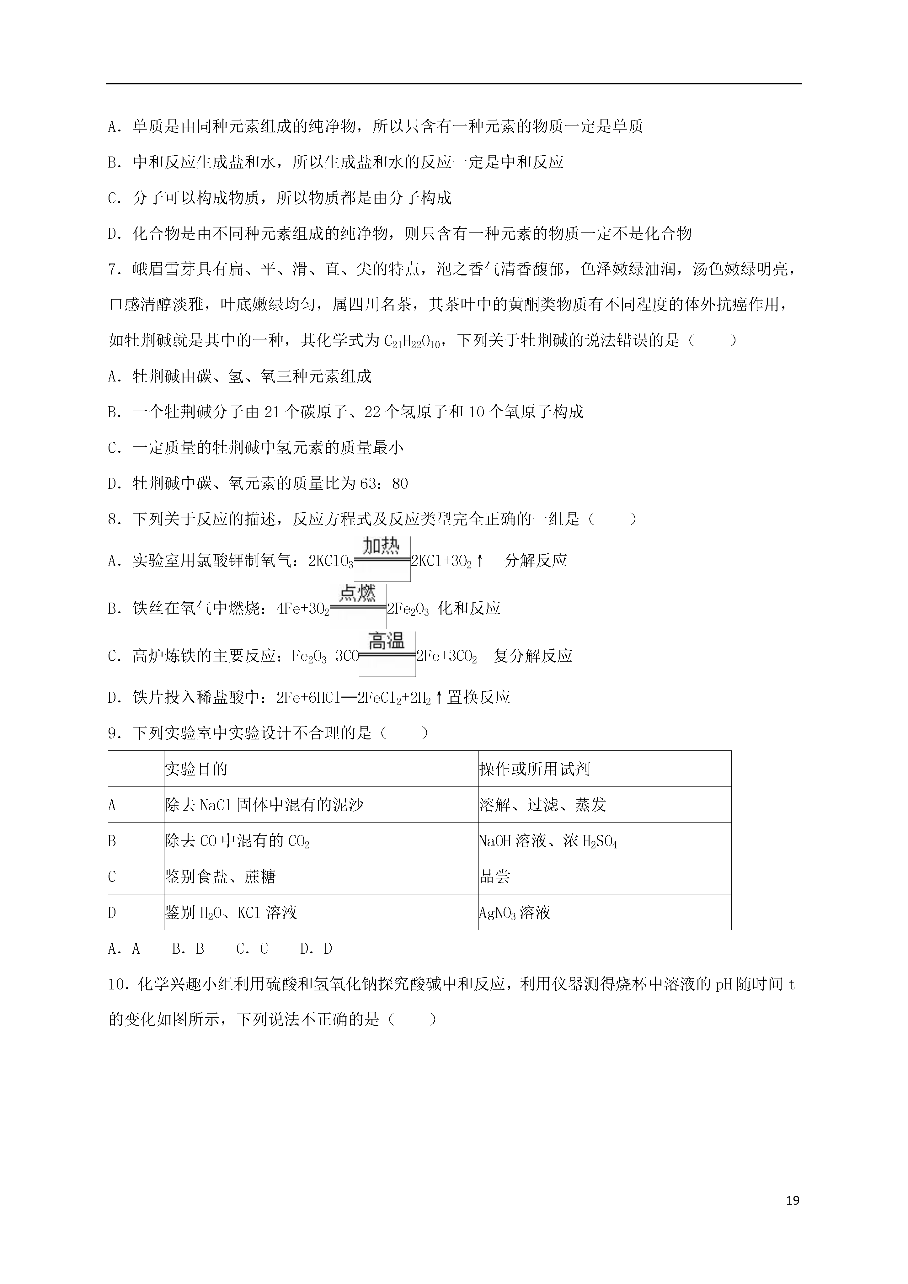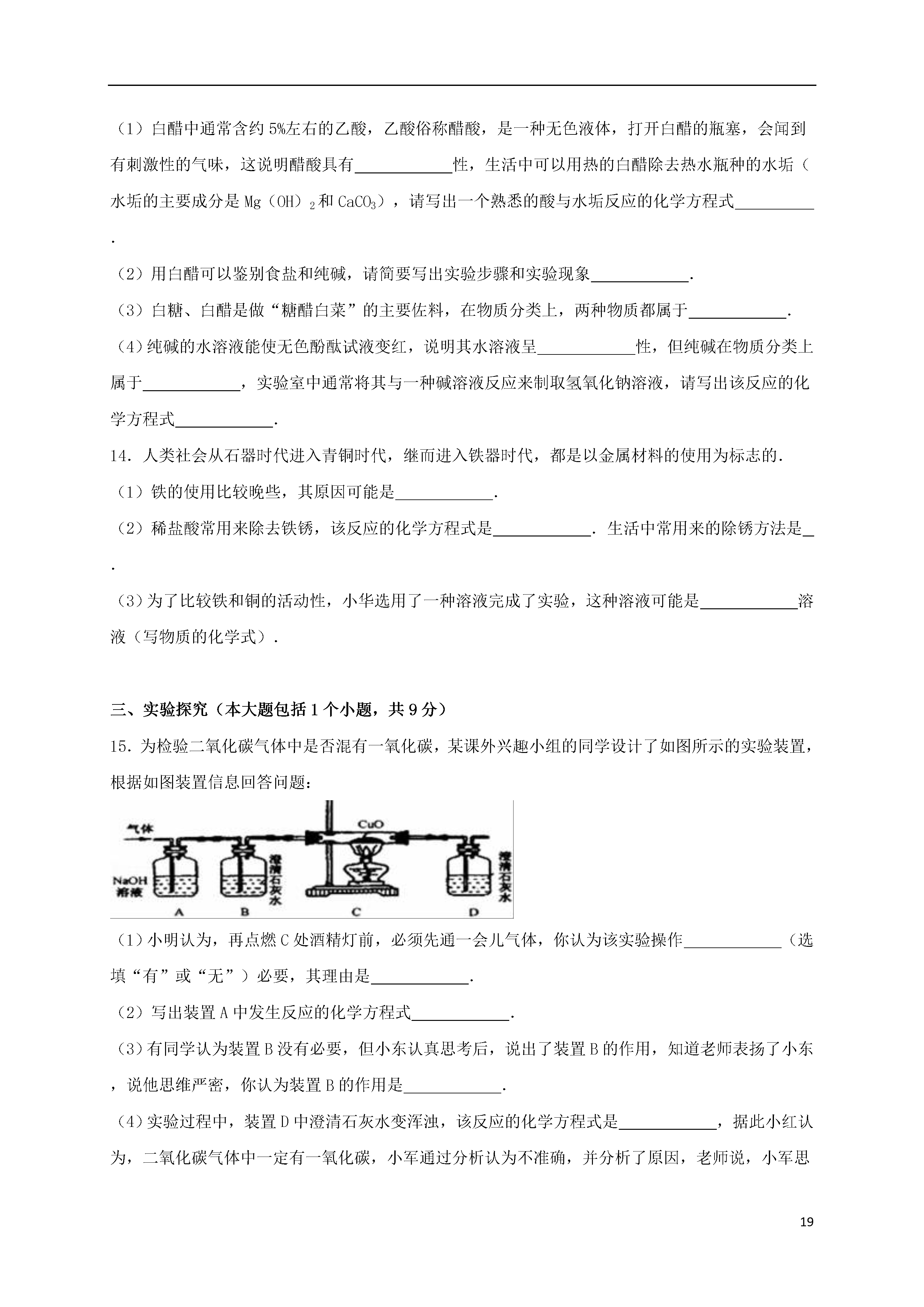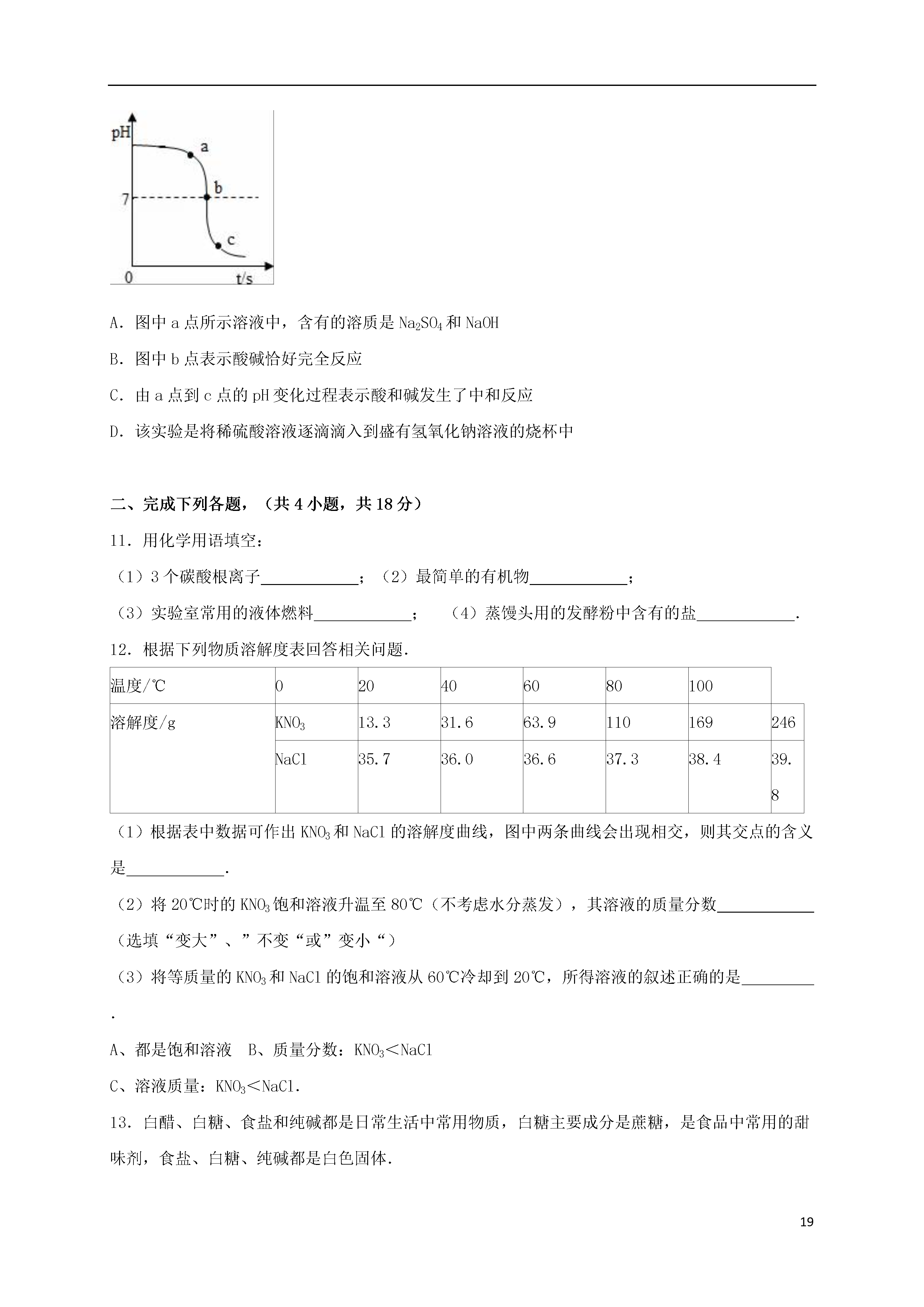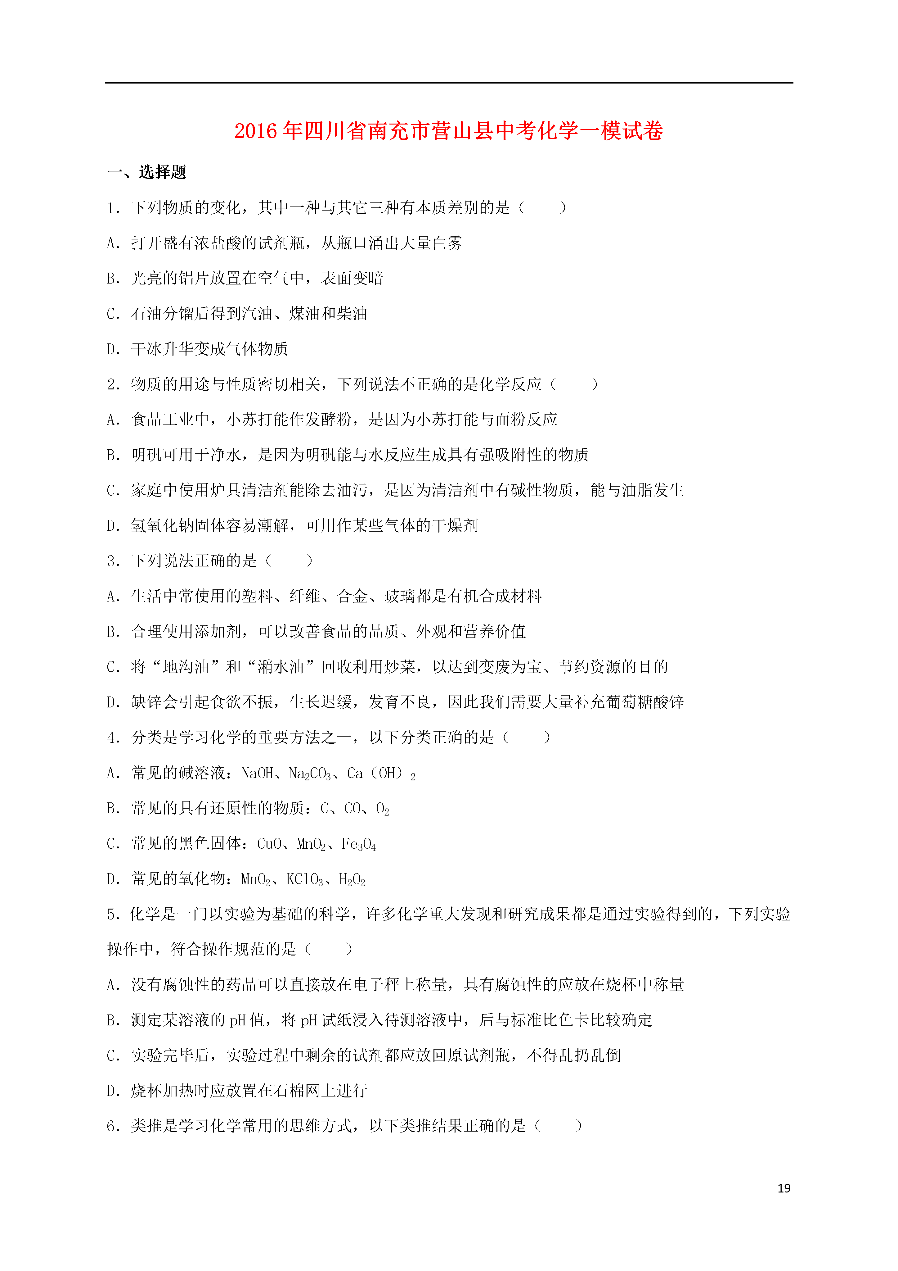 192016年四川省南充市营山县中考化学一模试卷一、选择题1.下列物质的变化,其中一种与其它三种有本质差别的是()A.打开盛有浓盐酸的试剂瓶,从瓶口涌出大量白雾B.光亮的铝片放置在空气中,表面变暗C.石油分馏后得到汽油、煤油和柴油D.干冰升华变成气体物质2.物质的用途与性质密切相关,下列说法不正确的是化学反应()A.食品工业中,小苏打能作发酵粉,是因为小苏打能与面粉反应B.明矾可用于净水,是因为明矾能与水反应生成具有强吸附性的物质C.家庭中使用炉具清洁剂能除去油污,是因为清洁剂中有碱性物质,能与油脂发生D.氢氧化钠固体容易潮解,可用作某些气体的干燥剂3.下列说法正确的是()A.生活中常使用的塑料、纤维、合金、玻璃都是有机合成材料B.合理使用添加剂,可以改善食品的品质、外观和营养价值C.将“地沟油”和“潲水油”回收利用炒菜,以达到变废为宝、节约资源的目的D.缺锌会引起食欲不振,生长迟缓,发育不良,因此我们需要大量补充葡萄糖酸锌4.分类是学习化学的重要方法之一,以下分类正确的是()A.常见的碱溶液:NaOH、Na2CO3、Ca(OH)2B.常见的具有还原性的物质:C、CO、O2C.常见的黑色固体:CuO、MnO2、Fe3O4D.常见的氧化物:MnO2、KClO3、H2O25.化学是一门以实验为基础的科学,许多化学重大发现和研究成果都是通过实验得到的,下列实验操作中,符合操作规范的是()A.没有腐蚀性的药品可以直接放在电子秤上称量,具有腐蚀性的应放在烧杯中称量B.测定某溶液的pH值,将pH试纸浸入待测溶液中,后与标准比色卡比较确定C.实验完毕后,实验过程中剩余的试剂都应放回原试剂瓶,不得乱扔乱倒D.烧杯加热时应放置在石棉网上进行6.类推是学习化学常用的思维方式,以下类推结果正确的是()A.单质是由同种元素组成的纯净物,所以只含有一种元素的物质一定是单质B.中和反应生成盐和水,所以生成盐和水的反应一定是中和反应C.分子可以构成物质,所以物质都是由分子构成D.化合物是由不同种元素组成的纯净物,则只含有一种元素的物质一定不是化合物7.峨眉雪芽具有扁、平、滑、直、尖的特点,泡之香气清香馥郁,色泽嫩绿油润,汤色嫩绿明亮,口感清醇淡雅,叶底嫩绿均匀,属四川名茶,其茶叶中的黄酮类物质有不同程度的体外抗癌作用,如牡荆碱就是其中的一种,其化学式为C21H22O10,下列关于牡荆碱的说法错误的是()A.牡荆碱由碳、氢、氧三种元素组成B.一个牡荆碱分子由21个碳原子、22个氢原子和10个氧原子构成C.一定质量的牡荆碱中氢元素的质量最小D.牡荆碱中碳、氧元素的质量比为63:808.下列关于反应的描述,反应方程式及反应类型完全正确的一组是()A.实验室用氯酸钾制氧气:2KClO32KCl+3O2↑分解反应B.铁丝在氧气中燃烧:4Fe+3O22Fe2O3化和反应C.高炉炼铁的主要反应:Fe2O3+3CO2Fe+3CO2复分解反应D.铁片投入稀盐酸中:2Fe+6HCl═2FeCl2+2H2↑置换反应9.下列实验室中实验设计不合理的是()实验目的操作或所用试剂A除去NaCl固体中混有的泥沙溶解、过滤、蒸发B除去CO中混有的CO2NaOH溶液、浓H2SO4C鉴别食盐、蔗糖品尝D鉴别H2O、KCl溶液AgNO3溶液A.AB.BC.CD.D10.化学兴趣小组利用硫酸和氢氧化钠探究酸碱中和反应,利用仪器测得烧杯中溶液的pH随时间t的变化如图所示,下列说法不正确的是()A.图中a点所示溶液中,含有的溶质是Na2SO4和NaOHB.图中b点表示酸碱恰好完全反应C.由a点到c点的pH变化过程表示酸和碱发生了中和反应D.该实验是将稀硫酸溶液逐滴滴入到盛有氢氧化钠溶液的烧杯中二、完成下列各题,(共4小题,共18分)11.用化学用语填空:(1)3个碳酸根离子;(2)最简单的有机物;(3)实验室常用的液体燃料;(4)蒸馒头用的发酵粉中含有的盐.12.根据下列物质溶解度表回答相关问题.温度/℃020406080100溶解度/gKNO313.331.663.9110169246NaCl35.736.036.637.338.439.8(1)根据表中数据可作出KNO3和NaCl的溶解度曲线,图中两条曲线会出现相交,则其交点的含义是.(2)将20℃时的KNO3饱和溶液升温至80℃(不考虑水分蒸发),其溶液的质量分数(选填“变大”、”不变“或”变小“)(3)将等质量的KNO3和NaCl的饱和溶液从60℃冷却到20℃,所得溶液的叙述正确的是.A、都是饱和溶液B、质量分数:KNO3<NaClC、溶液质量:KNO3<NaCl.13.白醋、白糖、食盐和纯碱都是日常生活中