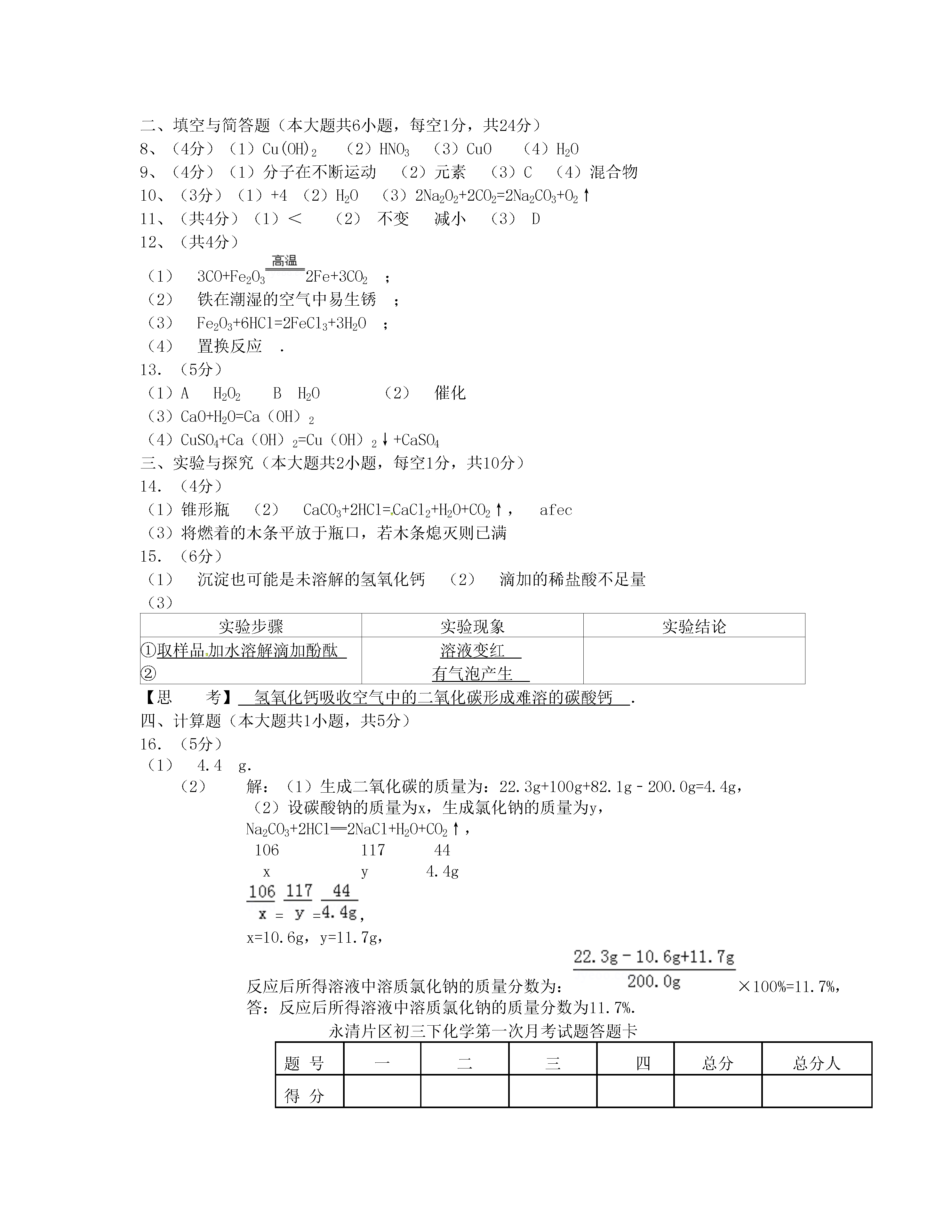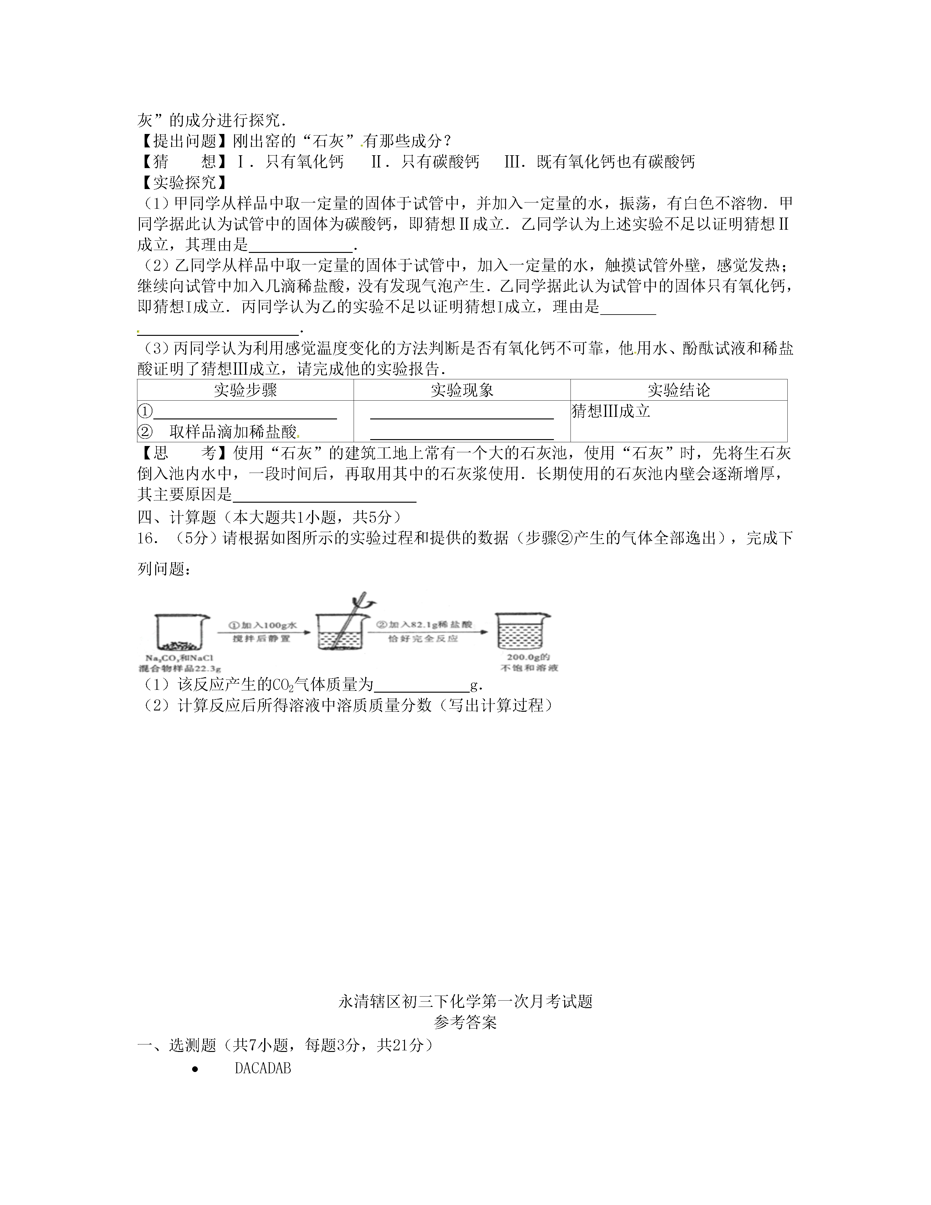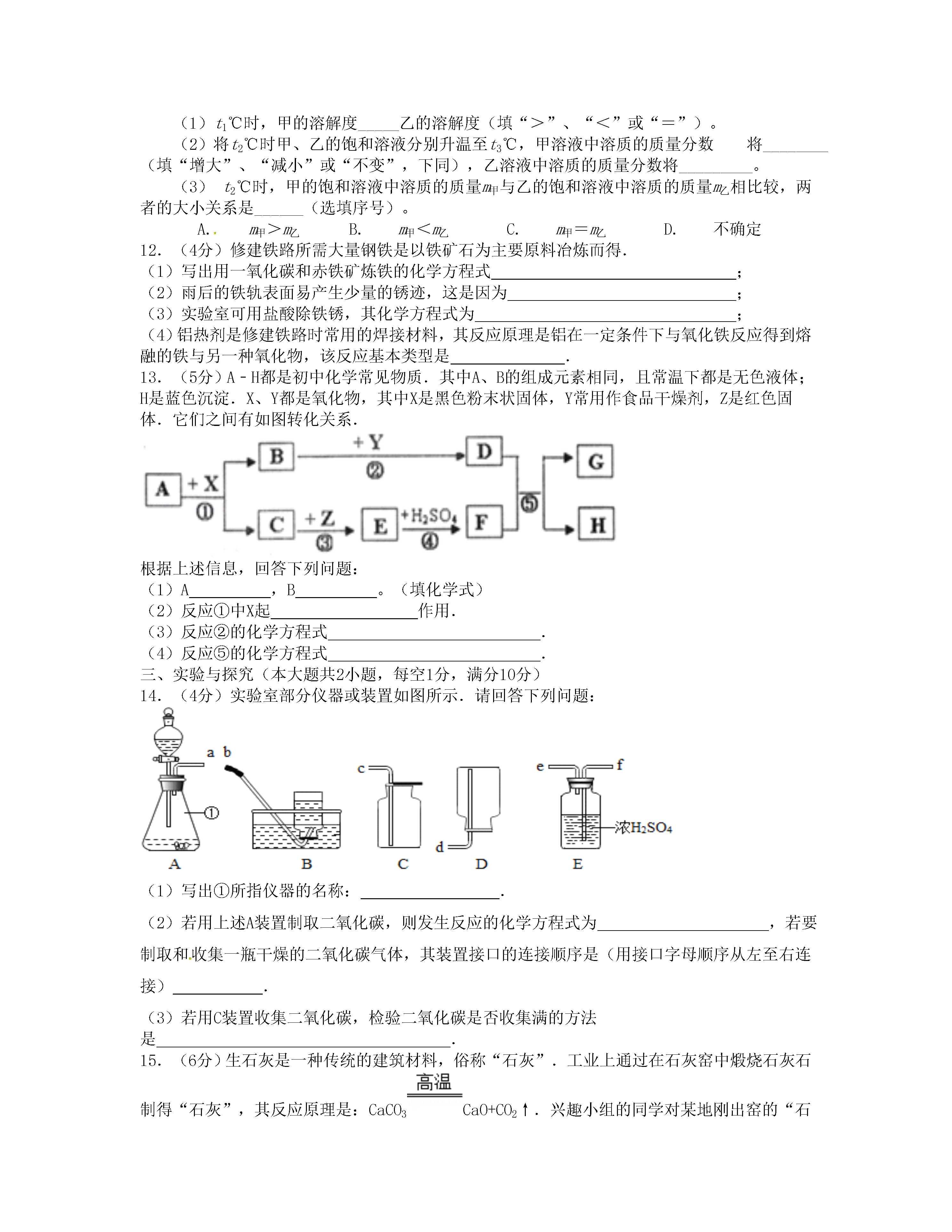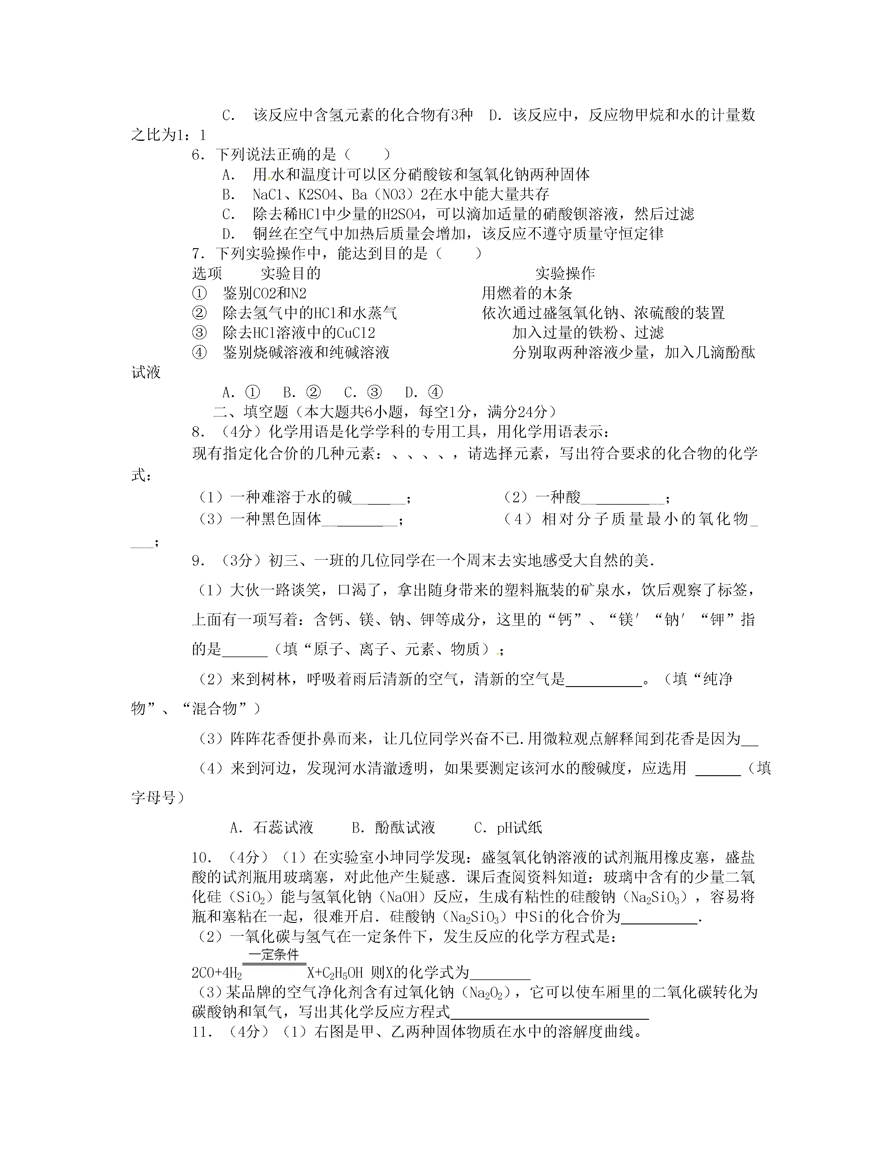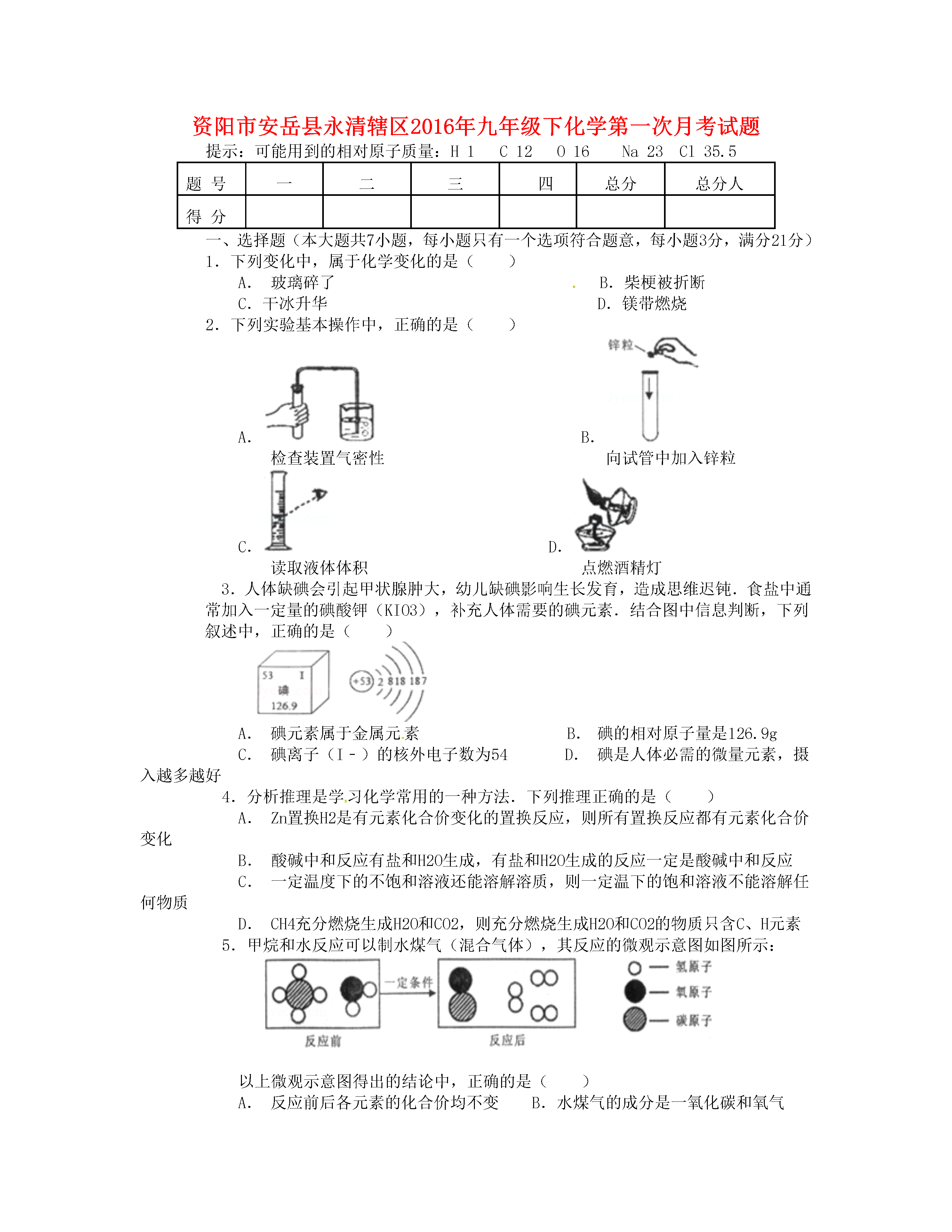 资阳市安岳县永清辖区2016年九年级下化学第一次月考试题提示:可能用到的相对原子质量:H1C12O16Na23Cl35.5题号一二三四总分总分人得分一、选择题(本大题共7小题,每小题只有一个选项符合题意,每小题3分,满分21分)1.下列变化中,属于化学变化的是()A.玻璃碎了B.柴梗被折断C.干冰升华D.镁带燃烧2.下列实验基本操作中,正确的是()A.B.检查装置气密性向试管中加入锌粒C.D.读取液体体积点燃酒精灯3.人体缺碘会引起甲状腺肿大,幼儿缺碘影响生长发育,造成思维迟钝.食盐中通常加入一定量的碘酸钾(KIO3),补充人体需要的碘元素.结合图中信息判断,下列叙述中,正确的是()A.碘元素属于金属元素B.碘的相对原子量是126.9gC.碘离子(I﹣)的核外电子数为54D.碘是人体必需的微量元素,摄入越多越好4.分析推理是学习化学常用的一种方法.下列推理正确的是()A.Zn置换H2是有元素化合价变化的置换反应,则所有置换反应都有元素化合价变化B.酸碱中和反应有盐和H2O生成,有盐和H2O生成的反应一定是酸碱中和反应C.一定温度下的不饱和溶液还能溶解溶质,则一定温下的饱和溶液不能溶解任何物质D.CH4充分燃烧生成H2O和CO2,则充分燃烧生成H2O和CO2的物质只含C、H元素5.甲烷和水反应可以制水煤气(混合气体),其反应的微观示意图如图所示:以上微观示意图得出的结论中,正确的是()A.反应前后各元素的化合价均不变B.水煤气的成分是一氧化碳和氧气C.该反应中含氢元素的化合物有3种D.该反应中,反应物甲烷和水的计量数之比为1:16.下列说法正确的是()A.用水和温度计可以区分硝酸铵和氢氧化钠两种固体B.NaC1、K2SO4、Ba(NO3)2在水中能大量共存C.除去稀HCl中少量的H2SO4,可以滴加适量的硝酸钡溶液,然后过滤D.铜丝在空气中加热后质量会增加,该反应不遵守质量守恒定律7.下列实验操作中,能达到目的是()选项实验目的实验操作①鉴别CO2和N2用燃着的木条②除去氢气中的HCl和水蒸气依次通过盛氢氧化钠、浓硫酸的装置③除去HCl溶液中的CuCl2加入过量的铁粉、过滤④鉴别烧碱溶液和纯碱溶液分别取两种溶液少量,加入几滴酚酞试液A.①B.②C.③D.④二、填空题(本大题共6小题,每空1分,满分24分)8.(4分)化学用语是化学学科的专用工具,用化学用语表示:现有指定化合价的几种元素:、、、、,请选择元素,写出符合要求的化合物的化学式:(1)一种难溶于水的碱____;(2)一种酸____;(3)一种黑色固体____;(4)相对分子质量最小的氧化物____;9.(3分)初三、一班的几位同学在一个周末去实地感受大自然的美.(1)大伙一路谈笑,口渴了,拿出随身带来的塑料瓶装的矿泉水,饮后观察了标签,上面有一项写着:含钙、镁、钠、钾等成分,这里的“钙”、“镁′“钠′“钾”指的是(填“原子、离子、元素、物质);(2)来到树林,呼吸着雨后清新的空气,清新的空气是。(填“纯净物”、“混合物”)(3)阵阵花香便扑鼻而来,让几位同学兴奋不已.用微粒观点解释闻到花香是因为(4)来到河边,发现河水清澈透明,如果要测定该河水的酸碱度,应选用(填字母号)A.石蕊试液B.酚酞试液C.pH试纸10.(4分)(1)在实验室小坤同学发现:盛氢氧化钠溶液的试剂瓶用橡皮塞,盛盐酸的试剂瓶用玻璃塞,对此他产生疑惑.课后査阅资料知道:玻璃中含有的少量二氧化硅(SiO2)能与氢氧化钠(NaOH)反应,生成有粘性的硅酸钠(Na2SiO3),容易将瓶和塞粘在一起,很难开启.硅酸钠(Na2SiO3)中Si的化合价为.(2)一氧化碳与氢气在一定条件下,发生反应的化学方程式是:2C0+4H2X+C2H5OH则X的化学式为(3)某品牌的空气净化剂含有过氧化钠(Na2O2),它可以使车厢里的二氧化碳转化为碳酸钠和氧气,写出其化学反应方程式11.(4分)(1)右图是甲、乙两种固体物质在水中的溶解度曲线。(1)t1℃时,甲的溶解度_____乙的溶解度(填“>”、“<”或“=”)。(2)将t2℃时甲、乙的饱和溶液分别升温至t3℃,甲溶液中溶质的质量分数将________(填“增大”、“减小”或“不变”,下同),乙溶液中溶质的质量分数将_________。(3)t2℃时,甲的饱和溶液中溶质的质量m甲与乙的饱和溶液中溶质的质量m乙相比较,两者的大小关系是______(选填序号)。A.m甲>m乙B.m甲<m乙C.m甲=m乙D.不确定12.(4分)修建铁路所需大量钢铁是以铁矿石为主要原料冶炼而得.(1)写出用一氧化碳和赤铁矿炼铁的化学方程式;(2)雨后的铁轨表面