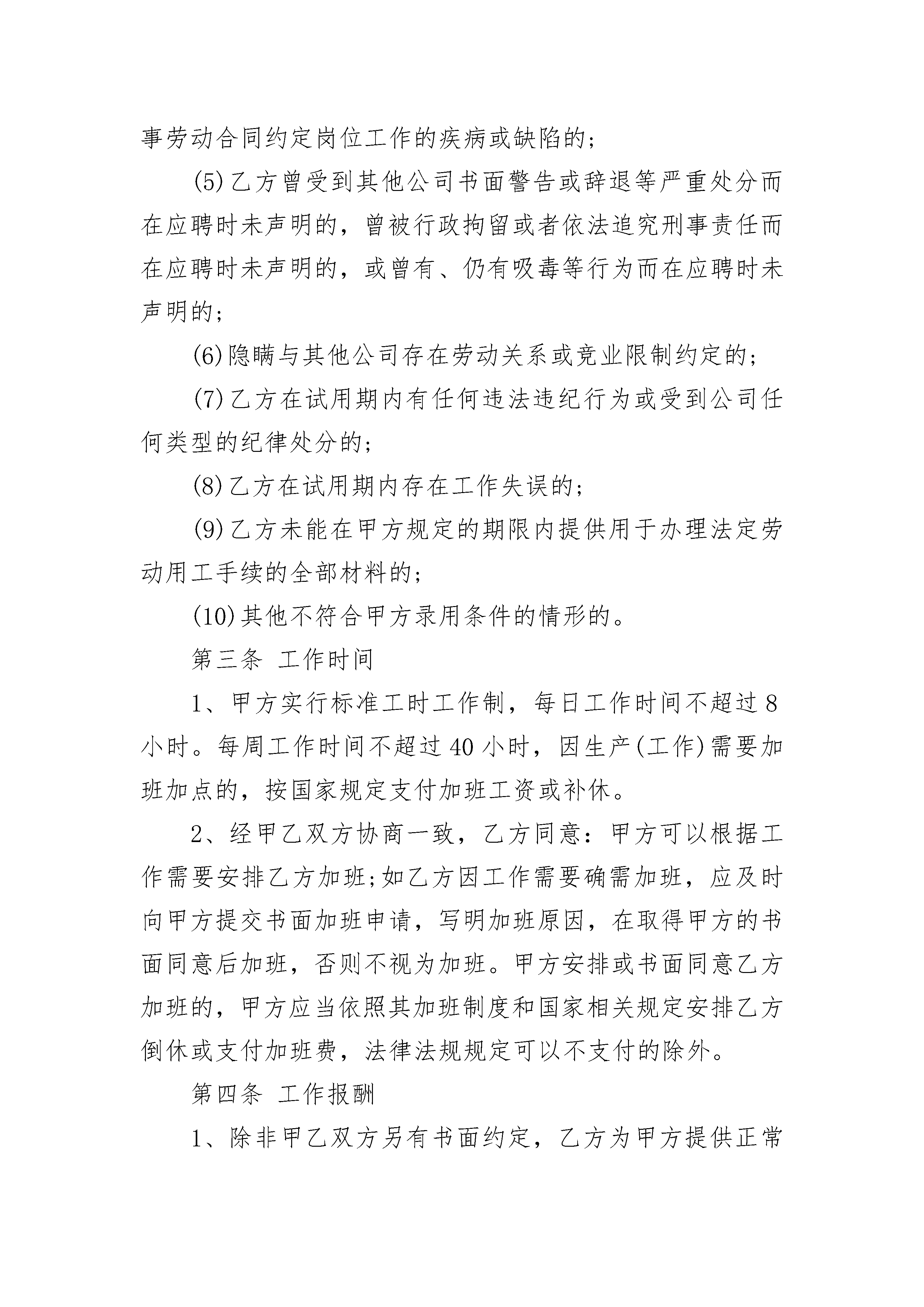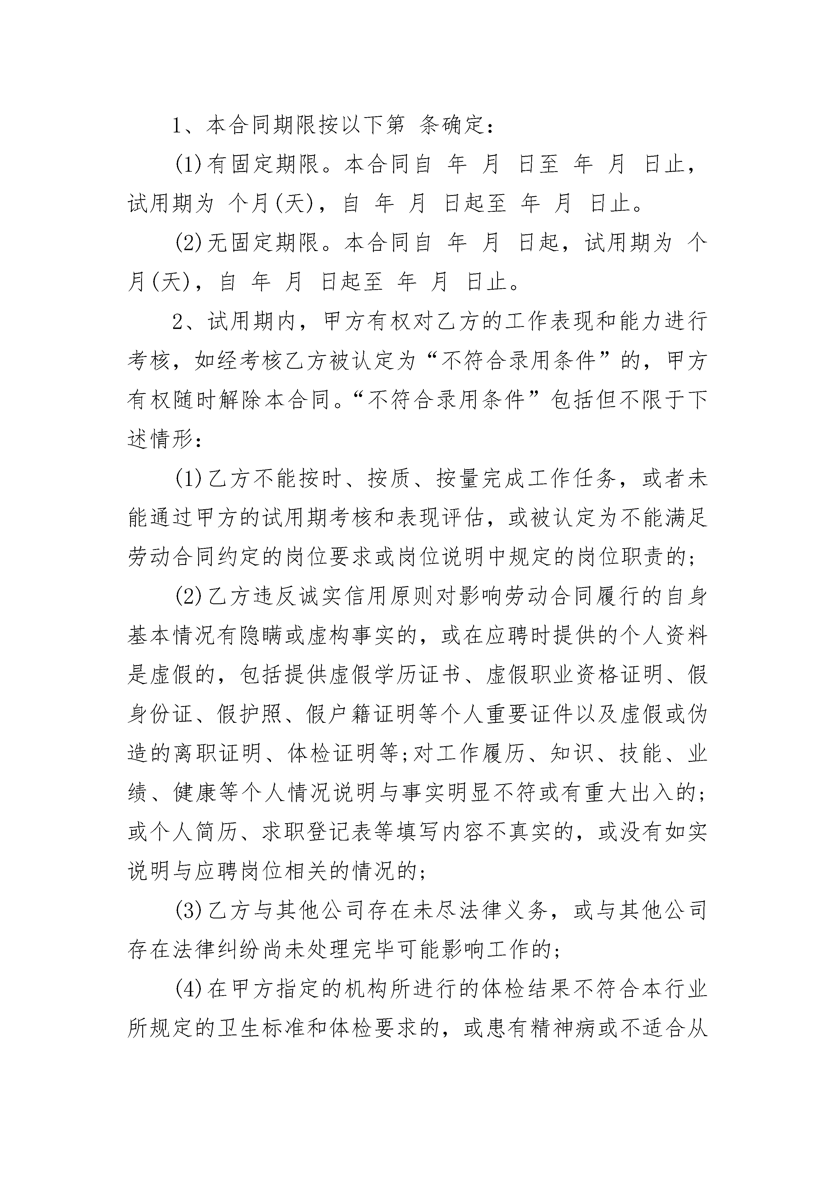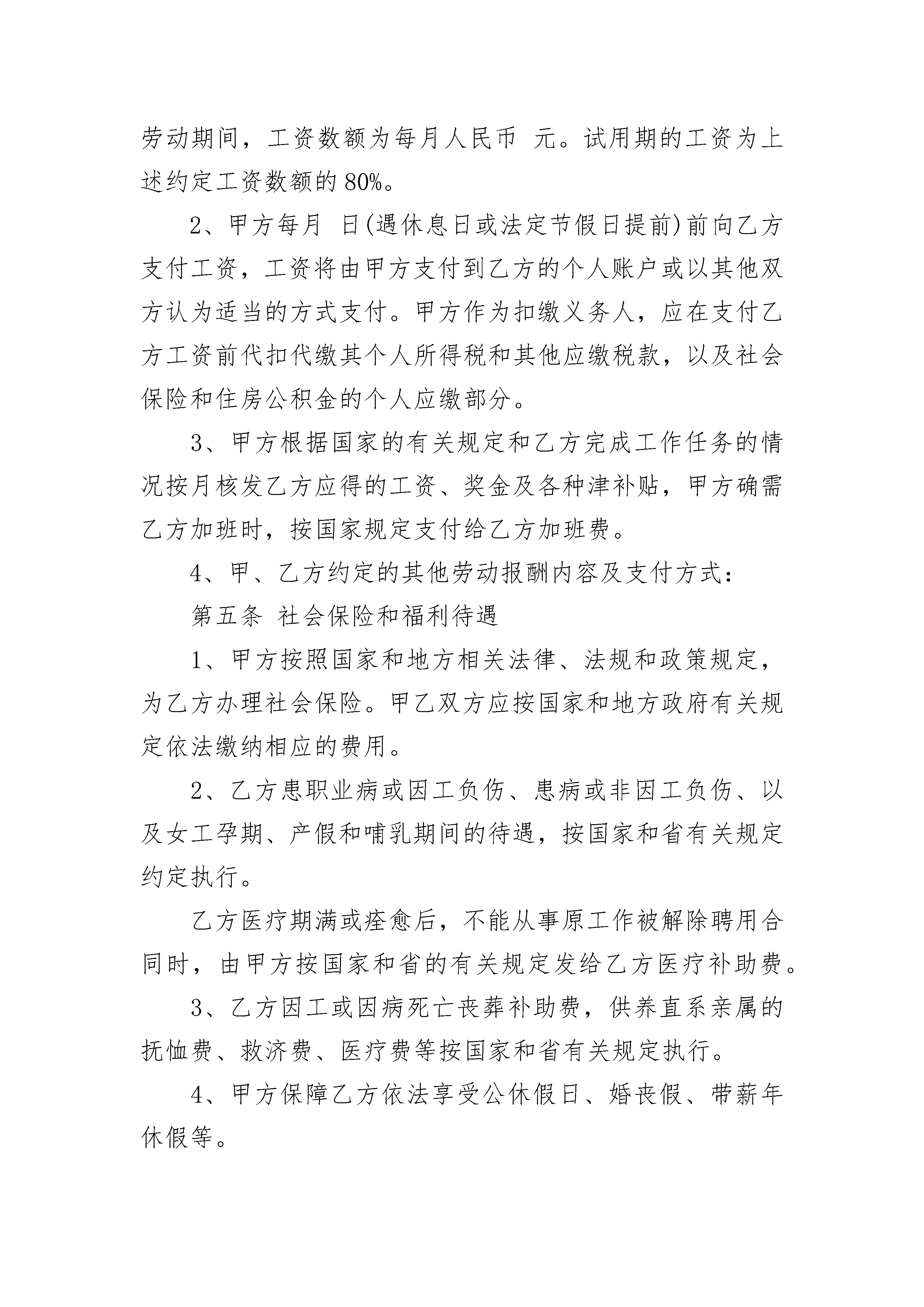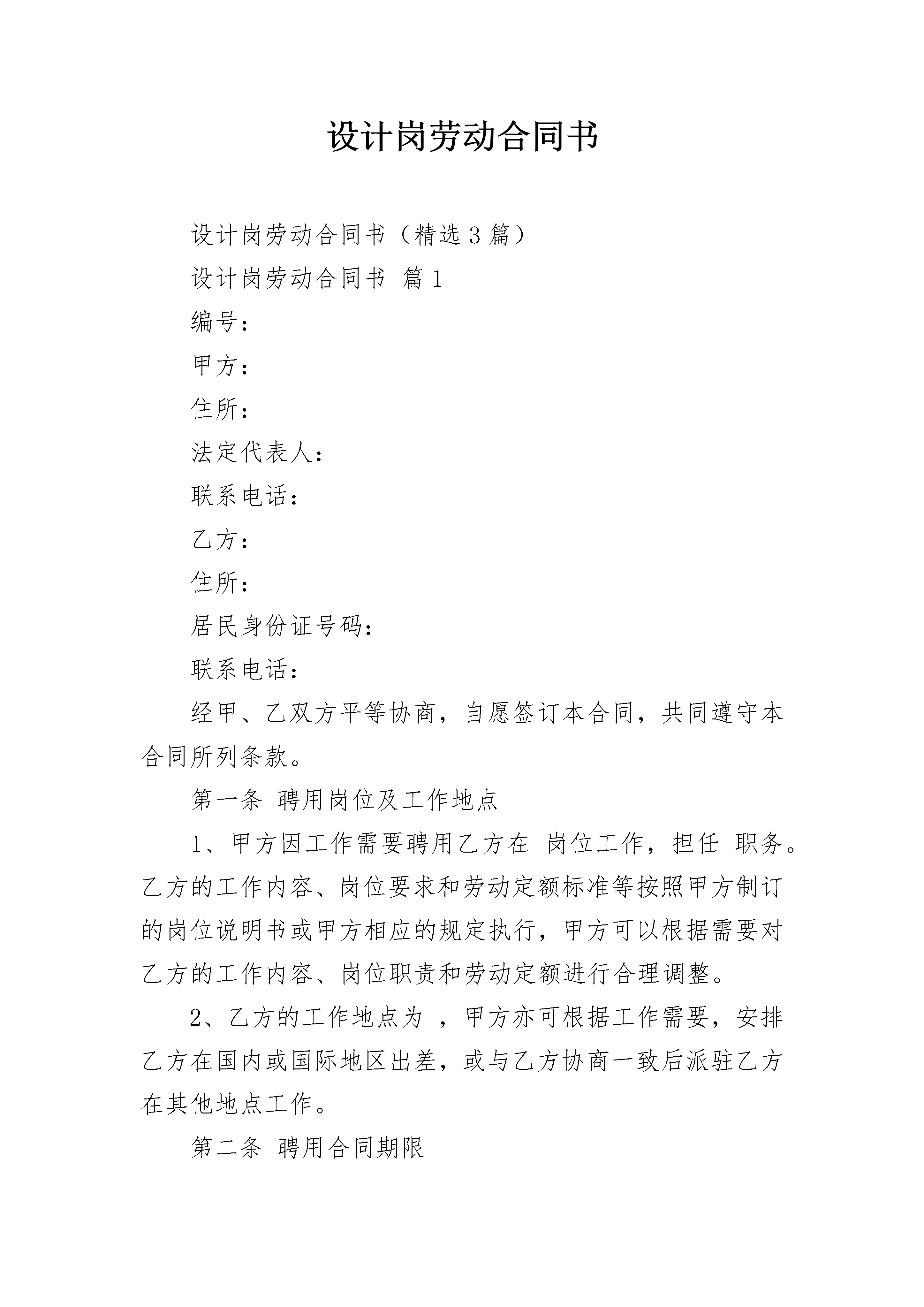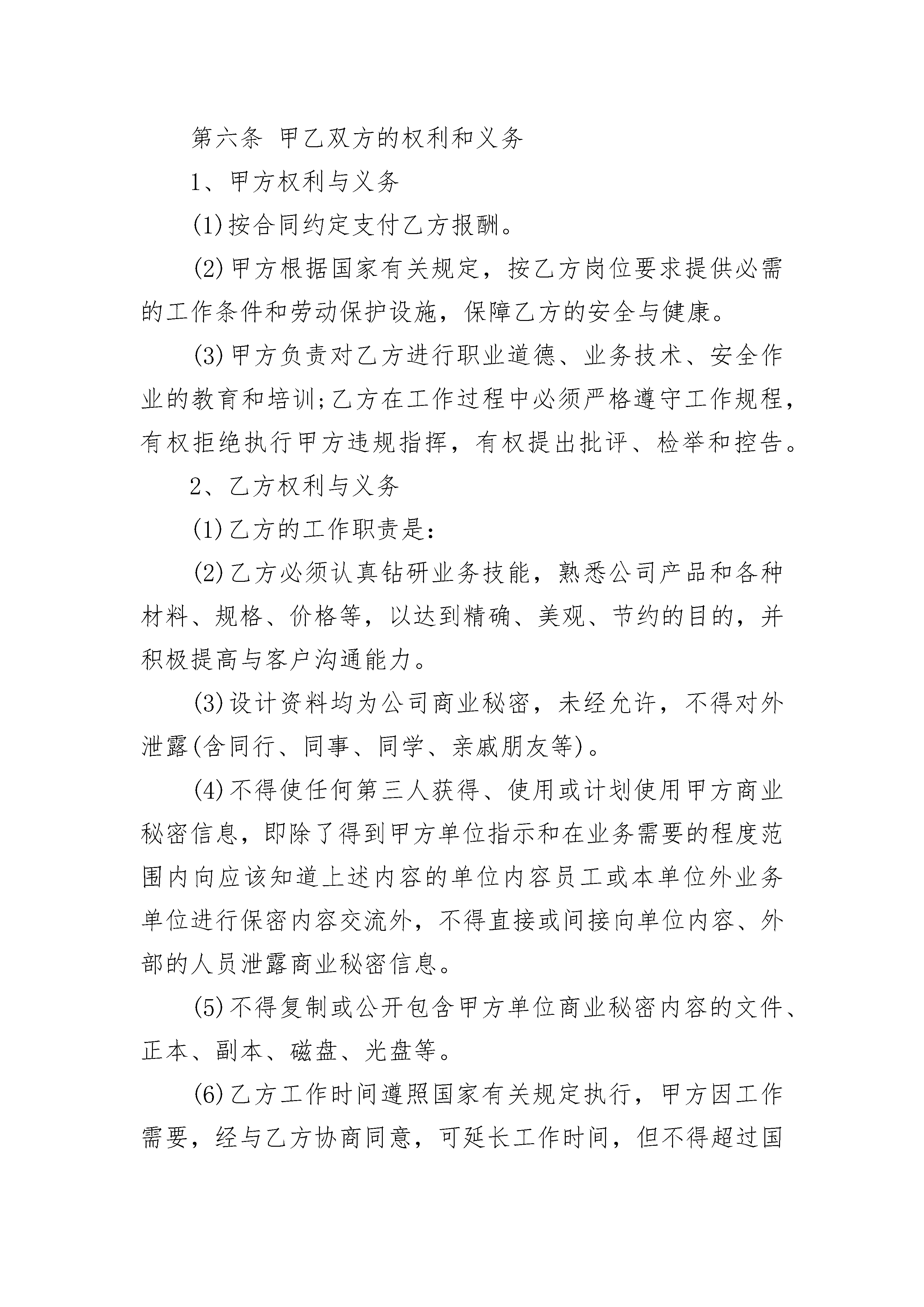设计岗劳动合同书设计岗劳动合同书(精选3篇)设计岗劳动合同书篇1编号:甲方:住所:法定代表人:联系电话:乙方:住所:居民身份证号码:联系电话:经甲、乙双方平等协商,自愿签订本合同,共同遵守本合同所列条款。第一条聘用岗位及工作地点1、甲方因工作需要聘用乙方在岗位工作,担任职务。乙方的工作内容、岗位要求和劳动定额标准等按照甲方制订的岗位说明书或甲方相应的规定执行,甲方可以根据需要对乙方的工作内容、岗位职责和劳动定额进行合理调整。2、乙方的工作地点为,甲方亦可根据工作需要,安排乙方在国内或国际地区出差,或与乙方协商一致后派驻乙方在其他地点工作。第二条聘用合同期限1、本合同期限按以下第条确定:(1)有固定期限。本合同自年月日至年月日止,试用期为个月(天),自年月日起至年月日止。(2)无固定期限。本合同自年月日起,试用期为个月(天),自年月日起至年月日止。2、试用期内,甲方有权对乙方的工作表现和能力进行考核,如经考核乙方被认定为“不符合录用条件”的,甲方有权随时解除本合同。“不符合录用条件”包括但不限于下述情形:(1)乙方不能按时、按质、按量完成工作任务,或者未能通过甲方的试用期考核和表现评估,或被认定为不能满足劳动合同约定的岗位要求或岗位说明中规定的岗位职责的;(2)乙方违反诚实信用原则对影响劳动合同履行的自身基本情况有隐瞒或虚构事实的,或在应聘时提供的个人资料是虚假的,包括提供虚假学历证书、虚假职业资格证明、假身份证、假护照、假户籍证明等个人重要证件以及虚假或伪造的离职证明、体检证明等;对工作履历、知识、技能、业绩、健康等个人情况说明与事实明显不符或有重大出入的;或个人简历、求职登记表等填写内容不真实的,或没有如实说明与应聘岗位相关的情况的;(3)乙方与其他公司存在未尽法律义务,或与其他公司存在法律纠纷尚未处理完毕可能影响工作的;(4)在甲方指定的机构所进行的体检结果不符合本行业所规定的卫生标准和体检要求的,或患有精神病或不适合从事劳动合同约定岗位工作的疾病或缺陷的;(5)乙方曾受到其他公司书面警告或辞退等严重处分而在应聘时未声明的,曾被行政拘留或者依法追究刑事责任而在应聘时未声明的,或曾有、仍有吸毒等行为而在应聘时未声明的;(6)隐瞒与其他公司存在劳动关系或竞业限制约定的;(7)乙方在试用期内有任何违法违纪行为或受到公司任何类型的纪律处分的;(8)乙方在试用期内存在工作失误的;(9)乙方未能在甲方规定的期限内提供用于办理法定劳动用工手续的全部材料的;(10)其他不符合甲方录用条件的情形的。第三条工作时间1、甲方实行标准工时工作制,每日工作时间不超过8小时。每周工作时间不超过40小时,因生产(工作)需要加班加点的,按国家规定支付加班工资或补休。2、经甲乙双方协商一致,乙方同意:甲方可以根据工作需要安排乙方加班;如乙方因工作需要确需加班,应及时向甲方提交书面加班申请,写明加班原因,在取得甲方的书面同意后加班,否则不视为加班。甲方安排或书面同意乙方加班的,甲方应当依照其加班制度和国家相关规定安排乙方倒休或支付加班费,法律法规规定可以不支付的除外。第四条工作报酬1、除非甲乙双方另有书面约定,乙方为甲方提供正常劳动期间,工资数额为每月人民币元。试用期的工资为上述约定工资数额的80%。2、甲方每月日(遇休息日或法定节假日提前)前向乙方支付工资,工资将由甲方支付到乙方的个人账户或以其他双方认为适当的方式支付。甲方作为扣缴义务人,应在支付乙方工资前代扣代缴其个人所得税和其他应缴税款,以及社会保险和住房公积金的个人应缴部分。3、甲方根据国家的有关规定和乙方完成工作任务的情况按月核发乙方应得的工资、奖金及各种津补贴,甲方确需乙方加班时,按国家规定支付给乙方加班费。4、甲、乙方约定的其他劳动报酬内容及支付方式:第五条社会保险和福利待遇1、甲方按照国家和地方相关法律、法规和政策规定,为乙方办理社会保险。甲乙双方应按国家和地方政府有关规定依法缴纳相应的费用。2、乙方患职业病或因工负伤、患病或非因工负伤、以及女工孕期、产假和哺乳期间的待遇,按国家和省有关规定约定执行。乙方医疗期满或痊愈后,不能从事原工作被解除聘用合同时,由甲方按国家和省的有关规定发给乙方医疗补助费。3、乙方因工或因病死亡丧葬补助费,供养直系亲属的抚恤费、救济费、医疗费等按国家和省有关规定执行。4、甲方保障乙方依法享受公休假日、婚丧假、带薪年休假等。第六条甲乙双方的权利和义务1、甲方权利与义务(1)按合同约定支付乙方报酬。(2)甲方根据国家有关规定,按乙方岗位要求提供必需的工作条件和劳动保护设施,保障乙方的安全与健康。(3)甲方负责对乙方进行职业道德、业务技术、安全作业的教育和培训;乙方在工作过程中必须严格遵守工作规程,有权拒绝执行甲方违规指挥,有权提出批评、检举和控告。2、乙方权利与义务