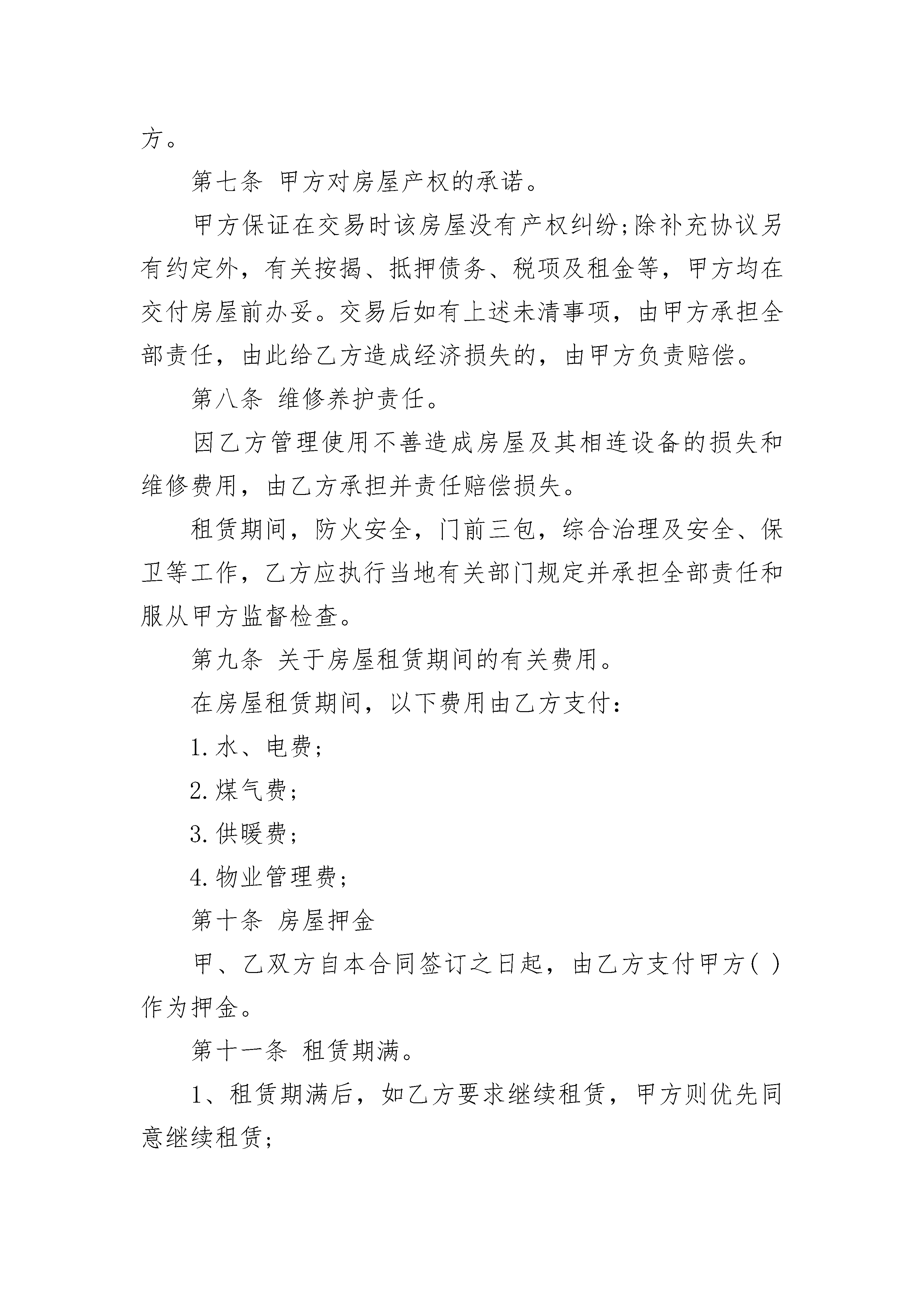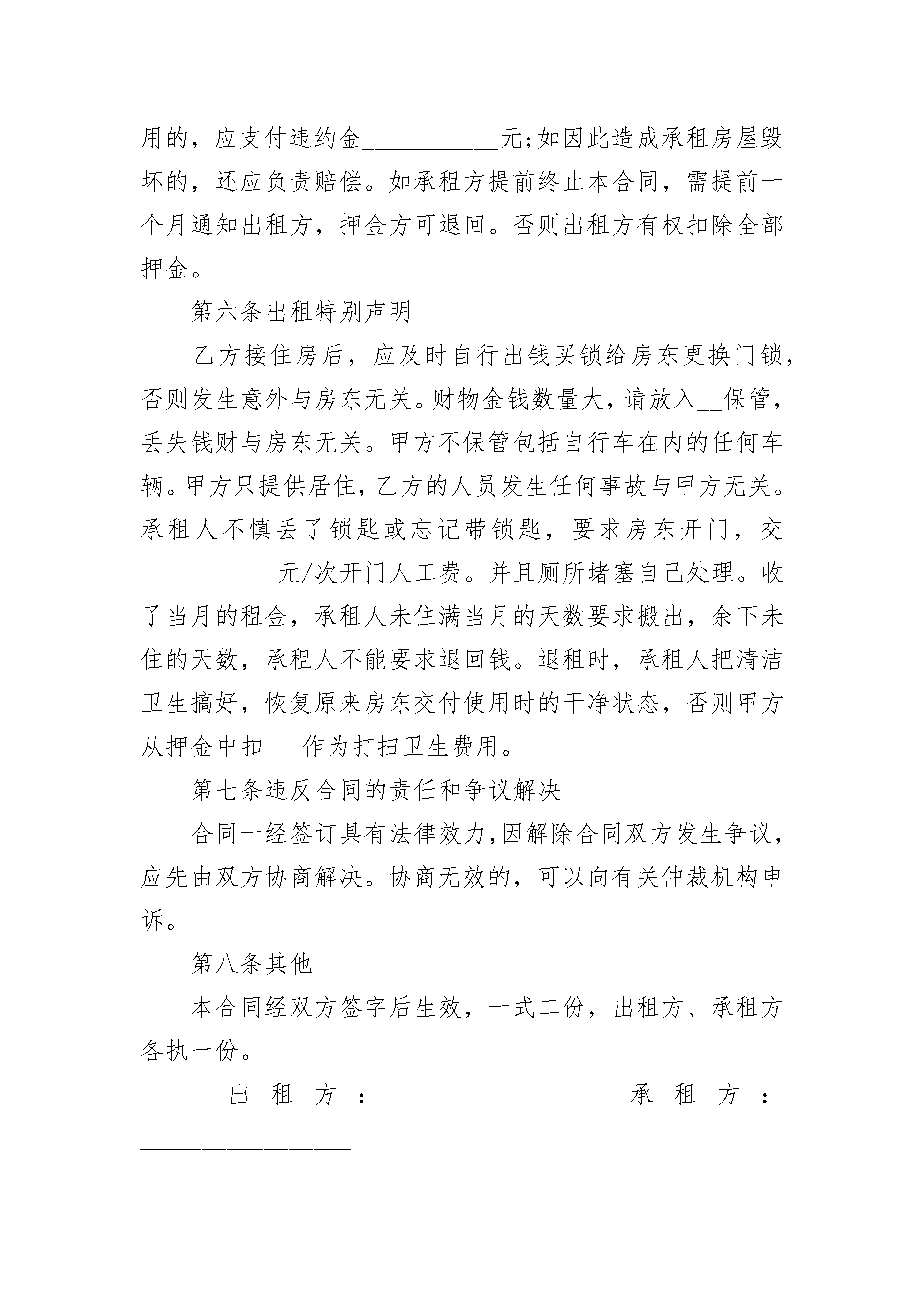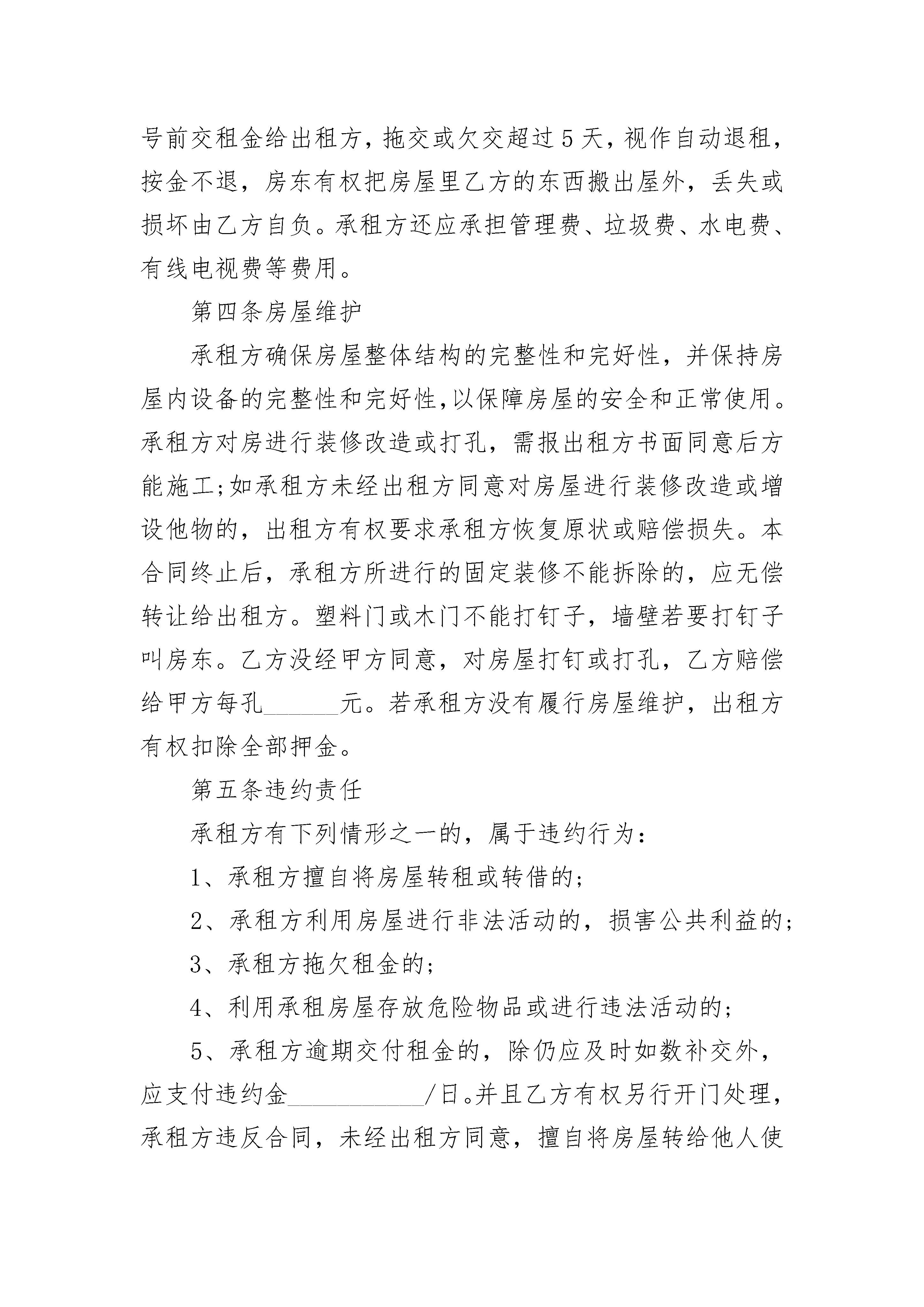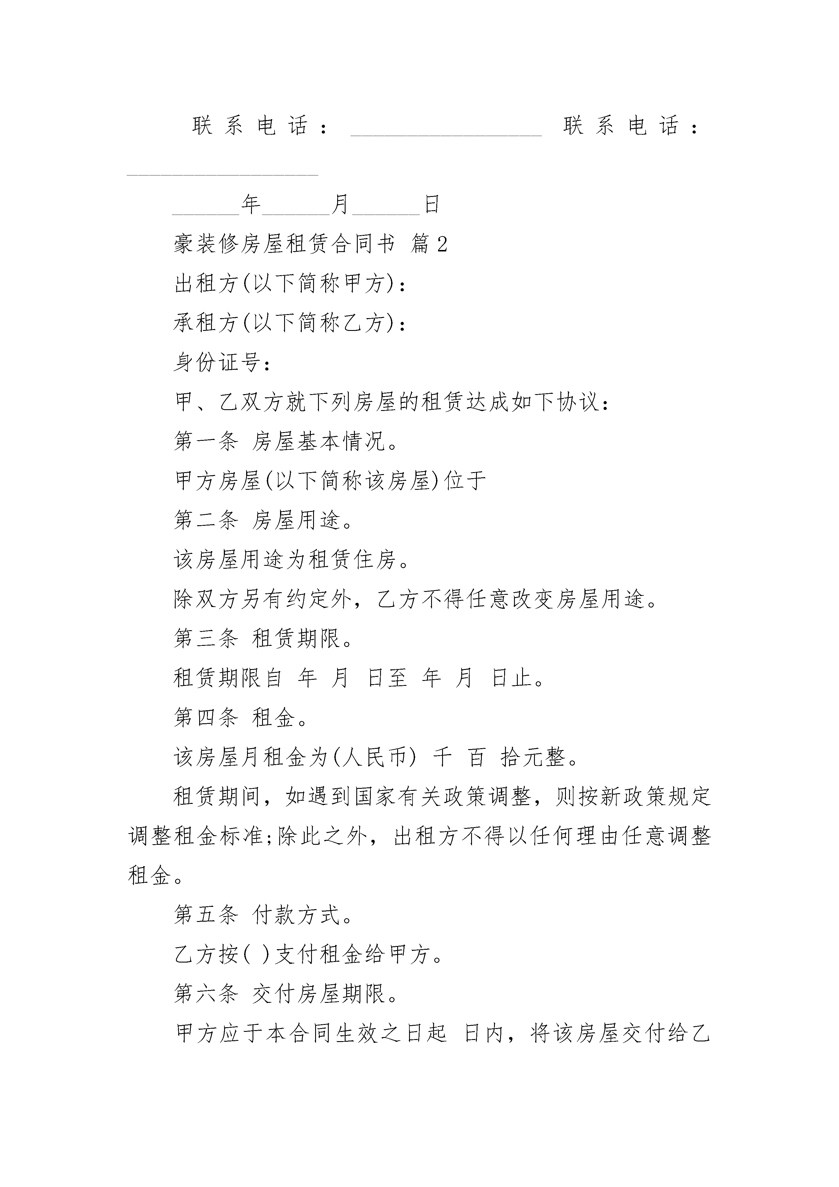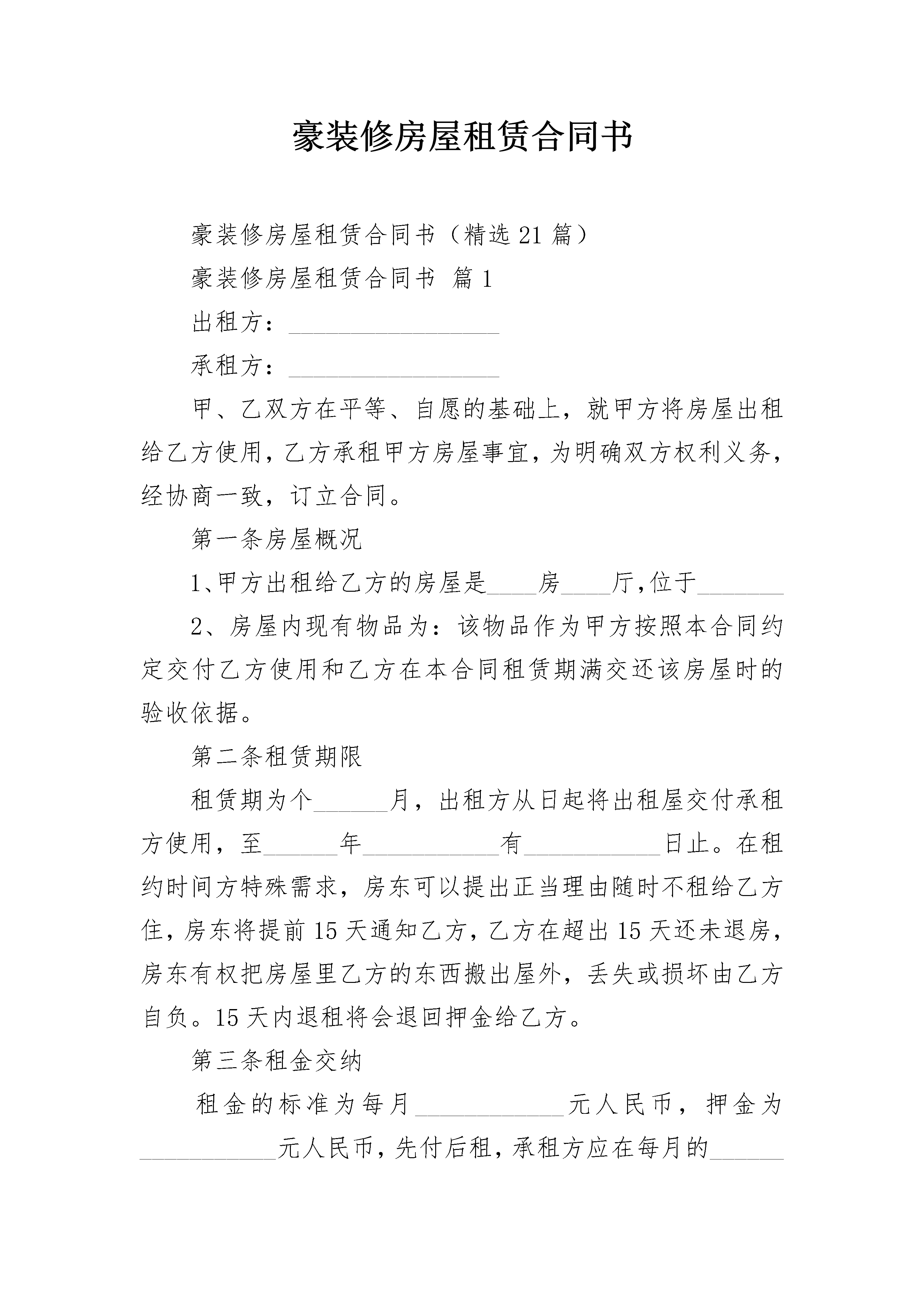 豪装修房屋租赁合同书豪装修房屋租赁合同书(精选21篇)豪装修房屋租赁合同书篇1出租方:_________________承租方:_________________甲、乙双方在平等、自愿的基础上,就甲方将房屋出租给乙方使用,乙方承租甲方房屋事宜,为明确双方权利义务,经协商一致,订立合同。第一条房屋概况1、甲方出租给乙方的房屋是____房____厅,位于_______2、房屋内现有物品为:该物品作为甲方按照本合同约定交付乙方使用和乙方在本合同租赁期满交还该房屋时的验收依据。第二条租赁期限租赁期为个______月,出租方从日起将出租屋交付承租方使用,至______年___________有___________日止。在租约时间方特殊需求,房东可以提出正当理由随时不租给乙方住,房东将提前15天通知乙方,乙方在超出15天还未退房,房东有权把房屋里乙方的东西搬出屋外,丢失或损坏由乙方自负。15天内退租将会退回押金给乙方。第三条租金交纳租金的标准为每月____________元人民币,押金为___________元人民币,先付后租,承租方应在每月的______号前交租金给出租方,拖交或欠交超过5天,视作自动退租,按金不退,房东有权把房屋里乙方的东西搬出屋外,丢失或损坏由乙方自负。承租方还应承担管理费、垃圾费、水电费、有线电视费等费用。第四条房屋维护承租方确保房屋整体结构的完整性和完好性,并保持房屋内设备的完整性和完好性,以保障房屋的安全和正常使用。承租方对房进行装修改造或打孔,需报出租方书面同意后方能施工;如承租方未经出租方同意对房屋进行装修改造或增设他物的,出租方有权要求承租方恢复原状或赔偿损失。本合同终止后,承租方所进行的固定装修不能拆除的,应无偿转让给出租方。塑料门或木门不能打钉子,墙壁若要打钉子叫房东。乙方没经甲方同意,对房屋打钉或打孔,乙方赔偿给甲方每孔______元。若承租方没有履行房屋维护,出租方有权扣除全部押金。第五条违约责任承租方有下列情形之一的,属于违约行为:1、承租方擅自将房屋转租或转借的;2、承租方利用房屋进行非法活动的,损害公共利益的;3、承租方拖欠租金的;4、利用承租房屋存放危险物品或进行违法活动的;5、承租方逾期交付租金的,除仍应及时如数补交外,应支付违约金___________/日。并且乙方有权另行开门处理,承租方违反合同,未经出租方同意,擅自将房屋转给他人使用的,应支付违约金___________元;如因此造成承租房屋毁坏的,还应负责赔偿。如承租方提前终止本合同,需提前一个月通知出租方,押金方可退回。否则出租方有权扣除全部押金。第六条出租特别声明乙方接住房后,应及时自行出钱买锁给房东更换门锁,否则发生意外与房东无关。财物金钱数量大,请放入__保管,丢失钱财与房东无关。甲方不保管包括自行车在内的任何车辆。甲方只提供居住,乙方的人员发生任何事故与甲方无关。承租人不慎丢了锁匙或忘记带锁匙,要求房东开门,交___________元/次开门人工费。并且厕所堵塞自己处理。收了当月的租金,承租人未住满当月的天数要求搬出,余下未住的天数,承租人不能要求退回钱。退租时,承租人把清洁卫生搞好,恢复原来房东交付使用时的干净状态,否则甲方从押金中扣___作为打扫卫生费用。第七条违反合同的责任和争议解决合同一经签订具有法律效力,因解除合同双方发生争议,应先由双方协商解决。协商无效的,可以向有关仲裁机构申诉。第八条其他本合同经双方签字后生效,一式二份,出租方、承租方各执一份。出租方:_________________承租方:_________________联系电话:_________________联系电话:_______________________年______月______日豪装修房屋租赁合同书篇2出租方(以下简称甲方):承租方(以下简称乙方):身份证号:甲、乙双方就下列房屋的租赁达成如下协议:第一条房屋基本情况。甲方房屋(以下简称该房屋)位于第二条房屋用途。该房屋用途为租赁住房。除双方另有约定外,乙方不得任意改变房屋用途。第三条租赁期限。租赁期限自年月日至年月日止。第四条租金。该房屋月租金为(人民币)千百拾元整。租赁期间,如遇到国家有关政策调整,则按新政策规定调整租金标准;除此之外,出租方不得以任何理由任意调整租金。第五条付款方式。乙方按()支付租金给甲方。第六条交付房屋期限。甲方应于本合同生效之日起日内,将该房屋交付给乙方。第七条甲方对房屋产权的承诺。甲方保证在交易时该房屋没有产权纠纷;除补充协议另有约定外,有关按揭、抵押债务、税项及租金等,甲方均在交付房屋前办妥。交易后如有上述未清事项,由甲方承担全部责任,由此给乙方造成经济损失的,由甲方负责赔偿。第八条维修养护责任。因乙方管理使用不善造成房屋及其相连设备的损失和维