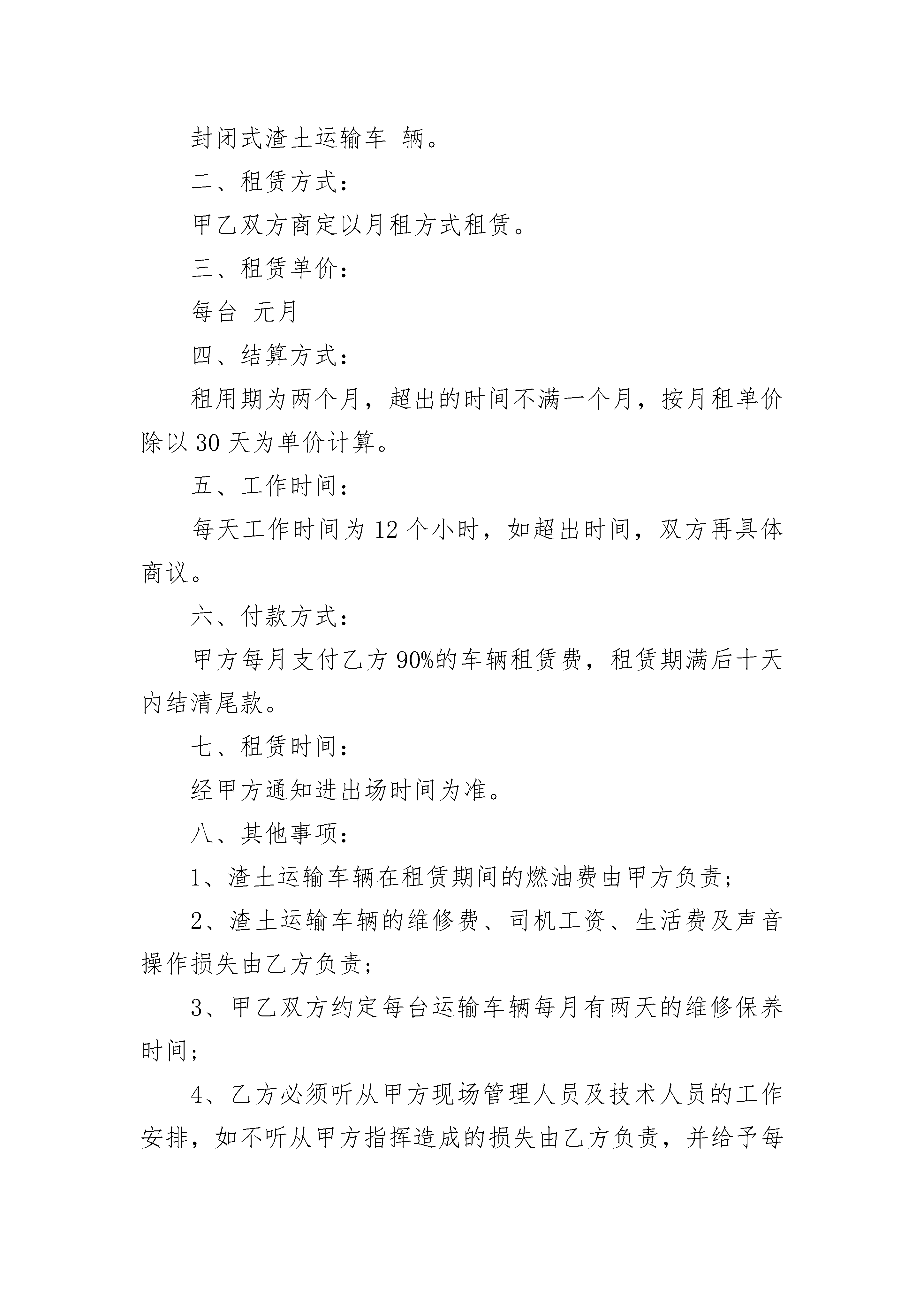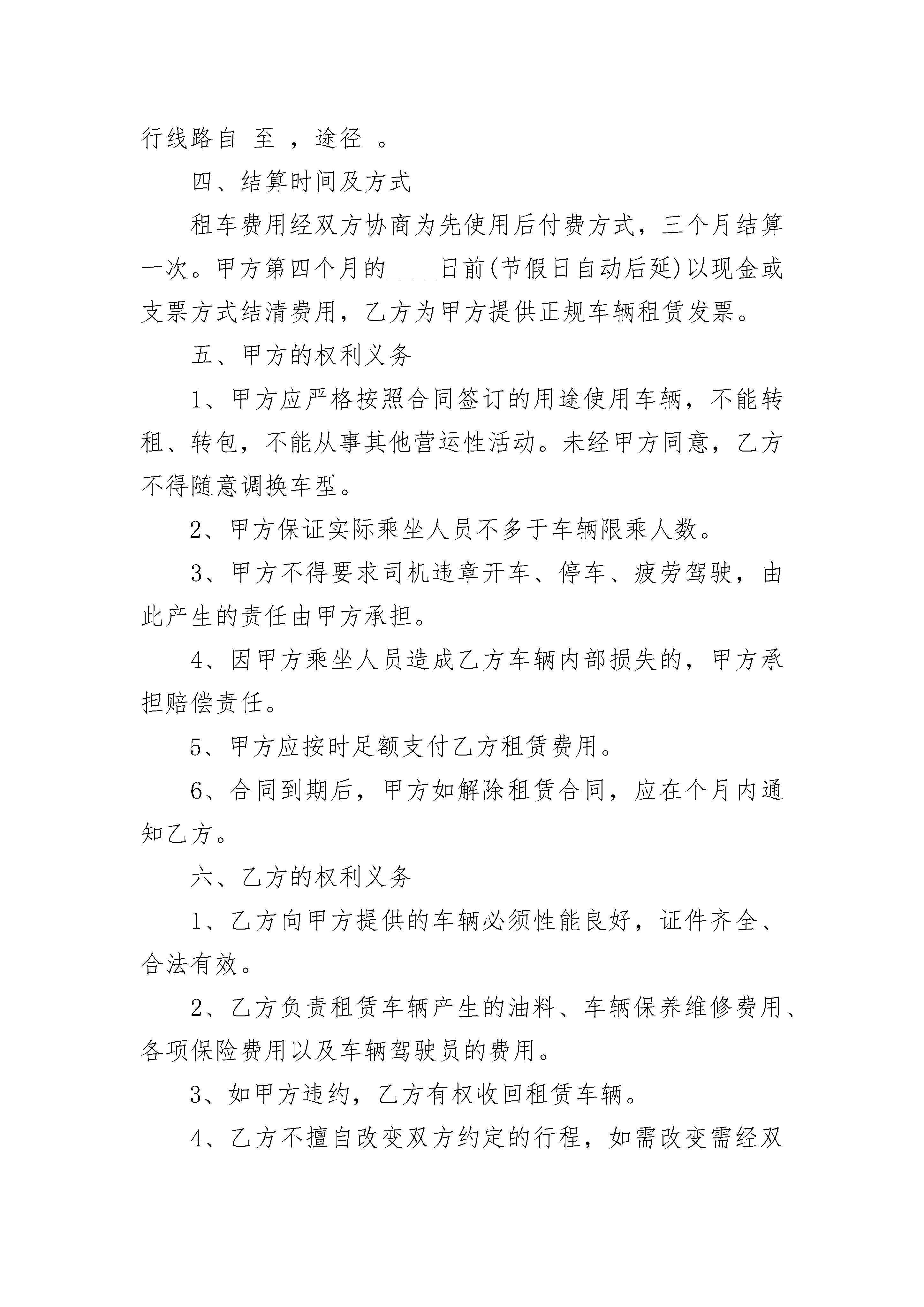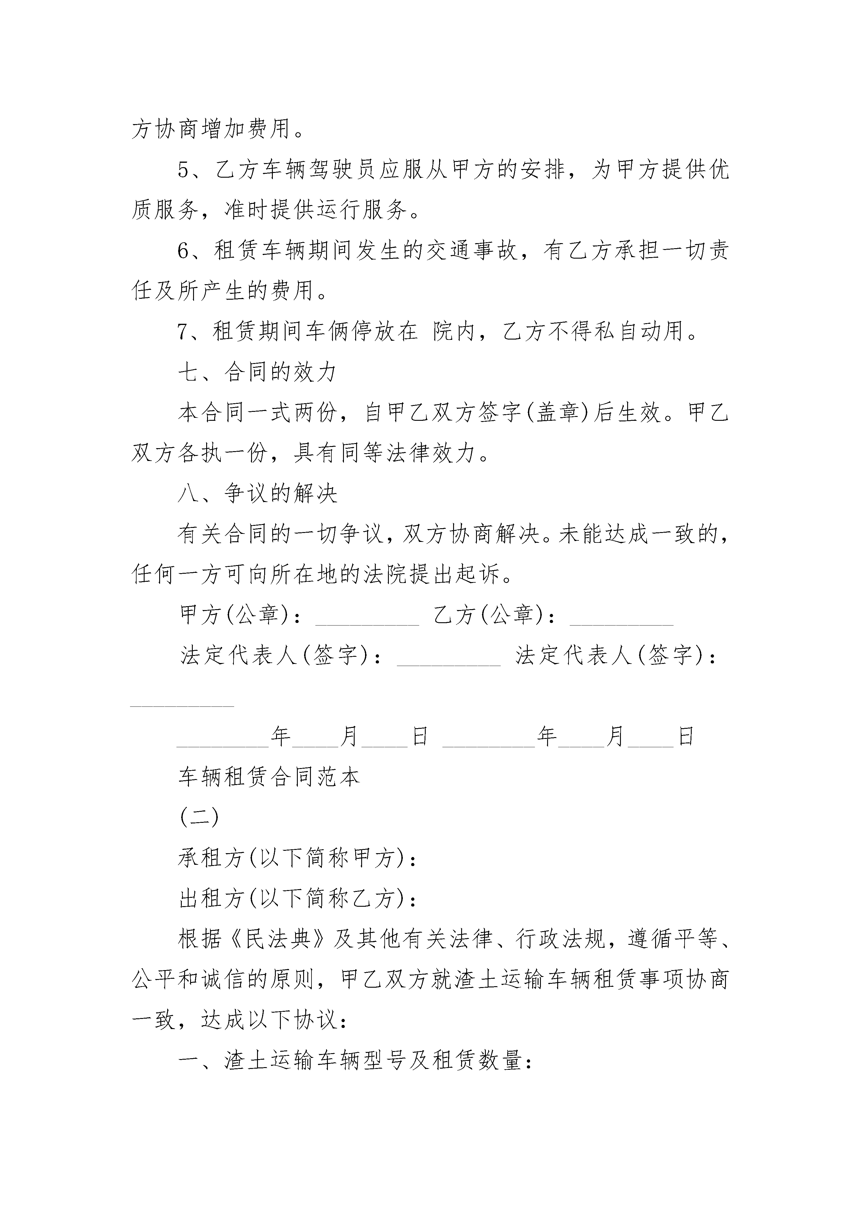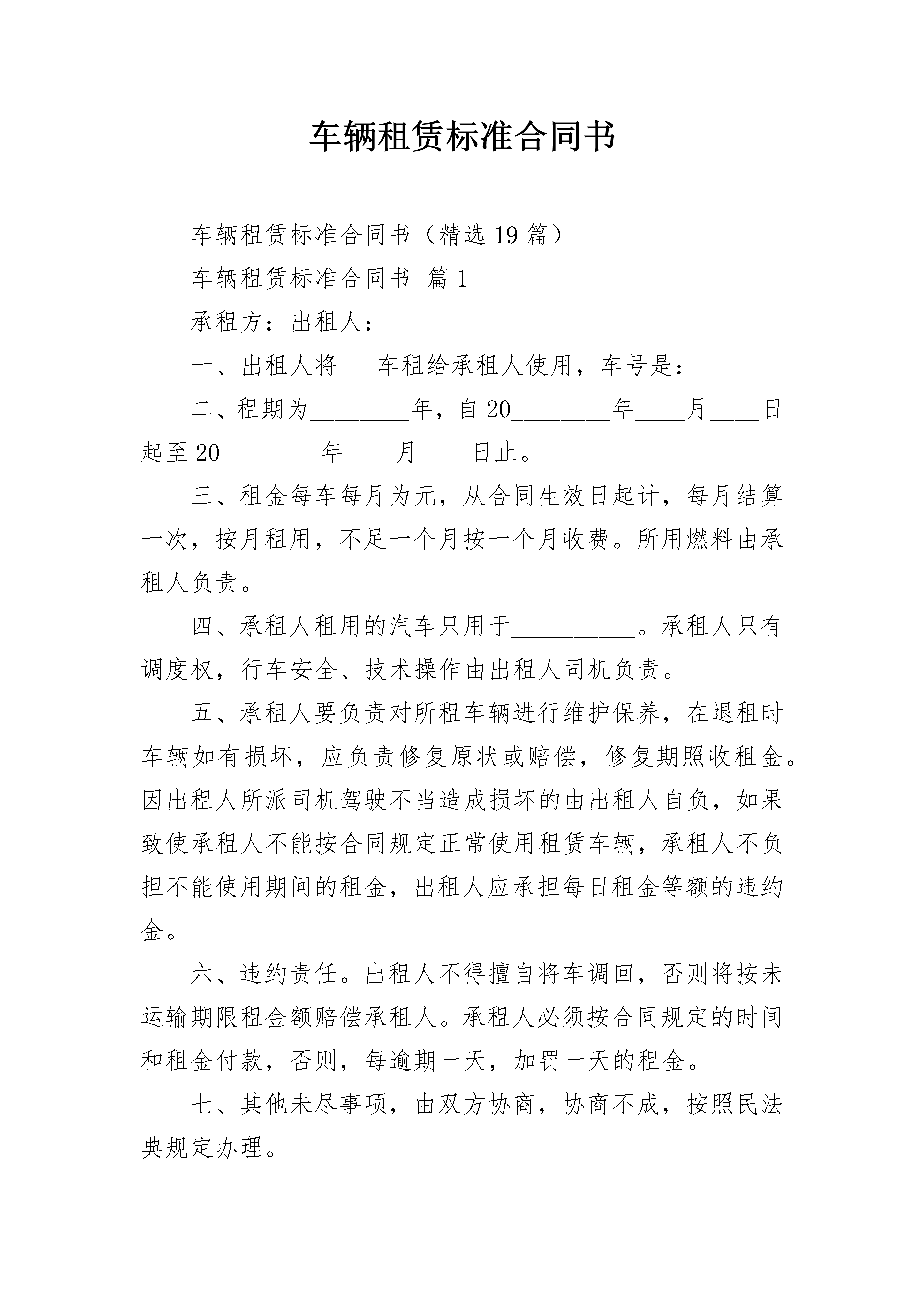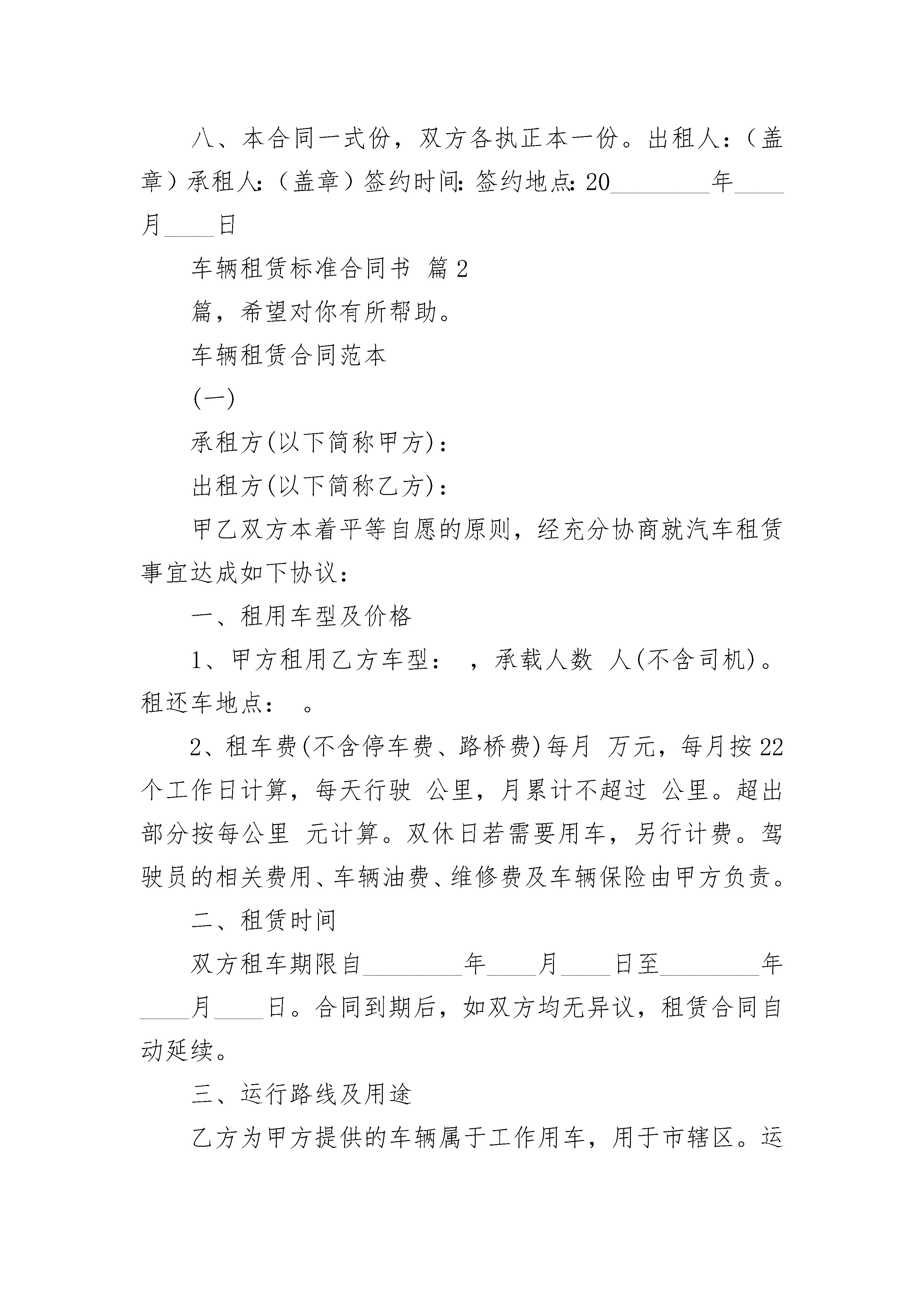 车辆租赁标准合同书车辆租赁标准合同书(精选19篇)车辆租赁标准合同书篇1承租方:出租人:一、出租人将___车租给承租人使用,车号是:二、租期为________年,自20________年____月____日起至20________年____月____日止。三、租金每车每月为元,从合同生效日起计,每月结算一次,按月租用,不足一个月按一个月收费。所用燃料由承租人负责。四、承租人租用的汽车只用于__________。承租人只有调度权,行车安全、技术操作由出租人司机负责。五、承租人要负责对所租车辆进行维护保养,在退租时车辆如有损坏,应负责修复原状或赔偿,修复期照收租金。因出租人所派司机驾驶不当造成损坏的由出租人自负,如果致使承租人不能按合同规定正常使用租赁车辆,承租人不负担不能使用期间的租金,出租人应承担每日租金等额的违约金。六、违约责任。出租人不得擅自将车调回,否则将按未运输期限租金额赔偿承租人。承租人必须按合同规定的时间和租金付款,否则,每逾期一天,加罚一天的租金。七、其他未尽事项,由双方协商,协商不成,按照民法典规定办理。八、本合同一式份,双方各执正本一份。出租人:(盖章)承租人:(盖章)签约时间:签约地点:20________年____月____日车辆租赁标准合同书篇2篇,希望对你有所帮助。车辆租赁合同范本(一)承租方(以下简称甲方):出租方(以下简称乙方):甲乙双方本着平等自愿的原则,经充分协商就汽车租赁事宜达成如下协议:一、租用车型及价格1、甲方租用乙方车型:,承载人数人(不含司机)。租还车地点:。2、租车费(不含停车费、路桥费)每月万元,每月按22个工作日计算,每天行驶公里,月累计不超过公里。超出部分按每公里元计算。双休日若需要用车,另行计费。驾驶员的相关费用、车辆油费、维修费及车辆保险由甲方负责。二、租赁时间双方租车期限自________年____月____日至________年____月____日。合同到期后,如双方均无异议,租赁合同自动延续。三、运行路线及用途乙方为甲方提供的车辆属于工作用车,用于市辖区。运行线路自至,途径。四、结算时间及方式租车费用经双方协商为先使用后付费方式,三个月结算一次。甲方第四个月的____日前(节假日自动后延)以现金或支票方式结清费用,乙方为甲方提供正规车辆租赁发票。五、甲方的权利义务1、甲方应严格按照合同签订的用途使用车辆,不能转租、转包,不能从事其他营运性活动。未经甲方同意,乙方不得随意调换车型。2、甲方保证实际乘坐人员不多于车辆限乘人数。3、甲方不得要求司机违章开车、停车、疲劳驾驶,由此产生的责任由甲方承担。4、因甲方乘坐人员造成乙方车辆内部损失的,甲方承担赔偿责任。5、甲方应按时足额支付乙方租赁费用。6、合同到期后,甲方如解除租赁合同,应在个月内通知乙方。六、乙方的权利义务1、乙方向甲方提供的车辆必须性能良好,证件齐全、合法有效。2、乙方负责租赁车辆产生的油料、车辆保养维修费用、各项保险费用以及车辆驾驶员的费用。3、如甲方违约,乙方有权收回租赁车辆。4、乙方不擅自改变双方约定的行程,如需改变需经双方协商增加费用。5、乙方车辆驾驶员应服从甲方的安排,为甲方提供优质服务,准时提供运行服务。6、租赁车辆期间发生的交通事故,有乙方承担一切责任及所产生的费用。7、租赁期间车俩停放在院内,乙方不得私自动用。七、合同的效力本合同一式两份,自甲乙双方签字(盖章)后生效。甲乙双方各执一份,具有同等法律效力。八、争议的解决有关合同的一切争议,双方协商解决。未能达成一致的,任何一方可向所在地的法院提出起诉。甲方(公章):_________乙方(公章):_________法定代表人(签字):_________法定代表人(签字):_________________年____月____日________年____月____日车辆租赁合同范本(二)承租方(以下简称甲方):出租方(以下简称乙方):根据《民法典》及其他有关法律、行政法规,遵循平等、公平和诚信的原则,甲乙双方就渣土运输车辆租赁事项协商一致,达成以下协议:一、渣土运输车辆型号及租赁数量:封闭式渣土运输车辆。二、租赁方式:甲乙双方商定以月租方式租赁。三、租赁单价:每台元月四、结算方式:租用期为两个月,超出的时间不满一个月,按月租单价除以30天为单价计算。五、工作时间:每天工作时间为12个小时,如超出时间,双方再具体商议。六、付款方式:甲方每月支付乙方90%的车辆租赁费,租赁期满后十天内结清尾款。七、租赁时间:经甲方通知进出场时间为准。八、其他事项:1、渣土运输车辆在租赁期间的燃油费由甲方负责;2、渣土运输车辆的维修费、司机工资、生活费及声音操作损失由乙方负责;3、甲乙双方约定每台运输车辆每月有两天的维修保养时间;4、乙方必须听从甲方现场管理人员及技