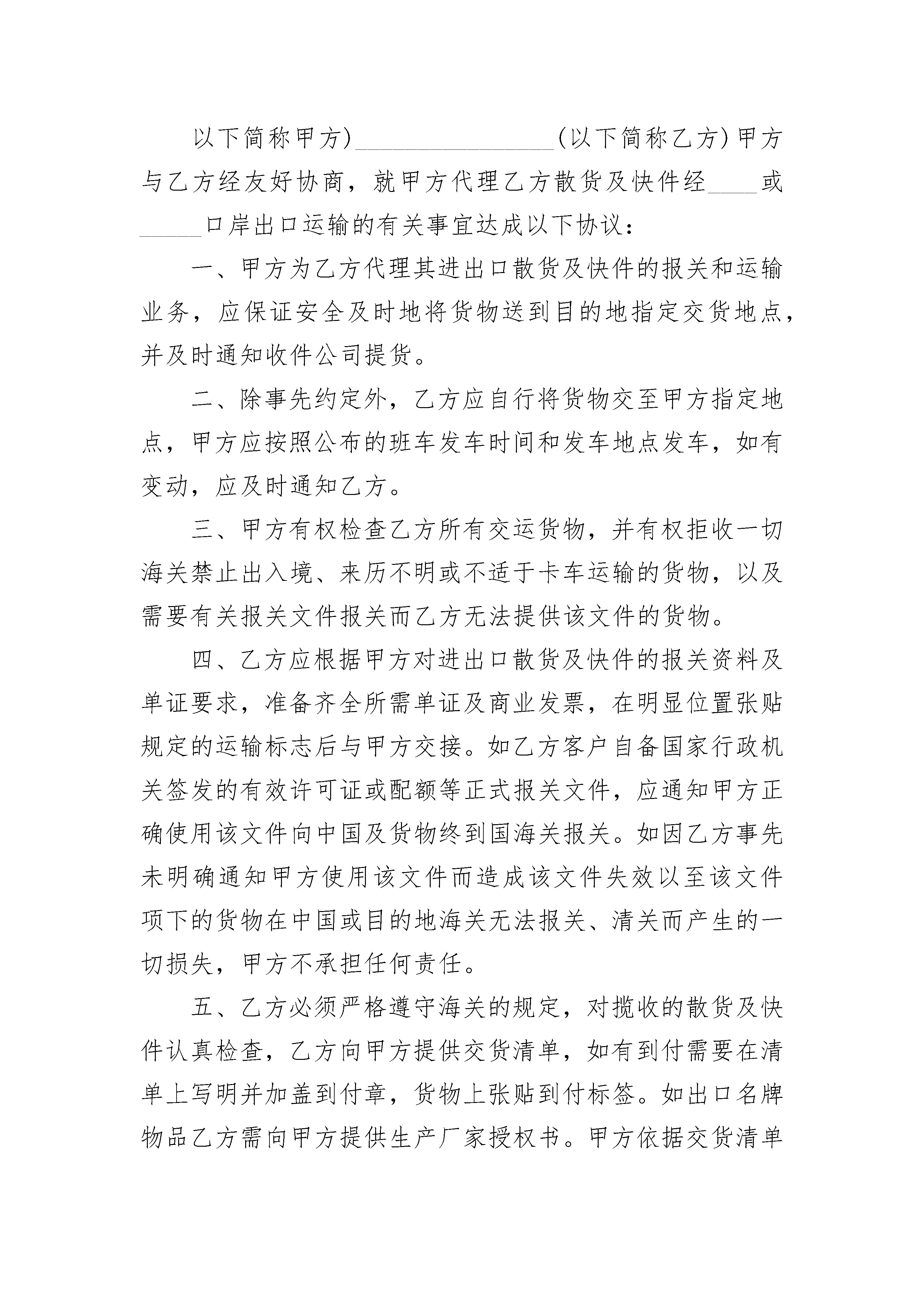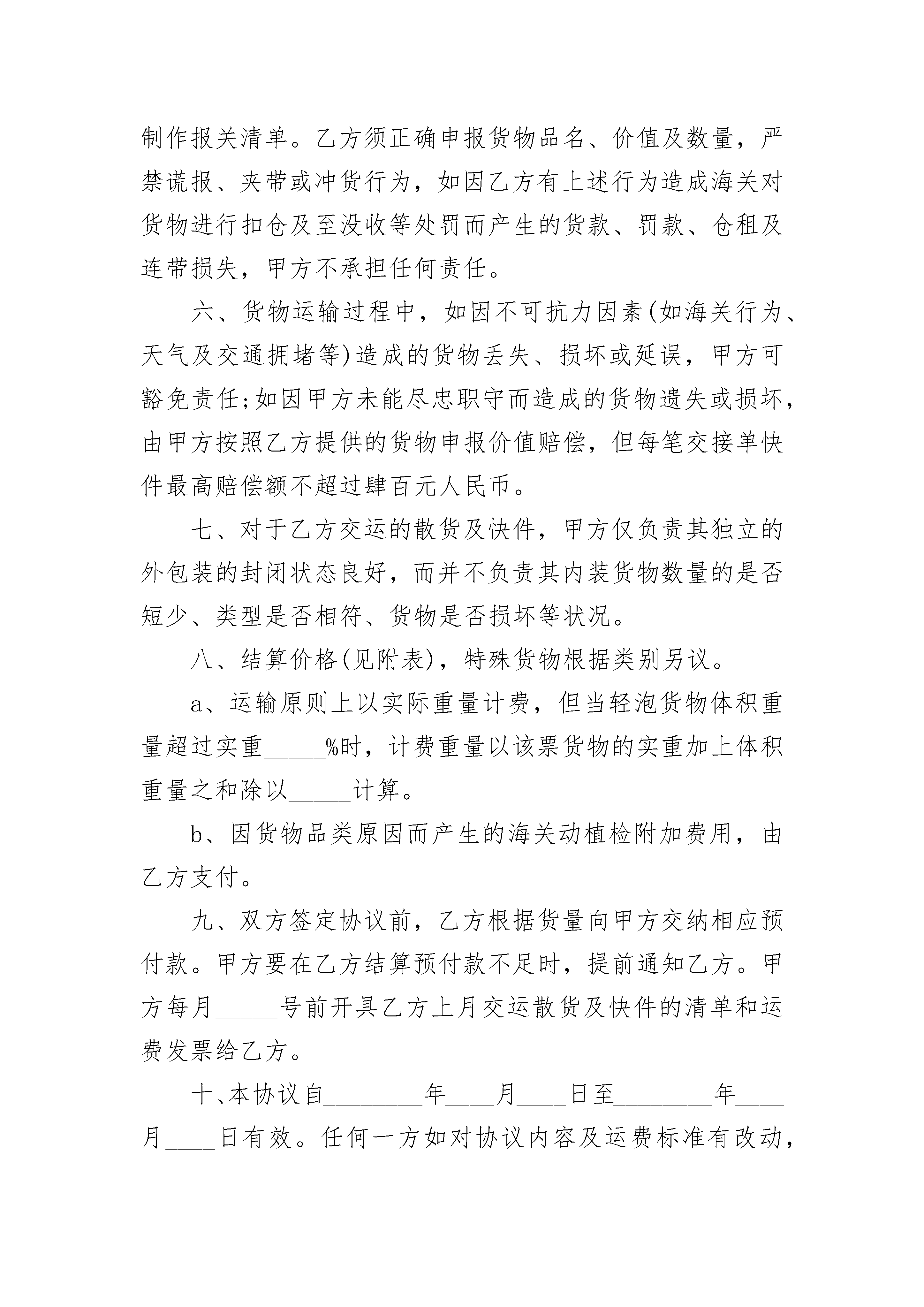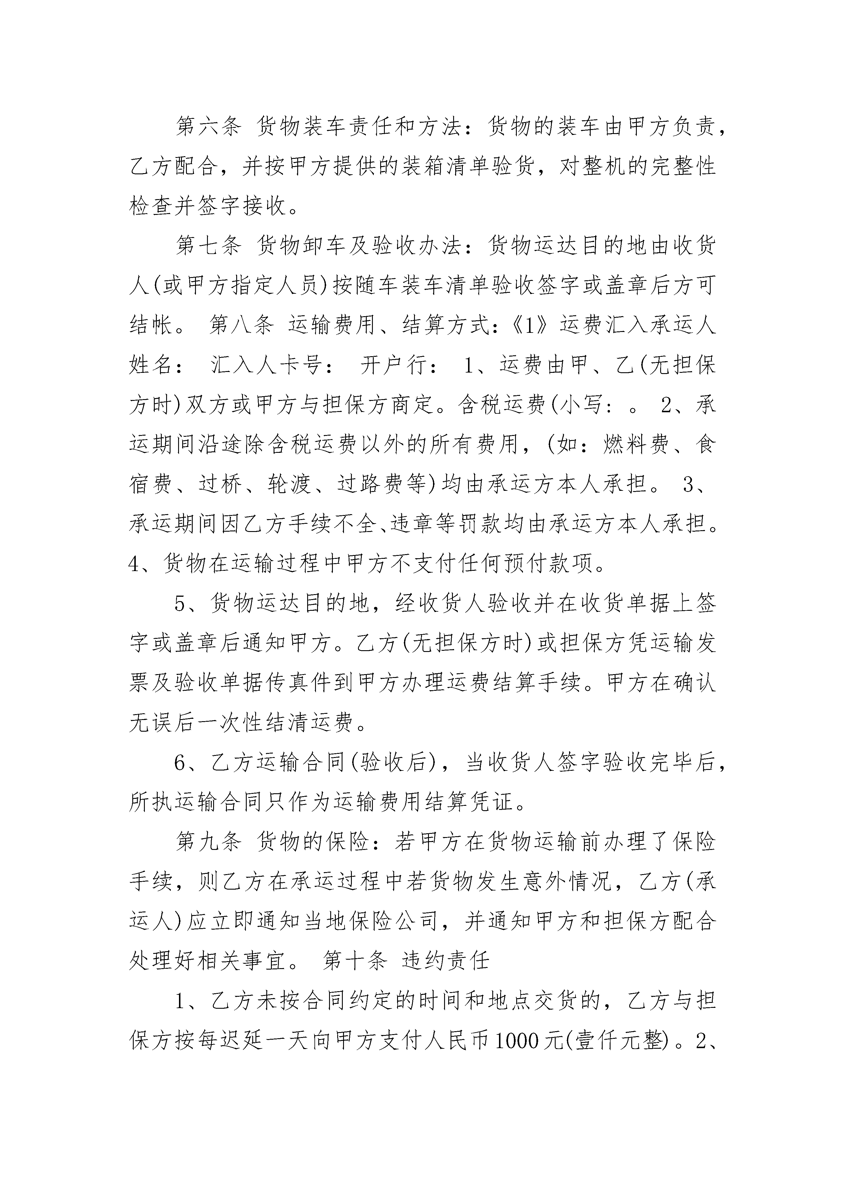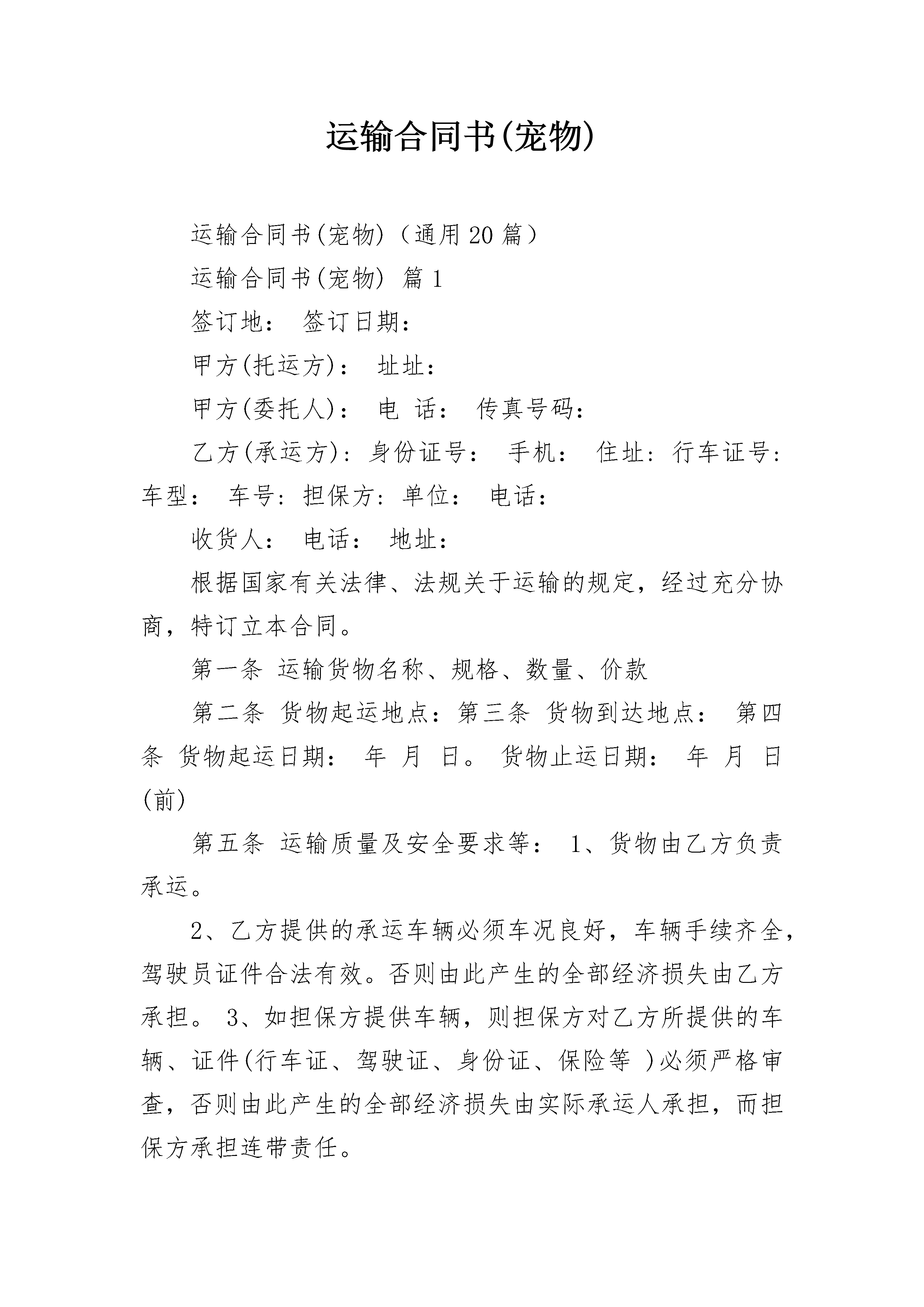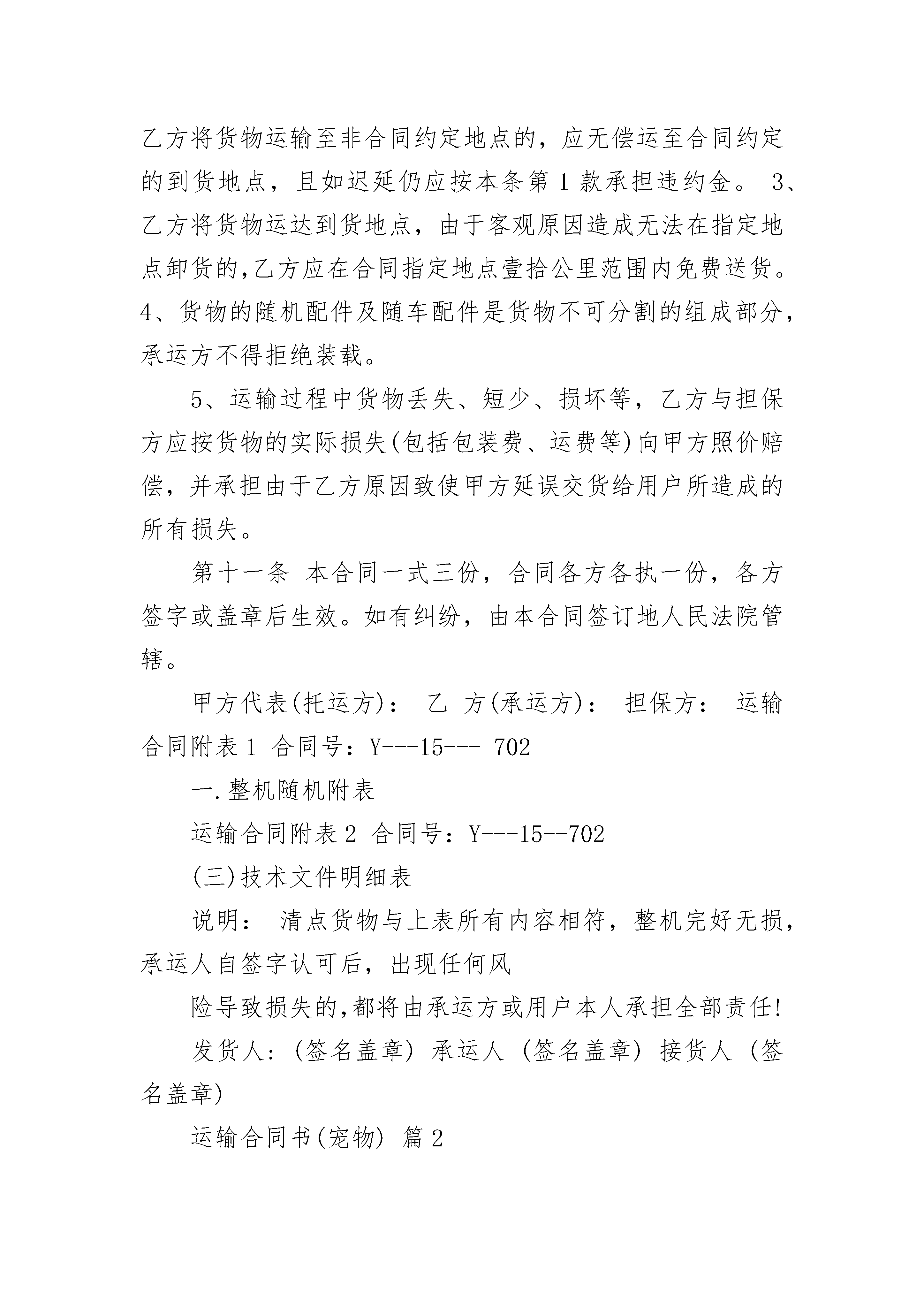 运输合同书(宠物)运输合同书(宠物)(通用20篇)运输合同书(宠物)篇1签订地:签订日期:甲方(托运方):址址:甲方(委托人):电话:传真号码:乙方(承运方):身份证号:手机:住址:行车证号:车型:车号:担保方:单位:电话:收货人:电话:地址:根据国家有关法律、法规关于运输的规定,经过充分协商,特订立本合同。第一条运输货物名称、规格、数量、价款第二条货物起运地点:第三条货物到达地点:第四条货物起运日期:年月日。货物止运日期:年月日(前)第五条运输质量及安全要求等:1、货物由乙方负责承运。2、乙方提供的承运车辆必须车况良好,车辆手续齐全,驾驶员证件合法有效。否则由此产生的全部经济损失由乙方承担。3、如担保方提供车辆,则担保方对乙方所提供的车辆、证件(行车证、驾驶证、身份证、保险等)必须严格审查,否则由此产生的全部经济损失由实际承运人承担,而担保方承担连带责任。第六条货物装车责任和方法:货物的装车由甲方负责,乙方配合,并按甲方提供的装箱清单验货,对整机的完整性检查并签字接收。第七条货物卸车及验收办法:货物运达目的地由收货人(或甲方指定人员)按随车装车清单验收签字或盖章后方可结帐。第八条运输费用、结算方式:《1》运费汇入承运人姓名:汇入人卡号:开户行:1、运费由甲、乙(无担保方时)双方或甲方与担保方商定。含税运费(小写:。2、承运期间沿途除含税运费以外的所有费用,(如:燃料费、食宿费、过桥、轮渡、过路费等)均由承运方本人承担。3、承运期间因乙方手续不全、违章等罚款均由承运方本人承担。4、货物在运输过程中甲方不支付任何预付款项。5、货物运达目的地,经收货人验收并在收货单据上签字或盖章后通知甲方。乙方(无担保方时)或担保方凭运输发票及验收单据传真件到甲方办理运费结算手续。甲方在确认无误后一次性结清运费。6、乙方运输合同(验收后),当收货人签字验收完毕后,所执运输合同只作为运输费用结算凭证。第九条货物的保险:若甲方在货物运输前办理了保险手续,则乙方在承运过程中若货物发生意外情况,乙方(承运人)应立即通知当地保险公司,并通知甲方和担保方配合处理好相关事宜。第十条违约责任1、乙方未按合同约定的时间和地点交货的,乙方与担保方按每迟延一天向甲方支付人民币1000元(壹仟元整)。2、乙方将货物运输至非合同约定地点的,应无偿运至合同约定的到货地点,且如迟延仍应按本条第1款承担违约金。3、乙方将货物运达到货地点,由于客观原因造成无法在指定地点卸货的,乙方应在合同指定地点壹拾公里范围内免费送货。4、货物的随机配件及随车配件是货物不可分割的组成部分,承运方不得拒绝装载。5、运输过程中货物丢失、短少、损坏等,乙方与担保方应按货物的实际损失(包括包装费、运费等)向甲方照价赔偿,并承担由于乙方原因致使甲方延误交货给用户所造成的所有损失。第十一条本合同一式三份,合同各方各执一份,各方签字或盖章后生效。如有纠纷,由本合同签订地人民法院管辖。甲方代表(托运方):乙方(承运方):担保方:运输合同附表1合同号:Y---15---702一.整机随机附表运输合同附表2合同号:Y---15--702(三)技术文件明细表说明:清点货物与上表所有内容相符,整机完好无损,承运人自签字认可后,出现任何风险导致损失的,都将由承运方或用户本人承担全部责任!发货人:(签名盖章)承运人(签名盖章)接货人(签名盖章)运输合同书(宠物)篇2以下简称甲方)________________(以下简称乙方)甲方与乙方经友好协商,就甲方代理乙方散货及快件经____或_____口岸出口运输的有关事宜达成以下协议:一、甲方为乙方代理其进出口散货及快件的报关和运输业务,应保证安全及时地将货物送到目的地指定交货地点,并及时通知收件公司提货。二、除事先约定外,乙方应自行将货物交至甲方指定地点,甲方应按照公布的班车发车时间和发车地点发车,如有变动,应及时通知乙方。三、甲方有权检查乙方所有交运货物,并有权拒收一切海关禁止出入境、来历不明或不适于卡车运输的货物,以及需要有关报关文件报关而乙方无法提供该文件的货物。四、乙方应根据甲方对进出口散货及快件的报关资料及单证要求,准备齐全所需单证及商业发票,在明显位置张贴规定的运输标志后与甲方交接。如乙方客户自备国家行政机关签发的有效许可证或配额等正式报关文件,应通知甲方正确使用该文件向中国及货物终到国海关报关。如因乙方事先未明确通知甲方使用该文件而造成该文件失效以至该文件项下的货物在中国或目的地海关无法报关、清关而产生的一切损失,甲方不承担任何责任。五、乙方必须严格遵守海关的规定,对揽收的散货及快件认真检查,乙方向甲方提供交货清单,如有到付需要在清单上写明并加盖到付章,货物上张贴到付标签。如出口名牌物品乙方需向甲方提供生产厂家授权书。甲方依据交货清单制作报关清单。乙方须正确申