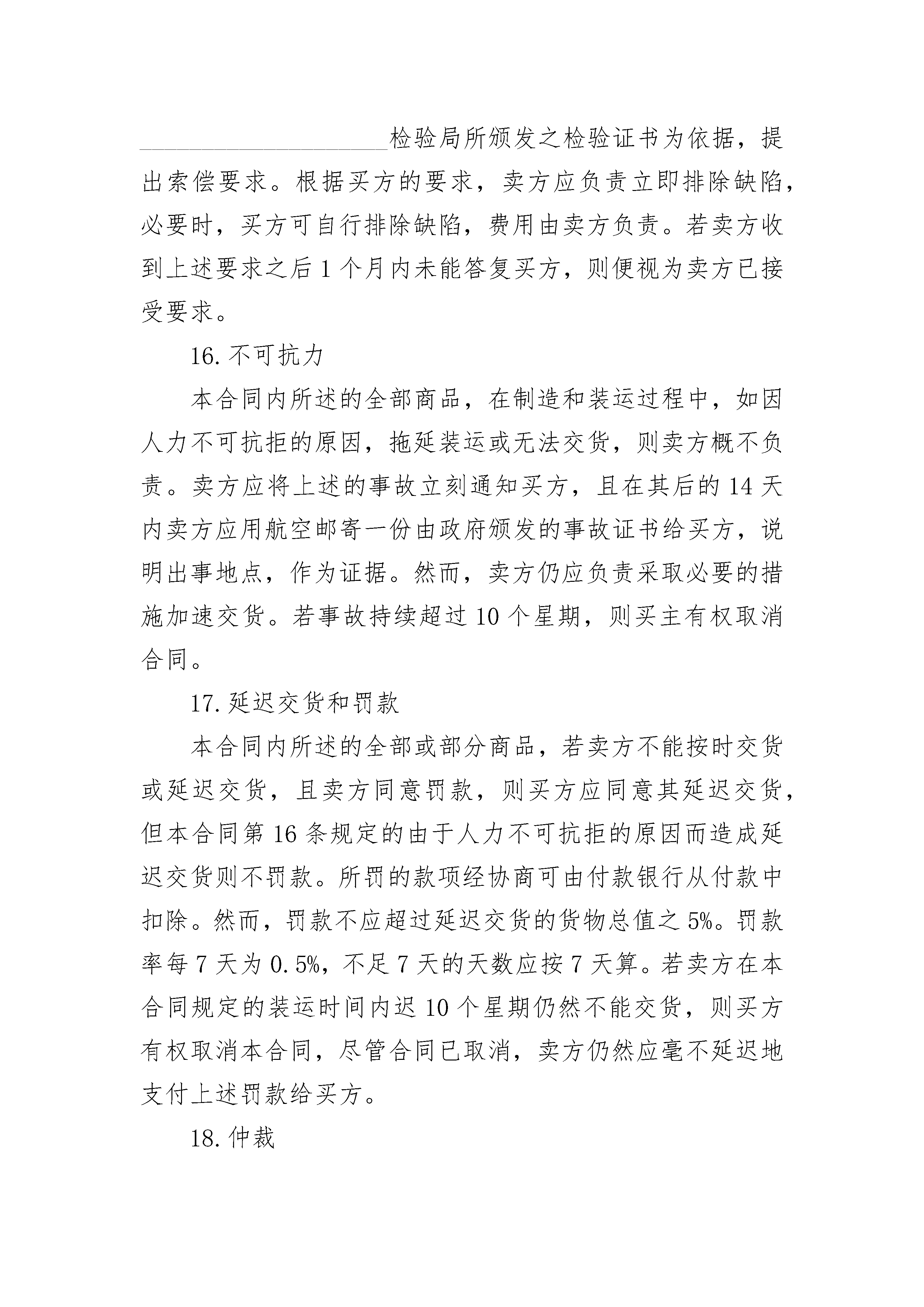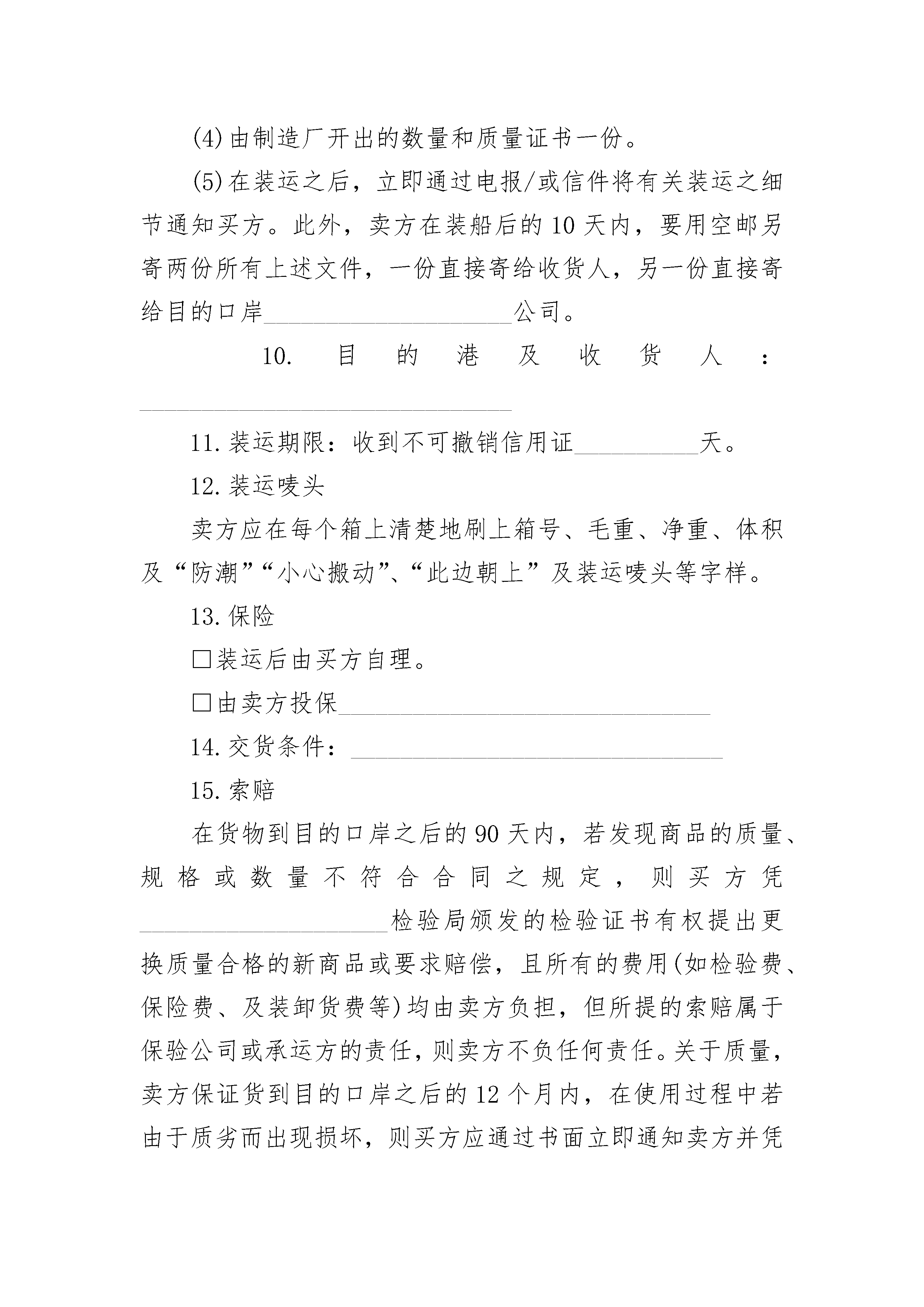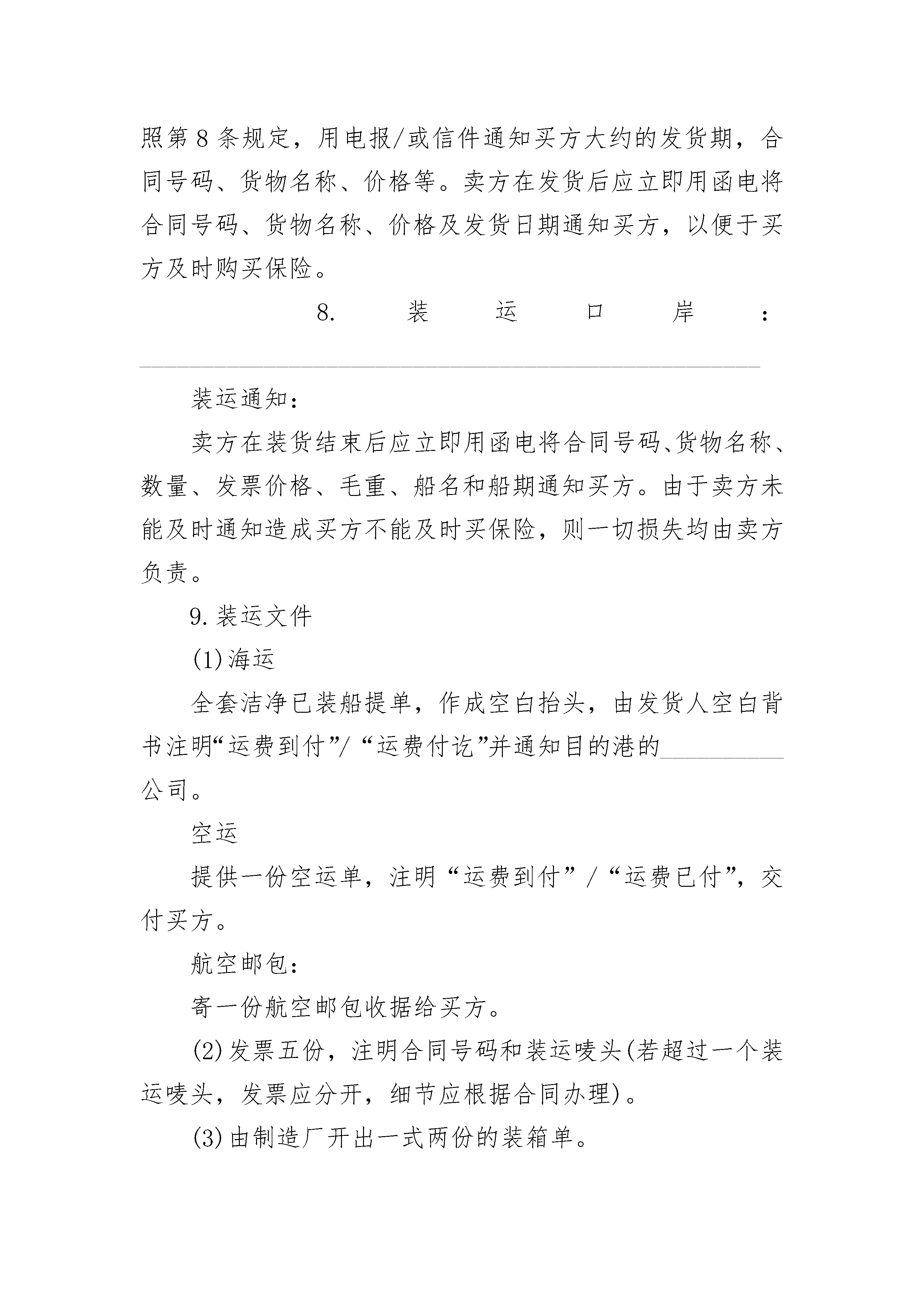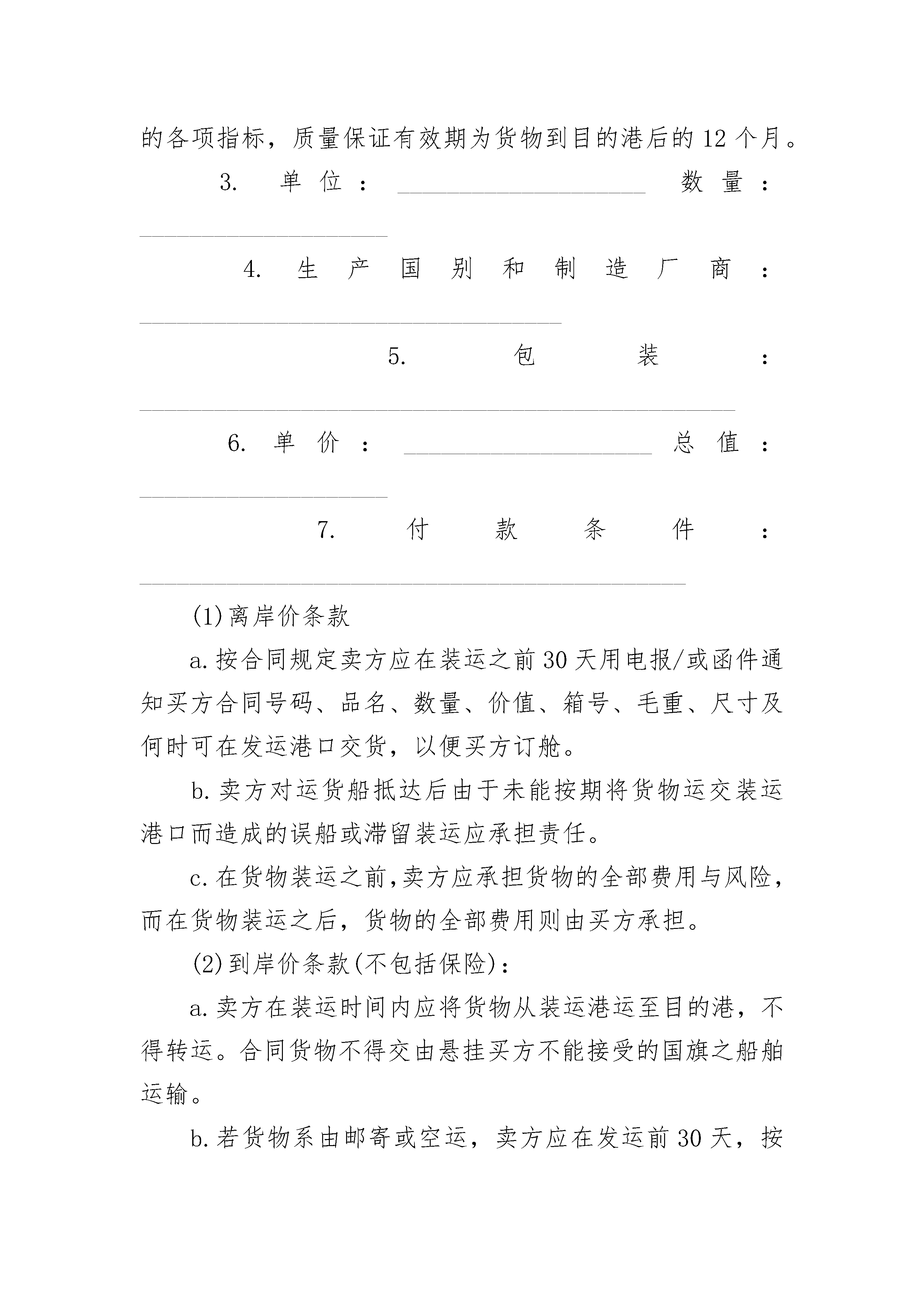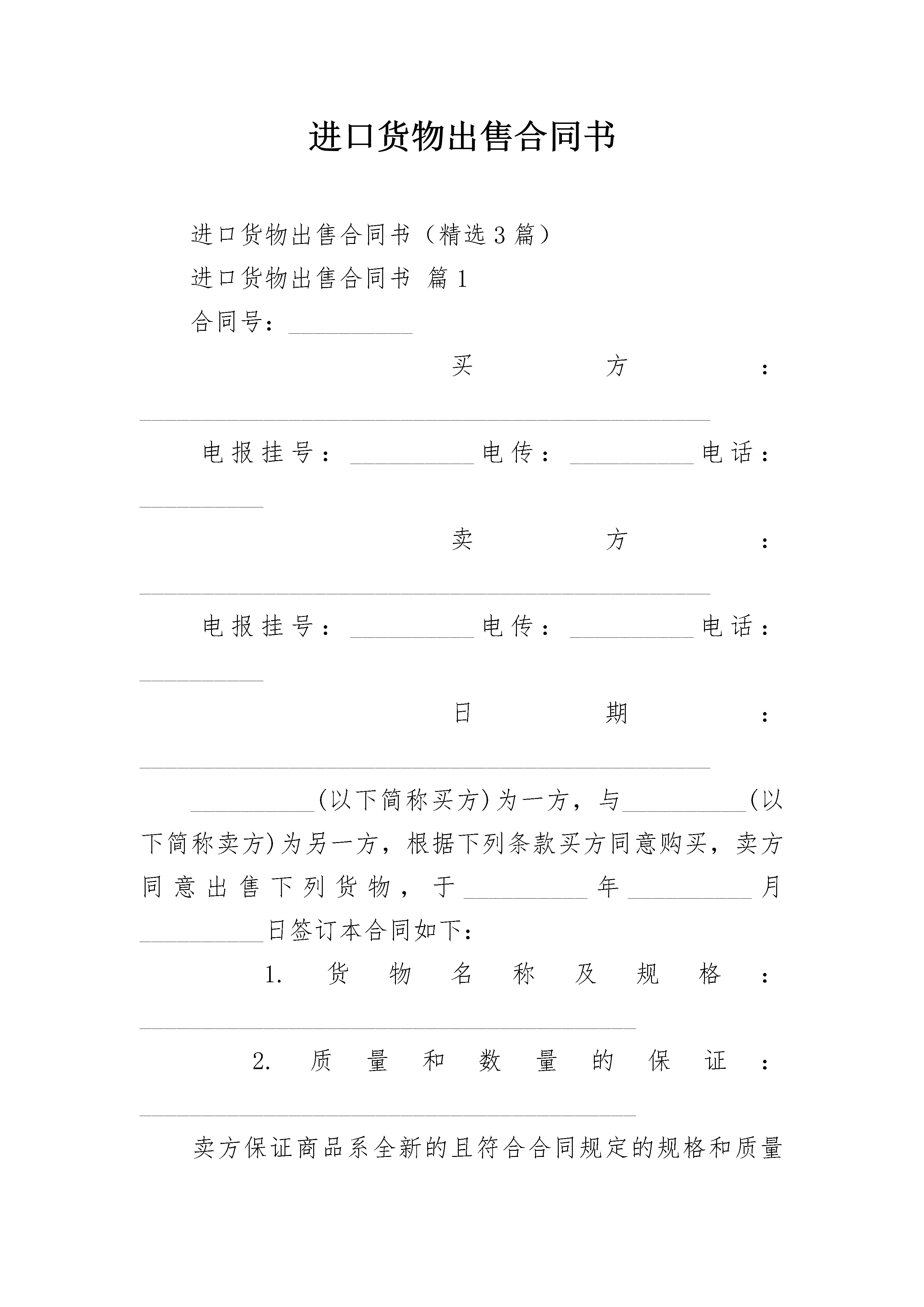 进口货物出售合同书进口货物出售合同书(精选3篇)进口货物出售合同书篇1合同号:__________买方:______________________________________________电报挂号:__________电传:__________电话:__________卖方:______________________________________________电报挂号:__________电传:__________电话:__________日期:________________________________________________________(以下简称买方)为一方,与__________(以下简称卖方)为另一方,根据下列条款买方同意购买,卖方同意出售下列货物,于__________年__________月__________日签订本合同如下:1.货物名称及规格:________________________________________2.质量和数量的保证:________________________________________卖方保证商品系全新的且符合合同规定的规格和质量的各项指标,质量保证有效期为货物到目的港后的12个月。3.单位:____________________数量:____________________4.生产国别和制造厂商:__________________________________5.包装:________________________________________________6.单价:____________________总值:____________________7.付款条件:____________________________________________(1)离岸价条款a.按合同规定卖方应在装运之前30天用电报/或函件通知买方合同号码、品名、数量、价值、箱号、毛重、尺寸及何时可在发运港口交货,以便买方订舱。b.卖方对运货船抵达后由于未能按期将货物运交装运港口而造成的误船或滞留装运应承担责任。c.在货物装运之前,卖方应承担货物的全部费用与风险,而在货物装运之后,货物的全部费用则由买方承担。(2)到岸价条款(不包括保险):a.卖方在装运时间内应将货物从装运港运至目的港,不得转运。合同货物不得交由悬挂买方不能接受的国旗之船舶运输。b.若货物系由邮寄或空运,卖方应在发运前30天,按照第8条规定,用电报/或信件通知买方大约的发货期,合同号码、货物名称、价格等。卖方在发货后应立即用函电将合同号码、货物名称、价格及发货日期通知买方,以便于买方及时购买保险。8.装运口岸:__________________________________________________装运通知:卖方在装货结束后应立即用函电将合同号码、货物名称、数量、发票价格、毛重、船名和船期通知买方。由于卖方未能及时通知造成买方不能及时买保险,则一切损失均由卖方负责。9.装运文件(1)海运全套洁净已装船提单,作成空白抬头,由发货人空白背书注明“运费到付”/“运费付讫”并通知目的港的__________公司。空运提供一份空运单,注明“运费到付”/“运费已付”,交付买方。航空邮包:寄一份航空邮包收据给买方。(2)发票五份,注明合同号码和装运唛头(若超过一个装运唛头,发票应分开,细节应根据合同办理)。(3)由制造厂开出一式两份的装箱单。(4)由制造厂开出的数量和质量证书一份。(5)在装运之后,立即通过电报/或信件将有关装运之细节通知买方。此外,卖方在装船后的10天内,要用空邮另寄两份所有上述文件,一份直接寄给收货人,另一份直接寄给目的口岸____________________公司。10.目的港及收货人:______________________________11.装运期限:收到不可撤销信用证__________天。12.装运唛头卖方应在每个箱上清楚地刷上箱号、毛重、净重、体积及“防潮”“小心搬动”、“此边朝上”及装运唛头等字样。13.保险□装运后由买方自理。□由卖方投保______________________________14.交货条件:______________________________15.索赔在货物到目的口岸之后的90天内,若发现商品的质量、规格或数量不符合合同之规定,则买方凭____________________检验局颁发的检验证书有权提出更换质量合格的新商品或要求赔偿,且所有的费用(如检验费、保险费、及装卸货费等)均由卖方负担,但所提的索赔属于保验公司或承运方的责任,则卖方不负任何责任。关于质量,卖方保证货到目的口岸之后的12个月内,在使用过程中若由