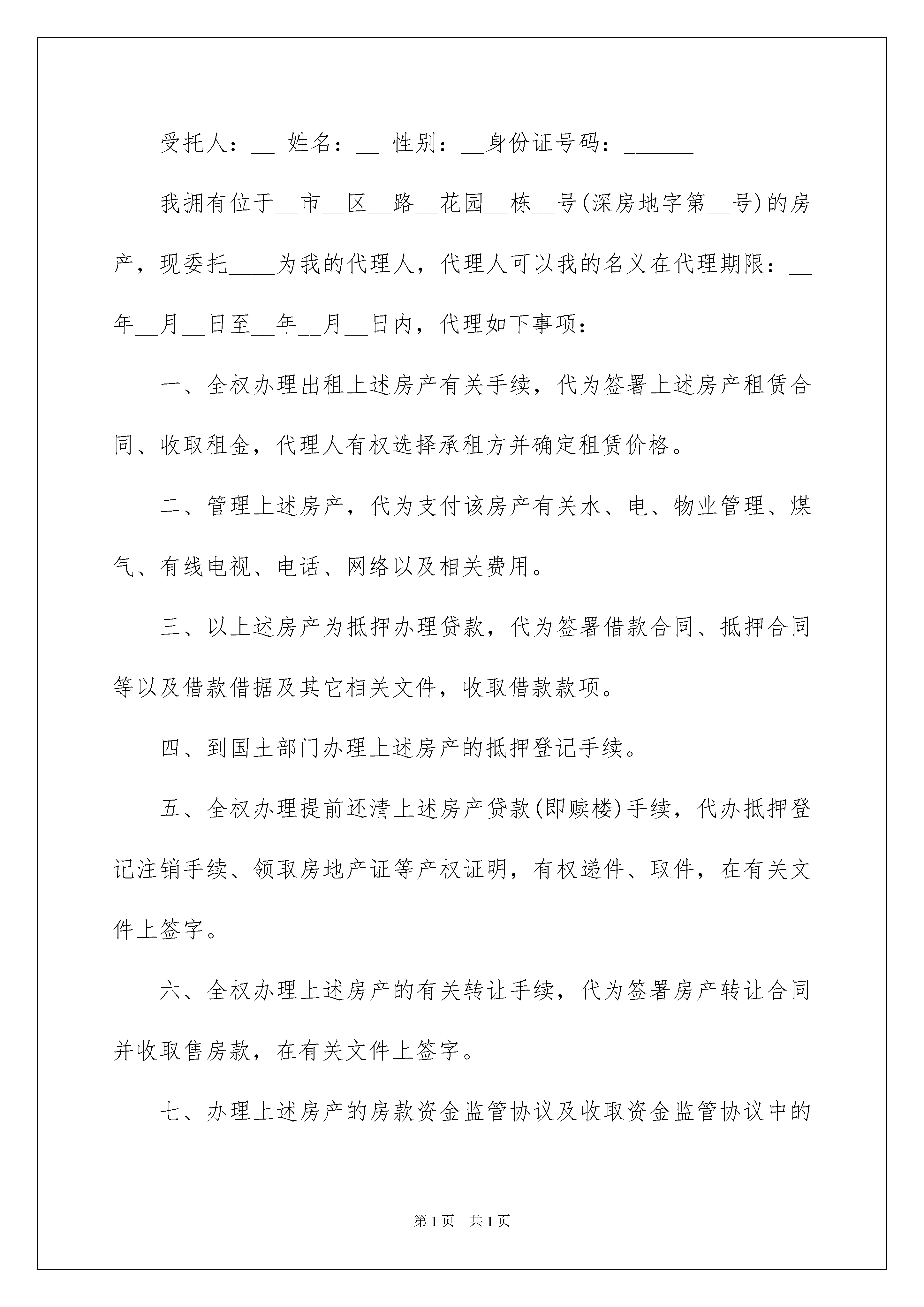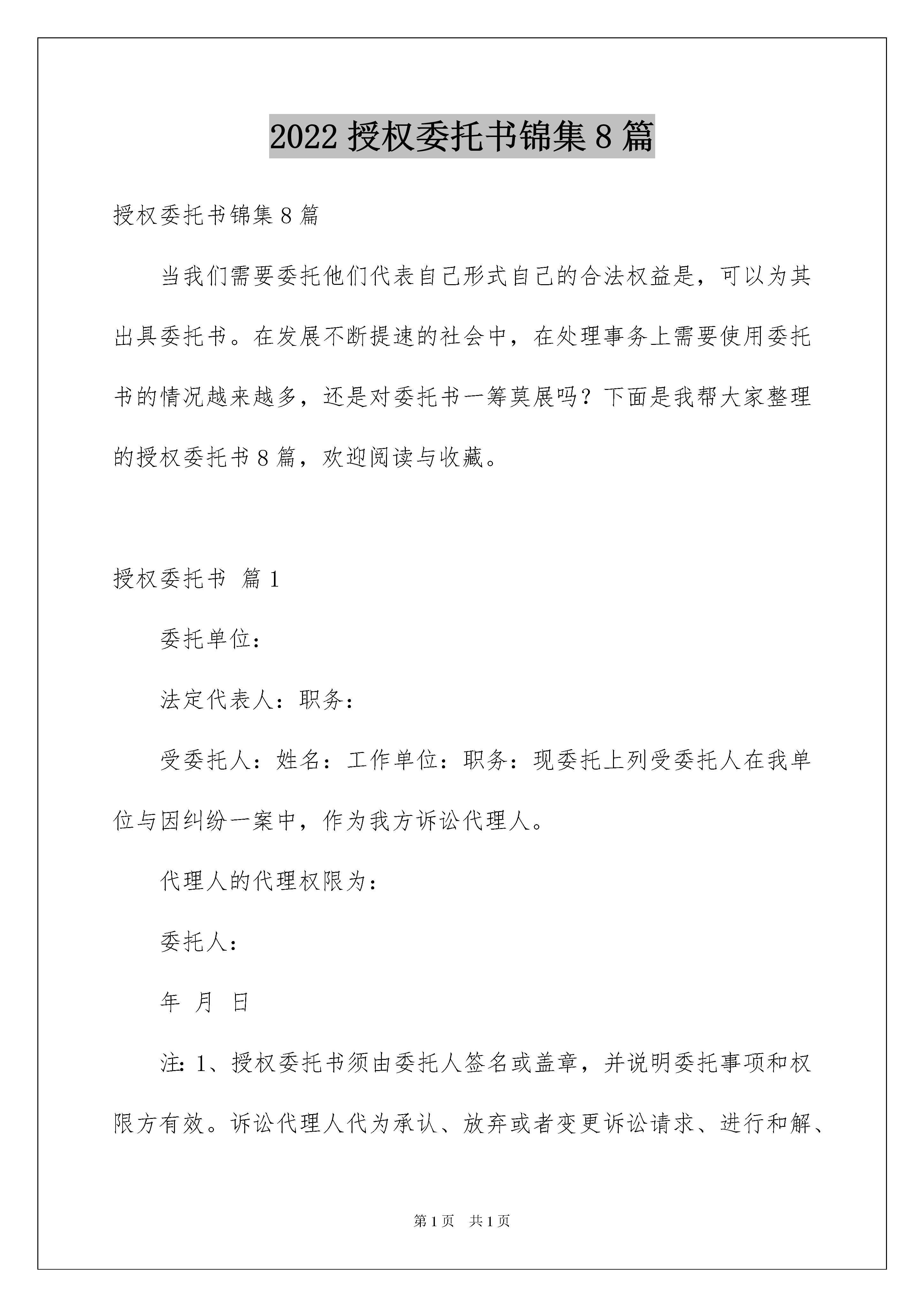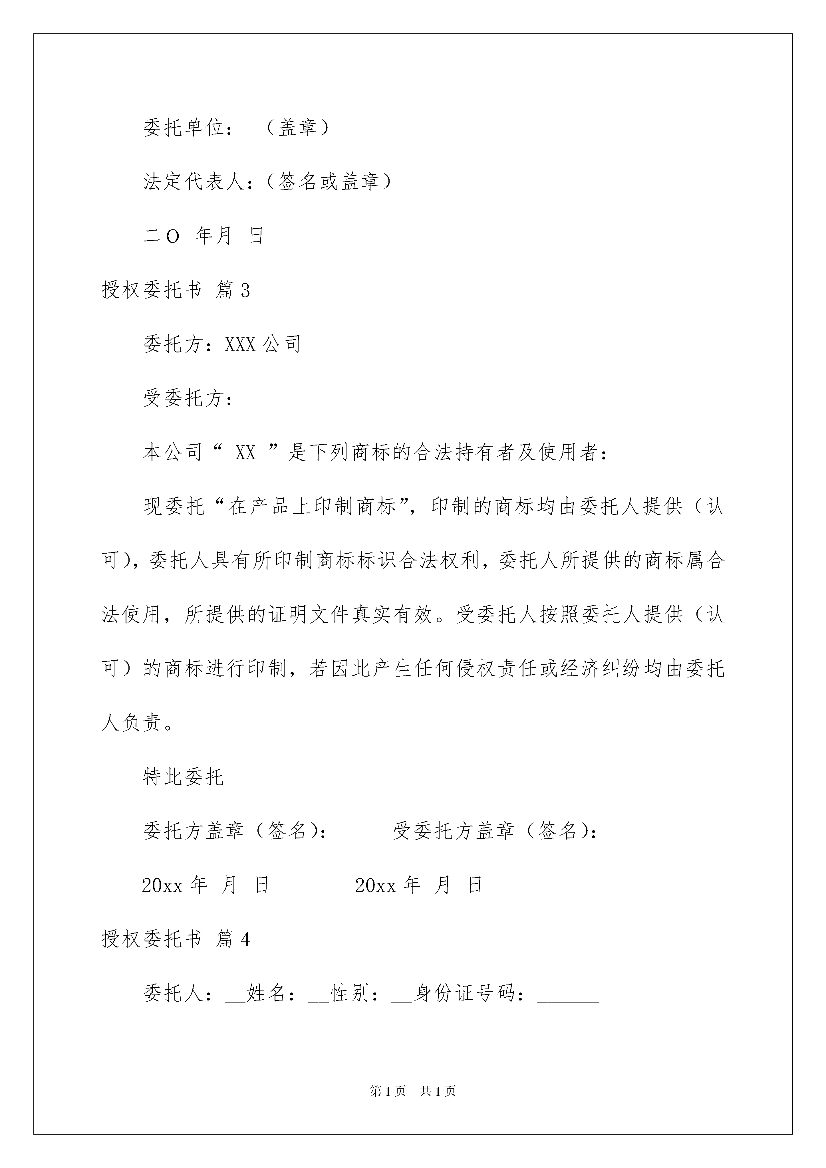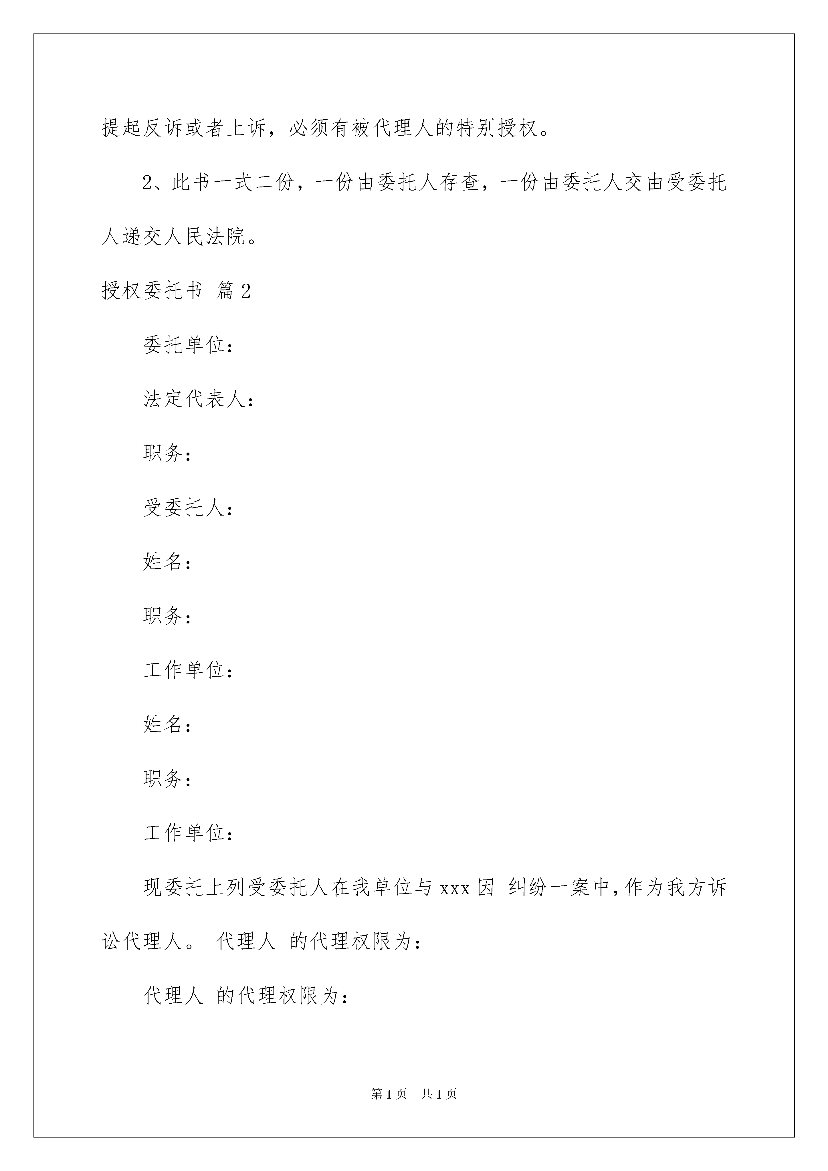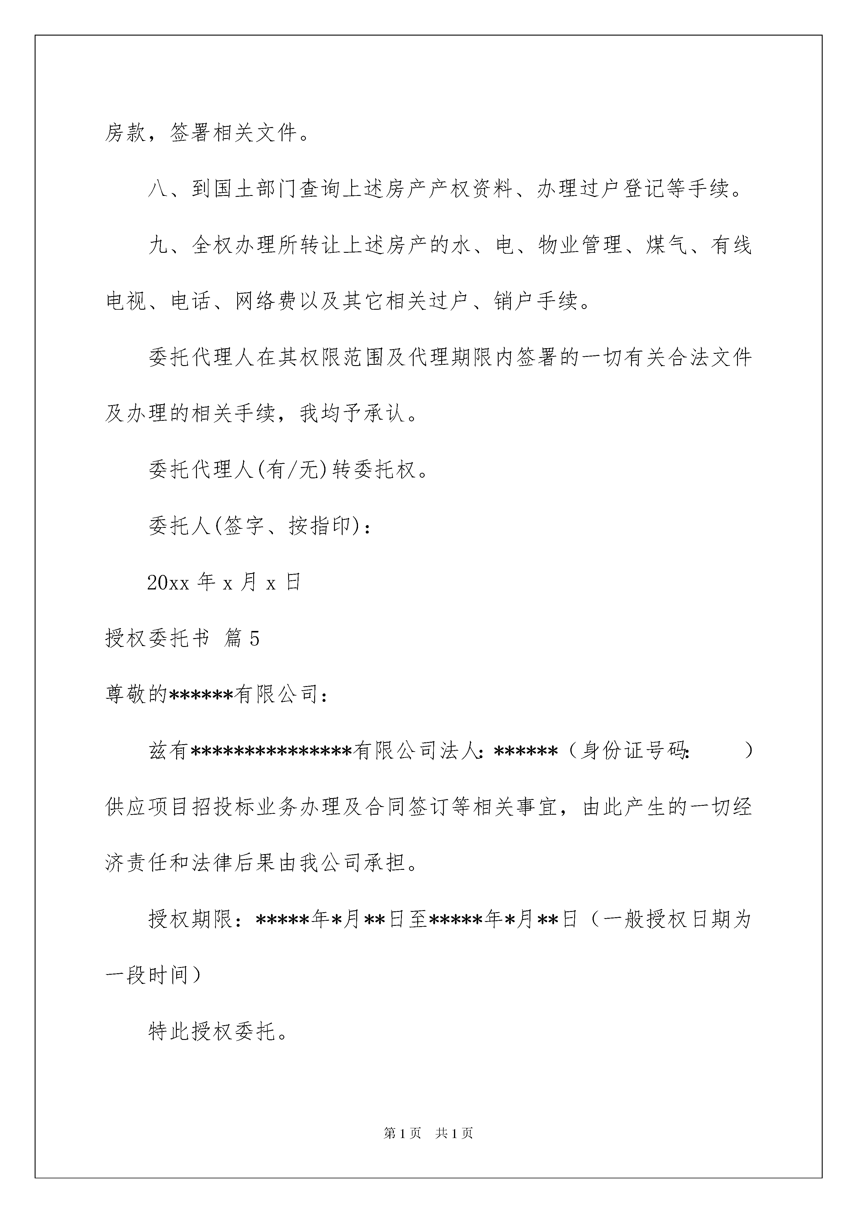 2022授权委托书锦集8篇授权委托书锦集8篇当我们需要委托他们代表自己形式自己的合法权益是,可以为其出具委托书。在发展不断提速的社会中,在处理事务上需要使用委托书的情况越来越多,还是对委托书一筹莫展吗?下面是我帮大家整理的授权委托书8篇,欢迎阅读与收藏。授权委托书篇1委托单位:法定代表人:职务:受委托人:姓名:工作单位:职务:现委托上列受委托人在我单位与因纠纷一案中,作为我方诉讼代理人。代理人的代理权限为:委托人:年月日注:1、授权委托书须由委托人签名或盖章,并说明委托事项和权限方有效。诉讼代理人代为承认、放弃或者变更诉讼请求、进行和解、提起反诉或者上诉,必须有被代理人的特别授权。2、此书一式二份,一份由委托人存查,一份由委托人交由受委托人递交人民法院。授权委托书篇2委托单位:法定代表人:职务:受委托人:姓名:职务:工作单位:姓名:职务:工作单位:现委托上列受委托人在我单位与xxx因纠纷一案中,作为我方诉讼代理人。代理人的代理权限为:代理人的代理权限为:委托单位:(盖章)法定代表人:(签名或盖章)二O年月日授权委托书篇3委托方:XXX公司受委托方:本公司“XX”是下列商标的合法持有者及使用者:现委托“在产品上印制商标”,印制的商标均由委托人提供(认可),委托人具有所印制商标标识合法权利,委托人所提供的商标属合法使用,所提供的证明文件真实有效。受委托人按照委托人提供(认可)的商标进行印制,若因此产生任何侵权责任或经济纠纷均由委托人负责。特此委托委托方盖章(签名):受委托方盖章(签名):20xx年月日20xx年月日授权委托书篇4委托人:__姓名:__性别:__身份证号码:______受托人:__姓名:__性别:__身份证号码:______我拥有位于__市__区__路__花园__栋__号(深房地字第__号)的房产,现委托____为我的代理人,代理人可以我的名义在代理期限:__年__月__日至__年__月__日内,代理如下事项:一、全权办理出租上述房产有关手续,代为签署上述房产租赁合同、收取租金,代理人有权选择承租方并确定租赁价格。二、管理上述房产,代为支付该房产有关水、电、物业管理、煤气、有线电视、电话、网络以及相关费用。三、以上述房产为抵押办理贷款,代为签署借款合同、抵押合同等以及借款借据及其它相关文件,收取借款款项。四、到国土部门办理上述房产的抵押登记手续。五、全权办理提前还清上述房产贷款(即赎楼)手续,代办抵押登记注销手续、领取房地产证等产权证明,有权递件、取件,在有关文件上签字。六、全权办理上述房产的有关转让手续,代为签署房产转让合同并收取售房款,在有关文件上签字。七、办理上述房产的房款资金监管协议及收取资金监管协议中的房款,签署相关文件。八、到国土部门查询上述房产产权资料、办理过户登记等手续。九、全权办理所转让上述房产的水、电、物业管理、煤气、有线电视、电话、网络费以及其它相关过户、销户手续。委托代理人在其权限范围及代理期限内签署的一切有关合法文件及办理的相关手续,我均予承认。委托代理人(有/无)转委托权。委托人(签字、按指印):20xx年x月x日授权委托书篇5尊敬的******有限公司:兹有***************有限公司法人:******(身份证号码:)供应项目招投标业务办理及合同签订等相关事宜,由此产生的一切经济责任和法律后果由我公司承担。授权期限:*****年*月**日至*****年*月**日(一般授权日期为一段时间)特此授权委托。公司名称:*************有限公司(盖章)法人签字:(签字或盖章)被授权人签字:(签字或盖章)20xx年*月***日授权委托书篇6_______________________:我(单位)于_______年_______月_______日收到你局_______工商______字(______)第______号《听证通知书》,现委托以下人员代理我(单位)参加听证:1、姓名:___________性别:________年龄:_______工作单位:____________________________________职务:___________电话:_____________________委托权限:____________________________________2、姓名:___________性别:________年龄:_______工作单位:____________________________________职务:___________电话:_____________________委托权限:_____