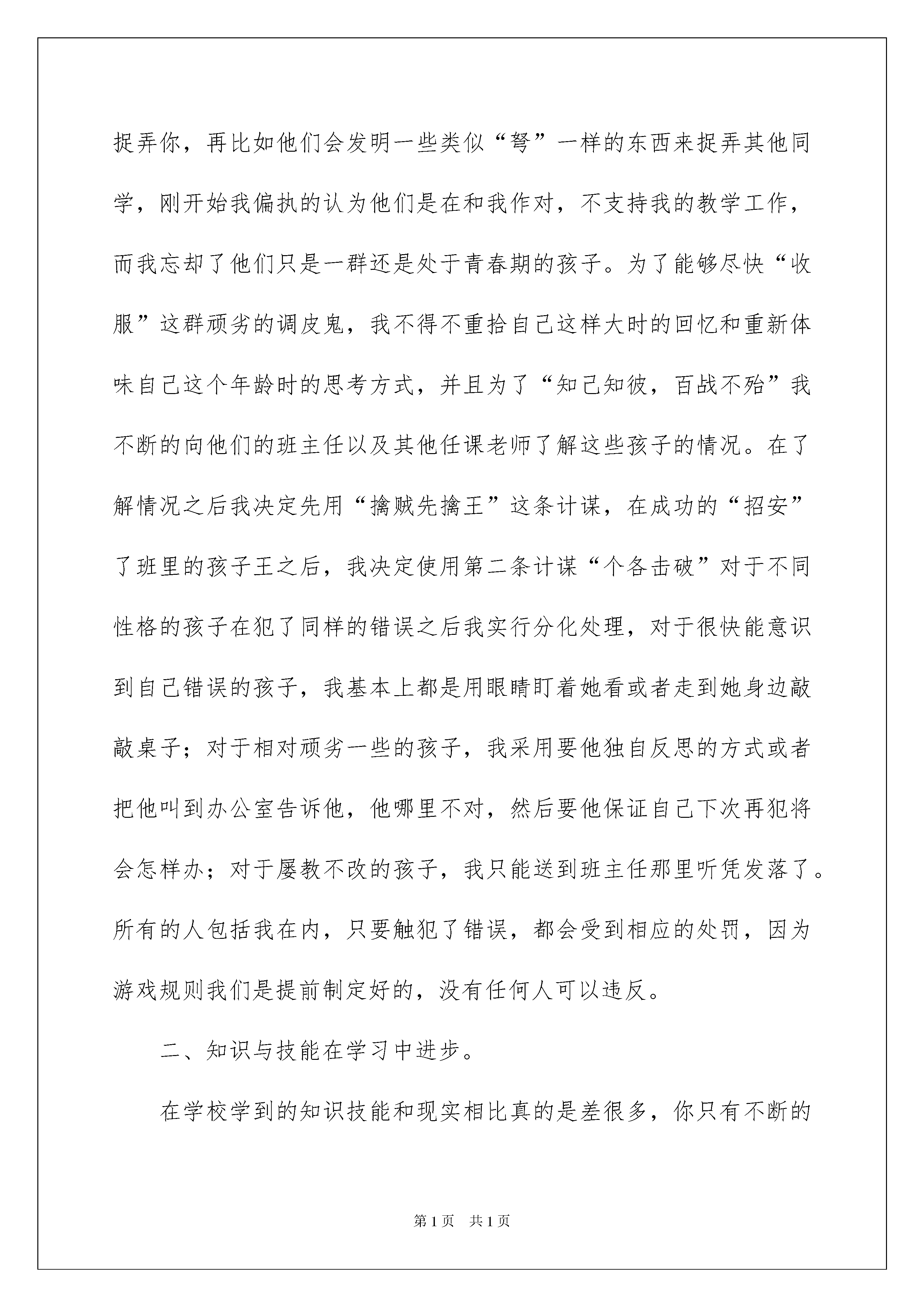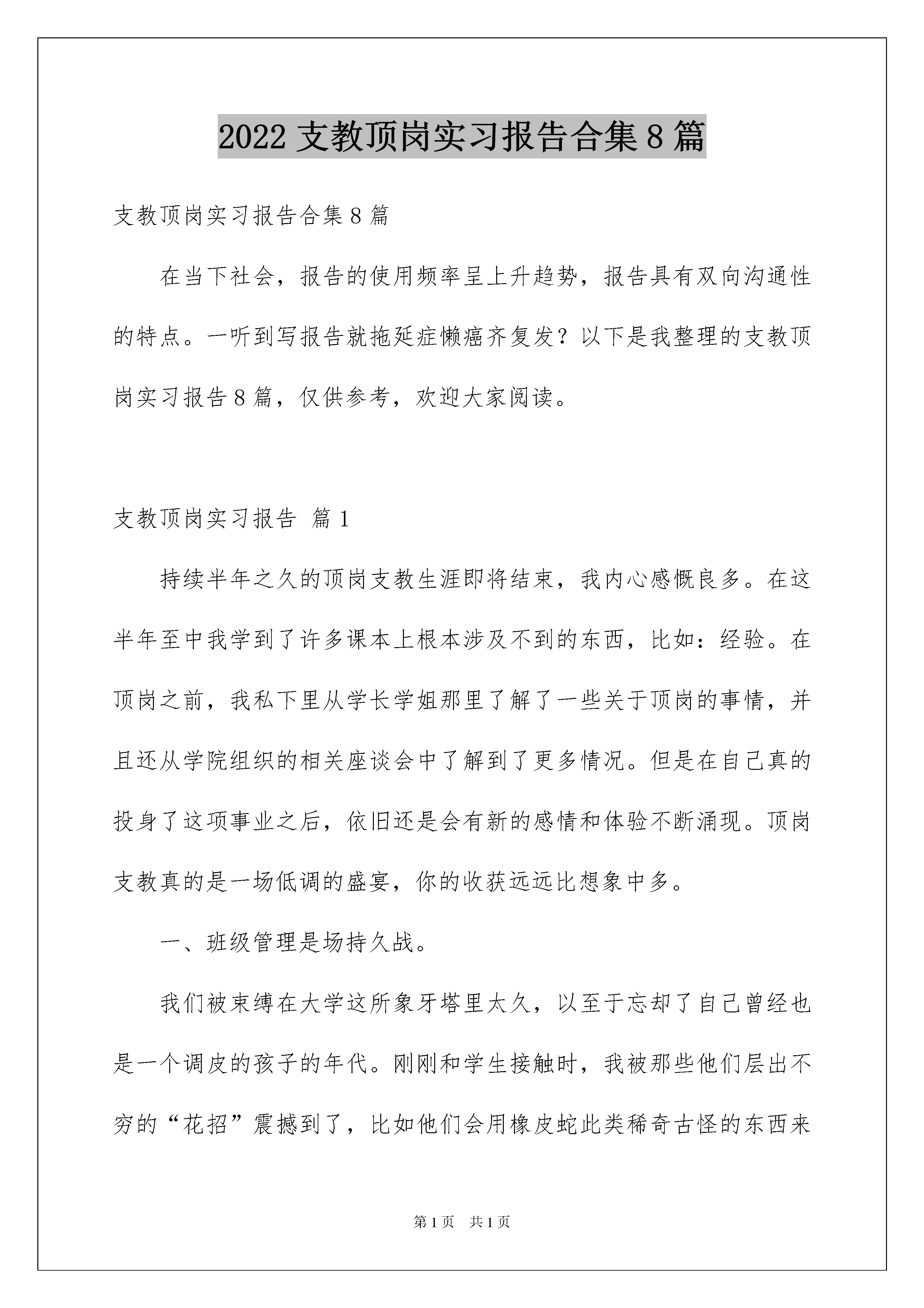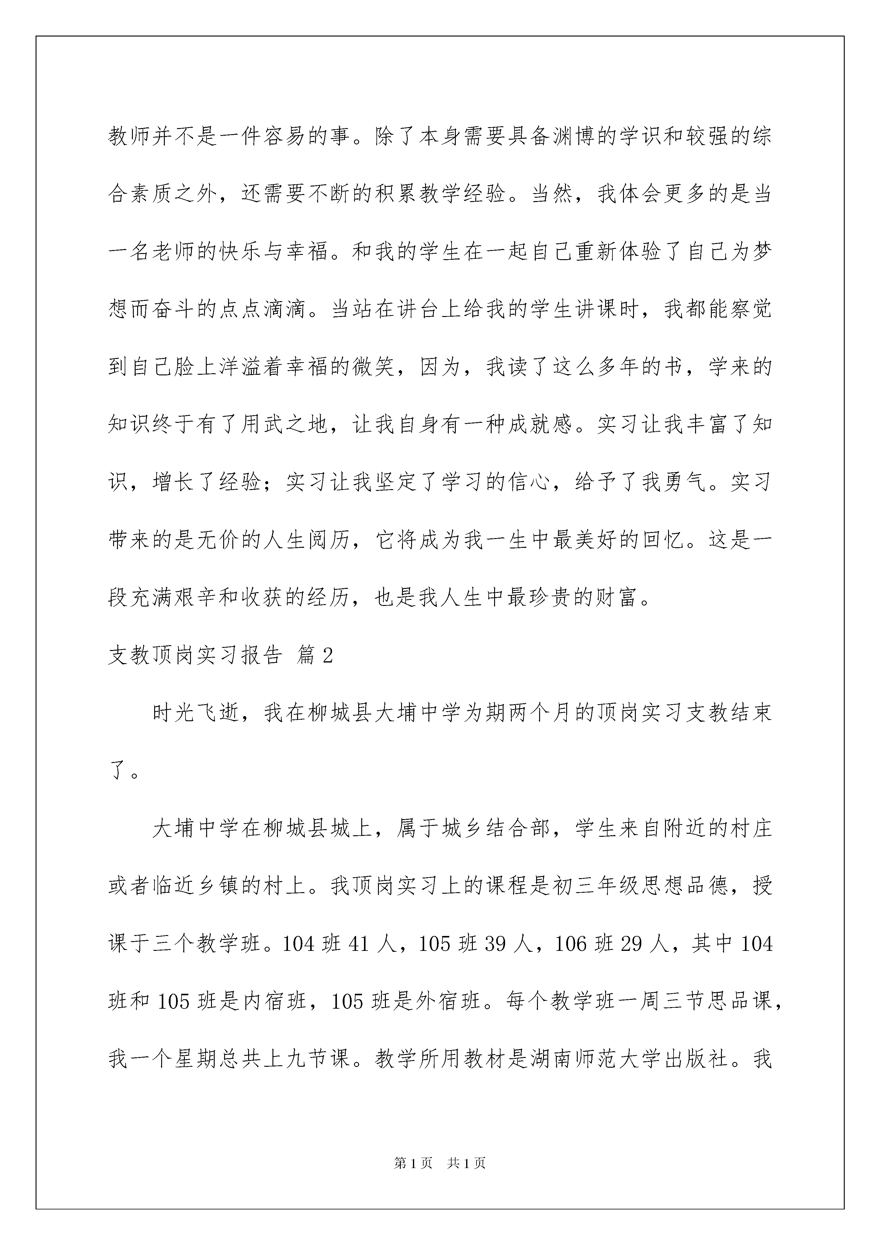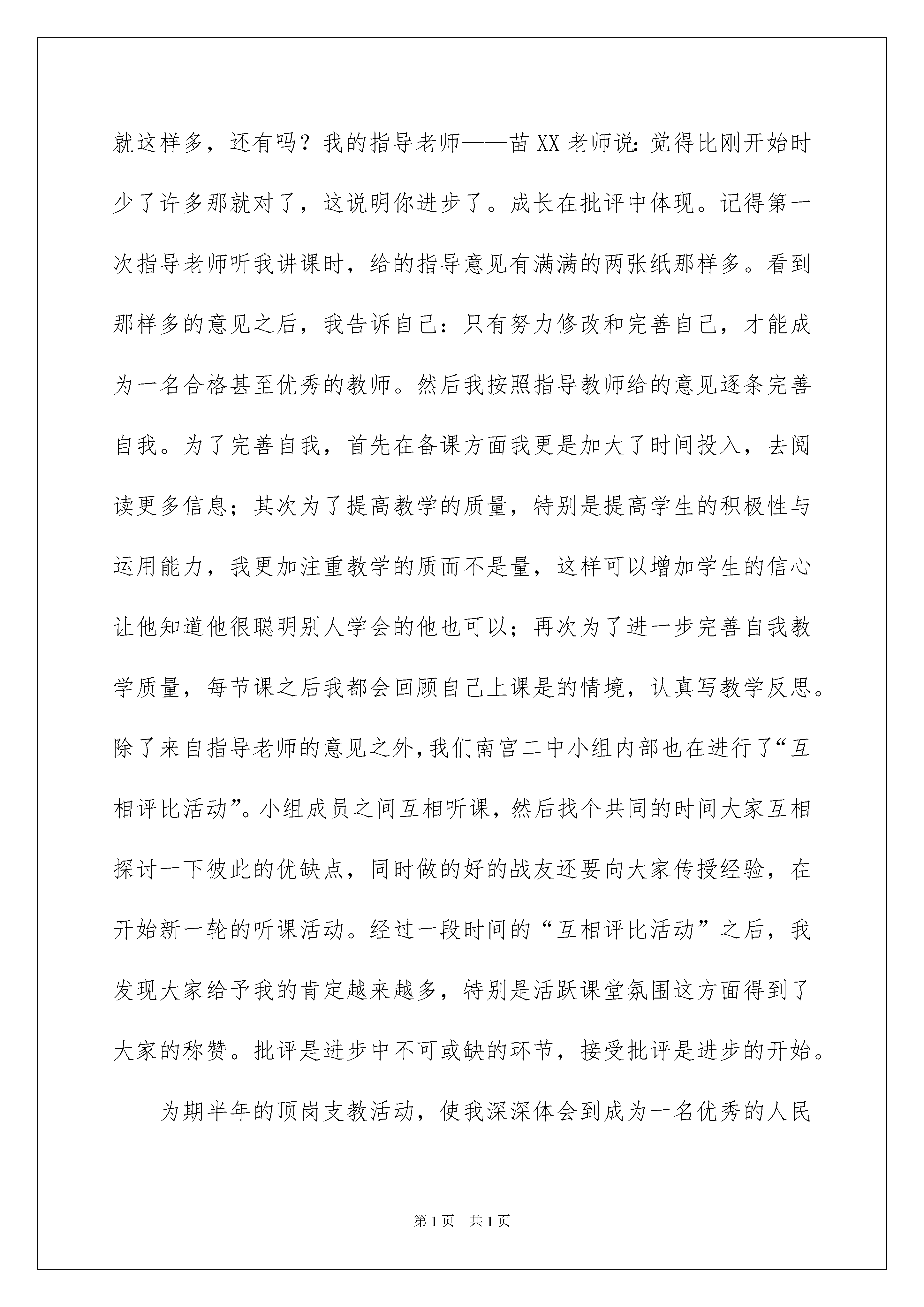 2022支教顶岗实习报告合集8篇支教顶岗实习报告合集8篇在当下社会,报告的使用频率呈上升趋势,报告具有双向沟通性的特点。一听到写报告就拖延症懒癌齐复发?以下是我整理的支教顶岗实习报告8篇,仅供参考,欢迎大家阅读。支教顶岗实习报告篇1持续半年之久的顶岗支教生涯即将结束,我内心感慨良多。在这半年至中我学到了许多课本上根本涉及不到的东西,比如:经验。在顶岗之前,我私下里从学长学姐那里了解了一些关于顶岗的事情,并且还从学院组织的相关座谈会中了解到了更多情况。但是在自己真的投身了这项事业之后,依旧还是会有新的感情和体验不断涌现。顶岗支教真的是一场低调的盛宴,你的收获远远比想象中多。一、班级管理是场持久战。我们被束缚在大学这所象牙塔里太久,以至于忘却了自己曾经也是一个调皮的孩子的年代。刚刚和学生接触时,我被那些他们层出不穷的“花招”震撼到了,比如他们会用橡皮蛇此类稀奇古怪的东西来捉弄你,再比如他们会发明一些类似“弩”一样的东西来捉弄其他同学,刚开始我偏执的认为他们是在和我作对,不支持我的教学工作,而我忘却了他们只是一群还是处于青春期的孩子。为了能够尽快“收服”这群顽劣的调皮鬼,我不得不重拾自己这样大时的回忆和重新体味自己这个年龄时的思考方式,并且为了“知己知彼,百战不殆”我不断的向他们的班主任以及其他任课老师了解这些孩子的情况。在了解情况之后我决定先用“擒贼先擒王”这条计谋,在成功的“招安”了班里的孩子王之后,我决定使用第二条计谋“个各击破”对于不同性格的孩子在犯了同样的错误之后我实行分化处理,对于很快能意识到自己错误的孩子,我基本上都是用眼睛盯着她看或者走到她身边敲敲桌子;对于相对顽劣一些的孩子,我采用要他独自反思的方式或者把他叫到办公室告诉他,他哪里不对,然后要他保证自己下次再犯将会怎样办;对于屡教不改的孩子,我只能送到班主任那里听凭发落了。所有的人包括我在内,只要触犯了错误,都会受到相应的处罚,因为游戏规则我们是提前制定好的,没有任何人可以违反。二、知识与技能在学习中进步。在学校学到的知识技能和现实相比真的是差很多,你只有不断的学习在学习才能填补空缺。在我们正式带班之前,实习学校为我们每人分配了一名有多年教学经验的教师作为指导老师,并且在听了两周课之后我们才正式上岗。在上岗之前,自己信心满满的外加些许忐忑,但真的上岗之后只有“书到用时方恨少”的感觉。这个“少”不仅仅是知识储备量上的少,更体现在技巧经验上的缺乏。虽然每节课的备课都会提前准备好多,但是上课时还会有好多状况发生,比如,怎样设计导入,导入只有符合孩子们的口味才能吸引他们的眼球,如果总是一个口味孩子们也会失去兴趣;再比如,上课讲的内容的多少,过多孩子们会产生倦怠感这就等于你做了无用功,少了就等于浪费时间;再比如,教师可以声调的变换是学生知道哪里是重点、难点,也可以利用声调的变化是学生在课堂上有适当的休息调整。这些技巧的掌握并不是朝夕就能完成的,但掌握这些技巧还是有捷径的,就是不断的听有经验的老师讲课和不断的向指导老师请教。只有不断学习,才能使自己更快的成长。三、批评是成长不可或缺的部分。最新一轮的听凭课结束后,指导老师和其他名师老师给我的指导意见只有四分之一张纸。我看着那四分之一张纸的评论,问:老师,就这样多,还有吗?我的指导老师——苗XX老师说:觉得比刚开始时少了许多那就对了,这说明你进步了。成长在批评中体现。记得第一次指导老师听我讲课时,给的指导意见有满满的两张纸那样多。看到那样多的意见之后,我告诉自己:只有努力修改和完善自己,才能成为一名合格甚至优秀的教师。然后我按照指导教师给的意见逐条完善自我。为了完善自我,首先在备课方面我更是加大了时间投入,去阅读更多信息;其次为了提高教学的质量,特别是提高学生的积极性与运用能力,我更加注重教学的质而不是量,这样可以增加学生的信心让他知道他很聪明别人学会的他也可以;再次为了进一步完善自我教学质量,每节课之后我都会回顾自己上课是的情境,认真写教学反思。除了来自指导老师的意见之外,我们南宫二中小组内部也在进行了“互相评比活动”。小组成员之间互相听课,然后找个共同的时间大家互相探讨一下彼此的优缺点,同时做的好的战友还要向大家传授经验,在开始新一轮的听课活动。经过一段时间的“互相评比活动”之后,我发现大家给予我的肯定越来越多,特别是活跃课堂氛围这方面得到了大家的称赞。批评是进步中不可或缺的环节,接受批评是进步的开始。为期半年的顶岗支教活动,使我深深体会到成为一名优秀的人民教师并不是一件容易的事。除了本身需要具备渊博的学识和较强的综合素质之外,还需要不断的积累教学经验。当然,我体会更多的