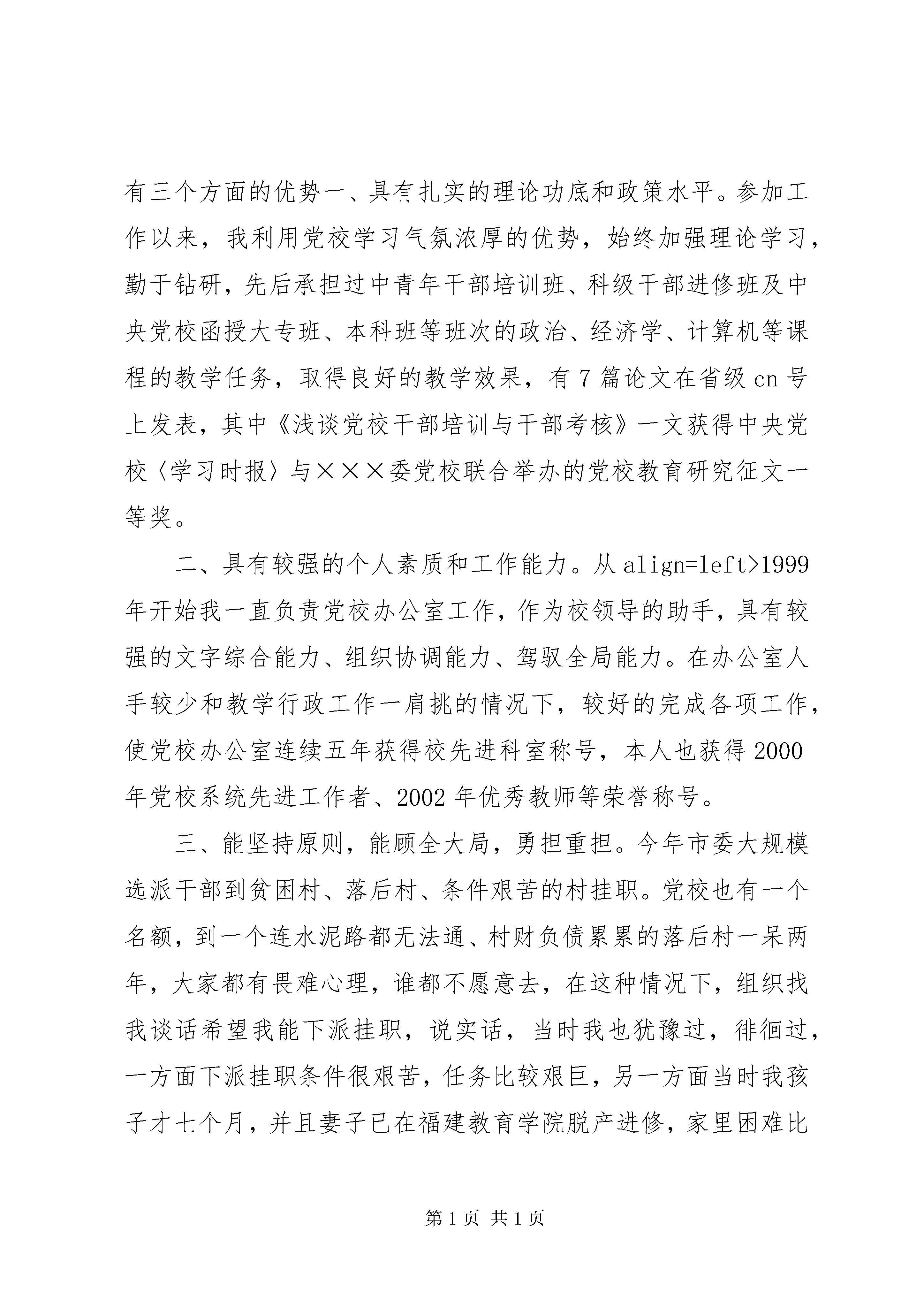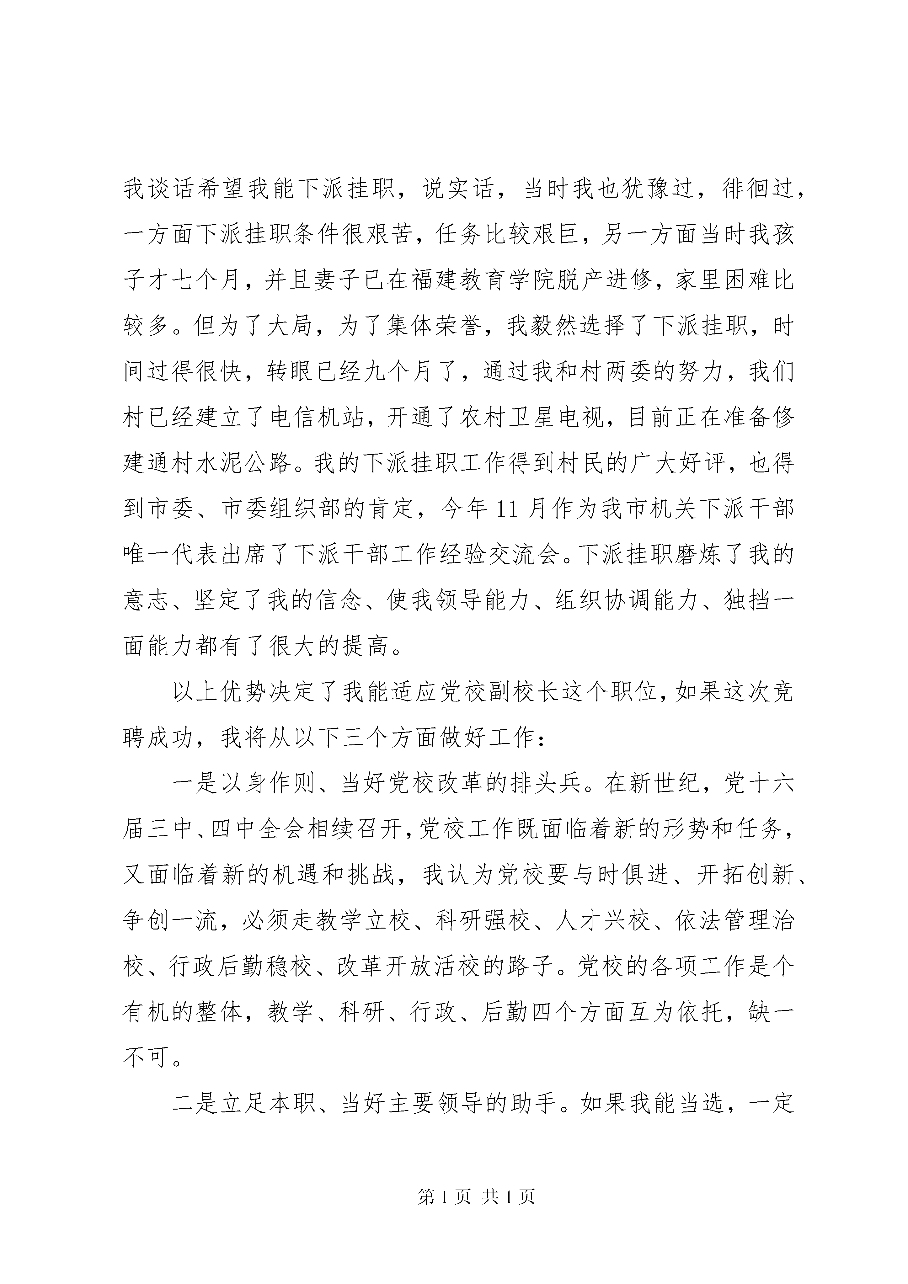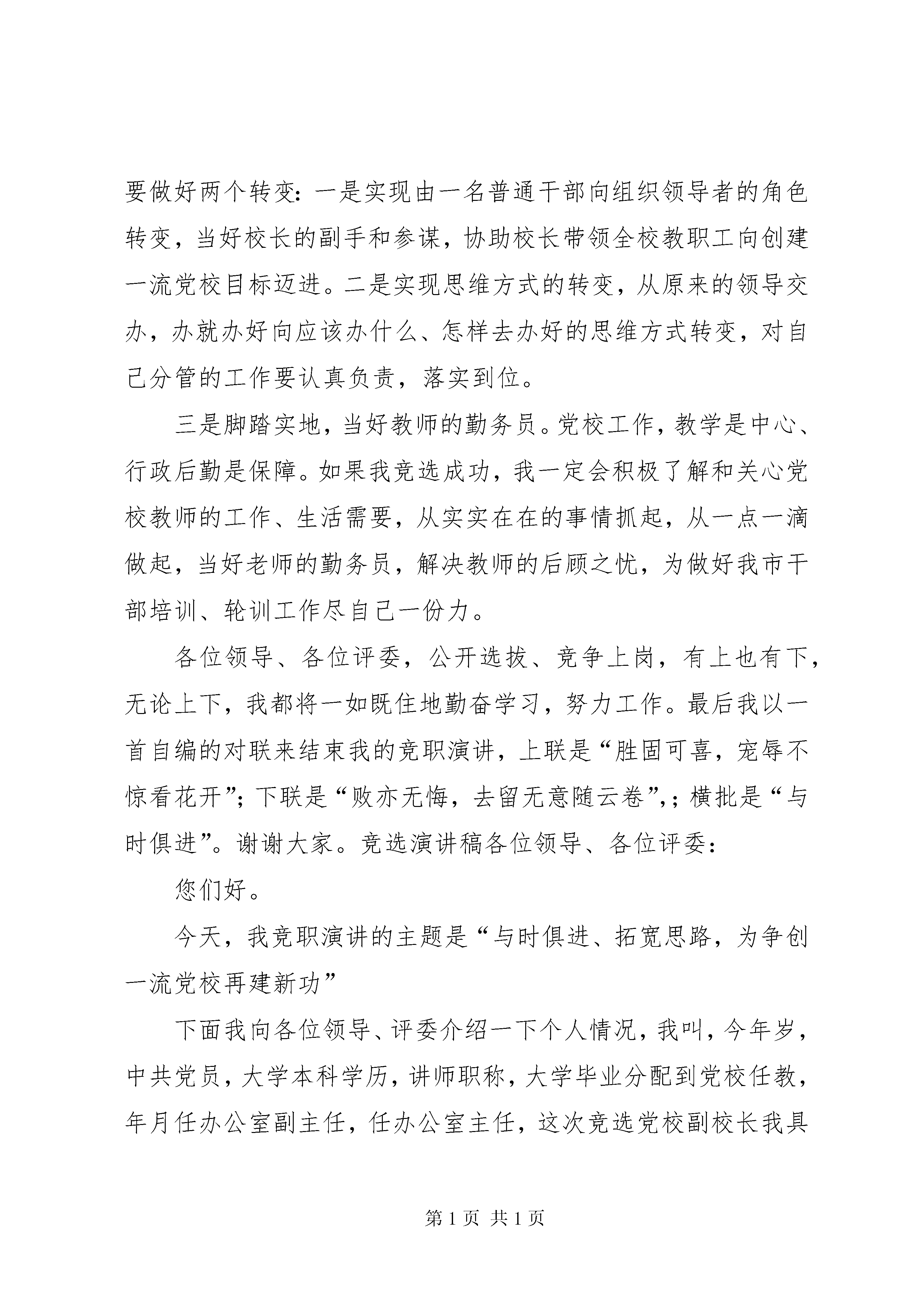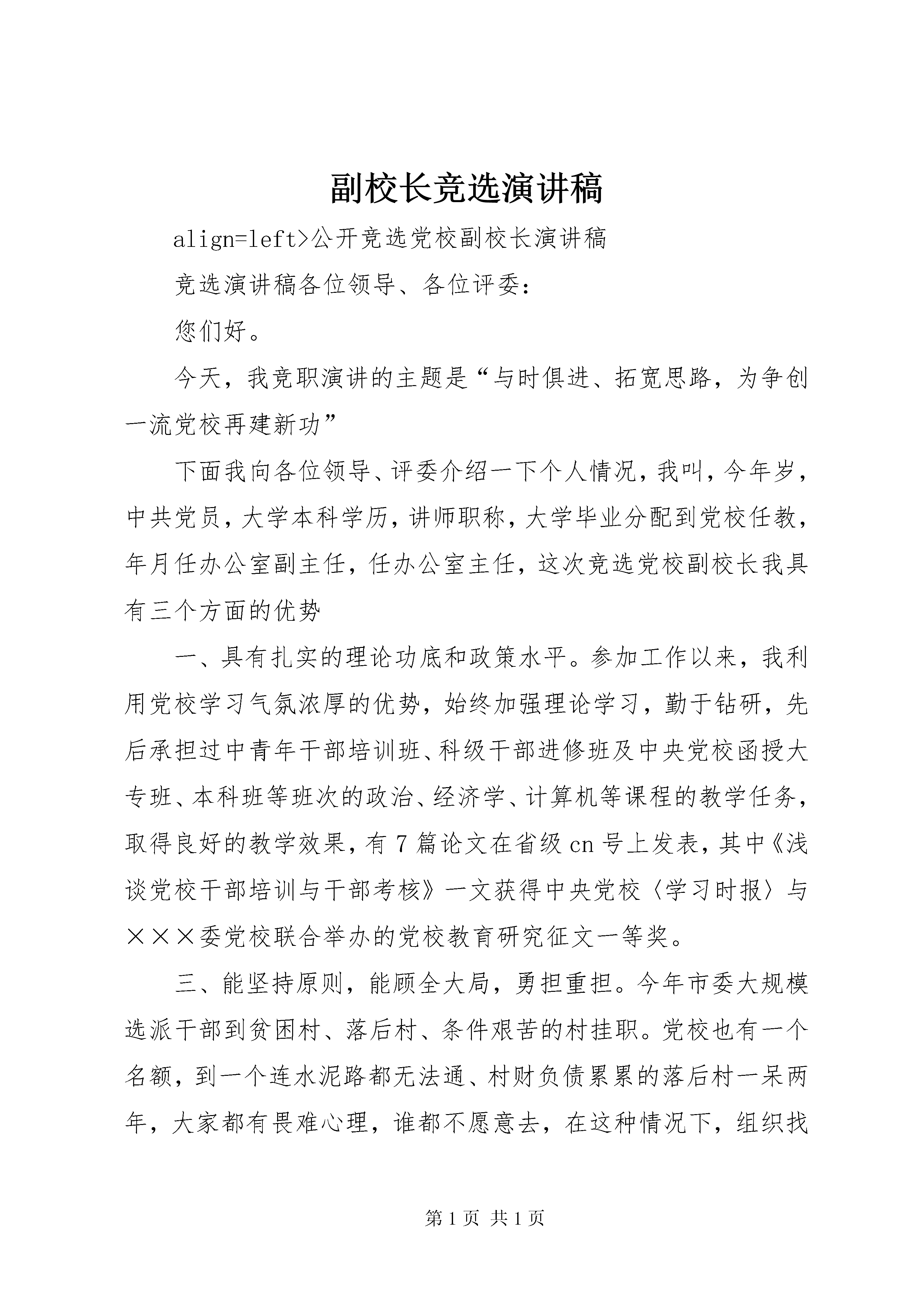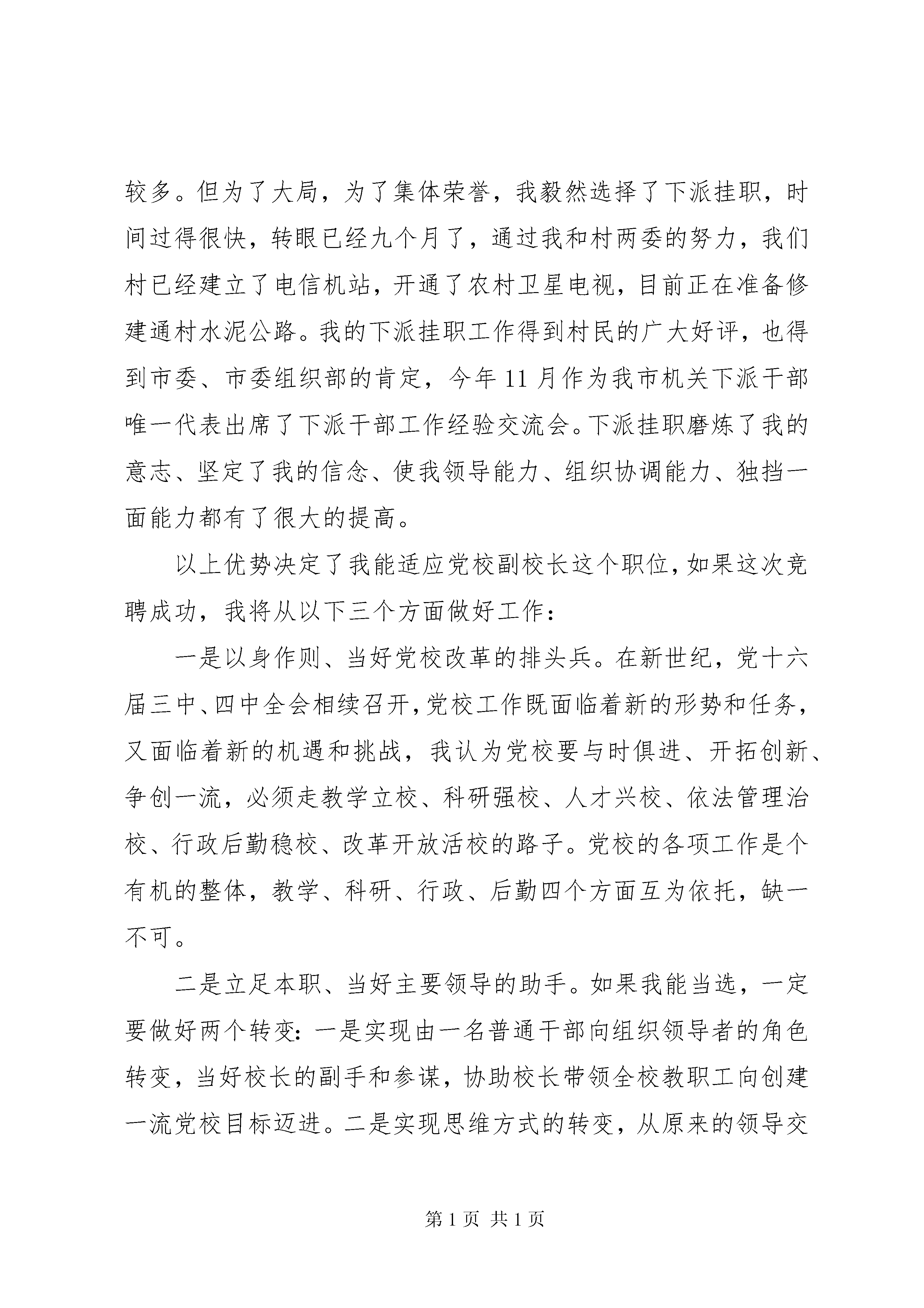 副校长竞选演讲稿align=left>公开竞选党校副校长演讲稿竞选演讲稿各位领导、各位评委:您们好。今天,我竞职演讲的主题是“与时俱进、拓宽思路,为争创一流党校再建新功”下面我向各位领导、评委介绍一下个人情况,我叫,今年岁,中共党员,大学本科学历,讲师职称,大学毕业分配到党校任教,年月任办公室副主任,任办公室主任,这次竞选党校副校长我具有三个方面的优势一、具有扎实的理论功底和政策水平。参加工作以来,我利用党校学习气氛浓厚的优势,始终加强理论学习,勤于钻研,先后承担过中青年干部培训班、科级干部进修班及中央党校函授大专班、本科班等班次的政治、经济学、计算机等课程的教学任务,取得良好的教学效果,有7篇论文在省级cn号上发表,其中《浅谈党校干部培训与干部考核》一文获得中央党校〈学习时报〉与×××委党校联合举办的党校教育研究征文一等奖。三、能坚持原则,能顾全大局,勇担重担。今年市委大规模选派干部到贫困村、落后村、条件艰苦的村挂职。党校也有一个名额,到一个连水泥路都无法通、村财负债累累的落后村一呆两年,大家都有畏难心理,谁都不愿意去,在这种情况下,组织找我谈话希望我能下派挂职,说实话,当时我也犹豫过,徘徊过,一方面下派挂职条件很艰苦,任务比较艰巨,另一方面当时我孩子才七个月,并且妻子已在福建教育学院脱产进修,家里困难比较多。但为了大局,为了集体荣誉,我毅然选择了下派挂职,时间过得很快,转眼已经九个月了,通过我和村两委的努力,我们村已经建立了电信机站,开通了农村卫星电视,目前正在准备修建通村水泥公路。我的下派挂职工作得到村民的广大好评,也得到市委、市委组织部的肯定,今年11月作为我市机关下派干部唯一代表出席了下派干部工作经验交流会。下派挂职磨炼了我的意志、坚定了我的信念、使我领导能力、组织协调能力、独挡一面能力都有了很大的提高。以上优势决定了我能适应党校副校长这个职位,如果这次竞聘成功,我将从以下三个方面做好工作:一是以身作则、当好党校改革的排头兵。在新世纪,党十六届三中、四中全会相续召开,党校工作既面临着新的形势和任务,又面临着新的机遇和挑战,我认为党校要与时俱进、开拓创新、争创一流,必须走教学立校、科研强校、人才兴校、依法管理治校、行政后勤稳校、改革开放活校的路子。党校的各项工作是个有机的整体,教学、科研、行政、后勤四个方面互为依托,缺一不可。二是立足本职、当好主要领导的助手。如果我能当选,一定要做好两个转变:一是实现由一名普通干部向组织领导者的角色转变,当好校长的副手和参谋,协助校长带领全校教职工向创建一流党校目标迈进。二是实现思维方式的转变,从原来的领导交办,办就办好向应该办什么、怎样去办好的思维方式转变,对自己分管的工作要认真负责,落实到位。三是脚踏实地,当好教师的勤务员。党校工作,教学是中心、行政后勤是保障。如果我竞选成功,我一定会积极了解和关心党校教师的工作、生活需要,从实实在在的事情抓起,从一点一滴做起,当好老师的勤务员,解决教师的后顾之忧,为做好我市干部培训、轮训工作尽自己一份力。各位领导、各位评委,公开选拔、竞争上岗,有上也有下,无论上下,我都将一如既住地勤奋学习,努力工作。最后我以一首自编的对联来结束我的竞职演讲,上联是“胜固可喜,宠辱不惊看花开”;下联是“败亦无悔,去留无意随云卷”,;横批是“与时俱进”。谢谢大家。竞选演讲稿各位领导、各位评委:您们好。今天,我竞职演讲的主题是“与时俱进、拓宽思路,为争创一流党校再建新功”下面我向各位领导、评委介绍一下个人情况,我叫,今年岁,中共党员,大学本科学历,讲师职称,大学毕业分配到党校任教,年月任办公室副主任,任办公室主任,这次竞选党校副校长我具有三个方面的优势一、具有扎实的理论功底和政策水平。参加工作以来,我利用党校学习气氛浓厚的优势,始终加强理论学习,勤于钻研,先后承担过中青年干部培训班、科级干部进修班及中央党校函授大专班、本科班等班次的政治、经济学、计算机等课程的教学任务,取得良好的教学效果,有7篇论文在省级cn号上发表,其中《浅谈党校干部培训与干部考核》一文获得中央党校〈学习时报〉与×××委党校联合举办的党校教育研究征文一等奖。二、具有较强的个人素质和工作能力。从align=left>1999年开始我一直负责党校办公室工作,作为校领导的助手,具有较强的文字综合能力、组织协调能力、驾驭全局能力。在办公室人手较少和教学行政工作一肩挑的情况下,较好的完成各项工作,使党校办公室连续五年获得校先进科室称号,本人也获得2000年党校系统先进工作者、2002年优秀教师等荣誉称号。三、能坚持原则,能顾全大局,勇担重担。今年市委大规模选派干部到贫困村、落后村、条件艰苦的村挂职。党校也有一个名额,到一个连水泥路都无法通、村财负债累累的落后村一呆两年,大家都有畏难心