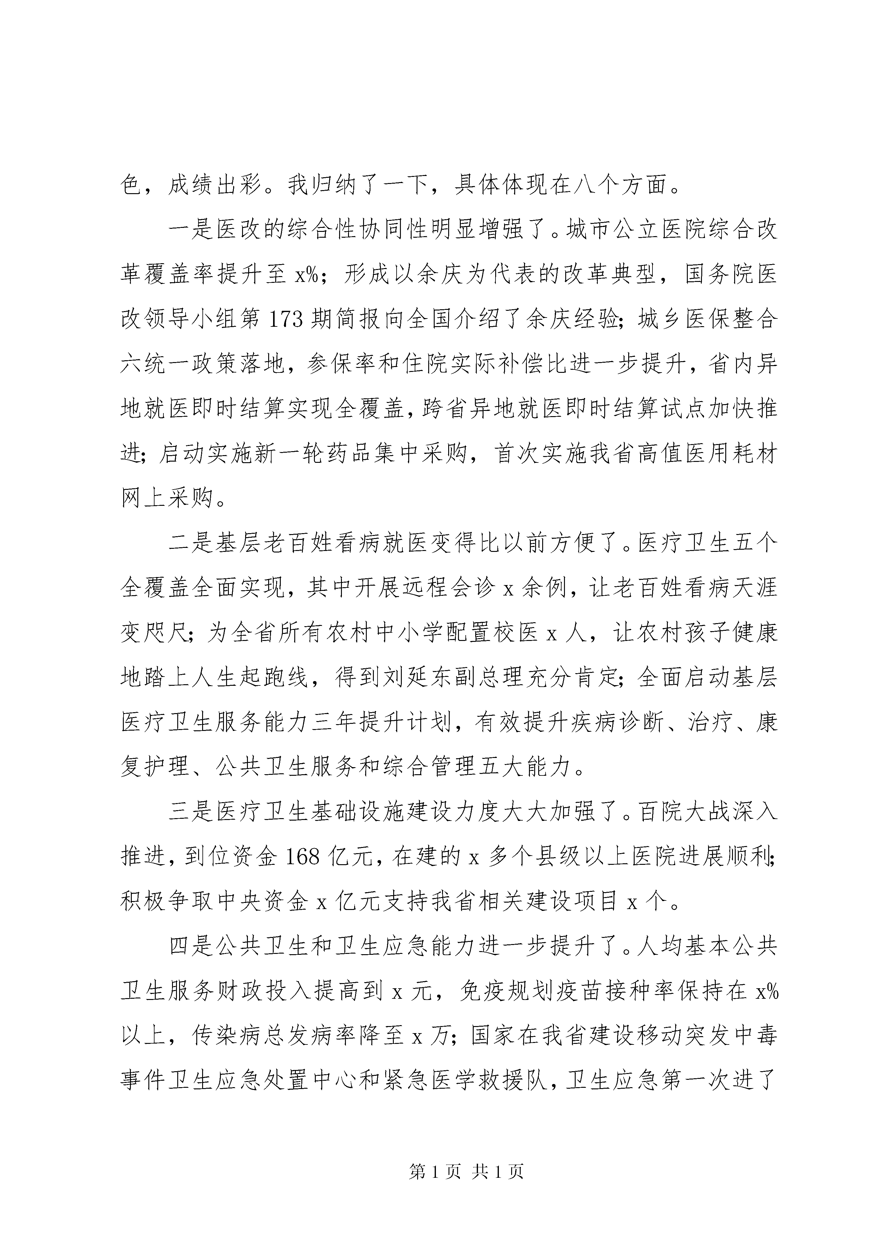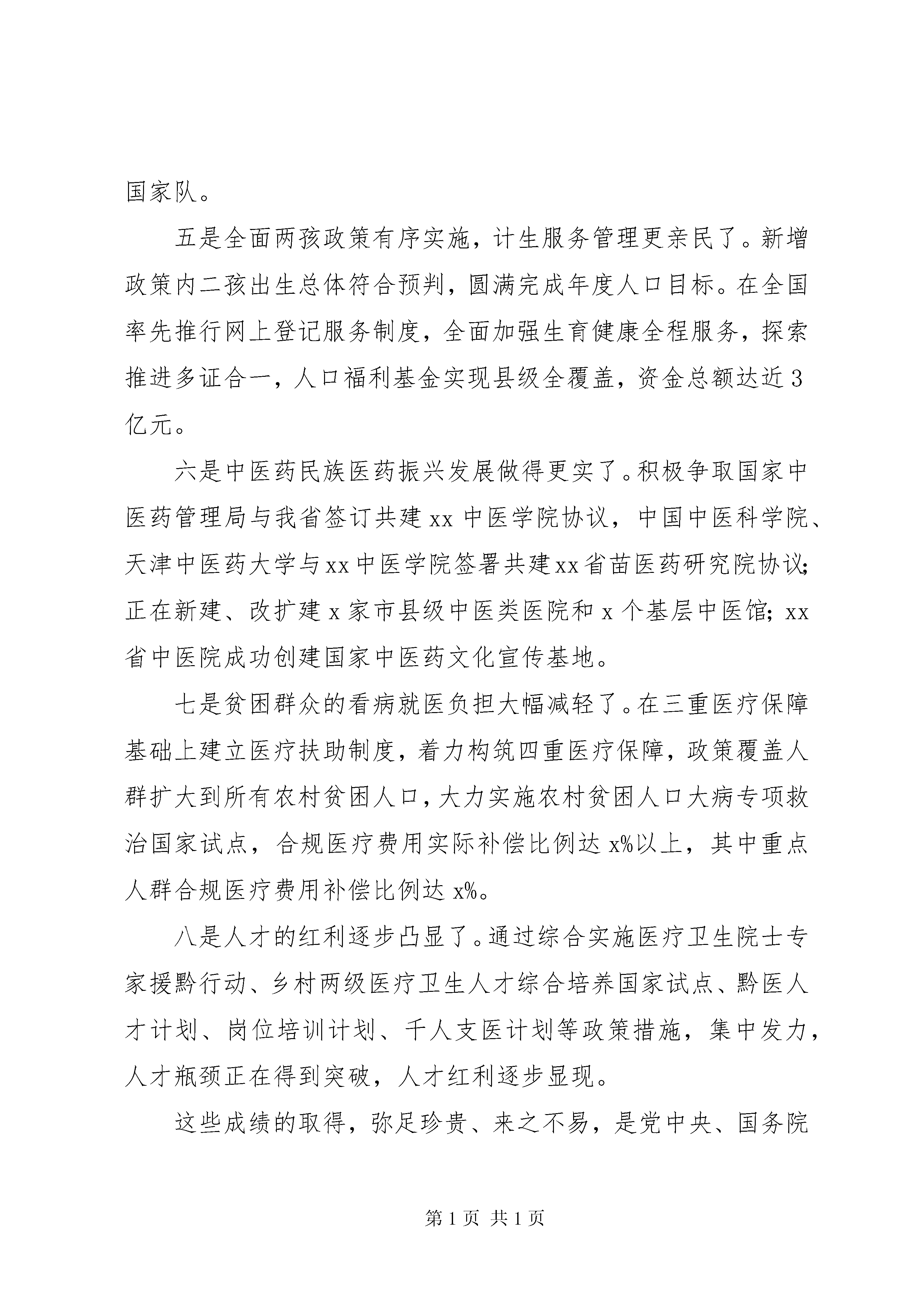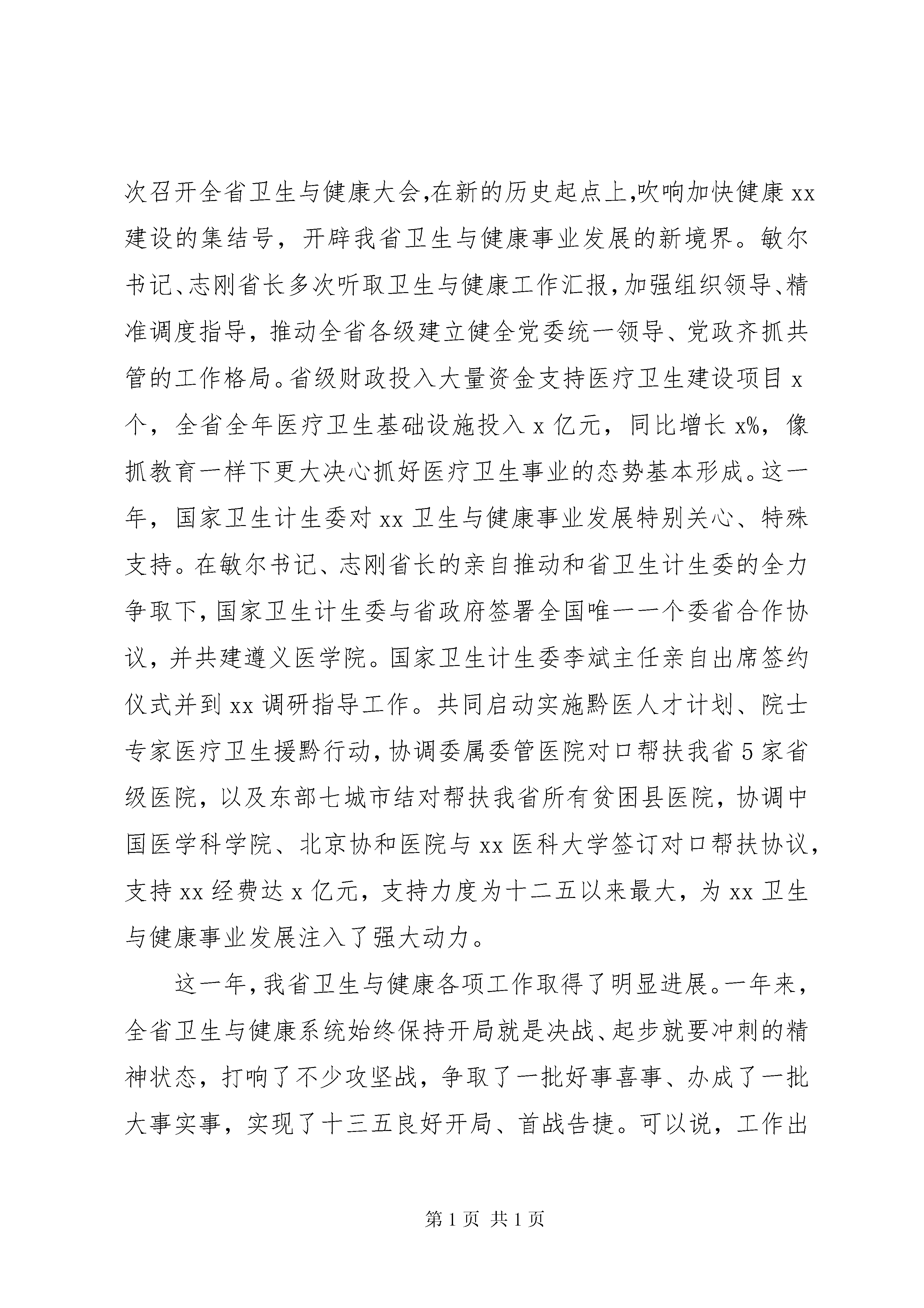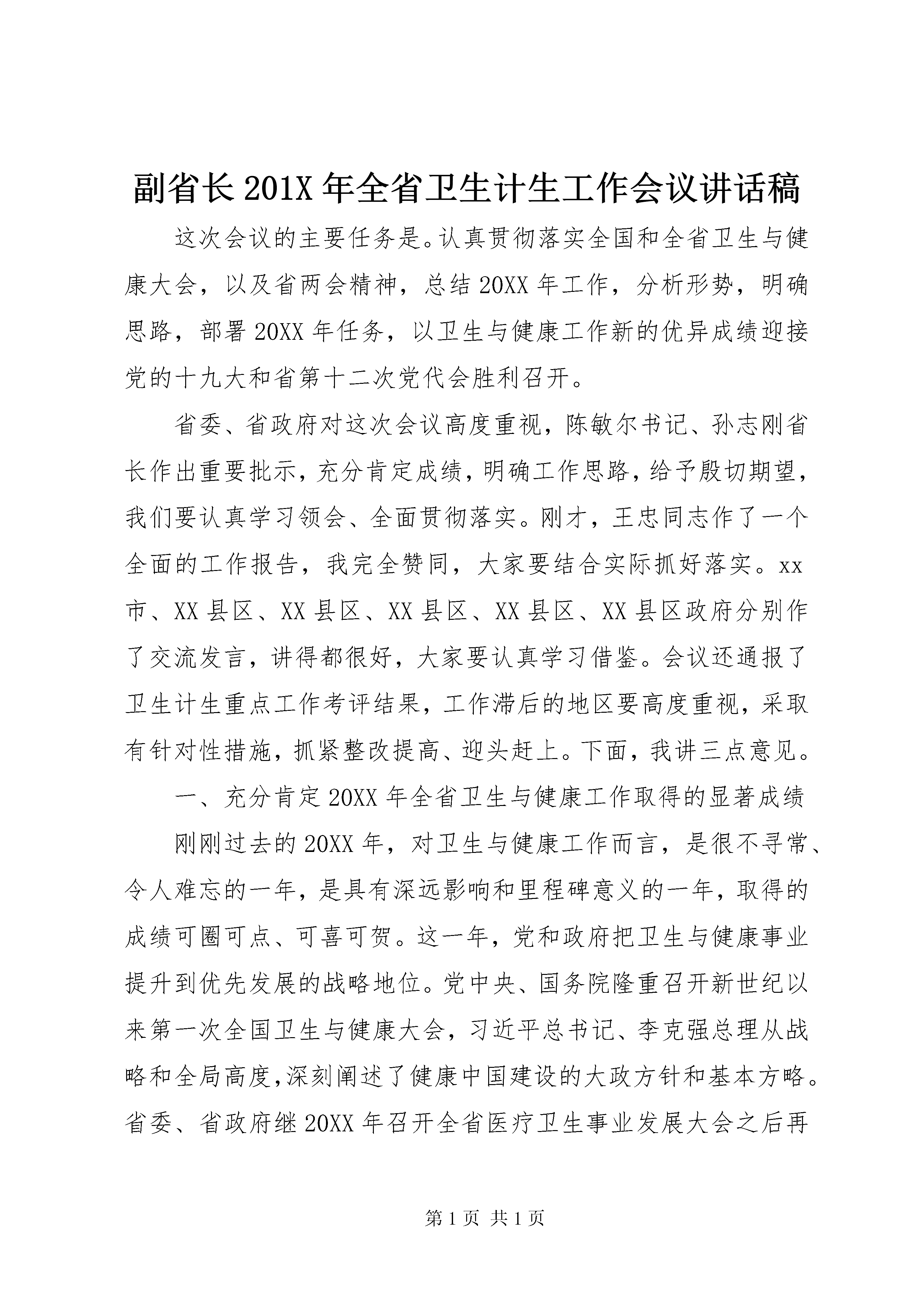 副省长201X年全省卫生计生工作会议讲话稿这次会议的主要任务是。认真贯彻落实全国和全省卫生与健康大会,以及省两会精神,总结20XX年工作,分析形势,明确思路,部署20XX年任务,以卫生与健康工作新的优异成绩迎接党的十九大和省第十二次党代会胜利召开。省委、省政府对这次会议高度重视,陈敏尔书记、孙志刚省长作出重要批示,充分肯定成绩,明确工作思路,给予殷切期望,我们要认真学习领会、全面贯彻落实。刚才,王忠同志作了一个全面的工作报告,我完全赞同,大家要结合实际抓好落实。xx市、XX县区、XX县区、XX县区、XX县区、XX县区政府分别作了交流发言,讲得都很好,大家要认真学习借鉴。会议还通报了卫生计生重点工作考评结果,工作滞后的地区要高度重视,采取有针对性措施,抓紧整改提高、迎头赶上。下面,我讲三点意见。一、充分肯定20XX年全省卫生与健康工作取得的显著成绩刚刚过去的20XX年,对卫生与健康工作而言,是很不寻常、令人难忘的一年,是具有深远影响和里程碑意义的一年,取得的成绩可圈可点、可喜可贺。这一年,党和政府把卫生与健康事业提升到优先发展的战略地位。党中央、国务院隆重召开新世纪以来第一次全国卫生与健康大会,习近平总书记、李克强总理从战略和全局高度,深刻阐述了健康中国建设的大政方针和基本方略。省委、省政府继20XX年召开全省医疗卫生事业发展大会之后再次召开全省卫生与健康大会,在新的历史起点上,吹响加快健康xx建设的集结号,开辟我省卫生与健康事业发展的新境界。敏尔书记、志刚省长多次听取卫生与健康工作汇报,加强组织领导、精准调度指导,推动全省各级建立健全党委统一领导、党政齐抓共管的工作格局。省级财政投入大量资金支持医疗卫生建设项目x个,全省全年医疗卫生基础设施投入x亿元,同比增长x%,像抓教育一样下更大决心抓好医疗卫生事业的态势基本形成。这一年,国家卫生计生委对xx卫生与健康事业发展特别关心、特殊支持。在敏尔书记、志刚省长的亲自推动和省卫生计生委的全力争取下,国家卫生计生委与省政府签署全国唯一一个委省合作协议,并共建遵义医学院。国家卫生计生委李斌主任亲自出席签约仪式并到xx调研指导工作。共同启动实施黔医人才计划、院士专家医疗卫生援黔行动,协调委属委管医院对口帮扶我省5家省级医院,以及东部七城市结对帮扶我省所有贫困县医院,协调中国医学科学院、北京协和医院与xx医科大学签订对口帮扶协议,支持xx经费达x亿元,支持力度为十二五以来最大,为xx卫生与健康事业发展注入了强大动力。这一年,我省卫生与健康各项工作取得了明显进展。一年来,全省卫生与健康系统始终保持开局就是决战、起步就要冲刺的精神状态,打响了不少攻坚战,争取了一批好事喜事、办成了一批大事实事,实现了十三五良好开局、首战告捷。可以说,工作出色,成绩出彩。我归纳了一下,具体体现在八个方面。一是医改的综合性协同性明显增强了。城市公立医院综合改革覆盖率提升至x%;形成以余庆为代表的改革典型,国务院医改领导小组第173期简报向全国介绍了余庆经验;城乡医保整合六统一政策落地,参保率和住院实际补偿比进一步提升,省内异地就医即时结算实现全覆盖,跨省异地就医即时结算试点加快推进;启动实施新一轮药品集中采购,首次实施我省高值医用耗材网上采购。二是基层老百姓看病就医变得比以前方便了。医疗卫生五个全覆盖全面实现,其中开展远程会诊x余例,让老百姓看病天涯变咫尺;为全省所有农村中小学配置校医x人,让农村孩子健康地踏上人生起跑线,得到刘延东副总理充分肯定;全面启动基层医疗卫生服务能力三年提升计划,有效提升疾病诊断、治疗、康复护理、公共卫生服务和综合管理五大能力。三是医疗卫生基础设施建设力度大大加强了。百院大战深入推进,到位资金168亿元,在建的x多个县级以上医院进展顺利;积极争取中央资金x亿元支持我省相关建设项目x个。四是公共卫生和卫生应急能力进一步提升了。人均基本公共卫生服务财政投入提高到x元,免疫规划疫苗接种率保持在x%以上,传染病总发病率降至x万;国家在我省建设移动突发中毒事件卫生应急处置中心和紧急医学救援队,卫生应急第一次进了国家队。五是全面两孩政策有序实施,计生服务管理更亲民了。新增政策内二孩出生总体符合预判,圆满完成年度人口目标。在全国率先推行网上登记服务制度,全面加强生育健康全程服务,探索推进多证合一,人口福利基金实现县级全覆盖,资金总额达近3亿元。六是中医药民族医药振兴发展做得更实了。积极争取国家中医药管理局与我省签订共建xx中医学院协议,中国中医科学院、天津中医药大学与xx中医学院签署共建xx省苗医药研究院协议;正在新建、改扩建x家市县级中医类医院和x个基层中医馆;xx省中医院成功创建国家中医药文化宣传基地。七是贫困群众的看病就医负担大幅减轻了。在三重医疗保障基础上建立医疗扶助制度,
