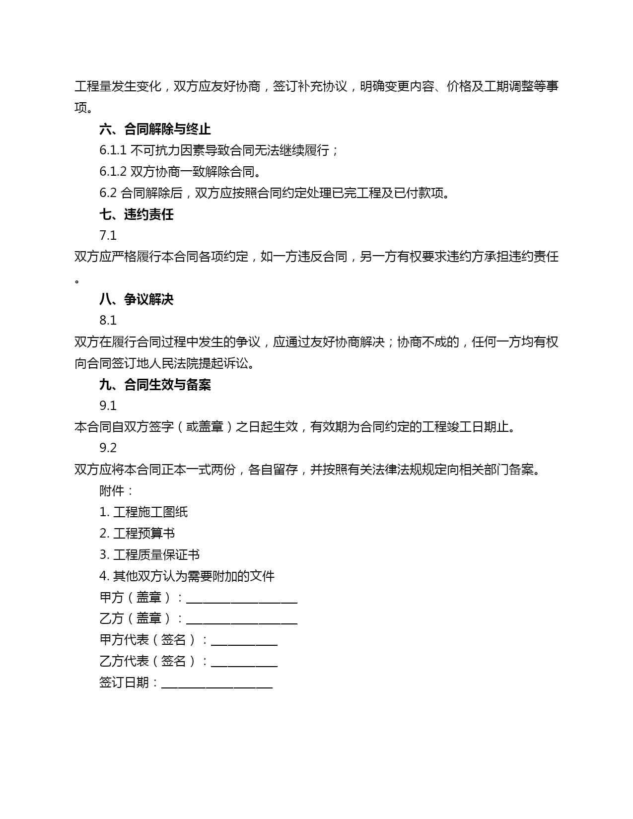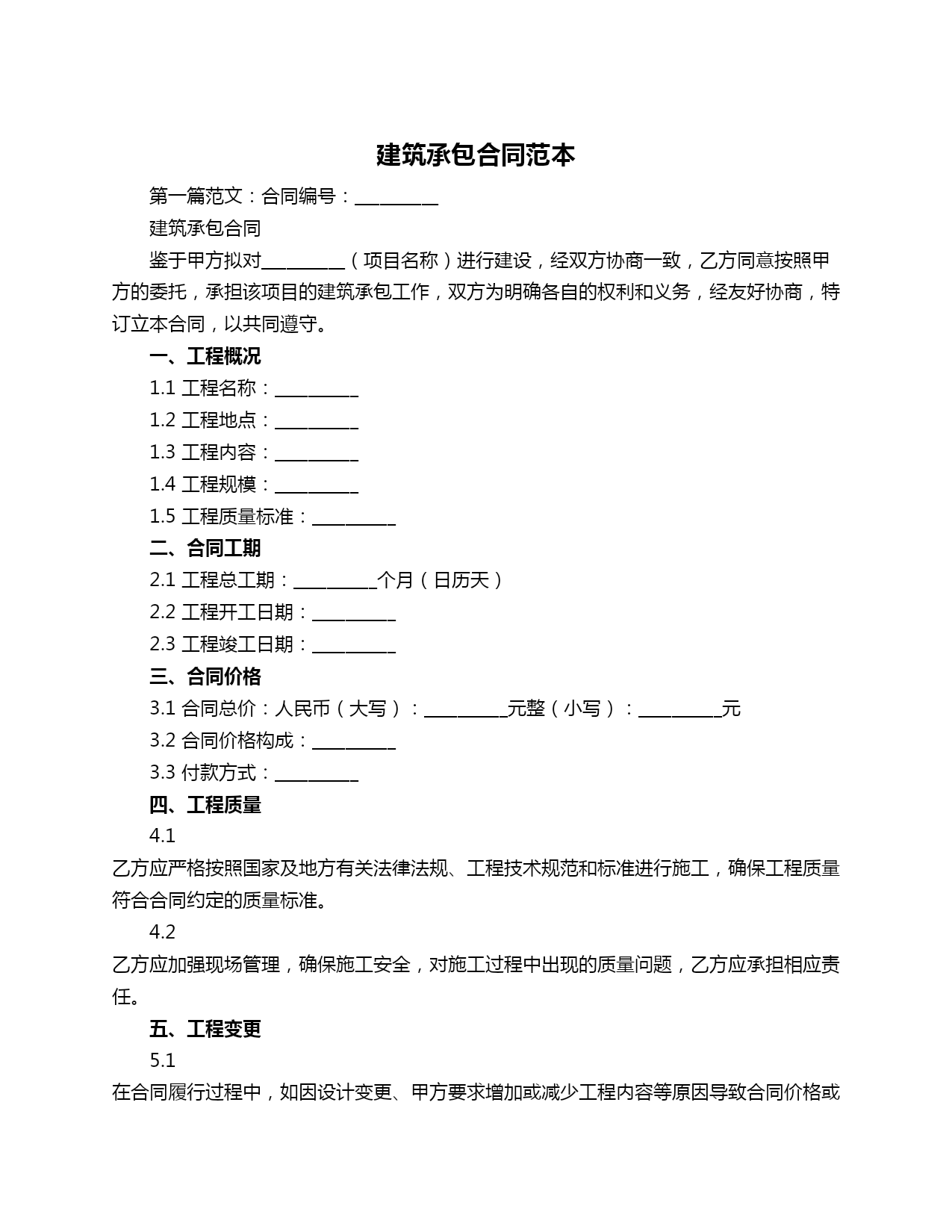 建筑承包合同范本 第一篇范文:合同编号:__________ 建筑承包合同 鉴于甲方拟对__________(项目名称)进行建设,经双方协商一致,乙方同意按照甲方的委托,承担该项目的建筑承包工作,双方为明确各自的权利和义务,经友好协商,特订立本合同,以共同遵守。 一、工程概况 1.1工程名称:__________ 1.2工程地点:__________ 1.3工程内容:__________ 1.4工程规模:__________ 1.5工程质量标准:__________ 二、合同工期 2.1工程总工期:__________个月(日历天) 2.2工程开工日期:__________ 2.3工程竣工日期:__________ 三、合同价格 3.1合同总价:人民币(大写):__________元整(小写):__________元 3.2合同价格构成:__________ 3.3付款方式:__________ 四、工程质量 4.1乙方应严格按照国家及地方有关法律法规、工程技术规范和标准进行施工,确保工程质量符合合同约定的质量标准。 4.2乙方应加强现场管理,确保施工安全,对施工过程中出现的质量问题,乙方应承担相应责任。 五、工程变更 5.1在合同履行过程中,如因设计变更、甲方要求增加或减少工程内容等原因导致合同价格或工程量发生变化,双方应友好协商,签订补充协议,明确变更内容、价格及工期调整等事项。 六、合同解除与终止 6.1.1不可抗力因素导致合同无法继续履行; 6.1.2双方协商一致解除合同。 6.2合同解除后,双方应按照合同约定处理已完工程及已付款项。 七、违约责任 7.1双方应严格履行本合同各项约定,如一方违反合同,另一方有权要求违约方承担违约责任。 八、争议解决 8.1双方在履行合同过程中发生的争议,应通过友好协商解决;协商不成的,任何一方均有权向合同签订地人民法院提起诉讼。 九、合同生效与备案 9.1本合同自双方签字(或盖章)之日起生效,有效期为合同约定的工程竣工日期止。 9.2双方应将本合同正本一式两份,各自留存,并按照有关法律法规规定向相关部门备案。 附件: 1.工程施工图纸 2.工程预算书 3.工程质量保证书 4.其他双方认为需要附加的文件 甲方(盖章):____________________ 乙方(盖章):____________________ 甲方代表(签名):____________ 乙方代表(签名):____________ 签订日期:____________________