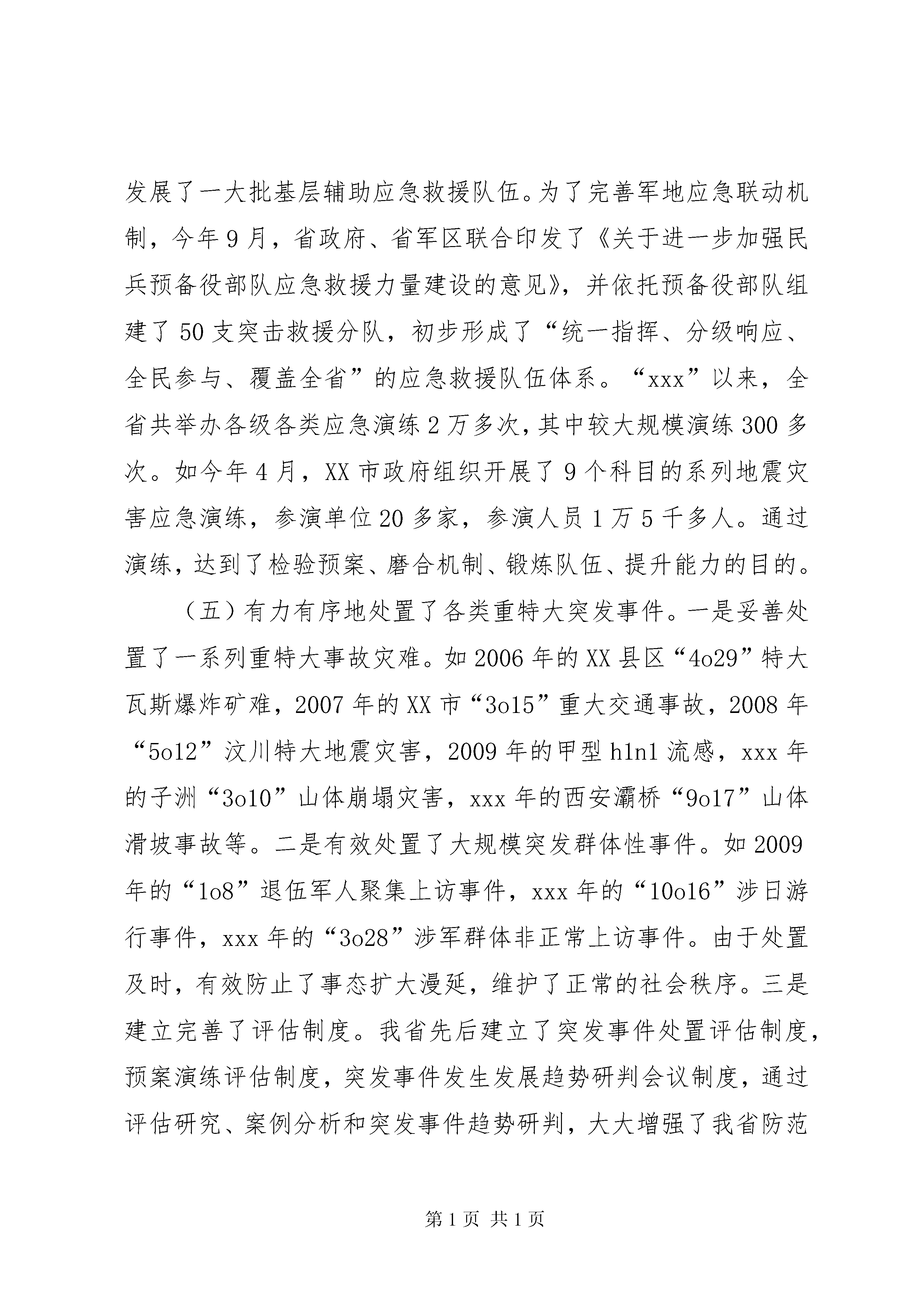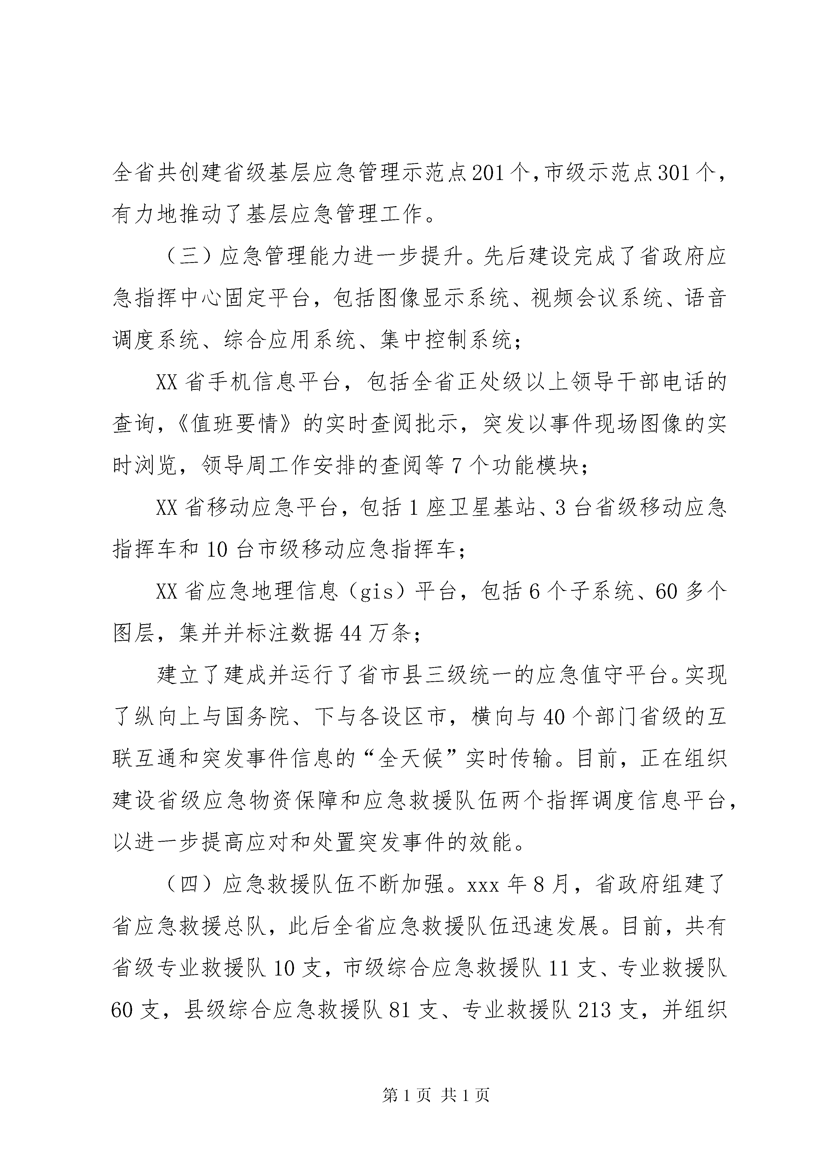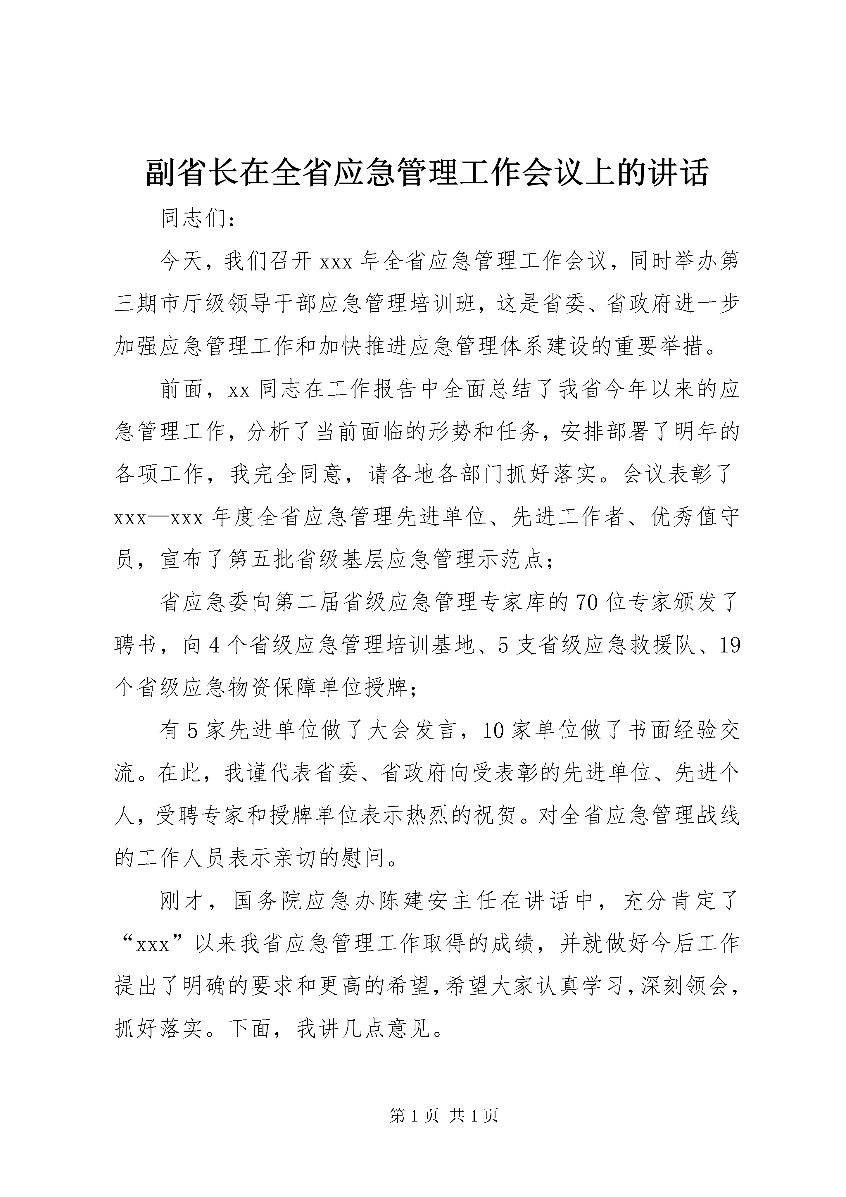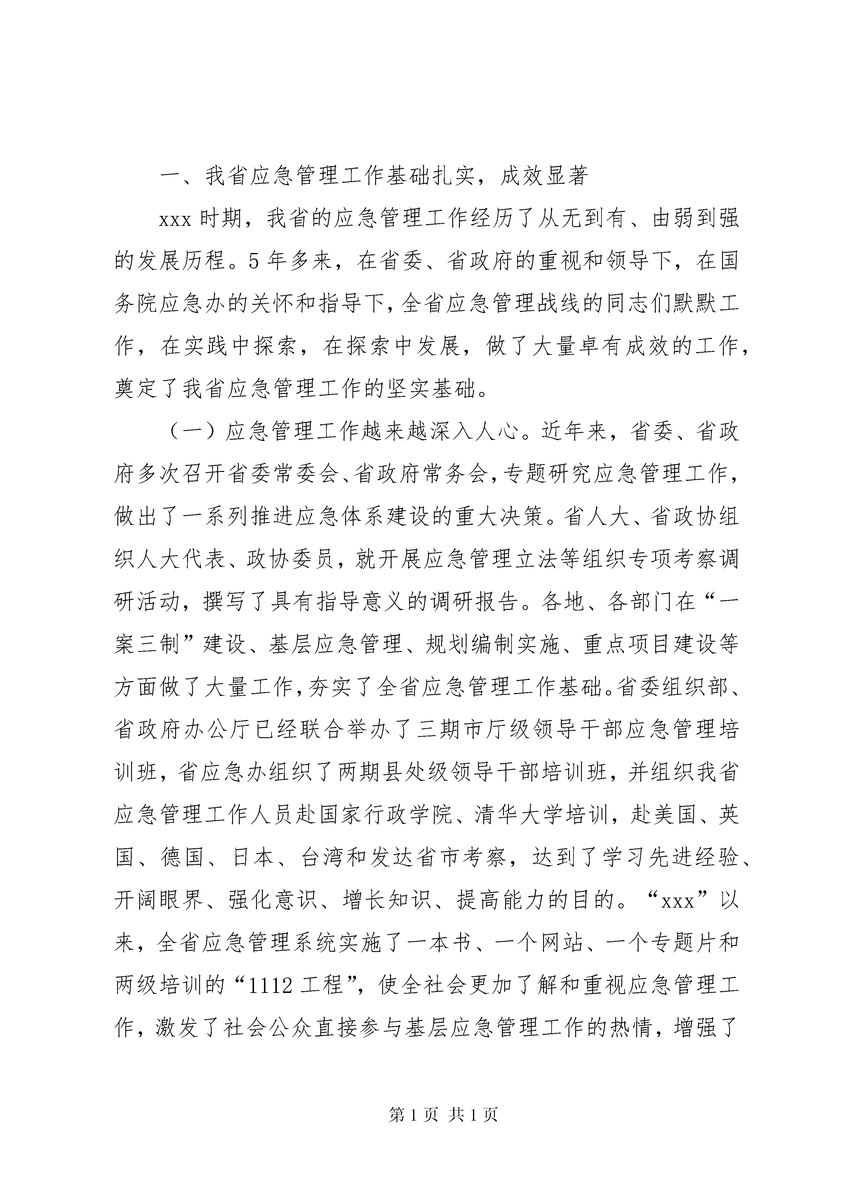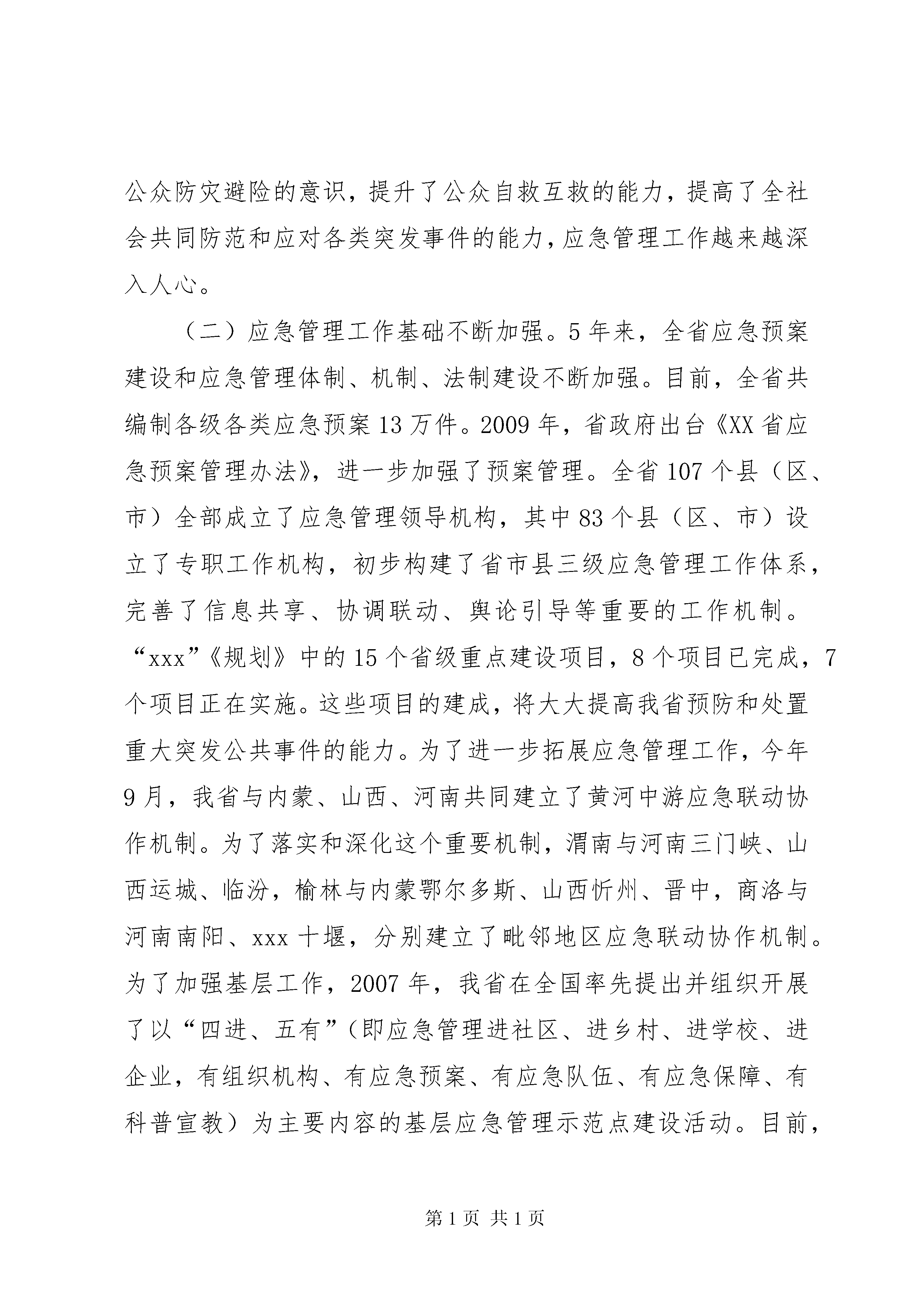 副省长在全省应急管理工作会议上的讲话同志们:今天,我们召开xxx年全省应急管理工作会议,同时举办第三期市厅级领导干部应急管理培训班,这是省委、省政府进一步加强应急管理工作和加快推进应急管理体系建设的重要举措。前面,xx同志在工作报告中全面总结了我省今年以来的应急管理工作,分析了当前面临的形势和任务,安排部署了明年的各项工作,我完全同意,请各地各部门抓好落实。会议表彰了xxx—xxx年度全省应急管理先进单位、先进工作者、优秀值守员,宣布了第五批省级基层应急管理示范点;省应急委向第二届省级应急管理专家库的70位专家颁发了聘书,向4个省级应急管理培训基地、5支省级应急救援队、19个省级应急物资保障单位授牌;有5家先进单位做了大会发言,10家单位做了书面经验交流。在此,我谨代表省委、省政府向受表彰的先进单位、先进个人,受聘专家和授牌单位表示热烈的祝贺。对全省应急管理战线的工作人员表示亲切的慰问。刚才,国务院应急办陈建安主任在讲话中,充分肯定了“xxx”以来我省应急管理工作取得的成绩,并就做好今后工作提出了明确的要求和更高的希望,希望大家认真学习,深刻领会,抓好落实。下面,我讲几点意见。一、我省应急管理工作基础扎实,成效显著xxx时期,我省的应急管理工作经历了从无到有、由弱到强的发展历程。5年多来,在省委、省政府的重视和领导下,在国务院应急办的关怀和指导下,全省应急管理战线的同志们默默工作,在实践中探索,在探索中发展,做了大量卓有成效的工作,奠定了我省应急管理工作的坚实基础。(一)应急管理工作越来越深入人心。近年来,省委、省政府多次召开省委常委会、省政府常务会,专题研究应急管理工作,做出了一系列推进应急体系建设的重大决策。省人大、省政协组织人大代表、政协委员,就开展应急管理立法等组织专项考察调研活动,撰写了具有指导意义的调研报告。各地、各部门在“一案三制”建设、基层应急管理、规划编制实施、重点项目建设等方面做了大量工作,夯实了全省应急管理工作基础。省委组织部、省政府办公厅已经联合举办了三期市厅级领导干部应急管理培训班,省应急办组织了两期县处级领导干部培训班,并组织我省应急管理工作人员赴国家行政学院、清华大学培训,赴美国、英国、德国、日本、台湾和发达省市考察,达到了学习先进经验、开阔眼界、强化意识、增长知识、提高能力的目的。“xxx”以来,全省应急管理系统实施了一本书、一个网站、一个专题片和两级培训的“1112工程”,使全社会更加了解和重视应急管理工作,激发了社会公众直接参与基层应急管理工作的热情,增强了公众防灾避险的意识,提升了公众自救互救的能力,提高了全社会共同防范和应对各类突发事件的能力,应急管理工作越来越深入人心。(二)应急管理工作基础不断加强。5年来,全省应急预案建设和应急管理体制、机制、法制建设不断加强。目前,全省共编制各级各类应急预案13万件。2009年,省政府出台《XX省应急预案管理办法》,进一步加强了预案管理。全省107个县(区、市)全部成立了应急管理领导机构,其中83个县(区、市)设立了专职工作机构,初步构建了省市县三级应急管理工作体系,完善了信息共享、协调联动、舆论引导等重要的工作机制。“xxx”《规划》中的15个省级重点建设项目,8个项目已完成,7个项目正在实施。这些项目的建成,将大大提高我省预防和处置重大突发公共事件的能力。为了进一步拓展应急管理工作,今年9月,我省与内蒙、山西、河南共同建立了黄河中游应急联动协作机制。为了落实和深化这个重要机制,渭南与河南三门峡、山西运城、临汾,榆林与内蒙鄂尔多斯、山西忻州、晋中,商洛与河南南阳、xxx十堰,分别建立了毗邻地区应急联动协作机制。为了加强基层工作,2007年,我省在全国率先提出并组织开展了以“四进、五有”(即应急管理进社区、进乡村、进学校、进企业,有组织机构、有应急预案、有应急队伍、有应急保障、有科普宣教)为主要内容的基层应急管理示范点建设活动。目前,全省共创建省级基层应急管理示范点201个,市级示范点301个,有力地推动了基层应急管理工作。(三)应急管理能力进一步提升。先后建设完成了省政府应急指挥中心固定平台,包括图像显示系统、视频会议系统、语音调度系统、综合应用系统、集中控制系统;XX省手机信息平台,包括全省正处级以上领导干部电话的查询,《值班要情》的实时查阅批示,突发以事件现场图像的实时浏览,领导周工作安排的查阅等7个功能模块;XX省移动应急平台,包括1座卫星基站、3台省级移动应急指挥车和10台市级移动应急指挥车;XX省应急地理信息(gis)平台,包括6个子系统、60多个图层,集并并标注数据44万条;建立了建成并运行了省市县三级统一的应急值守平台。实现了纵向上与国务院、下与各设区市,横向与40个部门省级的互联互通和突发事件信息的“全天