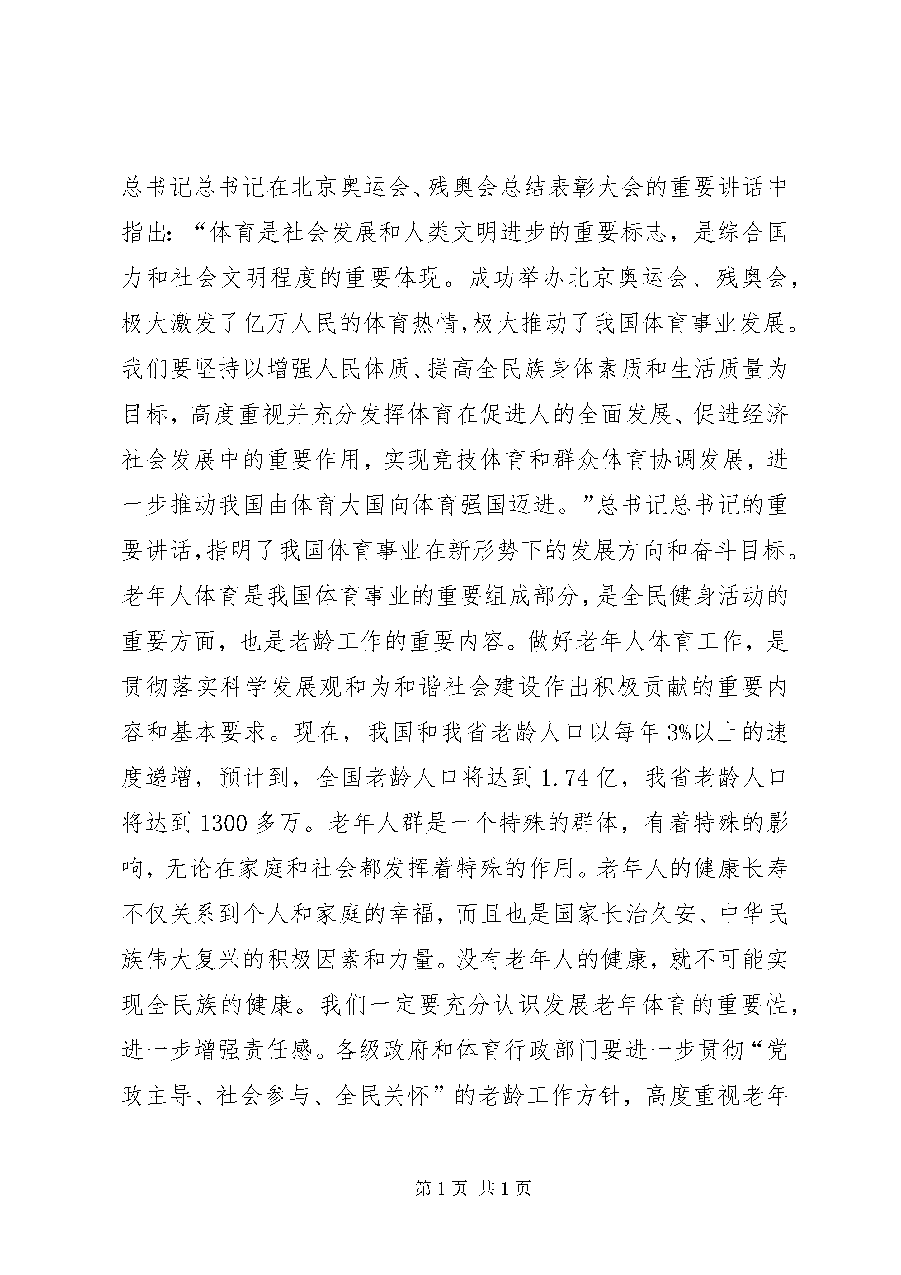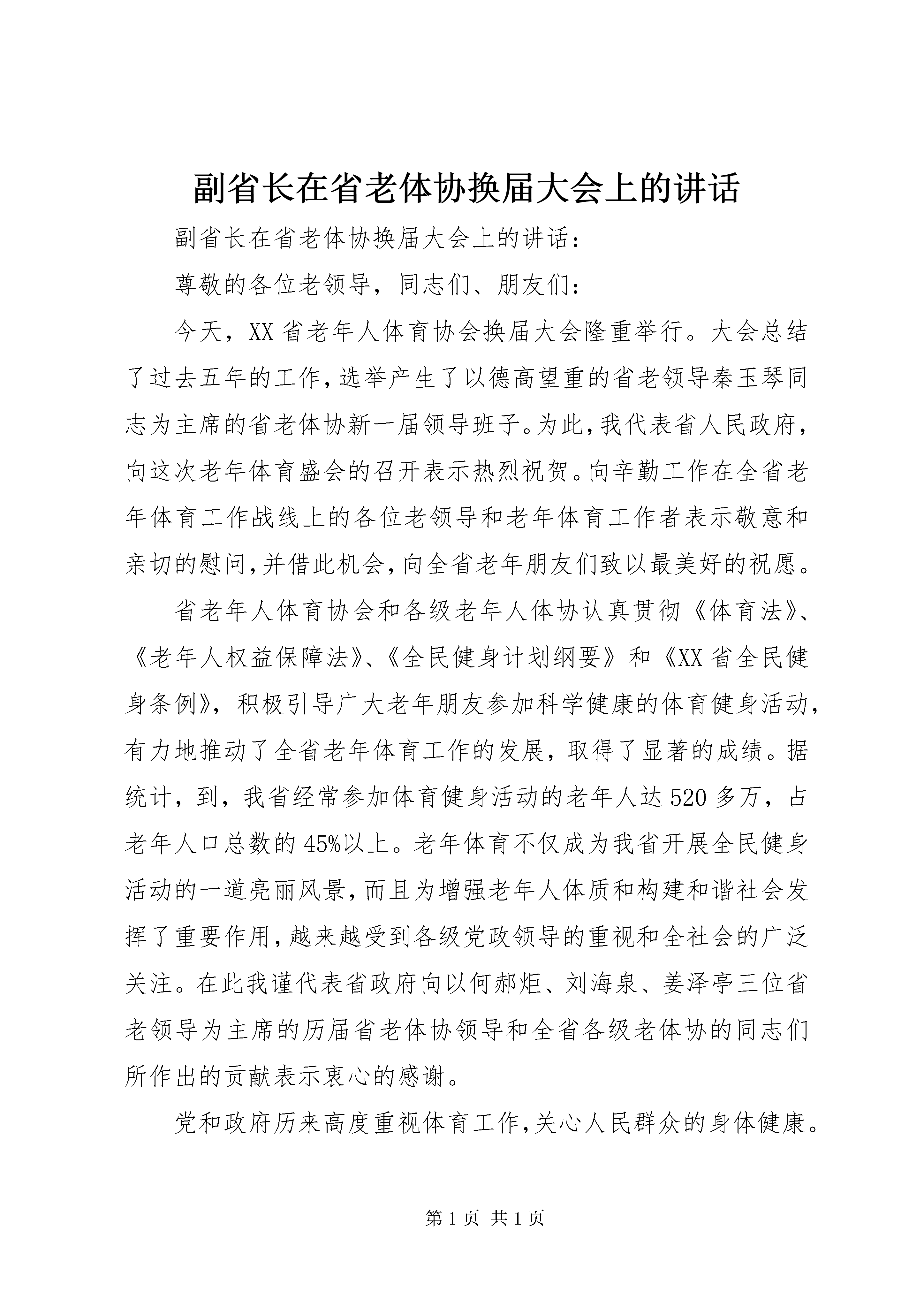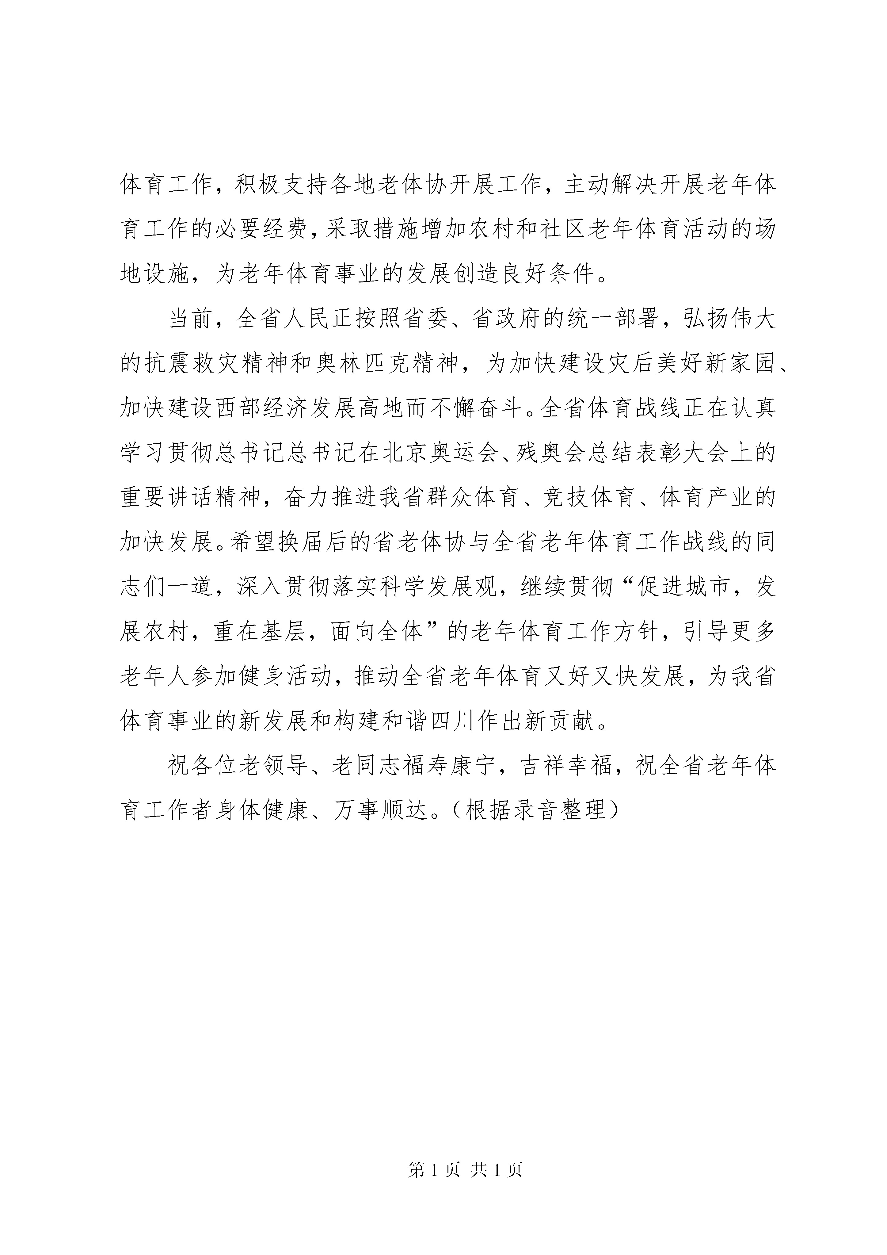 副省长在省老体协换届大会上的讲话副省长在省老体协换届大会上的讲话:尊敬的各位老领导,同志们、朋友们:今天,XX省老年人体育协会换届大会隆重举行。大会总结了过去五年的工作,选举产生了以德高望重的省老领导秦玉琴同志为主席的省老体协新一届领导班子。为此,我代表省人民政府,向这次老年体育盛会的召开表示热烈祝贺。向辛勤工作在全省老年体育工作战线上的各位老领导和老年体育工作者表示敬意和亲切的慰问,并借此机会,向全省老年朋友们致以最美好的祝愿。省老年人体育协会和各级老年人体协认真贯彻《体育法》、《老年人权益保障法》、《全民健身计划纲要》和《XX省全民健身条例》,积极引导广大老年朋友参加科学健康的体育健身活动,有力地推动了全省老年体育工作的发展,取得了显著的成绩。据统计,到,我省经常参加体育健身活动的老年人达520多万,占老年人口总数的45%以上。老年体育不仅成为我省开展全民健身活动的一道亮丽风景,而且为增强老年人体质和构建和谐社会发挥了重要作用,越来越受到各级党政领导的重视和全社会的广泛关注。在此我谨代表省政府向以何郝炬、刘海泉、姜泽亭三位省老领导为主席的历届省老体协领导和全省各级老体协的同志们所作出的贡献表示衷心的感谢。党和政府历来高度重视体育工作,关心人民群众的身体健康。总书记总书记在北京奥运会、残奥会总结表彰大会的重要讲话中指出:“体育是社会发展和人类文明进步的重要标志,是综合国力和社会文明程度的重要体现。成功举办北京奥运会、残奥会,极大激发了亿万人民的体育热情,极大推动了我国体育事业发展。我们要坚持以增强人民体质、提高全民族身体素质和生活质量为目标,高度重视并充分发挥体育在促进人的全面发展、促进经济社会发展中的重要作用,实现竞技体育和群众体育协调发展,进一步推动我国由体育大国向体育强国迈进。”总书记总书记的重要讲话,指明了我国体育事业在新形势下的发展方向和奋斗目标。老年人体育是我国体育事业的重要组成部分,是全民健身活动的重要方面,也是老龄工作的重要内容。做好老年人体育工作,是贯彻落实科学发展观和为和谐社会建设作出积极贡献的重要内容和基本要求。现在,我国和我省老龄人口以每年3%以上的速度递增,预计到,全国老龄人口将达到1.74亿,我省老龄人口将达到1300多万。老年人群是一个特殊的群体,有着特殊的影响,无论在家庭和社会都发挥着特殊的作用。老年人的健康长寿不仅关系到个人和家庭的幸福,而且也是国家长治久安、中华民族伟大复兴的积极因素和力量。没有老年人的健康,就不可能实现全民族的健康。我们一定要充分认识发展老年体育的重要性,进一步增强责任感。各级政府和体育行政部门要进一步贯彻“党政主导、社会参与、全民关怀”的老龄工作方针,高度重视老年体育工作,积极支持各地老体协开展工作,主动解决开展老年体育工作的必要经费,采取措施增加农村和社区老年体育活动的场地设施,为老年体育事业的发展创造良好条件。当前,全省人民正按照省委、省政府的统一部署,弘扬伟大的抗震救灾精神和奥林匹克精神,为加快建设灾后美好新家园、加快建设西部经济发展高地而不懈奋斗。全省体育战线正在认真学习贯彻总书记总书记在北京奥运会、残奥会总结表彰大会上的重要讲话精神,奋力推进我省群众体育、竞技体育、体育产业的加快发展。希望换届后的省老体协与全省老年体育工作战线的同志们一道,深入贯彻落实科学发展观,继续贯彻“促进城市,发展农村,重在基层,面向全体”的老年体育工作方针,引导更多老年人参加健身活动,推动全省老年体育又好又快发展,为我省体育事业的新发展和构建和谐四川作出新贡献。祝各位老领导、老同志福寿康宁,吉祥幸福,祝全省老年体育工作者身体健康、万事顺达。(根据录音整理)