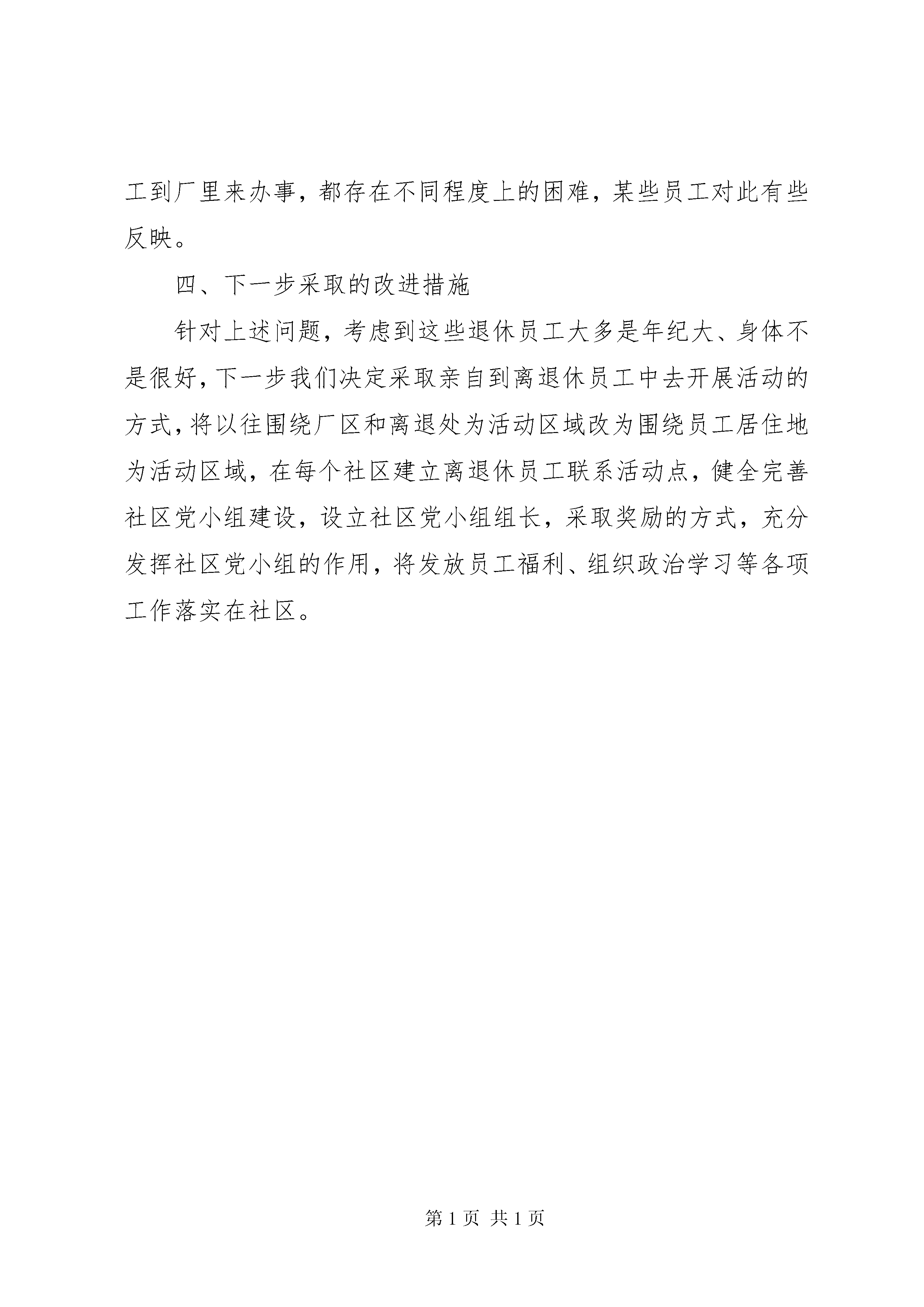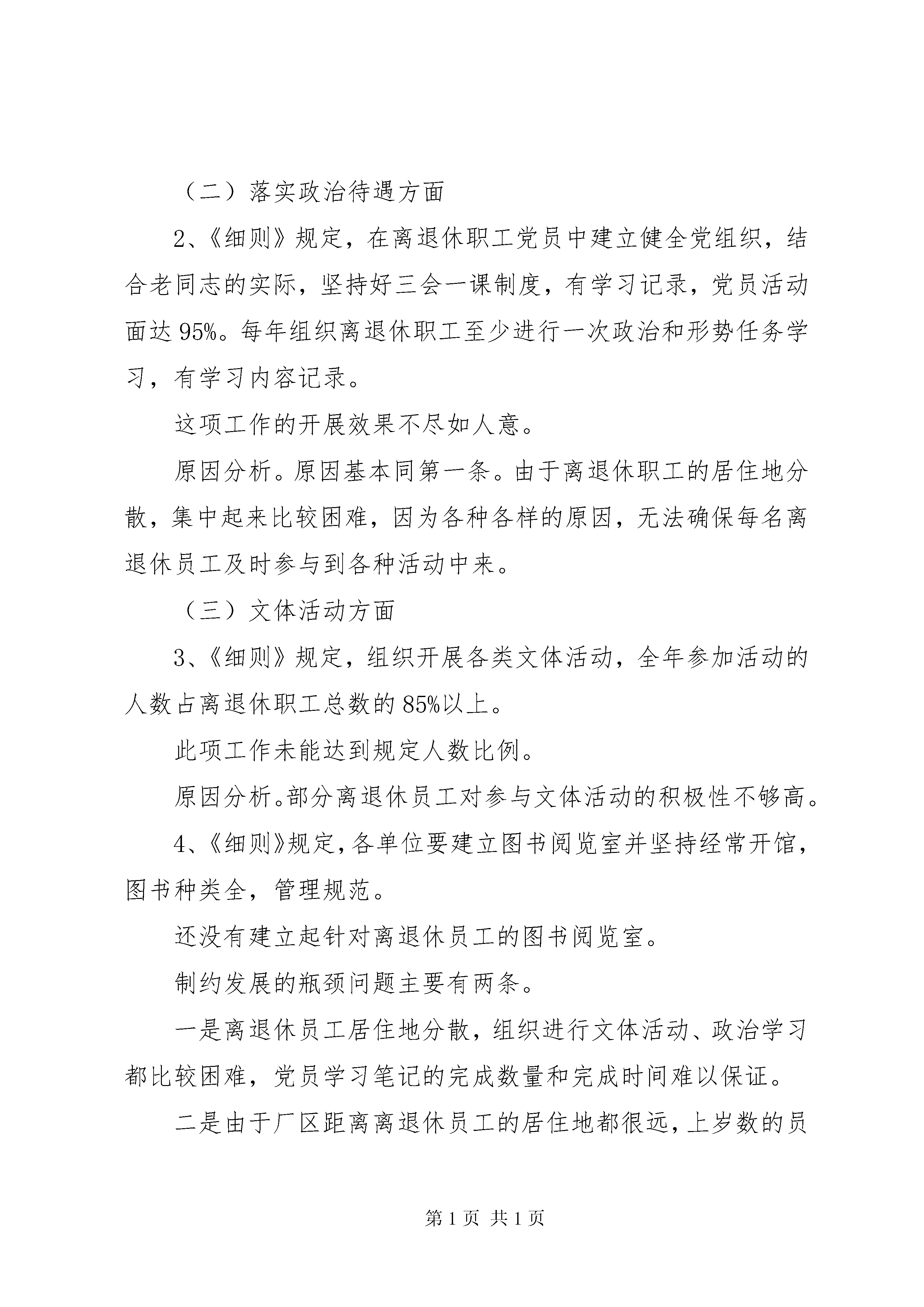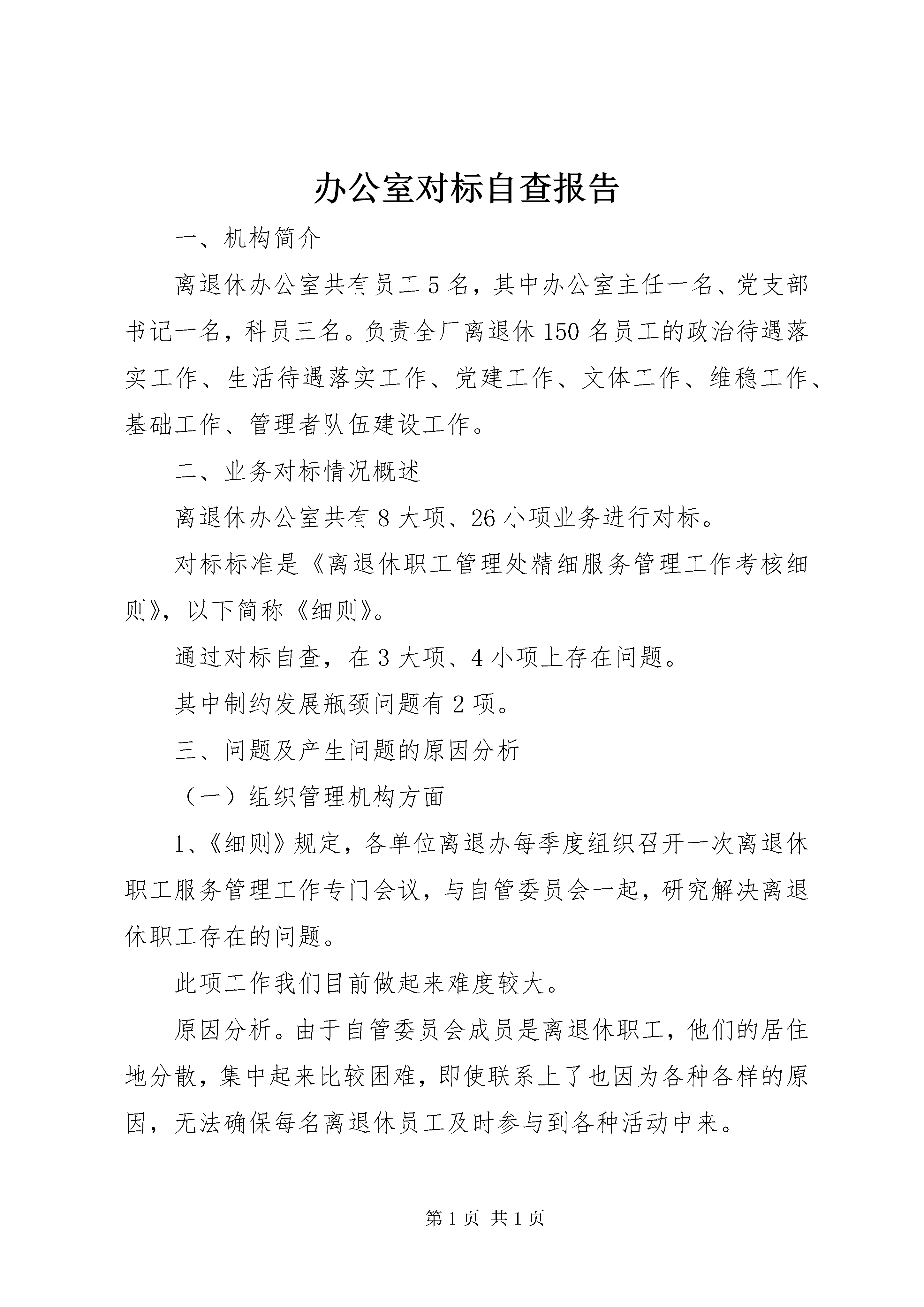 办公室对标自查报告一、机构简介离退休办公室共有员工5名,其中办公室主任一名、党支部书记一名,科员三名。负责全厂离退休150名员工的政治待遇落实工作、生活待遇落实工作、党建工作、文体工作、维稳工作、基础工作、管理者队伍建设工作。二、业务对标情况概述离退休办公室共有8大项、26小项业务进行对标。对标标准是《离退休职工管理处精细服务管理工作考核细则》,以下简称《细则》。通过对标自查,在3大项、4小项上存在问题。其中制约发展瓶颈问题有2项。三、问题及产生问题的原因分析(一)组织管理机构方面1、《细则》规定,各单位离退办每季度组织召开一次离退休职工服务管理工作专门会议,与自管委员会一起,研究解决离退休职工存在的问题。此项工作我们目前做起来难度较大。原因分析。由于自管委员会成员是离退休职工,他们的居住地分散,集中起来比较困难,即使联系上了也因为各种各样的原因,无法确保每名离退休员工及时参与到各种活动中来。(二)落实政治待遇方面2、《细则》规定,在离退休职工党员中建立健全党组织,结合老同志的实际,坚持好三会一课制度,有学习记录,党员活动面达95%。每年组织离退休职工至少进行一次政治和形势任务学习,有学习内容记录。这项工作的开展效果不尽如人意。原因分析。原因基本同第一条。由于离退休职工的居住地分散,集中起来比较困难,因为各种各样的原因,无法确保每名离退休员工及时参与到各种活动中来。(三)文体活动方面3、《细则》规定,组织开展各类文体活动,全年参加活动的人数占离退休职工总数的85%以上。此项工作未能达到规定人数比例。原因分析。部分离退休员工对参与文体活动的积极性不够高。4、《细则》规定,各单位要建立图书阅览室并坚持经常开馆,图书种类全,管理规范。还没有建立起针对离退休员工的图书阅览室。制约发展的瓶颈问题主要有两条。一是离退休员工居住地分散,组织进行文体活动、政治学习都比较困难,党员学习笔记的完成数量和完成时间难以保证。二是由于厂区距离离退休员工的居住地都很远,上岁数的员工到厂里来办事,都存在不同程度上的困难,某些员工对此有些反映。四、下一步采取的改进措施针对上述问题,考虑到这些退休员工大多是年纪大、身体不是很好,下一步我们决定采取亲自到离退休员工中去开展活动的方式,将以往围绕厂区和离退处为活动区域改为围绕员工居住地为活动区域,在每个社区建立离退休员工联系活动点,健全完善社区党小组建设,设立社区党小组组长,采取奖励的方式,充分发挥社区党小组的作用,将发放员工福利、组织政治学习等各项工作落实在社区。