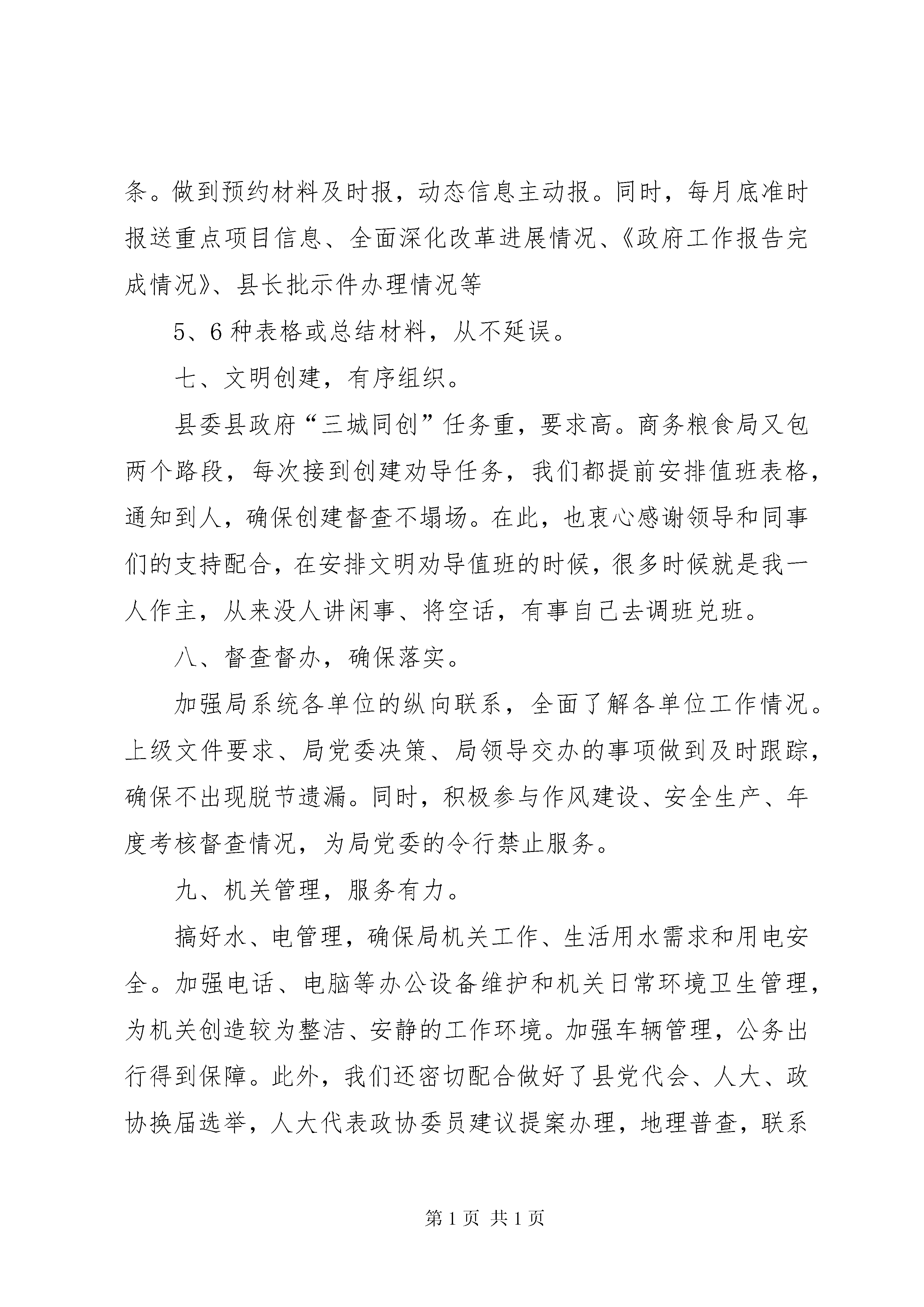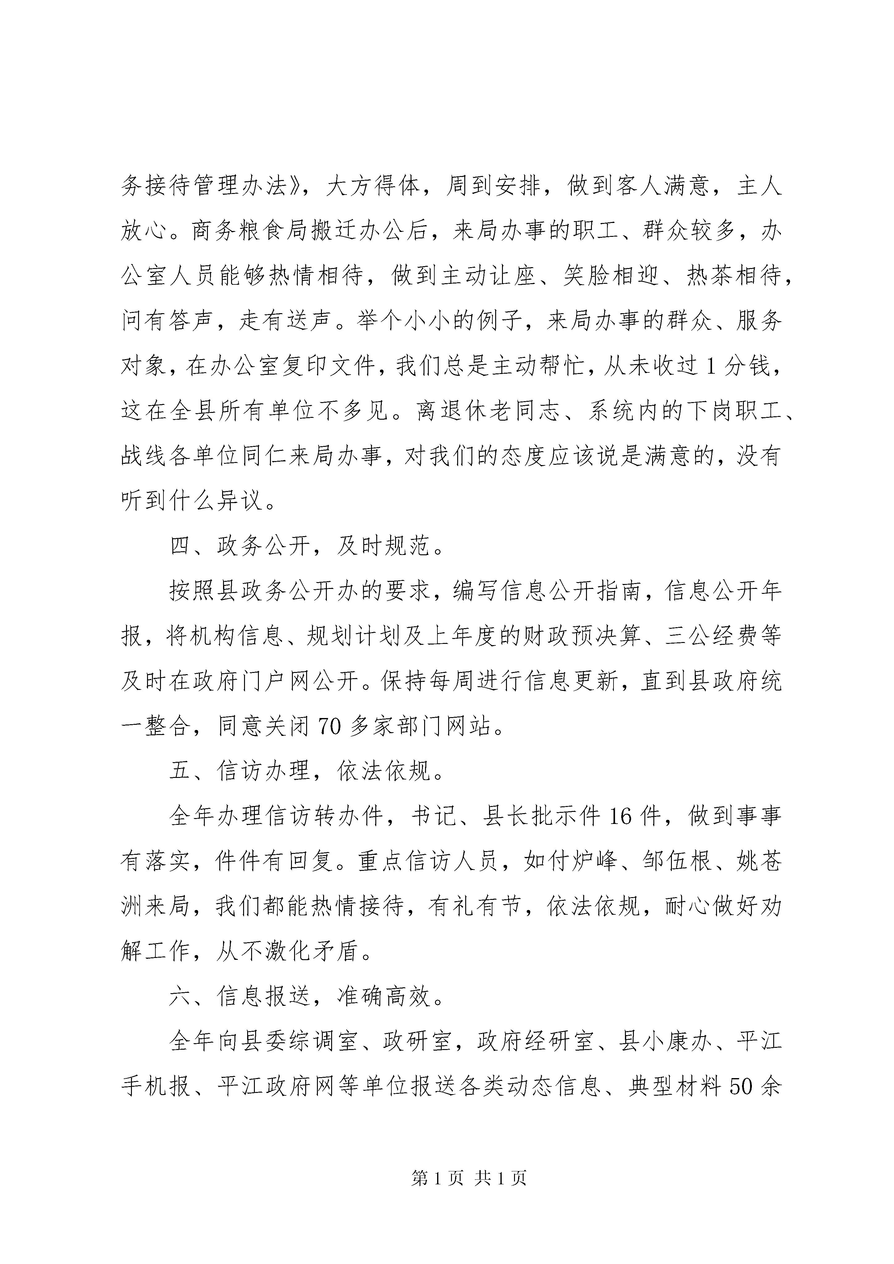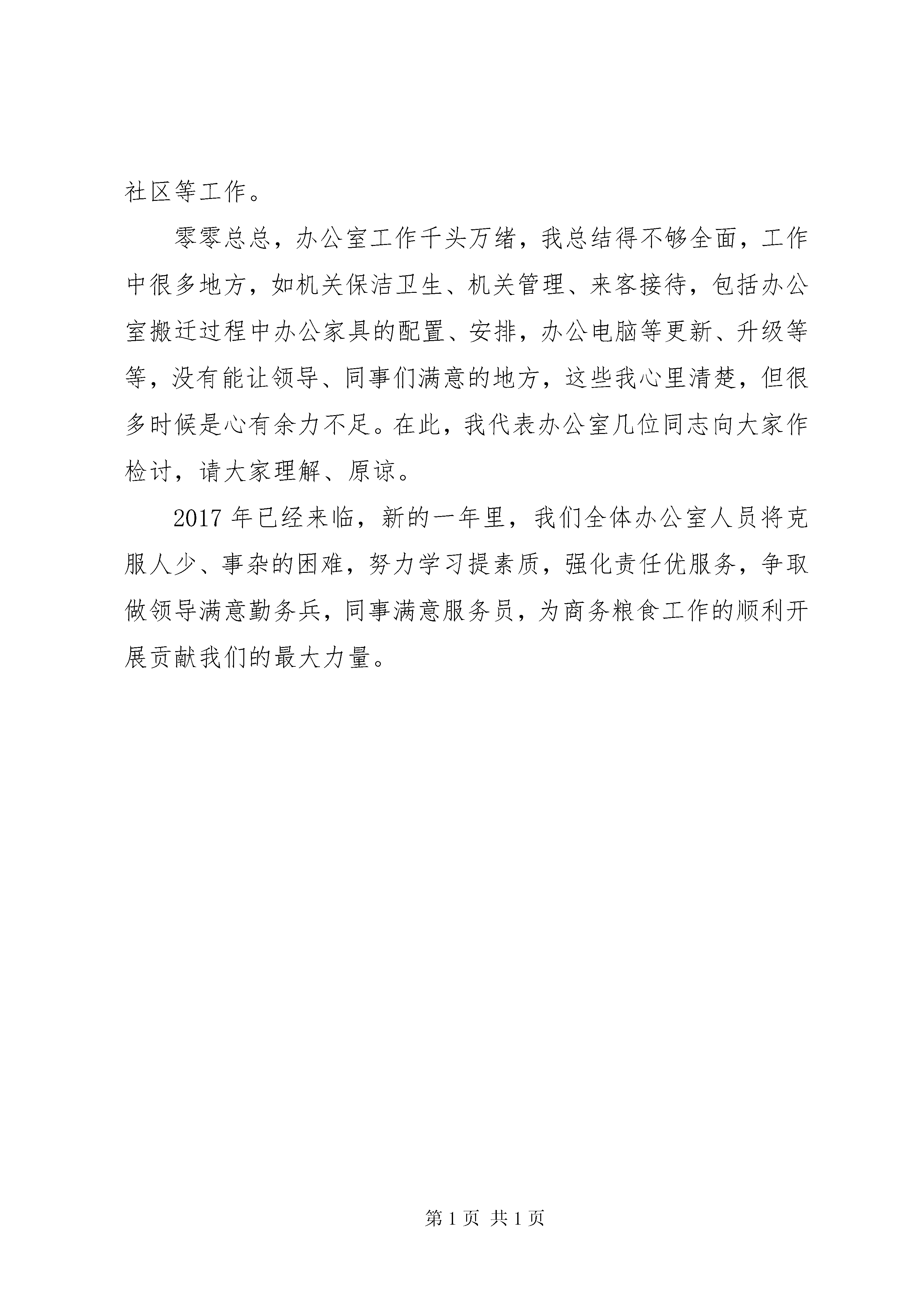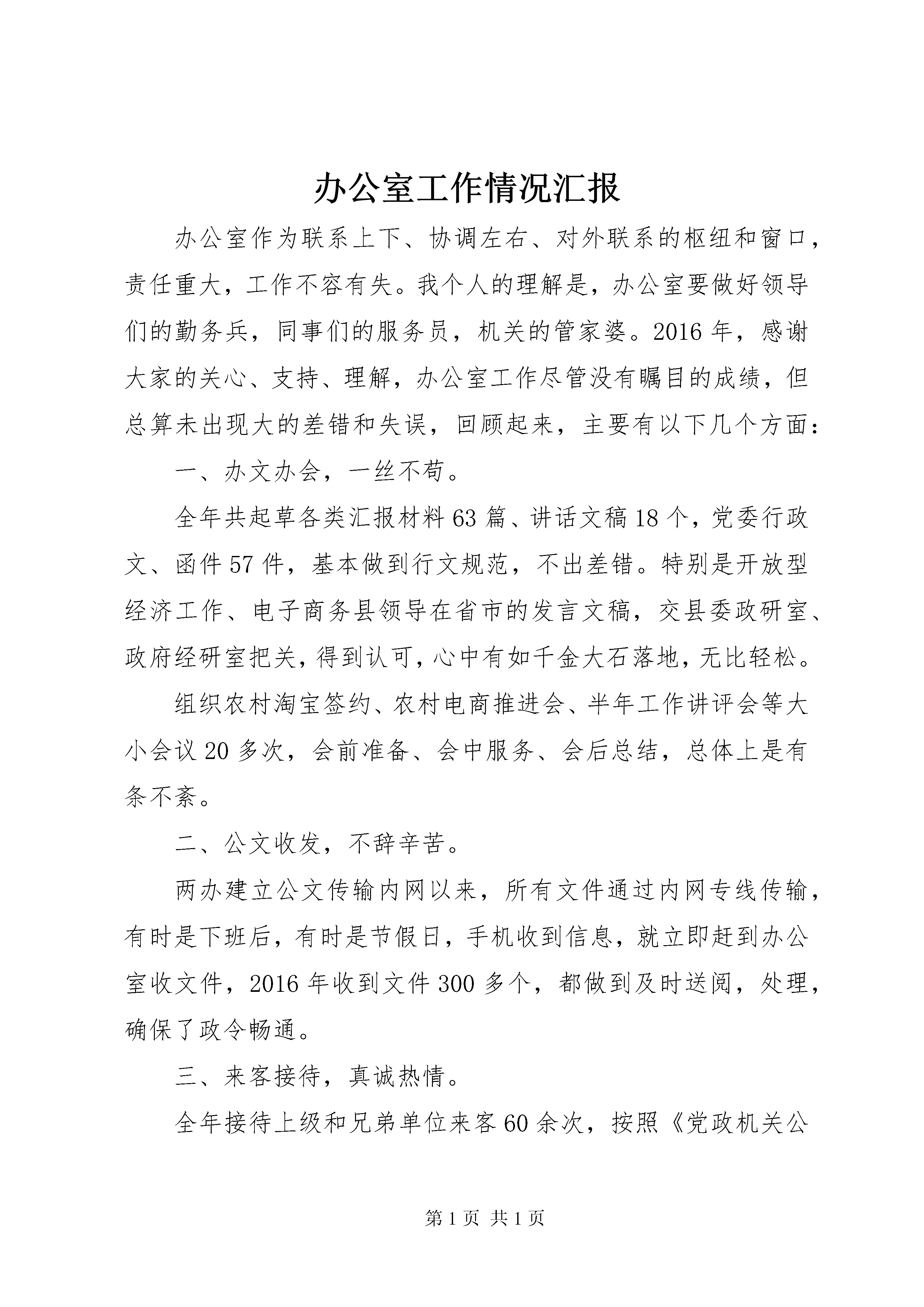 办公室工作情况汇报办公室作为联系上下、协调左右、对外联系的枢纽和窗口,责任重大,工作不容有失。我个人的理解是,办公室要做好领导们的勤务兵,同事们的服务员,机关的管家婆。2016年,感谢大家的关心、支持、理解,办公室工作尽管没有瞩目的成绩,但总算未出现大的差错和失误,回顾起来,主要有以下几个方面:一、办文办会,一丝不苟。全年共起草各类汇报材料63篇、讲话文稿18个,党委行政文、函件57件,基本做到行文规范,不出差错。特别是开放型经济工作、电子商务县领导在省市的发言文稿,交县委政研室、政府经研室把关,得到认可,心中有如千金大石落地,无比轻松。组织农村淘宝签约、农村电商推进会、半年工作讲评会等大小会议20多次,会前准备、会中服务、会后总结,总体上是有条不紊。二、公文收发,不辞辛苦。两办建立公文传输内网以来,所有文件通过内网专线传输,有时是下班后,有时是节假日,手机收到信息,就立即赶到办公室收文件,2016年收到文件300多个,都做到及时送阅,处理,确保了政令畅通。三、来客接待,真诚热情。全年接待上级和兄弟单位来客60余次,按照《党政机关公务接待管理办法》,大方得体,周到安排,做到客人满意,主人放心。商务粮食局搬迁办公后,来局办事的职工、群众较多,办公室人员能够热情相待,做到主动让座、笑脸相迎、热茶相待,问有答声,走有送声。举个小小的例子,来局办事的群众、服务对象,在办公室复印文件,我们总是主动帮忙,从未收过1分钱,这在全县所有单位不多见。离退休老同志、系统内的下岗职工、战线各单位同仁来局办事,对我们的态度应该说是满意的,没有听到什么异议。四、政务公开,及时规范。按照县政务公开办的要求,编写信息公开指南,信息公开年报,将机构信息、规划计划及上年度的财政预决算、三公经费等及时在政府门户网公开。保持每周进行信息更新,直到县政府统一整合,同意关闭70多家部门网站。五、信访办理,依法依规。全年办理信访转办件,书记、县长批示件16件,做到事事有落实,件件有回复。重点信访人员,如付炉峰、邹伍根、姚苍洲来局,我们都能热情接待,有礼有节,依法依规,耐心做好劝解工作,从不激化矛盾。六、信息报送,准确高效。全年向县委综调室、政研室,政府经研室、县小康办、平江手机报、平江政府网等单位报送各类动态信息、典型材料50余条。做到预约材料及时报,动态信息主动报。同时,每月底准时报送重点项目信息、全面深化改革进展情况、《政府工作报告完成情况》、县长批示件办理情况等5、6种表格或总结材料,从不延误。七、文明创建,有序组织。县委县政府“三城同创”任务重,要求高。商务粮食局又包两个路段,每次接到创建劝导任务,我们都提前安排值班表格,通知到人,确保创建督查不塌场。在此,也衷心感谢领导和同事们的支持配合,在安排文明劝导值班的时候,很多时候就是我一人作主,从来没人讲闲事、将空话,有事自己去调班兑班。八、督查督办,确保落实。加强局系统各单位的纵向联系,全面了解各单位工作情况。上级文件要求、局党委决策、局领导交办的事项做到及时跟踪,确保不出现脱节遗漏。同时,积极参与作风建设、安全生产、年度考核督查情况,为局党委的令行禁止服务。九、机关管理,服务有力。搞好水、电管理,确保局机关工作、生活用水需求和用电安全。加强电话、电脑等办公设备维护和机关日常环境卫生管理,为机关创造较为整洁、安静的工作环境。加强车辆管理,公务出行得到保障。此外,我们还密切配合做好了县党代会、人大、政协换届选举,人大代表政协委员建议提案办理,地理普查,联系社区等工作。零零总总,办公室工作千头万绪,我总结得不够全面,工作中很多地方,如机关保洁卫生、机关管理、来客接待,包括办公室搬迁过程中办公家具的配置、安排,办公电脑等更新、升级等等,没有能让领导、同事们满意的地方,这些我心里清楚,但很多时候是心有余力不足。在此,我代表办公室几位同志向大家作检讨,请大家理解、原谅。2017年已经来临,新的一年里,我们全体办公室人员将克服人少、事杂的困难,努力学习提素质,强化责任优服务,争取做领导满意勤务兵,同事满意服务员,为商务粮食工作的顺利开展贡献我们的最大力量。