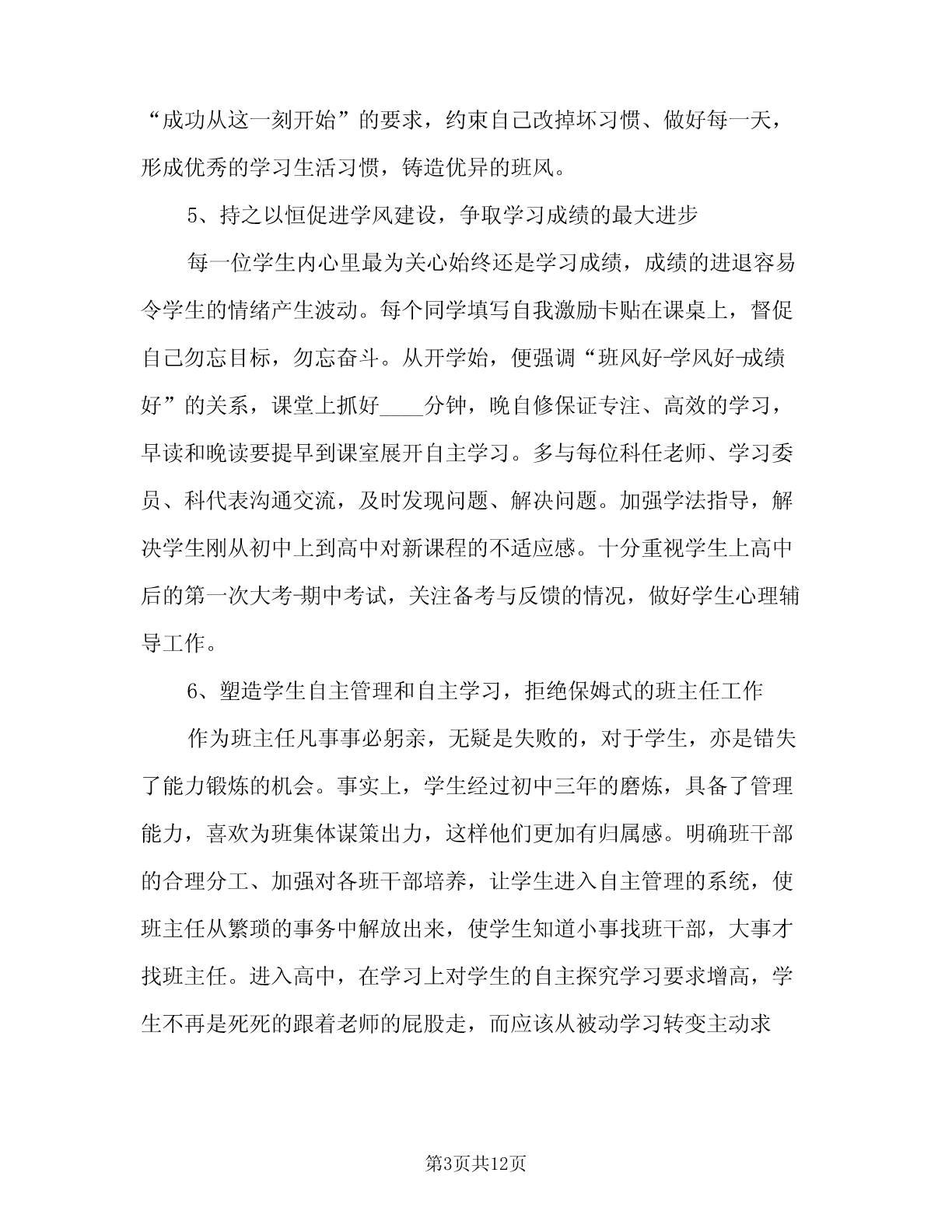 高中班主任工作计划书 转眼过完了忙碌的一学期,作为高一班主任,我严格按照学校的 要求,学生和家长的需要,一切以学生为中心。按照自己所制定的高 一班主任工作计划,一丝不苟的工作,虽然在做班主任工作总结时仍 有不足,但还是满载收获的喜悦。又快到了新的学期,以下是我新的 高一班主任工作计划。 一、指导思想:深刻领会____教育方针和《中学生德育大纲》的 方向,结合学校“人本、和谐”的理念和德育工作的要求,抓好班级 教育工作。 二、奋斗目标:将本班建设具有“团结、严谨、奋发、拼搏”的 班风,争当学校先进文明班;让学生养成优秀的习惯,为高中三年打下 坚实的基础,抒写人生中闪亮绚丽的青春风采。 三、班级基本情况:本班是一个由____名来自各镇、街道组成的 新集体;其中男生____人,女生____人;正取生____人,择校生____人;住 宿____人;低保户____人。 四、本学期班主任工作基本要点: 1、增强凝聚力,形成团结、互助互爱的班集体 通过军训、班会、团活动、校运会等活动不断将这个新集体建设 成为一个团结和谐、奋发进取的团队,形成“同舟共济”、“共同进 步”、“班荣我荣、班耻我耻”的思想,让每一位同学都努力为班争 光,使班级最终是战无不摧、脱颖而出,让每一位同学对班集体都有 一种归属感与荣耀感。 2、民主竞选,建立一支让人信服的、强而有力的班干部队伍 通过阅读学生档案、军训几天的观察,心里初步确定了几个当班 干部的人才,并找其单独谈话,鼓励他们勇于挑起重任、为班作贡 献,准备好竞选演讲。开学后的第二天,利用班会课举行了气氛热烈 的班干部竞选活动,再通过全班同学的不记名投票,最终选出每个岗 位的人选。具体而合理分工,让每位班干部都感觉到自己的重要性, 并非有名无实。 3、制定班规,落实每月操行评分细则的执行 国有国法,班有班规;制定班规,使班级有规可依,让学生们明白 遵守规矩就可以享受到最大的自由权利。每个班干部负责不同的操行 评分的登记,比如副班长负责考勤,科代表负责作业的完成状况,团 支书记录班团活动积极参加者,劳动委员负责清洁方面……每天都有 值日班干部,并对当天的一切情况做好记录;每个班干部要对自己的工 作进行每周总结交给班长汇总,然后向班主任汇报。每个月根据操行 分评选出三名文明之星。 4、狠抓常规,力求每位同学都形成优秀的行为习惯 课堂纪律、公区和课室清洁、早操出勤、宿舍内务清洁、午晚睡 的纪律,这些都是常规管理的重点,积极配合年级“头一个月不放 假”的措施,在这____天里勤下班督促和管理,鼓励每一个同学都以 “成功从这一刻开始”的要求,约束自己改掉坏习惯、做好每一天, 形成优秀的学习生活习惯,铸造优异的班风。 5、持之以恒促进学风建设,争取学习成绩的最大进步 每一位学生内心里最为关心始终还是学习成绩,成绩的进退容易 令学生的情绪产生波动。每个同学填写自我激励卡贴在课桌上,督促 自己勿忘目标,勿忘奋斗。从开学始,便强调“班风好-学风好-成绩 好”的关系,课堂上抓好____分钟,晚自修保证专注、高效的学习, 早读和晚读要提早到课室展开自主学习。多与每位科任老师、学习委 员、科代表沟通交流,及时发现问题、解决问题。加强学法指导,解 决学生刚从初中上到高中对新课程的不适应感。十分重视学生上高中 后的第一次大考-期中考试,关注备考与反馈的情况,做好学生心理辅 导工作。 6、塑造学生自主管理和自主学习,拒绝保姆式的班主任工作 作为班主任凡事事必躬亲,无疑是失败的,对于学生,亦是错失 了能力锻炼的机会。事实上,学生经过初中三年的磨炼,具备了管理 能力,喜欢为班集体谋策出力,这样他们更加有归属感。明确班干部 的合理分工、加强对各班干部培养,让学生进入自主管理的系统,使 班主任从繁琐的事务中解放出来,使学生知道小事找班干部,大事才 找班主任。进入高中,在学习上对学生的自主探究学习要求增高,学 生不再是死死的跟着老师的屁股走,而应该从被动学习转变主动求 知,减少学生对教师的依赖性,这就要求学生明确目标、做好学习计 划、严格执行、定期反馈总结,提高学习效率。 7、加强家校联系,同心协力培育学生成才 学生的教育不仅仅是学校的责任,学校与家长必须架起沟通的桥 梁,及时、切实和高效地解决每一位学生面临的问题。通过电话、邀 请家长到校等方式,加强沟通,及时了解学生的各方面动态,有效地 做好学生的思想工作。 高中班主任工作计划书(二) 一.指导思想 树立“素质教育、德育为先”的教育思想,坚持从我校的实际出 发、从班情出发,遵循学生的身心发展要求,以加强学生思想道德建 设为重点。以“四清”体