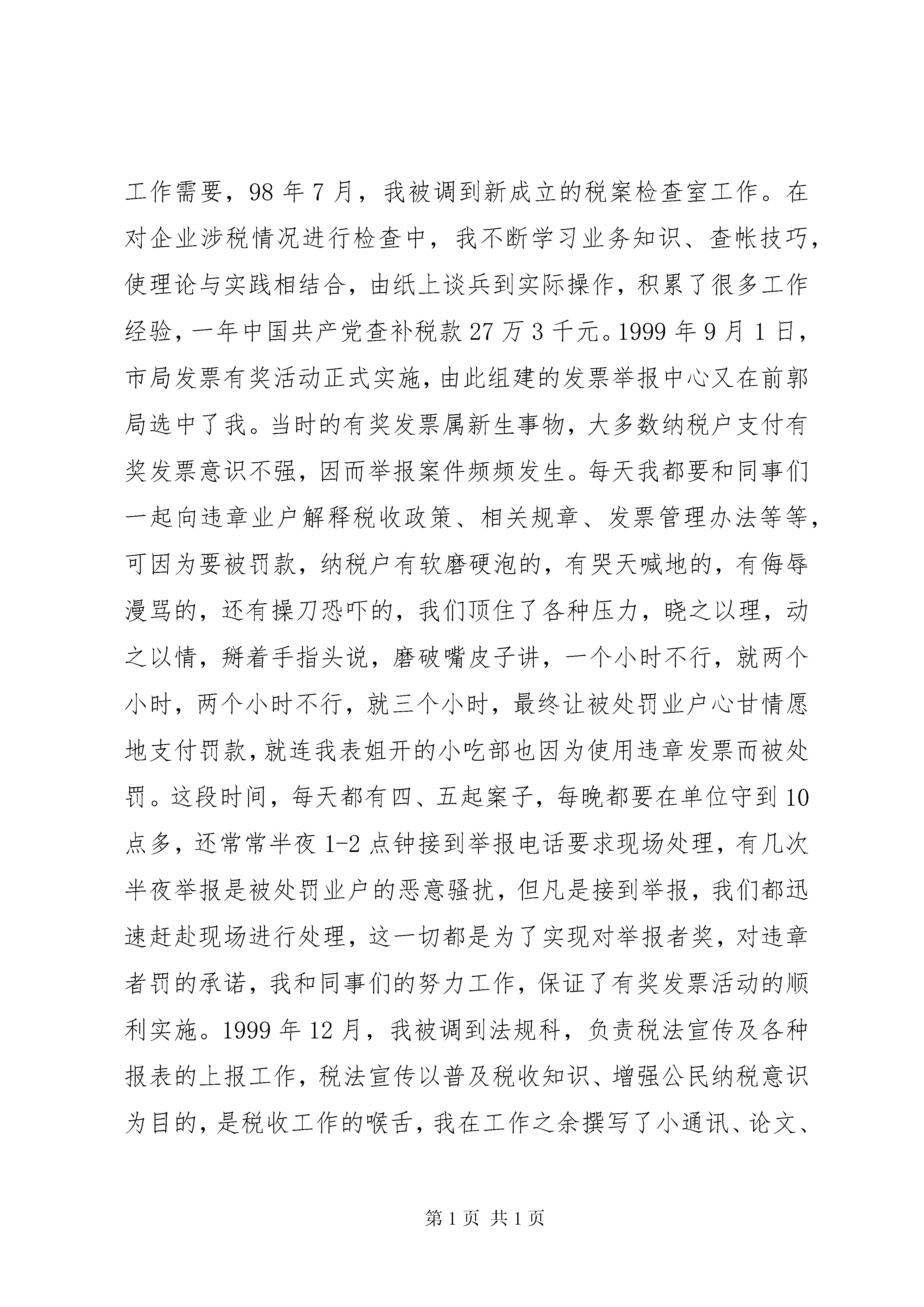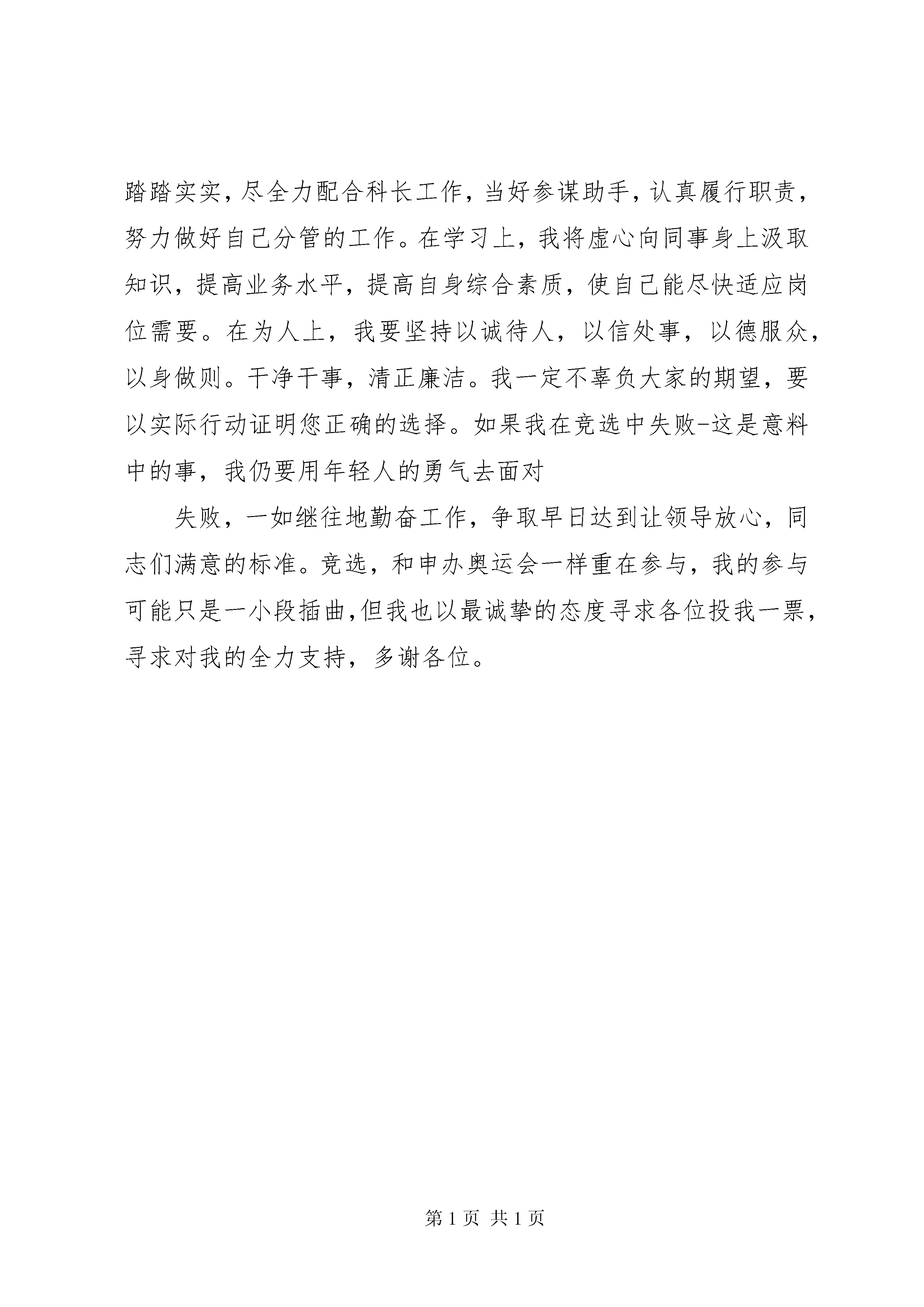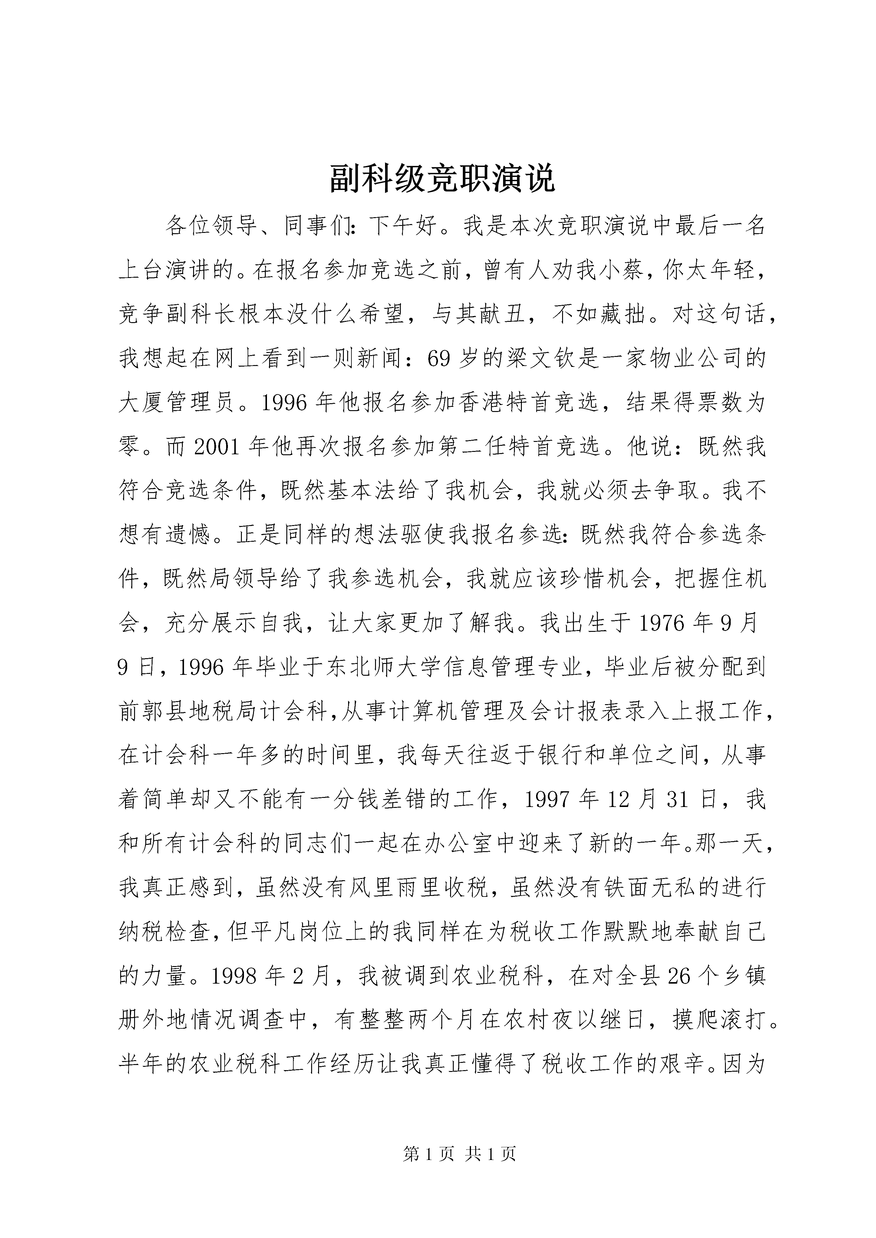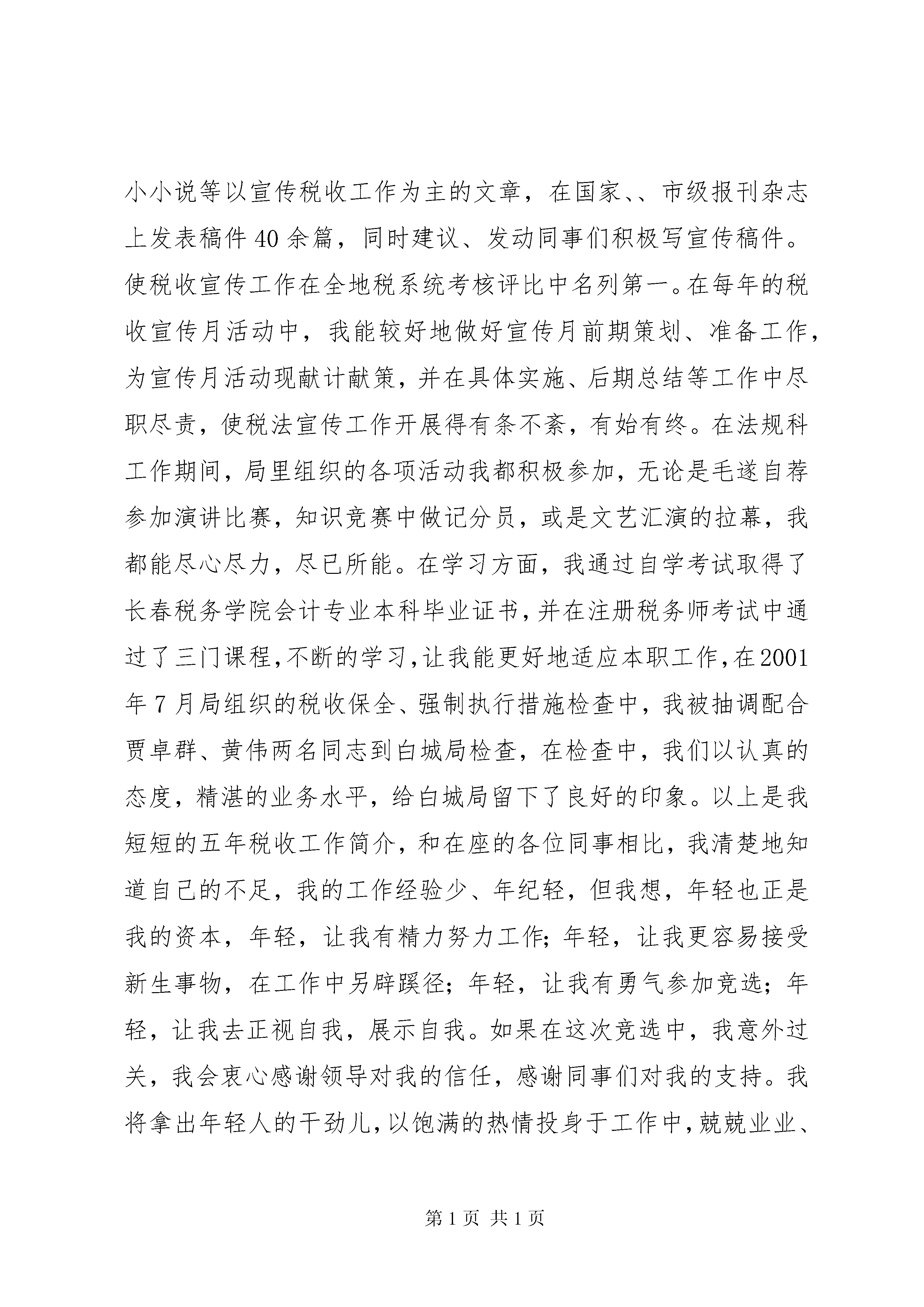 副科级竞职演说各位领导、同事们:下午好。我是本次竞职演说中最后一名上台演讲的。在报名参加竞选之前,曾有人劝我小蔡,你太年轻,竞争副科长根本没什么希望,与其献丑,不如藏拙。对这句话,我想起在网上看到一则新闻:69岁的梁文钦是一家物业公司的大厦管理员。1996年他报名参加香港特首竞选,结果得票数为零。而2001年他再次报名参加第二任特首竞选。他说:既然我符合竞选条件,既然基本法给了我机会,我就必须去争取。我不想有遗憾。正是同样的想法驱使我报名参选:既然我符合参选条件,既然局领导给了我参选机会,我就应该珍惜机会,把握住机会,充分展示自我,让大家更加了解我。我出生于1976年9月9日,1996年毕业于东北师大学信息管理专业,毕业后被分配到前郭县地税局计会科,从事计算机管理及会计报表录入上报工作,在计会科一年多的时间里,我每天往返于银行和单位之间,从事着简单却又不能有一分钱差错的工作,1997年12月31日,我和所有计会科的同志们一起在办公室中迎来了新的一年。那一天,我真正感到,虽然没有风里雨里收税,虽然没有铁面无私的进行纳税检查,但平凡岗位上的我同样在为税收工作默默地奉献自己的力量。1998年2月,我被调到农业税科,在对全县26个乡镇册外地情况调查中,有整整两个月在农村夜以继日,摸爬滚打。半年的农业税科工作经历让我真正懂得了税收工作的艰辛。因为工作需要,98年7月,我被调到新成立的税案检查室工作。在对企业涉税情况进行检查中,我不断学习业务知识、查帐技巧,使理论与实践相结合,由纸上谈兵到实际操作,积累了很多工作经验,一年中国共产党查补税款27万3千元。1999年9月1日,市局发票有奖活动正式实施,由此组建的发票举报中心又在前郭局选中了我。当时的有奖发票属新生事物,大多数纳税户支付有奖发票意识不强,因而举报案件频频发生。每天我都要和同事们一起向违章业户解释税收政策、相关规章、发票管理办法等等,可因为要被罚款,纳税户有软磨硬泡的,有哭天喊地的,有侮辱漫骂的,还有操刀恐吓的,我们顶住了各种压力,晓之以理,动之以情,掰着手指头说,磨破嘴皮子讲,一个小时不行,就两个小时,两个小时不行,就三个小时,最终让被处罚业户心甘情愿地支付罚款,就连我表姐开的小吃部也因为使用违章发票而被处罚。这段时间,每天都有四、五起案子,每晚都要在单位守到10点多,还常常半夜1-2点钟接到举报电话要求现场处理,有几次半夜举报是被处罚业户的恶意骚扰,但凡是接到举报,我们都迅速赶赴现场进行处理,这一切都是为了实现对举报者奖,对违章者罚的承诺,我和同事们的努力工作,保证了有奖发票活动的顺利实施。1999年12月,我被调到法规科,负责税法宣传及各种报表的上报工作,税法宣传以普及税收知识、增强公民纳税意识为目的,是税收工作的喉舌,我在工作之余撰写了小通讯、论文、小小说等以宣传税收工作为主的文章,在国家、、市级报刊杂志上发表稿件40余篇,同时建议、发动同事们积极写宣传稿件。使税收宣传工作在全地税系统考核评比中名列第一。在每年的税收宣传月活动中,我能较好地做好宣传月前期策划、准备工作,为宣传月活动现献计献策,并在具体实施、后期总结等工作中尽职尽责,使税法宣传工作开展得有条不紊,有始有终。在法规科工作期间,局里组织的各项活动我都积极参加,无论是毛遂自荐参加演讲比赛,知识竞赛中做记分员,或是文艺汇演的拉幕,我都能尽心尽力,尽已所能。在学习方面,我通过自学考试取得了长春税务学院会计专业本科毕业证书,并在注册税务师考试中通过了三门课程,不断的学习,让我能更好地适应本职工作,在2001年7月局组织的税收保全、强制执行措施检查中,我被抽调配合贾卓群、黄伟两名同志到白城局检查,在检查中,我们以认真的态度,精湛的业务水平,给白城局留下了良好的印象。以上是我短短的五年税收工作简介,和在座的各位同事相比,我清楚地知道自己的不足,我的工作经验少、年纪轻,但我想,年轻也正是我的资本,年轻,让我有精力努力工作;年轻,让我更容易接受新生事物,在工作中另辟蹊径;年轻,让我有勇气参加竞选;年轻,让我去正视自我,展示自我。如果在这次竞选中,我意外过关,我会衷心感谢领导对我的信任,感谢同事们对我的支持。我将拿出年轻人的干劲儿,以饱满的热情投身于工作中,兢兢业业、踏踏实实,尽全力配合科长工作,当好参谋助手,认真履行职责,努力做好自己分管的工作。在学习上,我将虚心向同事身上汲取知识,提高业务水平,提高自身综合素质,使自己能尽快适应岗位需要。在为人上,我要坚持以诚待人,以信处事,以德服众,以身做则。干净干事,清正廉洁。我一定不辜负大家的期望,要以实际行动证明您正确的选择。如果我在竞选中失败-这是意料中的事,我仍要用年轻人的勇气去面对失败,一如继往地勤奋工作,争取早日达到让领导放心,同志们满意的标准。竞选