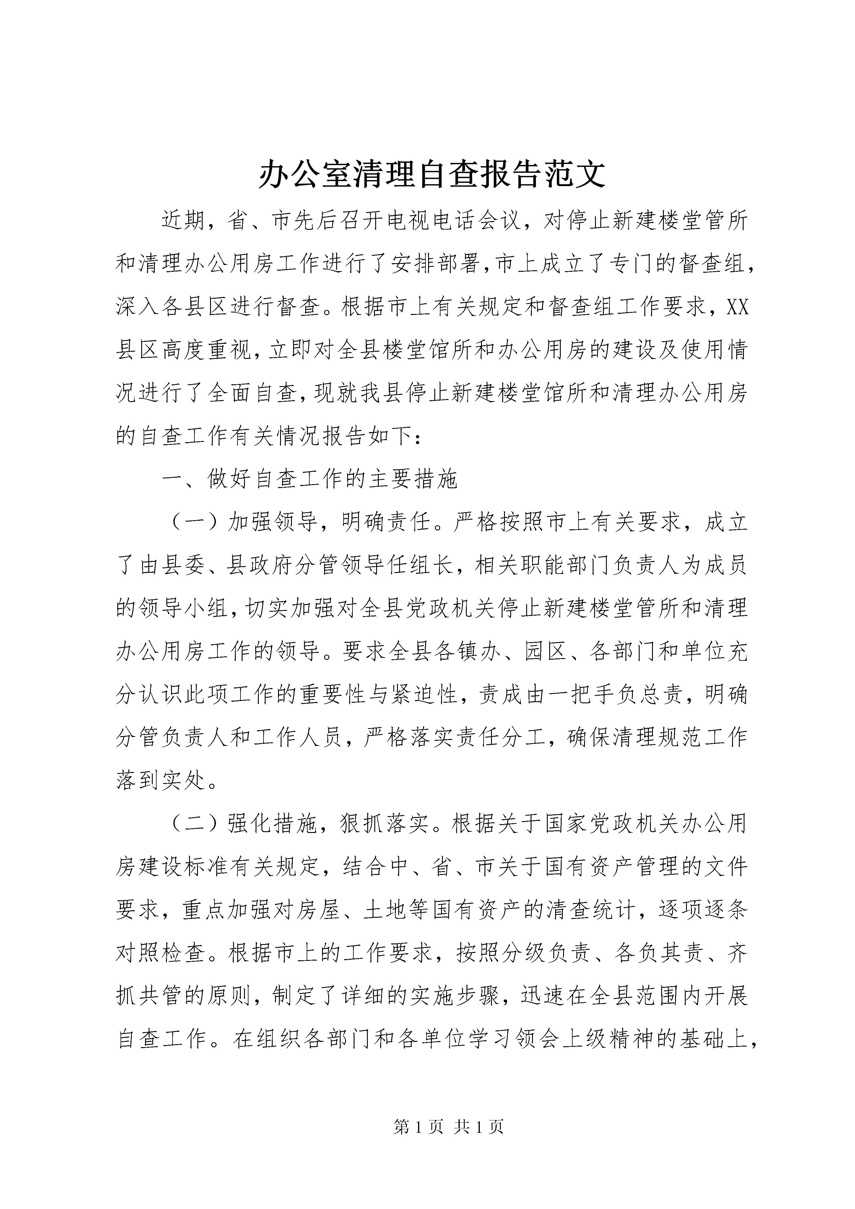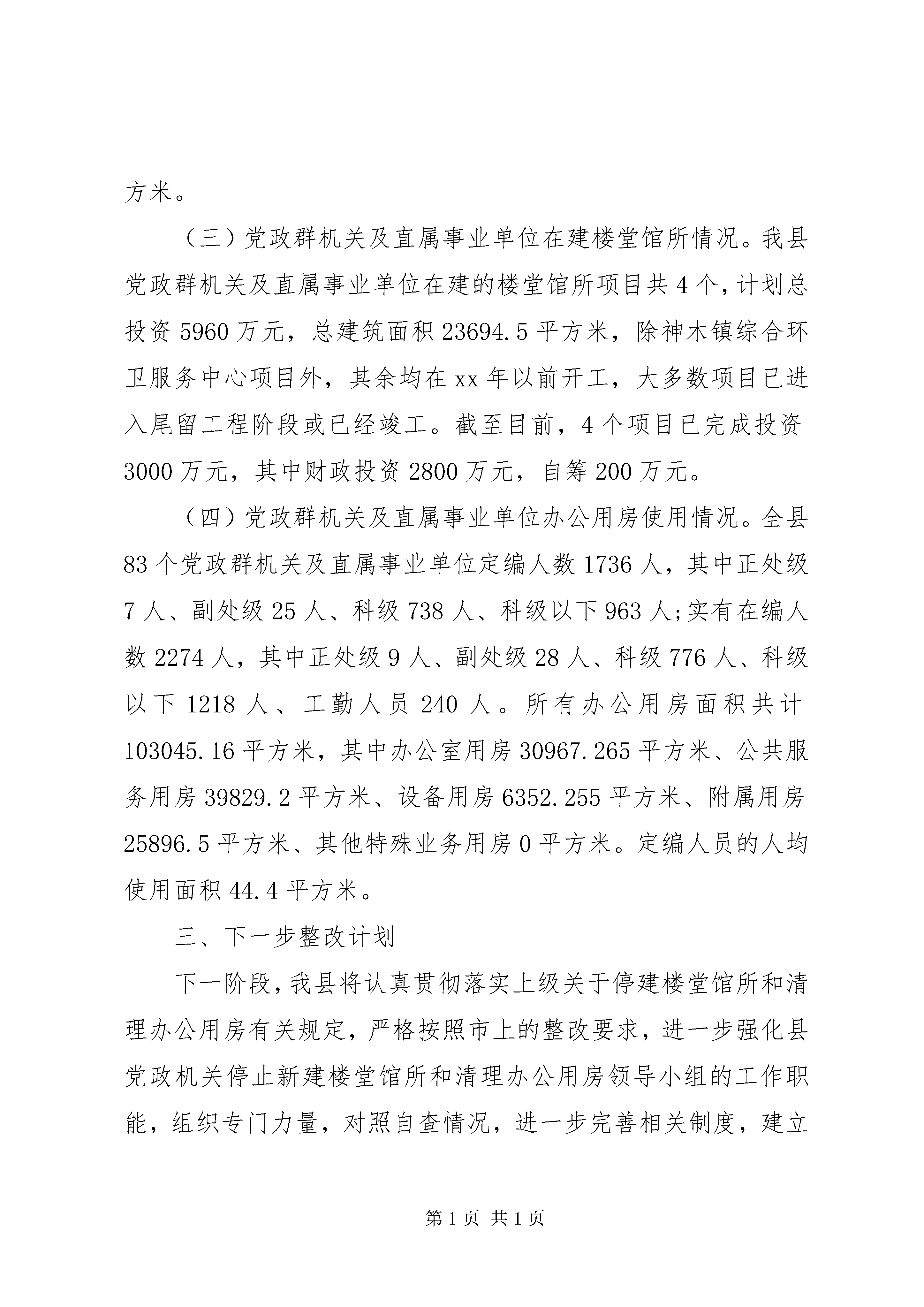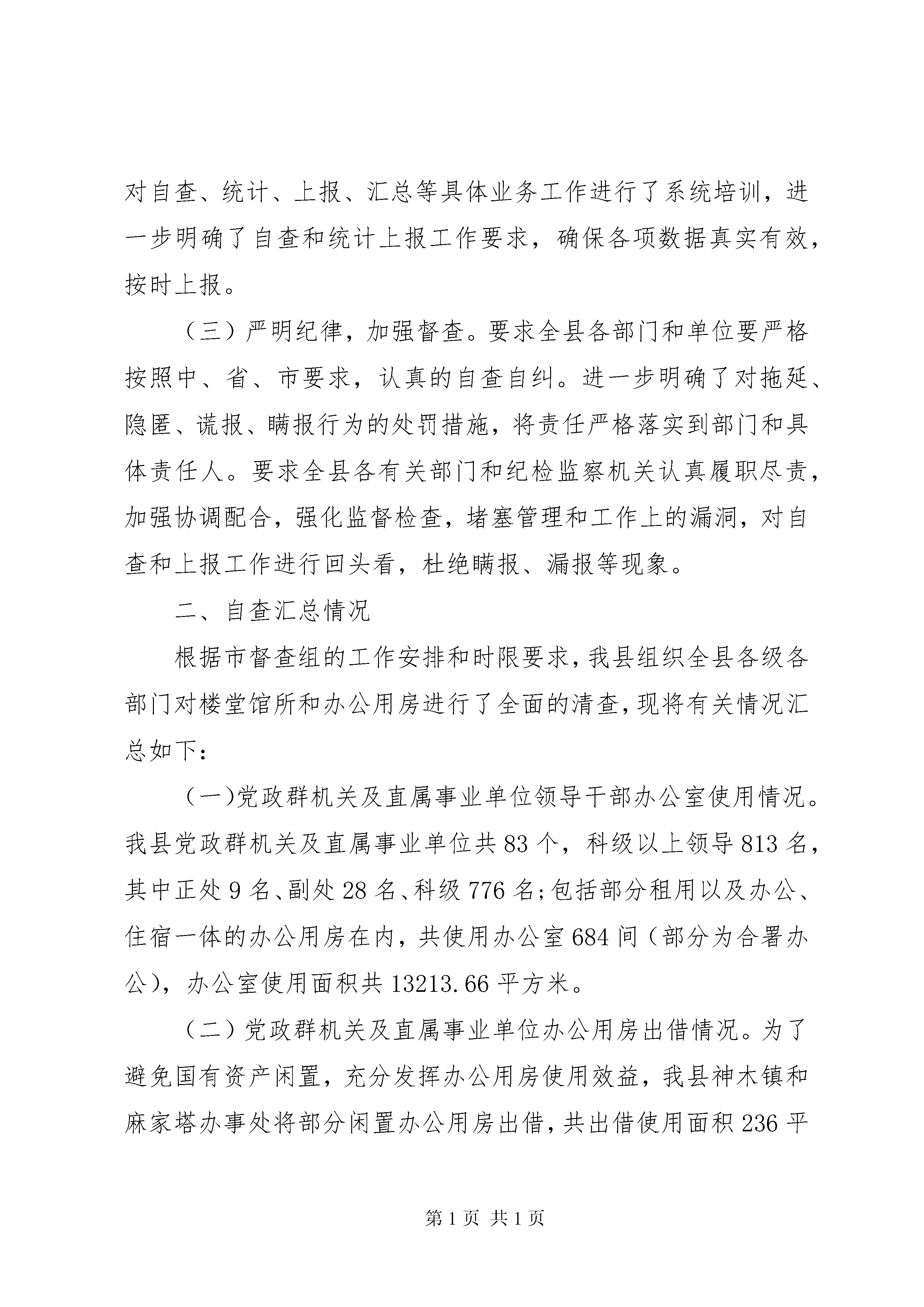 办公室清理自查报告范文近期,省、市先后召开电视电话会议,对停止新建楼堂管所和清理办公用房工作进行了安排部署,市上成立了专门的督查组,深入各县区进行督查。根据市上有关规定和督查组工作要求,XX县区高度重视,立即对全县楼堂馆所和办公用房的建设及使用情况进行了全面自查,现就我县停止新建楼堂馆所和清理办公用房的自查工作有关情况报告如下:一、做好自查工作的主要措施(一)加强领导,明确责任。严格按照市上有关要求,成立了由县委、县政府分管领导任组长,相关职能部门负责人为成员的领导小组,切实加强对全县党政机关停止新建楼堂管所和清理办公用房工作的领导。要求全县各镇办、园区、各部门和单位充分认识此项工作的重要性与紧迫性,责成由一把手负总责,明确分管负责人和工作人员,严格落实责任分工,确保清理规范工作落到实处。(二)强化措施,狠抓落实。根据关于国家党政机关办公用房建设标准有关规定,结合中、省、市关于国有资产管理的文件要求,重点加强对房屋、土地等国有资产的清查统计,逐项逐条对照检查。根据市上的工作要求,按照分级负责、各负其责、齐抓共管的原则,制定了详细的实施步骤,迅速在全县范围内开展自查工作。在组织各部门和各单位学习领会上级精神的基础上,对自查、统计、上报、汇总等具体业务工作进行了系统培训,进一步明确了自查和统计上报工作要求,确保各项数据真实有效,按时上报。(三)严明纪律,加强督查。要求全县各部门和单位要严格按照中、省、市要求,认真的自查自纠。进一步明确了对拖延、隐匿、谎报、瞒报行为的处罚措施,将责任严格落实到部门和具体责任人。要求全县各有关部门和纪检监察机关认真履职尽责,加强协调配合,强化监督检查,堵塞管理和工作上的漏洞,对自查和上报工作进行回头看,杜绝瞒报、漏报等现象。二、自查汇总情况根据市督查组的工作安排和时限要求,我县组织全县各级各部门对楼堂馆所和办公用房进行了全面的清查,现将有关情况汇总如下:(一)党政群机关及直属事业单位领导干部办公室使用情况。我县党政群机关及直属事业单位共83个,科级以上领导813名,其中正处9名、副处28名、科级776名;包括部分租用以及办公、住宿一体的办公用房在内,共使用办公室684间(部分为合署办公),办公室使用面积共13213.66平方米。(二)党政群机关及直属事业单位办公用房出借情况。为了避免国有资产闲置,充分发挥办公用房使用效益,我县神木镇和麻家塔办事处将部分闲置办公用房出借,共出借使用面积236平方米。(三)党政群机关及直属事业单位在建楼堂馆所情况。我县党政群机关及直属事业单位在建的楼堂馆所项目共4个,计划总投资5960万元,总建筑面积23694.5平方米,除神木镇综合环卫服务中心项目外,其余均在xx年以前开工,大多数项目已进入尾留工程阶段或已经竣工。截至目前,4个项目已完成投资3000万元,其中财政投资2800万元,自筹200万元。(四)党政群机关及直属事业单位办公用房使用情况。全县83个党政群机关及直属事业单位定编人数1736人,其中正处级7人、副处级25人、科级738人、科级以下963人;实有在编人数2274人,其中正处级9人、副处级28人、科级776人、科级以下1218人、工勤人员240人。所有办公用房面积共计103045.16平方米,其中办公室用房30967.265平方米、公共服务用房39829.2平方米、设备用房6352.255平方米、附属用房25896.5平方米、其他特殊业务用房0平方米。定编人员的人均使用面积44.4平方米。三、下一步整改计划下一阶段,我县将认真贯彻落实上级关于停建楼堂馆所和清理办公用房有关规定,严格按照市上的整改要求,进一步强化县党政机关停止新建楼堂馆所和清理办公用房领导小组的工作职能,组织专门力量,对照自查情况,进一步完善相关制度,建立有效监管的长效机制,从根本上杜绝党政机关违规建设楼堂管所和违规占用办公用房现象。同时,计划将各部门和单位楼堂馆所建设和维修改造项目实施情况作为政务公开的重要内容,主动接受社会监督。
