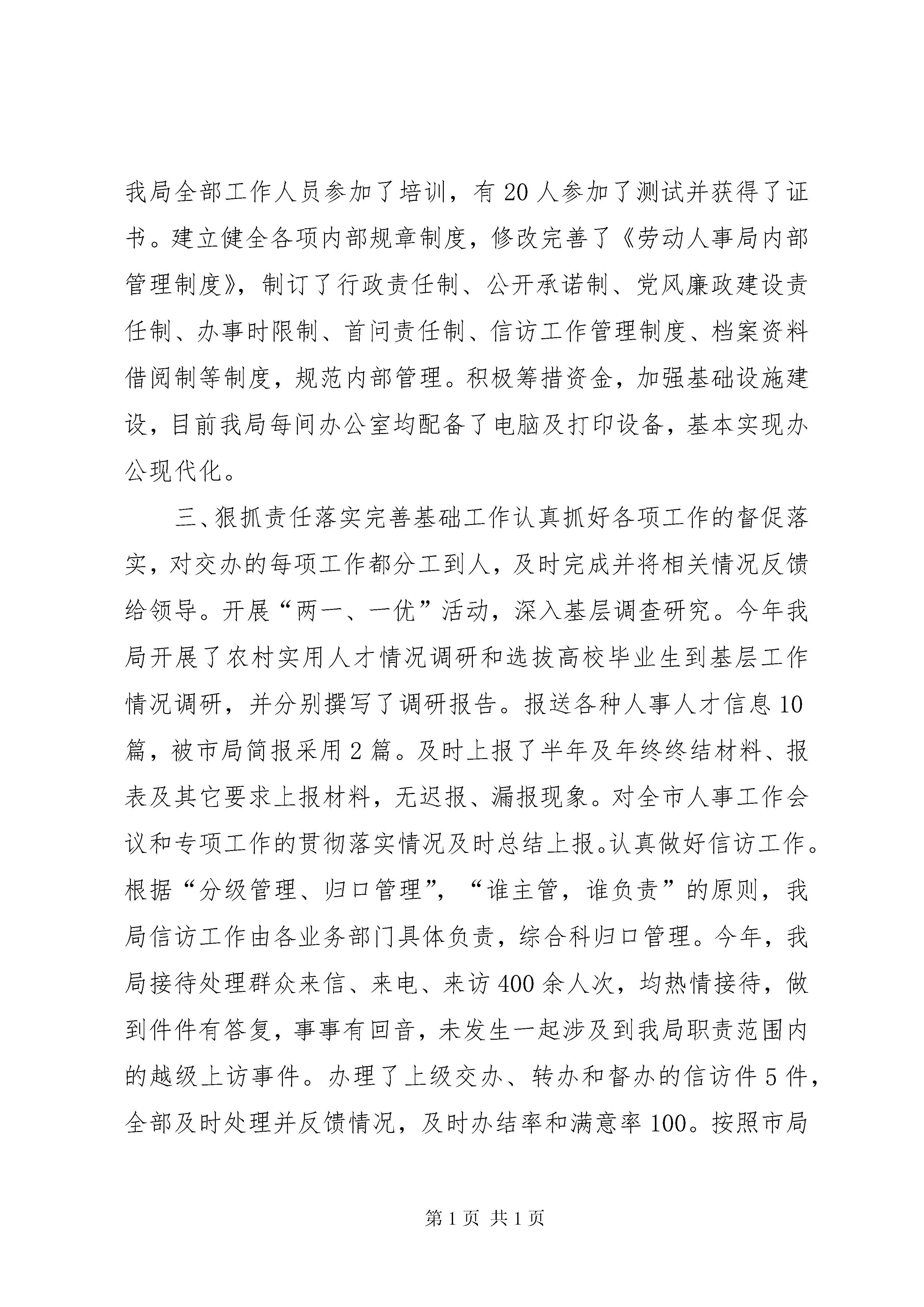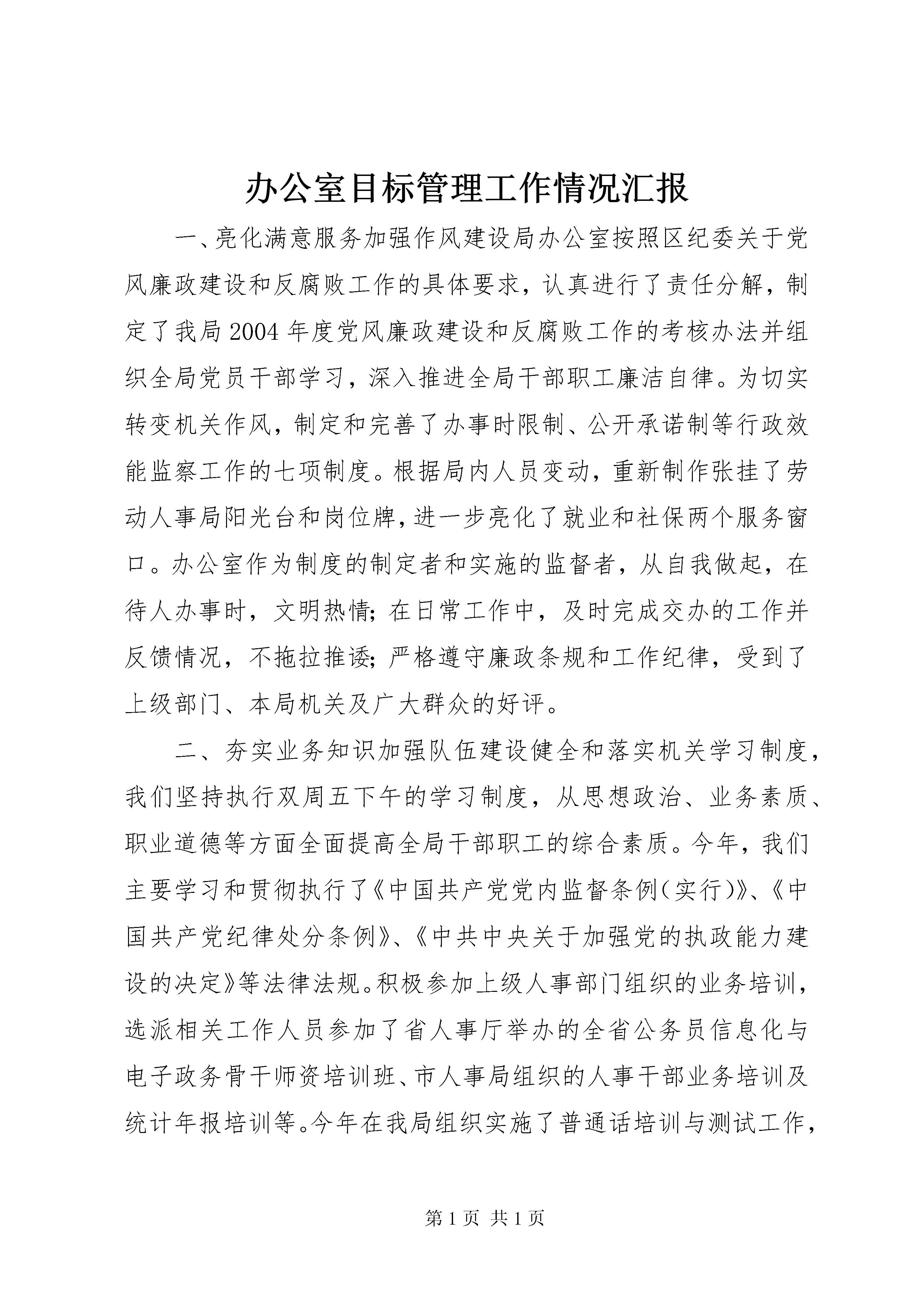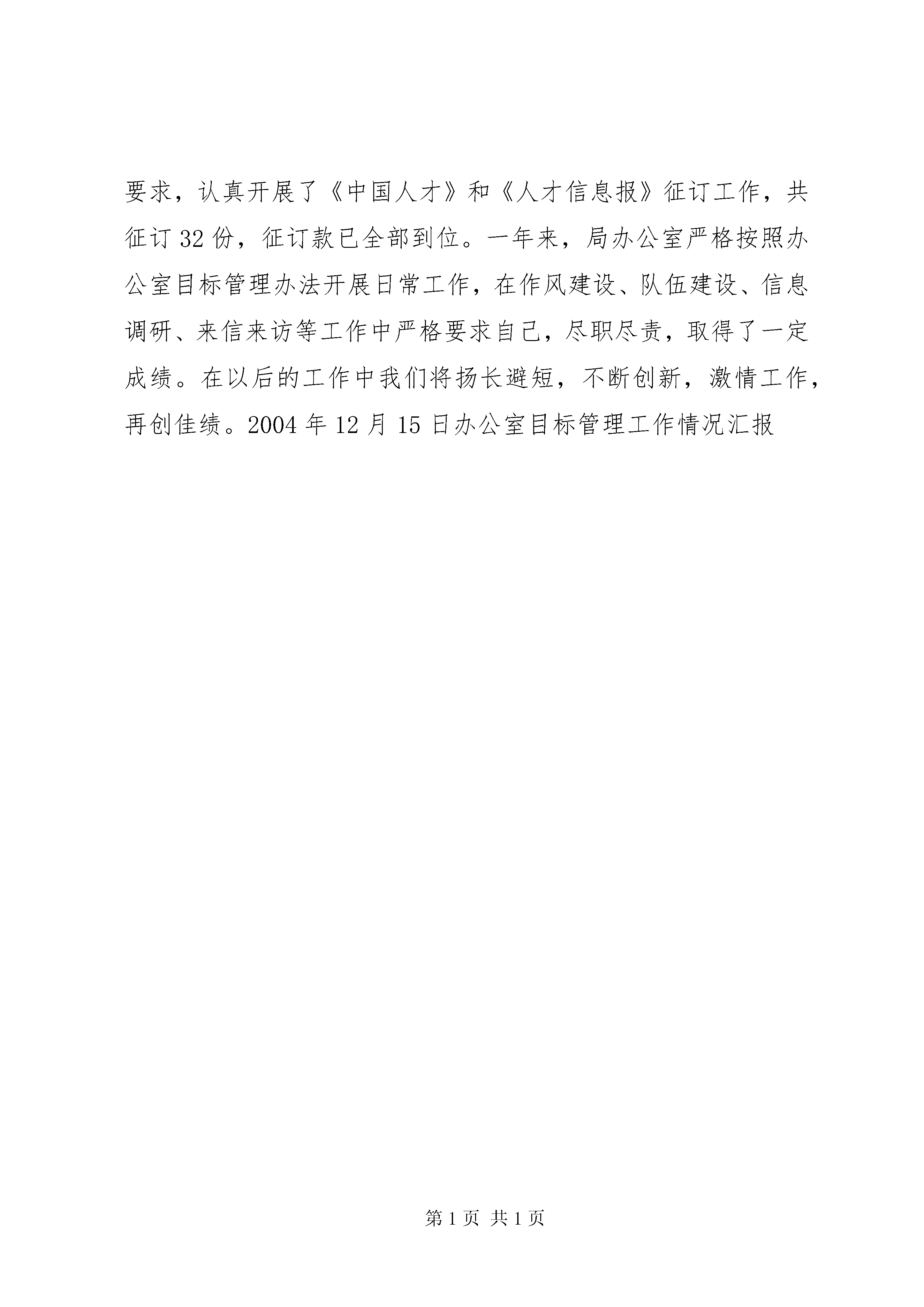 办公室目标管理工作情况汇报一、亮化满意服务加强作风建设局办公室按照区纪委关于党风廉政建设和反腐败工作的具体要求,认真进行了责任分解,制定了我局2004年度党风廉政建设和反腐败工作的考核办法并组织全局党员干部学习,深入推进全局干部职工廉洁自律。为切实转变机关作风,制定和完善了办事时限制、公开承诺制等行政效能监察工作的七项制度。根据局内人员变动,重新制作张挂了劳动人事局阳光台和岗位牌,进一步亮化了就业和社保两个服务窗口。办公室作为制度的制定者和实施的监督者,从自我做起,在待人办事时,文明热情;在日常工作中,及时完成交办的工作并反馈情况,不拖拉推诿;严格遵守廉政条规和工作纪律,受到了上级部门、本局机关及广大群众的好评。二、夯实业务知识加强队伍建设健全和落实机关学习制度,我们坚持执行双周五下午的学习制度,从思想政治、业务素质、职业道德等方面全面提高全局干部职工的综合素质。今年,我们主要学习和贯彻执行了《中国共产党党内监督条例(实行)》、《中国共产党纪律处分条例》、《中共中央关于加强党的执政能力建设的决定》等法律法规。积极参加上级人事部门组织的业务培训,选派相关工作人员参加了省人事厅举办的全省公务员信息化与电子政务骨干师资培训班、市人事局组织的人事干部业务培训及统计年报培训等。今年在我局组织实施了普通话培训与测试工作,我局全部工作人员参加了培训,有20人参加了测试并获得了证书。建立健全各项内部规章制度,修改完善了《劳动人事局内部管理制度》,制订了行政责任制、公开承诺制、党风廉政建设责任制、办事时限制、首问责任制、信访工作管理制度、档案资料借阅制等制度,规范内部管理。积极筹措资金,加强基础设施建设,目前我局每间办公室均配备了电脑及打印设备,基本实现办公现代化。三、狠抓责任落实完善基础工作认真抓好各项工作的督促落实,对交办的每项工作都分工到人,及时完成并将相关情况反馈给领导。开展“两一、一优”活动,深入基层调查研究。今年我局开展了农村实用人才情况调研和选拔高校毕业生到基层工作情况调研,并分别撰写了调研报告。报送各种人事人才信息10篇,被市局简报采用2篇。及时上报了半年及年终终结材料、报表及其它要求上报材料,无迟报、漏报现象。对全市人事工作会议和专项工作的贯彻落实情况及时总结上报。认真做好信访工作。根据“分级管理、归口管理”,“谁主管,谁负责”的原则,我局信访工作由各业务部门具体负责,综合科归口管理。今年,我局接待处理群众来信、来电、来访400余人次,均热情接待,做到件件有答复,事事有回音,未发生一起涉及到我局职责范围内的越级上访事件。办理了上级交办、转办和督办的信访件5件,全部及时处理并反馈情况,及时办结率和满意率100。按照市局要求,认真开展了《中国人才》和《人才信息报》征订工作,共征订32份,征订款已全部到位。一年来,局办公室严格按照办公室目标管理办法开展日常工作,在作风建设、队伍建设、信息调研、来信来访等工作中严格要求自己,尽职尽责,取得了一定成绩。在以后的工作中我们将扬长避短,不断创新,激情工作,再创佳绩。2004年12月15日办公室目标管理工作情况汇报
