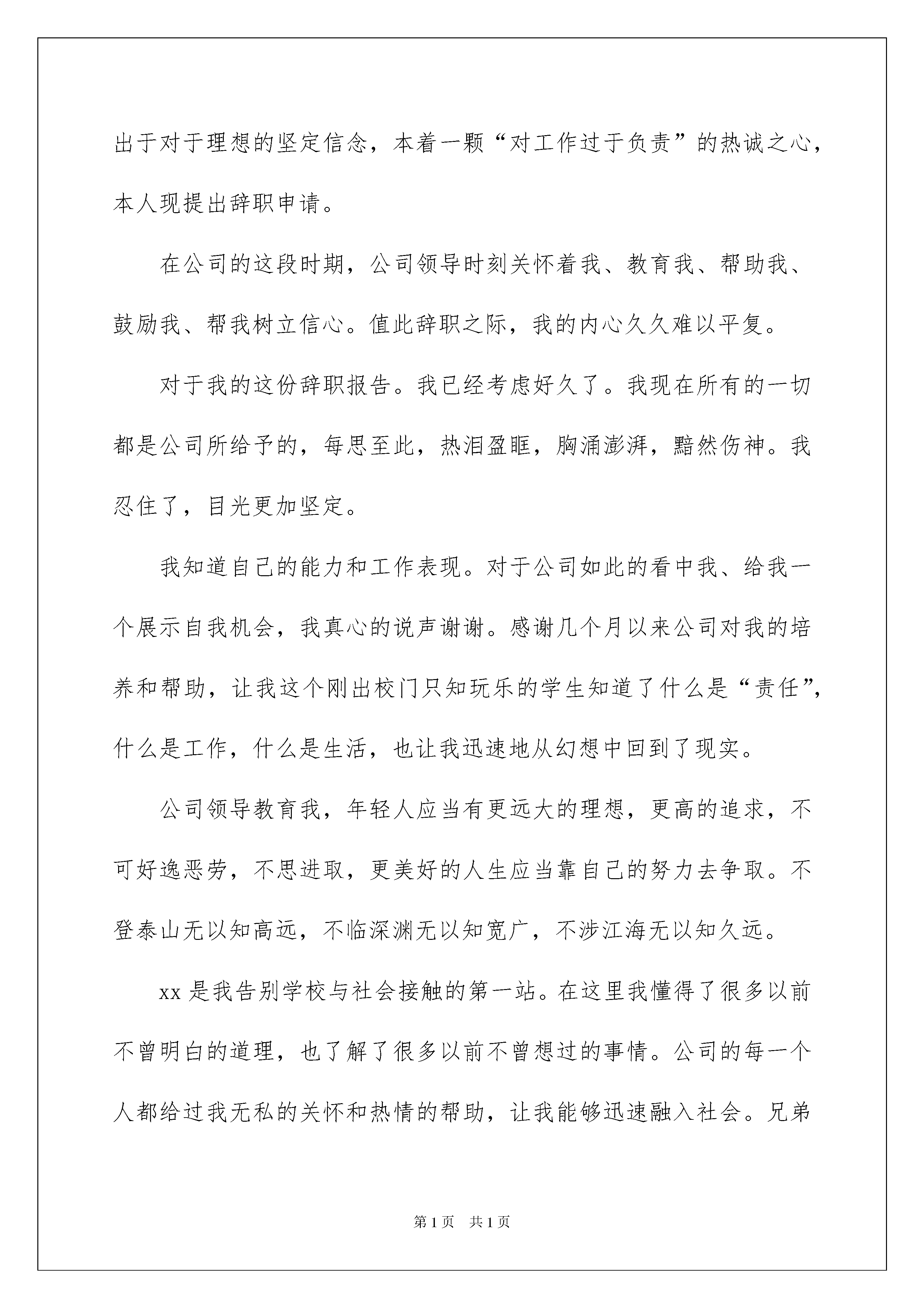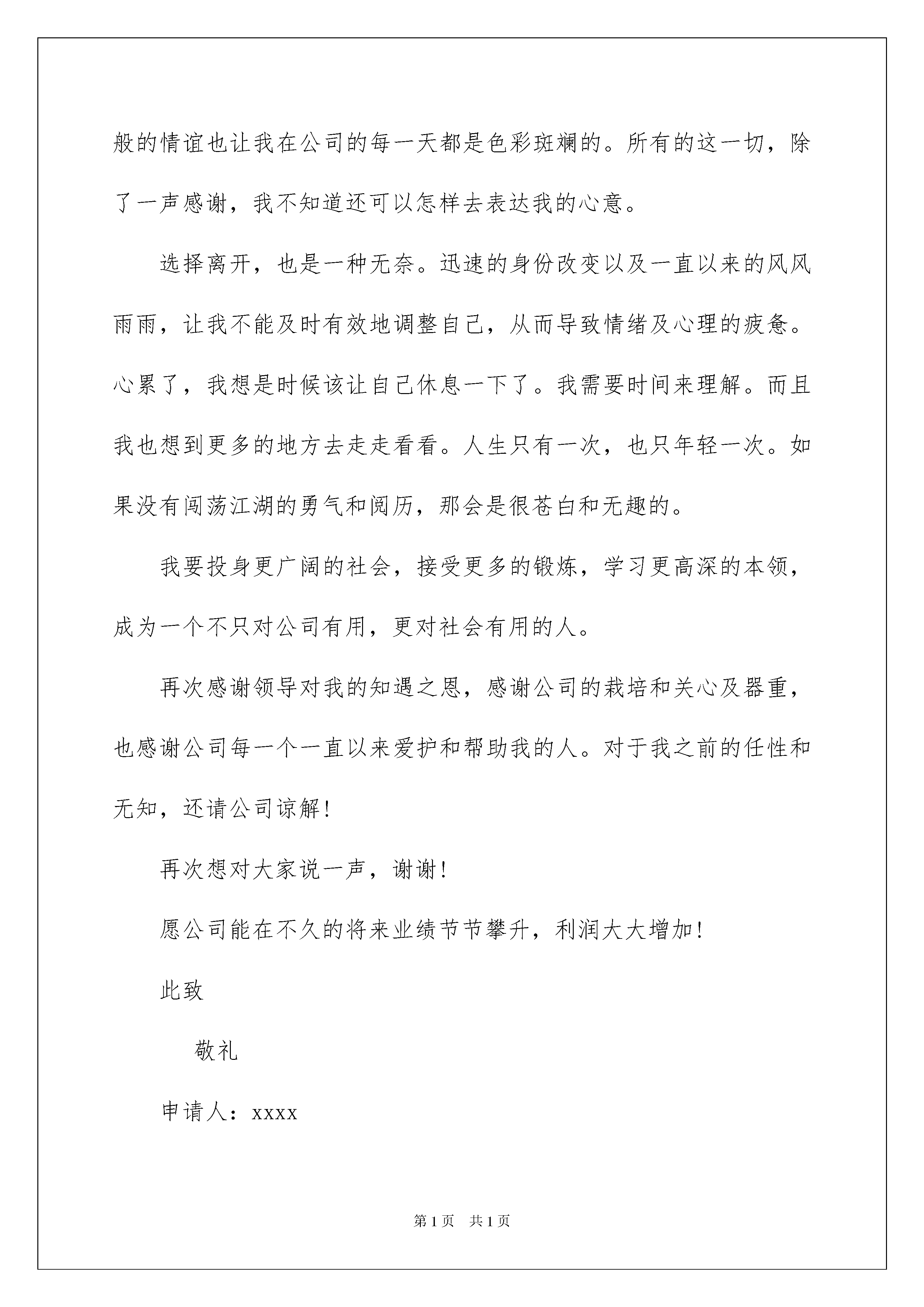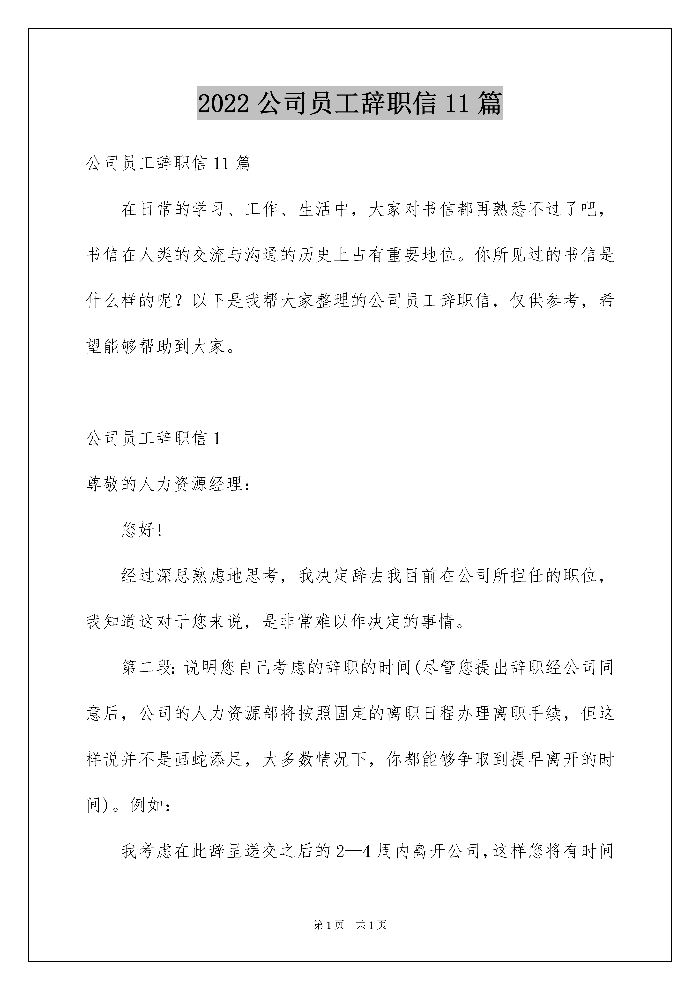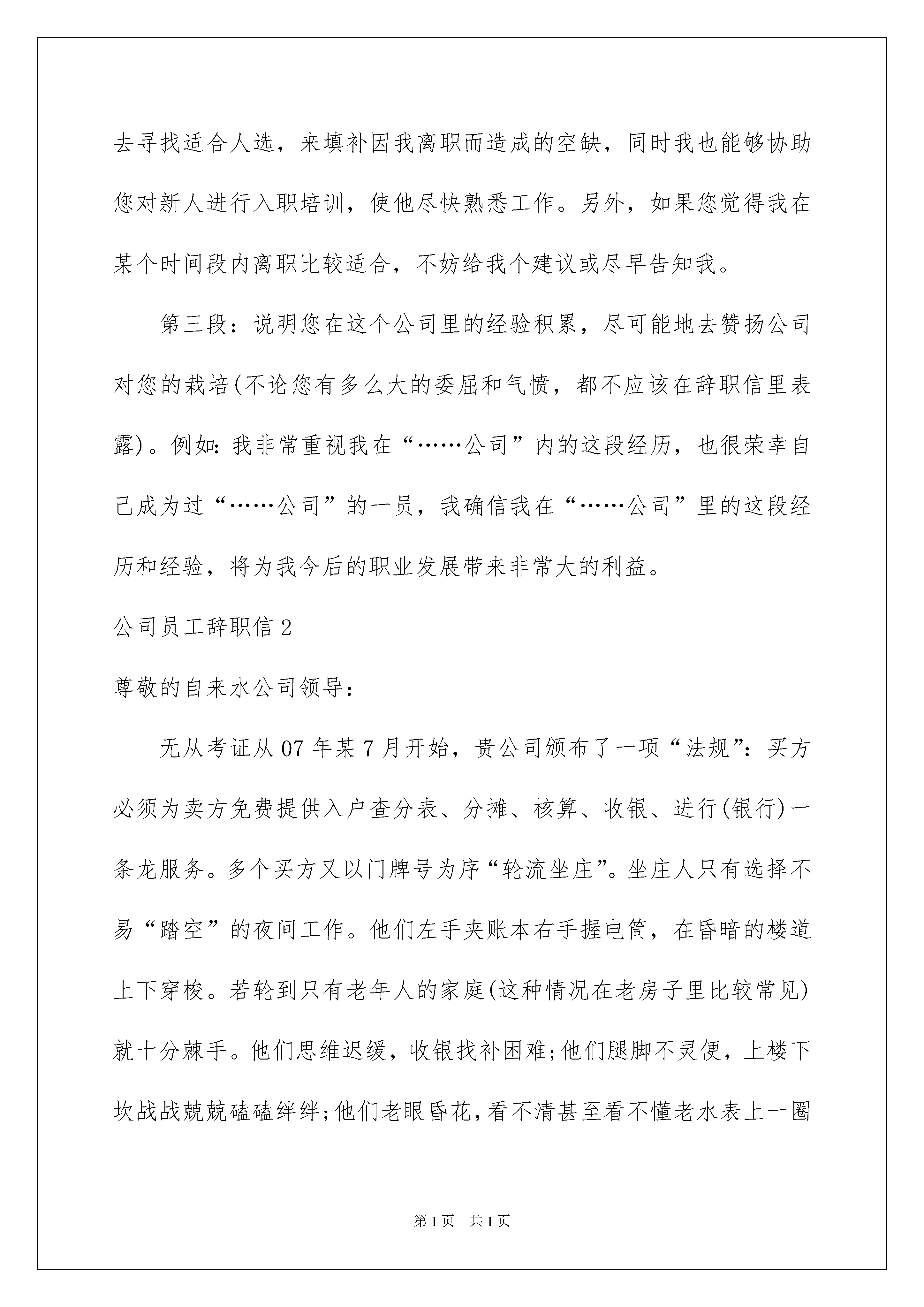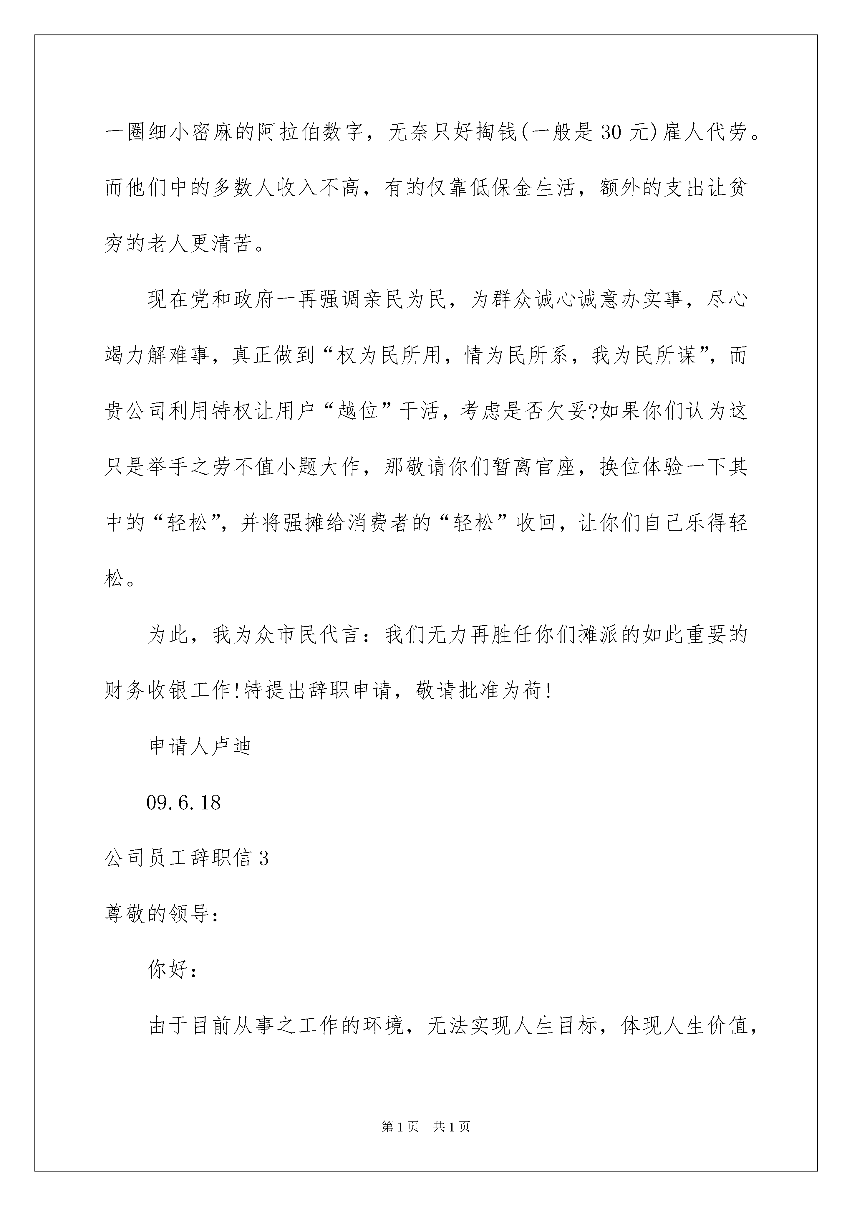 2022公司员工辞职信11篇公司员工辞职信11篇在日常的学习、工作、生活中,大家对书信都再熟悉不过了吧,书信在人类的交流与沟通的历史上占有重要地位。你所见过的书信是什么样的呢?以下是我帮大家整理的公司员工辞职信,仅供参考,希望能够帮助到大家。公司员工辞职信1尊敬的人力资源经理:您好!经过深思熟虑地思考,我决定辞去我目前在公司所担任的职位,我知道这对于您来说,是非常难以作决定的事情。第二段:说明您自己考虑的辞职的时间(尽管您提出辞职经公司同意后,公司的人力资源部将按照固定的离职日程办理离职手续,但这样说并不是画蛇添足,大多数情况下,你都能够争取到提早离开的时间)。例如:我考虑在此辞呈递交之后的2—4周内离开公司,这样您将有时间去寻找适合人选,来填补因我离职而造成的空缺,同时我也能够协助您对新人进行入职培训,使他尽快熟悉工作。另外,如果您觉得我在某个时间段内离职比较适合,不妨给我个建议或尽早告知我。第三段:说明您在这个公司里的经验积累,尽可能地去赞扬公司对您的栽培(不论您有多么大的委屈和气愤,都不应该在辞职信里表露)。例如:我非常重视我在“……公司”内的这段经历,也很荣幸自己成为过“……公司”的一员,我确信我在“……公司”里的这段经历和经验,将为我今后的职业发展带来非常大的利益。公司员工辞职信2尊敬的自来水公司领导:无从考证从07年某7月开始,贵公司颁布了一项“法规”:买方必须为卖方免费提供入户查分表、分摊、核算、收银、进行(银行)一条龙服务。多个买方又以门牌号为序“轮流坐庄”。坐庄人只有选择不易“踏空”的夜间工作。他们左手夹账本右手握电筒,在昏暗的楼道上下穿梭。若轮到只有老年人的家庭(这种情况在老房子里比较常见)就十分棘手。他们思维迟缓,收银找补困难;他们腿脚不灵便,上楼下坎战战兢兢磕磕绊绊;他们老眼昏花,看不清甚至看不懂老水表上一圈一圈细小密麻的阿拉伯数字,无奈只好掏钱(一般是30元)雇人代劳。而他们中的多数人收入不高,有的仅靠低保金生活,额外的支出让贫穷的老人更清苦。现在党和政府一再强调亲民为民,为群众诚心诚意办实事,尽心竭力解难事,真正做到“权为民所用,情为民所系,我为民所谋”,而贵公司利用特权让用户“越位”干活,考虑是否欠妥?如果你们认为这只是举手之劳不值小题大作,那敬请你们暂离官座,换位体验一下其中的“轻松”,并将强摊给消费者的“轻松”收回,让你们自己乐得轻松。为此,我为众市民代言:我们无力再胜任你们摊派的如此重要的财务收银工作!特提出辞职申请,敬请批准为荷!申请人卢迪09.6.18公司员工辞职信3尊敬的领导:你好:由于目前从事之工作的环境,无法实现人生目标,体现人生价值,出于对于理想的坚定信念,本着一颗“对工作过于负责”的热诚之心,本人现提出辞职申请。在公司的这段时期,公司领导时刻关怀着我、教育我、帮助我、鼓励我、帮我树立信心。值此辞职之际,我的内心久久难以平复。对于我的这份辞职报告。我已经考虑好久了。我现在所有的一切都是公司所给予的,每思至此,热泪盈眶,胸涌澎湃,黯然伤神。我忍住了,目光更加坚定。我知道自己的能力和工作表现。对于公司如此的看中我、给我一个展示自我机会,我真心的说声谢谢。感谢几个月以来公司对我的培养和帮助,让我这个刚出校门只知玩乐的学生知道了什么是“责任”,什么是工作,什么是生活,也让我迅速地从幻想中回到了现实。公司领导教育我,年轻人应当有更远大的理想,更高的追求,不可好逸恶劳,不思进取,更美好的人生应当靠自己的努力去争取。不登泰山无以知高远,不临深渊无以知宽广,不涉江海无以知久远。xx是我告别学校与社会接触的第一站。在这里我懂得了很多以前不曾明白的道理,也了解了很多以前不曾想过的事情。公司的每一个人都给过我无私的关怀和热情的帮助,让我能够迅速融入社会。兄弟般的情谊也让我在公司的每一天都是色彩斑斓的。所有的这一切,除了一声感谢,我不知道还可以怎样去表达我的心意。选择离开,也是一种无奈。迅速的身份改变以及一直以来的风风雨雨,让我不能及时有效地调整自己,从而导致情绪及心理的疲惫。心累了,我想是时候该让自己休息一下了。我需要时间来理解。而且我也想到更多的地方去走走看看。人生只有一次,也只年轻一次。如果没有闯荡江湖的勇气和阅历,那会是很苍白和无趣的。我要投身更广阔的社会,接受更多的锻炼,学习更高深的本领,成为一个不只对公司有用,更对社会有用的人。再次感谢领导对我的知遇之恩,感谢公司的栽培和关心及器重,也感谢公司每一个一直以来爱护和帮助我的人。对于我之前的任性和无知,还请公司谅解!再次想对大家说一声,谢谢!愿公司能在不久的将来业绩节节攀升,利润大大增加!此