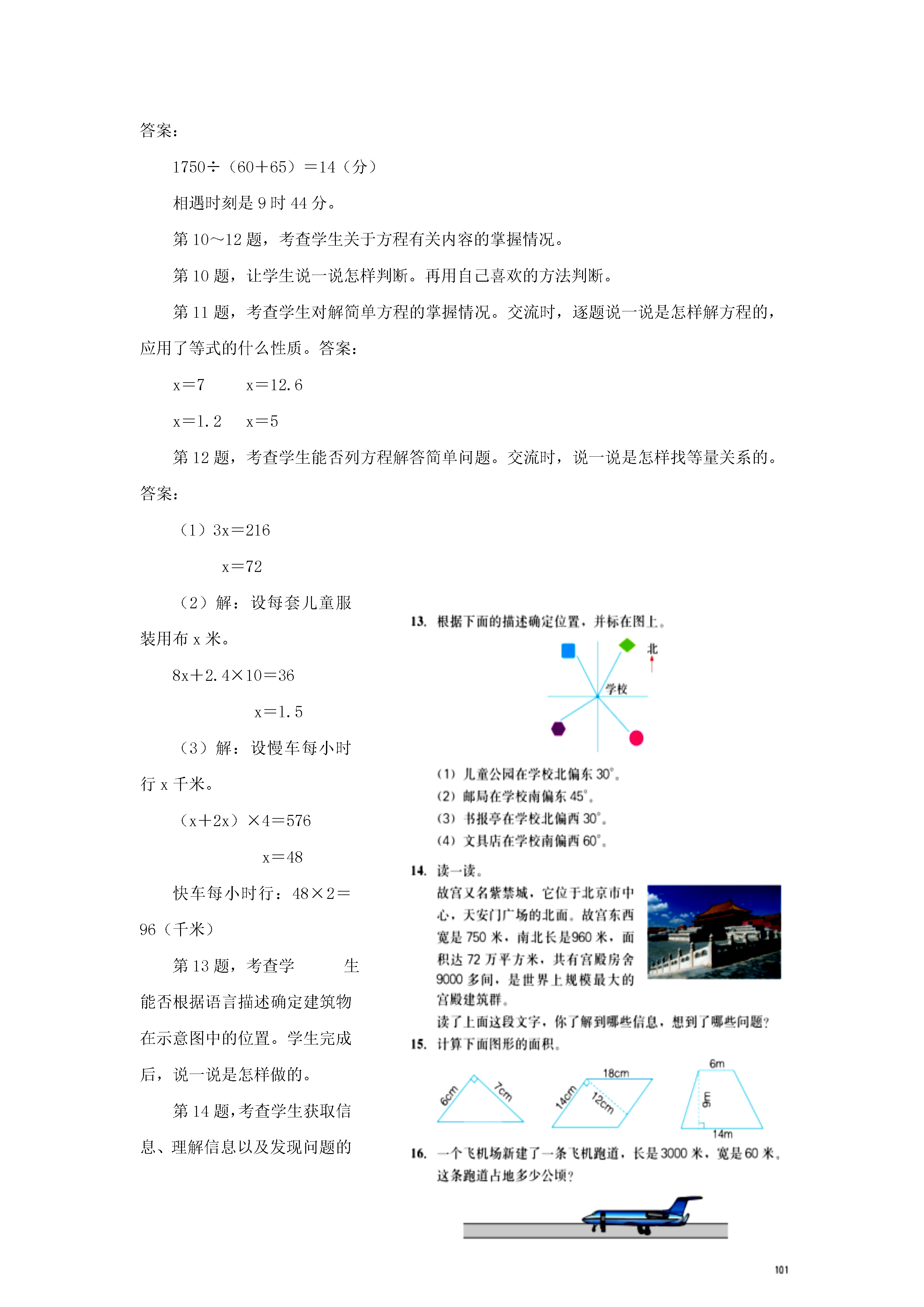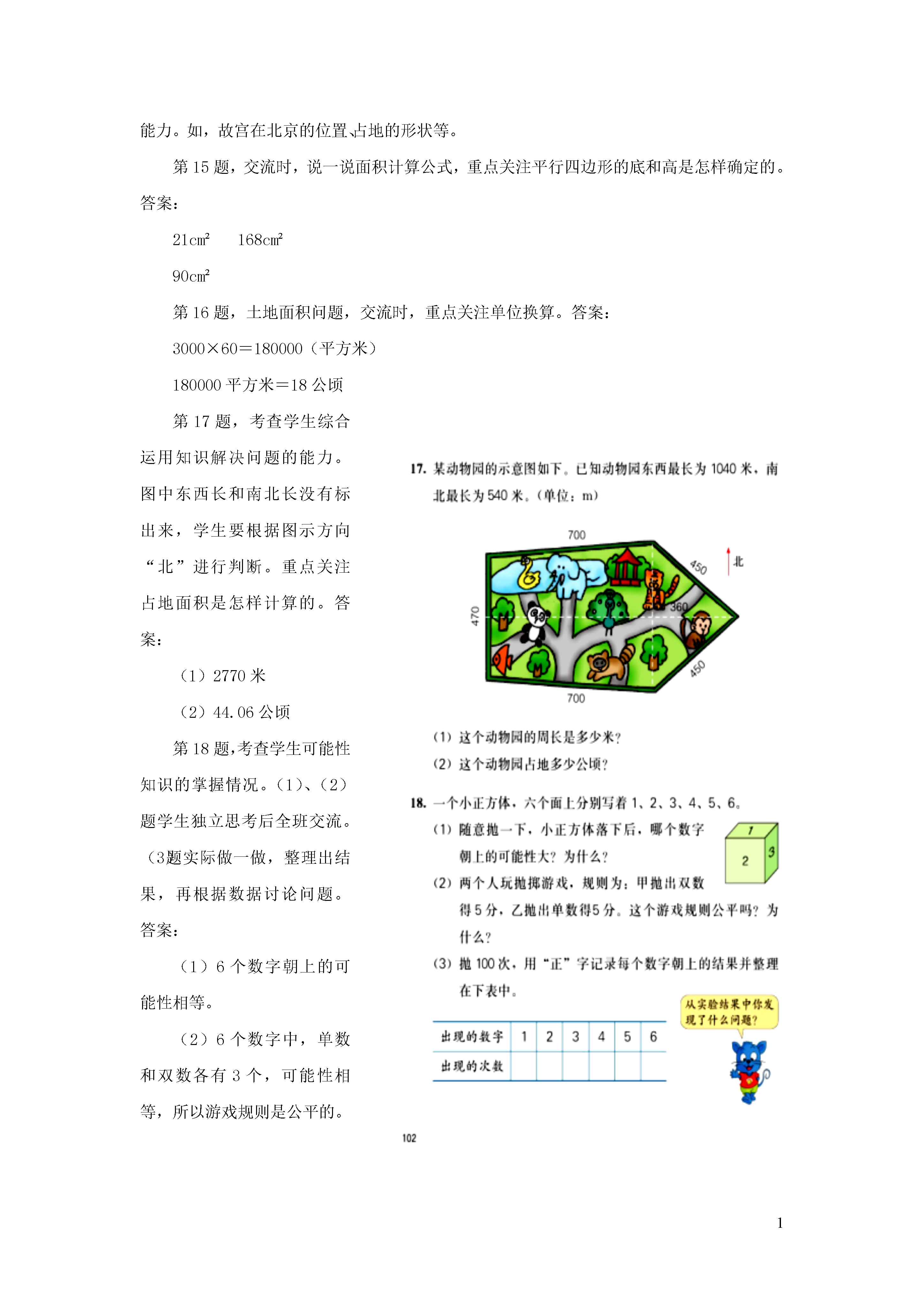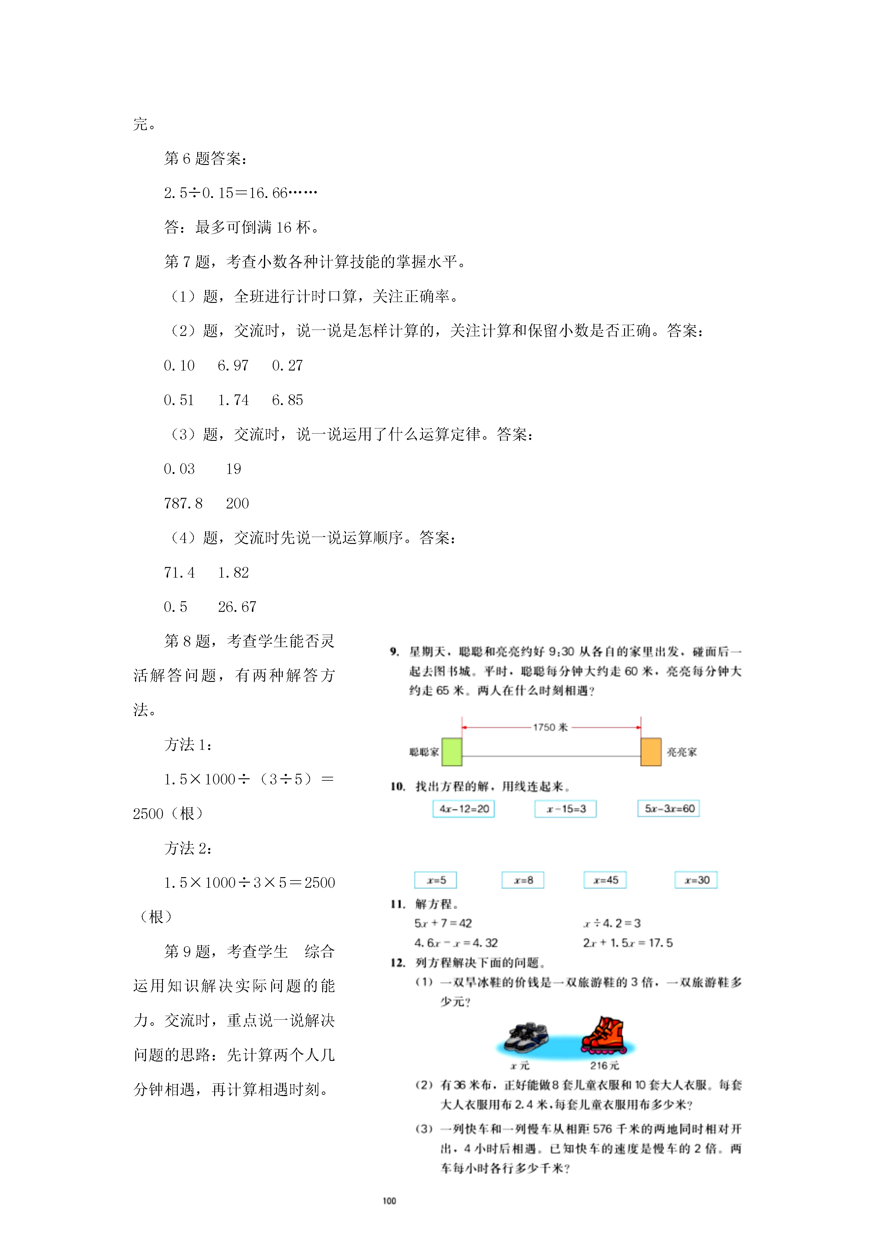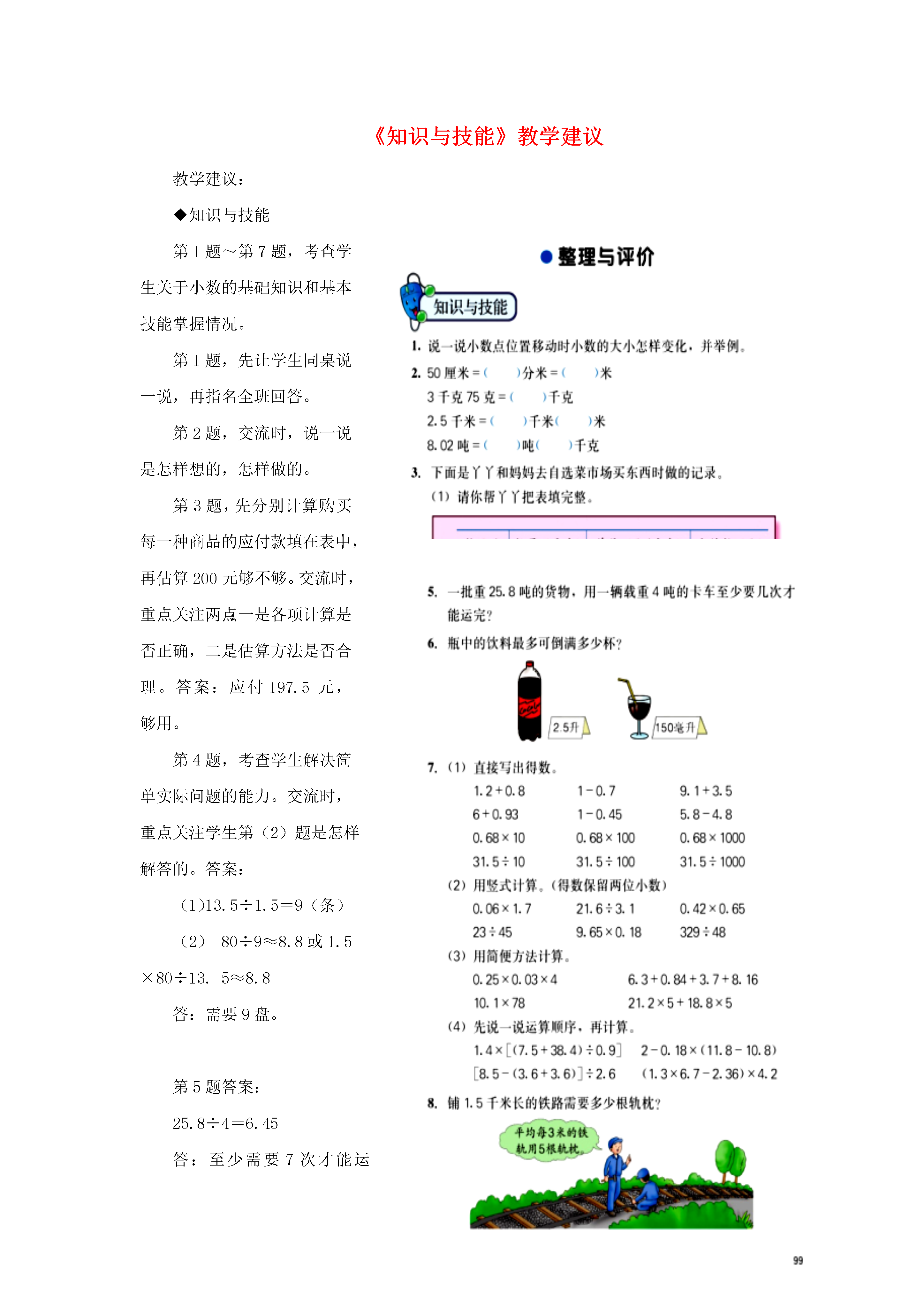 1《知识与技能》教学建议教学建议:◆知识与技能第1题~第7题,考查学生关于小数的基础知识和基本技能掌握情况。第1题,先让学生同桌说一说,再指名全班回答。第2题,交流时,说一说是怎样想的,怎样做的。第3题,先分别计算购买每一种商品的应付款填在表中,再估算200元够不够。交流时,重点关注两点:一是各项计算是否正确,二是估算方法是否合理。答案:应付197.5元,够用。第4题,考查学生解决简单实际问题的能力。交流时,重点关注学生第(2)题是怎样解答的。答案:(1)13.5÷1.5=9(条)(2)80÷9≈8.8或1.5×80÷13.5≈8.8答:需要9盘。第5题答案:25.8÷4=6.45答:至少需要7次才能运完。第6题答案:2.5÷0.15=16.66……答:最多可倒满16杯。第7题,考查小数各种计算技能的掌握水平。(1)题,全班进行计时口算,关注正确率。(2)题,交流时,说一说是怎样计算的,关注计算和保留小数是否正确。答案:0.106.970.270.511.746.85(3)题,交流时,说一说运用了什么运算定律。答案:0.0319787.8200(4)题,交流时先说一说运算顺序。答案:71.41.820.526.67第8题,考查学生能否灵活解答问题,有两种解答方法。方法1:1.5×1000÷(3÷5)=2500(根)方法2:1.5×1000÷3×5=2500(根)第9题,考查学生综合运用知识解决实际问题的能力。交流时,重点说一说解决问题的思路:先计算两个人几分钟相遇,再计算相遇时刻。答案:1750÷(60+65)=14(分)相遇时刻是9时44分。第10~12题,考查学生关于方程有关内容的掌握情况。第10题,让学生说一说怎样判断。再用自己喜欢的方法判断。第11题,考查学生对解简单方程的掌握情况。交流时,逐题说一说是怎样解方程的,应用了等式的什么性质。答案:x=7x=12.6x=l.2x=5第12题,考查学生能否列方程解答简单问题。交流时,说一说是怎样找等量关系的。答案:(1)3x=216x=72(2)解:设每套儿童服装用布x米。8x+2.4×10=36x=l.5(3)解:设慢车每小时行x千米。(x+2x)×4=576x=48快车每小时行:48×2=96(千米)第13题,考查学生能否根据语言描述确定建筑物在示意图中的位置。学生完成后,说一说是怎样做的。第14题,考查学生获取信息、理解信息以及发现问题的能力。如,故宫在北京的位置、占地的形状等。第15题,交流时,说一说面积计算公式,重点关注平行四边形的底和高是怎样确定的。答案:21cm²168cm²90cm²第16题,土地面积问题,交流时,重点关注单位换算。答案:3000×60=180000(平方米)180000平方米=18公顷第17题,考查学生综合运用知识解决问题的能力。图中东西长和南北长没有标出来,学生要根据图示方向“北”进行判断。重点关注占地面积是怎样计算的。答案:(1)2770米(2)44.06公顷第18题,考查学生可能性知识的掌握情况。(1)、(2)题学生独立思考后全班交流。(3)题实际做一做,整理出结果,再根据数据讨论问题。答案:(1)6个数字朝上的可能性相等。(2)6个数字中,单数和双数各有3个,可能性相等,所以游戏规则是公平的。