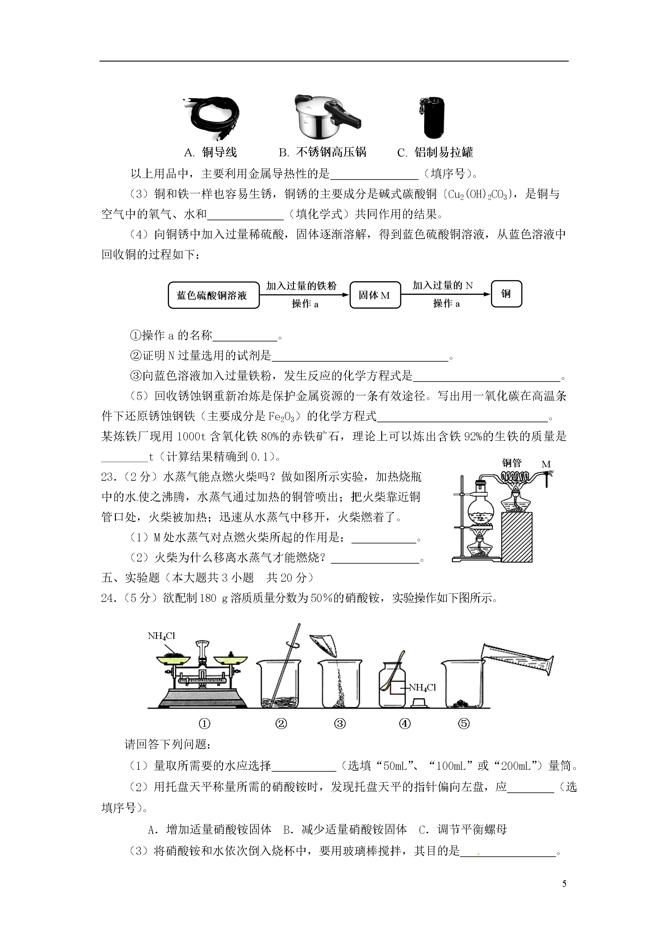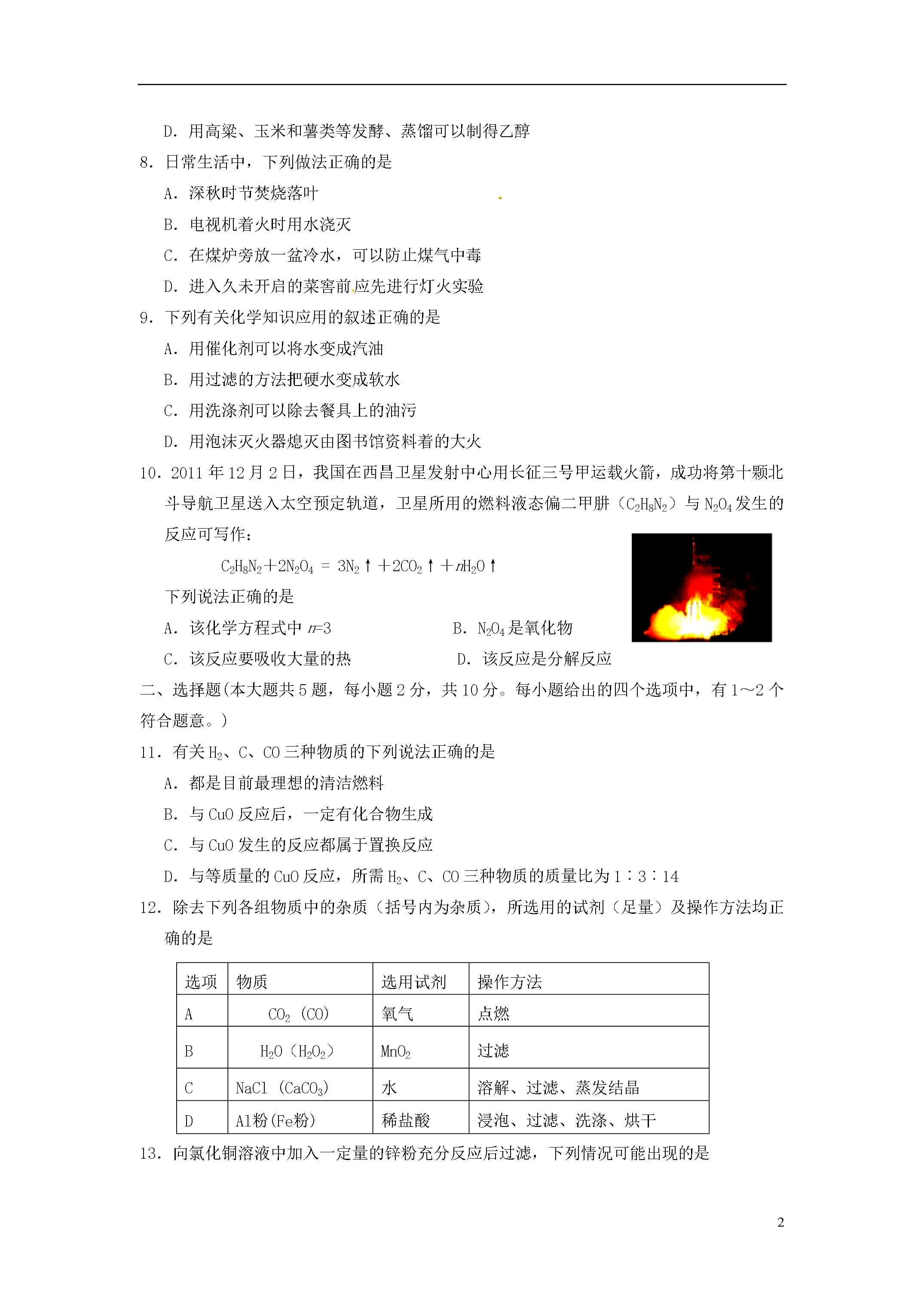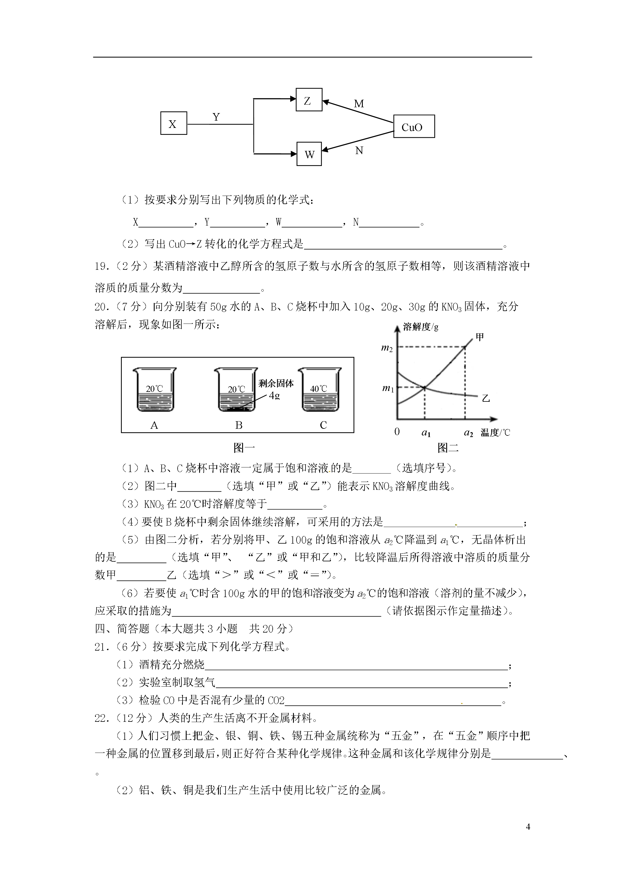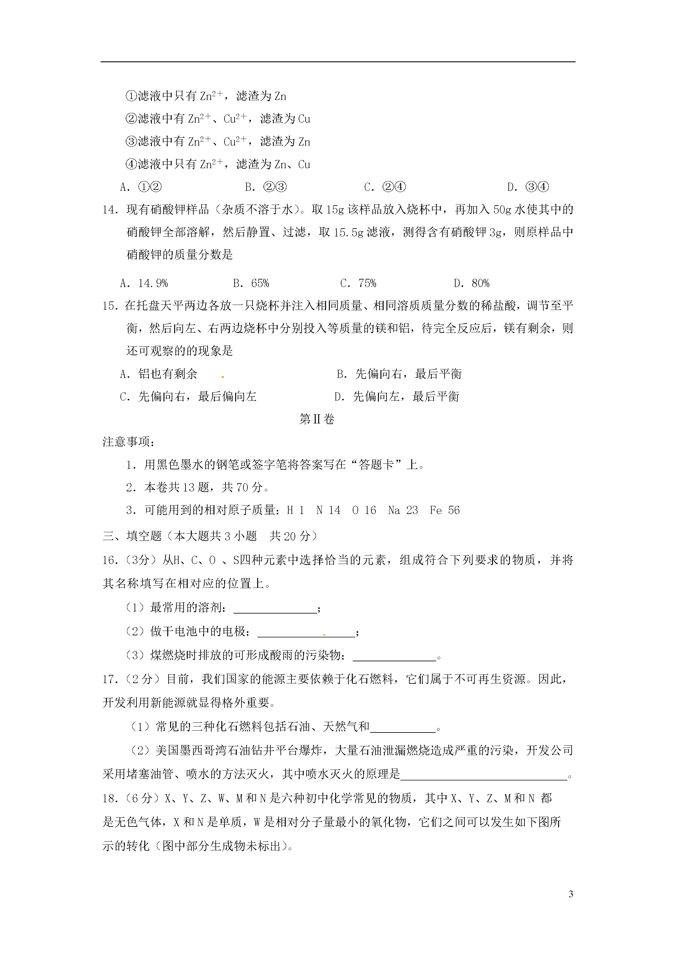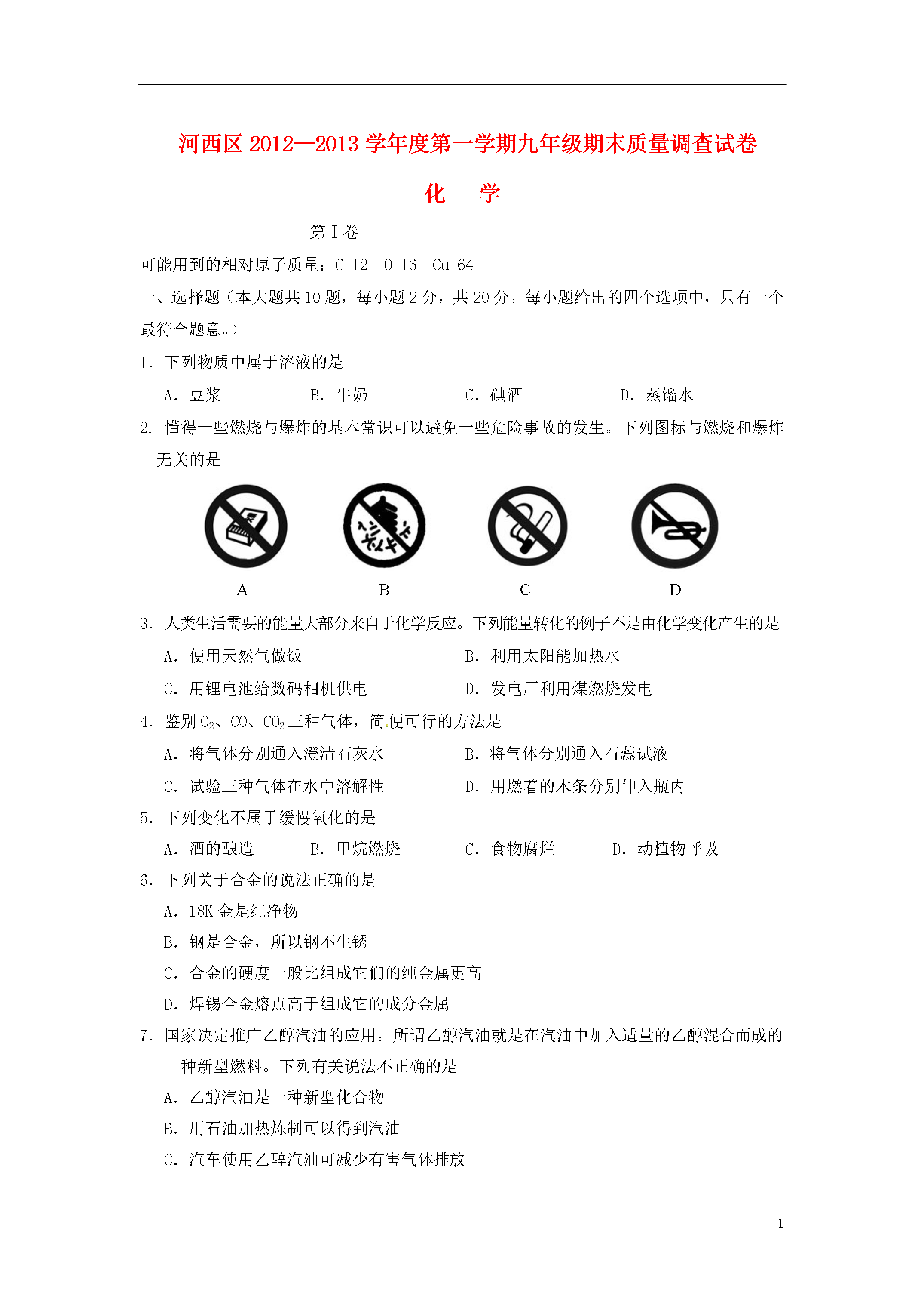 9河西区2012—2013学年度第一学期九年级期末质量调查试卷化学第Ⅰ卷可能用到的相对原子质量:C12O16Cu64一、选择题(本大题共10题,每小题2分,共20分。每小题给出的四个选项中,只有一个最符合题意。)1.下列物质中属于溶液的是A.豆浆B.牛奶C.碘酒D.蒸馏水2.懂得一些燃烧与爆炸的基本常识可以避免一些危险事故的发生。下列图标与燃烧和爆炸无关的是ABCD3.人类生活需要的能量大部分来自于化学反应。下列能量转化的例子不是由化学变化产生的是A.使用天然气做饭B.利用太阳能加热水C.用锂电池给数码相机供电D.发电厂利用煤燃烧发电4.鉴别O2、CO、CO2三种气体,简便可行的方法是A.将气体分别通入澄清石灰水B.将气体分别通入石蕊试液C.试验三种气体在水中溶解性D.用燃着的木条分别伸入瓶内5.下列变化不属于缓慢氧化的是A.酒的酿造B.甲烷燃烧C.食物腐烂D.动植物呼吸6.下列关于合金的说法正确的是A.18K金是纯净物B.钢是合金,所以钢不生锈C.合金的硬度一般比组成它们的纯金属更高D.焊锡合金熔点高于组成它的成分金属7.国家决定推广乙醇汽油的应用。所谓乙醇汽油就是在汽油中加入适量的乙醇混合而成的一种新型燃料。下列有关说法不正确的是A.乙醇汽油是一种新型化合物B.用石油加热炼制可以得到汽油C.汽车使用乙醇汽油可减少有害气体排放D.用高粱、玉米和薯类等发酵、蒸馏可以制得乙醇8.日常生活中,下列做法正确的是A.深秋时节焚烧落叶B.电视机着火时用水浇灭C.在煤炉旁放一盆冷水,可以防止煤气中毒D.进入久未开启的菜窖前应先进行灯火实验9.下列有关化学知识应用的叙述正确的是A.用催化剂可以将水变成汽油B.用过滤的方法把硬水变成软水C.用洗涤剂可以除去餐具上的油污D.用泡沫灭火器熄灭由图书馆资料着的大火10.2011年12月2日,我国在西昌卫星发射中心用长征三号甲运载火箭,成功将第十颗北斗导航卫星送入太空预定轨道,卫星所用的燃料液态偏二甲肼(C2H8N2)与N2O4发生的反应可写作:C2H8N2+2N2O4=3N2↑+2CO2↑+nH2O↑下列说法正确的是A.该化学方程式中n=3B.N2O4是氧化物C.该反应要吸收大量的热D.该反应是分解反应二、选择题(本大题共5题,每小题2分,共10分。每小题给出的四个选项中,有1~2个符合题意。)11.有关H2、C、CO三种物质的下列说法正确的是A.都是目前最理想的清洁燃料B.与CuO反应后,一定有化合物生成C.与CuO发生的反应都属于置换反应D.与等质量的CuO反应,所需H2、C、CO三种物质的质量比为1︰3︰1412.除去下列各组物质中的杂质(括号内为杂质),所选用的试剂(足量)及操作方法均正确的是选项物质选用试剂操作方法ACO2(CO)氧气点燃BH2O(H2O2)MnO2过滤CNaCl(CaCO3)水溶解、过滤、蒸发结晶DAl粉(Fe粉)稀盐酸浸泡、过滤、洗涤、烘干13.向氯化铜溶液中加入一定量的锌粉充分反应后过滤,下列情况可能出现的是①滤液中只有Zn2+,滤渣为Zn②滤液中有Zn2+、Cu2+,滤渣为Cu③滤液中有Zn2+、Cu2+,滤渣为Zn④滤液中只有Zn2+,滤渣为Zn、CuA.①②B.②③C.②④D.③④14.现有硝酸钾样品(杂质不溶于水)。取15g该样品放入烧杯中,再加入50g水使其中的硝酸钾全部溶解,然后静置、过滤,取15.5g滤液,测得含有硝酸钾3g,则原样品中硝酸钾的质量分数是A.14.9%B.65%C.75%D.80%15.在托盘天平两边各放一只烧杯并注入相同质量、相同溶质质量分数的稀盐酸,调节至平衡,然后向左、右两边烧杯中分别投入等质量的镁和铝,待完全反应后,镁有剩余,则还可观察的的现象是A.铝也有剩余B.先偏向右,最后平衡C.先偏向右,最后偏向左D.先偏向左,最后平衡第Ⅱ卷注意事项:1.用黑色墨水的钢笔或签字笔将答案写在“答题卡”上。2.本卷共13题,共70分。3.可能用到的相对原子质量:H1N14O16Na23Fe56三、填空题(本大题共3小题共20分)16.(3分)从H、C、O、S四种元素中选择恰当的元素,组成符合下列要求的物质,并将其名称填写在相对应的位置上。(1)最常用的溶剂:;(2)做干电池中的电极:;(3)煤燃烧时排放的可形成酸雨的污染物:。17.(2分)目前,我们国家的能源主要依赖于化石燃料,它们属于不可再生资源。因此,开发利用新能源就显得格外重要。(1)常见的三种化石燃料包括石油、天然气和。(2)美国墨西哥湾石油钻井平台爆炸,大量石油泄漏燃烧造成严重的污染,开发公司采用堵塞油管、喷水的方法灭火,其中喷水灭火的原理是。18.(6分)X、Y、Z、W、M和N是六种初中化学常见的物质,其中X、Y、Z、M和N都是无色气体,X和N是单质,W是相对分子量最小的氧化物,它