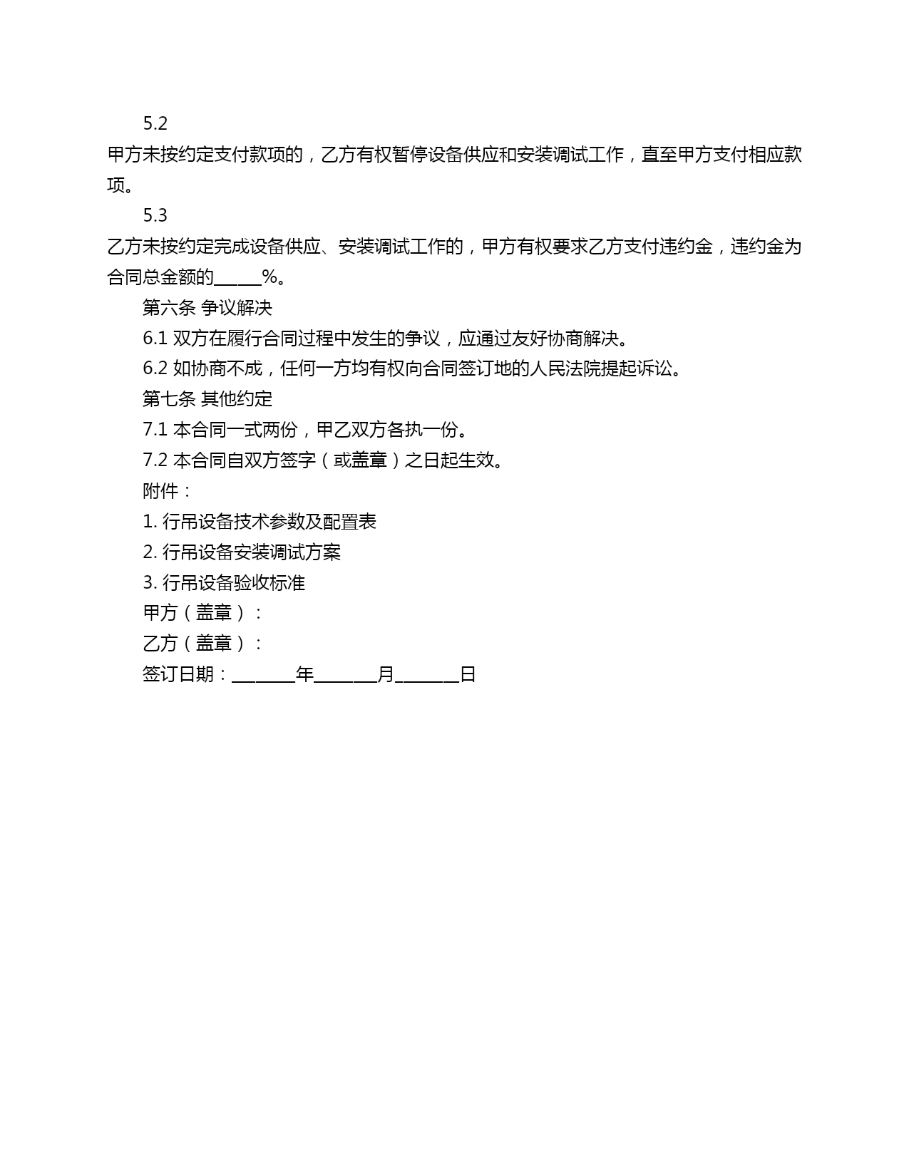 行吊生产安装合同范本 第一篇范文:合同编号:__________ 一、合同主体 二、合同背景 鉴于甲方需采购乙方提供的行吊设备,并委托乙方进行安装调试,双方经友好协商,特订立本合同,以明确双方的权利、义务和责任。 三、合同 第一条行吊设备生产及供应 1.1乙方根据甲方的需求,提供符合国家相关标准的行吊设备,包括但不限于行吊主体、控制系统、电气设备等。 1.2乙方应保证行吊设备的质量、性能和安全,确保设备在正常使用条件下,达到甲方的要求。 第二条行吊设备安装及调试 2.1乙方负责将行吊设备安装在甲方指定的地点,并按照甲方的要求进行调试。 2.2乙方应确保行吊设备在安装调试过程中,符合国家相关法律法规和安全标准。 2.3乙方应在合同约定的工期内完成行吊设备的安装调试工作。 第三条付款及验收 3.1甲方按照合同约定的付款方式支付设备款及安装调试费用。 3.2甲方应在设备安装调试完成后进行验收,确认设备质量、性能符合合同要求。 3.3甲方验收合格后,支付剩余款项。 第四条质量保证 4.1乙方提供的行吊设备质量保证期为______年,自设备安装调试验收合格之日起计算。 4.2乙方在质量保证期内,对设备出现的质量问题,负责免费维修、更换或退货。 4.3质量保证期外,乙方应按照甲方的要求,提供有偿维修服务。 第五条违约责任 5.1任何一方违反合同规定,导致合同无法履行或造成对方损失的,应承担违约责任。 5.2甲方未按约定支付款项的,乙方有权暂停设备供应和安装调试工作,直至甲方支付相应款项。 5.3乙方未按约定完成设备供应、安装调试工作的,甲方有权要求乙方支付违约金,违约金为合同总金额的______%。 第六条争议解决 6.1双方在履行合同过程中发生的争议,应通过友好协商解决。 6.2如协商不成,任何一方均有权向合同签订地的人民法院提起诉讼。 第七条其他约定 7.1本合同一式两份,甲乙双方各执一份。 7.2本合同自双方签字(或盖章)之日起生效。 附件: 1.行吊设备技术参数及配置表 2.行吊设备安装调试方案 3.行吊设备验收标准 甲方(盖章): 乙方(盖章): 签订日期:________年________月________日
