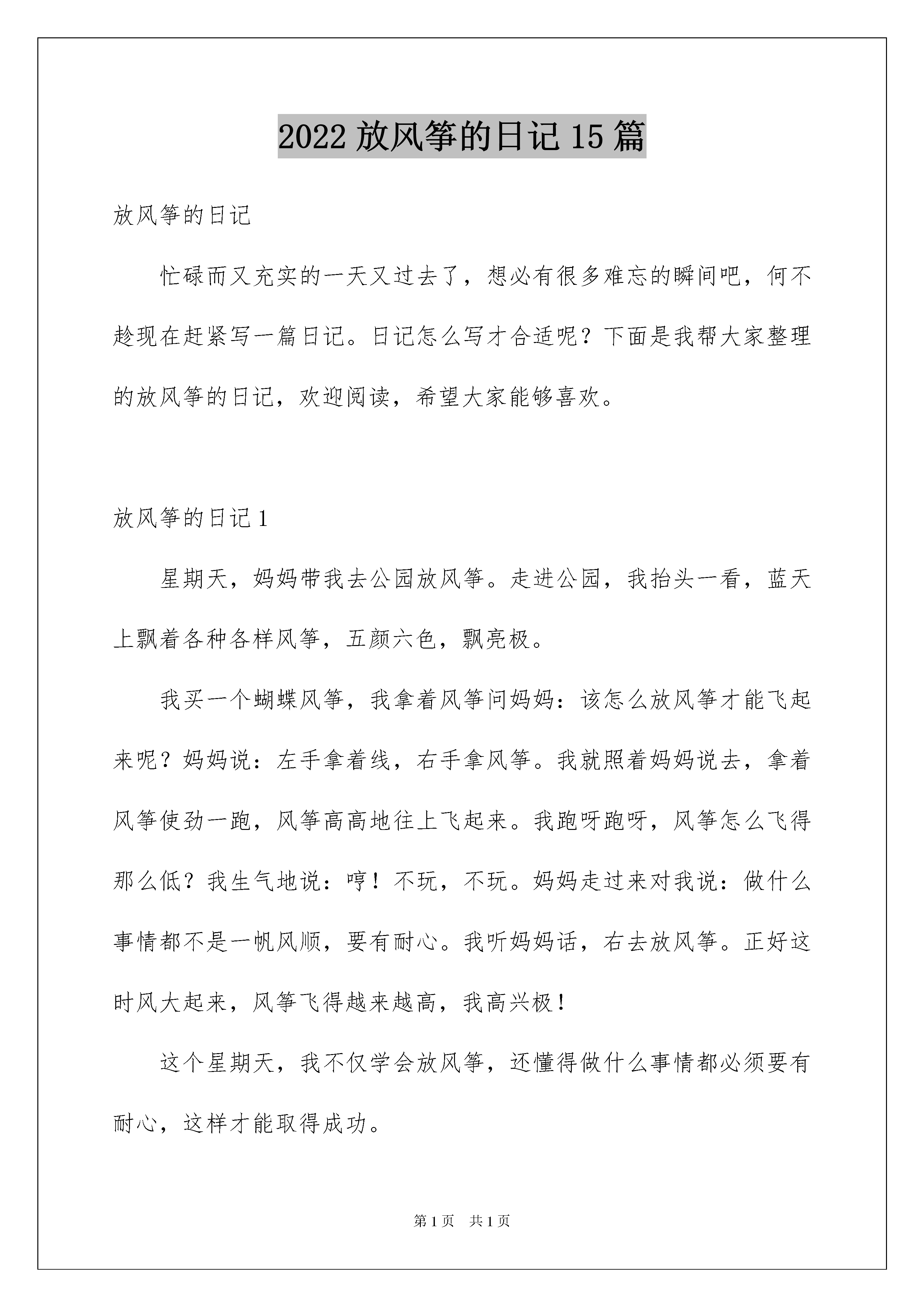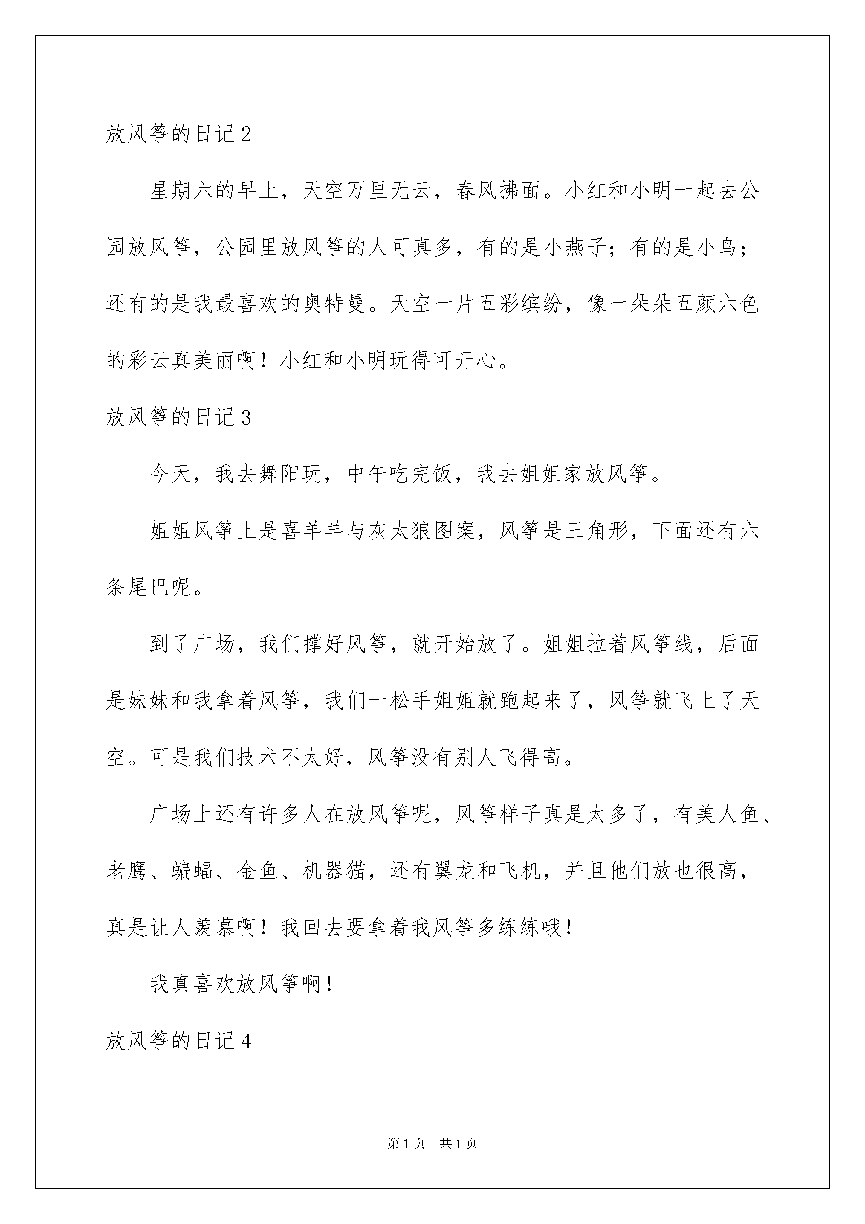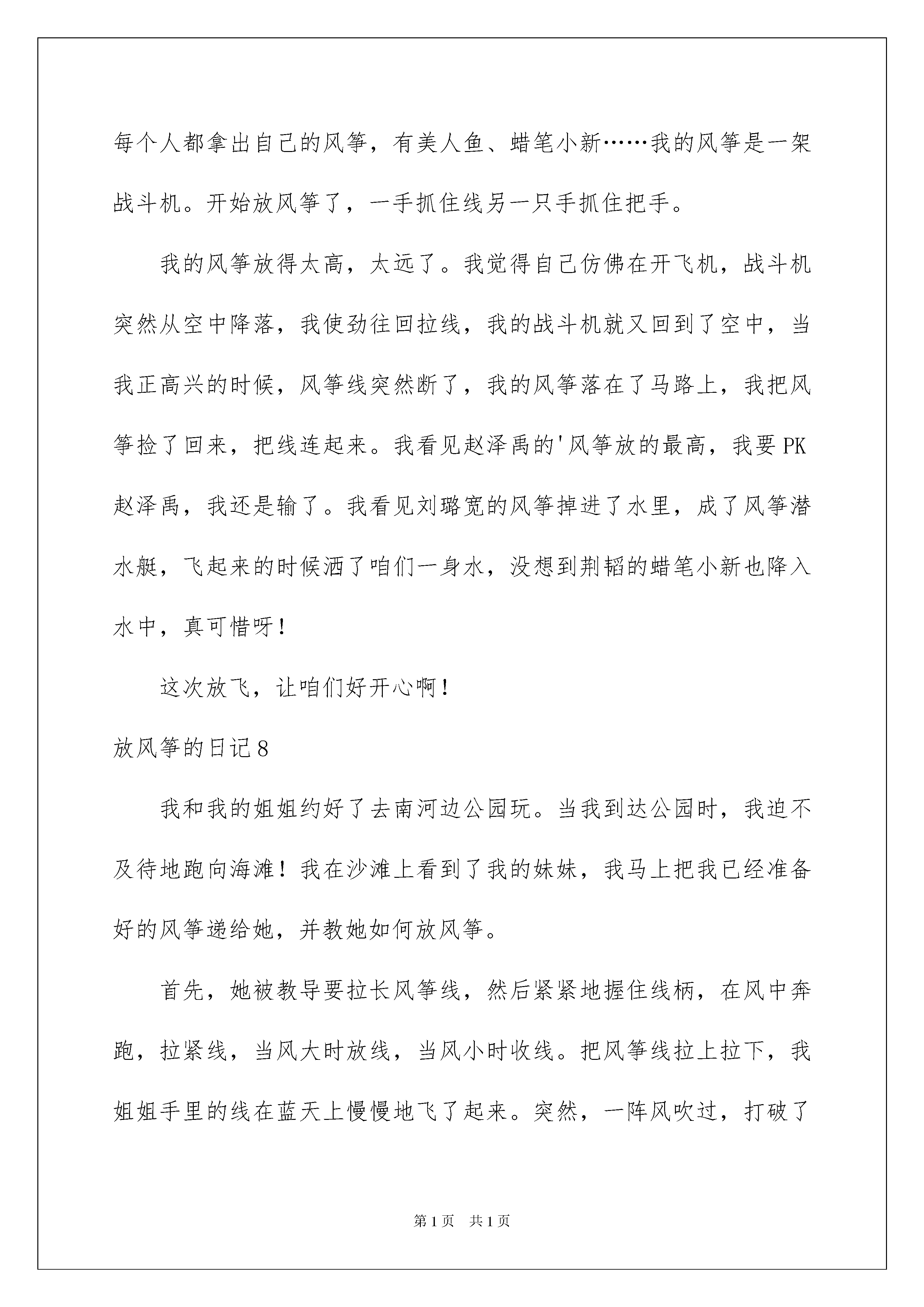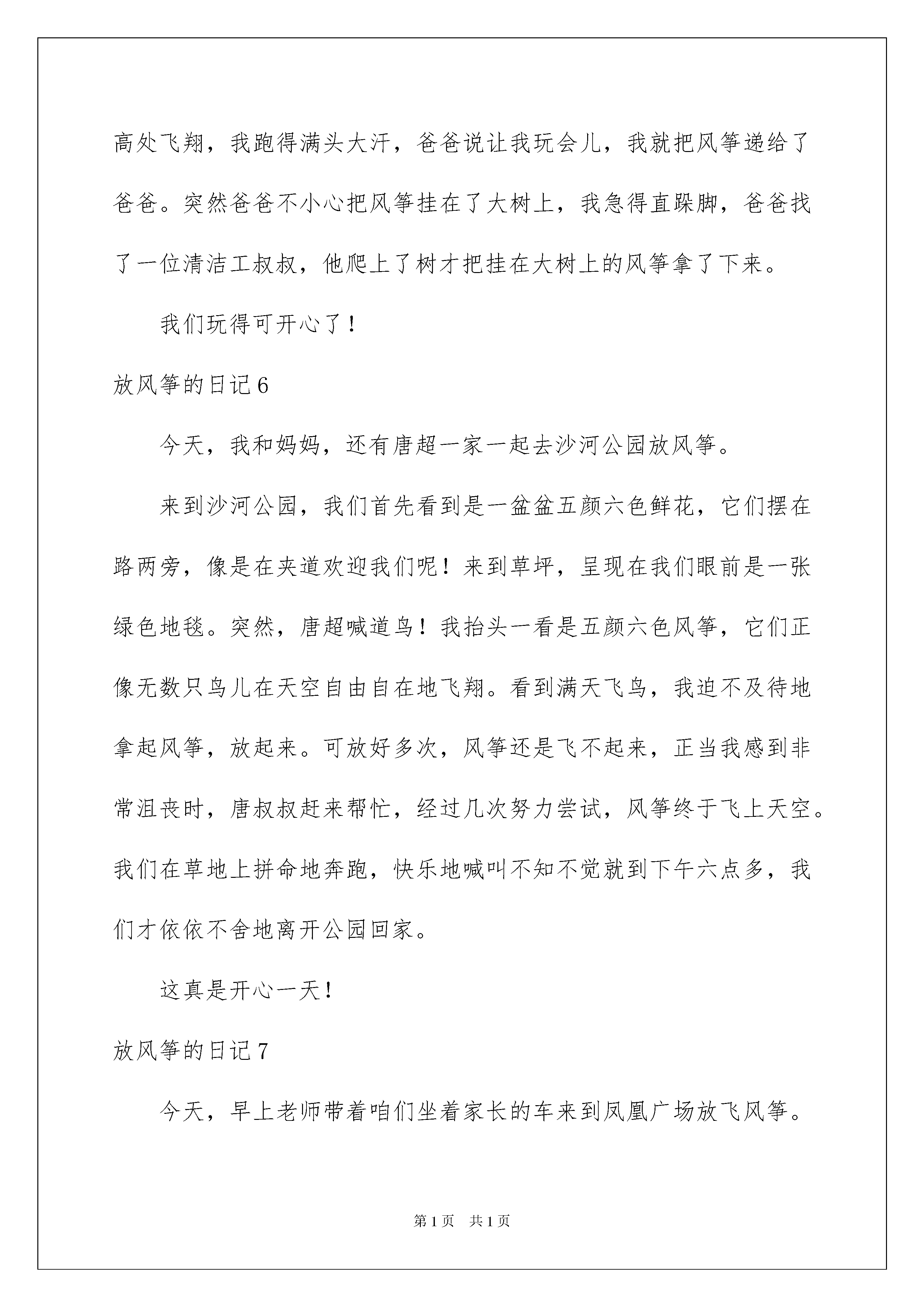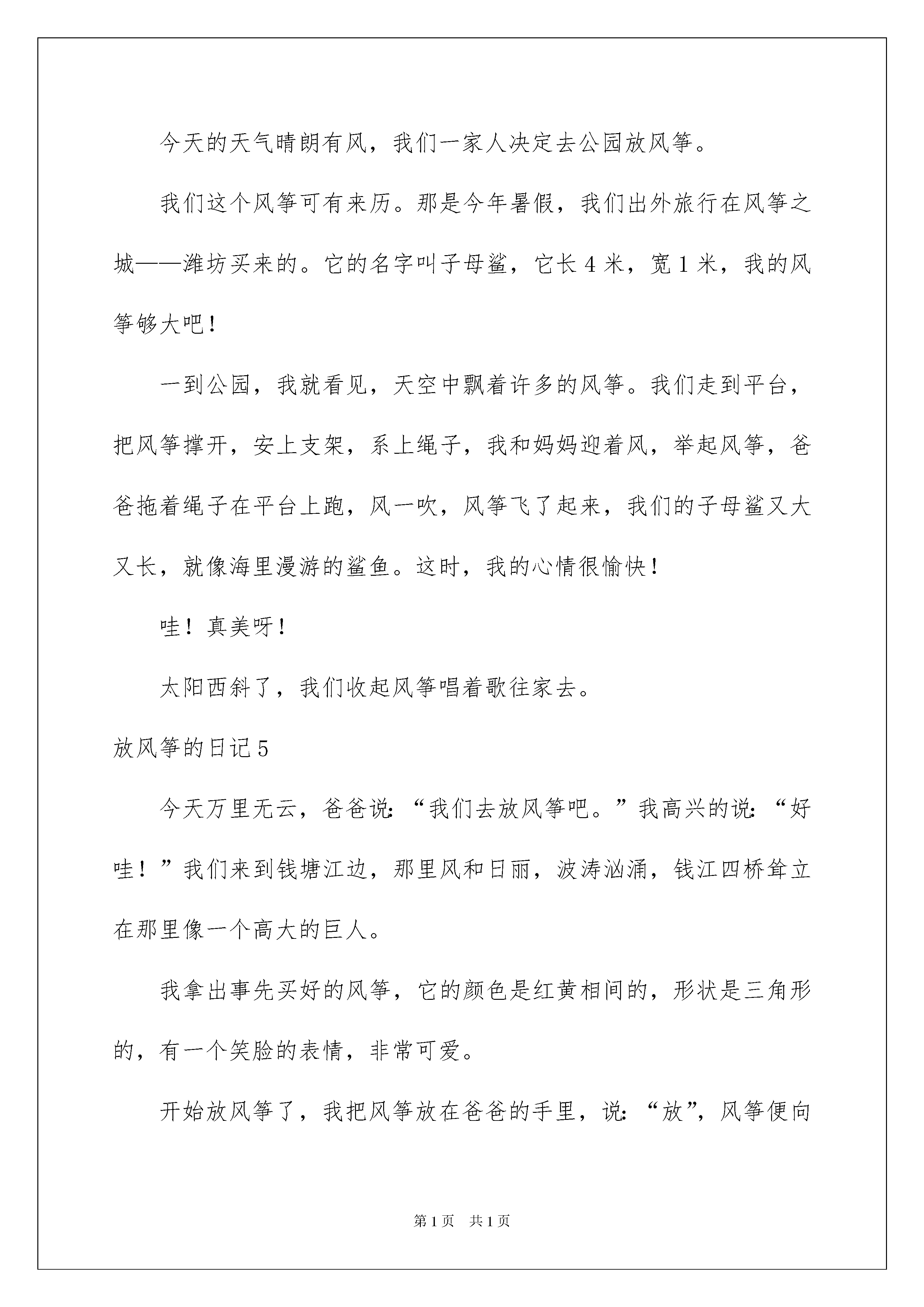 2022放风筝的日记15篇放风筝的日记忙碌而又充实的一天又过去了,想必有很多难忘的瞬间吧,何不趁现在赶紧写一篇日记。日记怎么写才合适呢?下面是我帮大家整理的放风筝的日记,欢迎阅读,希望大家能够喜欢。放风筝的日记1星期天,妈妈带我去公园放风筝。走进公园,我抬头一看,蓝天上飘着各种各样风筝,五颜六色,飘亮极。我买一个蝴蝶风筝,我拿着风筝问妈妈:该怎么放风筝才能飞起来呢?妈妈说:左手拿着线,右手拿风筝。我就照着妈妈说去,拿着风筝使劲一跑,风筝高高地往上飞起来。我跑呀跑呀,风筝怎么飞得那么低?我生气地说:哼!不玩,不玩。妈妈走过来对我说:做什么事情都不是一帆风顺,要有耐心。我听妈妈话,右去放风筝。正好这时风大起来,风筝飞得越来越高,我高兴极!这个星期天,我不仅学会放风筝,还懂得做什么事情都必须要有耐心,这样才能取得成功。放风筝的日记2星期六的早上,天空万里无云,春风拂面。小红和小明一起去公园放风筝,公园里放风筝的人可真多,有的是小燕子;有的是小鸟;还有的是我最喜欢的奥特曼。天空一片五彩缤纷,像一朵朵五颜六色的彩云真美丽啊!小红和小明玩得可开心。放风筝的日记3今天,我去舞阳玩,中午吃完饭,我去姐姐家放风筝。姐姐风筝上是喜羊羊与灰太狼图案,风筝是三角形,下面还有六条尾巴呢。到了广场,我们撑好风筝,就开始放了。姐姐拉着风筝线,后面是妹妹和我拿着风筝,我们一松手姐姐就跑起来了,风筝就飞上了天空。可是我们技术不太好,风筝没有别人飞得高。广场上还有许多人在放风筝呢,风筝样子真是太多了,有美人鱼、老鹰、蝙蝠、金鱼、机器猫,还有翼龙和飞机,并且他们放也很高,真是让人羡慕啊!我回去要拿着我风筝多练练哦!我真喜欢放风筝啊!放风筝的日记4今天的天气晴朗有风,我们一家人决定去公园放风筝。我们这个风筝可有来历。那是今年暑假,我们出外旅行在风筝之城——潍坊买来的。它的名字叫子母鲨,它长4米,宽1米,我的风筝够大吧!一到公园,我就看见,天空中飘着许多的风筝。我们走到平台,把风筝撑开,安上支架,系上绳子,我和妈妈迎着风,举起风筝,爸爸拖着绳子在平台上跑,风一吹,风筝飞了起来,我们的子母鲨又大又长,就像海里漫游的鲨鱼。这时,我的心情很愉快!哇!真美呀!太阳西斜了,我们收起风筝唱着歌往家去。放风筝的日记5今天万里无云,爸爸说:“我们去放风筝吧。”我高兴的说:“好哇!”我们来到钱塘江边,那里风和日丽,波涛汹涌,钱江四桥耸立在那里像一个高大的巨人。我拿出事先买好的风筝,它的颜色是红黄相间的,形状是三角形的,有一个笑脸的表情,非常可爱。开始放风筝了,我把风筝放在爸爸的手里,说:“放”,风筝便向高处飞翔,我跑得满头大汗,爸爸说让我玩会儿,我就把风筝递给了爸爸。突然爸爸不小心把风筝挂在了大树上,我急得直跺脚,爸爸找了一位清洁工叔叔,他爬上了树才把挂在大树上的风筝拿了下来。我们玩得可开心了!放风筝的日记6今天,我和妈妈,还有唐超一家一起去沙河公园放风筝。来到沙河公园,我们首先看到是一盆盆五颜六色鲜花,它们摆在路两旁,像是在夹道欢迎我们呢!来到草坪,呈现在我们眼前是一张绿色地毯。突然,唐超喊道鸟!我抬头一看是五颜六色风筝,它们正像无数只鸟儿在天空自由自在地飞翔。看到满天飞鸟,我迫不及待地拿起风筝,放起来。可放好多次,风筝还是飞不起来,正当我感到非常沮丧时,唐叔叔赶来帮忙,经过几次努力尝试,风筝终于飞上天空。我们在草地上拼命地奔跑,快乐地喊叫不知不觉就到下午六点多,我们才依依不舍地离开公园回家。这真是开心一天!放风筝的日记7今天,早上老师带着咱们坐着家长的车来到凤凰广场放飞风筝。每个人都拿出自己的风筝,有美人鱼、蜡笔小新……我的风筝是一架战斗机。开始放风筝了,一手抓住线另一只手抓住把手。我的风筝放得太高,太远了。我觉得自己仿佛在开飞机,战斗机突然从空中降落,我使劲往回拉线,我的战斗机就又回到了空中,当我正高兴的时候,风筝线突然断了,我的风筝落在了马路上,我把风筝捡了回来,把线连起来。我看见赵泽禹的'风筝放的最高,我要PK赵泽禹,我还是输了。我看见刘璐宽的风筝掉进了水里,成了风筝潜水艇,飞起来的时候洒了咱们一身水,没想到荆韬的蜡笔小新也降入水中,真可惜呀!这次放飞,让咱们好开心啊!放风筝的日记8我和我的姐姐约好了去南河边公园玩。当我到达公园时,我迫不及待地跑向海滩!我在沙滩上看到了我的妹妹,我马上把我已经准备好的风筝递给她,并教她如何放风筝。首先,她被教导要拉长风筝线,然后紧紧地握住线柄,在风中奔跑,拉紧线,当风大时放线,当风小时收线。把风筝线拉上拉下,我姐姐手里的线在蓝天上慢慢地飞了起来。突然,一阵风吹过,打破了我姐姐手中的风筝线