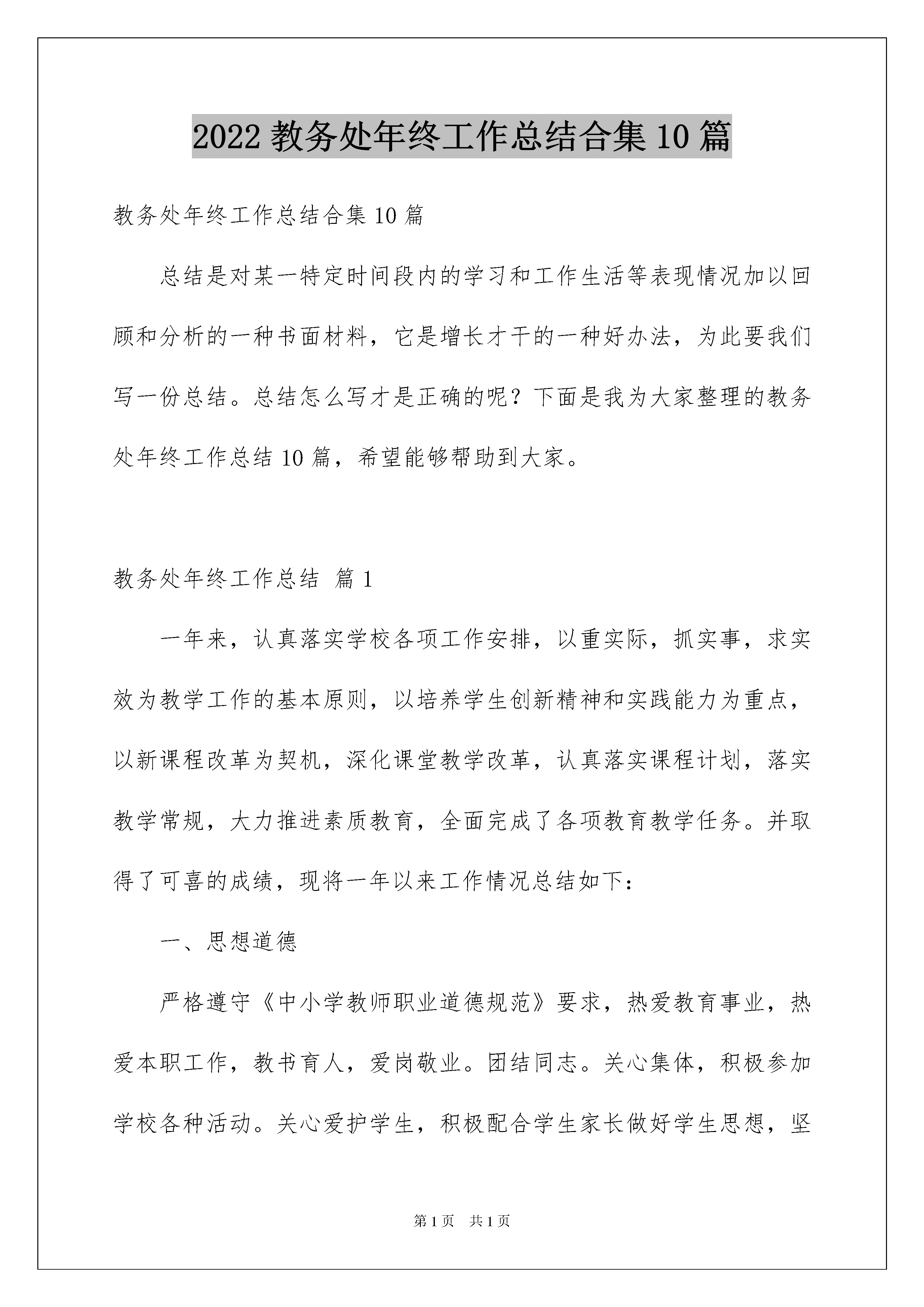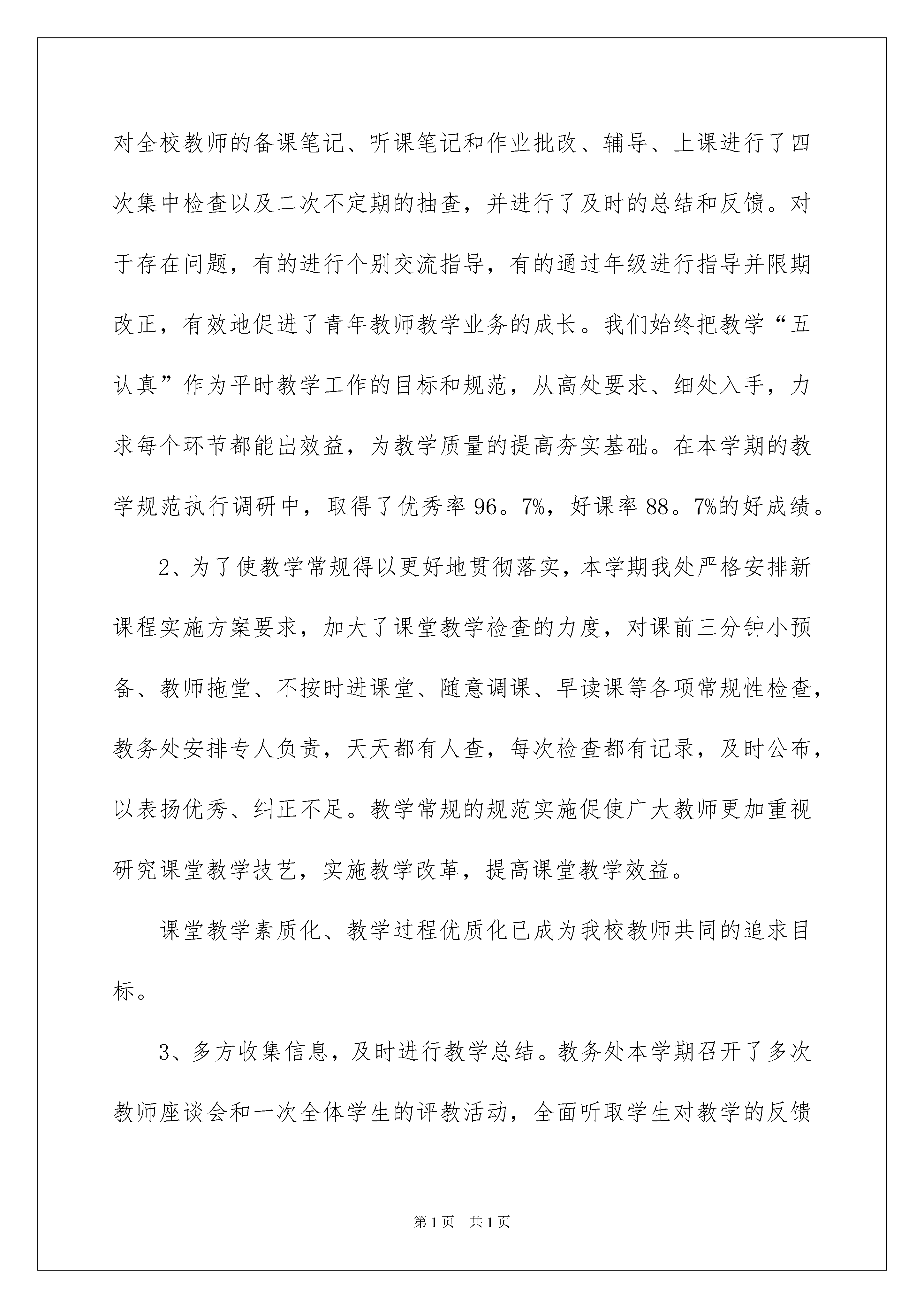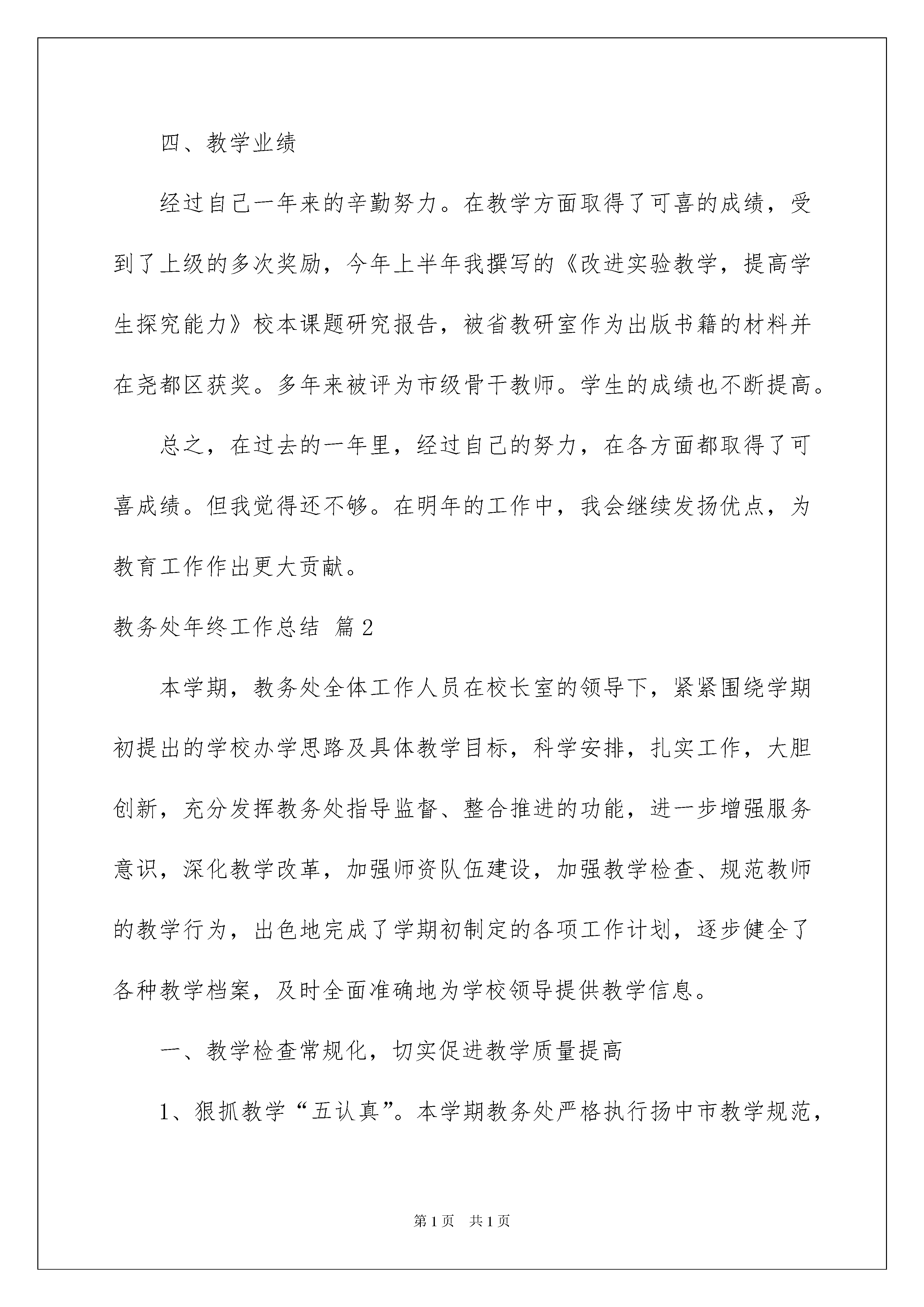2022教务处年终工作总结合集10篇教务处年终工作总结合集10篇总结是对某一特定时间段内的学习和工作生活等表现情况加以回顾和分析的一种书面材料,它是增长才干的一种好办法,为此要我们写一份总结。总结怎么写才是正确的呢?下面是我为大家整理的教务处年终工作总结10篇,希望能够帮助到大家。教务处年终工作总结篇1一年来,认真落实学校各项工作安排,以重实际,抓实事,求实效为教学工作的基本原则,以培养学生创新精神和实践能力为重点,以新课程改革为契机,深化课堂教学改革,认真落实课程计划,落实教学常规,大力推进素质教育,全面完成了各项教育教学任务。并取得了可喜的成绩,现将一年以来工作情况总结如下:一、思想道德严格遵守《中小学教师职业道德规范》要求,热爱教育事业,热爱本职工作,教书育人,爱岗敬业。团结同志。关心集体,积极参加学校各种活动。关心爱护学生,积极配合学生家长做好学生思想,坚持每周的政治学习和业务学习,紧紧围绕新课程标准学习新课程,构建新课程,尝试新教法,不断更新教学观念。提高了政治觉悟和思想道德水平。二、考勤按时到校,坚持两签两消,坚守工作岗位,从没耽误过学生一节课,尽量少请假或不请假。三、教学工作在教学工作中,做到:认真备课、讲课、辅导、批改、考核学生成绩。在课内课外对学生进行思想品德教育,激发学生学习兴趣。积极参加新课程改革研讨、虚心听取别人意见,上好每一节课,打破常规教学模式,大胆改革,大胆尝试创新。坚持启发、诱导原则,采用多种教学方法和多种教学手段,结合多媒体教学手段充分调动学生的学习积极性。在差生转化方面,也做了大量工作。1、课前认真准备,认真钻研教材,对教材的基本思想、基本概念,每句话、每个字都弄清楚,了解教材的结构,重点与难点,掌握知识的逻辑,能运用自如,知道应补充哪些资料,怎样才能教好。2、了解学生原有的知识技能,以及兴趣、习惯,预测学习新知识过程中可能会有哪些问题,并采取相应的预防措施。3、优选教法,结合学生的实际选择恰当的教法,解决如何把已掌握的教材传授给学生,包括如何组织教材、如何安排每节课的活动。4、组织好课堂教学,关注全体学生,注意信息反馈,充分调动学生的学习积极性,同时,激发学生的情感,使他们产生愉悦的心境,创造良好的课堂气氛,课堂提问面向全体学生,课堂上讲练结合,布置作业少而精,减轻学生的负担。5、尤其在后进生的转化上,对后进生努力做到从友善开始,比如,握握他的手,摸摸他的头,或帮助整理衣服。从赞美着手,所有的人都渴望得到别人的理解和尊重,所以,和差生交谈时,对他的处境、想法表示深刻的理解和尊重热爱学生,平等的对待每一个学生用发展的观点看学生,应当纵向地看到:后进生的今天比他的昨天好,即使不然,也应相信他的明天会比今天好。真正做到晓之以理,动之以情,让他们都感受到老师的关心,良好的师生关系从而促进了学生的学习。6、身为教研组长,认真履行自己的职责,在教学研究方面理应首当其冲,组织理化生组的成员积极参与听课、评课以及教研活动,坚持间周一次的备课和作业批改检查工作,大胆进行校本课题研究。四、教学业绩经过自己一年来的辛勤努力。在教学方面取得了可喜的成绩,受到了上级的多次奖励,今年上半年我撰写的《改进实验教学,提高学生探究能力》校本课题研究报告,被省教研室作为出版书籍的材料并在尧都区获奖。多年来被评为市级骨干教师。学生的成绩也不断提高。总之,在过去的一年里,经过自己的努力,在各方面都取得了可喜成绩。但我觉得还不够。在明年的工作中,我会继续发扬优点,为教育工作作出更大贡献。教务处年终工作总结篇2本学期,教务处全体工作人员在校长室的领导下,紧紧围绕学期初提出的学校办学思路及具体教学目标,科学安排,扎实工作,大胆创新,充分发挥教务处指导监督、整合推进的功能,进一步增强服务意识,深化教学改革,加强师资队伍建设,加强教学检查、规范教师的教学行为,出色地完成了学期初制定的各项工作计划,逐步健全了各种教学档案,及时全面准确地为学校领导提供教学信息。一、教学检查常规化,切实促进教学质量提高1、狠抓教学“五认真”。本学期教务处严格执行扬中市教学规范,对全校教师的备课笔记、听课笔记和作业批改、辅导、上课进行了四次集中检查以及二次不定期的抽查,并进行了及时的总结和反馈。对于存在问题,有的进行个别交流指导,有的通过年级进行指导并限期改正,有效地促进了青年教师教学业务的成长。我们始终把教学“五认真”作为平时教学工作的目标和规范,从高处要求、细处入手,力求每个环节都能出效益,为教学质量的提高夯实基础。在本学期的教学规范执行调研中,取得了优秀率96。7%,好课率88。7%的好成绩。2、为了