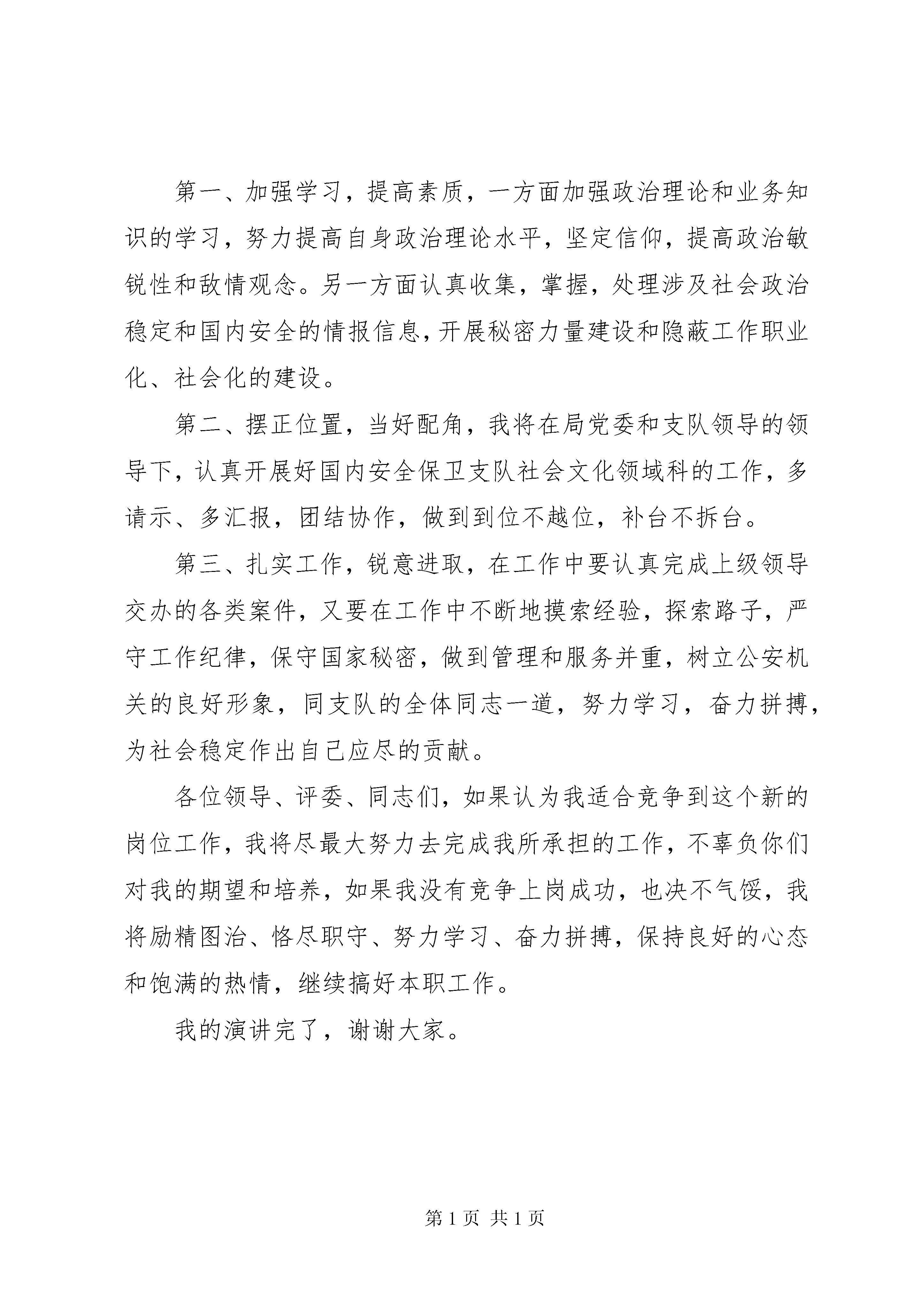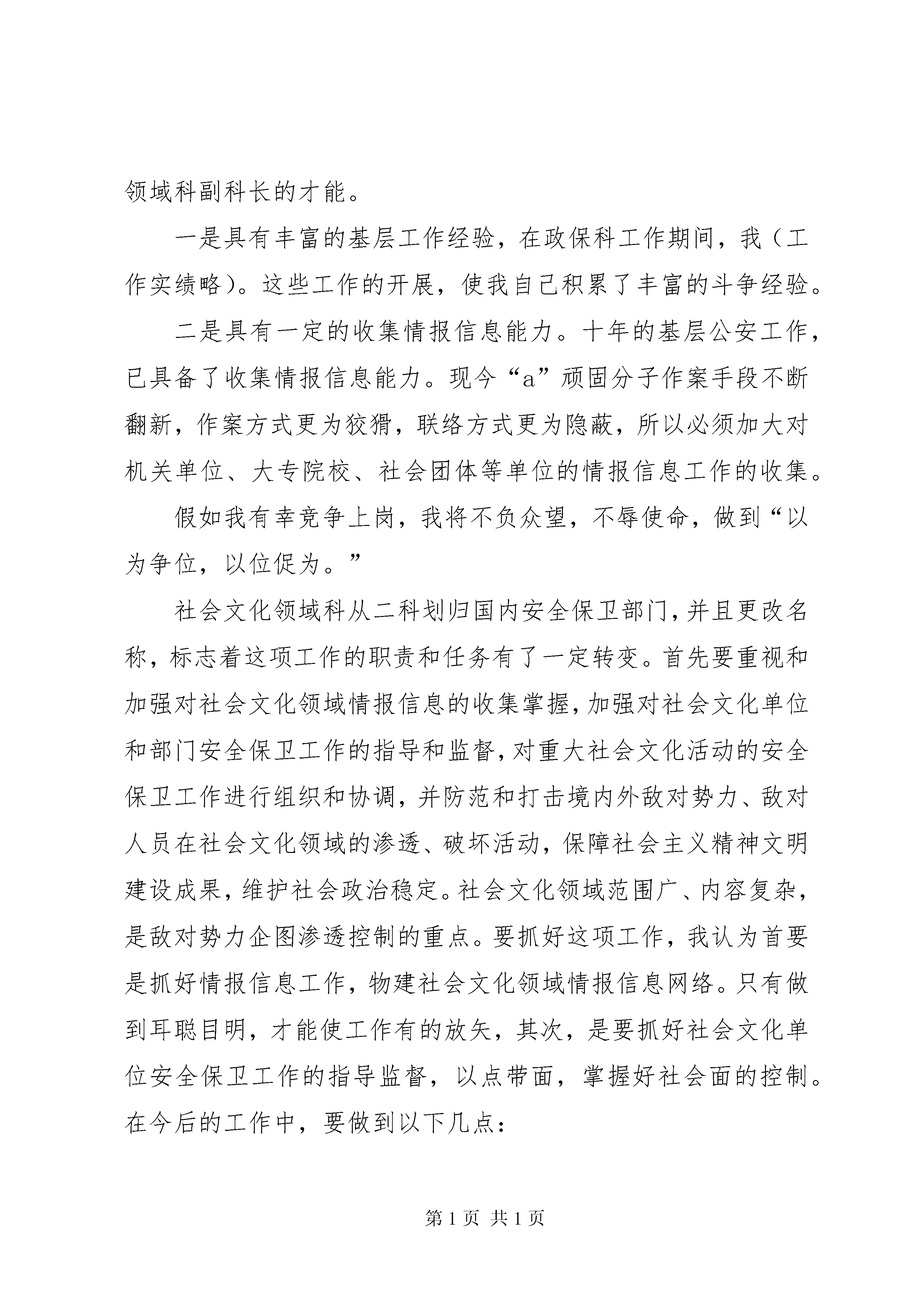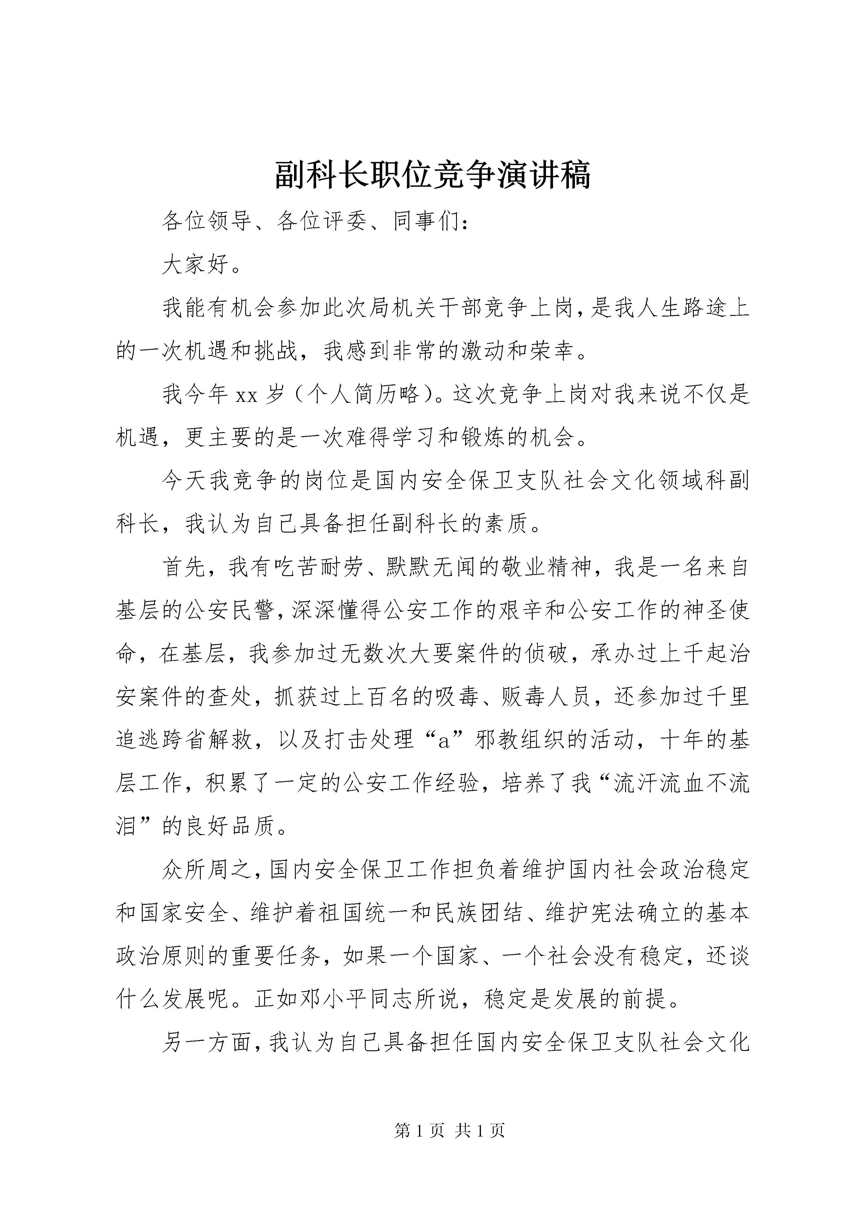 副科长职位竞争演讲稿各位领导、各位评委、同事们:大家好。我能有机会参加此次局机关干部竞争上岗,是我人生路途上的一次机遇和挑战,我感到非常的激动和荣幸。我今年xx岁(个人简历略)。这次竞争上岗对我来说不仅是机遇,更主要的是一次难得学习和锻炼的机会。今天我竞争的岗位是国内安全保卫支队社会文化领域科副科长,我认为自己具备担任副科长的素质。首先,我有吃苦耐劳、默默无闻的敬业精神,我是一名来自基层的公安民警,深深懂得公安工作的艰辛和公安工作的神圣使命,在基层,我参加过无数次大要案件的侦破,承办过上千起治安案件的查处,抓获过上百名的吸毒、贩毒人员,还参加过千里追逃跨省解救,以及打击处理“a”邪教组织的活动,十年的基层工作,积累了一定的公安工作经验,培养了我“流汗流血不流泪”的良好品质。众所周之,国内安全保卫工作担负着维护国内社会政治稳定和国家安全、维护着祖国统一和民族团结、维护宪法确立的基本政治原则的重要任务,如果一个国家、一个社会没有稳定,还谈什么发展呢。正如邓小平同志所说,稳定是发展的前提。另一方面,我认为自己具备担任国内安全保卫支队社会文化领域科副科长的才能。一是具有丰富的基层工作经验,在政保科工作期间,我(工作实绩略)。这些工作的开展,使我自己积累了丰富的斗争经验。二是具有一定的收集情报信息能力。十年的基层公安工作,已具备了收集情报信息能力。现今“a”顽固分子作案手段不断翻新,作案方式更为狡猾,联络方式更为隐蔽,所以必须加大对机关单位、大专院校、社会团体等单位的情报信息工作的收集。假如我有幸竞争上岗,我将不负众望,不辱使命,做到“以为争位,以位促为。”社会文化领域科从二科划归国内安全保卫部门,并且更改名称,标志着这项工作的职责和任务有了一定转变。首先要重视和加强对社会文化领域情报信息的收集掌握,加强对社会文化单位和部门安全保卫工作的指导和监督,对重大社会文化活动的安全保卫工作进行组织和协调,并防范和打击境内外敌对势力、敌对人员在社会文化领域的渗透、破坏活动,保障社会主义精神文明建设成果,维护社会政治稳定。社会文化领域范围广、内容复杂,是敌对势力企图渗透控制的重点。要抓好这项工作,我认为首要是抓好情报信息工作,物建社会文化领域情报信息网络。只有做到耳聪目明,才能使工作有的放矢,其次,是要抓好社会文化单位安全保卫工作的指导监督,以点带面,掌握好社会面的控制。在今后的工作中,要做到以下几点:第一、加强学习,提高素质,一方面加强政治理论和业务知识的学习,努力提高自身政治理论水平,坚定信仰,提高政治敏锐性和敌情观念。另一方面认真收集,掌握,处理涉及社会政治稳定和国内安全的情报信息,开展秘密力量建设和隐蔽工作职业化、社会化的建设。第二、摆正位置,当好配角,我将在局党委和支队领导的领导下,认真开展好国内安全保卫支队社会文化领域科的工作,多请示、多汇报,团结协作,做到到位不越位,补台不拆台。第三、扎实工作,锐意进取,在工作中要认真完成上级领导交办的各类案件,又要在工作中不断地摸索经验,探索路子,严守工作纪律,保守国家秘密,做到管理和服务并重,树立公安机关的良好形象,同支队的全体同志一道,努力学习,奋力拼搏,为社会稳定作出自己应尽的贡献。各位领导、评委、同志们,如果认为我适合竞争到这个新的岗位工作,我将尽最大努力去完成我所承担的工作,不辜负你们对我的期望和培养,如果我没有竞争上岗成功,也决不气馁,我将励精图治、恪尽职守、努力学习、奋力拼搏,保持良好的心态和饱满的热情,继续搞好本职工作。我的演讲完了,谢谢大家。