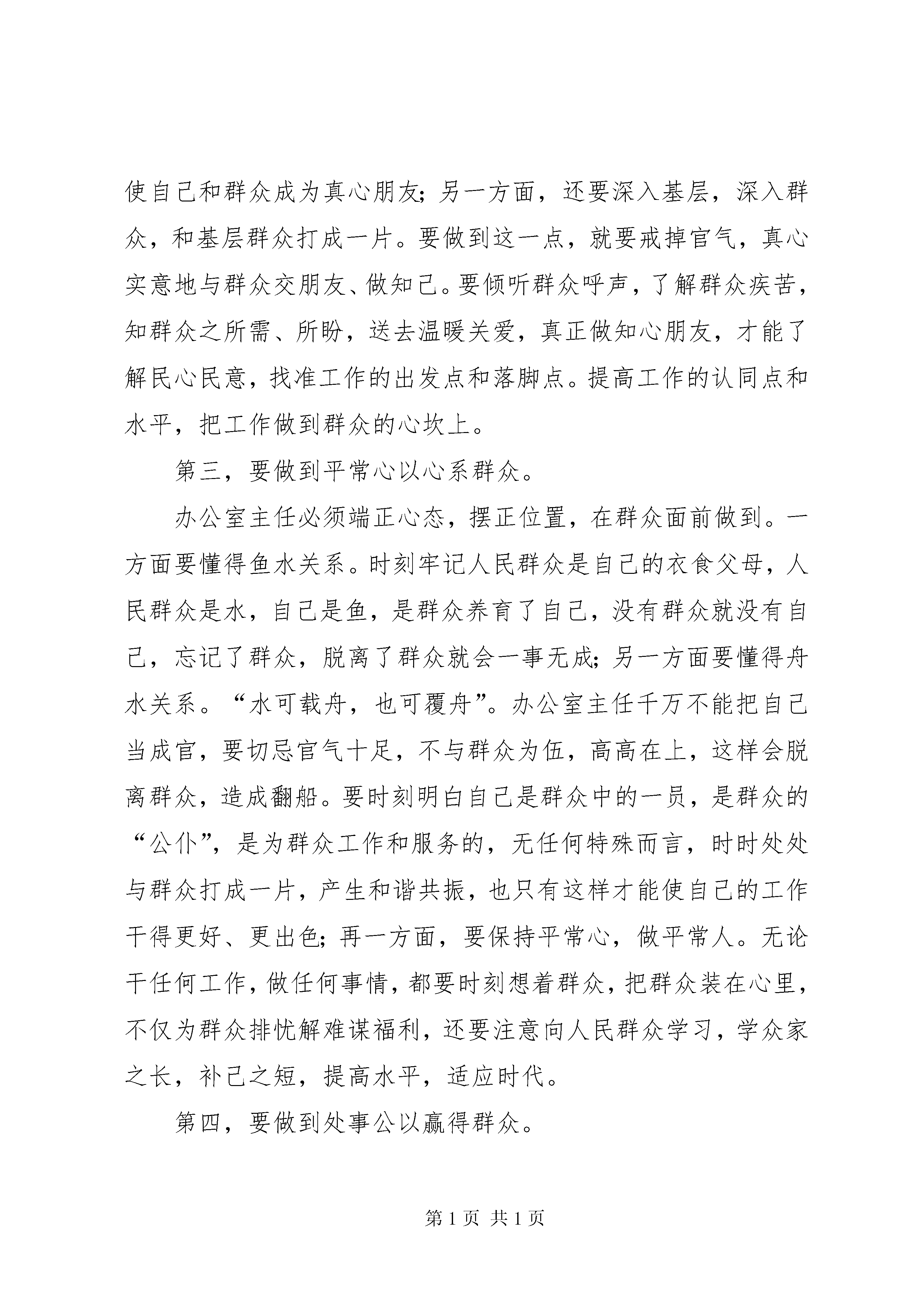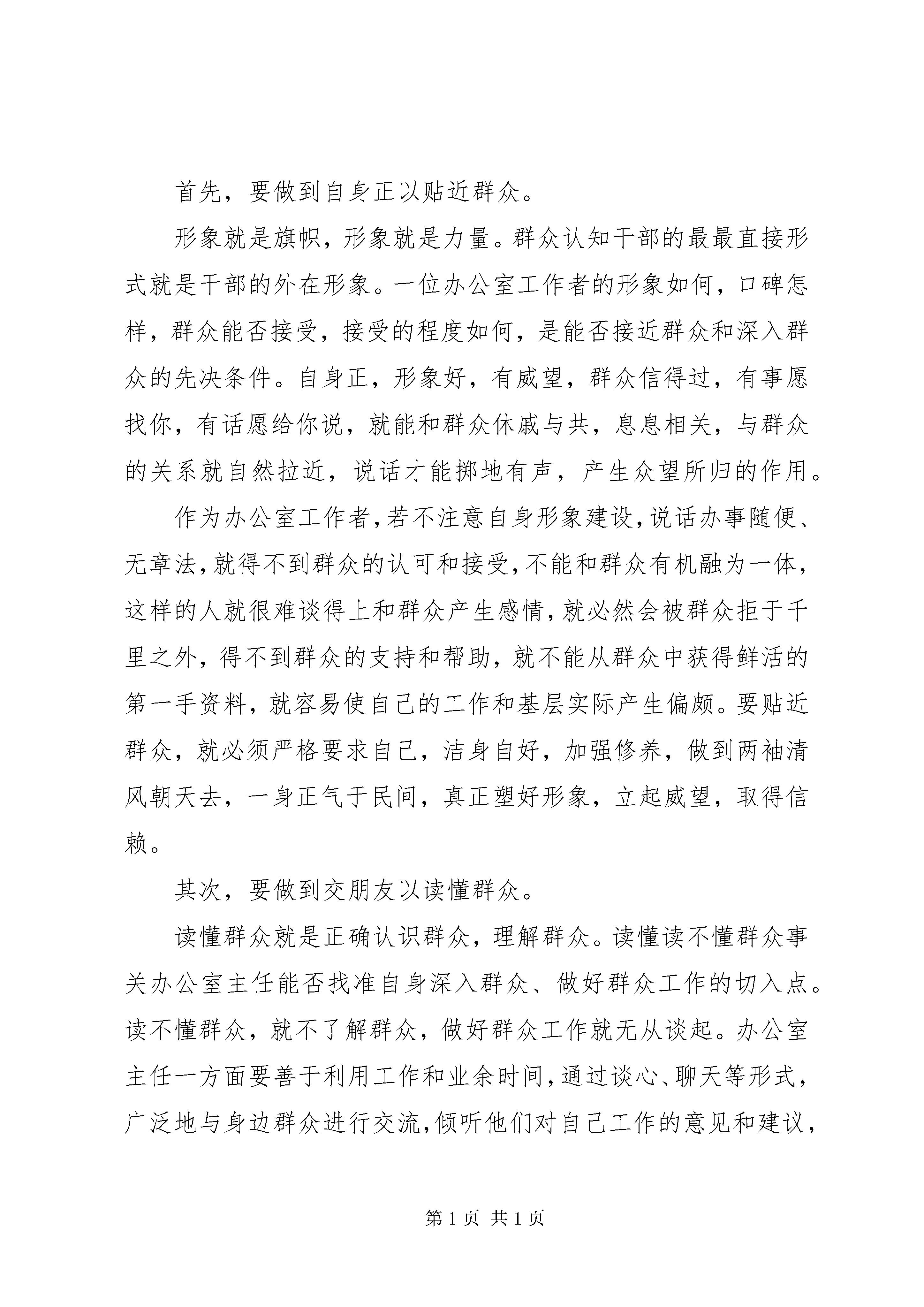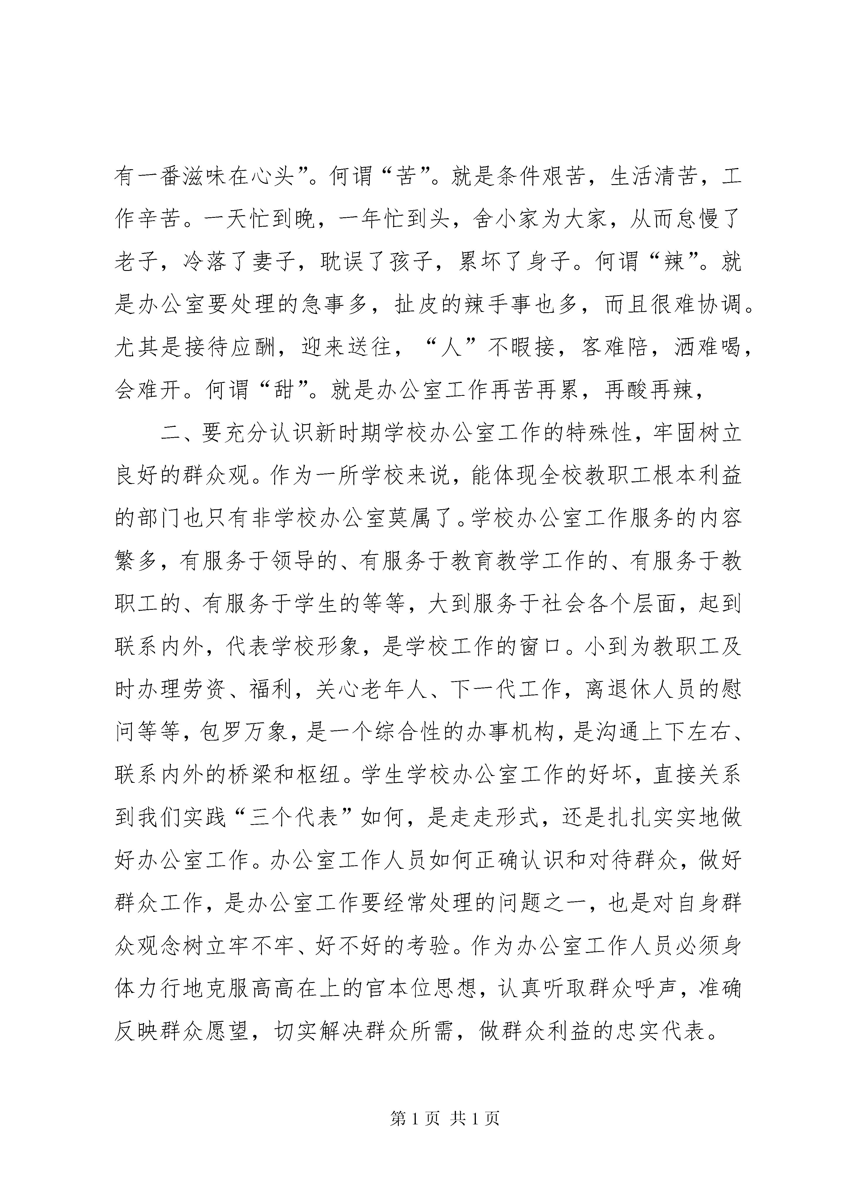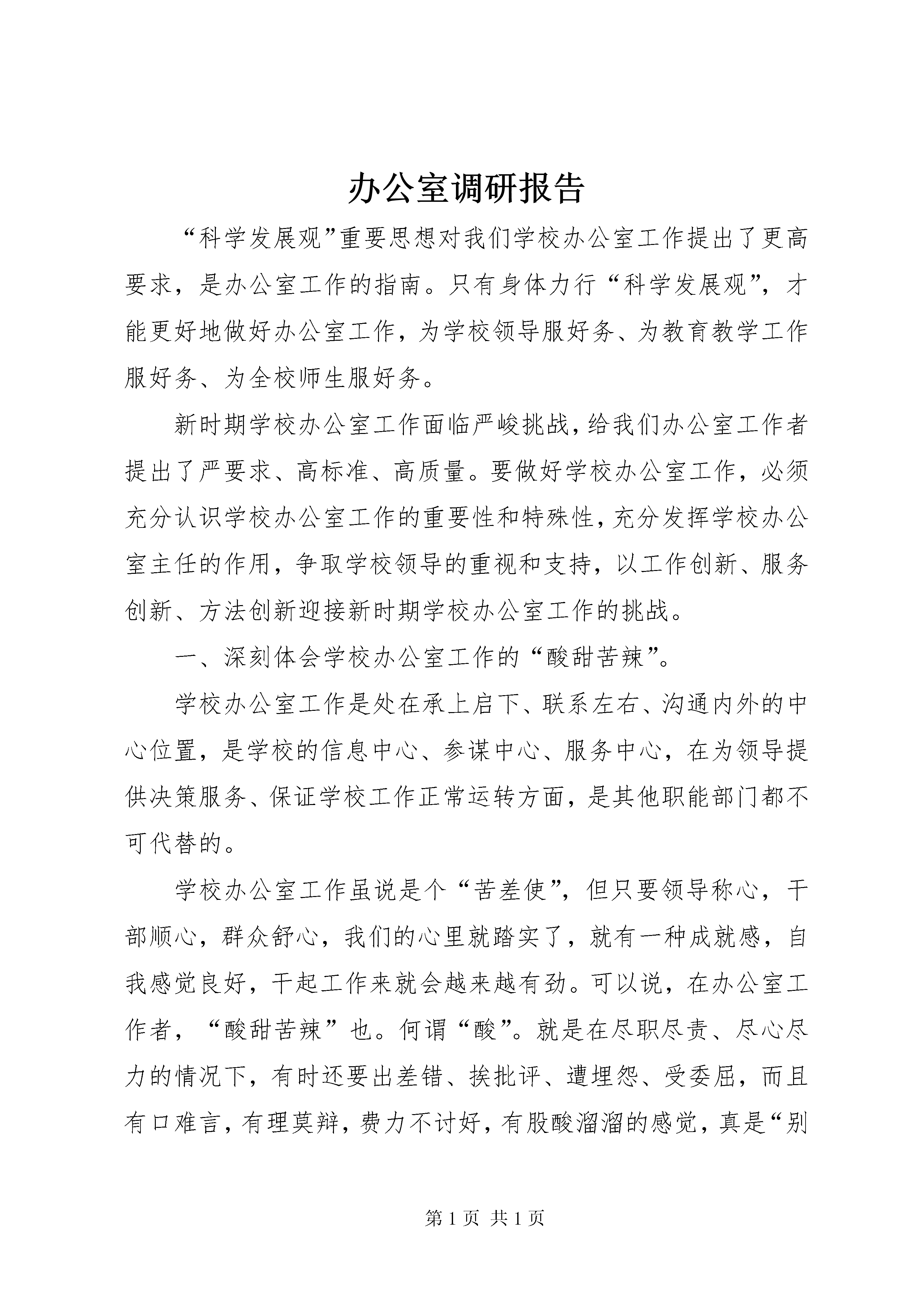 办公室调研报告“科学发展观”重要思想对我们学校办公室工作提出了更高要求,是办公室工作的指南。只有身体力行“科学发展观”,才能更好地做好办公室工作,为学校领导服好务、为教育教学工作服好务、为全校师生服好务。新时期学校办公室工作面临严峻挑战,给我们办公室工作者提出了严要求、高标准、高质量。要做好学校办公室工作,必须充分认识学校办公室工作的重要性和特殊性,充分发挥学校办公室主任的作用,争取学校领导的重视和支持,以工作创新、服务创新、方法创新迎接新时期学校办公室工作的挑战。一、深刻体会学校办公室工作的“酸甜苦辣”。学校办公室工作是处在承上启下、联系左右、沟通内外的中心位置,是学校的信息中心、参谋中心、服务中心,在为领导提供决策服务、保证学校工作正常运转方面,是其他职能部门都不可代替的。学校办公室工作虽说是个“苦差使”,但只要领导称心,干部顺心,群众舒心,我们的心里就踏实了,就有一种成就感,自我感觉良好,干起工作来就会越来越有劲。可以说,在办公室工作者,“酸甜苦辣”也。何谓“酸”。就是在尽职尽责、尽心尽力的情况下,有时还要出差错、挨批评、遭埋怨、受委屈,而且有口难言,有理莫辩,费力不讨好,有股酸溜溜的感觉,真是“别有一番滋味在心头”。何谓“苦”。就是条件艰苦,生活清苦,工作辛苦。一天忙到晚,一年忙到头,舍小家为大家,从而怠慢了老子,冷落了妻子,耽误了孩子,累坏了身子。何谓“辣”。就是办公室要处理的急事多,扯皮的辣手事也多,而且很难协调。尤其是接待应酬,迎来送往,“人”不暇接,客难陪,洒难喝,会难开。何谓“甜”。就是办公室工作再苦再累,再酸再辣,二、要充分认识新时期学校办公室工作的特殊性,牢固树立良好的群众观。作为一所学校来说,能体现全校教职工根本利益的部门也只有非学校办公室莫属了。学校办公室工作服务的内容繁多,有服务于领导的、有服务于教育教学工作的、有服务于教职工的、有服务于学生的等等,大到服务于社会各个层面,起到联系内外,代表学校形象,是学校工作的窗口。小到为教职工及时办理劳资、福利,关心老年人、下一代工作,离退休人员的慰问等等,包罗万象,是一个综合性的办事机构,是沟通上下左右、联系内外的桥梁和枢纽。学生学校办公室工作的好坏,直接关系到我们实践“三个代表”如何,是走走形式,还是扎扎实实地做好办公室工作。办公室工作人员如何正确认识和对待群众,做好群众工作,是办公室工作要经常处理的问题之一,也是对自身群众观念树立牢不牢、好不好的考验。作为办公室工作人员必须身体力行地克服高高在上的官本位思想,认真听取群众呼声,准确反映群众愿望,切实解决群众所需,做群众利益的忠实代表。首先,要做到自身正以贴近群众。形象就是旗帜,形象就是力量。群众认知干部的最最直接形式就是干部的外在形象。一位办公室工作者的形象如何,口碑怎样,群众能否接受,接受的程度如何,是能否接近群众和深入群众的先决条件。自身正,形象好,有威望,群众信得过,有事愿找你,有话愿给你说,就能和群众休戚与共,息息相关,与群众的关系就自然拉近,说话才能掷地有声,产生众望所归的作用。作为办公室工作者,若不注意自身形象建设,说话办事随便、无章法,就得不到群众的认可和接受,不能和群众有机融为一体,这样的人就很难谈得上和群众产生感情,就必然会被群众拒于千里之外,得不到群众的支持和帮助,就不能从群众中获得鲜活的第一手资料,就容易使自己的工作和基层实际产生偏颇。要贴近群众,就必须严格要求自己,洁身自好,加强修养,做到两袖清风朝天去,一身正气于民间,真正塑好形象,立起威望,取得信赖。其次,要做到交朋友以读懂群众。读懂群众就是正确认识群众,理解群众。读懂读不懂群众事关办公室主任能否找准自身深入群众、做好群众工作的切入点。读不懂群众,就不了解群众,做好群众工作就无从谈起。办公室主任一方面要善于利用工作和业余时间,通过谈心、聊天等形式,广泛地与身边群众进行交流,倾听他们对自己工作的意见和建议,使自己和群众成为真心朋友;另一方面,还要深入基层,深入群众,和基层群众打成一片。要做到这一点,就要戒掉官气,真心实意地与群众交朋友、做知己。要倾听群众呼声,了解群众疾苦,知群众之所需、所盼,送去温暖关爱,真正做知心朋友,才能了解民心民意,找准工作的出发点和落脚点。提高工作的认同点和水平,把工作做到群众的心坎上。第三,要做到平常心以心系群众。办公室主任必须端正心态,摆正位置,在群众面前做到。一方面要懂得鱼水关系。时刻牢记人民群众是自己的衣食父母,人民群众是水,自己是鱼,是群众养育了自己,没有群众就没有自己,忘记了群众,脱离了群众就会一事无成;另一方面要懂得舟水关系。“水可载舟,也可覆舟”。办公室主任千万不能把自己当成官,要切忌官气十足,不与群众为伍,高高在上,这样会脱离群众,造成翻船。要时刻明白自己是群众中