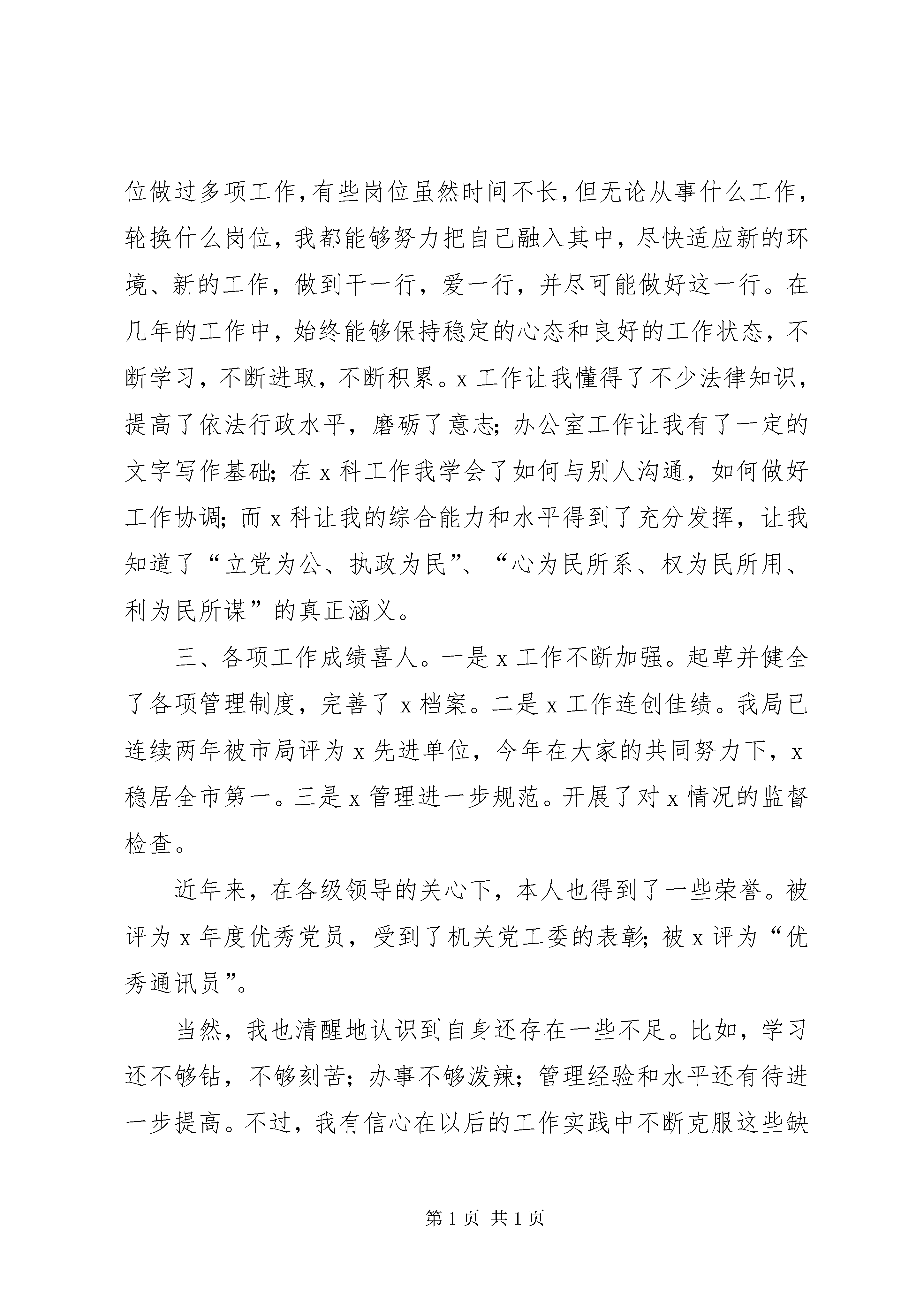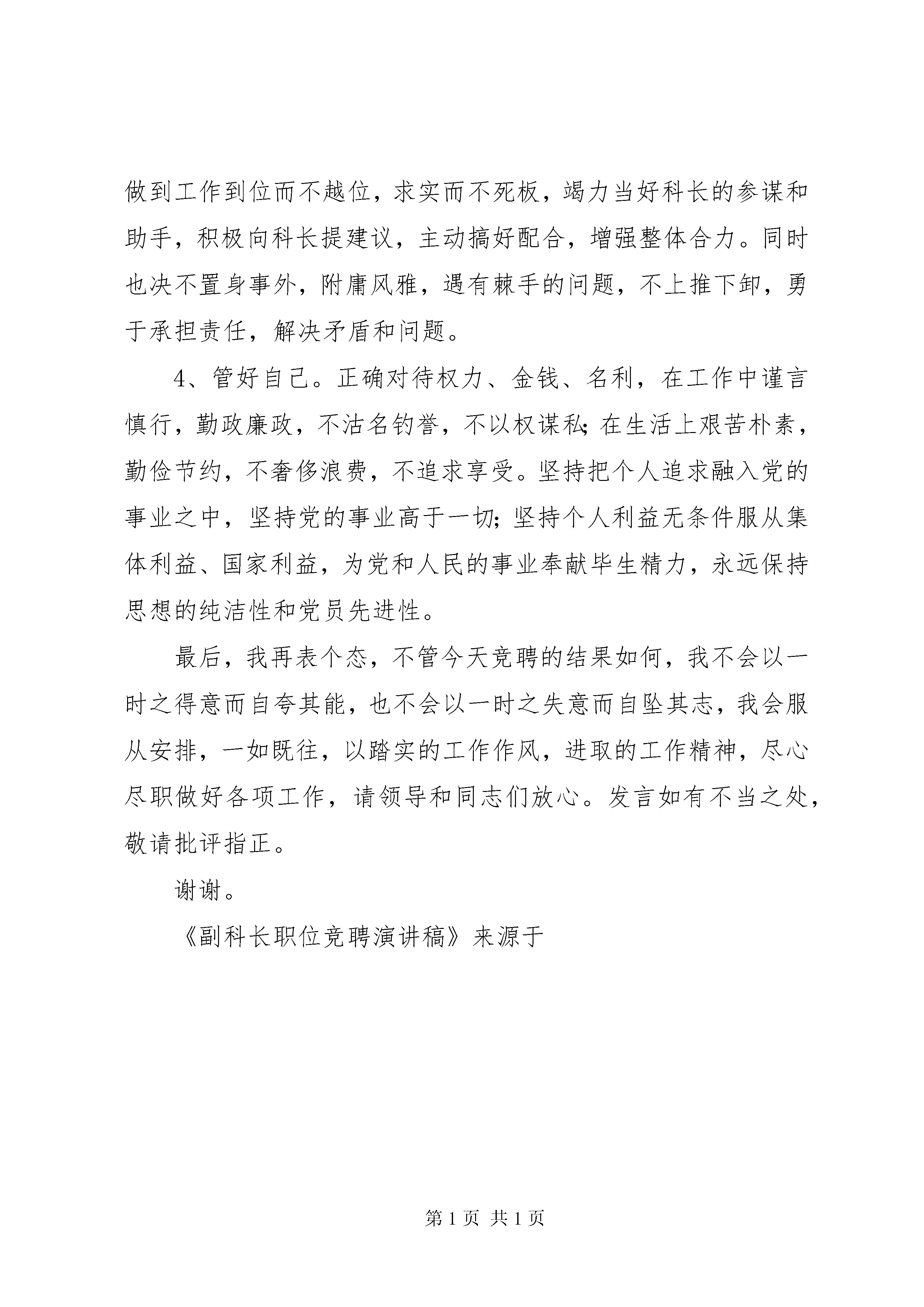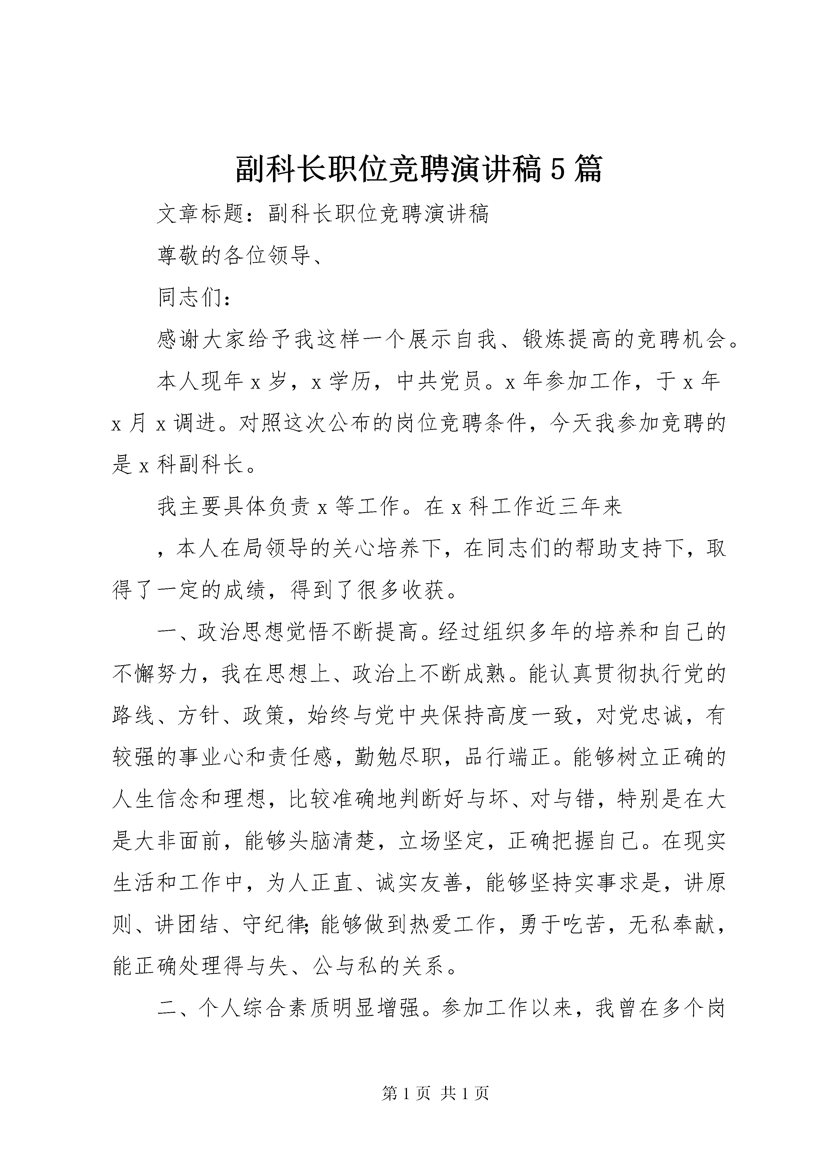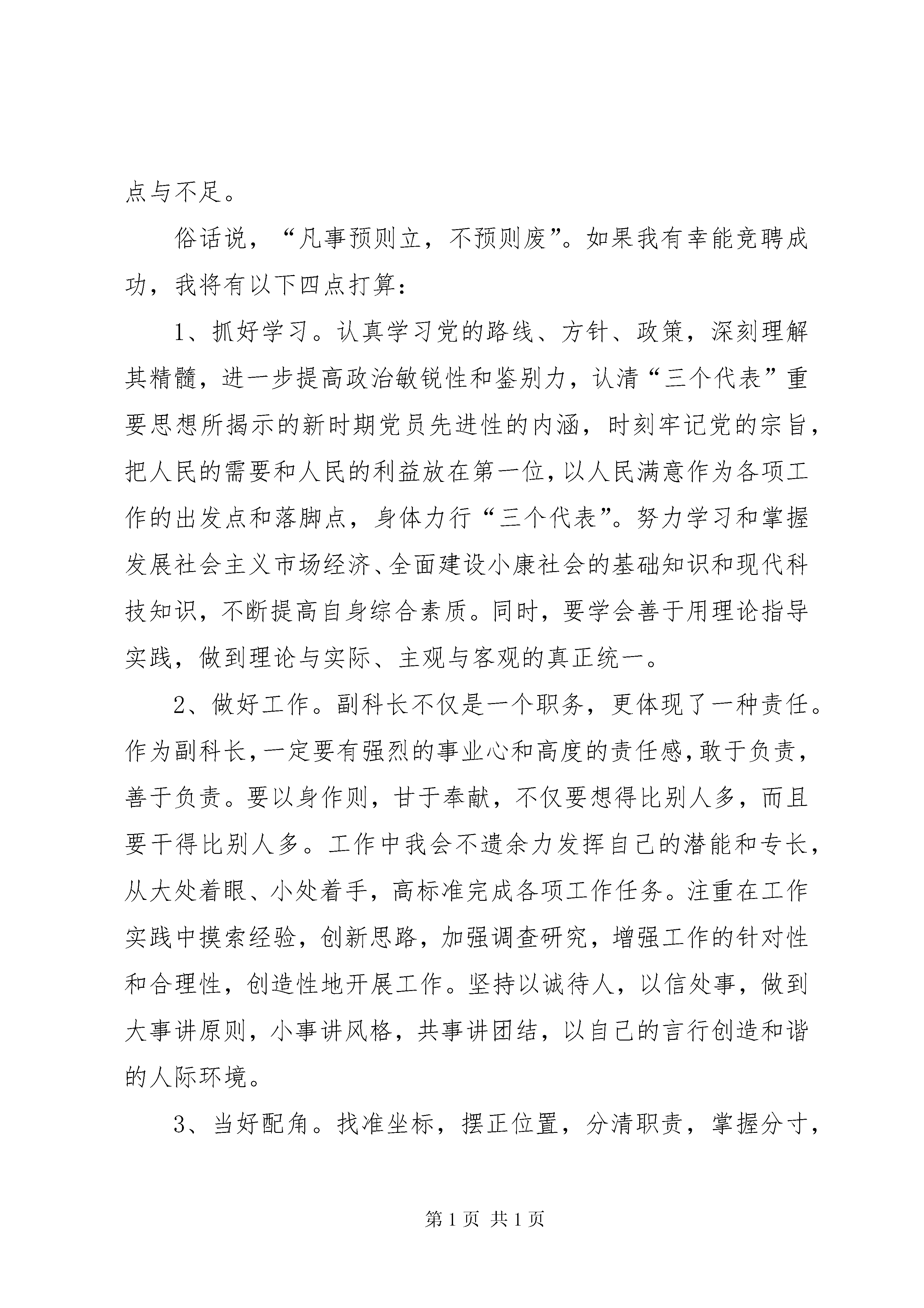 副科长职位竞聘演讲稿5篇文章标题:副科长职位竞聘演讲稿尊敬的各位领导、同志们:感谢大家给予我这样一个展示自我、锻炼提高的竞聘机会。本人现年x岁,x学历,中共党员。x年参加工作,于x年x月x调进。对照这次公布的岗位竞聘条件,今天我参加竞聘的是x科副科长。我主要具体负责x等工作。在x科工作近三年来,本人在局领导的关心培养下,在同志们的帮助支持下,取得了一定的成绩,得到了很多收获。一、政治思想觉悟不断提高。经过组织多年的培养和自己的不懈努力,我在思想上、政治上不断成熟。能认真贯彻执行党的路线、方针、政策,始终与党中央保持高度一致,对党忠诚,有较强的事业心和责任感,勤勉尽职,品行端正。能够树立正确的人生信念和理想,比较准确地判断好与坏、对与错,特别是在大是大非面前,能够头脑清楚,立场坚定,正确把握自己。在现实生活和工作中,为人正直、诚实友善,能够坚持实事求是,讲原则、讲团结、守纪律;能够做到热爱工作,勇于吃苦,无私奉献,能正确处理得与失、公与私的关系。二、个人综合素质明显增强。参加工作以来,我曾在多个岗位做过多项工作,有些岗位虽然时间不长,但无论从事什么工作,轮换什么岗位,我都能够努力把自己融入其中,尽快适应新的环境、新的工作,做到干一行,爱一行,并尽可能做好这一行。在几年的工作中,始终能够保持稳定的心态和良好的工作状态,不断学习,不断进取,不断积累。x工作让我懂得了不少法律知识,提高了依法行政水平,磨砺了意志;办公室工作让我有了一定的文字写作基础;在x科工作我学会了如何与别人沟通,如何做好工作协调;而x科让我的综合能力和水平得到了充分发挥,让我知道了“立党为公、执政为民”、“心为民所系、权为民所用、利为民所谋”的真正涵义。三、各项工作成绩喜人。一是x工作不断加强。起草并健全了各项管理制度,完善了x档案。二是x工作连创佳绩。我局已连续两年被市局评为x先进单位,今年在大家的共同努力下,x稳居全市第一。三是x管理进一步规范。开展了对x情况的监督检查。近年来,在各级领导的关心下,本人也得到了一些荣誉。被评为x年度优秀党员,受到了机关党工委的表彰;被x评为“优秀通讯员”。当然,我也清醒地认识到自身还存在一些不足。比如,学习还不够钻,不够刻苦;办事不够泼辣;管理经验和水平还有待进一步提高。不过,我有信心在以后的工作实践中不断克服这些缺点与不足。俗话说,“凡事预则立,不预则废”。如果我有幸能竞聘成功,我将有以下四点打算:1、抓好学习。认真学习党的路线、方针、政策,深刻理解其精髓,进一步提高政治敏锐性和鉴别力,认清“三个代表”重要思想所揭示的新时期党员先进性的内涵,时刻牢记党的宗旨,把人民的需要和人民的利益放在第一位,以人民满意作为各项工作的出发点和落脚点,身体力行“三个代表”。努力学习和掌握发展社会主义市场经济、全面建设小康社会的基础知识和现代科技知识,不断提高自身综合素质。同时,要学会善于用理论指导实践,做到理论与实际、主观与客观的真正统一。2、做好工作。副科长不仅是一个职务,更体现了一种责任。作为副科长,一定要有强烈的事业心和高度的责任感,敢于负责,善于负责。要以身作则,甘于奉献,不仅要想得比别人多,而且要干得比别人多。工作中我会不遗余力发挥自己的潜能和专长,从大处着眼、小处着手,高标准完成各项工作任务。注重在工作实践中摸索经验,创新思路,加强调查研究,增强工作的针对性和合理性,创造性地开展工作。坚持以诚待人,以信处事,做到大事讲原则,小事讲风格,共事讲团结,以自己的言行创造和谐的人际环境。3、当好配角。找准坐标,摆正位置,分清职责,掌握分寸,做到工作到位而不越位,求实而不死板,竭力当好科长的参谋和助手,积极向科长提建议,主动搞好配合,增强整体合力。同时也决不置身事外,附庸风雅,遇有棘手的问题,不上推下卸,勇于承担责任,解决矛盾和问题。4、管好自己。正确对待权力、金钱、名利,在工作中谨言慎行,勤政廉政,不沽名钓誉,不以权谋私;在生活上艰苦朴素,勤俭节约,不奢侈浪费,不追求享受。坚持把个人追求融入党的事业之中,坚持党的事业高于一切;坚持个人利益无条件服从集体利益、国家利益,为党和人民的事业奉献毕生精力,永远保持思想的纯洁性和党员先进性。最后,我再表个态,不管今天竞聘的结果如何,我不会以一时之得意而自夸其能,也不会以一时之失意而自坠其志,我会服从安排,一如既往,以踏实的工作作风,进取的工作精神,尽心尽职做好各项工作,请领导和同志们放心。发言如有不当之处,敬请批评指正。谢谢。《副科长职位竞聘演讲稿》来源于