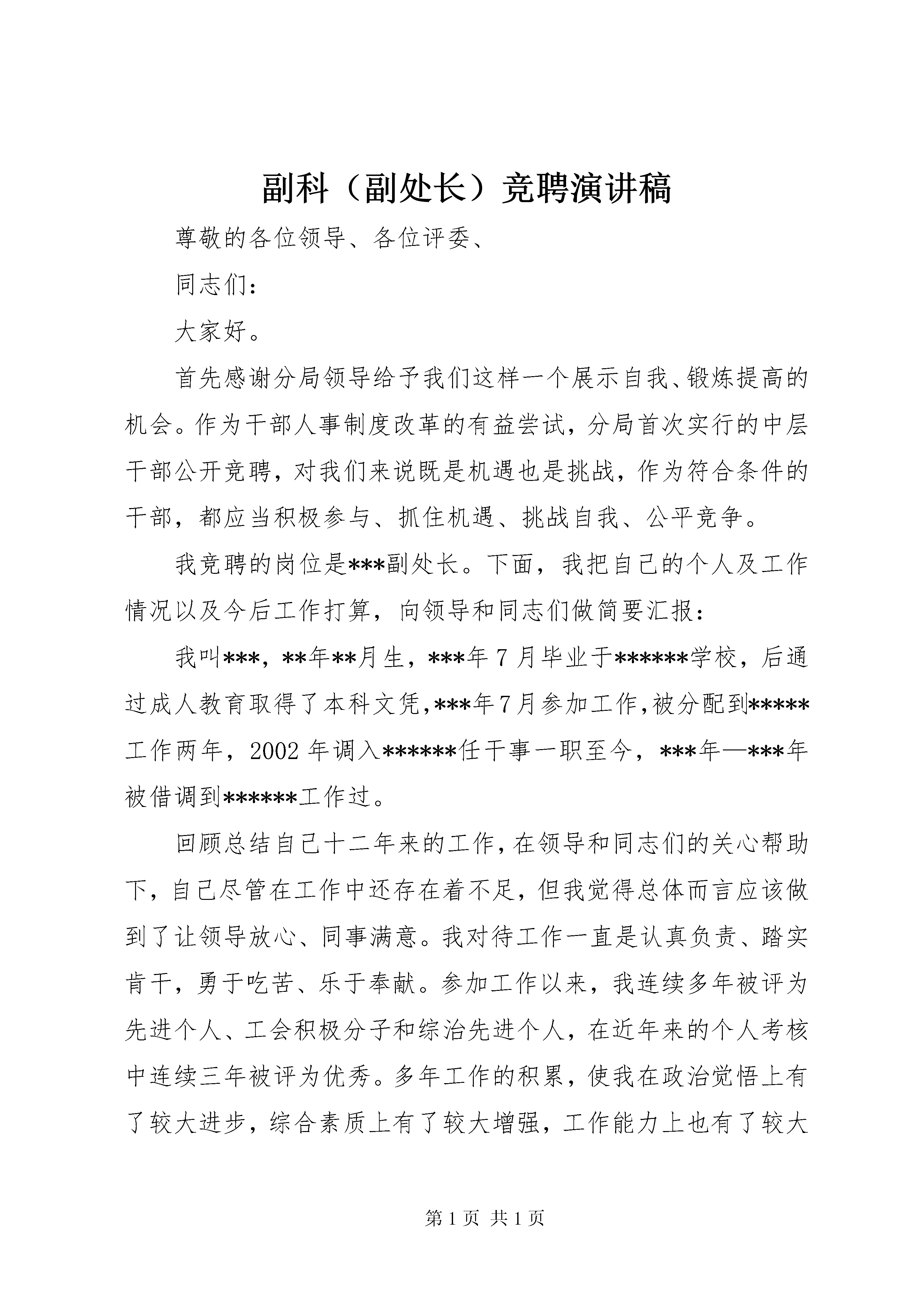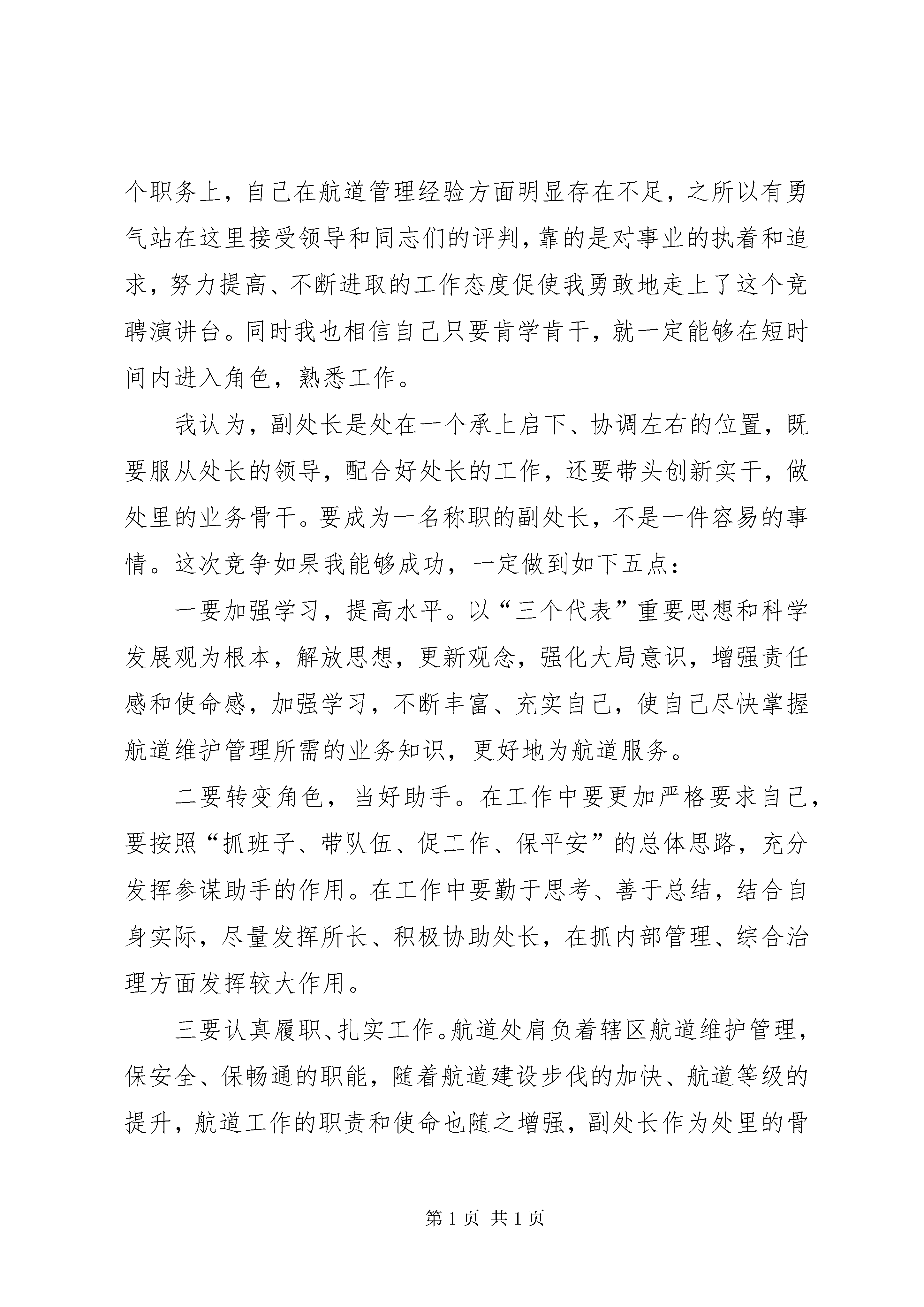 副科(副处长)竞聘演讲稿尊敬的各位领导、各位评委、同志们:大家好。首先感谢分局领导给予我们这样一个展示自我、锻炼提高的机会。作为干部人事制度改革的有益尝试,分局首次实行的中层干部公开竞聘,对我们来说既是机遇也是挑战,作为符合条件的干部,都应当积极参与、抓住机遇、挑战自我、公平竞争。我竞聘的岗位是***副处长。下面,我把自己的个人及工作情况以及今后工作打算,向领导和同志们做简要汇报:我叫***,**年**月生,***年7月毕业于******学校,后通过成人教育取得了本科文凭,***年7月参加工作,被分配到*****工作两年,2002年调入******任干事一职至今,***年—***年被借调到******工作过。回顾总结自己十二年来的工作,在领导和同志们的关心帮助下,自己尽管在工作中还存在着不足,但我觉得总体而言应该做到了让领导放心、同事满意。我对待工作一直是认真负责、踏实肯干,勇于吃苦、乐于奉献。参加工作以来,我连续多年被评为先进个人、工会积极分子和综治先进个人,在近年来的个人考核中连续三年被评为优秀。多年工作的积累,使我在政治觉悟上有了较大进步,综合素质上有了较大增强,工作能力上也有了较大提高。具体表现在以下几个方面:一是有了一定的政治思想素质。参加工作这十二年,绝大部分时间是在办公室工作,使我有机会学习和领会党的路线、方针、政策,也为我学习各种知识提供了机会和便利,长期的熏陶,使自己的政治理论和文化水平得到了不断提高。能够树立正确的人生信念和理想,比较准确地判断好与坏、对与错,特别是在大是大非面前,能够头脑清楚,立场坚定,正确把握自己。在思想上能够积极要求进步,努力向党组织靠拢,在党组织的关心、培养下,作为入党培养对象,我参加了交通系统20XX年入党积极分子培训班,使我对党、对党员有了更为深刻的了解和认识,使自己在思想上、政治上不断走向成熟。二是具备了一定的工作能力。在******做干事的这九年,有苦、有乐,但更多的是收获,作为所里的唯一干事,我承担了比其他部门干事更多的辛劳和压力,但同时也给了我更多的机会,让我能更好地挖掘自身潜力和创造力,在不知不觉中提高了自己的工作能力,使自己能够较好地完成本职工作以及领导交办的各项工作。长期办公室工作的磨炼,使我在文字写作、组织协调、待人接物、处理问题等多方面都积累了一定的经验。特别是借调到分局纪检监察室工作的经历,使我的综合能力得到了进一步的提升。三是具备较强的工作责任心和集体荣誉感。无论从事什么工作,也不管是份内还是份外,只要是领导安排的,我都是尽可能地去完成,去做好。记得我刚参加工作时被分配到***从事除锈油漆、制作航标链工作,对于一个刚参加工作的年轻女孩来说,在心理和体力上都很难适应,在刚开始制作标链时双手经常敲打出血泡,三天都制作不了一根标链,但是我并没有借机逃避,而是在工作中虚心学习老同志的经验做法,然后再慢慢琢磨、体会,最后我居然能一天完成三根标链的任务,从而没有给集体拉后腿。在***的那两年,较好的锻炼我的意志,培养了我吃苦耐劳的优良品格以及良好的适应能力。调入***后,由于工作性质的原因,使我有机会参加上级组织的健康有益的文体活动,在领导的安排下,我多次代表单位参加了各类演讲比赛和知识竞赛,强烈的责任心和集体荣誉感,趋使我全力以赴、认真对待,从而在各类比赛中我都能够取得较好的名次,为单位也为自己争得了荣誉。四是有了一定的管理经验。在多年办公室工作中,在所领导的言传身教下,我耳濡目染,潜移默化中积累了一些管理经验。在所领导的重视培养下,我共同参与制定了所里的多项规章管理制度,使我对管理工作在思路、方法、目的上有了进一步的认识和掌握。同时,作为管理工作的一部分,在工作中我能正确处理与领导、与同事的关系,做到对领导尊敬爱戴,对同事真诚友善,能够建立和谐、融洽的人际关系。在总结成绩,展现优势的同时,客观地说,在竞争******这个职务上,自己在航道管理经验方面明显存在不足,之所以有勇气站在这里接受领导和同志们的评判,靠的是对事业的执着和追求,努力提高、不断进取的工作态度促使我勇敢地走上了这个竞聘演讲台。同时我也相信自己只要肯学肯干,就一定能够在短时间内进入角色,熟悉工作。我认为,副处长是处在一个承上启下、协调左右的位置,既要服从处长的领导,配合好处长的工作,还要带头创新实干,做处里的业务骨干。要成为一名称职的副处长,不是一件容易的事情。这次竞争如果我能够成功,一定做到如下五点:一要加强学习,提高水平。以“三个代表”重要思想和科学发展观为根本,解放思想,更新观念,强化大局意识,增强责任感和使命感,加强学习,不断丰富、充实自己,使自己尽快掌握航道维护管理所需的业务知识,更好地为航道服务。二要转变角色,当好助手。在工作中要更加严格要求自己,要按照“抓班子、