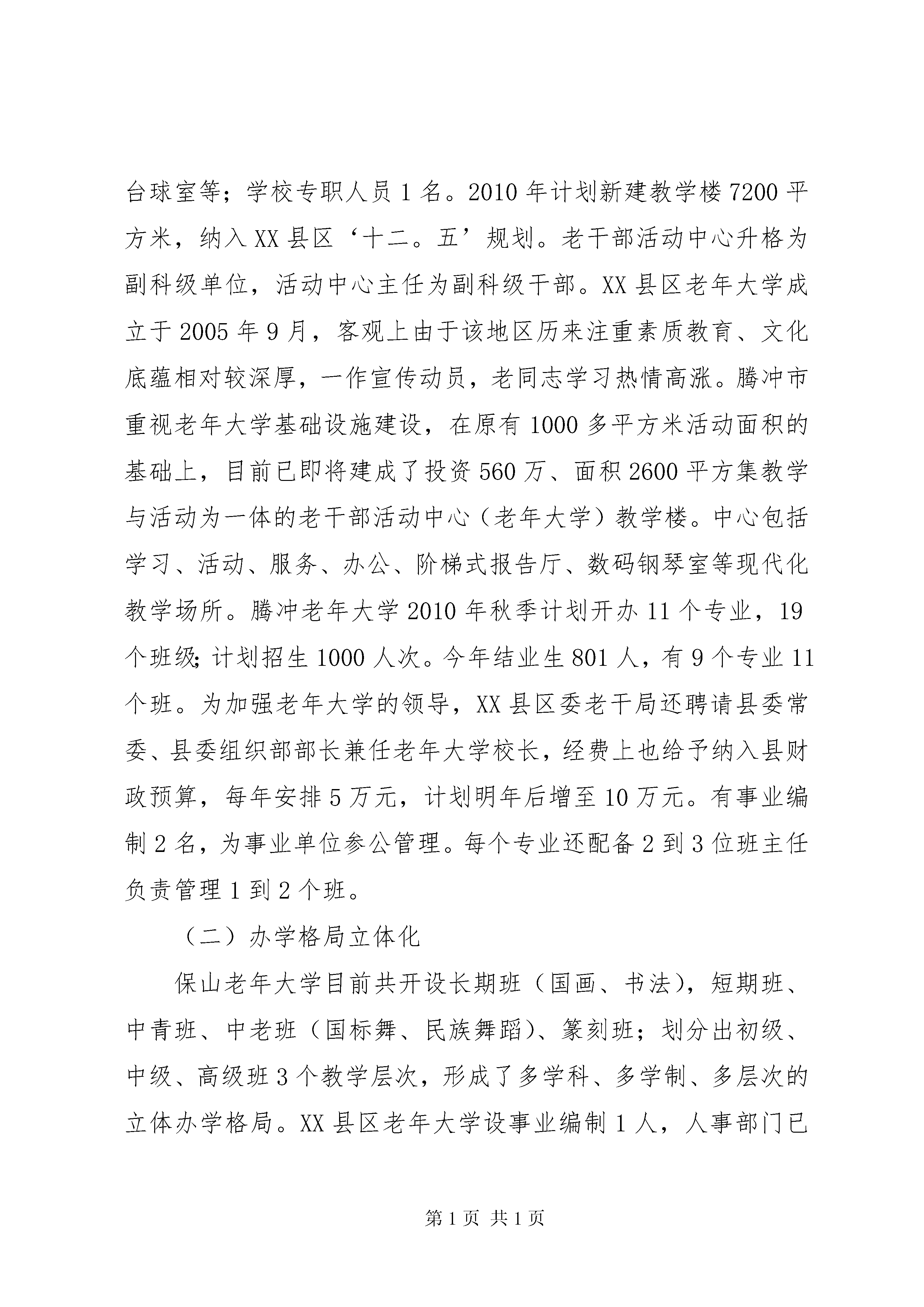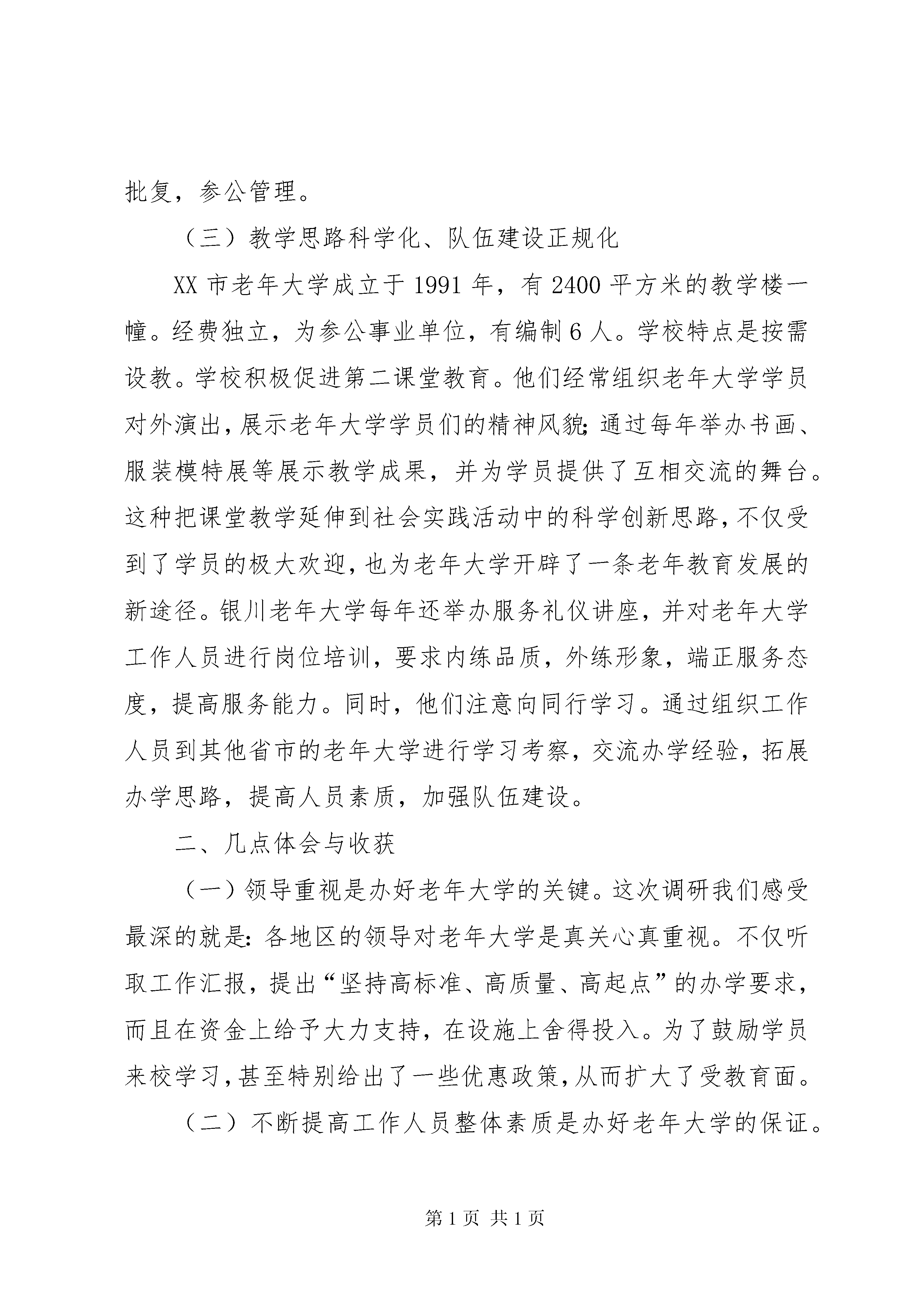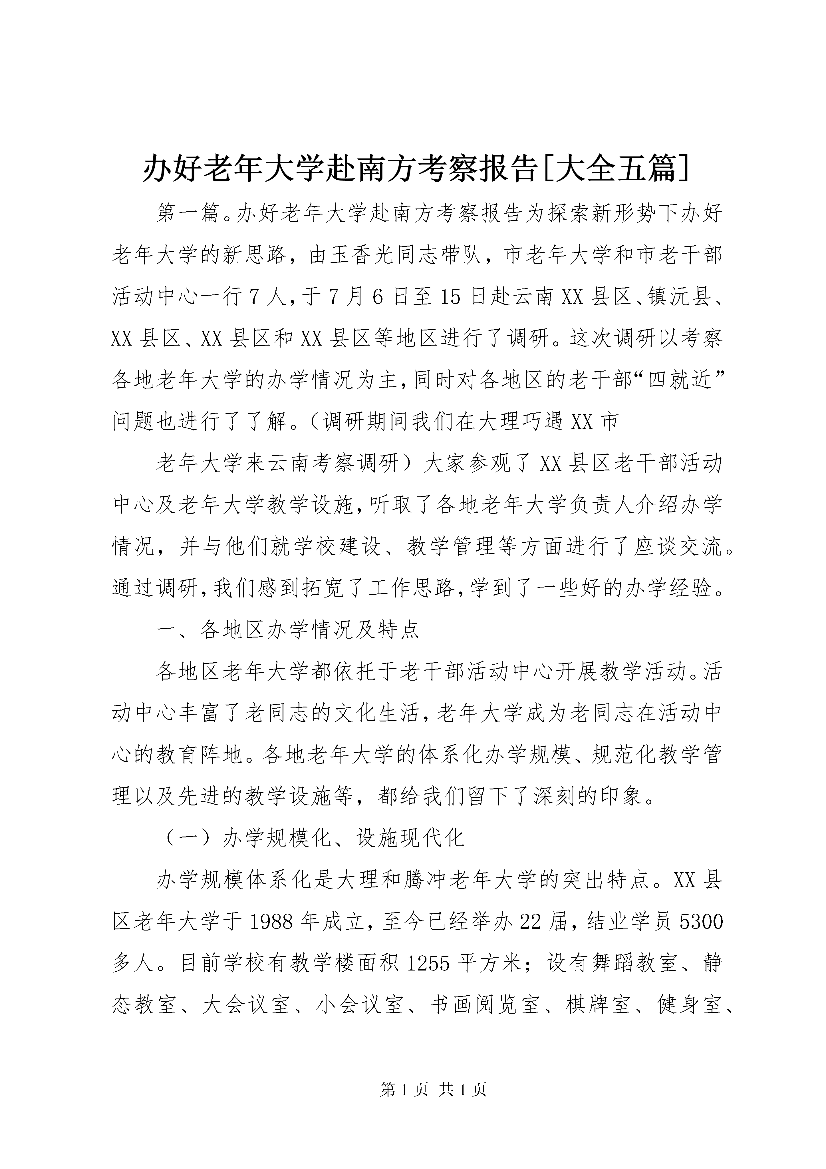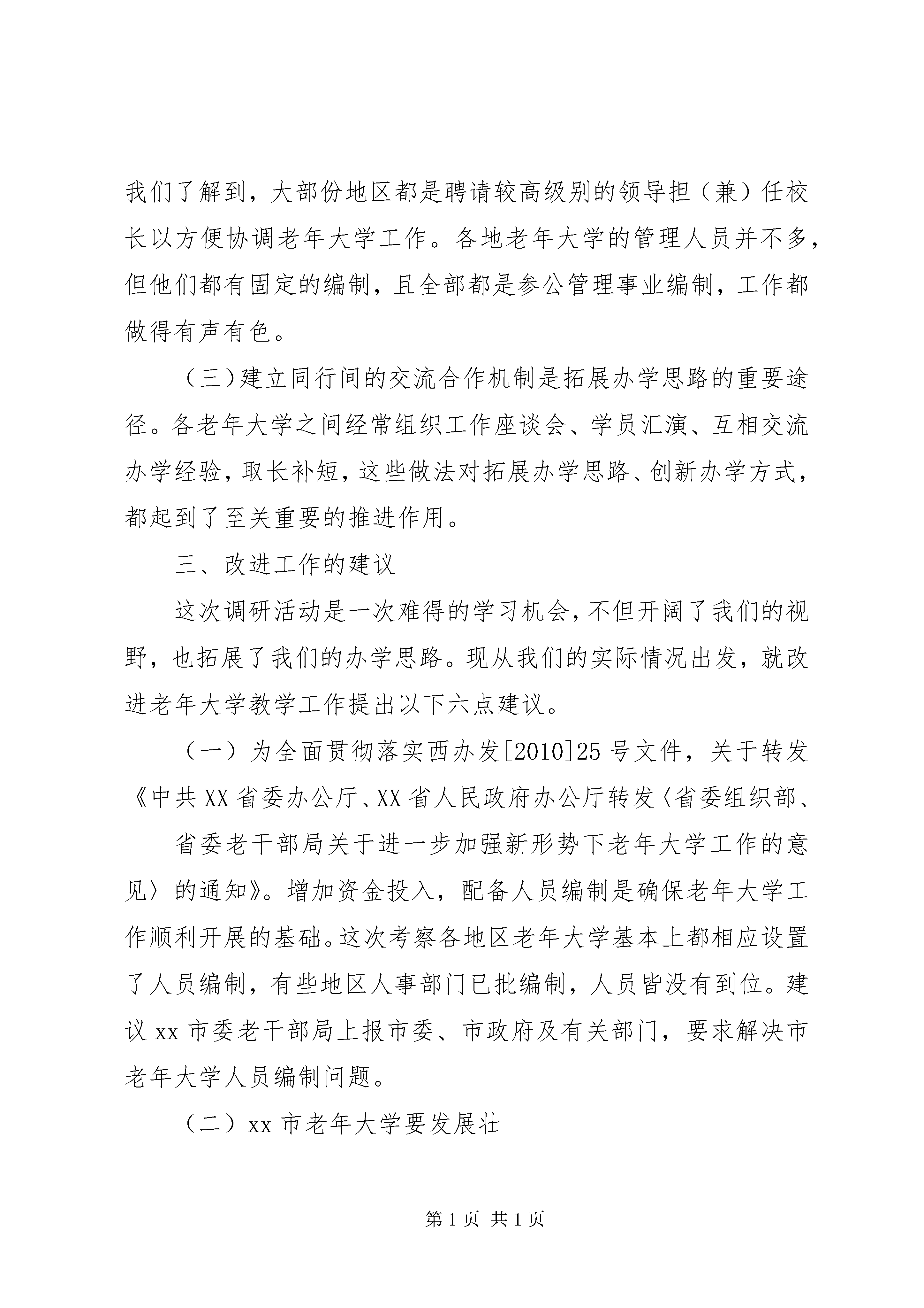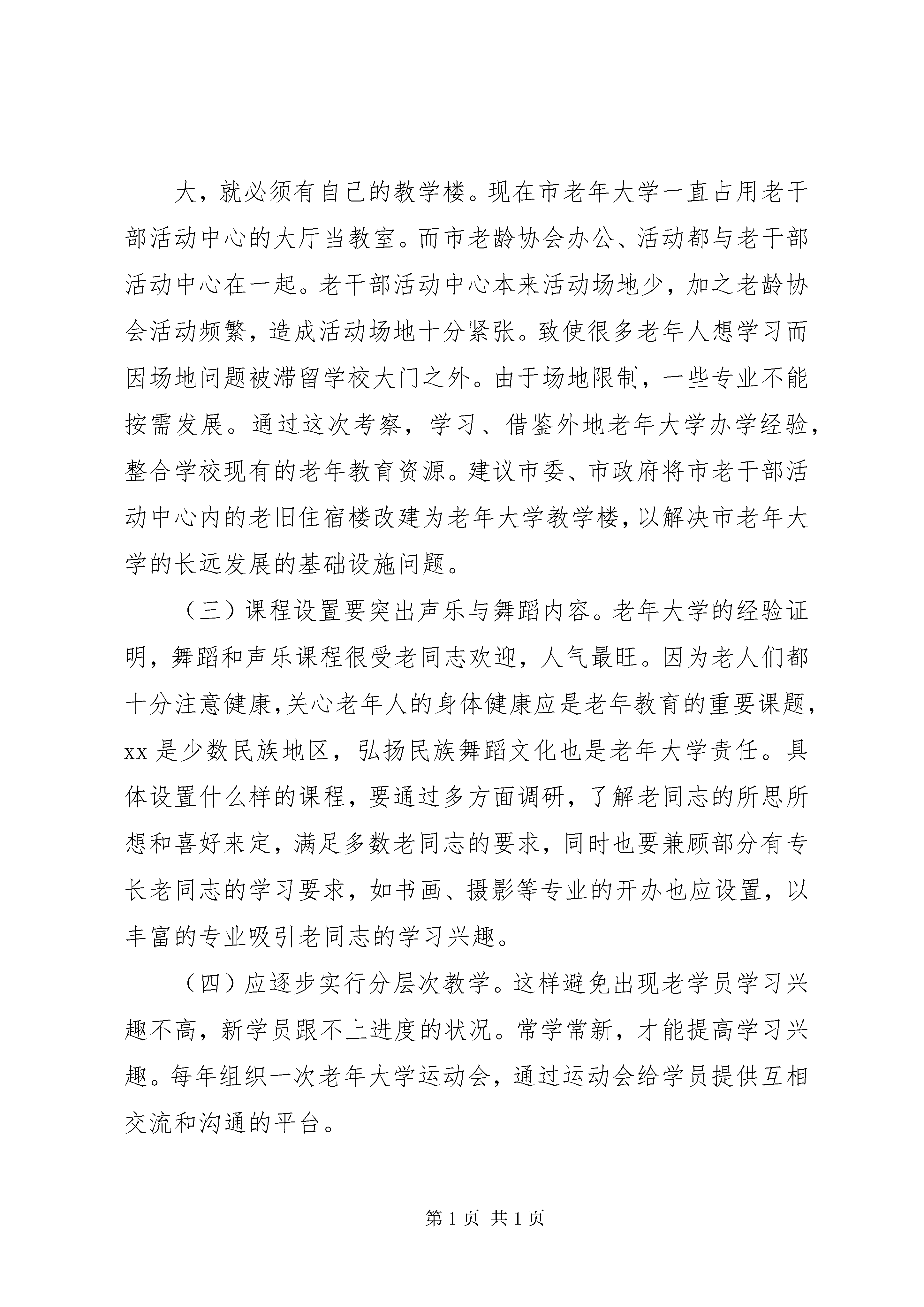 办好老年大学赴南方考察报告[大全五篇]第一篇。办好老年大学赴南方考察报告为探索新形势下办好老年大学的新思路,由玉香光同志带队,市老年大学和市老干部活动中心一行7人,于7月6日至15日赴云南XX县区、镇沅县、XX县区、XX县区和XX县区等地区进行了调研。这次调研以考察各地老年大学的办学情况为主,同时对各地区的老干部“四就近”问题也进行了了解。(调研期间我们在大理巧遇XX市老年大学来云南考察调研)大家参观了XX县区老干部活动中心及老年大学教学设施,听取了各地老年大学负责人介绍办学情况,并与他们就学校建设、教学管理等方面进行了座谈交流。通过调研,我们感到拓宽了工作思路,学到了一些好的办学经验。一、各地区办学情况及特点各地区老年大学都依托于老干部活动中心开展教学活动。活动中心丰富了老同志的文化生活,老年大学成为老同志在活动中心的教育阵地。各地老年大学的体系化办学规模、规范化教学管理以及先进的教学设施等,都给我们留下了深刻的印象。(一)办学规模化、设施现代化办学规模体系化是大理和腾冲老年大学的突出特点。XX县区老年大学于1988年成立,至今已经举办22届,结业学员5300多人。目前学校有教学楼面积1255平方米;设有舞蹈教室、静态教室、大会议室、小会议室、书画阅览室、棋牌室、健身室、台球室等;学校专职人员1名。2010年计划新建教学楼7200平方米,纳入XX县区‘十二。五’规划。老干部活动中心升格为副科级单位,活动中心主任为副科级干部。XX县区老年大学成立于2005年9月,客观上由于该地区历来注重素质教育、文化底蕴相对较深厚,一作宣传动员,老同志学习热情高涨。腾冲市重视老年大学基础设施建设,在原有1000多平方米活动面积的基础上,目前已即将建成了投资560万、面积2600平方集教学与活动为一体的老干部活动中心(老年大学)教学楼。中心包括学习、活动、服务、办公、阶梯式报告厅、数码钢琴室等现代化教学场所。腾冲老年大学2010年秋季计划开办11个专业,19个班级;计划招生1000人次。今年结业生801人,有9个专业11个班。为加强老年大学的领导,XX县区委老干局还聘请县委常委、县委组织部部长兼任老年大学校长,经费上也给予纳入县财政预算,每年安排5万元,计划明年后增至10万元。有事业编制2名,为事业单位参公管理。每个专业还配备2到3位班主任负责管理1到2个班。(二)办学格局立体化保山老年大学目前共开设长期班(国画、书法),短期班、中青班、中老班(国标舞、民族舞蹈)、篆刻班;划分出初级、中级、高级班3个教学层次,形成了多学科、多学制、多层次的立体办学格局。XX县区老年大学设事业编制1人,人事部门已批复,参公管理。(三)教学思路科学化、队伍建设正规化XX市老年大学成立于1991年,有2400平方米的教学楼一幢。经费独立,为参公事业单位,有编制6人。学校特点是按需设教。学校积极促进第二课堂教育。他们经常组织老年大学学员对外演出,展示老年大学学员们的精神风貌;通过每年举办书画、服装模特展等展示教学成果,并为学员提供了互相交流的舞台。这种把课堂教学延伸到社会实践活动中的科学创新思路,不仅受到了学员的极大欢迎,也为老年大学开辟了一条老年教育发展的新途径。银川老年大学每年还举办服务礼仪讲座,并对老年大学工作人员进行岗位培训,要求内练品质,外练形象,端正服务态度,提高服务能力。同时,他们注意向同行学习。通过组织工作人员到其他省市的老年大学进行学习考察,交流办学经验,拓展办学思路,提高人员素质,加强队伍建设。二、几点体会与收获(一)领导重视是办好老年大学的关键。这次调研我们感受最深的就是:各地区的领导对老年大学是真关心真重视。不仅听取工作汇报,提出“坚持高标准、高质量、高起点”的办学要求,而且在资金上给予大力支持,在设施上舍得投入。为了鼓励学员来校学习,甚至特别给出了一些优惠政策,从而扩大了受教育面。(二)不断提高工作人员整体素质是办好老年大学的保证。我们了解到,大部份地区都是聘请较高级别的领导担(兼)任校长以方便协调老年大学工作。各地老年大学的管理人员并不多,但他们都有固定的编制,且全部都是参公管理事业编制,工作都做得有声有色。(三)建立同行间的交流合作机制是拓展办学思路的重要途径。各老年大学之间经常组织工作座谈会、学员汇演、互相交流办学经验,取长补短,这些做法对拓展办学思路、创新办学方式,都起到了至关重要的推进作用。三、改进工作的建议这次调研活动是一次难得的学习机会,不但开阔了我们的视野,也拓展了我们的办学思路。现从我们的实际情况出发,就改进老年大学教学工作提出以下六点建议。(一)为全面贯彻落实西办发[2010]25号文件,关于转发《中共XX省委办公厅、XX省人民政府办公厅转发〈省委组织部、省委老干部局关于进一步加强新形势下老年大学