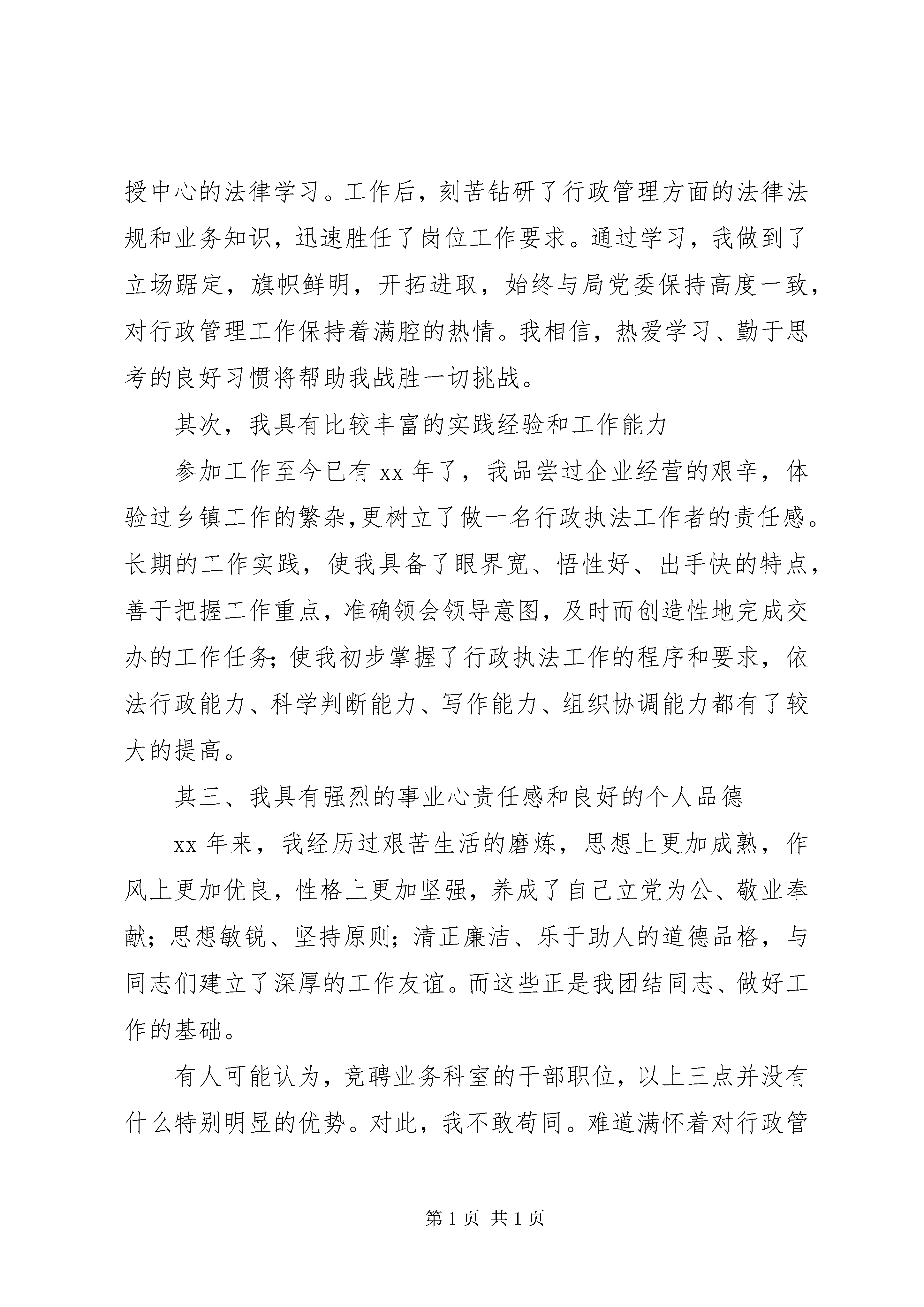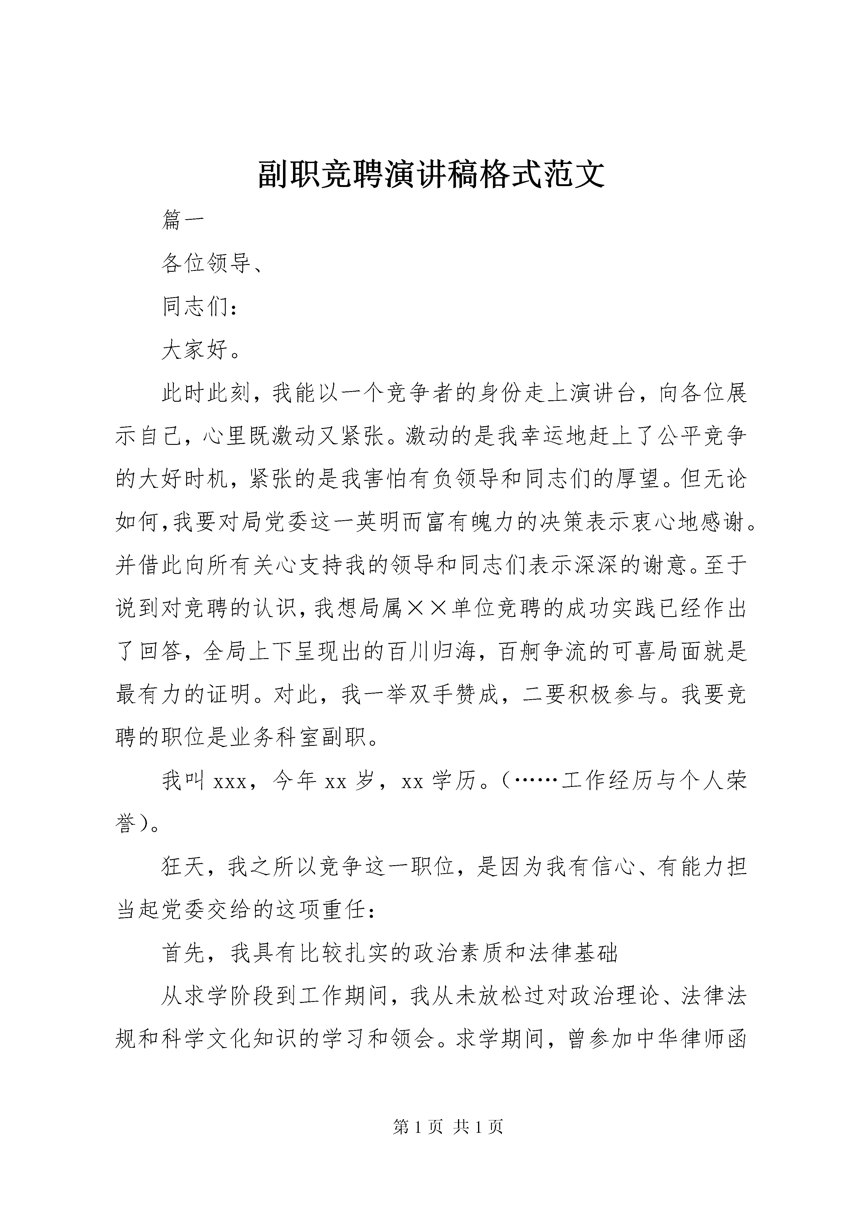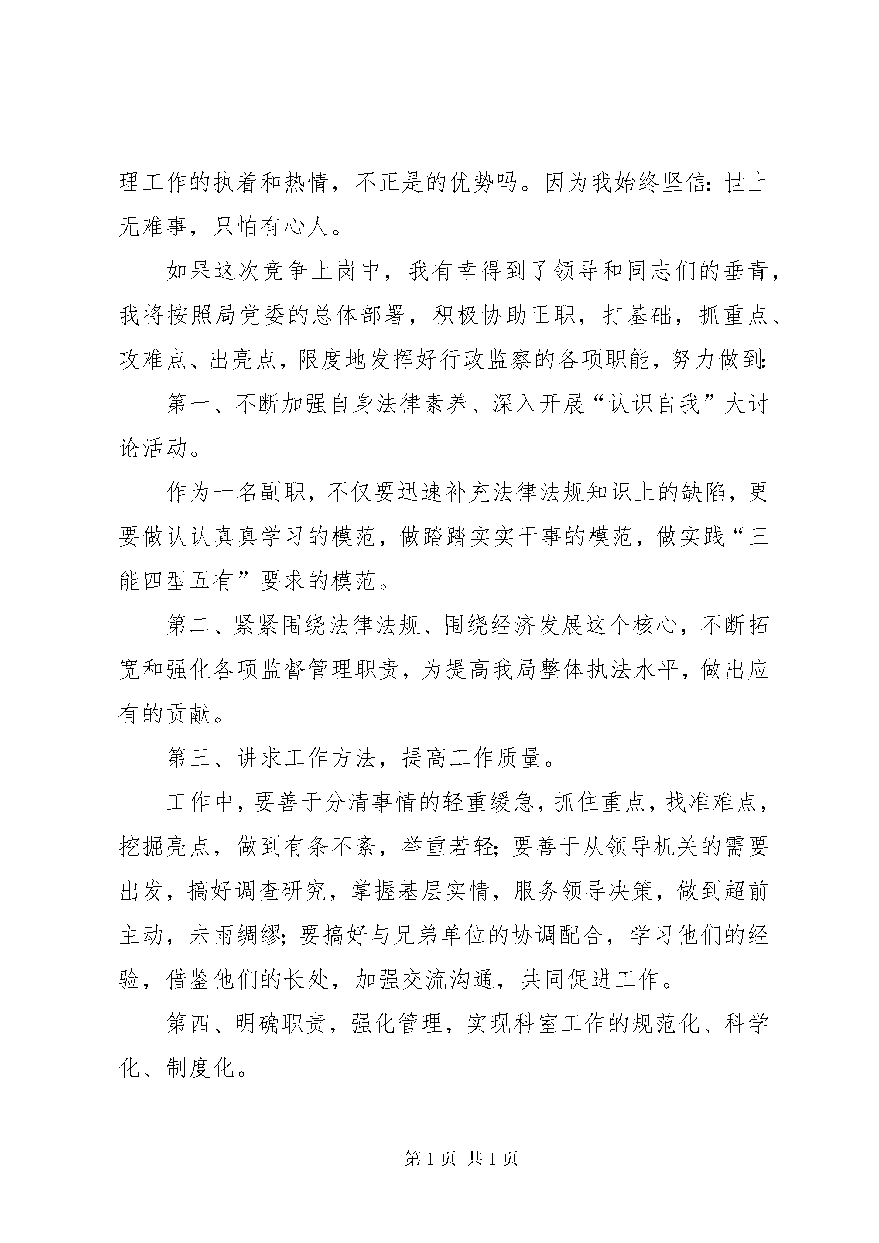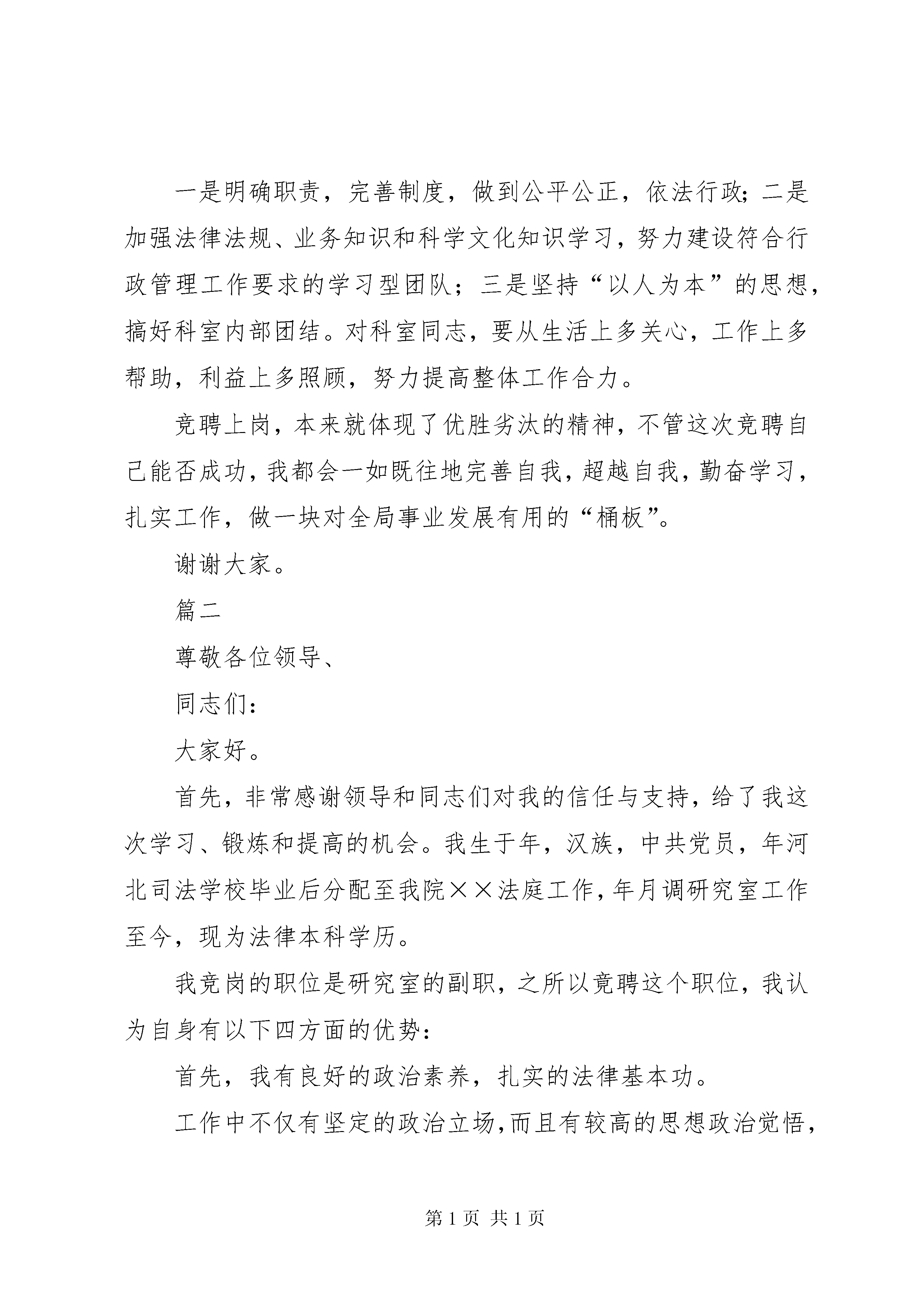 副职竞聘演讲稿格式范文篇一各位领导、同志们:大家好。此时此刻,我能以一个竞争者的身份走上演讲台,向各位展示自己,心里既激动又紧张。激动的是我幸运地赶上了公平竞争的大好时机,紧张的是我害怕有负领导和同志们的厚望。但无论如何,我要对局党委这一英明而富有魄力的决策表示衷心地感谢。并借此向所有关心支持我的领导和同志们表示深深的谢意。至于说到对竞聘的认识,我想局属××单位竞聘的成功实践已经作出了回答,全局上下呈现出的百川归海,百舸争流的可喜局面就是最有力的证明。对此,我一举双手赞成,二要积极参与。我要竞聘的职位是业务科室副职。我叫xxx,今年xx岁,xx学历。(……工作经历与个人荣誉)。狂天,我之所以竞争这一职位,是因为我有信心、有能力担当起党委交给的这项重任:首先,我具有比较扎实的政治素质和法律基础从求学阶段到工作期间,我从未放松过对政治理论、法律法规和科学文化知识的学习和领会。求学期间,曾参加中华律师函授中心的法律学习。工作后,刻苦钻研了行政管理方面的法律法规和业务知识,迅速胜任了岗位工作要求。通过学习,我做到了立场踞定,旗帜鲜明,开拓进取,始终与局党委保持高度一致,对行政管理工作保持着满腔的热情。我相信,热爱学习、勤于思考的良好习惯将帮助我战胜一切挑战。其次,我具有比较丰富的实践经验和工作能力参加工作至今已有xx年了,我品尝过企业经营的艰辛,体验过乡镇工作的繁杂,更树立了做一名行政执法工作者的责任感。长期的工作实践,使我具备了眼界宽、悟性好、出手快的特点,善于把握工作重点,准确领会领导意图,及时而创造性地完成交办的工作任务;使我初步掌握了行政执法工作的程序和要求,依法行政能力、科学判断能力、写作能力、组织协调能力都有了较大的提高。其三、我具有强烈的事业心责任感和良好的个人品德xx年来,我经历过艰苦生活的磨炼,思想上更加成熟,作风上更加优良,性格上更加坚强,养成了自己立党为公、敬业奉献;思想敏锐、坚持原则;清正廉洁、乐于助人的道德品格,与同志们建立了深厚的工作友谊。而这些正是我团结同志、做好工作的基础。有人可能认为,竞聘业务科室的干部职位,以上三点并没有什么特别明显的优势。对此,我不敢苟同。难道满怀着对行政管理工作的执着和热情,不正是的优势吗。因为我始终坚信:世上无难事,只怕有心人。如果这次竞争上岗中,我有幸得到了领导和同志们的垂青,我将按照局党委的总体部署,积极协助正职,打基础,抓重点、攻难点、出亮点,限度地发挥好行政监察的各项职能,努力做到:第一、不断加强自身法律素养、深入开展“认识自我”大讨论活动。作为一名副职,不仅要迅速补充法律法规知识上的缺陷,更要做认认真真学习的模范,做踏踏实实干事的模范,做实践“三能四型五有”要求的模范。第二、紧紧围绕法律法规、围绕经济发展这个核心,不断拓宽和强化各项监督管理职责,为提高我局整体执法水平,做出应有的贡献。第三、讲求工作方法,提高工作质量。工作中,要善于分清事情的轻重缓急,抓住重点,找准难点,挖掘亮点,做到有条不紊,举重若轻;要善于从领导机关的需要出发,搞好调查研究,掌握基层实情,服务领导决策,做到超前主动,未雨绸缪;要搞好与兄弟单位的协调配合,学习他们的经验,借鉴他们的长处,加强交流沟通,共同促进工作。第四、明确职责,强化管理,实现科室工作的规范化、科学化、制度化。一是明确职责,完善制度,做到公平公正,依法行政;二是加强法律法规、业务知识和科学文化知识学习,努力建设符合行政管理工作要求的学习型团队;三是坚持“以人为本”的思想,搞好科室内部团结。对科室同志,要从生活上多关心,工作上多帮助,利益上多照顾,努力提高整体工作合力。竞聘上岗,本来就体现了优胜劣汰的精神,不管这次竞聘自己能否成功,我都会一如既往地完善自我,超越自我,勤奋学习,扎实工作,做一块对全局事业发展有用的“桶板”。谢谢大家。篇二尊敬各位领导、同志们:大家好。首先,非常感谢领导和同志们对我的信任与支持,给了我这次学习、锻炼和提高的机会。我生于年,汉族,中共党员,年河北司法学校毕业后分配至我院××法庭工作,年月调研究室工作至今,现为法律本科学历。我竞岗的职位是研究室的副职,之所以竟聘这个职位,我认为自身有以下四方面的优势:首先,我有良好的政治素养,扎实的法律基本功。工作中不仅有坚定的政治立场,而且有较高的思想政治觉悟,积极了解国家、地方政事以及与工作密切相关的动态和信息。可以说“家事、国事、天下事,事事关心”。如果说年来从未间断的法律知识学习使我对法律有了一定的了解、掌握,那么在××法庭年的审判工作则使我找到了理论和实践的结合,而研究室的年调研又使我对法律有了更深层次的理解,尤其通过审委会的记录、学习使我超脱了“就案办案、就事论事”的局限,把更高的着眼点放于整个法院、整个社会。从xx法院的整体出发、从法院