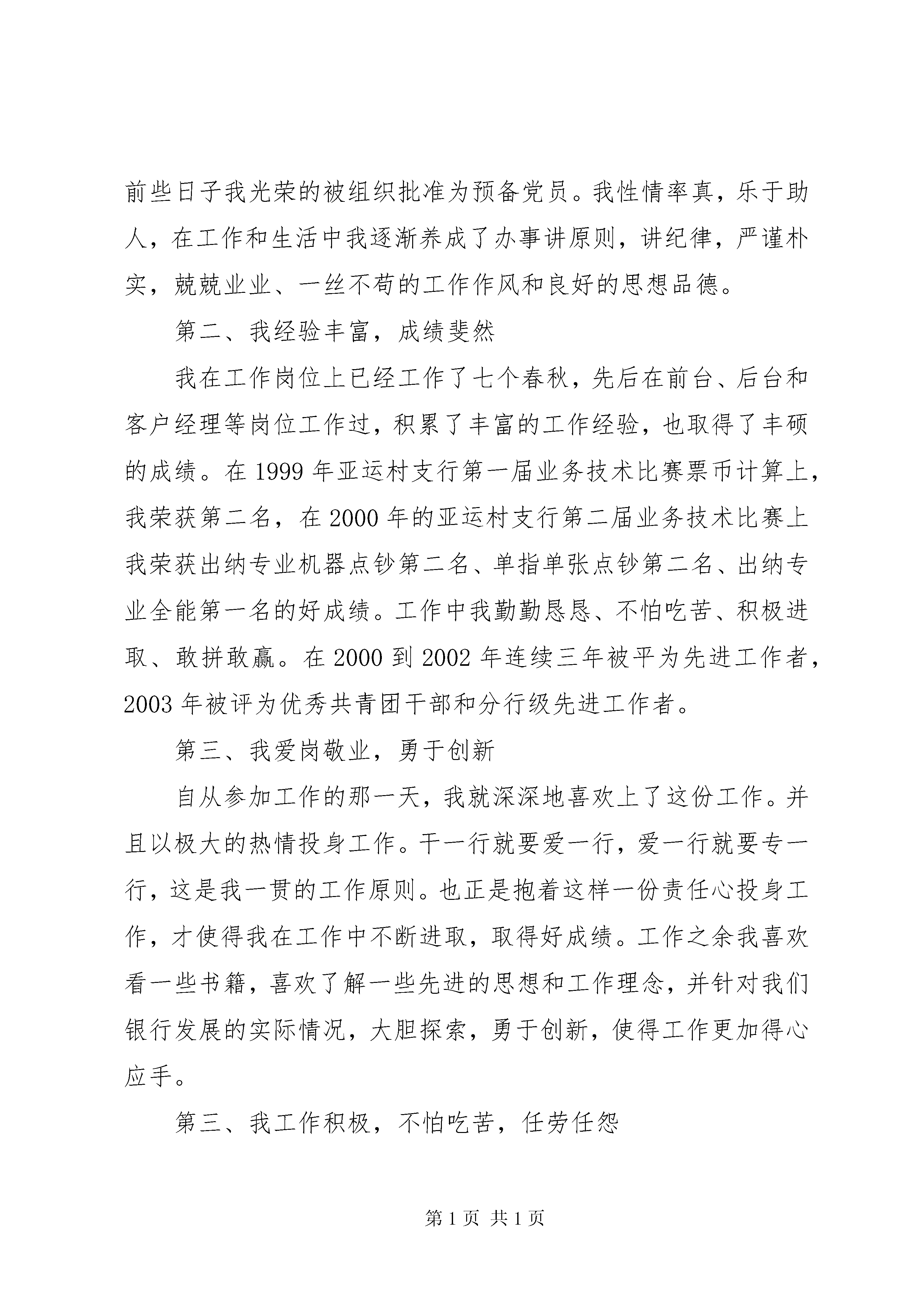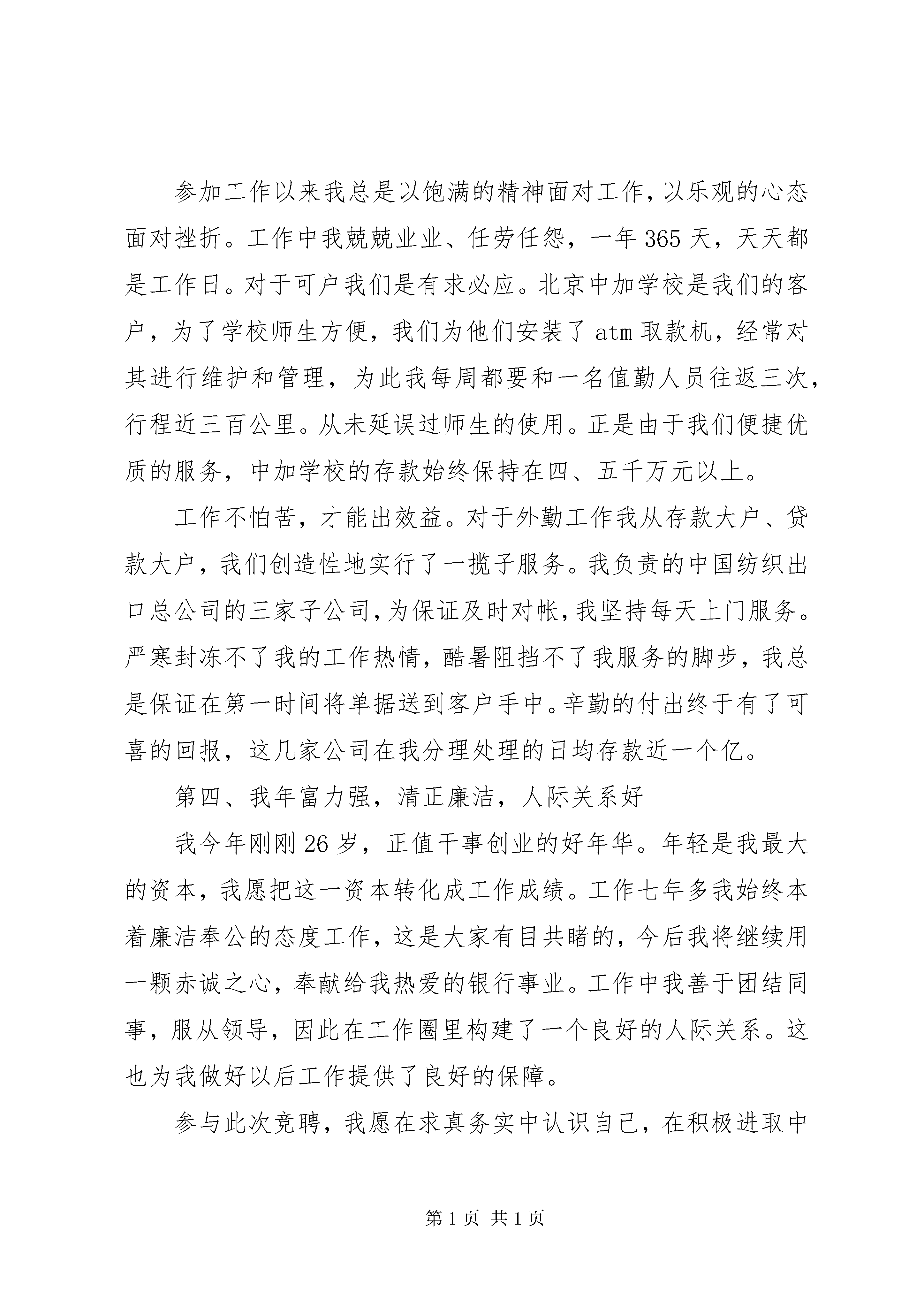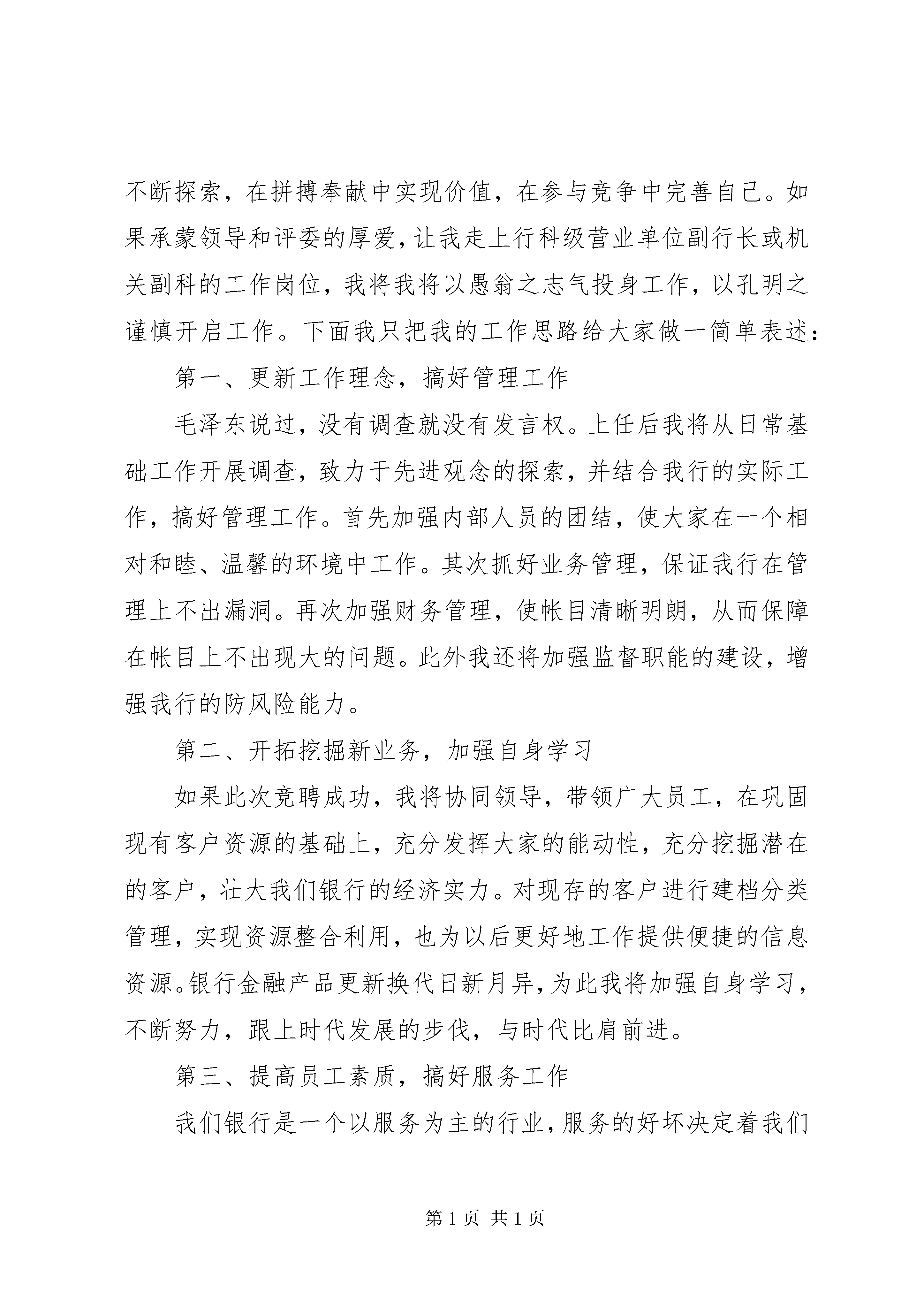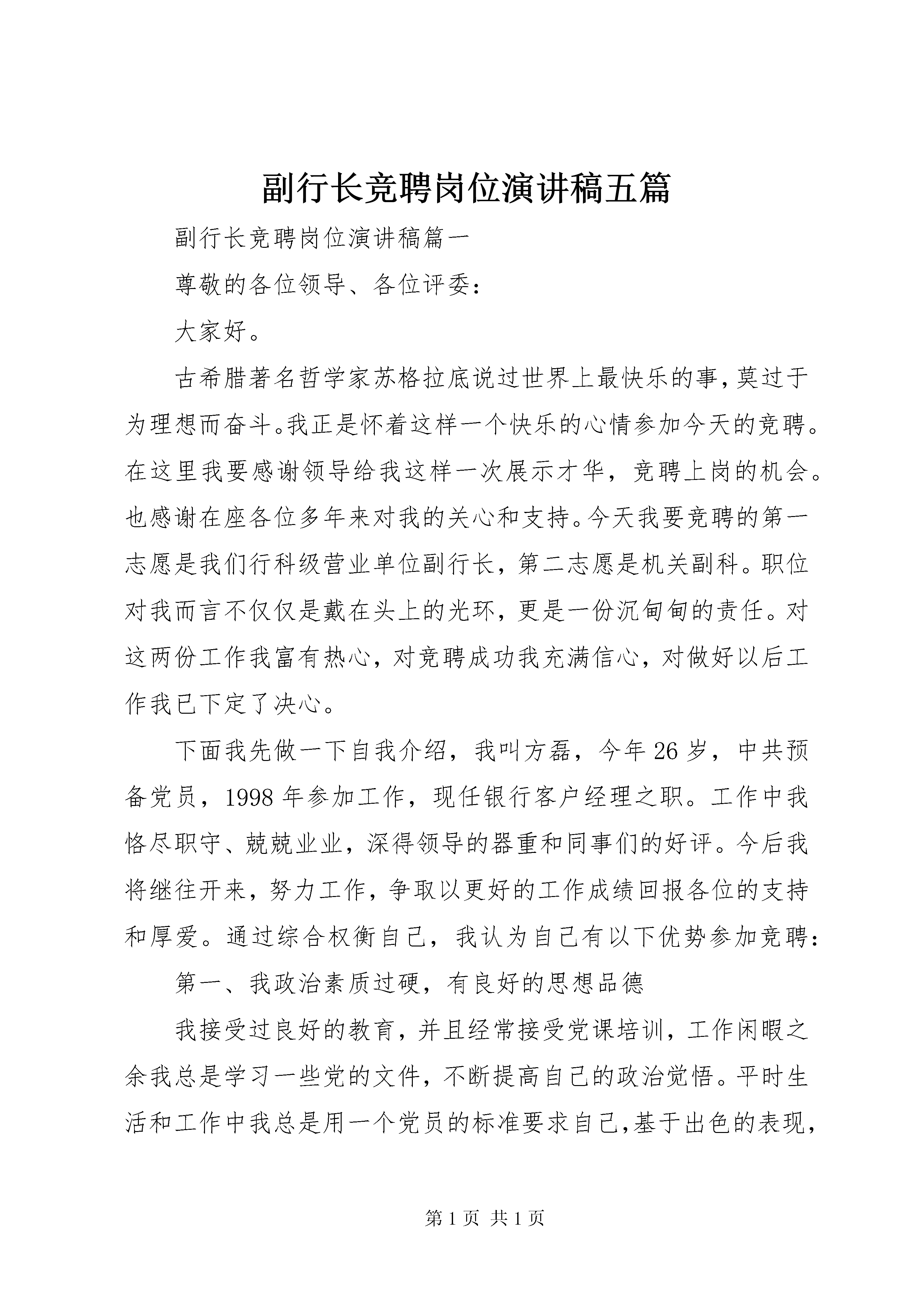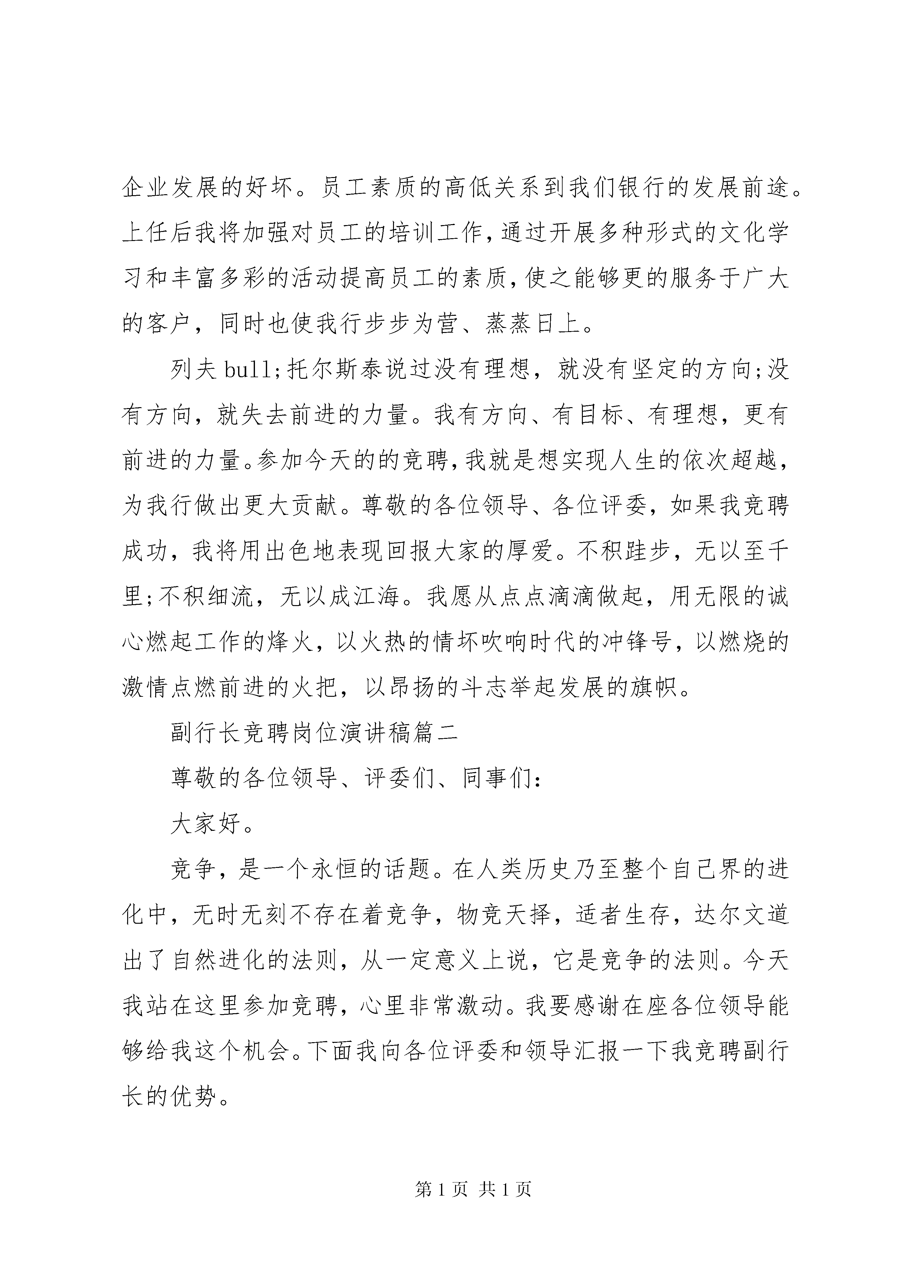 副行长竞聘岗位演讲稿五篇副行长竞聘岗位演讲稿篇一尊敬的各位领导、各位评委:大家好。古希腊著名哲学家苏格拉底说过世界上最快乐的事,莫过于为理想而奋斗。我正是怀着这样一个快乐的心情参加今天的竞聘。在这里我要感谢领导给我这样一次展示才华,竞聘上岗的机会。也感谢在座各位多年来对我的关心和支持。今天我要竞聘的第一志愿是我们行科级营业单位副行长,第二志愿是机关副科。职位对我而言不仅仅是戴在头上的光环,更是一份沉甸甸的责任。对这两份工作我富有热心,对竞聘成功我充满信心,对做好以后工作我已下定了决心。下面我先做一下自我介绍,我叫方磊,今年26岁,中共预备党员,1998年参加工作,现任银行客户经理之职。工作中我恪尽职守、兢兢业业,深得领导的器重和同事们的好评。今后我将继往开来,努力工作,争取以更好的工作成绩回报各位的支持和厚爱。通过综合权衡自己,我认为自己有以下优势参加竞聘:第一、我政治素质过硬,有良好的思想品德我接受过良好的教育,并且经常接受党课培训,工作闲暇之余我总是学习一些党的文件,不断提高自己的政治觉悟。平时生活和工作中我总是用一个党员的标准要求自己,基于出色的表现,前些日子我光荣的被组织批准为预备党员。我性情率真,乐于助人,在工作和生活中我逐渐养成了办事讲原则,讲纪律,严谨朴实,兢兢业业、一丝不苟的工作作风和良好的思想品德。第二、我经验丰富,成绩斐然我在工作岗位上已经工作了七个春秋,先后在前台、后台和客户经理等岗位工作过,积累了丰富的工作经验,也取得了丰硕的成绩。在1999年亚运村支行第一届业务技术比赛票币计算上,我荣获第二名,在2000年的亚运村支行第二届业务技术比赛上我荣获出纳专业机器点钞第二名、单指单张点钞第二名、出纳专业全能第一名的好成绩。工作中我勤勤恳恳、不怕吃苦、积极进取、敢拼敢赢。在2000到2002年连续三年被平为先进工作者,2003年被评为优秀共青团干部和分行级先进工作者。第三、我爱岗敬业,勇于创新自从参加工作的那一天,我就深深地喜欢上了这份工作。并且以极大的热情投身工作。干一行就要爱一行,爱一行就要专一行,这是我一贯的工作原则。也正是抱着这样一份责任心投身工作,才使得我在工作中不断进取,取得好成绩。工作之余我喜欢看一些书籍,喜欢了解一些先进的思想和工作理念,并针对我们银行发展的实际情况,大胆探索,勇于创新,使得工作更加得心应手。第三、我工作积极,不怕吃苦,任劳任怨参加工作以来我总是以饱满的精神面对工作,以乐观的心态面对挫折。工作中我兢兢业业、任劳任怨,一年365天,天天都是工作日。对于可户我们是有求必应。北京中加学校是我们的客户,为了学校师生方便,我们为他们安装了atm取款机,经常对其进行维护和管理,为此我每周都要和一名值勤人员往返三次,行程近三百公里。从未延误过师生的使用。正是由于我们便捷优质的服务,中加学校的存款始终保持在四、五千万元以上。工作不怕苦,才能出效益。对于外勤工作我从存款大户、贷款大户,我们创造性地实行了一揽子服务。我负责的中国纺织出口总公司的三家子公司,为保证及时对帐,我坚持每天上门服务。严寒封冻不了我的工作热情,酷暑阻挡不了我服务的脚步,我总是保证在第一时间将单据送到客户手中。辛勤的付出终于有了可喜的回报,这几家公司在我分理处理的日均存款近一个亿。第四、我年富力强,清正廉洁,人际关系好我今年刚刚26岁,正值干事创业的好年华。年轻是我最大的资本,我愿把这一资本转化成工作成绩。工作七年多我始终本着廉洁奉公的态度工作,这是大家有目共睹的,今后我将继续用一颗赤诚之心,奉献给我热爱的银行事业。工作中我善于团结同事,服从领导,因此在工作圈里构建了一个良好的人际关系。这也为我做好以后工作提供了良好的保障。参与此次竞聘,我愿在求真务实中认识自己,在积极进取中不断探索,在拼搏奉献中实现价值,在参与竞争中完善自己。如果承蒙领导和评委的厚爱,让我走上行科级营业单位副行长或机关副科的工作岗位,我将我将以愚翁之志气投身工作,以孔明之谨慎开启工作。下面我只把我的工作思路给大家做一简单表述:第一、更新工作理念,搞好管理工作毛泽东说过,没有调查就没有发言权。上任后我将从日常基础工作开展调查,致力于先进观念的探索,并结合我行的实际工作,搞好管理工作。首先加强内部人员的团结,使大家在一个相对和睦、温馨的环境中工作。其次抓好业务管理,保证我行在管理上不出漏洞。再次加强财务管理,使帐目清晰明朗,从而保障在帐目上不出现大的问题。此外我还将加强监督职能的建设,增强我行的防风险能力。第二、开拓挖掘新业务,加强自身学习如果此次竞聘成功,我将协同领导,带领广大员工,在巩固现有客户资源的基础上,充分发挥大家的能动性,充分挖掘潜在的客户,壮大我们银行的经济实力。对现存的客户进行建档分类管理,实现资源整合利用,也为以后更好地