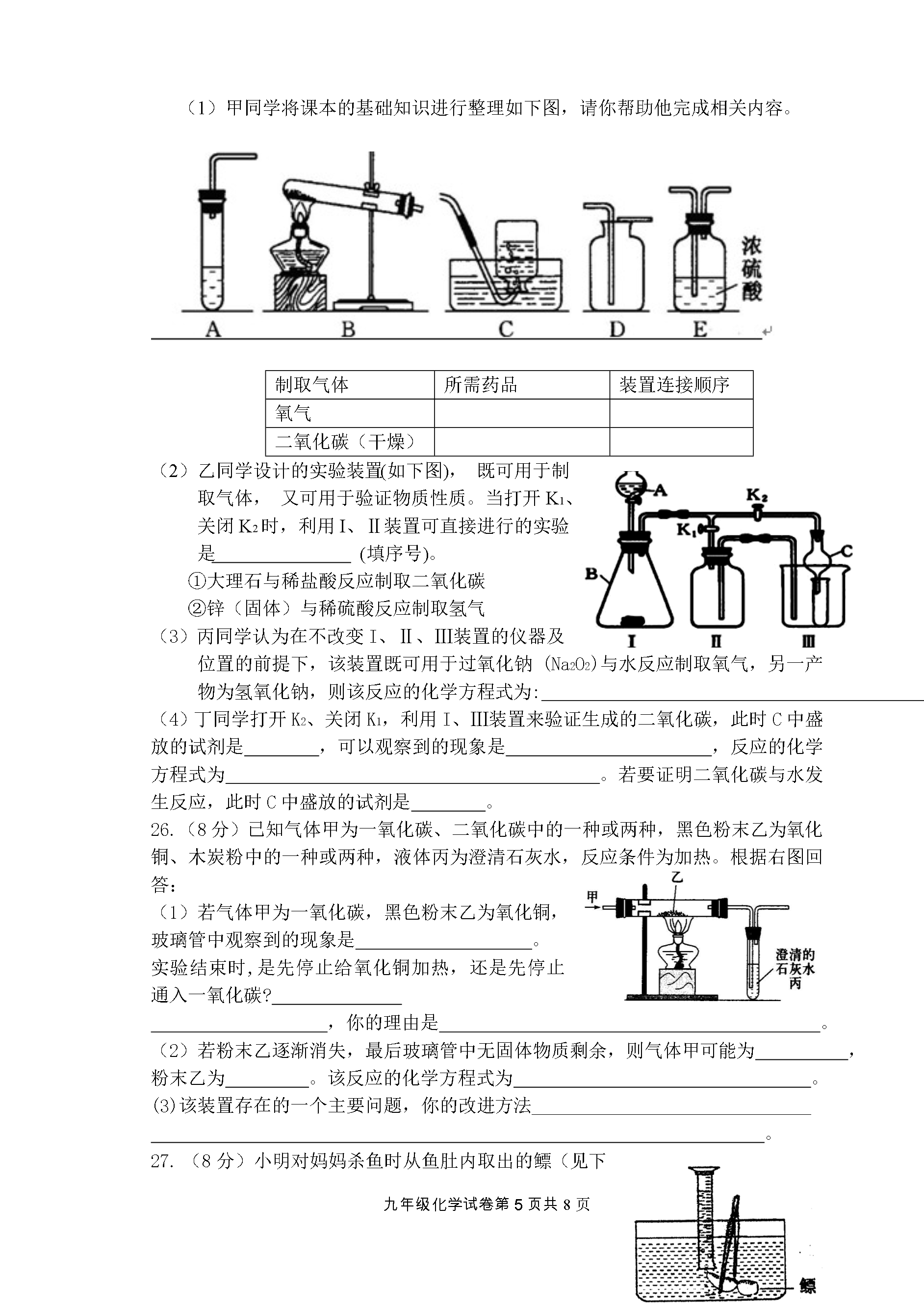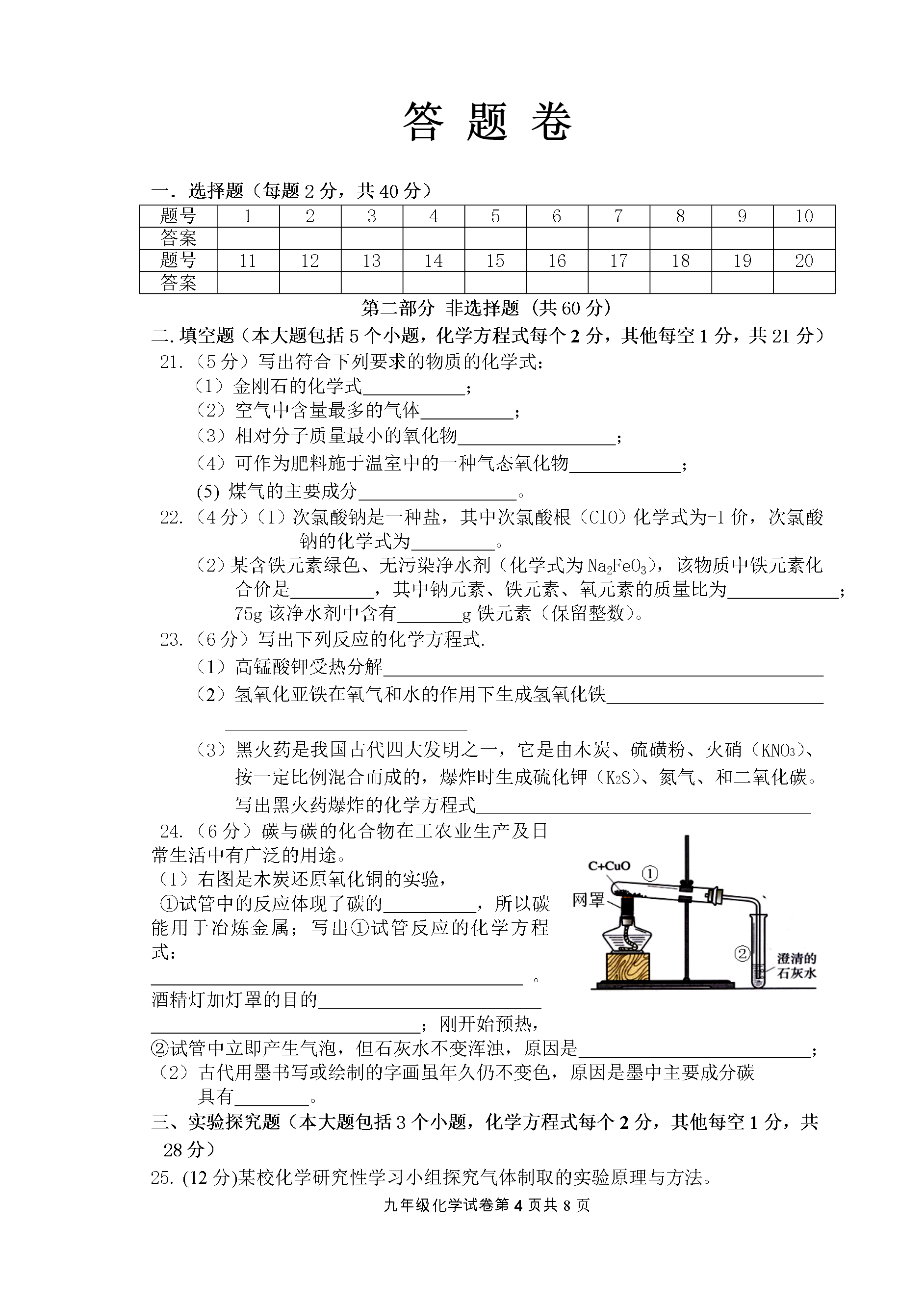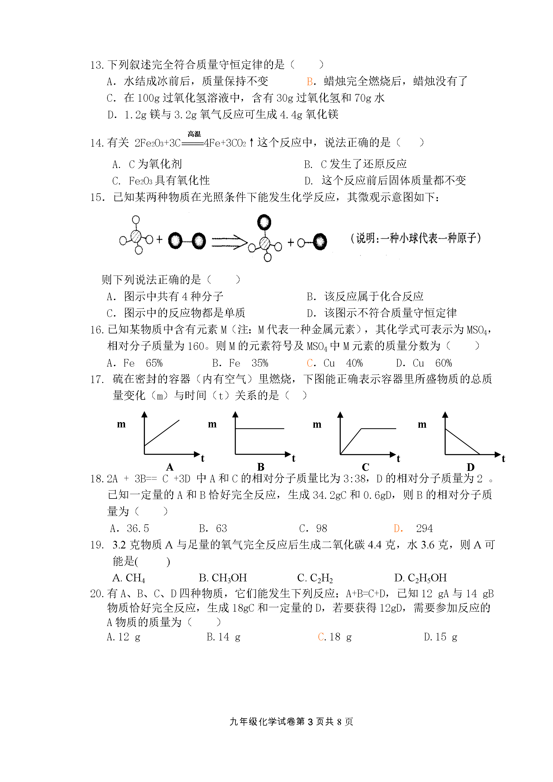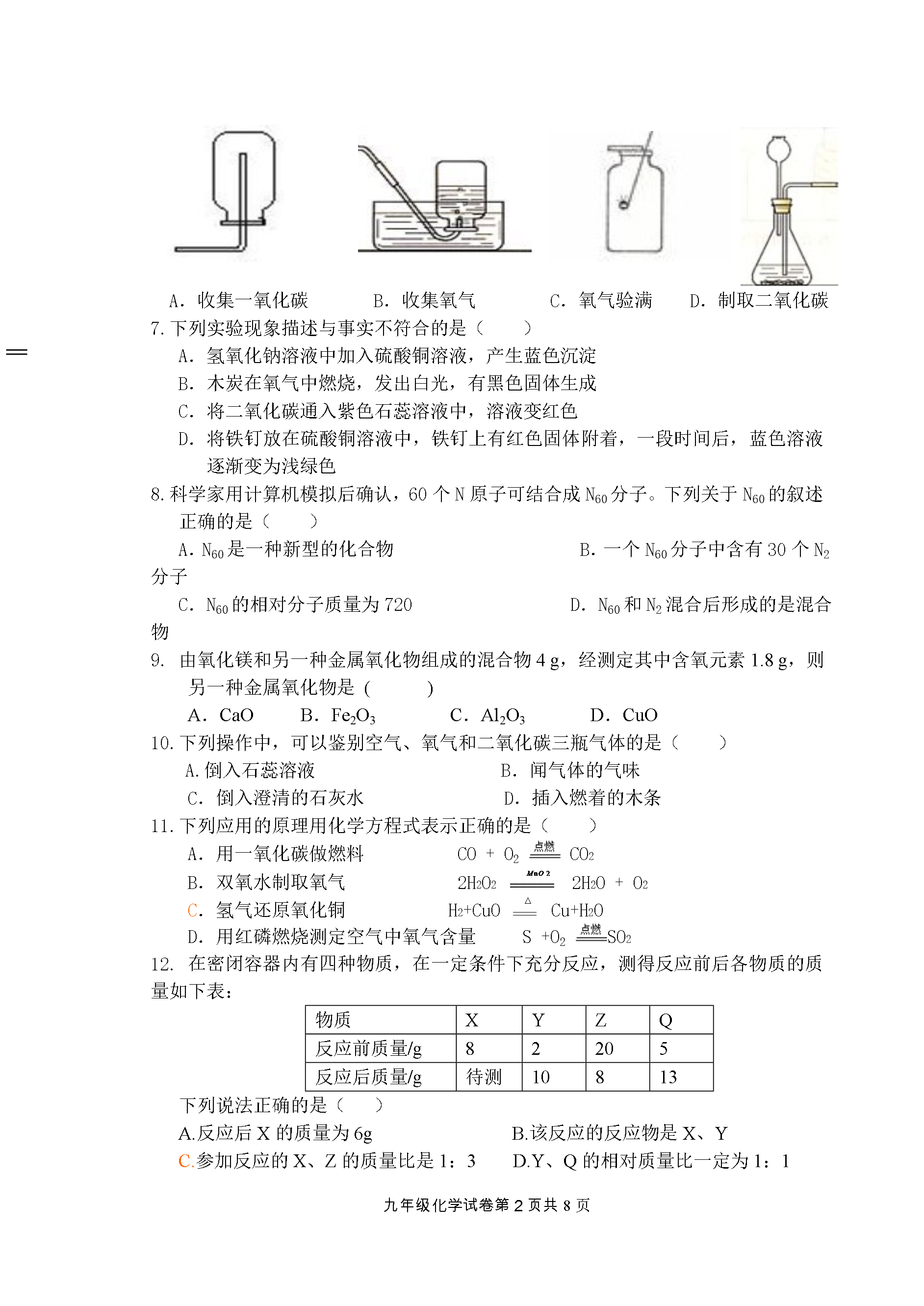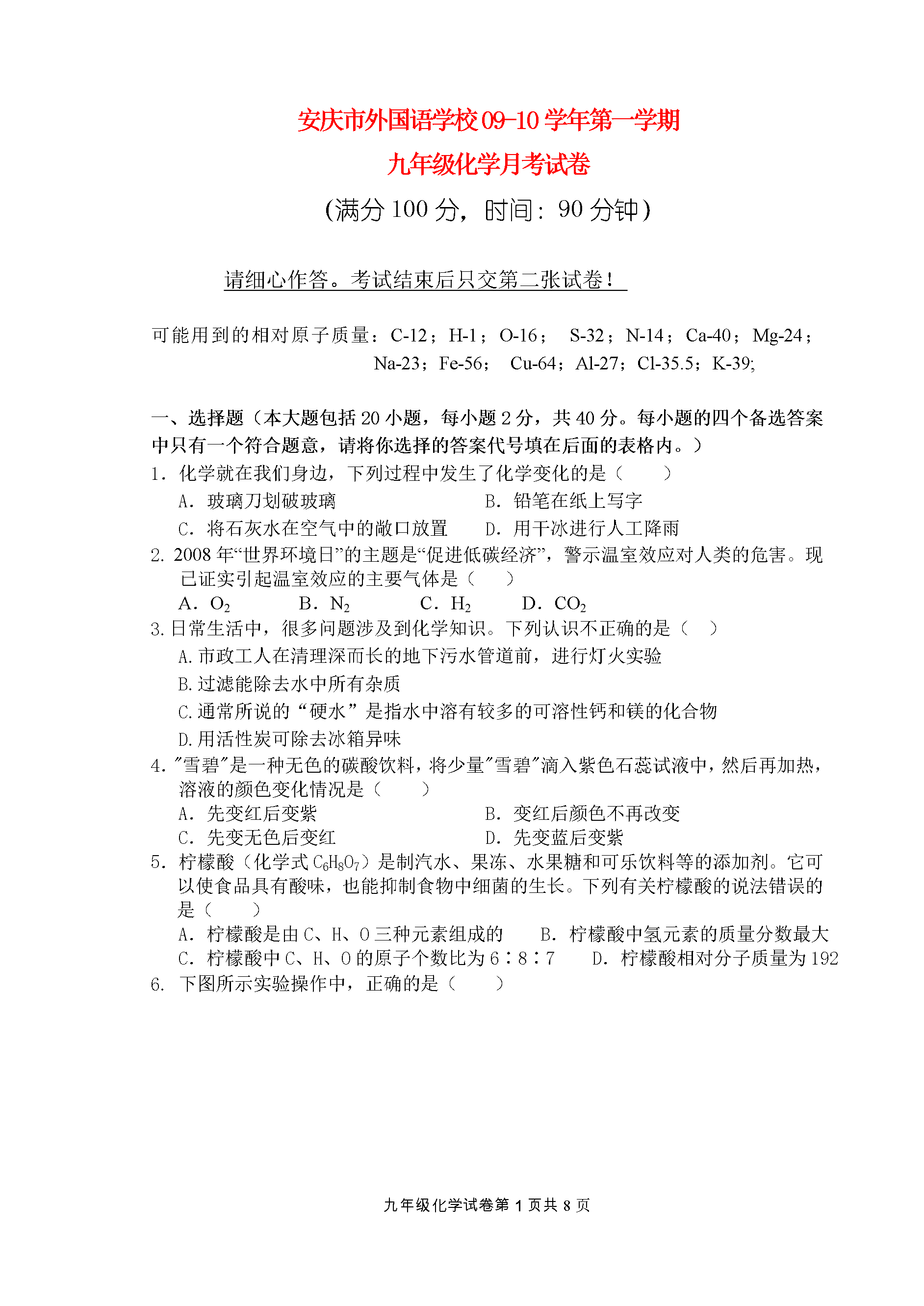 九年级化学试卷安庆市外国语学校09-10学年第一学期九年级化学月考试卷(满分100分,时间:90分钟)请细心作答。考试结束后只交第二张试卷!可能用到的相对原子质量:C-12;H-1;O-16;S-32;N-14;Ca-40;Mg-24;Na-23;Fe-56;Cu-64;Al-27;Cl-35.5;K-39;一、选择题(本大题包括20小题,每小题2分,共40分。每小题的四个备选答案中只有一个符合题意,请将你选择的答案代号填在后面的表格内。)1.化学就在我们身边,下列过程中发生了化学变化的是()A.玻璃刀划破玻璃B.铅笔在纸上写字C.将石灰水在空气中的敞口放置D.用干冰进行人工降雨2.2008年“世界环境日”的主题是“促进低碳经济”,警示温室效应对人类的危害。现已证实引起温室效应的主要气体是()A.O2B.N2C.H2D.CO23.日常生活中,很多问题涉及到化学知识。下列认识不正确的是()A.市政工人在清理深而长的地下污水管道前,进行灯火实验B.过滤能除去水中所有杂质C.通常所说的“硬水”是指水中溶有较多的可溶性钙和镁的化合物D.用活性炭可除去冰箱异味4."雪碧"是一种无色的碳酸饮料,将少量"雪碧"滴入紫色石蕊试液中,然后再加热,溶液的颜色变化情况是()A.先变红后变紫B.变红后颜色不再改变C.先变无色后变红D.先变蓝后变紫5.柠檬酸(化学式C6H8O7)是制汽水、果冻、水果糖和可乐饮料等的添加剂。它可以使食品具有酸味,也能抑制食物中细菌的生长。下列有关柠檬酸的说法错误的是()A.柠檬酸是由C、H、O三种元素组成的B.柠檬酸中氢元素的质量分数最大C.柠檬酸中C、H、O的原子个数比为6∶8∶7D.柠檬酸相对分子质量为1926.下图所示实验操作中,正确的是()A.收集一氧化碳B.收集氧气C.氧气验满D.制取二氧化碳7.下列实验现象描述与事实不符合的是()A.氢氧化钠溶液中加入硫酸铜溶液,产生蓝色沉淀B.木炭在氧气中燃烧,发出白光,有黑色固体生成C.将二氧化碳通入紫色石蕊溶液中,溶液变红色D.将铁钉放在硫酸铜溶液中,铁钉上有红色固体附着,一段时间后,蓝色溶液逐渐变为浅绿色8.科学家用计算机模拟后确认,60个N原子可结合成N60分子。下列关于N60的叙述正确的是()A.N60是一种新型的化合物B.一个N60分子中含有30个N2分子C.N60的相对分子质量为720D.N60和N2混合后形成的是混合物9.由氧化镁和另一种金属氧化物组成的混合物4g,经测定其中含氧元素1.8g,则另一种金属氧化物是()A.CaOB.Fe2O3C.Al2O3D.CuO10.下列操作中,可以鉴别空气、氧气和二氧化碳三瓶气体的是()A.倒入石蕊溶液B.闻气体的气味C.倒入澄清的石灰水D.插入燃着的木条11.下列应用的原理用化学方程式表示正确的是()A.用一氧化碳做燃料CO+O2CO2B.双氧水制取氧气2H2O22H2O+O2C.氢气还原氧化铜H2+CuOCu+H2OD.用红磷燃烧测定空气中氧气含量S+O2SO212.在密闭容器内有四种物质,在一定条件下充分反应,测得反应前后各物质的质量如下表:物质XYZQ反应前质量/g82205反应后质量/g待测10813下列说法正确的是()A.反应后X的质量为6gB.该反应的反应物是X、YC.参加反应的X、Z的质量比是1:3D.Y、Q的相对质量比一定为1:113.下列叙述完全符合质量守恒定律的是()A.水结成冰前后,质量保持不变B.蜡烛完全燃烧后,蜡烛没有了C.在100g过氧化氢溶液中,含有30g过氧化氢和70g水D.1.2g镁与3.2g氧气反应可生成4.4g氧化镁14.有关2Fe2O3+3C4Fe+3CO2↑这个反应中,说法正确的是()A.C为氧化剂B.C发生了还原反应C.Fe2O3具有氧化性D.这个反应前后固体质量都不变15.已知某两种物质在光照条件下能发生化学反应,其微观示意图如下:则下列说法正确的是()A.图示中共有4种分子B.该反应属于化合反应C.图示中的反应物都是单质D.该图示不符合质量守恒定律16.已知某物质中含有元素M(注:M代表一种金属元素),其化学式可表示为MSO4,相对分子质量为160。则M的元素符号及MSO4中M元素的质量分数为()A.Fe65%B.Fe35%C.Cu40%D.Cu60%17.硫在密封的容器(内有空气)里燃烧,下图能正确表示容器里所盛物质的总质量变化(m)与时间(t)关系的是()tAmtBmtCmtDm18.2A+3B==C+3D中A和C的相对分子质量比为3:38,D的相对分子质量为2。已知一定量的A和B恰好完全反应,生成34.2gC和0.6gD,则B的相对分子质量为()A.36.5B.63C.98D.29419.3.2克物质A与足量的氧气完全反应后生成二氧化碳4.4克,水3.6克,则A可能