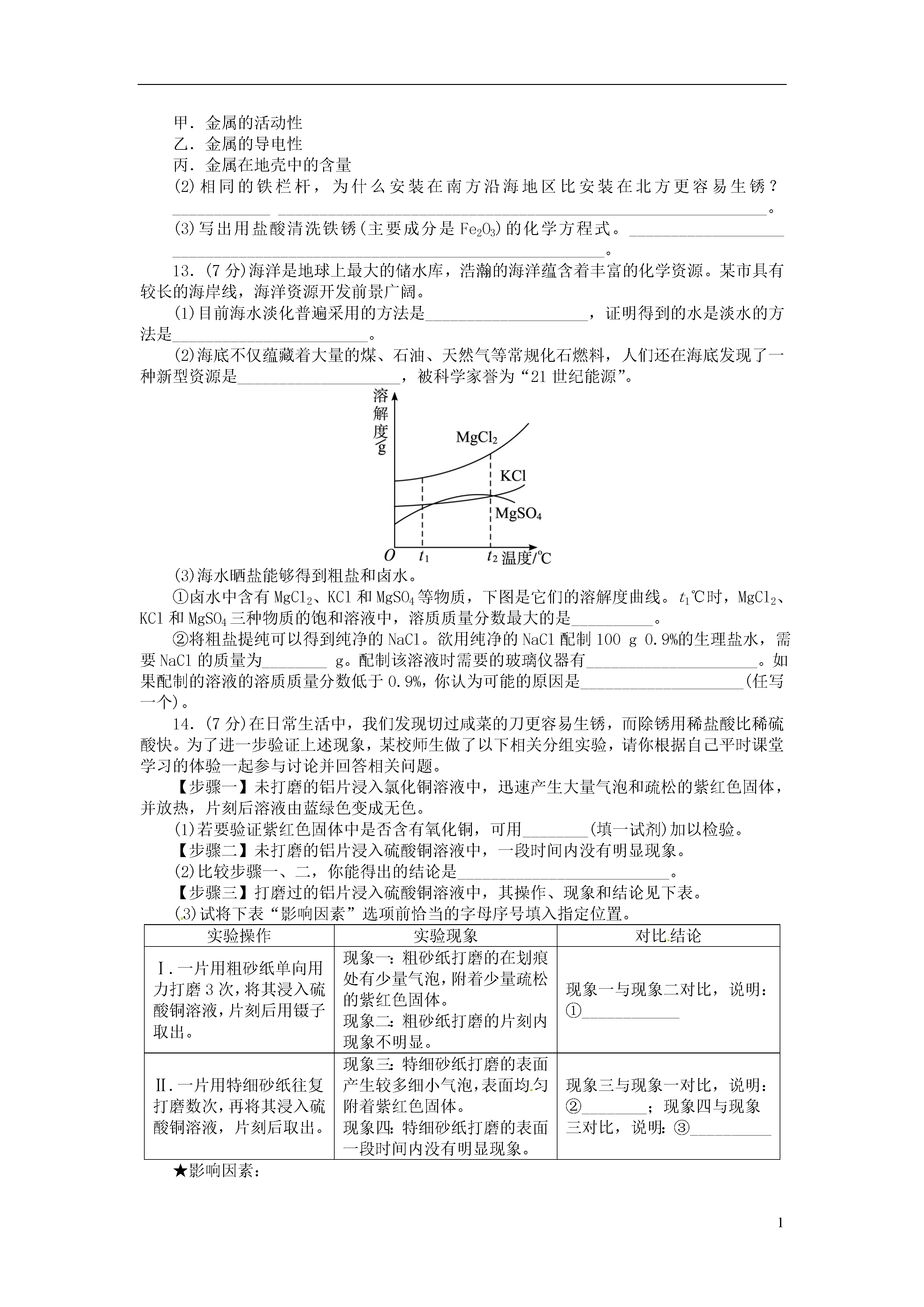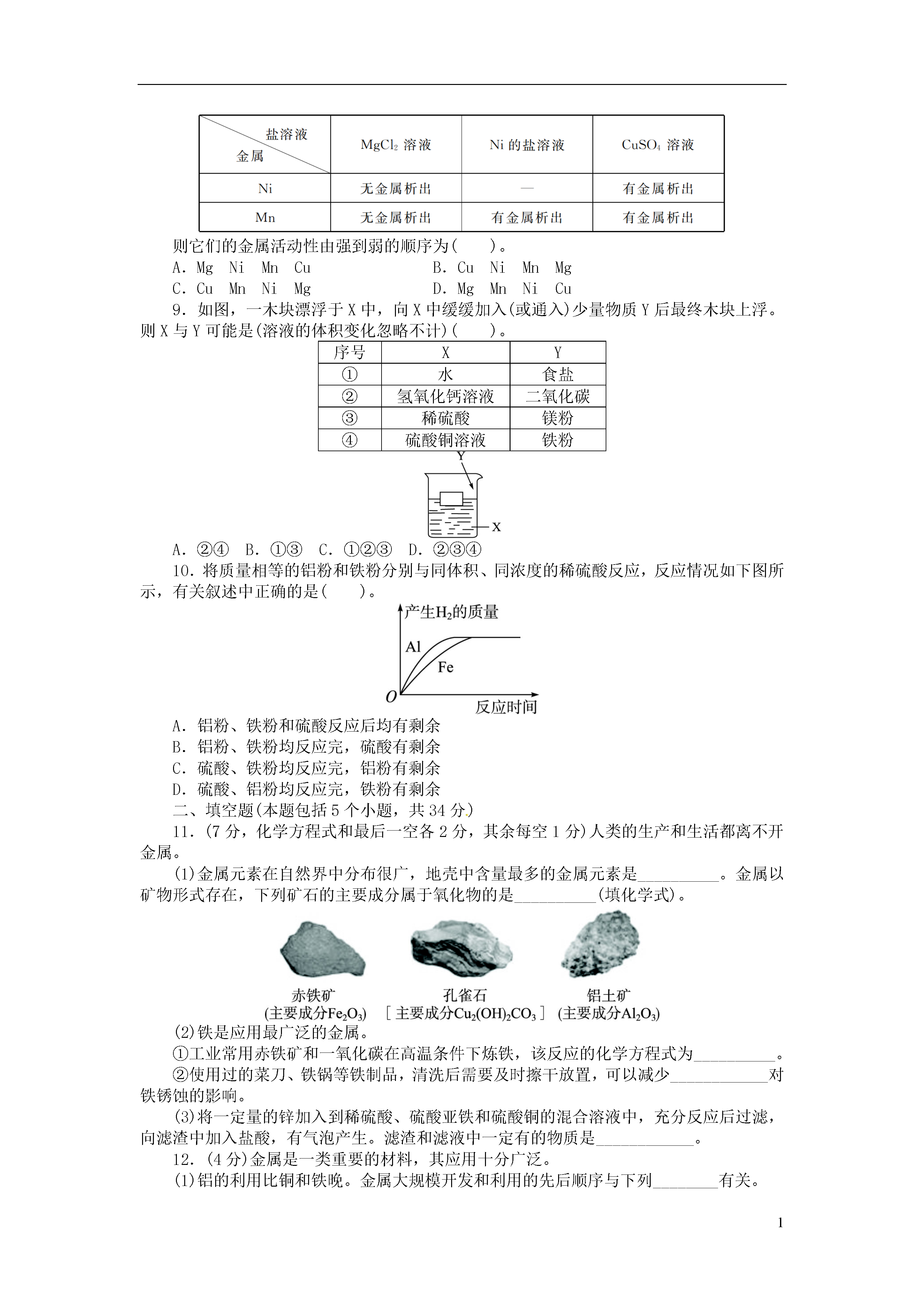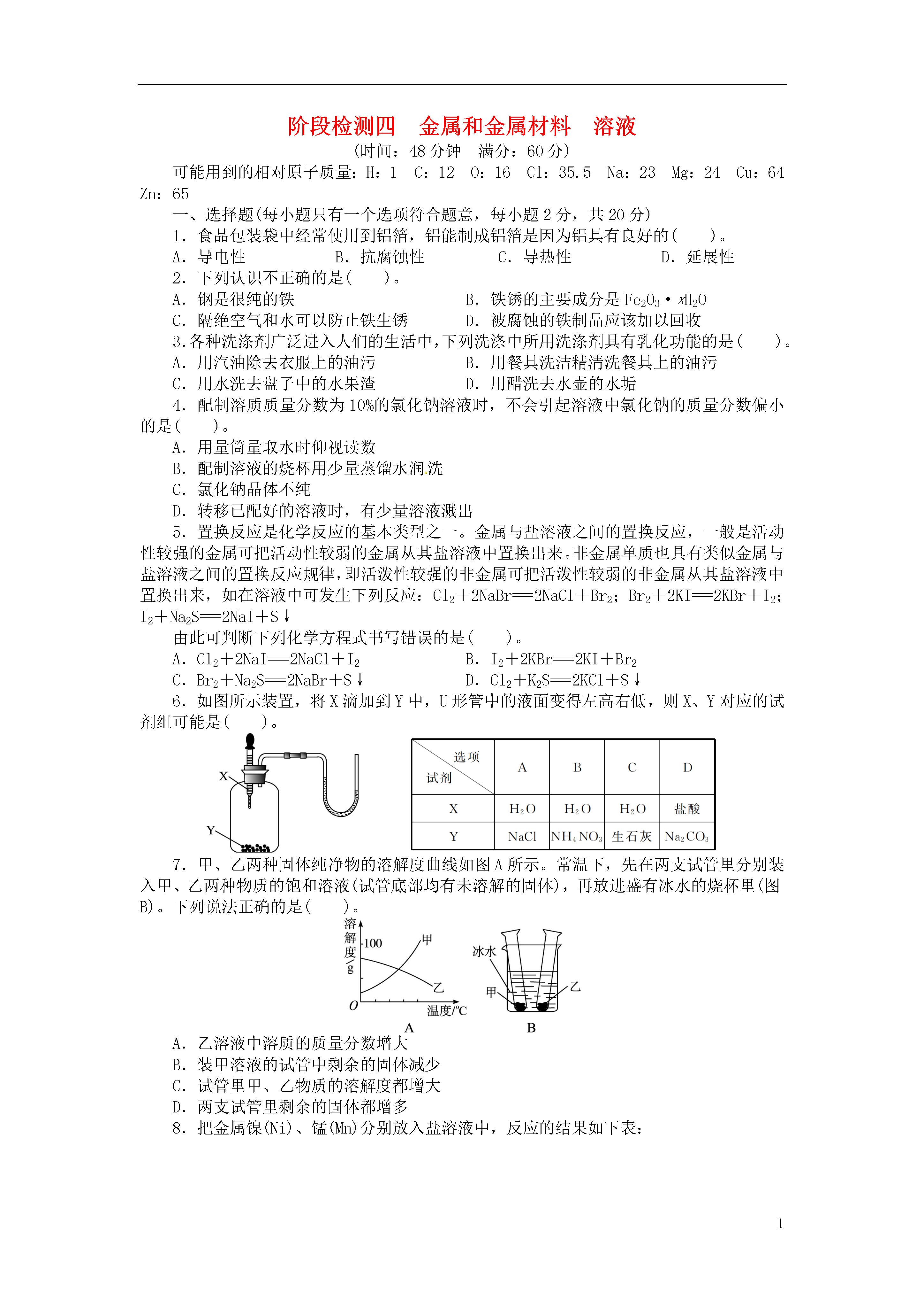 1阶段检测四金属和金属材料溶液(时间:48分钟满分:60分)可能用到的相对原子质量:H:1C:12O:16Cl:35.5Na:23Mg:24Cu:64Zn:65一、选择题(每小题只有一个选项符合题意,每小题2分,共20分)1.食品包装袋中经常使用到铝箔,铝能制成铝箔是因为铝具有良好的()。A.导电性B.抗腐蚀性C.导热性D.延展性2.下列认识不正确的是()。A.钢是很纯的铁B.铁锈的主要成分是Fe2O3·xH2OC.隔绝空气和水可以防止铁生锈D.被腐蚀的铁制品应该加以回收3.各种洗涤剂广泛进入人们的生活中,下列洗涤中所用洗涤剂具有乳化功能的是()。A.用汽油除去衣服上的油污B.用餐具洗洁精清洗餐具上的油污C.用水洗去盘子中的水果渣D.用醋洗去水壶的水垢4.配制溶质质量分数为10%的氯化钠溶液时,不会引起溶液中氯化钠的质量分数偏小的是()。A.用量筒量取水时仰视读数B.配制溶液的烧杯用少量蒸馏水润洗C.氯化钠晶体不纯D.转移已配好的溶液时,有少量溶液溅出5.置换反应是化学反应的基本类型之一。金属与盐溶液之间的置换反应,一般是活动性较强的金属可把活动性较弱的金属从其盐溶液中置换出来。非金属单质也具有类似金属与盐溶液之间的置换反应规律,即活泼性较强的非金属可把活泼性较弱的非金属从其盐溶液中置换出来,如在溶液中可发生下列反应:Cl2+2NaBr===2NaCl+Br2;Br2+2KI===2KBr+I2;I2+Na2S===2NaI+S↓由此可判断下列化学方程式书写错误的是()。A.Cl2+2NaI===2NaCl+I2B.I2+2KBr===2KI+Br2C.Br2+Na2S===2NaBr+S↓D.Cl2+K2S===2KCl+S↓6.如图所示装置,将X滴加到Y中,U形管中的液面变得左高右低,则X、Y对应的试剂组可能是()。7.甲、乙两种固体纯净物的溶解度曲线如图A所示。常温下,先在两支试管里分别装入甲、乙两种物质的饱和溶液(试管底部均有未溶解的固体),再放进盛有冰水的烧杯里(图B)。下列说法正确的是()。A.乙溶液中溶质的质量分数增大B.装甲溶液的试管中剩余的固体减少C.试管里甲、乙物质的溶解度都增大D.两支试管里剩余的固体都增多8.把金属镍(Ni)、锰(Mn)分别放入盐溶液中,反应的结果如下表:则它们的金属活动性由强到弱的顺序为()。A.MgNiMnCuB.CuNiMnMgC.CuMnNiMgD.MgMnNiCu9.如图,一木块漂浮于X中,向X中缓缓加入(或通入)少量物质Y后最终木块上浮。则X与Y可能是(溶液的体积变化忽略不计)()。序号XY①水食盐②氢氧化钙溶液二氧化碳③稀硫酸镁粉④硫酸铜溶液铁粉A.②④B.①③C.①②③D.②③④10.将质量相等的铝粉和铁粉分别与同体积、同浓度的稀硫酸反应,反应情况如下图所示,有关叙述中正确的是()。A.铝粉、铁粉和硫酸反应后均有剩余B.铝粉、铁粉均反应完,硫酸有剩余C.硫酸、铁粉均反应完,铝粉有剩余D.硫酸、铝粉均反应完,铁粉有剩余二、填空题(本题包括5个小题,共34分)11.(7分,化学方程式和最后一空各2分,其余每空1分)人类的生产和生活都离不开金属。(1)金属元素在自然界中分布很广,地壳中含量最多的金属元素是__________。金属以矿物形式存在,下列矿石的主要成分属于氧化物的是__________(填化学式)。(2)铁是应用最广泛的金属。①工业常用赤铁矿和一氧化碳在高温条件下炼铁,该反应的化学方程式为__________。②使用过的菜刀、铁锅等铁制品,清洗后需要及时擦干放置,可以减少____________对铁锈蚀的影响。(3)将一定量的锌加入到稀硫酸、硫酸亚铁和硫酸铜的混合溶液中,充分反应后过滤,向滤渣中加入盐酸,有气泡产生。滤渣和滤液中一定有的物质是____________。12.(4分)金属是一类重要的材料,其应用十分广泛。(1)铝的利用比铜和铁晚。金属大规模开发和利用的先后顺序与下列________有关。甲.金属的活动性乙.金属的导电性丙.金属在地壳中的含量(2)相同的铁栏杆,为什么安装在南方沿海地区比安装在北方更容易生锈?________________________________________________________________________。(3)写出用盐酸清洗铁锈(主要成分是Fe2O3)的化学方程式。________________________________________________________________________。13.(7分)海洋是地球上最大的储水库,浩瀚的海洋蕴含着丰富的化学资源