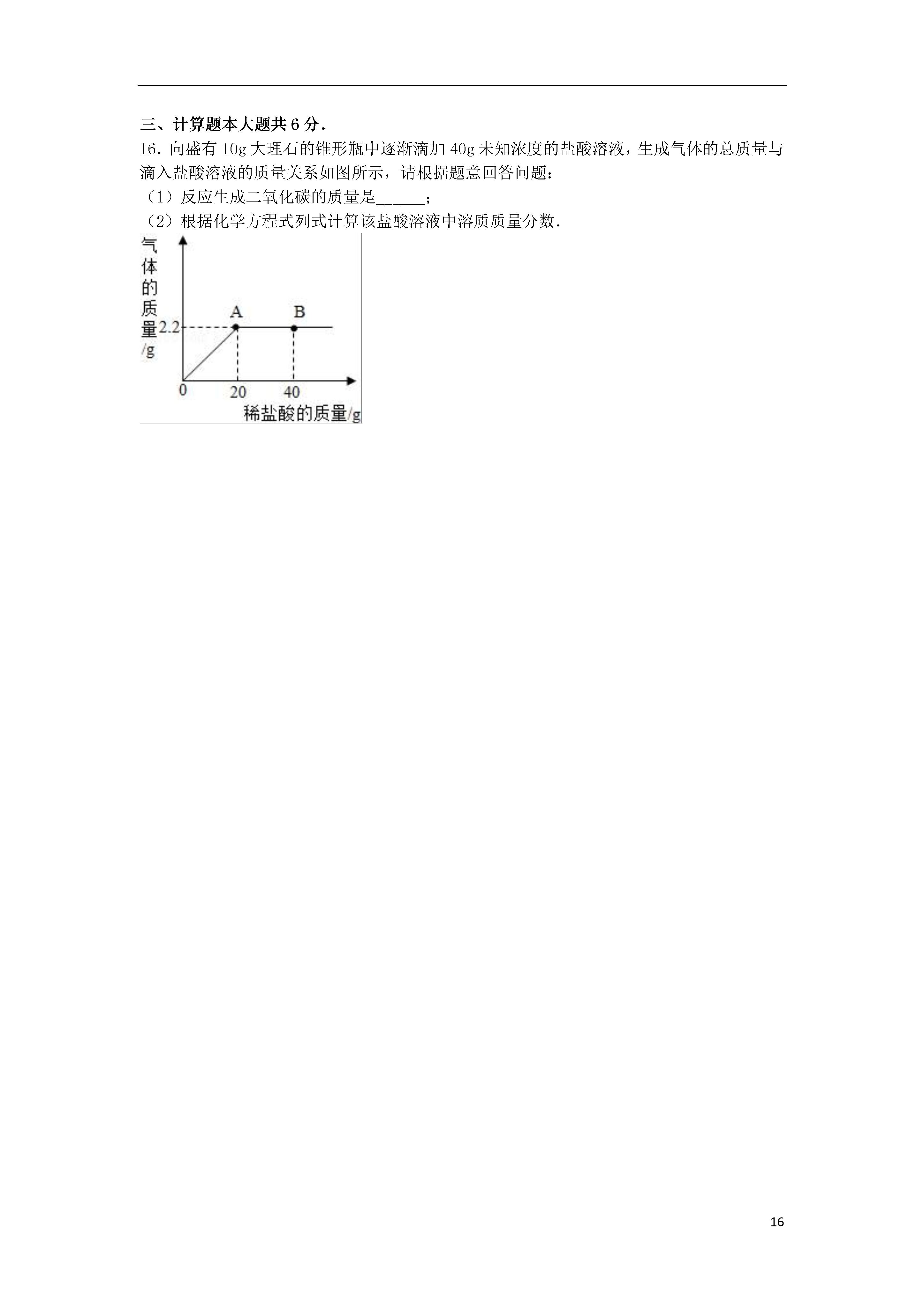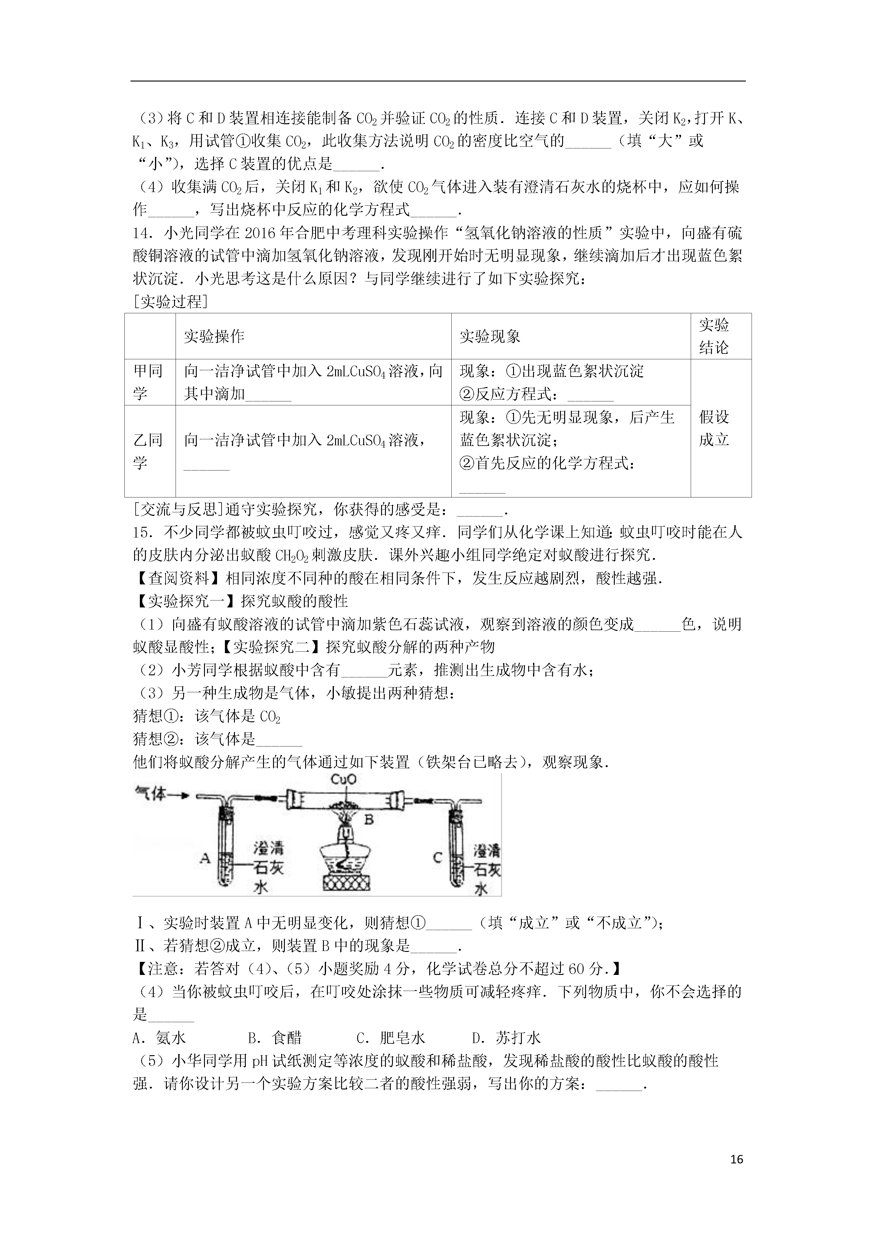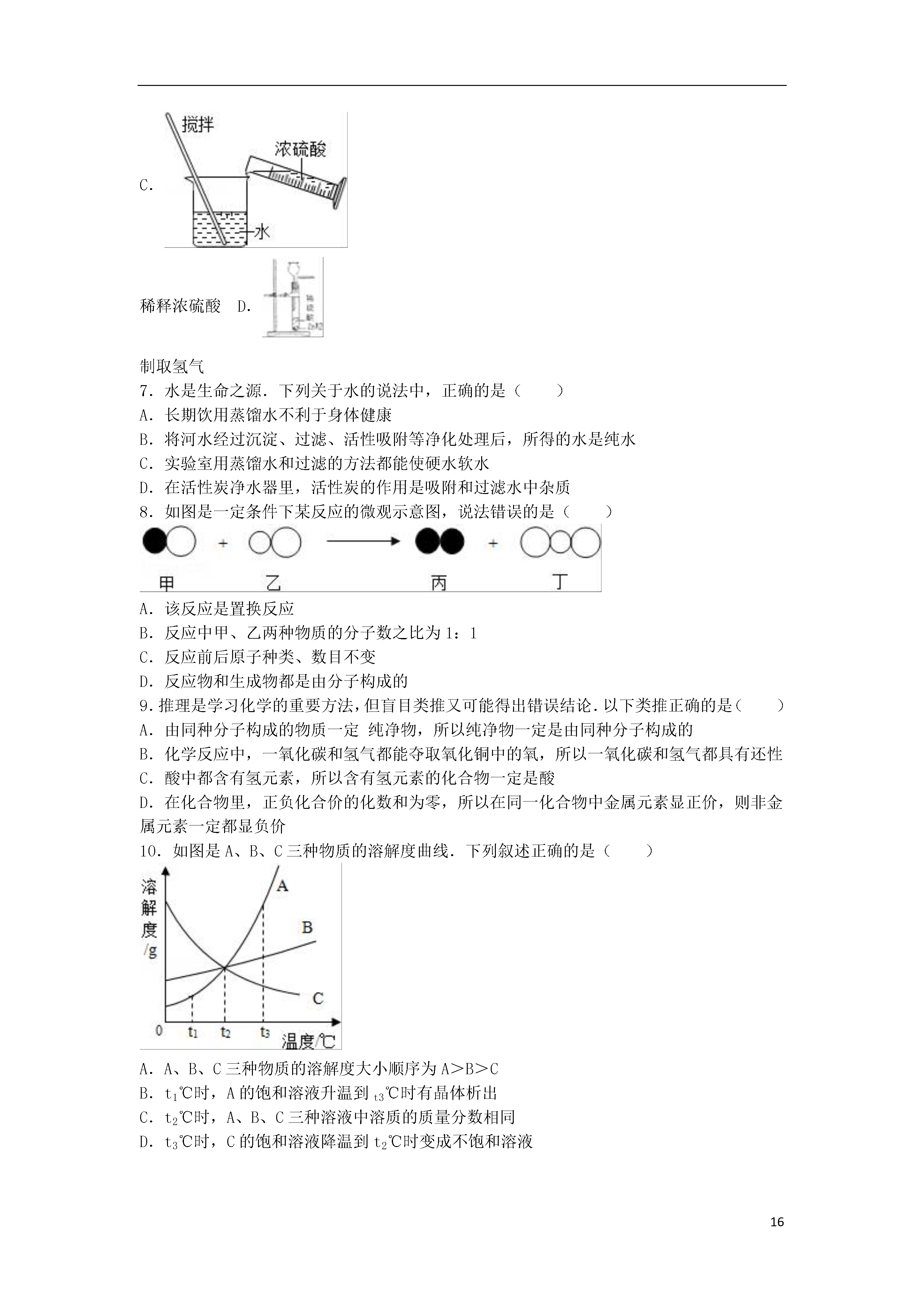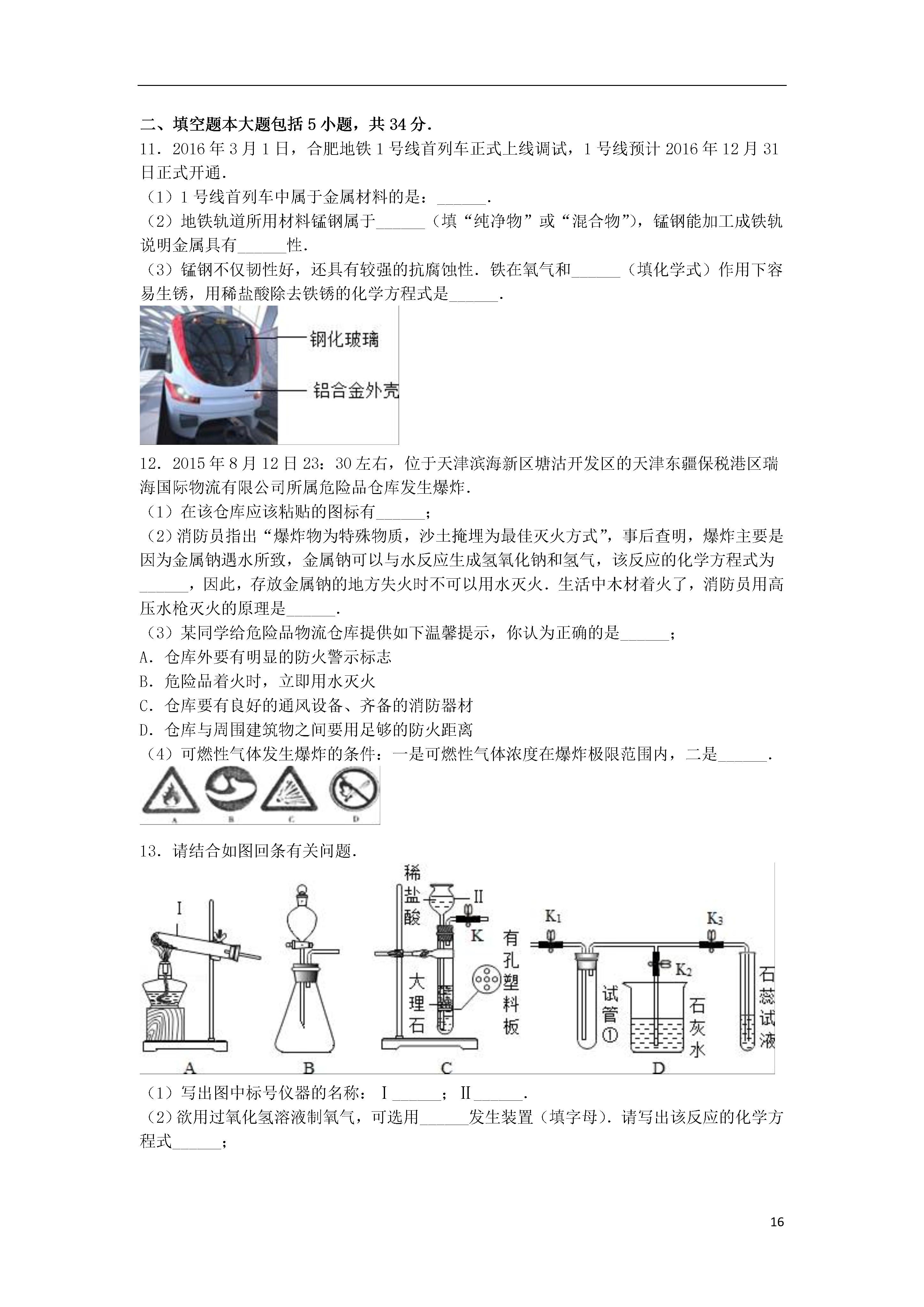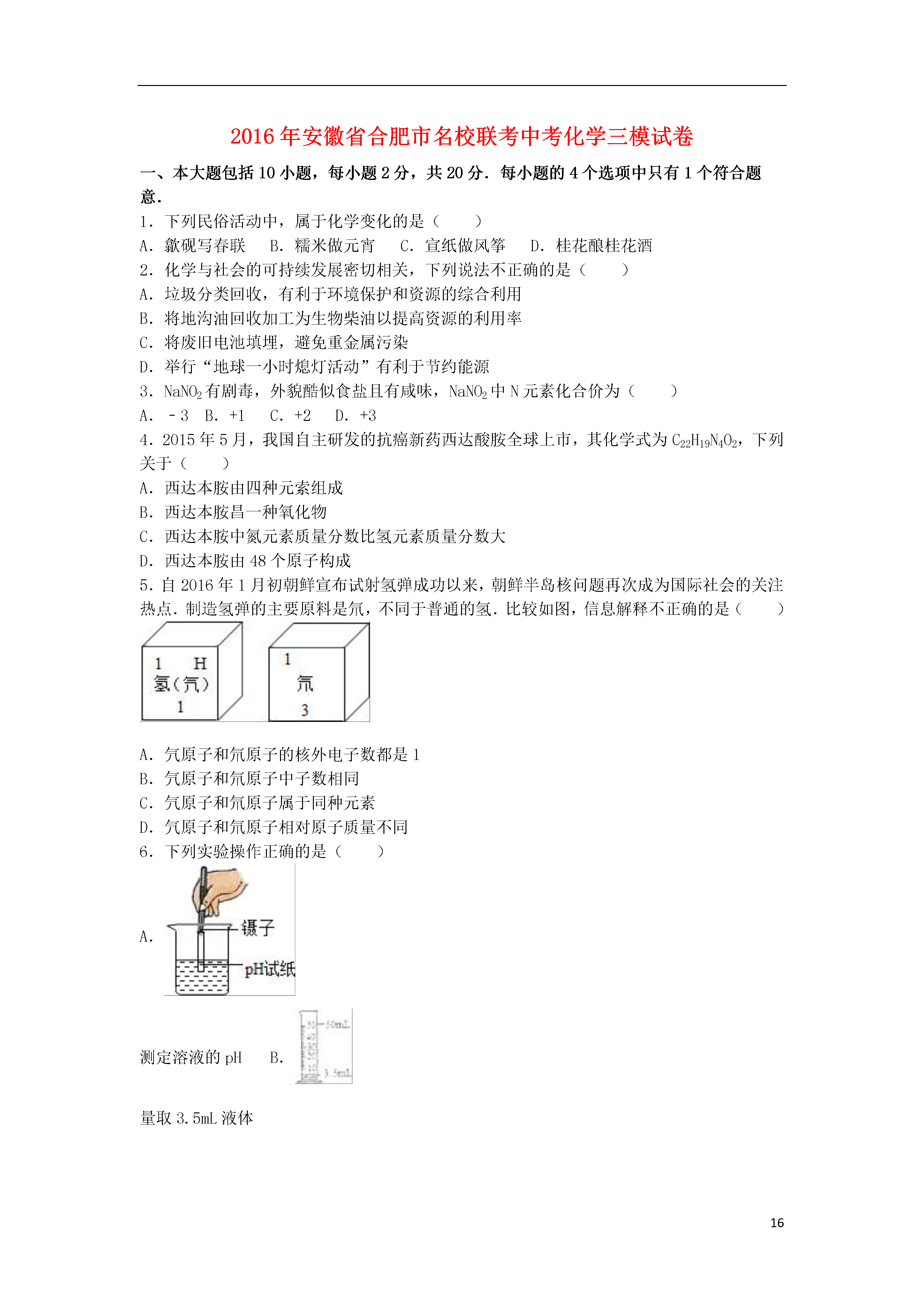 162016年安徽省合肥市名校联考中考化学三模试卷一、本大题包括10小题,每小题2分,共20分.每小题的4个选项中只有1个符合题意.1.下列民俗活动中,属于化学变化的是()A.歙砚写春联B.糯米做元宵C.宣纸做风筝D.桂花酿桂花酒2.化学与社会的可持续发展密切相关,下列说法不正确的是()A.垃圾分类回收,有利于环境保护和资源的综合利用B.将地沟油回收加工为生物柴油以提高资源的利用率C.将废旧电池填埋,避免重金属污染D.举行“地球一小时熄灯活动”有利于节约能源3.NaNO2有剧毒,外貌酷似食盐且有咸味,NaNO2中N元素化合价为()A.﹣3B.+1C.+2D.+34.2015年5月,我国自主研发的抗癌新药西达酸胺全球上市,其化学式为C22H19N4O2,下列关于()A.西达本胺由四种元索组成B.西达本胺昌一种氧化物C.西达本胺中氮元素质量分数比氢元素质量分数大D.西达本胺由48个原子构成5.自2016年1月初朝鲜宣布试射氢弹成功以来,朝鲜半岛核问题再次成为国际社会的关注热点.制造氢弹的主要原料是氘,不同于普通的氢.比较如图,信息解释不正确的是()A.氕原子和氘原子的核外电子数都是1B.氕原子和氘原子中子数相同C.氕原子和氘原子属于同种元素D.氕原子和氘原子相对原子质量不同6.下列实验操作正确的是()A.测定溶液的pHB.量取3.5mL液体C.稀释浓硫酸D.制取氢气7.水是生命之源.下列关于水的说法中,正确的是()A.长期饮用蒸馏水不利于身体健康B.将河水经过沉淀、过滤、活性吸附等净化处理后,所得的水是纯水C.实验室用蒸馏水和过滤的方法都能使硬水软水D.在活性炭净水器里,活性炭的作用是吸附和过滤水中杂质8.如图是一定条件下某反应的微观示意图,说法错误的是()A.该反应是置换反应B.反应中甲、乙两种物质的分子数之比为1:1C.反应前后原子种类、数目不变D.反应物和生成物都是由分子构成的9.推理是学习化学的重要方法,但盲目类推又可能得出错误结论.以下类推正确的是()A.由同种分子构成的物质一定纯净物,所以纯净物一定是由同种分子构成的B.化学反应中,一氧化碳和氢气都能夺取氧化铜中的氧,所以一氧化碳和氢气都具有还性C.酸中都含有氢元素,所以含有氢元素的化合物一定是酸D.在化合物里,正负化合价的化数和为零,所以在同一化合物中金属元素显正价,则非金属元素一定都显负价10.如图是A、B、C三种物质的溶解度曲线.下列叙述正确的是()A.A、B、C三种物质的溶解度大小顺序为A>B>CB.t1℃时,A的饱和溶液升温到t3℃时有晶体析出C.t2℃时,A、B、C三种溶液中溶质的质量分数相同D.t3℃时,C的饱和溶液降温到t2℃时变成不饱和溶液二、填空题本大题包括5小题,共34分.11.2016年3月1日,合肥地铁1号线首列车正式上线调试,1号线预计2016年12月31日正式开通.(1)1号线首列车中属于金属材料的是:______.(2)地铁轨道所用材料锰钢属于______(填“纯净物”或“混合物”),锰钢能加工成铁轨说明金属具有______性.(3)锰钢不仅韧性好,还具有较强的抗腐蚀性.铁在氧气和______(填化学式)作用下容易生锈,用稀盐酸除去铁锈的化学方程式是______.12.2015年8月12日23:30左右,位于天津滨海新区塘沽开发区的天津东疆保税港区瑞海国际物流有限公司所属危险品仓库发生爆炸.(1)在该仓库应该粘贴的图标有______;(2)消防员指出“爆炸物为特殊物质,沙土掩埋为最佳灭火方式”,事后查明,爆炸主要是因为金属钠遇水所致,金属钠可以与水反应生成氢氧化钠和氢气,该反应的化学方程式为______,因此,存放金属钠的地方失火时不可以用水灭火.生活中木材着火了,消防员用高压水枪灭火的原理是______.(3)某同学给危险品物流仓库提供如下温馨提示,你认为正确的是______;A.仓库外要有明显的防火警示标志B.危险品着火时,立即用水灭火C.仓库要有良好的通风设备、齐备的消防器材D.仓库与周围建筑物之间要用足够的防火距离(4)可燃性气体发生爆炸的条件:一是可燃性气体浓度在爆炸极限范围内,二是______.13.请结合如图回条有关问题.(1)写出图中标号仪器的名称:Ⅰ______;Ⅱ______.(2)欲用过氧化氢溶液制氧气,可选用______发生装置(填字母).请写出该反应的化学方程式______;(3)将C和D装置相连接能制备CO2并验证CO2的性质.连接C和D装置,关闭K2,打开K、K1、K3,用试管①收集CO2,此收集方法说明CO2的密度比空气的______(填“大”或“小