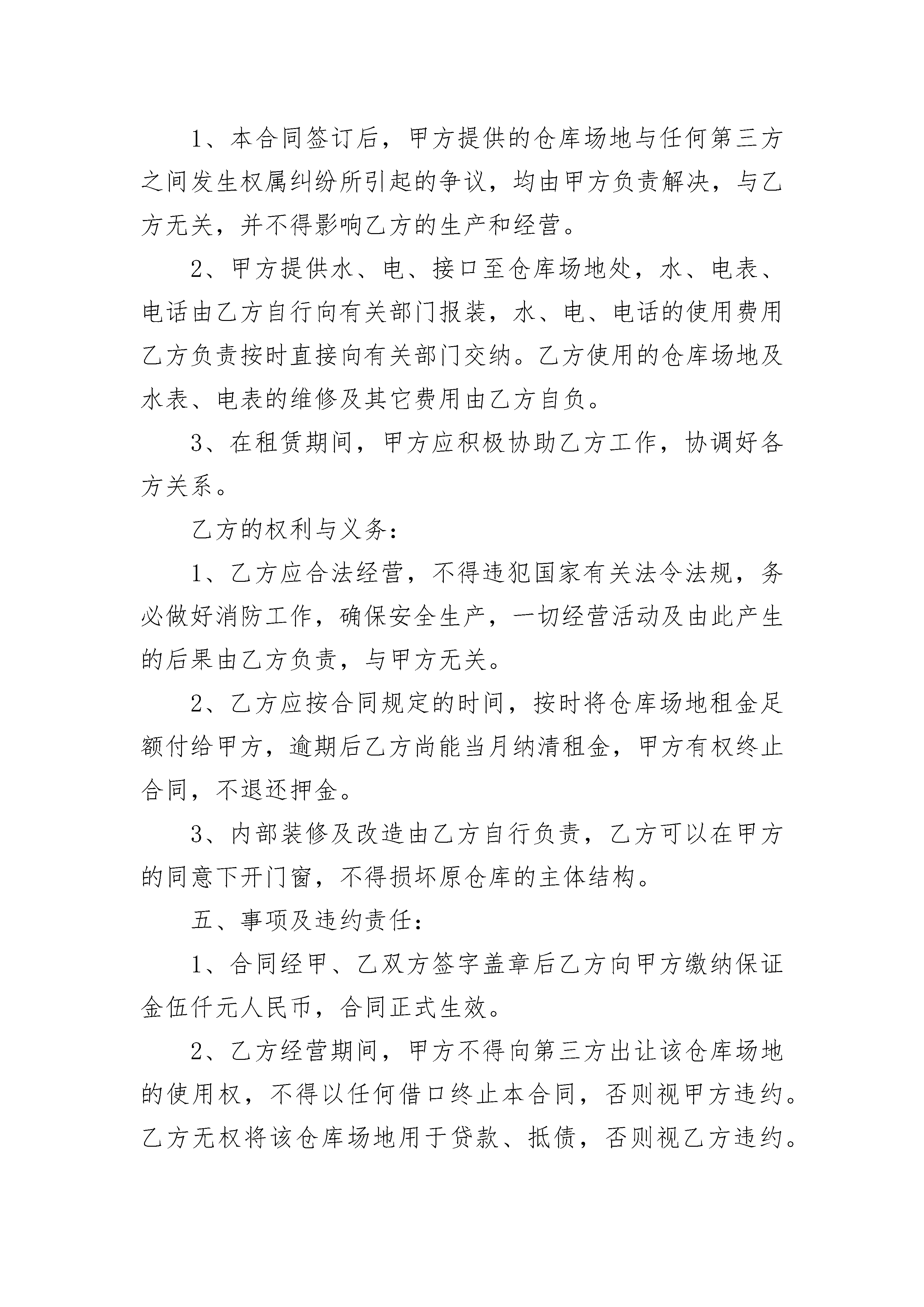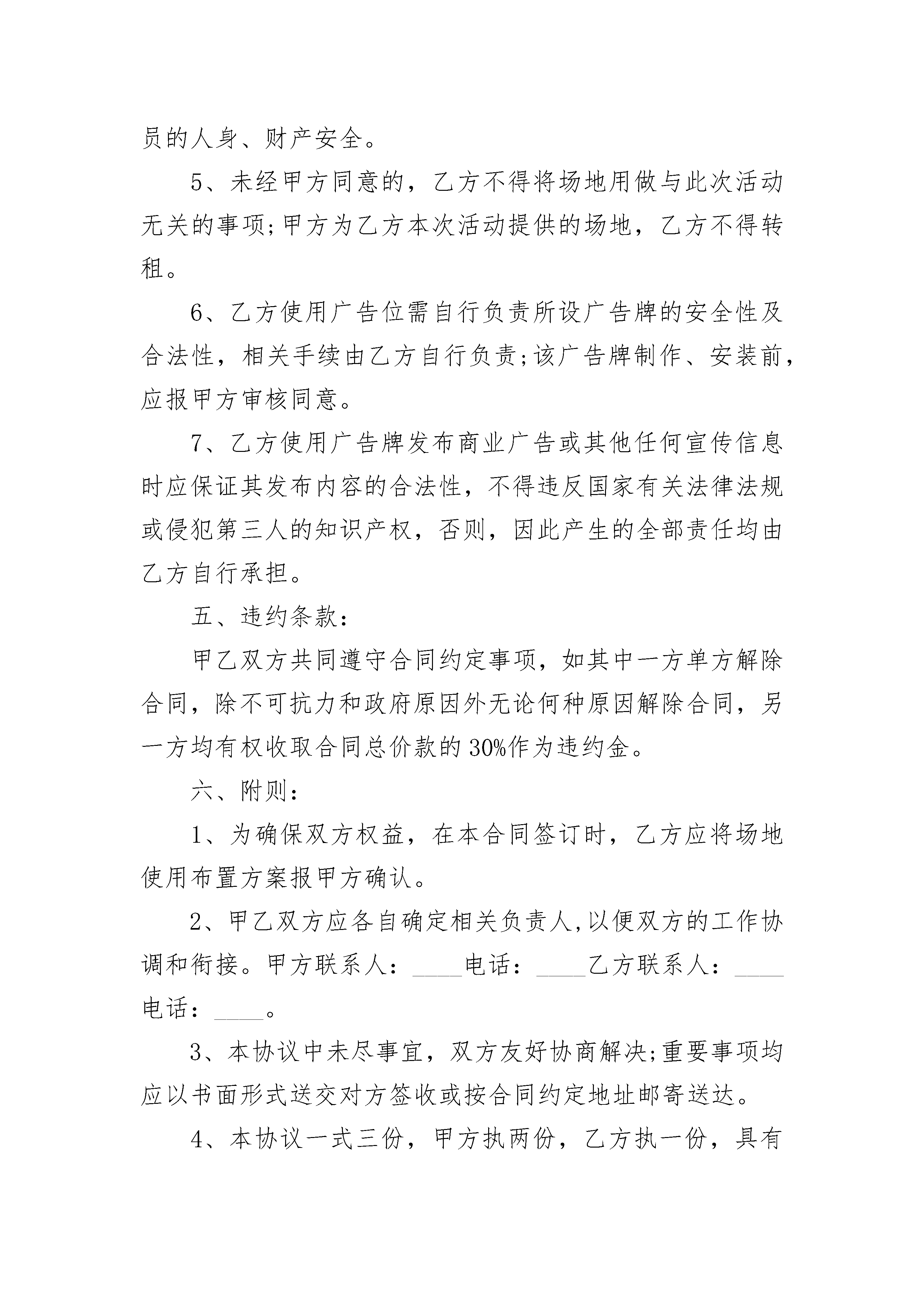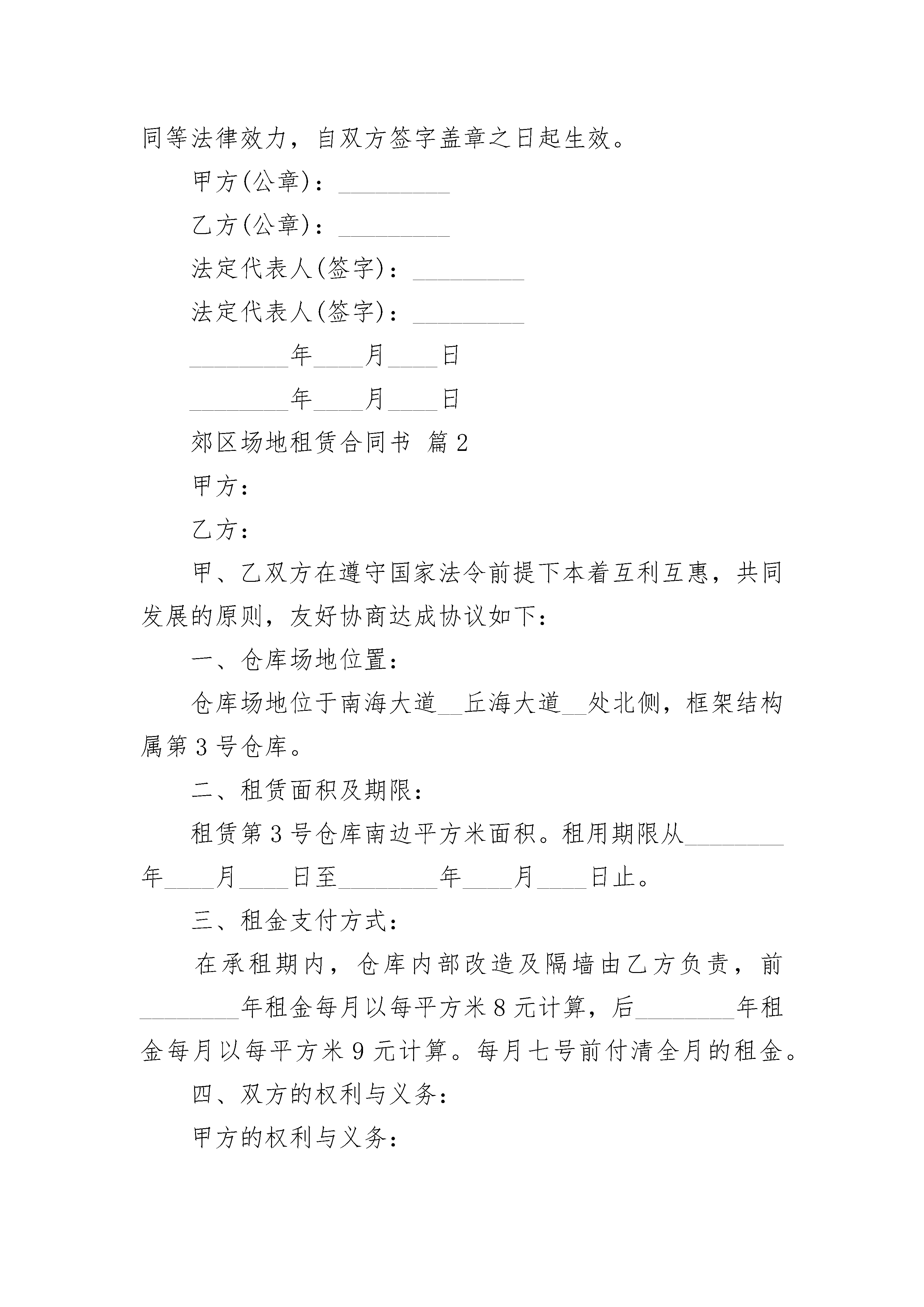 郊区场地租赁合同书郊区场地租赁合同书(精选21篇)郊区场地租赁合同书篇1甲方:乙方:由乙方承办的_________活动将于________年____月____日在_________举办,双方为圆满办好此次活动,就场地使用事宜达成如下协议:一、场地位置及使用时间:1、时间:________年____月____日。2、地点:_________。3、现场布展时间:________年____月____日____点。4、现场撤展时间:________年____月____日____前撤场完毕。二、活动相关费用支付方式:1、场地使用费:____人民币元(大写:____元整)。2、乙方在活动后内将场地损坏的设备、设施、绿化恢复完毕,并经甲方派人验收确认之后,甲方无息向乙方退还保证金。如乙方未按期恢复,甲方有权将所有保证金用作违约金来赔偿甲方损失。若相应损失该保证金不足以赔偿的,乙方应另行予以赔偿。3、乙方于签订本协议合同当日,向甲方一次性支付上述全部款项。4、以上款项支付方式:现金或支票。三、甲方相关义务与权利:1、提供本协议约定的场地。2、提供活动期间动力、照明及设备、用水用电接口点,安排专人协助乙方落实水、电的对接。3、若乙方需要保洁服务,甲方可优先为其进行安排,服务费用另计。4、乙方未按合同约定支付费用,甲方有权解除合同并拒绝交付场地给乙方使用,由此而造成的一切后果由乙方自行承担。四、乙方义务与权利:1、乙方作为本次活动的组织单位,在此次活动的专版宣传中应对此次活动的场地提供单位甲方进行相关宣传,同时乙方应自行向审批大型活动的相关行政主管部门进行申报审批,并将审批同意举办本次活动的相关全套批复文件的有效复印件于活动开始前一天提供一份给甲方留底备案,否则,一切责任由乙方自行承担。2、负责本次活动组织实施工作及相关的安保、消防、清洁维护、垃圾清运工作,确保活动圆满开展。3、因使用不当或活动需要而造成的场地、设施、设备、绿化破坏,乙方应在活动结束后按时恢复或按甲方提供的标准在活动结束后5个工作日内赔偿。4、乙方应自行安排保安人员负责场内的交通秩序、车辆行驶、停放安全、现场活动秩序和参观人员及活动参与人员的人身、财产安全。5、未经甲方同意的,乙方不得将场地用做与此次活动无关的事项;甲方为乙方本次活动提供的场地,乙方不得转租。6、乙方使用广告位需自行负责所设广告牌的安全性及合法性,相关手续由乙方自行负责;该广告牌制作、安装前,应报甲方审核同意。7、乙方使用广告牌发布商业广告或其他任何宣传信息时应保证其发布内容的合法性,不得违反国家有关法律法规或侵犯第三人的知识产权,否则,因此产生的全部责任均由乙方自行承担。五、违约条款:甲乙双方共同遵守合同约定事项,如其中一方单方解除合同,除不可抗力和政府原因外无论何种原因解除合同,另一方均有权收取合同总价款的30%作为违约金。六、附则:1、为确保双方权益,在本合同签订时,乙方应将场地使用布置方案报甲方确认。2、甲乙双方应各自确定相关负责人,以便双方的工作协调和衔接。甲方联系人:____电话:____乙方联系人:____电话:____。3、本协议中未尽事宜,双方友好协商解决;重要事项均应以书面形式送交对方签收或按合同约定地址邮寄送达。4、本协议一式三份,甲方执两份,乙方执一份,具有同等法律效力,自双方签字盖章之日起生效。甲方(公章):_________乙方(公章):_________法定代表人(签字):_________法定代表人(签字):_________________年____月____日________年____月____日郊区场地租赁合同书篇2甲方:乙方:甲、乙双方在遵守国家法令前提下本着互利互惠,共同发展的原则,友好协商达成协议如下:一、仓库场地位置:仓库场地位于南海大道__丘海大道__处北侧,框架结构属第3号仓库。二、租赁面积及期限:租赁第3号仓库南边平方米面积。租用期限从________年____月____日至________年____月____日止。三、租金支付方式:在承租期内,仓库内部改造及隔墙由乙方负责,前________年租金每月以每平方米8元计算,后________年租金每月以每平方米9元计算。每月七号前付清全月的租金。四、双方的权利与义务:甲方的权利与义务:1、本合同签订后,甲方提供的仓库场地与任何第三方之间发生权属纠纷所引起的争议,均由甲方负责解决,与乙方无关,并不得影响乙方的生产和经营。2、甲方提供水、电、接口至仓库场地处,水、电表、电话由乙方自行向有关部门报装,水、电、电话的使用费用乙方负责按时直接向有关部门交纳。乙方使用的仓库场地及水表、电表的维修及其它费用由乙方自负。3、在租赁期间,甲方应积极协助乙方工作,协调好各方关系。乙方的权利与义务:1、乙方应合法经营,不得违犯国家