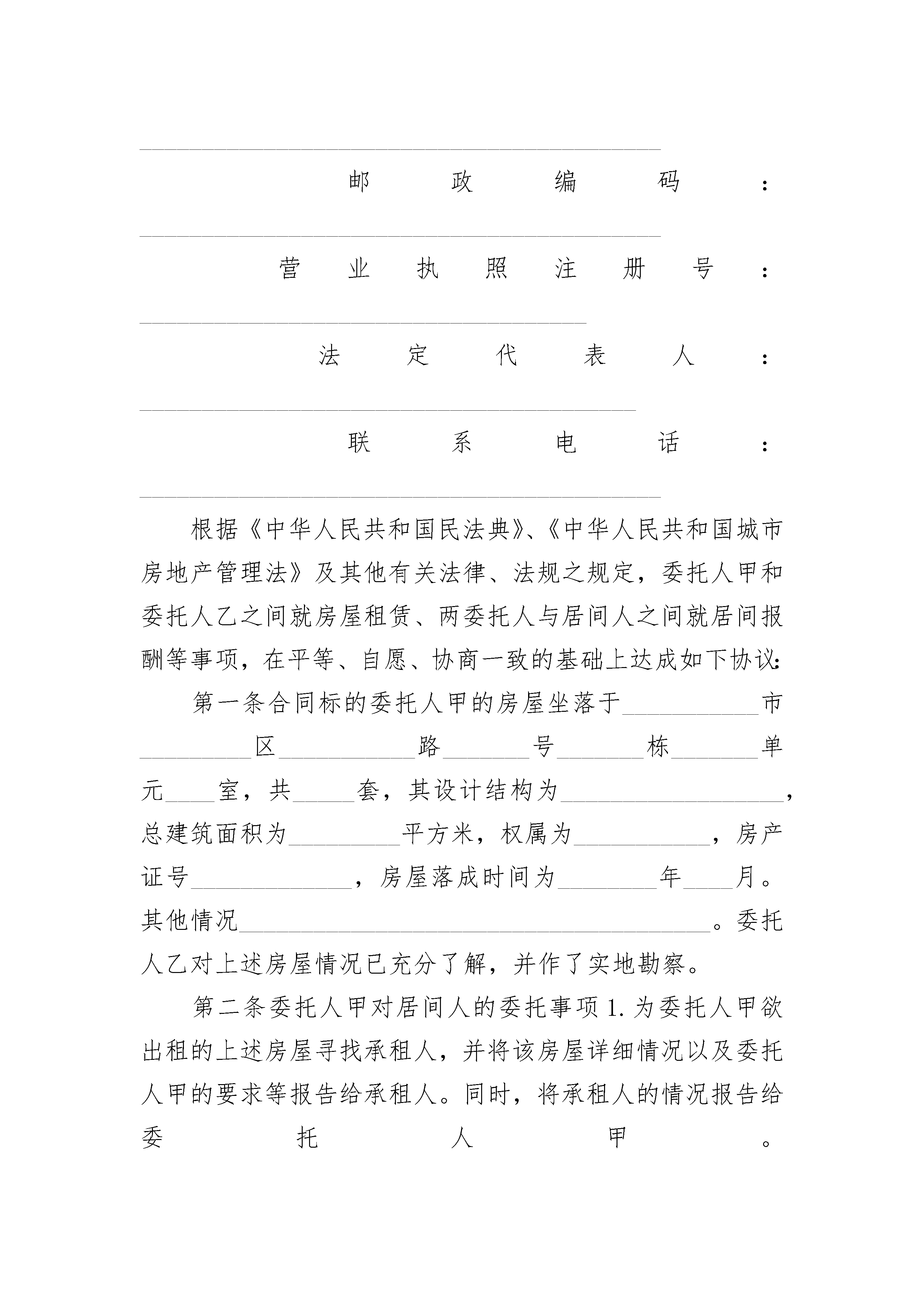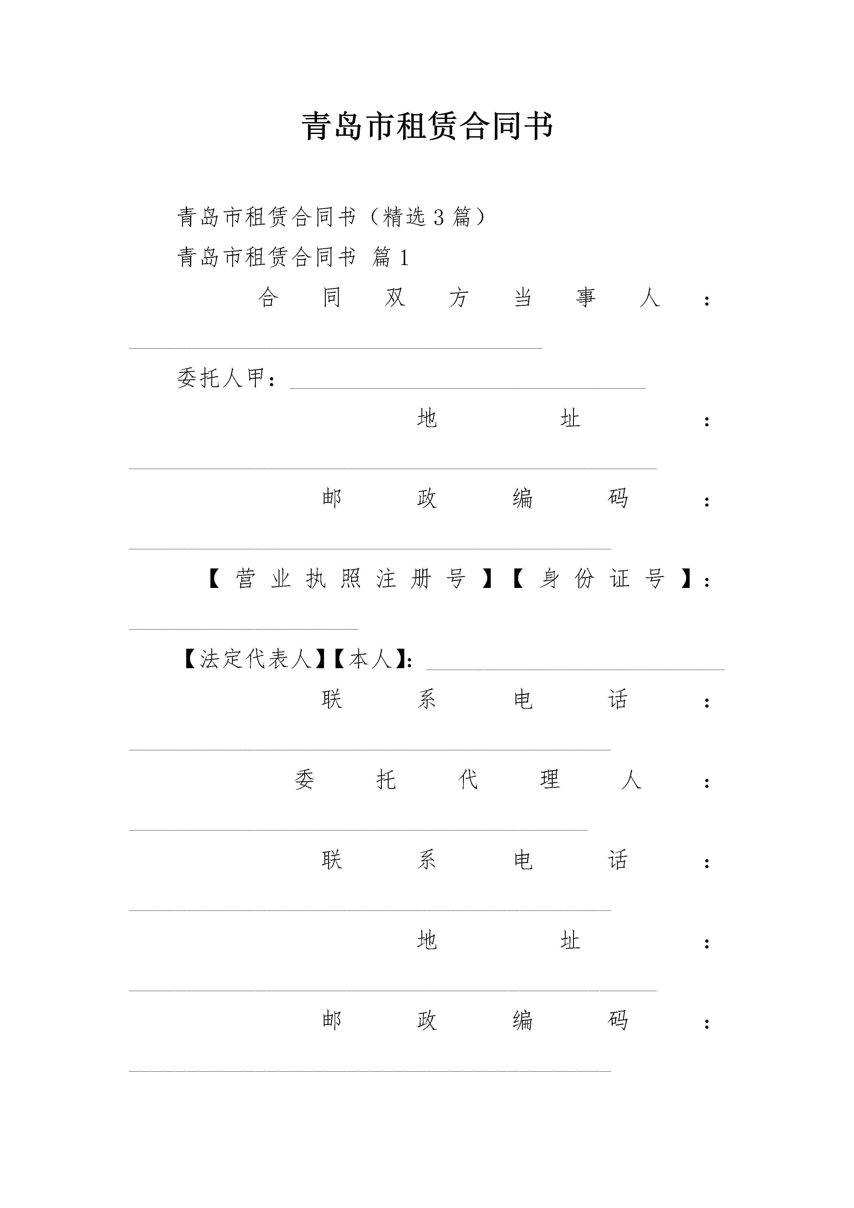 青岛市租赁合同书青岛市租赁合同书(精选3篇)青岛市租赁合同书篇1合同双方当事人:____________________________________委托人甲:_______________________________地址:______________________________________________邮政编码:__________________________________________【营业执照注册号】【身份证号】:____________________【法定代表人】【本人】:__________________________联系电话:__________________________________________委托代理人:________________________________________联系电话:__________________________________________地址:______________________________________________邮政编码:__________________________________________委托人乙:________________________________【本人】【法定代表人】姓名:________________________国籍:_____________【身份证号】【护照】【营业执照注册号】地址:______________________________________________邮政编码:__________________________________________联系电话:__________________________________________【委托代理人】姓名:______________________________________________国籍:______________________________________________地址:______________________________________________邮政编码:__________________________________________联系电话:__________________________________________居间人:____________________________________________注册地址:__________________________________________邮政编码:__________________________________________营业执照注册号:____________________________________法定代表人:________________________________________联系电话:__________________________________________根据《中华人民共和国民法典》、《中华人民共和国城市房地产管理法》及其他有关法律、法规之规定,委托人甲和委托人乙之间就房屋租赁、两委托人与居间人之间就居间报酬等事项,在平等、自愿、协商一致的基础上达成如下协议:第一条合同标的委托人甲的房屋坐落于___________市_________区___________路_______号_______栋_______单元____室,共_____套,其设计结构为__________________,总建筑面积为_________平方米,权属为___________,房产证号_____________,房屋落成时间为________年____月。其他情况______________________________________。委托人乙对上述房屋情况已充分了解,并作了实地勘察。第二条委托人甲对居间人的委托事项1.为委托人甲欲出租的上述房屋寻找承租人,并将该房屋详细情况以及委托人甲的要求等报告给承租人。同时,将承租人的情况报告给委托人甲。2._________________________________________________3._________________________________________________第三条委托人乙对居间人的委托事项1.委托人乙欲在__________市__________区__________________地段承租___________房屋____套,面积为_________平方米。委托居间人搜寻信息,并及时报告委托人乙,以便促成委托人乙承租房屋的目的。2._______________