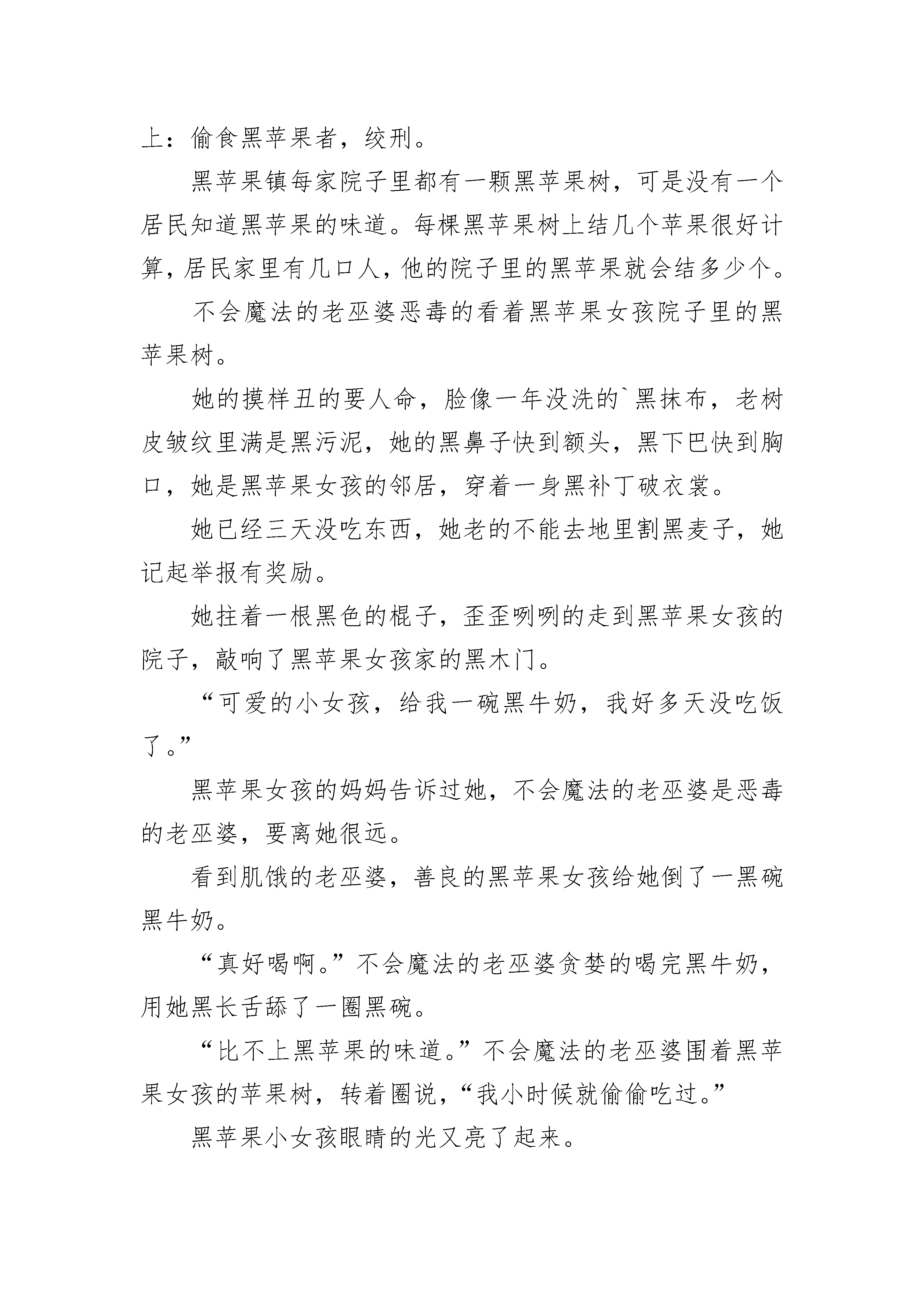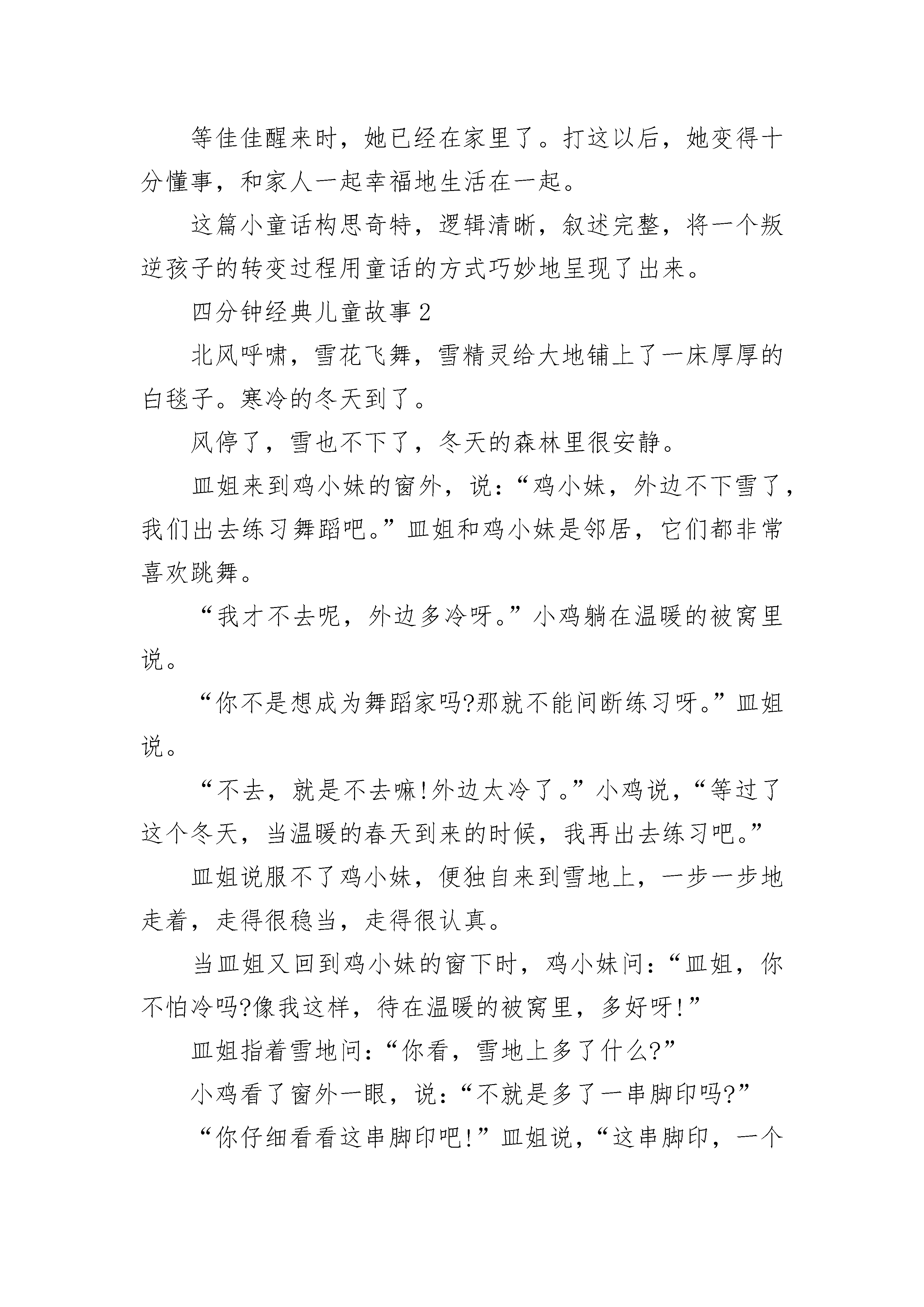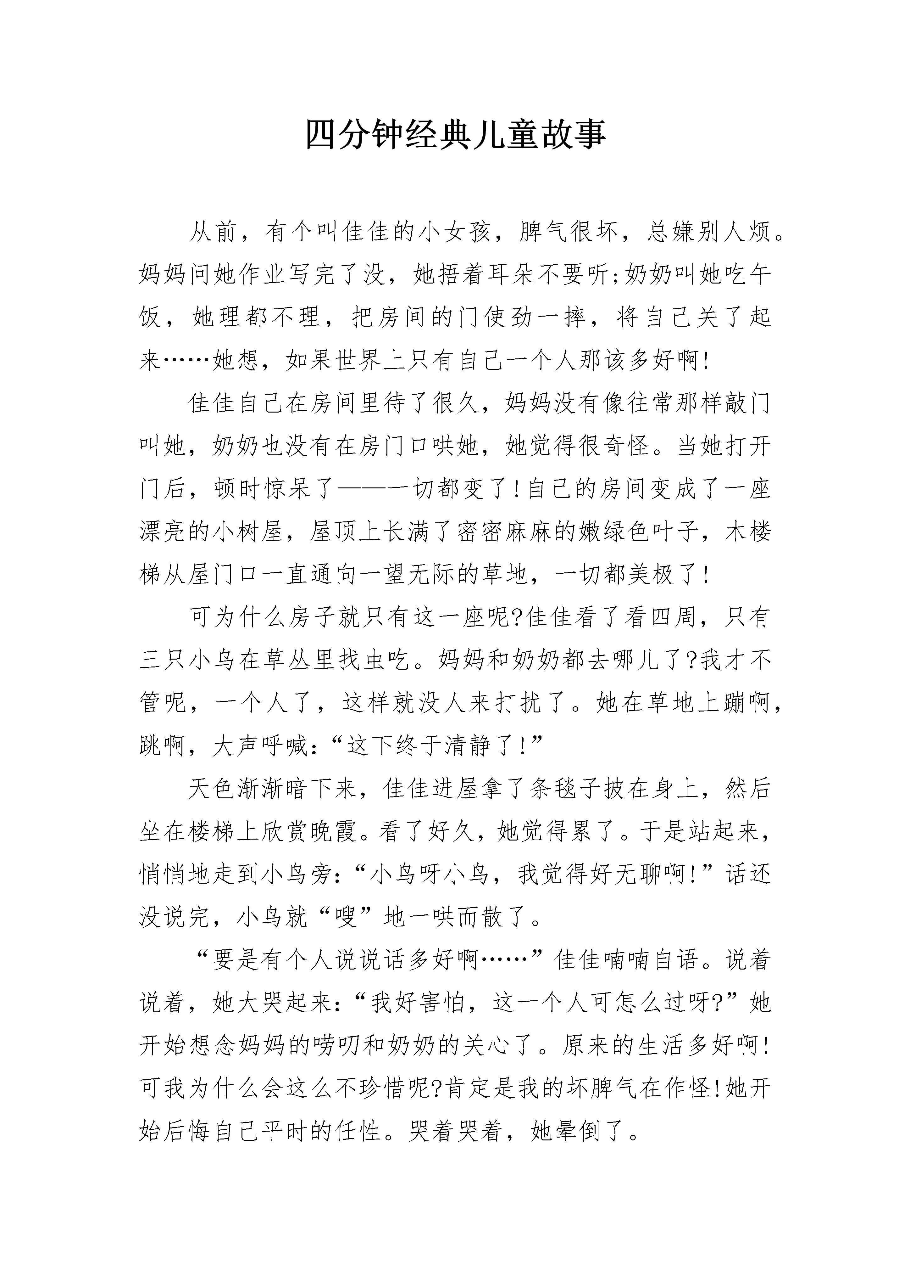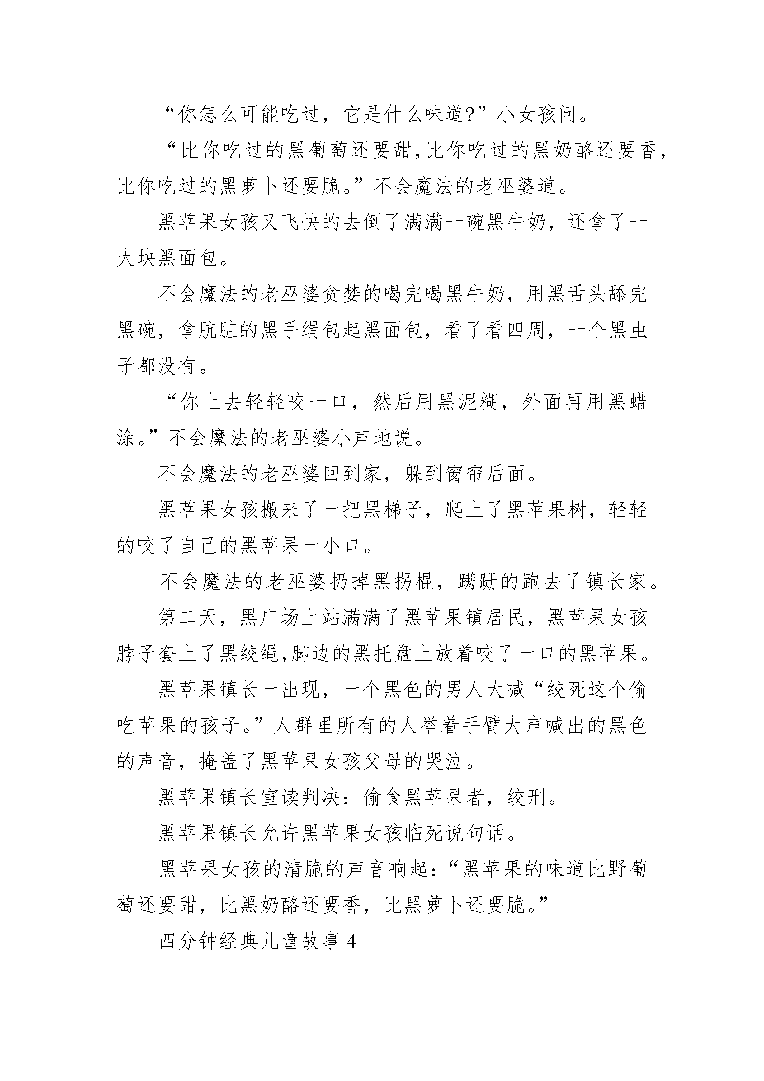 四分钟经典儿童故事从前,有个叫佳佳的小女孩,脾气很坏,总嫌别人烦。妈妈问她作业写完了没,她捂着耳朵不要听;奶奶叫她吃午饭,她理都不理,把房间的门使劲一摔,将自己关了起来……她想,如果世界上只有自己一个人那该多好啊!佳佳自己在房间里待了很久,妈妈没有像往常那样敲门叫她,奶奶也没有在房门口哄她,她觉得很奇怪。当她打开门后,顿时惊呆了——一切都变了!自己的房间变成了一座漂亮的小树屋,屋顶上长满了密密麻麻的嫩绿色叶子,木楼梯从屋门口一直通向一望无际的草地,一切都美极了!可为什么房子就只有这一座呢?佳佳看了看四周,只有三只小乌在草丛里找虫吃。妈妈和奶奶都去哪儿了?我才不管呢,一个人了,这样就没人来打扰了。她在草地上蹦啊,跳啊,大声呼喊:“这下终于清静了!”天色渐渐暗下来,佳佳进屋拿了条毯子披在身上,然后坐在楼梯上欣赏晚霞。看了好久,她觉得累了。于是站起来,悄悄地走到小鸟旁:“小鸟呀小鸟,我觉得好无聊啊!”话还没说完,小鸟就“嗖”地一哄而散了。“要是有个人说说话多好啊……”佳佳喃喃自语。说着说着,她大哭起来:“我好害怕,这一个人可怎么过呀?”她开始想念妈妈的唠叨和奶奶的关心了。原来的生活多好啊!可我为什么会这么不珍惜呢?肯定是我的坏脾气在作怪!她开始后悔自己平时的任性。哭着哭着,她晕倒了。等佳佳醒来时,她已经在家里了。打这以后,她变得十分懂事,和家人一起幸福地生活在一起。这篇小童话构思奇特,逻辑清晰,叙述完整,将一个叛逆孩子的转变过程用童话的方式巧妙地呈现了出来。四分钟经典儿童故事2北风呼啸,雪花飞舞,雪精灵给大地铺上了一床厚厚的白毯子。寒冷的冬天到了。风停了,雪也不下了,冬天的森林里很安静。皿姐来到鸡小妹的窗外,说:“鸡小妹,外边不下雪了,我们出去练习舞蹈吧。”皿姐和鸡小妹是邻居,它们都非常喜欢跳舞。“我才不去呢,外边多冷呀。”小鸡躺在温暖的被窝里说。“你不是想成为舞蹈家吗?那就不能间断练习呀。”皿姐说。“不去,就是不去嘛!外边太冷了。”小鸡说,“等过了这个冬天,当温暖的春天到来的时候,我再出去练习吧。”皿姐说服不了鸡小妹,便独自来到雪地上,一步一步地走着,走得很稳当,走得很认真。当皿姐又回到鸡小妹的窗下时,鸡小妹问:“皿姐,你不怕冷吗?像我这样,待在温暖的被窝里,多好呀!”皿姐指着雪地问:“你看,雪地上多了什么?”小鸡看了窗外一眼,说:“不就是多了一串脚印吗?”“你仔细看看这串脚印吧!”皿姐说,“这串脚印,一个接着一个中间没有间断,如果哪个地方间断了,这路,就走不下去了。”“皿姐,你是想告诉我,不能间断练习,是吗?”鸡小妹说,“那么,我马上起床,到雪地上练习舞蹈吧。”鸡小妹和皿姐一起来到雪地上,它们一边哼着节拍,一边跳着优美的舞蹈。太阳出来了,照得雪地泛着亮光。皿姐和鸡小妹的舞蹈,为寒冷的冬天带来了无限的生机和活力。四分钟经典儿童故事3三个肥嘟嘟的黑苹果,透亮亮,黑黝黝发着黑光,挂在一棵粗壮的黑色苹果树上。黑苹果女孩趴在窗户上,鼻子贴在浅黑透明黑的玻璃上,眼睛紧紧盯着“属于”她的那个的黑苹果。“黑苹果是什么味道?我真想知道。”黑苹果女孩眼睛里闪着渴望,随即想到黑苹果镇的律法,眼神马上黯淡下去。黑苹果女孩的父母去收割黑麦子,她留在家里照看黑苹果。她必须一刻不停的盯着黑苹果,眼睛都不能眨,一点闪失都不行。黑苹果镇的是一个黑色小镇,这里有黑铁一般的律法。居民穿黑外套,戴黑帽子,穿黑靴子。这里一切都是黑色的:黑树木头做成的黑木屋,黑石头铺成的黑道路。乌黑广场旁边是一座黑黑尖教堂。居民吃黑面包,喝黑奶牛身上挤出的黑牛奶。黑苹果镇最重要的一条法律刻在黑广场中央的黑石碑上:偷食黑苹果者,绞刑。黑苹果镇每家院子里都有一颗黑苹果树,可是没有一个居民知道黑苹果的味道。每棵黑苹果树上结几个苹果很好计算,居民家里有几口人,他的院子里的黑苹果就会结多少个。不会魔法的老巫婆恶毒的看着黑苹果女孩院子里的黑苹果树。她的摸样丑的要人命,脸像一年没洗的`黑抹布,老树皮皱纹里满是黑污泥,她的黑鼻子快到额头,黑下巴快到胸口,她是黑苹果女孩的邻居,穿着一身黑补丁破衣裳。她已经三天没吃东西,她老的不能去地里割黑麦子,她记起举报有奖励。她拄着一根黑色的棍子,歪歪咧咧的走到黑苹果女孩的院子,敲响了黑苹果女孩家的黑木门。“可爱的小女孩,给我一碗黑牛奶,我好多天没吃饭了。”黑苹果女孩的妈妈告诉过她,不会魔法的老巫婆是恶毒的老巫婆,要离她很远。看到肌饿的老巫婆,善良的黑苹果女孩给她倒了一黑碗黑牛奶。“真好喝啊。”不会魔法的老巫婆贪婪的喝完黑牛奶,用她黑长舌舔了一圈黑碗。“比不上黑苹果的味道。”不会魔法的老巫婆围着黑苹果女孩的苹果树,转着圈说,“我小时候就偷偷吃过。”黑苹果小女孩眼睛的光又亮了起来。“你怎么可能吃过,它是什么味道?”小女孩问。“比你吃过的黑葡萄还要甜,比你吃过的黑奶酪还