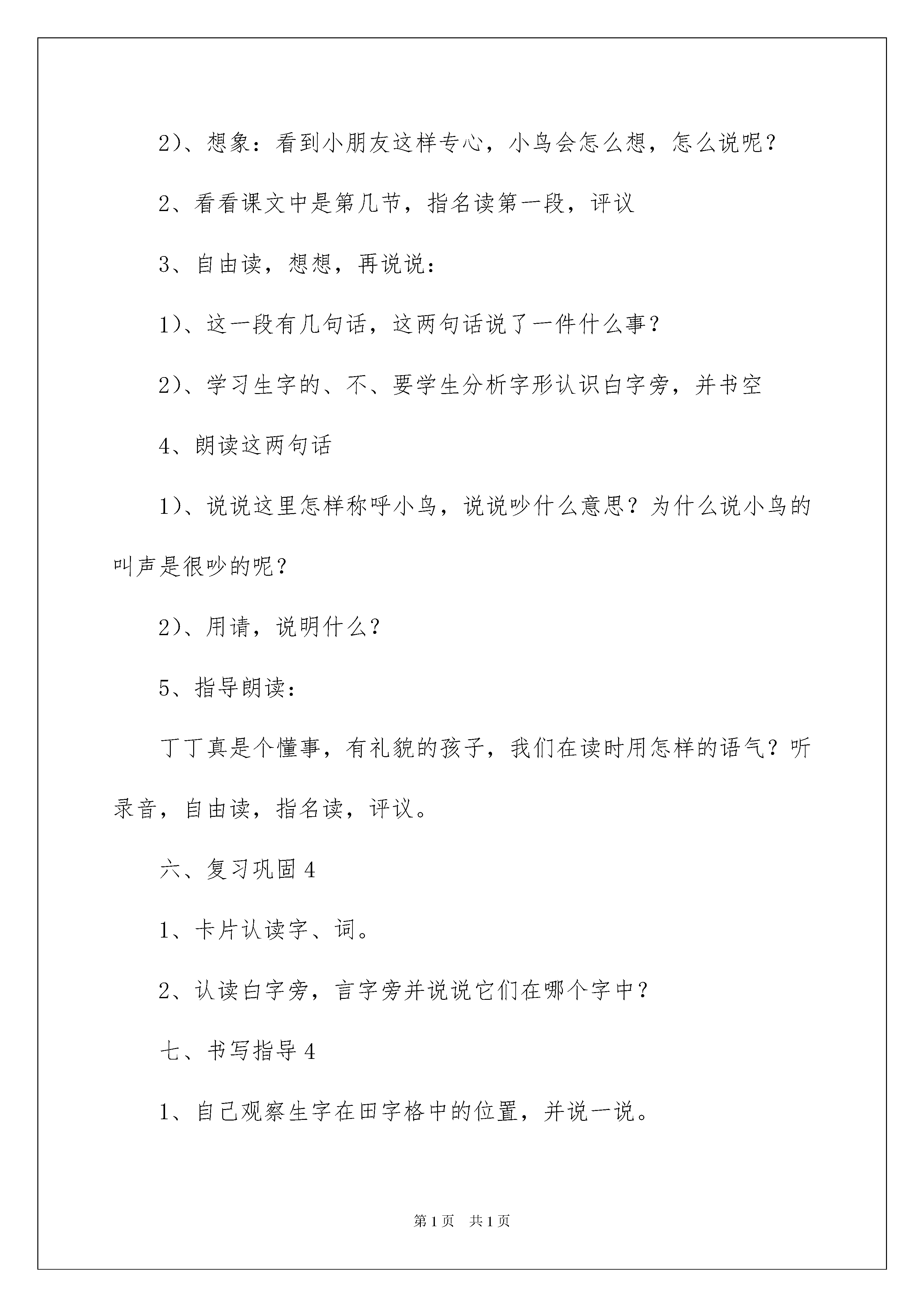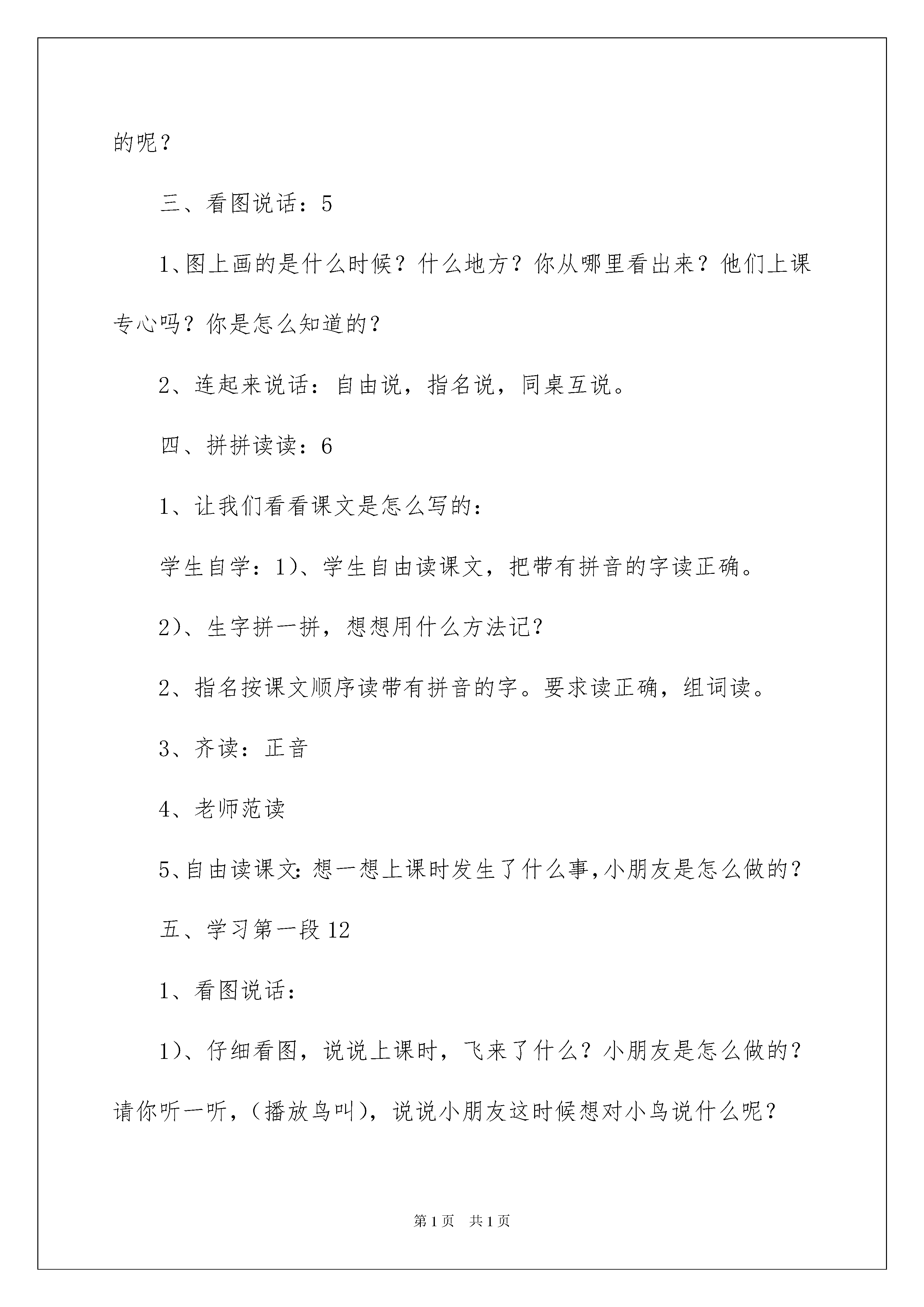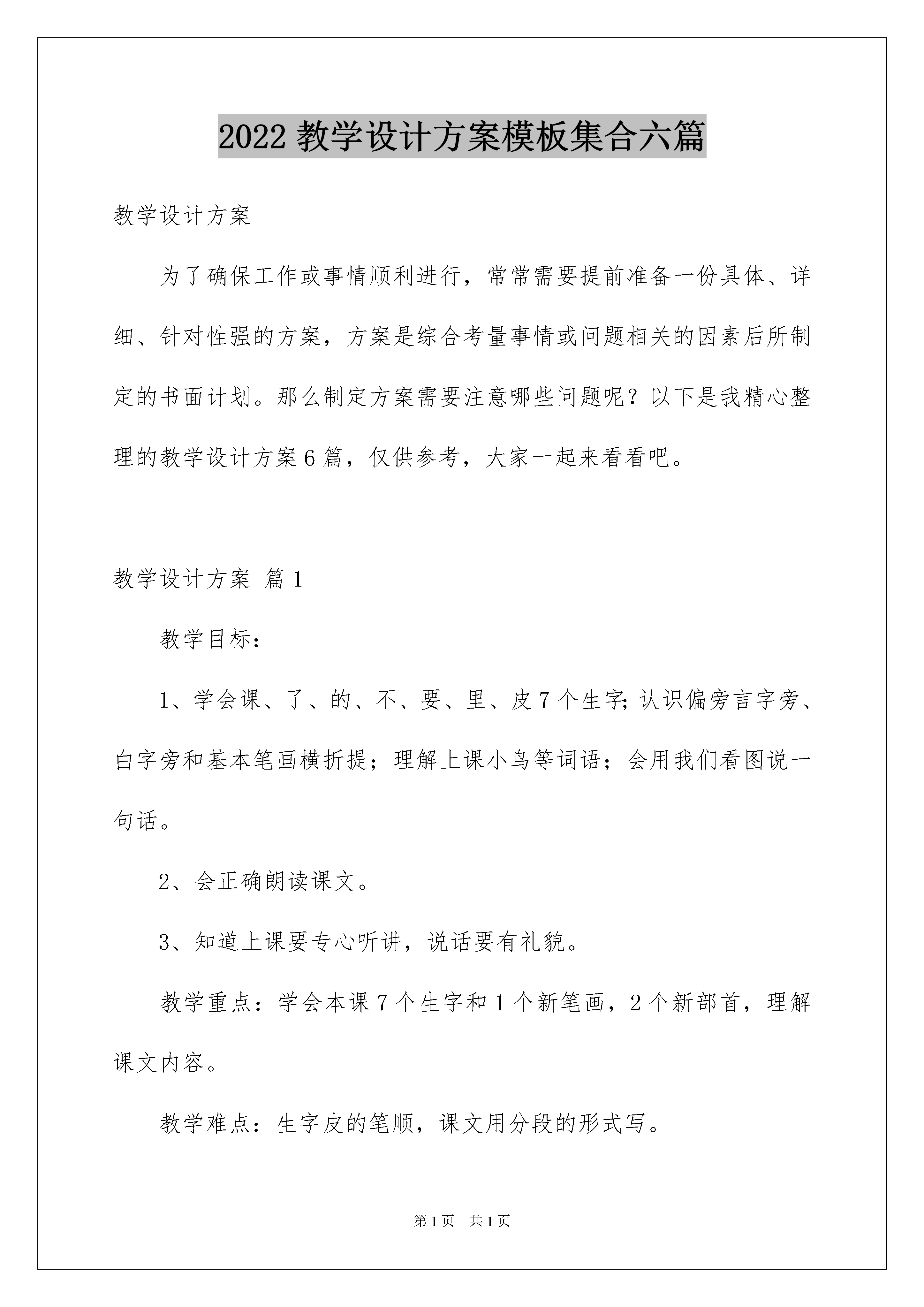 2022教学设计方案模板集合六篇教学设计方案为了确保工作或事情顺利进行,常常需要提前准备一份具体、详细、针对性强的方案,方案是综合考量事情或问题相关的因素后所制定的书面计划。那么制定方案需要注意哪些问题呢?以下是我精心整理的教学设计方案6篇,仅供参考,大家一起来看看吧。教学设计方案篇1教学目标:1、学会课、了、的、不、要、里、皮7个生字;认识偏旁言字旁、白字旁和基本笔画横折提;理解上课小鸟等词语;会用我们看图说一句话。2、会正确朗读课文。3、知道上课要专心听讲,说话要有礼貌。教学重点:学会本课7个生字和1个新笔画,2个新部首,理解课文内容。教学难点:生字皮的笔顺,课文用分段的形式写。教学准备:卡片、录音、投影。教学时间:3课时第一课时教学目标:看图读课文。初步了解课文内容,学习课文第一节及有关字、词。教学过程一、复习41、卡片读生字:女、子、大、上、你、的、好、我们。2、指名认读音节:shubuyaokelechandaiqiushuixiaojiao二、揭示课题:5今天我们学习:5我们上课了1、学生拼读音节后齐读课题2、说说上课了我们应该怎么做呢?3、出示生字课、了4、自己分析字形,认识横折提、言字旁5、齐读课题6、导入:我们上课了是这么做的,那么课文中的小朋友是怎么做的呢?三、看图说话:51、图上画的是什么时候?什么地方?你从哪里看出来?他们上课专心吗?你是怎么知道的?2、连起来说话:自由说,指名说,同桌互说。四、拼拼读读:61、让我们看看课文是怎么写的:学生自学:1)、学生自由读课文,把带有拼音的字读正确。2)、生字拼一拼,想想用什么方法记?2、指名按课文顺序读带有拼音的字。要求读正确,组词读。3、齐读:正音4、老师范读5、自由读课文:想一想上课时发生了什么事,小朋友是怎么做的?五、学习第一段121、看图说话:1)、仔细看图,说说上课时,飞来了什么?小朋友是怎么做的?请你听一听,(播放鸟叫),说说小朋友这时候想对小鸟说什么呢?2)、想象:看到小朋友这样专心,小鸟会怎么想,怎么说呢?2、看看课文中是第几节,指名读第一段,评议3、自由读,想想,再说说:1)、这一段有几句话,这两句话说了一件什么事?2)、学习生字的、不、要学生分析字形认识白字旁,并书空4、朗读这两句话1)、说说这里怎样称呼小鸟,说说吵什么意思?为什么说小鸟的叫声是很吵的呢?2)、用请,说明什么?5、指导朗读:丁丁真是个懂事,有礼貌的孩子,我们在读时用怎样的语气?听录音,自由读,指名读,评议。六、复习巩固41、卡片认读字、词。2、认读白字旁,言字旁并说说它们在哪个字中?七、书写指导41、自己观察生字在田字格中的位置,并说一说。2、试写一个,评议3、抄写生字。第二课时教学目标:朗读课文,进一步了解课文内容,学习课文第二节及有关字、词。教学过程一、复习51、认读生字:开火车读卡片。2、指名读第一段,说说有几句话,说了些什么?二、学习第二节121、自由读一读,想想这节有几句话?读后回答。2、说说这两句话说了一件什么事?学习生字:里:说说用什么办法记?皮说说笔顺,组词3、齐读3、4句话,后出示课件,看图,想一想:1)、皮球会睡觉吗?这是什么意思?2)、请你好好睡一觉中的你是谁?怎样才能使皮球整节课都睡觉呢?3)、这句话里有个请说明了什么?你能不能像丁丁那样,用请说一句话呢?4、丁丁为什么要请皮球好好睡一觉呢?5、指导朗读,好好慢些,轻一些。自由读,指名读,齐读。三、朗读全文,练习说话:121、自己读全文,想想:为什么3、4句话不和一二两句话接在一起呢?2、告诉学生:因为课文说了两件事。第二件事就另起一行写。第一件事,既第一自然段,读完要多停顿一会儿。3、练习说话:1)、看图,说说上课时,谁也来了,小朋友是怎么做的呢?2)、你能不能照前面两节的样子说话呢?出示句式:()的(),请你()。我们()。自由准备,后指名说一说。4、这些小朋友上课真专心,我们再一起读课文。四、书写指导111、指名板书里、皮笔顺,齐书空,说说笔画名称。2、抄写生字:里、皮。五、自己朗读课文,完成作业本3。第三课时教学目标:总结课文,行为指导,作业练习。教学过程:一、复习检查:101、看拼音写词piyikoudailishangkelebuyao()()()()2、口头组词,完成作业本4。3、朗读课文:指名读课文,自由读。齐读。二、总结课文,指导行为101、读了课文,你觉得丁丁是个怎样的孩子?我们要向丁丁学习什么呢?2、完成课后作业第五题1)指名读题2)学生逐条评定后,同桌互评。3)小结三、指导看图用我们说一句话101、读题,说说题目要求2、自由