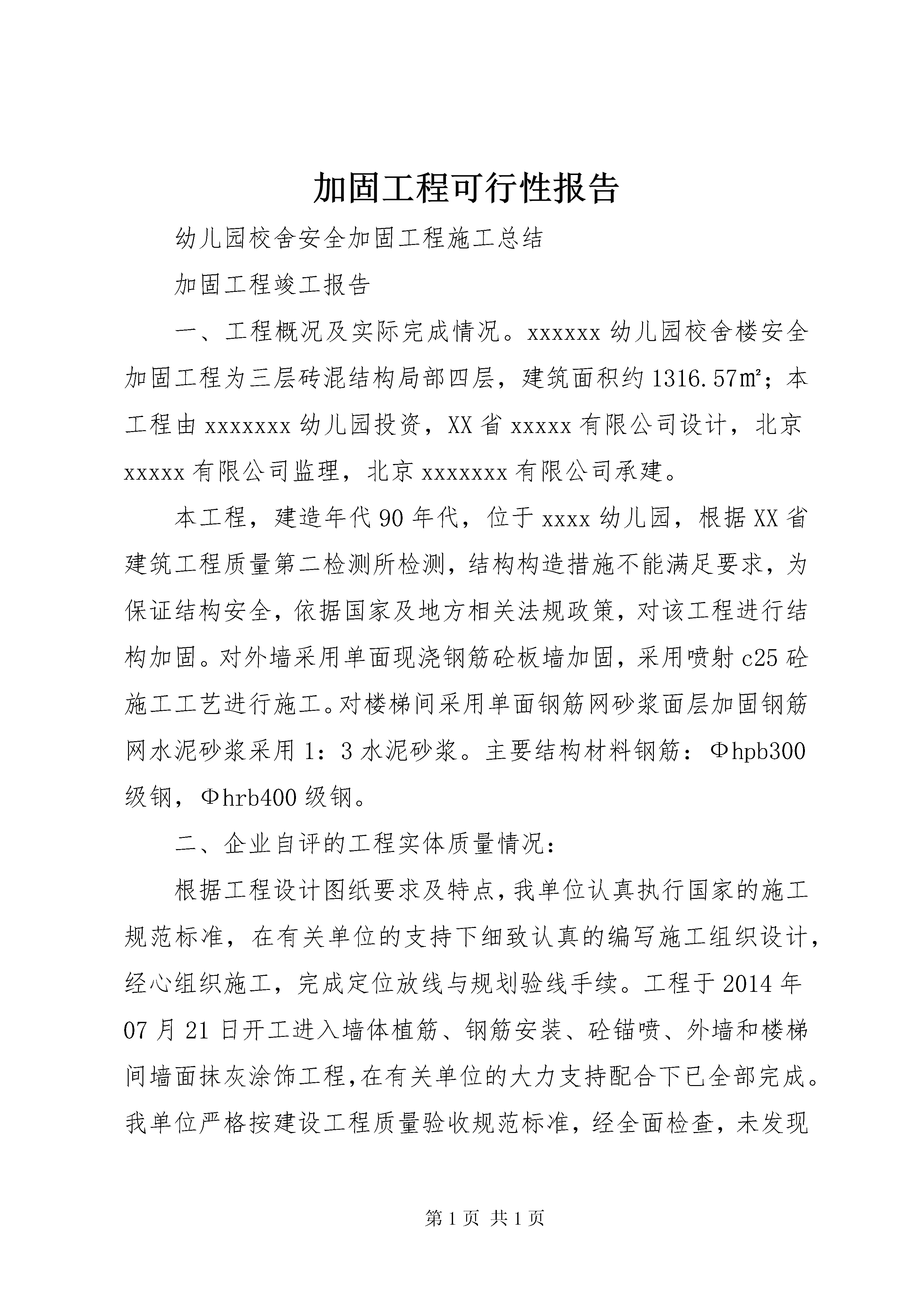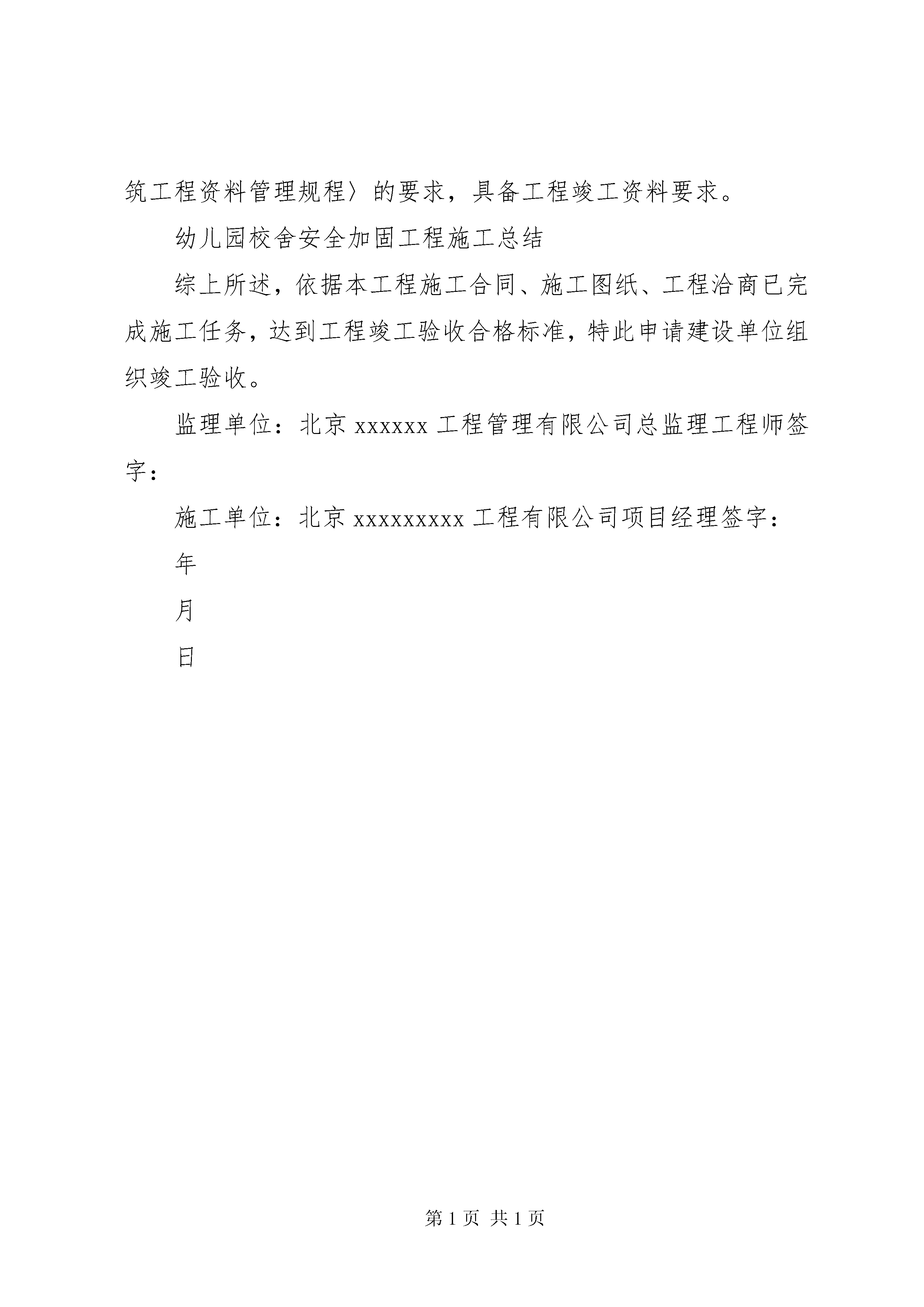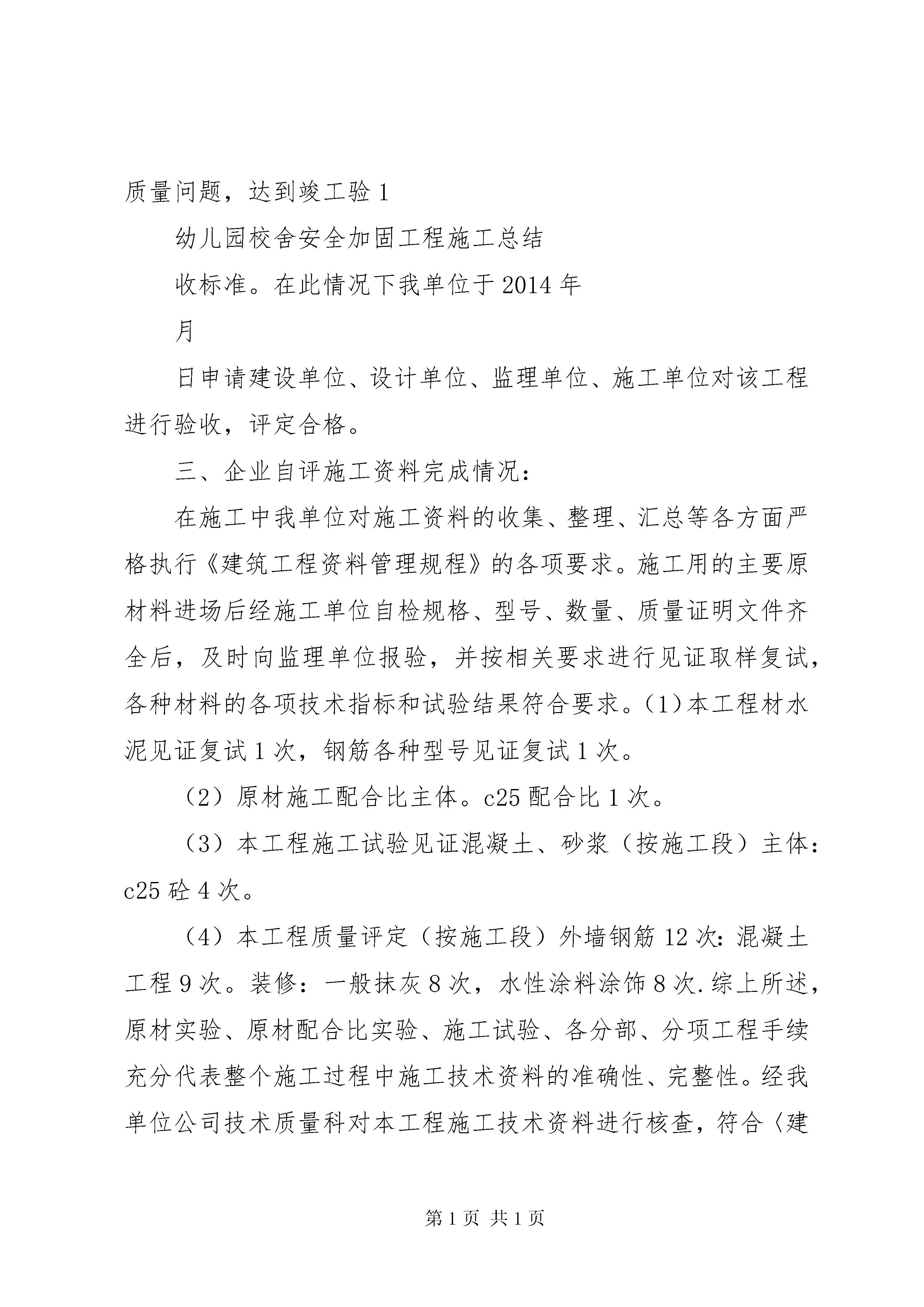 加固工程可行性报告幼儿园校舍安全加固工程施工总结加固工程竣工报告一、工程概况及实际完成情况。xxxxxx幼儿园校舍楼安全加固工程为三层砖混结构局部四层,建筑面积约1316.57㎡;本工程由xxxxxxx幼儿园投资,XX省xxxxx有限公司设计,北京xxxxx有限公司监理,北京xxxxxxx有限公司承建。本工程,建造年代90年代,位于xxxx幼儿园,根据XX省建筑工程质量第二检测所检测,结构构造措施不能满足要求,为保证结构安全,依据国家及地方相关法规政策,对该工程进行结构加固。对外墙采用单面现浇钢筋砼板墙加固,采用喷射c25砼施工工艺进行施工。对楼梯间采用单面钢筋网砂浆面层加固钢筋网水泥砂浆采用1:3水泥砂浆。主要结构材料钢筋:Фhpb300级钢,Фhrb400级钢。二、企业自评的工程实体质量情况:根据工程设计图纸要求及特点,我单位认真执行国家的施工规范标准,在有关单位的支持下细致认真的编写施工组织设计,经心组织施工,完成定位放线与规划验线手续。工程于2014年07月21日开工进入墙体植筋、钢筋安装、砼锚喷、外墙和楼梯间墙面抹灰涂饰工程,在有关单位的大力支持配合下已全部完成。我单位严格按建设工程质量验收规范标准,经全面检查,未发现质量问题,达到竣工验1幼儿园校舍安全加固工程施工总结收标准。在此情况下我单位于2014年月日申请建设单位、设计单位、监理单位、施工单位对该工程进行验收,评定合格。三、企业自评施工资料完成情况:在施工中我单位对施工资料的收集、整理、汇总等各方面严格执行《建筑工程资料管理规程》的各项要求。施工用的主要原材料进场后经施工单位自检规格、型号、数量、质量证明文件齐全后,及时向监理单位报验,并按相关要求进行见证取样复试,各种材料的各项技术指标和试验结果符合要求。(1)本工程材水泥见证复试1次,钢筋各种型号见证复试1次。(2)原材施工配合比主体。c25配合比1次。(3)本工程施工试验见证混凝土、砂浆(按施工段)主体:c25砼4次。(4)本工程质量评定(按施工段)外墙钢筋12次:混凝土工程9次。装修:一般抹灰8次,水性涂料涂饰8次.综上所述,原材实验、原材配合比实验、施工试验、各分部、分项工程手续充分代表整个施工过程中施工技术资料的准确性、完整性。经我单位公司技术质量科对本工程施工技术资料进行核查,符合〈建筑工程资料管理规程〉的要求,具备工程竣工资料要求。幼儿园校舍安全加固工程施工总结综上所述,依据本工程施工合同、施工图纸、工程洽商已完成施工任务,达到工程竣工验收合格标准,特此申请建设单位组织竣工验收。监理单位:北京xxxxxx工程管理有限公司总监理工程师签字:施工单位:北京xxxxxxxxx工程有限公司项目经理签字:年月日