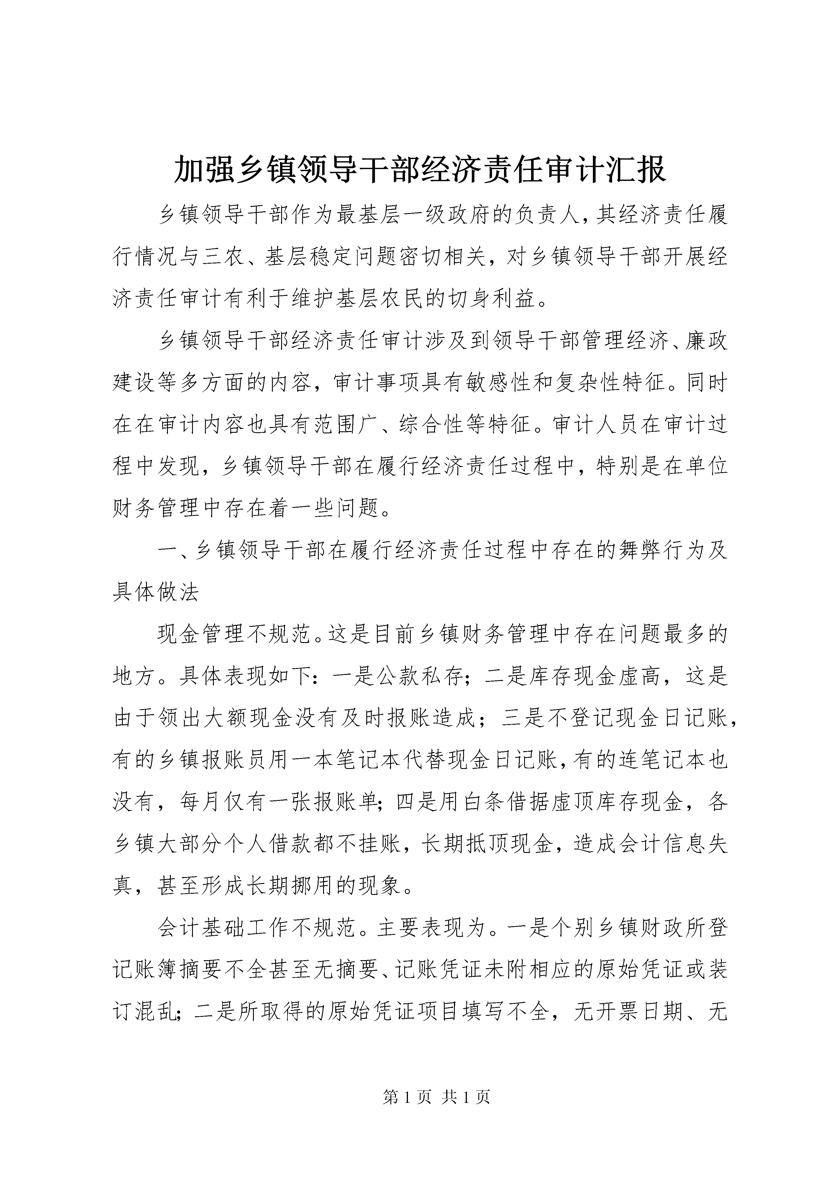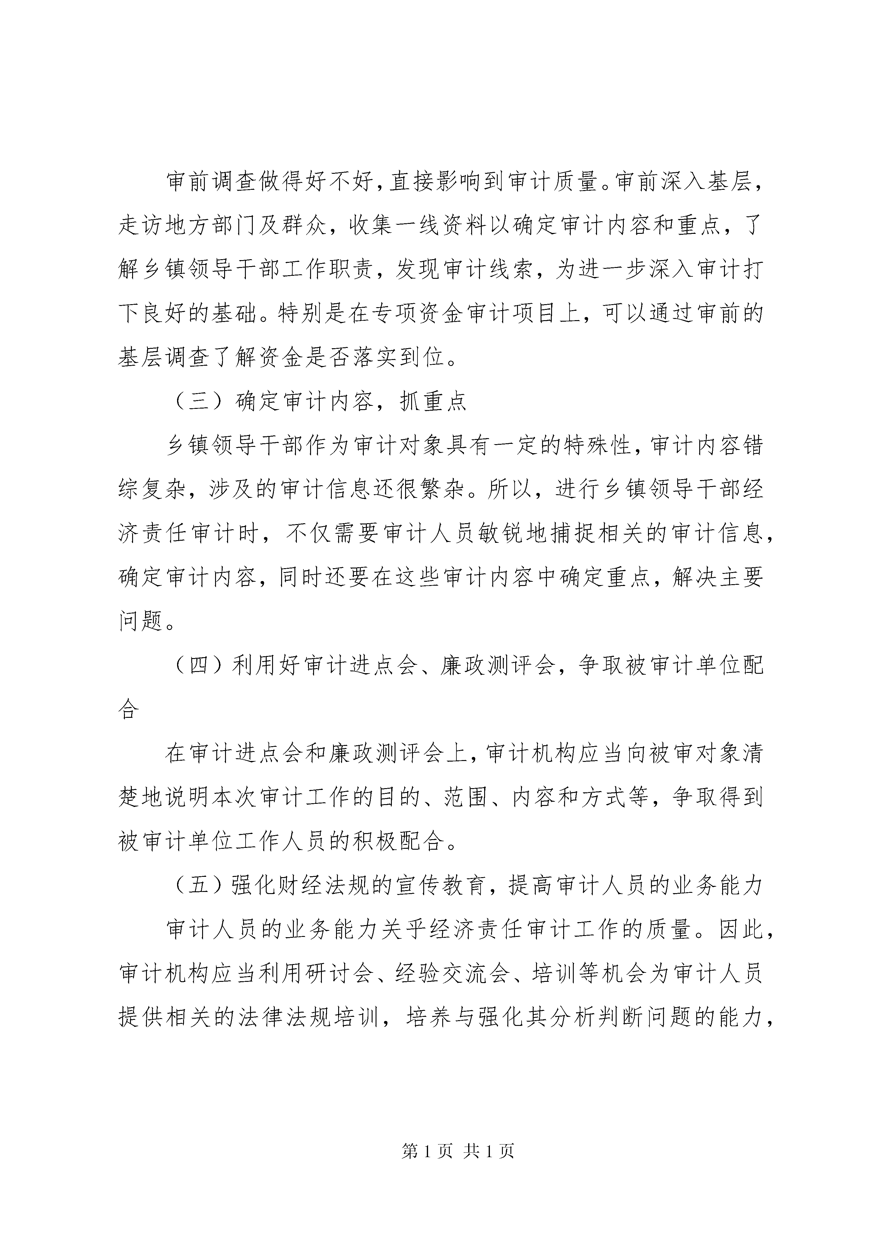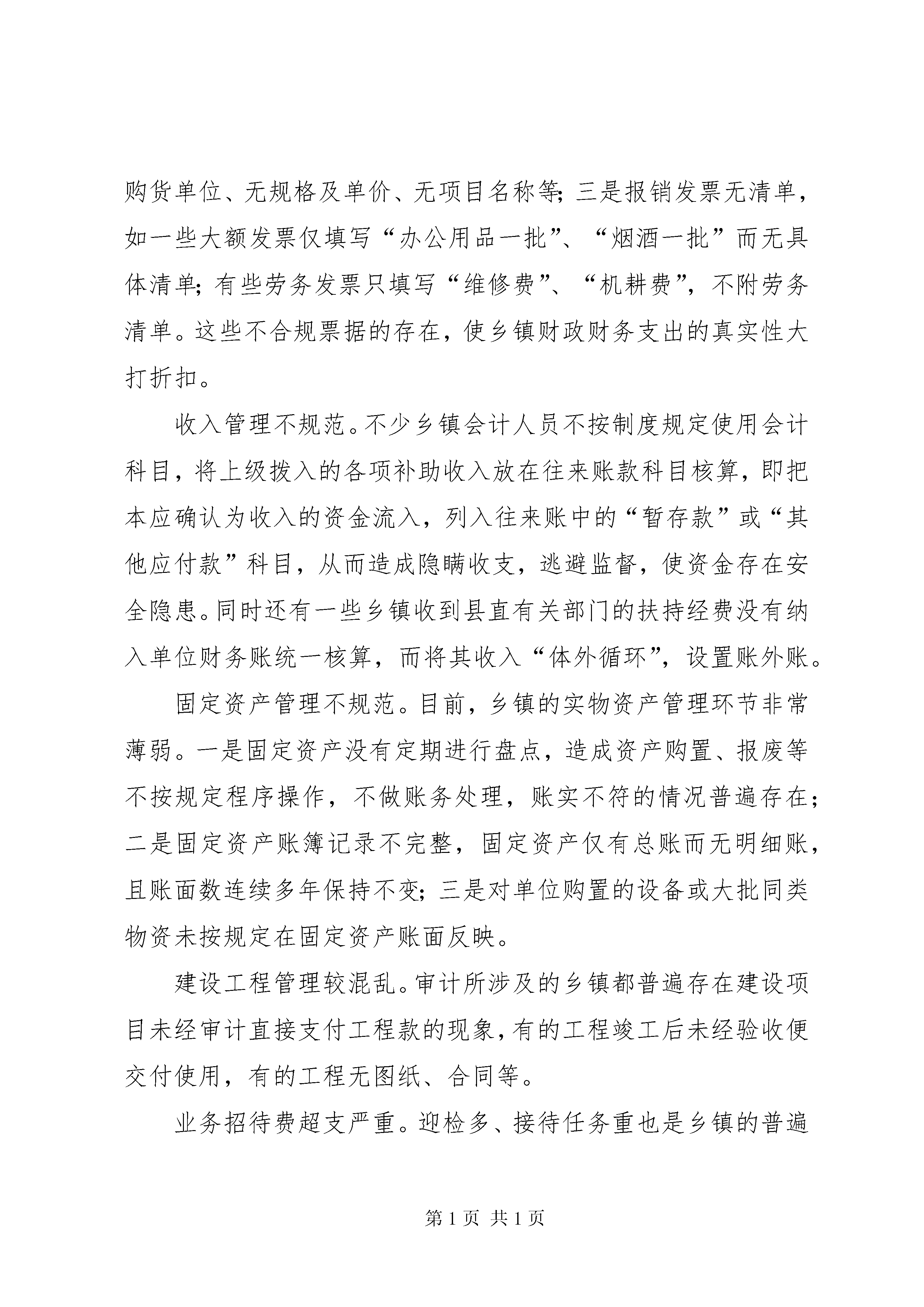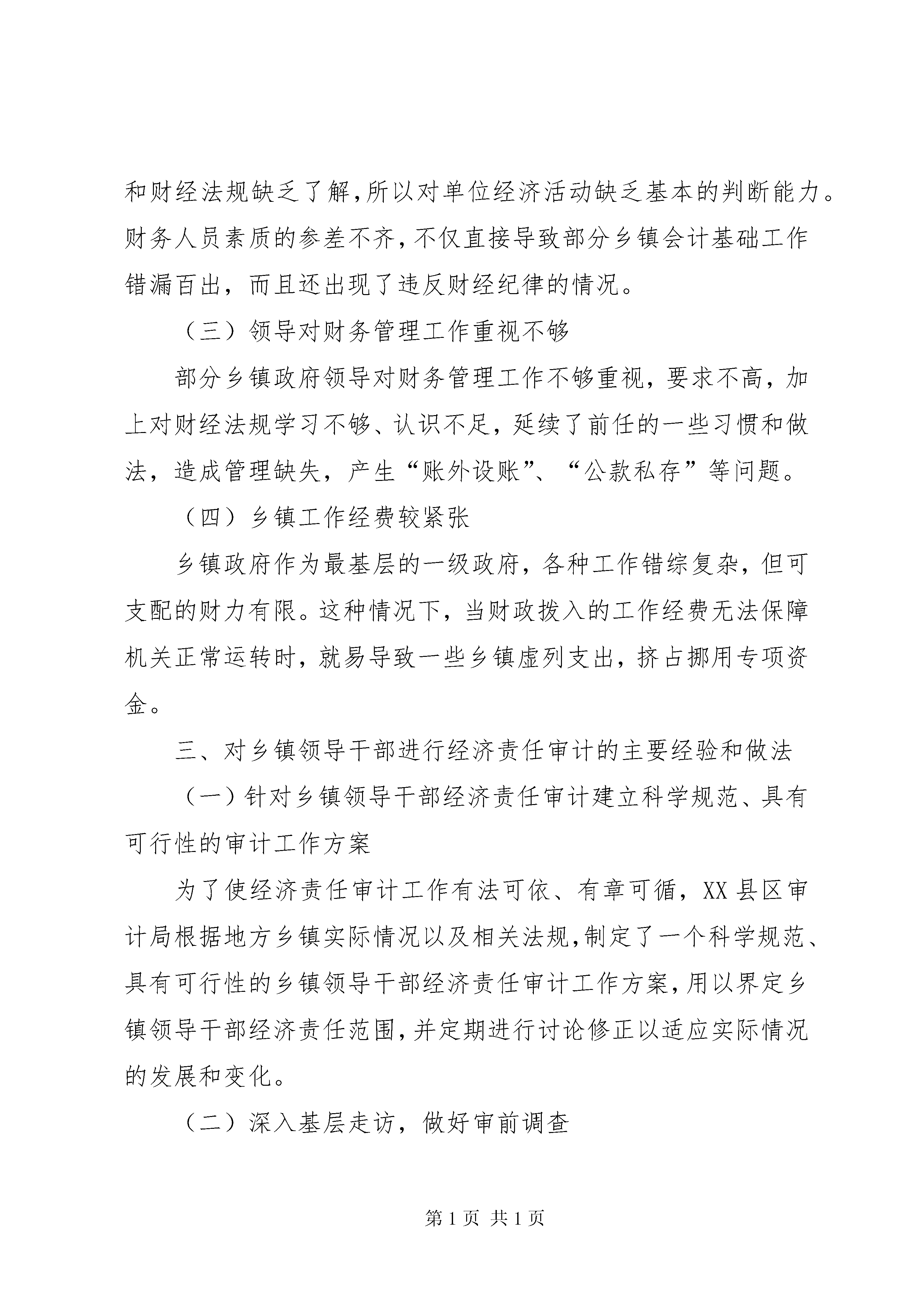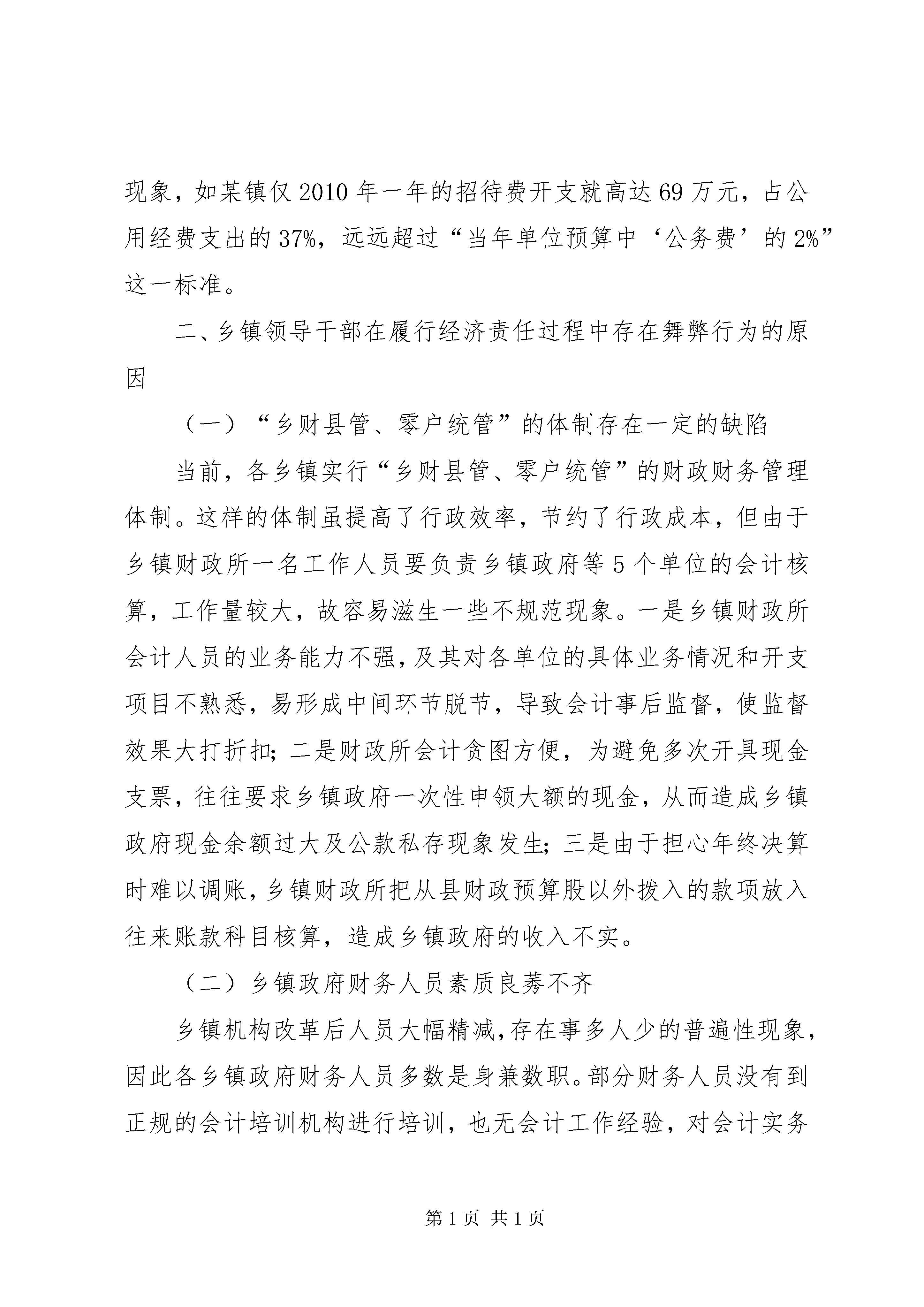 加强乡镇领导干部经济责任审计汇报乡镇领导干部作为最基层一级政府的负责人,其经济责任履行情况与三农、基层稳定问题密切相关,对乡镇领导干部开展经济责任审计有利于维护基层农民的切身利益。乡镇领导干部经济责任审计涉及到领导干部管理经济、廉政建设等多方面的内容,审计事项具有敏感性和复杂性特征。同时在在审计内容也具有范围广、综合性等特征。审计人员在审计过程中发现,乡镇领导干部在履行经济责任过程中,特别是在单位财务管理中存在着一些问题。一、乡镇领导干部在履行经济责任过程中存在的舞弊行为及具体做法现金管理不规范。这是目前乡镇财务管理中存在问题最多的地方。具体表现如下:一是公款私存;二是库存现金虚高,这是由于领出大额现金没有及时报账造成;三是不登记现金日记账,有的乡镇报账员用一本笔记本代替现金日记账,有的连笔记本也没有,每月仅有一张报账单;四是用白条借据虚顶库存现金,各乡镇大部分个人借款都不挂账,长期抵顶现金,造成会计信息失真,甚至形成长期挪用的现象。会计基础工作不规范。主要表现为。一是个别乡镇财政所登记账簿摘要不全甚至无摘要、记账凭证未附相应的原始凭证或装订混乱;二是所取得的原始凭证项目填写不全,无开票日期、无购货单位、无规格及单价、无项目名称等;三是报销发票无清单,如一些大额发票仅填写“办公用品一批”、“烟酒一批”而无具体清单;有些劳务发票只填写“维修费”、“机耕费”,不附劳务清单。这些不合规票据的存在,使乡镇财政财务支出的真实性大打折扣。收入管理不规范。不少乡镇会计人员不按制度规定使用会计科目,将上级拨入的各项补助收入放在往来账款科目核算,即把本应确认为收入的资金流入,列入往来账中的“暂存款”或“其他应付款”科目,从而造成隐瞒收支,逃避监督,使资金存在安全隐患。同时还有一些乡镇收到县直有关部门的扶持经费没有纳入单位财务账统一核算,而将其收入“体外循环”,设置账外账。固定资产管理不规范。目前,乡镇的实物资产管理环节非常薄弱。一是固定资产没有定期进行盘点,造成资产购置、报废等不按规定程序操作,不做账务处理,账实不符的情况普遍存在;二是固定资产账簿记录不完整,固定资产仅有总账而无明细账,且账面数连续多年保持不变;三是对单位购置的设备或大批同类物资未按规定在固定资产账面反映。建设工程管理较混乱。审计所涉及的乡镇都普遍存在建设项目未经审计直接支付工程款的现象,有的工程竣工后未经验收便交付使用,有的工程无图纸、合同等。业务招待费超支严重。迎检多、接待任务重也是乡镇的普遍现象,如某镇仅2010年一年的招待费开支就高达69万元,占公用经费支出的37%,远远超过“当年单位预算中‘公务费’的2%”这一标准。二、乡镇领导干部在履行经济责任过程中存在舞弊行为的原因(一)“乡财县管、零户统管”的体制存在一定的缺陷当前,各乡镇实行“乡财县管、零户统管”的财政财务管理体制。这样的体制虽提高了行政效率,节约了行政成本,但由于乡镇财政所一名工作人员要负责乡镇政府等5个单位的会计核算,工作量较大,故容易滋生一些不规范现象。一是乡镇财政所会计人员的业务能力不强,及其对各单位的具体业务情况和开支项目不熟悉,易形成中间环节脱节,导致会计事后监督,使监督效果大打折扣;二是财政所会计贪图方便,为避免多次开具现金支票,往往要求乡镇政府一次性申领大额的现金,从而造成乡镇政府现金余额过大及公款私存现象发生;三是由于担心年终决算时难以调账,乡镇财政所把从县财政预算股以外拨入的款项放入往来账款科目核算,造成乡镇政府的收入不实。(二)乡镇政府财务人员素质良莠不齐乡镇机构改革后人员大幅精减,存在事多人少的普遍性现象,因此各乡镇政府财务人员多数是身兼数职。部分财务人员没有到正规的会计培训机构进行培训,也无会计工作经验,对会计实务和财经法规缺乏了解,所以对单位经济活动缺乏基本的判断能力。财务人员素质的参差不齐,不仅直接导致部分乡镇会计基础工作错漏百出,而且还出现了违反财经纪律的情况。(三)领导对财务管理工作重视不够部分乡镇政府领导对财务管理工作不够重视,要求不高,加上对财经法规学习不够、认识不足,延续了前任的一些习惯和做法,造成管理缺失,产生“账外设账”、“公款私存”等问题。(四)乡镇工作经费较紧张乡镇政府作为最基层的一级政府,各种工作错综复杂,但可支配的财力有限。这种情况下,当财政拨入的工作经费无法保障机关正常运转时,就易导致一些乡镇虚列支出,挤占挪用专项资金。三、对乡镇领导干部进行经济责任审计的主要经验和做法(一)针对乡镇领导干部经济责任审计建立科学规范、具有可行性的审计工作方案为了使经济责任审计工作有法可依、有章可循,XX县区审计局根据地方乡镇实际情况以及相关法规,制定了一个科学规范、具有可行性的乡镇领导干部经济责任审计工作方案,用以界定乡镇领导干部经济责任范围,并定期