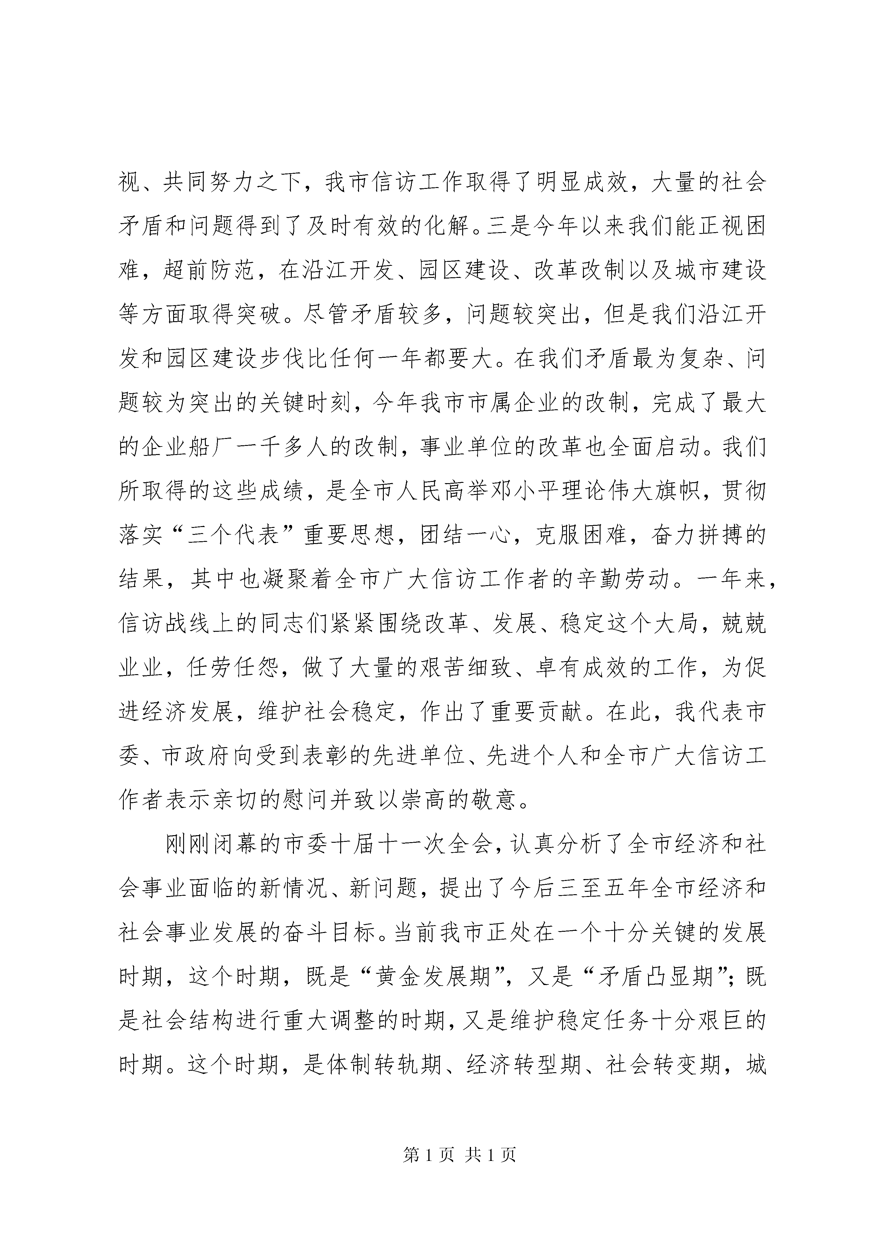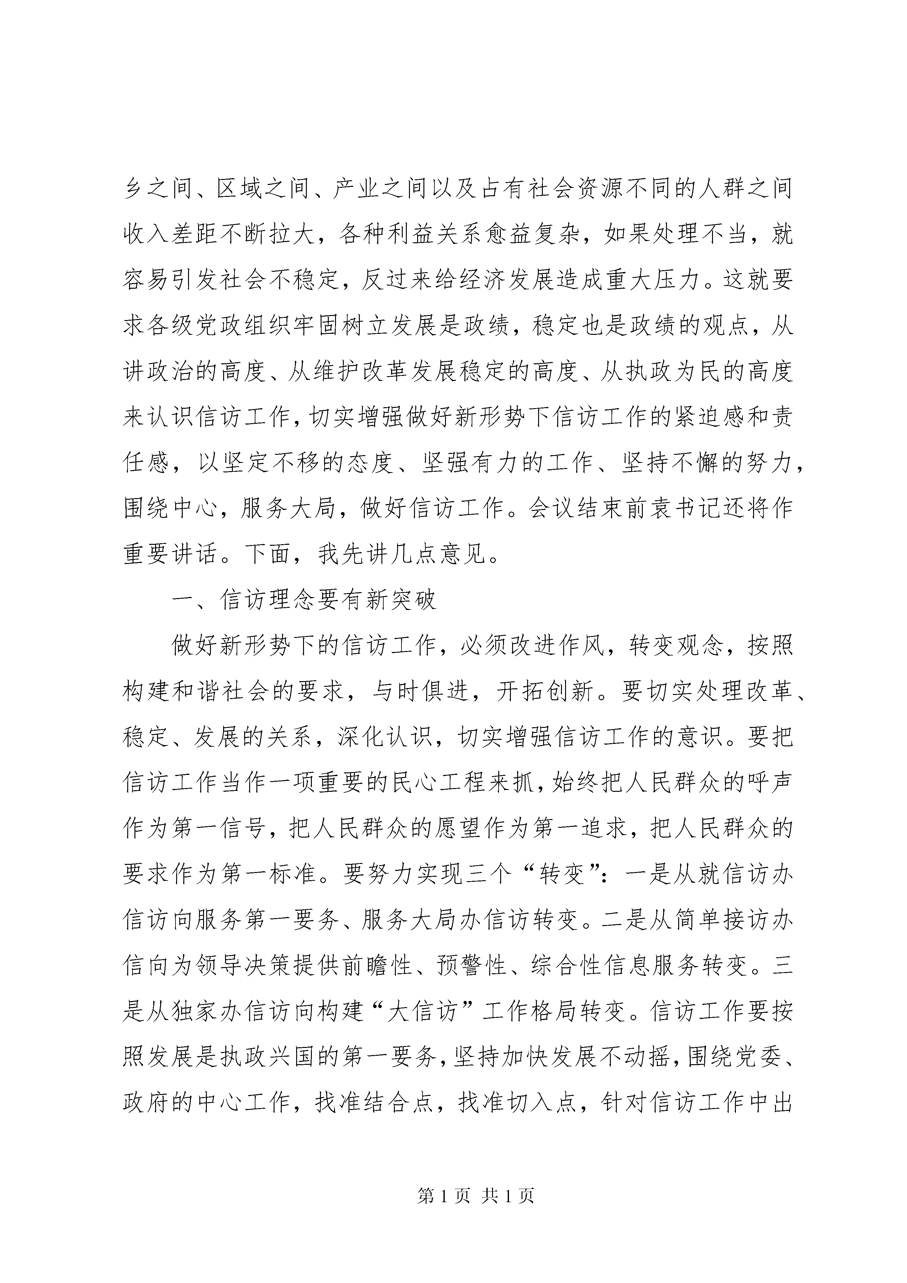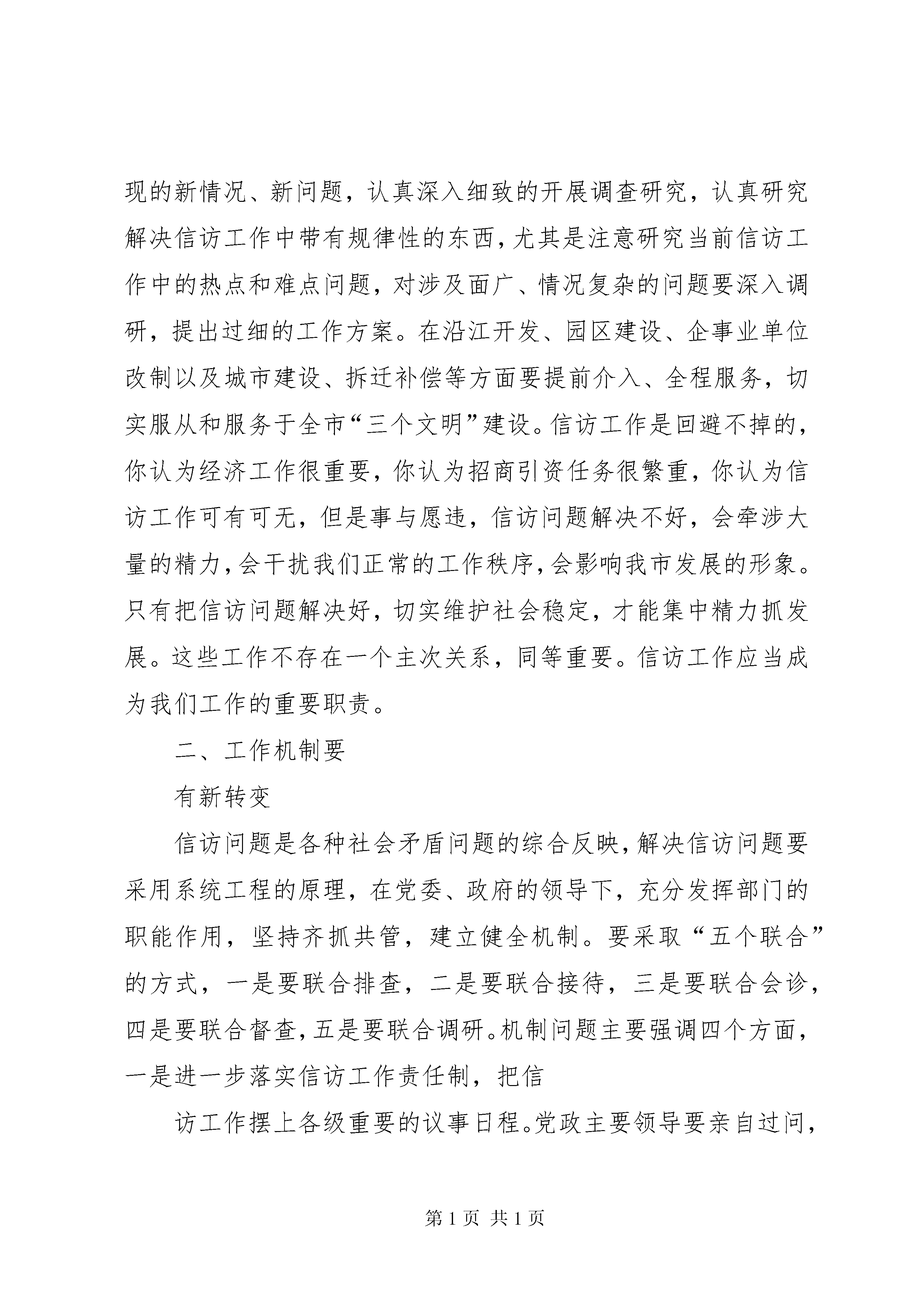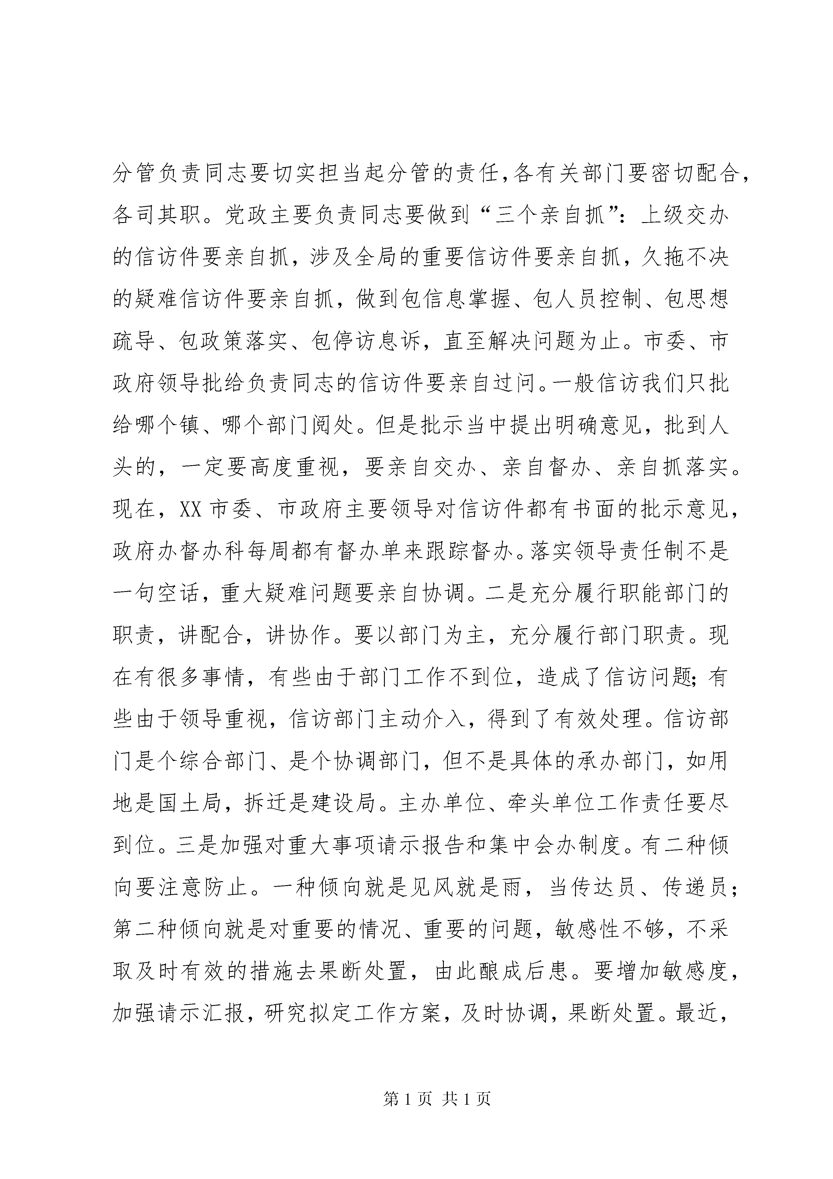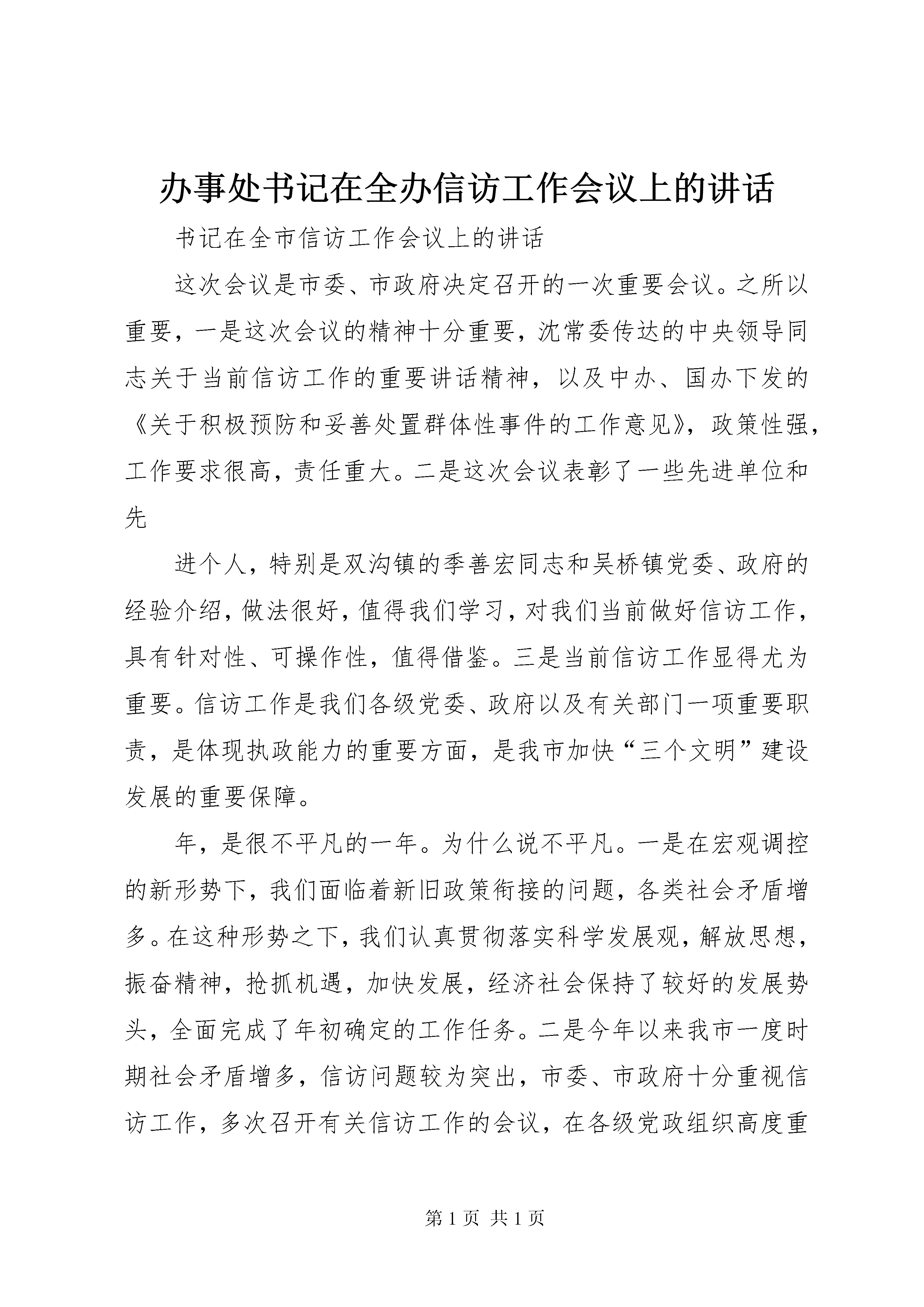 办事处书记在全办信访工作会议上的讲话书记在全市信访工作会议上的讲话这次会议是市委、市政府决定召开的一次重要会议。之所以重要,一是这次会议的精神十分重要,沈常委传达的中央领导同志关于当前信访工作的重要讲话精神,以及中办、国办下发的《关于积极预防和妥善处置群体性事件的工作意见》,政策性强,工作要求很高,责任重大。二是这次会议表彰了一些先进单位和先进个人,特别是双沟镇的季善宏同志和吴桥镇党委、政府的经验介绍,做法很好,值得我们学习,对我们当前做好信访工作,具有针对性、可操作性,值得借鉴。三是当前信访工作显得尤为重要。信访工作是我们各级党委、政府以及有关部门一项重要职责,是体现执政能力的重要方面,是我市加快“三个文明”建设发展的重要保障。年,是很不平凡的一年。为什么说不平凡。一是在宏观调控的新形势下,我们面临着新旧政策衔接的问题,各类社会矛盾增多。在这种形势之下,我们认真贯彻落实科学发展观,解放思想,振奋精神,抢抓机遇,加快发展,经济社会保持了较好的发展势头,全面完成了年初确定的工作任务。二是今年以来我市一度时期社会矛盾增多,信访问题较为突出,市委、市政府十分重视信访工作,多次召开有关信访工作的会议,在各级党政组织高度重视、共同努力之下,我市信访工作取得了明显成效,大量的社会矛盾和问题得到了及时有效的化解。三是今年以来我们能正视困难,超前防范,在沿江开发、园区建设、改革改制以及城市建设等方面取得突破。尽管矛盾较多,问题较突出,但是我们沿江开发和园区建设步伐比任何一年都要大。在我们矛盾最为复杂、问题较为突出的关键时刻,今年我市市属企业的改制,完成了最大的企业船厂一千多人的改制,事业单位的改革也全面启动。我们所取得的这些成绩,是全市人民高举邓小平理论伟大旗帜,贯彻落实“三个代表”重要思想,团结一心,克服困难,奋力拼搏的结果,其中也凝聚着全市广大信访工作者的辛勤劳动。一年来,信访战线上的同志们紧紧围绕改革、发展、稳定这个大局,兢兢业业,任劳任怨,做了大量的艰苦细致、卓有成效的工作,为促进经济发展,维护社会稳定,作出了重要贡献。在此,我代表市委、市政府向受到表彰的先进单位、先进个人和全市广大信访工作者表示亲切的慰问并致以崇高的敬意。刚刚闭幕的市委十届十一次全会,认真分析了全市经济和社会事业面临的新情况、新问题,提出了今后三至五年全市经济和社会事业发展的奋斗目标。当前我市正处在一个十分关键的发展时期,这个时期,既是“黄金发展期”,又是“矛盾凸显期”;既是社会结构进行重大调整的时期,又是维护稳定任务十分艰巨的时期。这个时期,是体制转轨期、经济转型期、社会转变期,城乡之间、区域之间、产业之间以及占有社会资源不同的人群之间收入差距不断拉大,各种利益关系愈益复杂,如果处理不当,就容易引发社会不稳定,反过来给经济发展造成重大压力。这就要求各级党政组织牢固树立发展是政绩,稳定也是政绩的观点,从讲政治的高度、从维护改革发展稳定的高度、从执政为民的高度来认识信访工作,切实增强做好新形势下信访工作的紧迫感和责任感,以坚定不移的态度、坚强有力的工作、坚持不懈的努力,围绕中心,服务大局,做好信访工作。会议结束前袁书记还将作重要讲话。下面,我先讲几点意见。一、信访理念要有新突破做好新形势下的信访工作,必须改进作风,转变观念,按照构建和谐社会的要求,与时俱进,开拓创新。要切实处理改革、稳定、发展的关系,深化认识,切实增强信访工作的意识。要把信访工作当作一项重要的民心工程来抓,始终把人民群众的呼声作为第一信号,把人民群众的愿望作为第一追求,把人民群众的要求作为第一标准。要努力实现三个“转变”:一是从就信访办信访向服务第一要务、服务大局办信访转变。二是从简单接访办信向为领导决策提供前瞻性、预警性、综合性信息服务转变。三是从独家办信访向构建“大信访”工作格局转变。信访工作要按照发展是执政兴国的第一要务,坚持加快发展不动摇,围绕党委、政府的中心工作,找准结合点,找准切入点,针对信访工作中出现的新情况、新问题,认真深入细致的开展调查研究,认真研究解决信访工作中带有规律性的东西,尤其是注意研究当前信访工作中的热点和难点问题,对涉及面广、情况复杂的问题要深入调研,提出过细的工作方案。在沿江开发、园区建设、企事业单位改制以及城市建设、拆迁补偿等方面要提前介入、全程服务,切实服从和服务于全市“三个文明”建设。信访工作是回避不掉的,你认为经济工作很重要,你认为招商引资任务很繁重,你认为信访工作可有可无,但是事与愿违,信访问题解决不好,会牵涉大量的精力,会干扰我们正常的工作秩序,会影响我市发展的形象。只有把信访问题解决好,切实维护社会稳定,才能集中精力抓发展。这些工作不存在一个主次关系,同等重要。信访工作应当成为我们工作的重要职责。二、工作机制要有新转变信访问题是各