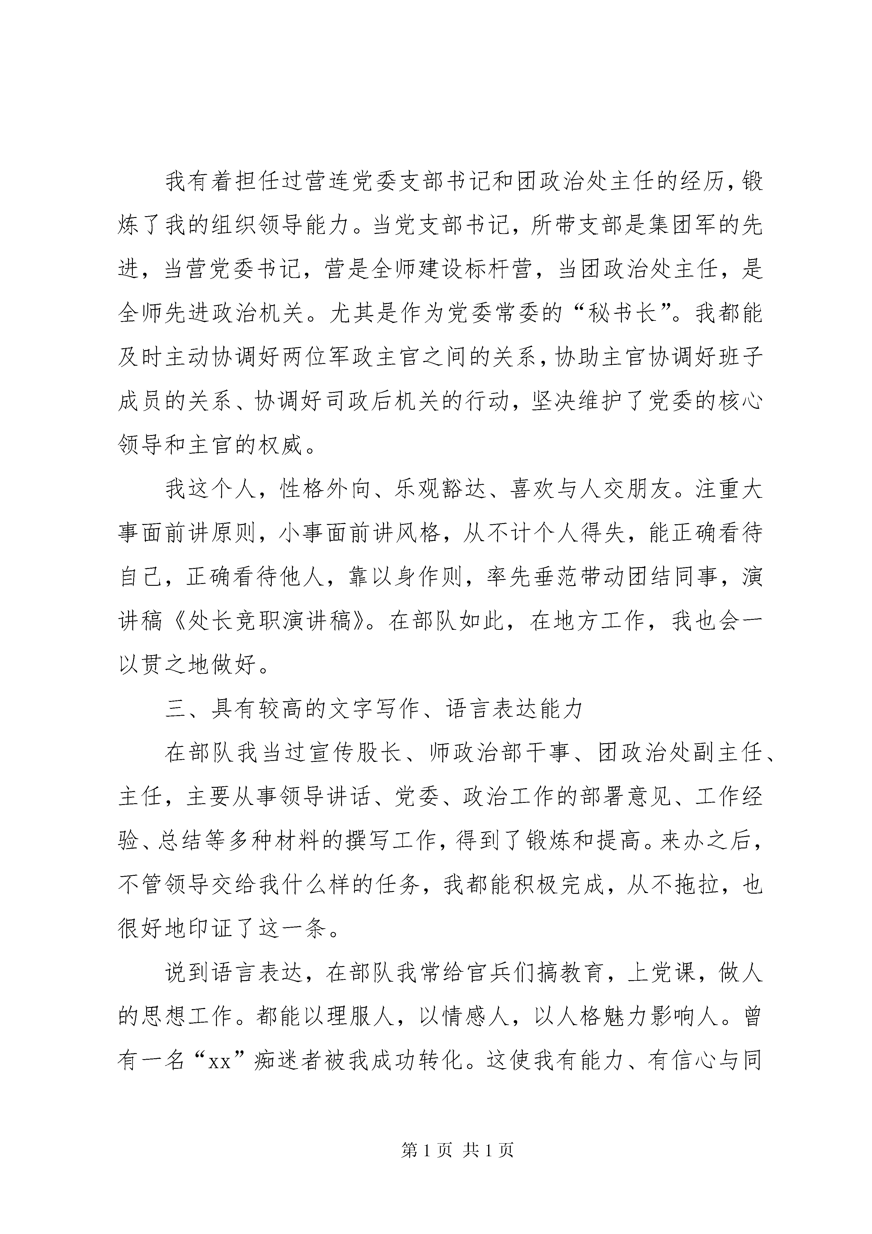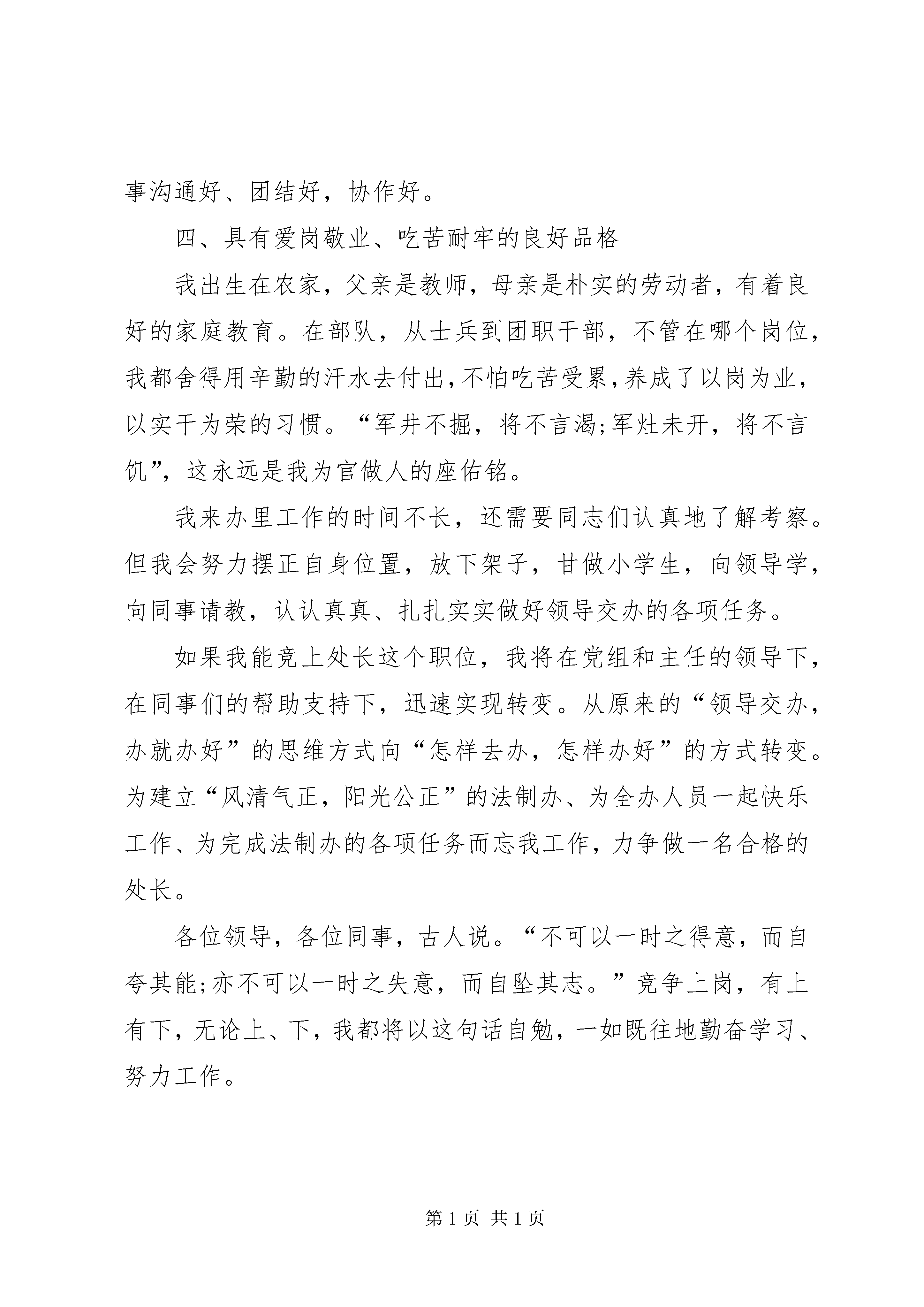 办公厅处长竞职演讲2013年竟职处长演讲稿(最新篇)。在部队我当过宣传股长、师政治部干事、团政治处副主任、主任,主要从事领导讲话、党委、政治工作的部署意见、工作经验、总结等多种材料的撰写工作,得到了锻炼和提高,处长竞职演讲稿。来办之后,不管领导交给我什么样的任务,我都能积极完成,从不拖拉,也很好地印证了这一条。尊敬的各位领导,各位同事:大家好。首先感谢党组给予我竞职演说的机会。今天,我要竞选的职位是处长。通过对我办工作性质和职能特点的理解,我感到我有四点优势:一、具有较好的讲政治,讲政策、听招呼、守规矩的能力。“服从命令是军人的天职”,我是一名有着22年兵龄的军人,养成了令行禁止的思维和行为习惯。在实际工作中,做到了:只要党委有号召,我就有自觉行动;只要领导有指示,我就能坚决落实。说到讲政治、讲政策,绝对不是盲从。我习惯于把对上负责与对下负责一致起来,通过对下负责来落实对上负责,我想这是科学发展观人本思想在政治上的最好体现。这一点,在任何时候,任何岗位都动摇不得。二、具有较强的组织领导和沟通协调能力我有着担任过营连党委支部书记和团政治处主任的经历,锻炼了我的组织领导能力。当党支部书记,所带支部是集团军的先进,当营党委书记,营是全师建设标杆营,当团政治处主任,是全师先进政治机关。尤其是作为党委常委的“秘书长”。我都能及时主动协调好两位军政主官之间的关系,协助主官协调好班子成员的关系、协调好司政后机关的行动,坚决维护了党委的核心领导和主官的权威。我这个人,性格外向、乐观豁达、喜欢与人交朋友。注重大事面前讲原则,小事面前讲风格,从不计个人得失,能正确看待自己,正确看待他人,靠以身作则,率先垂范带动团结同事,演讲稿《处长竞职演讲稿》。在部队如此,在地方工作,我也会一以贯之地做好。三、具有较高的文字写作、语言表达能力在部队我当过宣传股长、师政治部干事、团政治处副主任、主任,主要从事领导讲话、党委、政治工作的部署意见、工作经验、总结等多种材料的撰写工作,得到了锻炼和提高。来办之后,不管领导交给我什么样的任务,我都能积极完成,从不拖拉,也很好地印证了这一条。说到语言表达,在部队我常给官兵们搞教育,上党课,做人的思想工作。都能以理服人,以情感人,以人格魅力影响人。曾有一名“xx”痴迷者被我成功转化。这使我有能力、有信心与同事沟通好、团结好,协作好。四、具有爱岗敬业、吃苦耐牢的良好品格我出生在农家,父亲是教师,母亲是朴实的劳动者,有着良好的家庭教育。在部队,从士兵到团职干部,不管在哪个岗位,我都舍得用辛勤的汗水去付出,不怕吃苦受累,养成了以岗为业,以实干为荣的习惯。“军井不掘,将不言渴;军灶未开,将不言饥”,这永远是我为官做人的座佑铭。我来办里工作的时间不长,还需要同志们认真地了解考察。但我会努力摆正自身位置,放下架子,甘做小学生,向领导学,向同事请教,认认真真、扎扎实实做好领导交办的各项任务。如果我能竞上处长这个职位,我将在党组和主任的领导下,在同事们的帮助支持下,迅速实现转变。从原来的“领导交办,办就办好”的思维方式向“怎样去办,怎样办好”的方式转变。为建立“风清气正,阳光公正”的法制办、为全办人员一起快乐工作、为完成法制办的各项任务而忘我工作,力争做一名合格的处长。各位领导,各位同事,古人说。“不可以一时之得意,而自夸其能;亦不可以一时之失意,而自坠其志。”竞争上岗,有上有下,无论上、下,我都将以这句话自勉,一如既往地勤奋学习、努力工作。