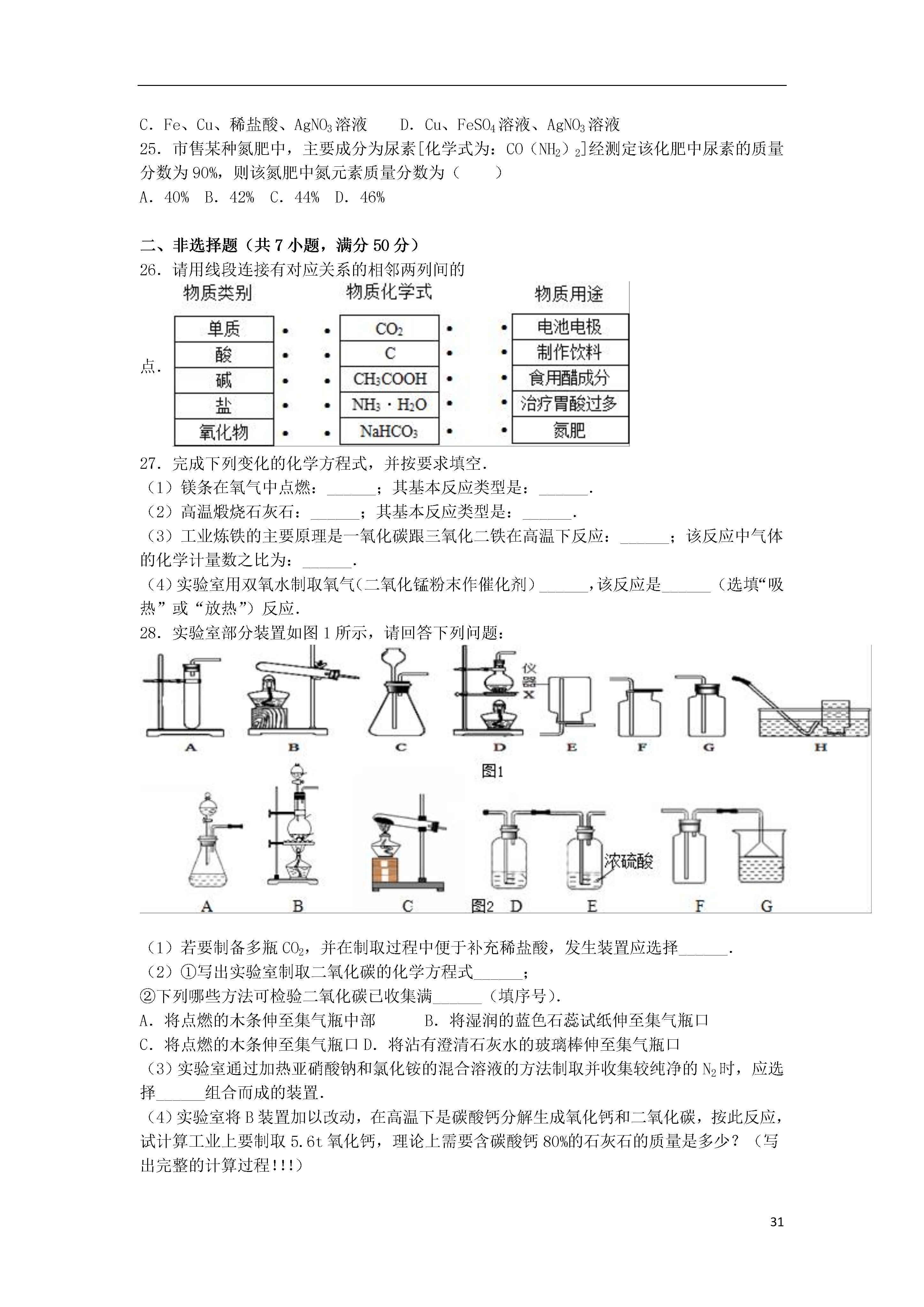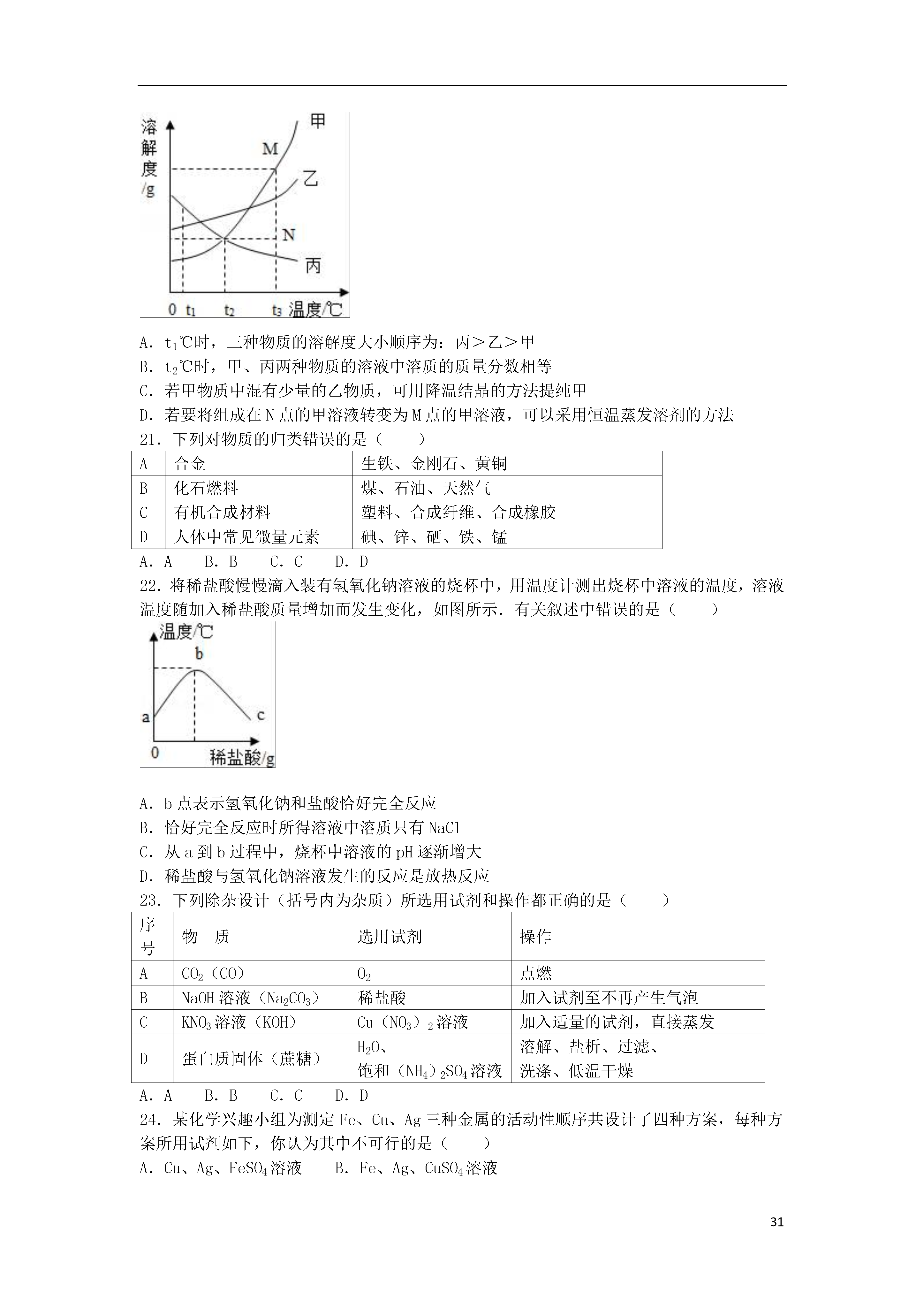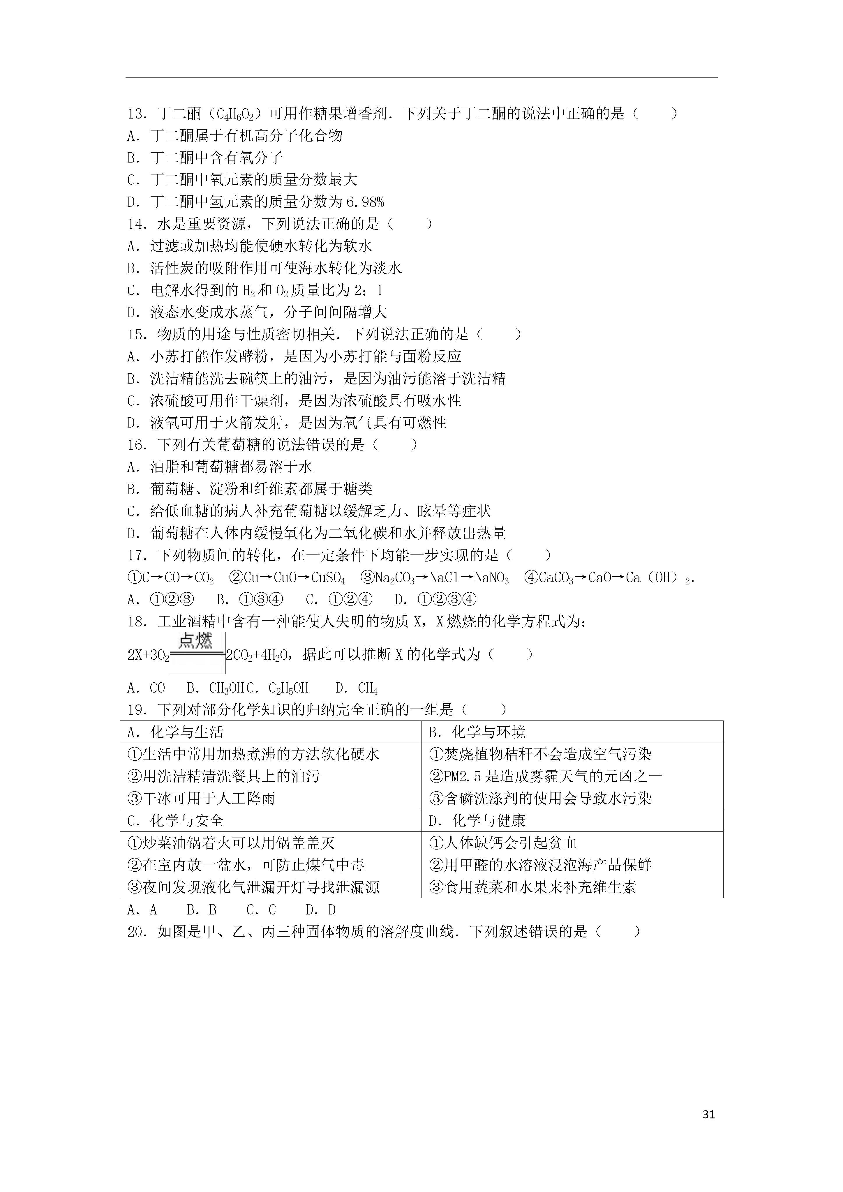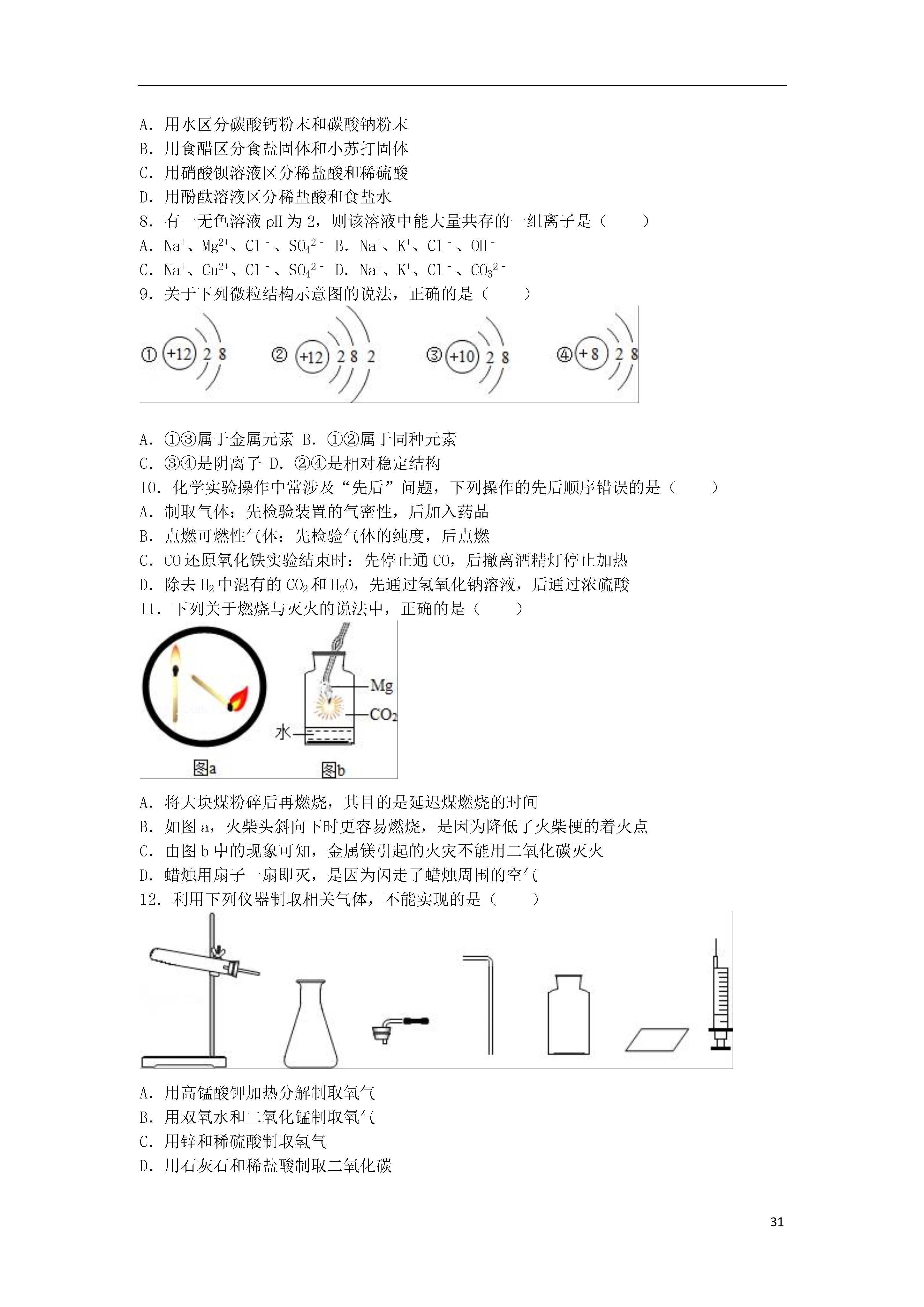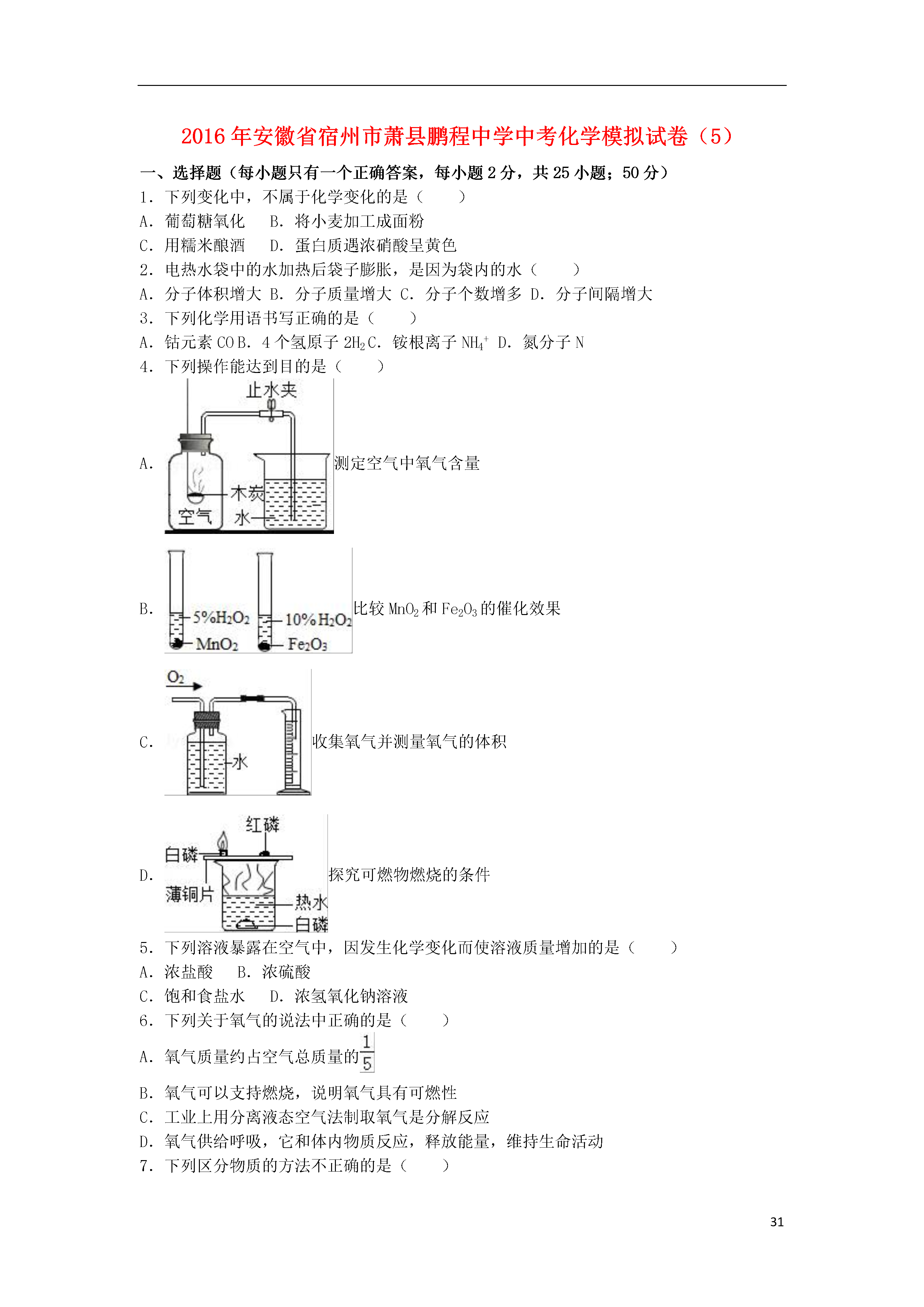 312016年安徽省宿州市萧县鹏程中学中考化学模拟试卷(5)一、选择题(每小题只有一个正确答案,每小题2分,共25小题;50分)1.下列变化中,不属于化学变化的是()A.葡萄糖氧化B.将小麦加工成面粉C.用糯米酿酒D.蛋白质遇浓硝酸呈黄色2.电热水袋中的水加热后袋子膨胀,是因为袋内的水()A.分子体积增大B.分子质量增大C.分子个数增多D.分子间隔增大3.下列化学用语书写正确的是()A.钴元素COB.4个氢原子2H2C.铵根离子NH4+D.氮分子N4.下列操作能达到目的是()A.测定空气中氧气含量B.比较MnO2和Fe2O3的催化效果C.收集氧气并测量氧气的体积D.探究可燃物燃烧的条件5.下列溶液暴露在空气中,因发生化学变化而使溶液质量增加的是()A.浓盐酸B.浓硫酸C.饱和食盐水D.浓氢氧化钠溶液6.下列关于氧气的说法中正确的是()A.氧气质量约占空气总质量的B.氧气可以支持燃烧,说明氧气具有可燃性C.工业上用分离液态空气法制取氧气是分解反应D.氧气供给呼吸,它和体内物质反应,释放能量,维持生命活动7.下列区分物质的方法不正确的是()A.用水区分碳酸钙粉末和碳酸钠粉末B.用食醋区分食盐固体和小苏打固体C.用硝酸钡溶液区分稀盐酸和稀硫酸D.用酚酞溶液区分稀盐酸和食盐水8.有一无色溶液pH为2,则该溶液中能大量共存的一组离子是()A.Na+、Mg2+、Cl﹣、SO42﹣B.Na+、K+、Cl﹣、OH﹣C.Na+、Cu2+、Cl﹣、SO42﹣D.Na+、K+、Cl﹣、CO32﹣9.关于下列微粒结构示意图的说法,正确的是()A.①③属于金属元素B.①②属于同种元素C.③④是阴离子D.②④是相对稳定结构10.化学实验操作中常涉及“先后”问题,下列操作的先后顺序错误的是()A.制取气体:先检验装置的气密性,后加入药品B.点燃可燃性气体:先检验气体的纯度,后点燃C.CO还原氧化铁实验结束时:先停止通CO,后撤离酒精灯停止加热D.除去H2中混有的CO2和H2O,先通过氢氧化钠溶液,后通过浓硫酸11.下列关于燃烧与灭火的说法中,正确的是()A.将大块煤粉碎后再燃烧,其目的是延迟煤燃烧的时间B.如图a,火柴头斜向下时更容易燃烧,是因为降低了火柴梗的着火点C.由图b中的现象可知,金属镁引起的火灾不能用二氧化碳灭火D.蜡烛用扇子一扇即灭,是因为闪走了蜡烛周围的空气12.利用下列仪器制取相关气体,不能实现的是()A.用高锰酸钾加热分解制取氧气B.用双氧水和二氧化锰制取氧气C.用锌和稀硫酸制取氢气D.用石灰石和稀盐酸制取二氧化碳13.丁二酮(C4H6O2)可用作糖果增香剂.下列关于丁二酮的说法中正确的是()A.丁二酮属于有机高分子化合物B.丁二酮中含有氧分子C.丁二酮中氧元素的质量分数最大D.丁二酮中氢元素的质量分数为6.98%14.水是重要资源,下列说法正确的是()A.过滤或加热均能使硬水转化为软水B.活性炭的吸附作用可使海水转化为淡水C.电解水得到的H2和O2质量比为2:1D.液态水变成水蒸气,分子间间隔增大15.物质的用途与性质密切相关.下列说法正确的是()A.小苏打能作发酵粉,是因为小苏打能与面粉反应B.洗洁精能洗去碗筷上的油污,是因为油污能溶于洗洁精C.浓硫酸可用作干燥剂,是因为浓硫酸具有吸水性D.液氧可用于火箭发射,是因为氧气具有可燃性16.下列有关葡萄糖的说法错误的是()A.油脂和葡萄糖都易溶于水B.葡萄糖、淀粉和纤维素都属于糖类C.给低血糖的病人补充葡萄糖以缓解乏力、眩晕等症状D.葡萄糖在人体内缓慢氧化为二氧化碳和水并释放出热量17.下列物质间的转化,在一定条件下均能一步实现的是()①C→CO→CO2②Cu→CuO→CuSO4③Na2CO3→NaCl→NaNO3④CaCO3→CaO→Ca(OH)2.A.①②③B.①③④C.①②④D.①②③④18.工业酒精中含有一种能使人失明的物质X,X燃烧的化学方程式为:2X+3O22CO2+4H2O,据此可以推断X的化学式为()A.COB.CH3OHC.C2H5OHD.CH419.下列对部分化学知识的归纳完全正确的一组是()A.化学与生活B.化学与环境①生活中常用加热煮沸的方法软化硬水②用洗洁精清洗餐具上的油污③干冰可用于人工降雨①焚烧植物秸秆不会造成空气污染②PM2.5是造成雾霾天气的元凶之一③含磷洗涤剂的使用会导致水污染C.化学与安全D.化学与健康①炒菜油锅着火可以用锅盖盖灭②在室内放一盆水,可防止煤气中毒③夜间发现液化气泄漏开灯寻找泄漏源①人体缺钙会引起贫血②用甲醛的水溶液浸泡海产品保鲜③食用蔬菜和水果来补充维生