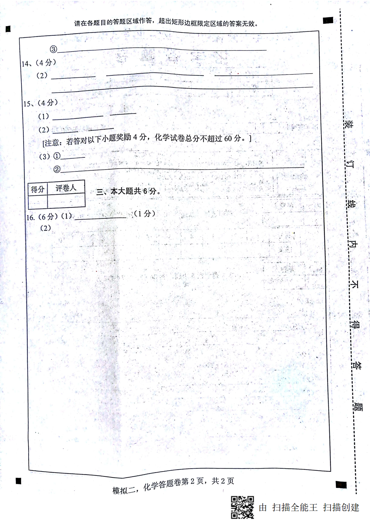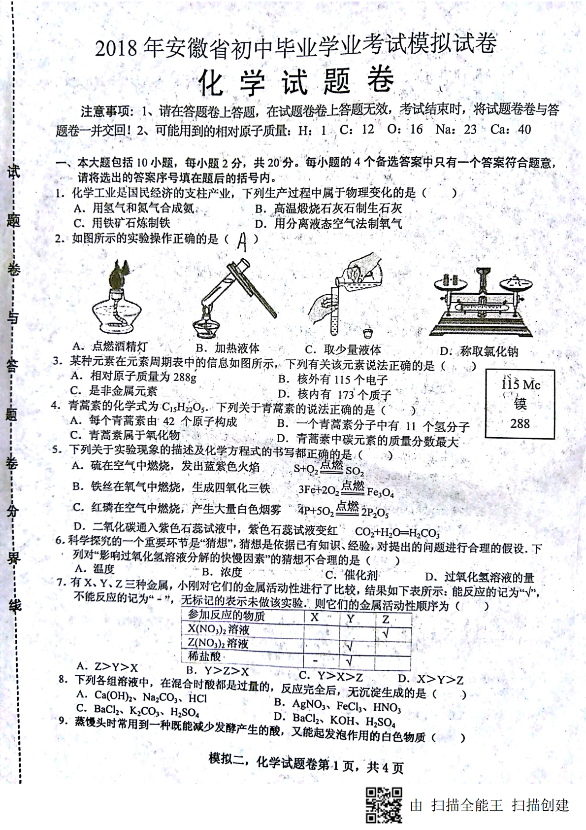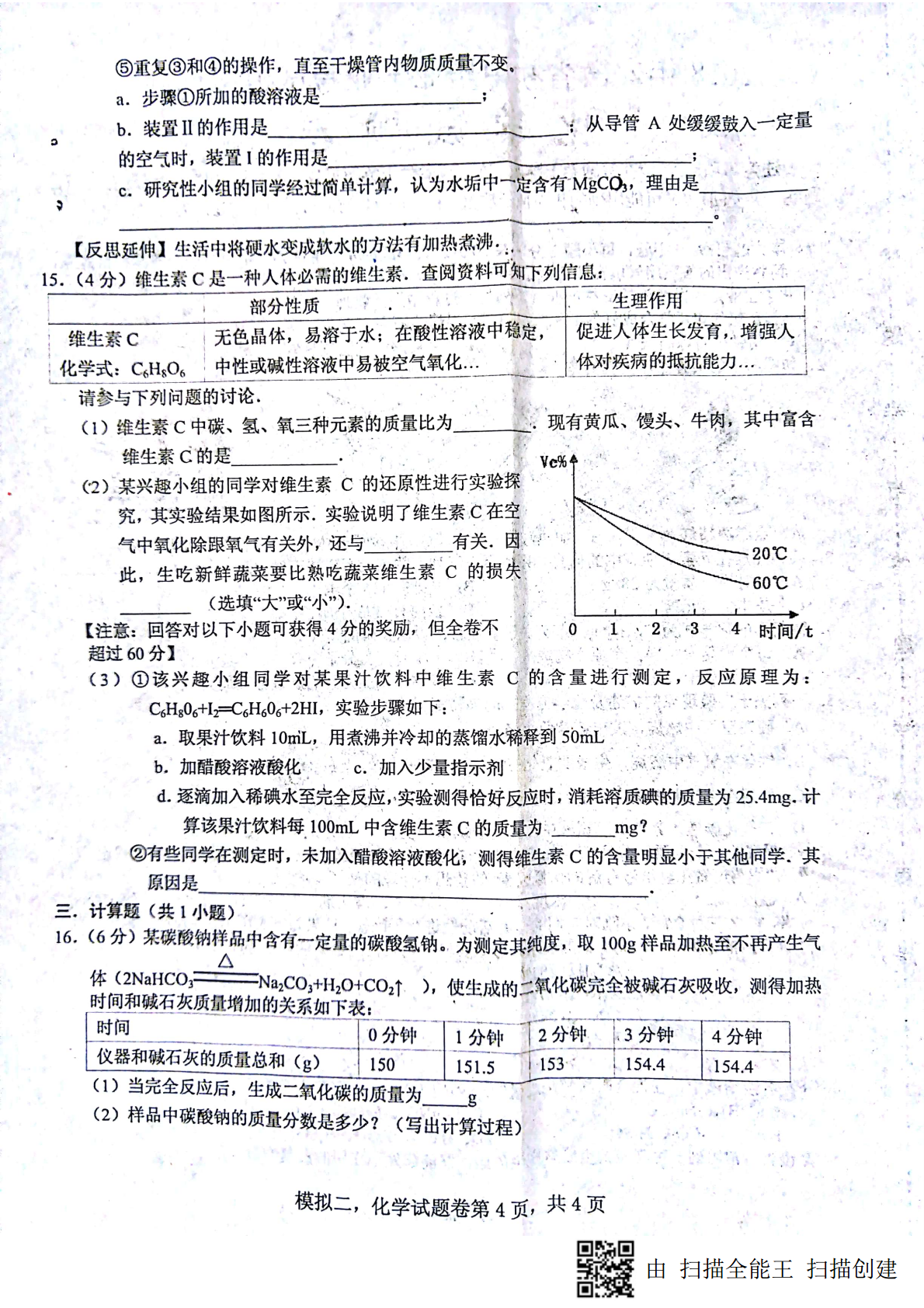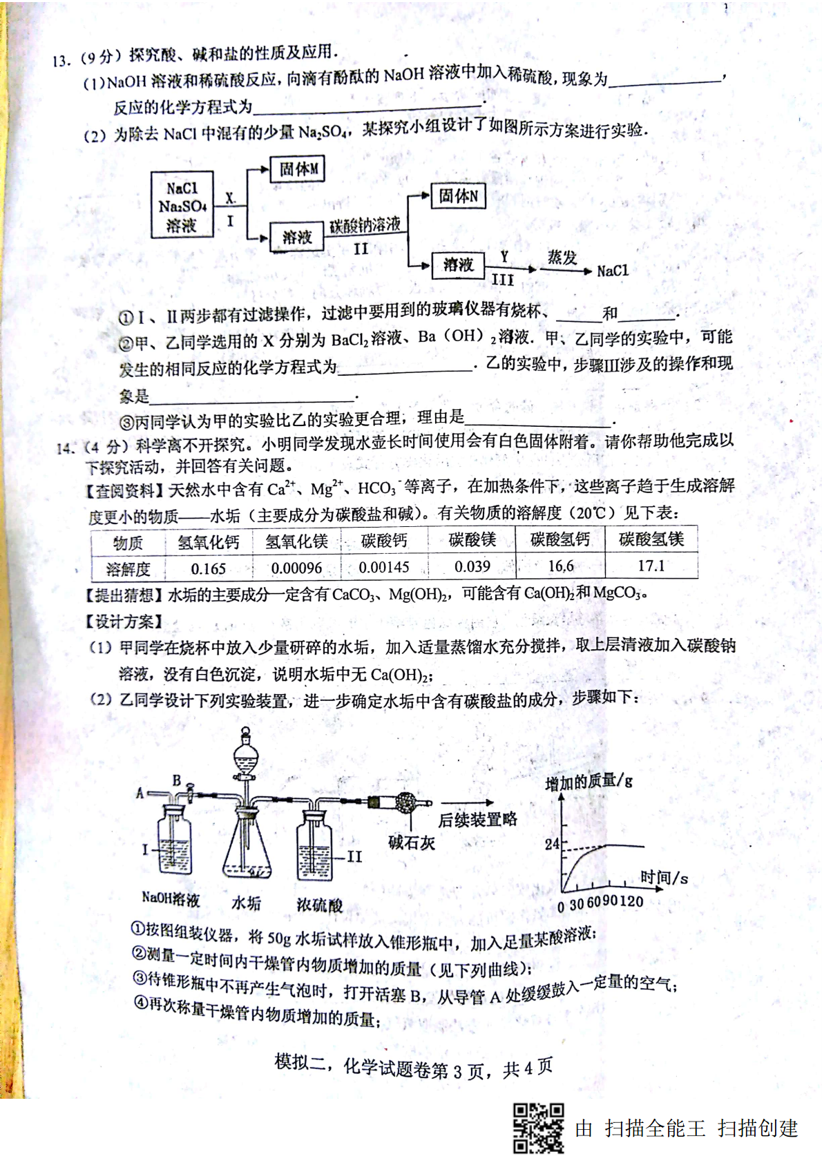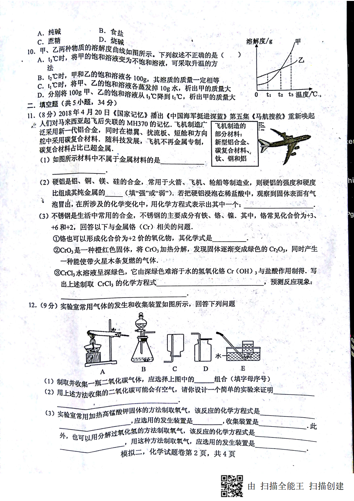 įľ°模拟こ,化学试题卷第1由枞芡扫描创建页,A*ıBA纯碱食盐Dc蔗糖烧碱乙种物质的溶解度甲、两曲编1o她图所示将甲的饱和。下列叙述不正确的是(A时,溶液变为不饱和溶液可采取升温干,的方它对甲和乙的饱和溶Btz,液各toog,其溶质的质量定相等0甲、乙百话108的饱和tt.ロD丽溶液从t它otız温度广リ3降到t艺,析出甲的质量大5小题34二填空题(共,分)2018年4月20日《国山(8分)家记忆》播出《中国海军挺进深蓝》第五集《马航搜救》重新唤起马来西亚起飞后失联的庶人们对更星更苎竺MH37o的记忆飞机制造才I画目机制造的阵铝合金采用新代,同时在襟翼泛、扰流板、短舱和方向.飞机不再金属专制,新型铝合金碳复合材料占比已超金属碳复合材料。.(n如图所示材料中不属于金属材料的是铝、铜、镁《2)硬铝是、硅的合金,常用于箭、函火、轮船等制造业硬强度和硬度多耍,刚铬组成其纯金属的(。·?")比įユニー:强穹弱若把硬铝浸泡在稀矗酸中,观察到固体表面有气的一え泡冒出,在所涉及化学变化中,用化学方程式表示出其中个t主价+3(3)不锈钢是生活中常用的合金,不锈钢的要成分有铁、铬、镍其中,铬常见化合屴.!。ぜ鳥'"+6和牛2回答以下与金属铬(cr)相关的问题y国铬也可以形成化合价为+2价的氧化物其化学式是Cro加热分解发固体逐渐变成绿色的Cf0,同时产生@cro,是种橙红色固体,将,,现23种能使带火星木条复燃的气体;,Cr(0H)盐写绿色,它由深绿色难溶于水的氢氧化铬,与酸作用制得@Crcl,水溶液呈深式ł预测反应现象出上述制取Crc13的化学方程答下列问题く,2(9分)实验室常用气体的发生和收集装置如图所示。回应选上组合(填字母序)(ı)化碳气体,择图中的号制取井收集一瓶二氧会验(氧化碳可能有空气,请你设计个简单的实来证明2)用上地方法收集的二体的方法制取氧气臼锰酸\固,该反应的化学方程式是)实虿室常用加热高选用的发生装,应置是,收集装置是的方法制取氧气过氧化氢,该反应的化学方程式是朱也分解可以用种法用这方制取氧气,应选,用的发生装置是二化学模拟,试题卷第2瓦由枞芡扫描创建)探究酸碱和盐的性质及应用13(9分、液中加入海有酚酞的NaOH溶稀硫酸(1)NaOH溶液和稀硫酸反应,向,现象为反应的化学方程式为0某探究小组诬计了如图所示方验(2)为除去Nacl中混有的少量Nıas4案进行实°到的玻璃仪器有烧姓过滤中要用杯、滤操作,i.兹两步都和(oH)、Ba溶可能x分别为Bacı,溶液,液甲乙同学的实验中,甲、乙同学选用的乙的实验中m及的操作和现发生的相同反应的化学方程式为,步骤涉象是理理由是圆丙同学认为甲的实验比乙的实验更合,会成以烧水壶长时间使用有白色固体附着。请你帮助他完14(4分)科学离不开探究。小明同学发·。下探究活动,并回答有关问题。2+2*MHCO等离子,在加热条件亢这些离子趋于生成溶解{査倜资料】天然水中含有Ca、g、,i关物质的解(20亡)见下表度更小的物质水垢(主要成分为碳酸盐和碱。有溶度碳酸钙碳酸镁碳酸氢钙碳酸氢镁ļ物质上氢氧化钙氢氧化镁īi:1ı溶解度į0165Ș000145į0039;I166171M村H有0HMCO。【提出猜想】水垢的主要成%定含有CaCO,、ぼ回),,可能含\)i到g,·【设计方案】万':如じ孚殖碣,三;泉拌,取土层清液加入碳酸钠(D甲同学在烧杯中放入少量研碎的水垢,加入适量蒸馏充分搅-氲鳥。,,《2)乙同学设计下二诬盐的菇。,列实验装置,进步确定水垢中含有酸ゴİ+fTー:S按图组装仪器溶液,将50g水垢试样放入锥形瓶中加入足量某酸@测量,定时间内干燥二管内物质增加的质量(见下列曲线)回特锥一量形瓶中不再产生八定的空气气泡时,打缓鼓开活塞B·处缓ン,从导管A再次称量千燥管内物质增加的质量门1一书模拟二,化学试题卷第3由枞芡扫描创建城页,管内物质质量不变©重复圆和田的操作,直至千燥。乙。步骤所加的酸溶液趸屋量b装置U的作用是가从导管A处缓缓鼓じ定有加热煮沸【反思延1相生活中将硬水变成就水的方法.!'料讨15(4分)维生素c是二种人体必需的维生素查阅资细分列部分性质告理芦用稳羞生阮溶液中定,促又$长发醒。维生素c无色晶体,易溶于水;郎曜匡或碱性溶液中易被空气氧化I的抵抗能!化