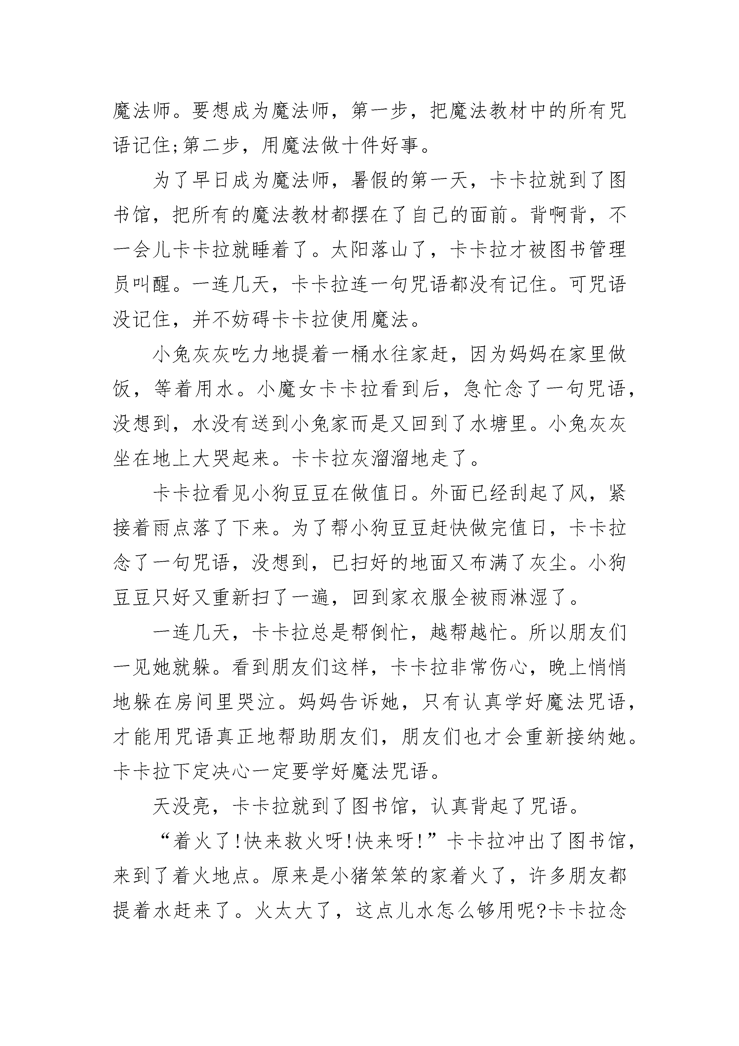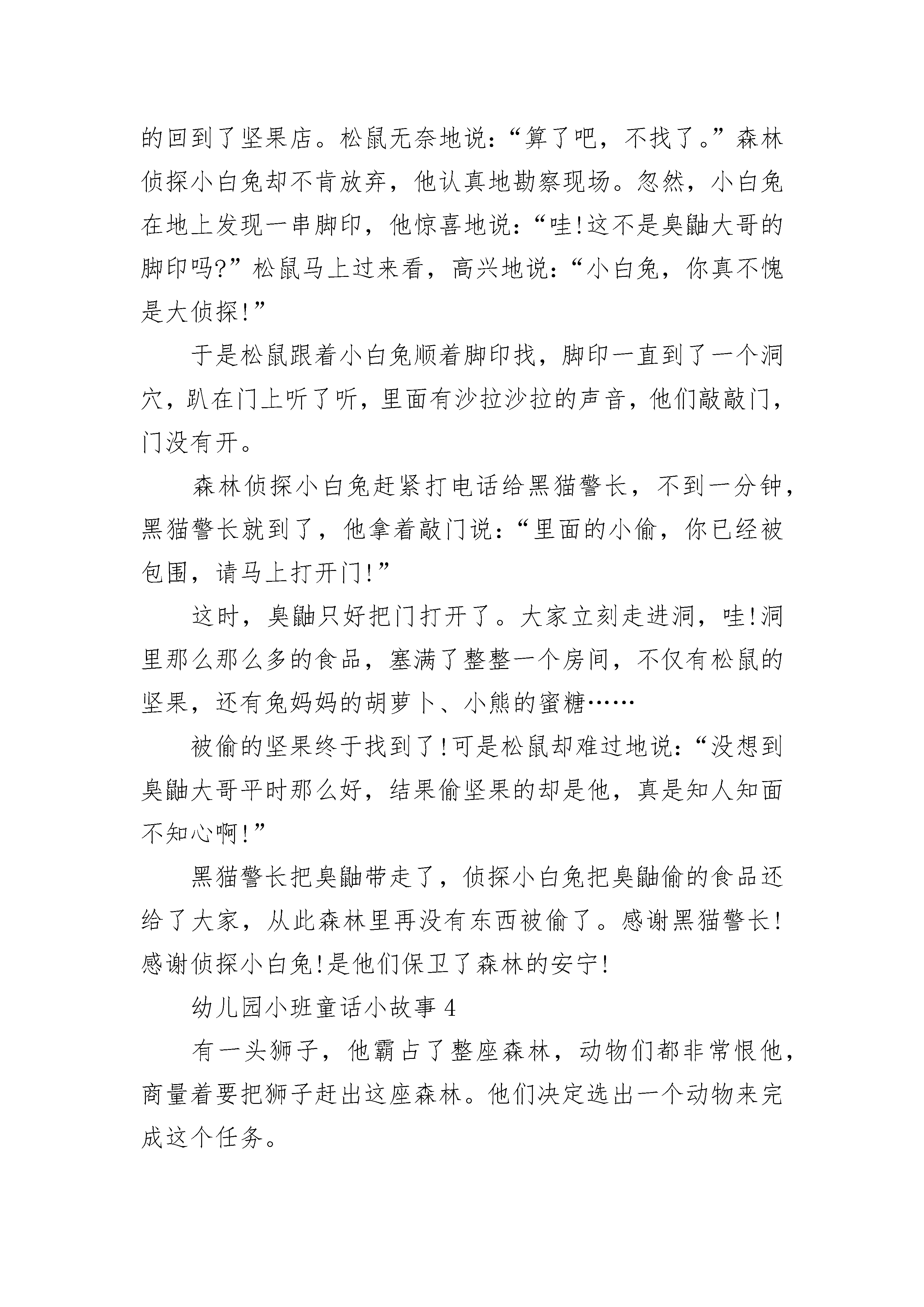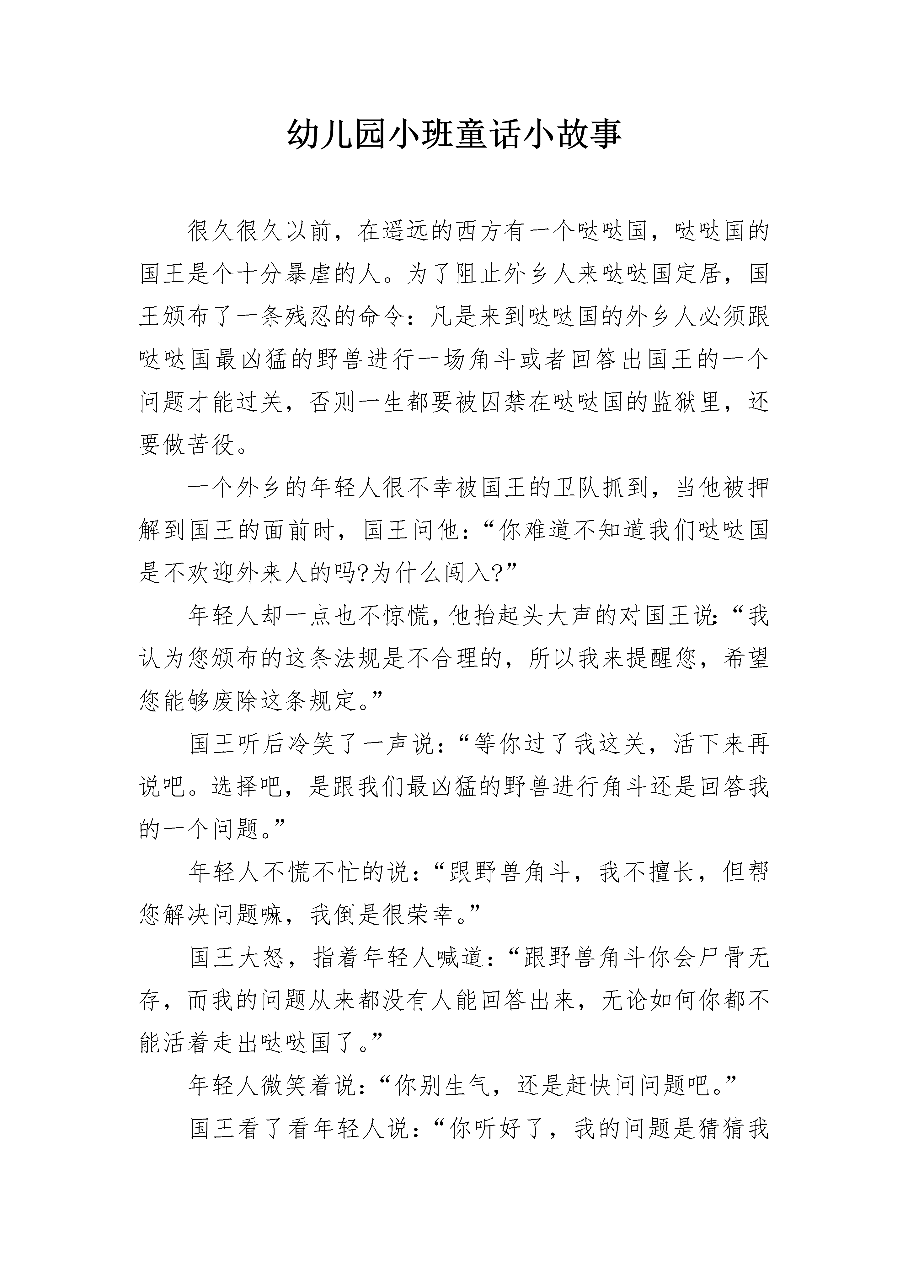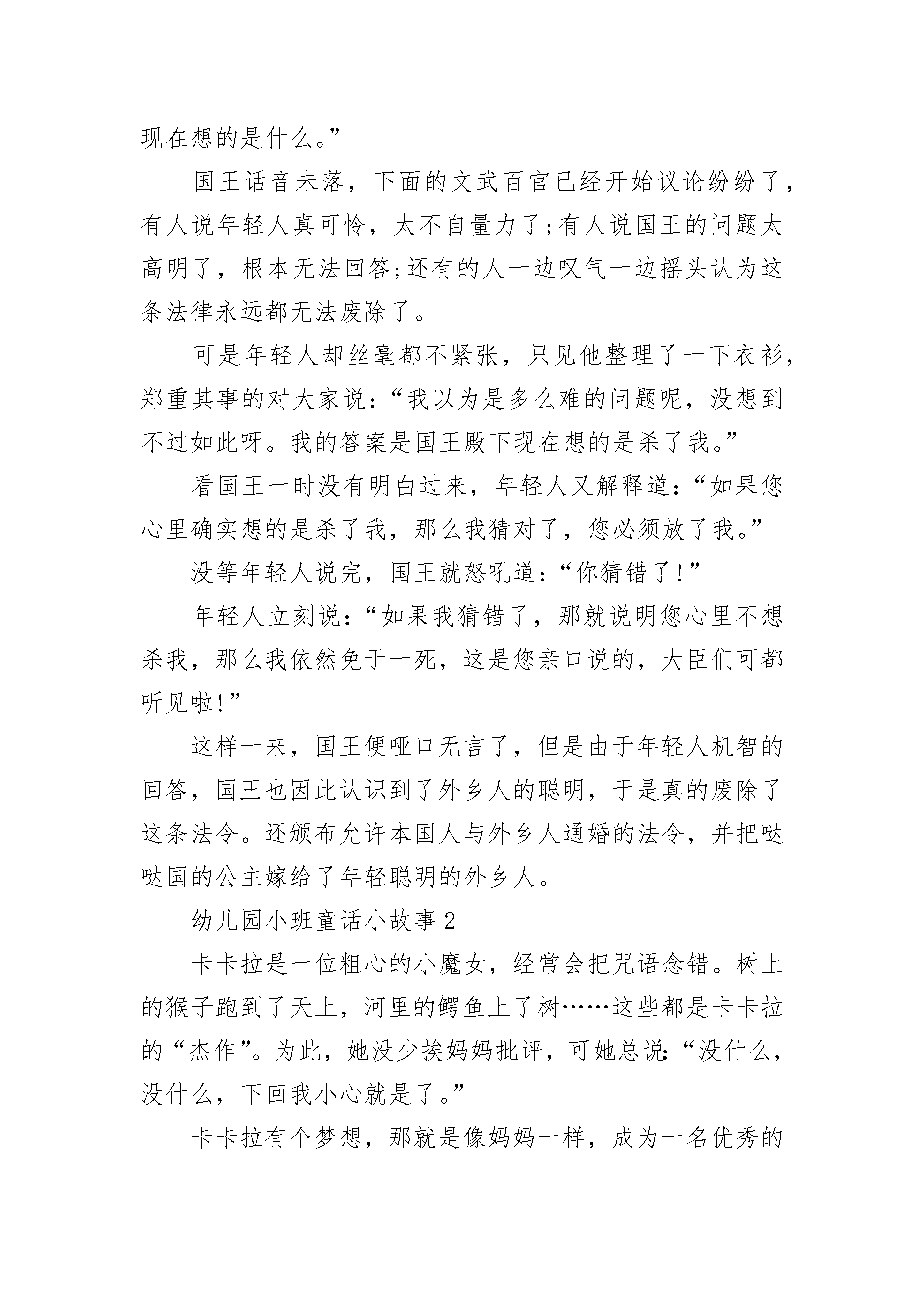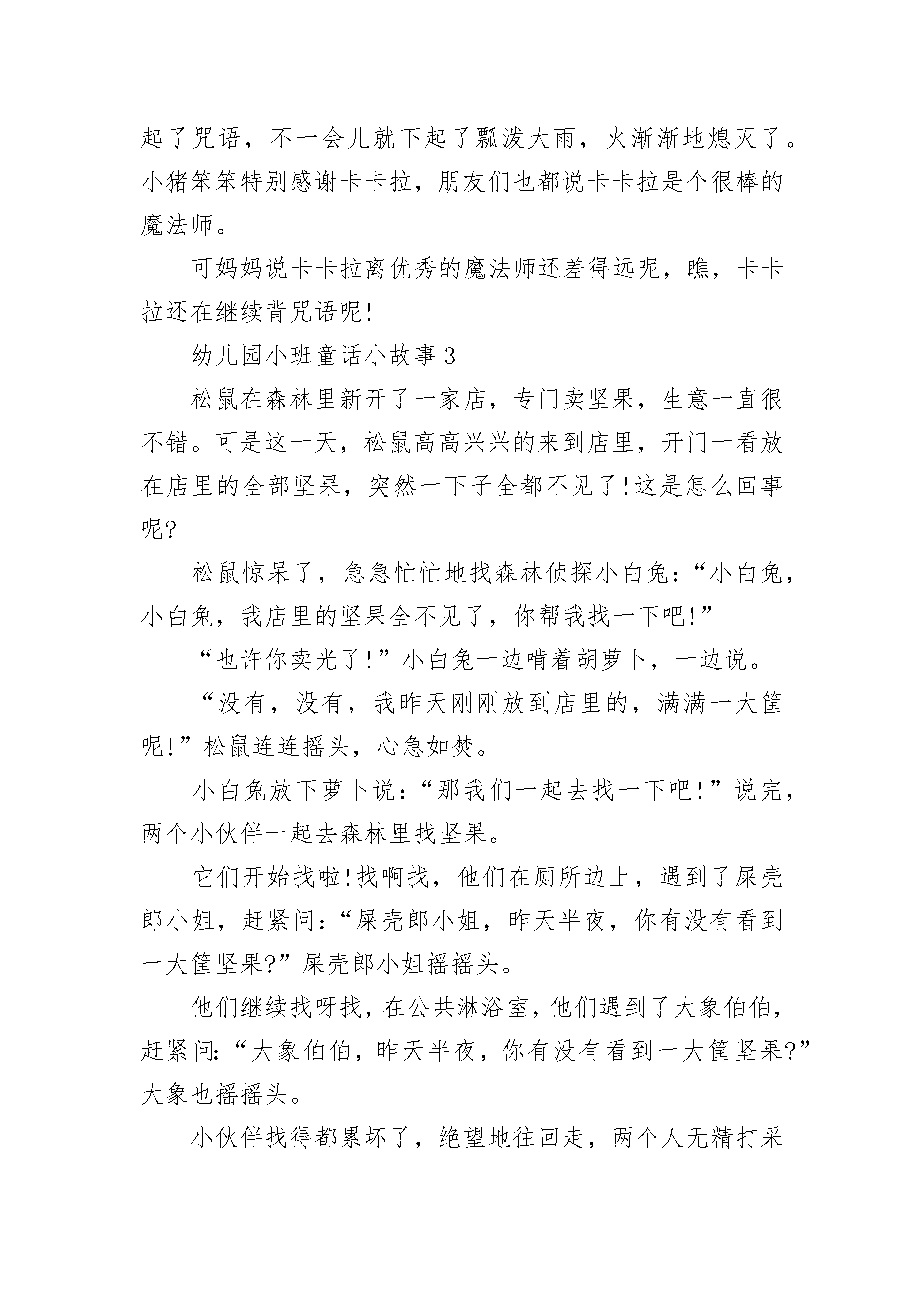 幼儿园小班童话小故事很久很久以前,在遥远的西方有一个哒哒国,哒哒国的国王是个十分暴虐的人。为了阻止外乡人来哒哒国定居,国王颁布了一条残忍的命令:凡是来到哒哒国的外乡人必须跟哒哒国最凶猛的野兽进行一场角斗或者回答出国王的一个问题才能过关,否则一生都要被囚禁在哒哒国的监狱里,还要做苦役。一个外乡的年轻人很不幸被国王的卫队抓到,当他被押解到国王的面前时,国王问他:“你难道不知道我们哒哒国是不欢迎外来人的吗?为什么闯入?”年轻人却一点也不惊慌,他抬起头大声的对国王说:“我认为您颁布的这条法规是不合理的,所以我来提醒您,希望您能够废除这条规定。”国王听后冷笑了一声说:“等你过了我这关,活下来再说吧。选择吧,是跟我们最凶猛的野兽进行角斗还是回答我的一个问题。”年轻人不慌不忙的说:“跟野兽角斗,我不擅长,但帮您解决问题嘛,我倒是很荣幸。”国王大怒,指着年轻人喊道:“跟野兽角斗你会尸骨无存,而我的问题从来都没有人能回答出来,无论如何你都不能活着走出哒哒国了。”年轻人微笑着说:“你别生气,还是赶快问问题吧。”国王看了看年轻人说:“你听好了,我的问题是猜猜我现在想的是什么。”国王话音未落,下面的文武百官已经开始议论纷纷了,有人说年轻人真可怜,太不自量力了;有人说国王的问题太高明了,根本无法回答;还有的人一边叹气一边摇头认为这条法律永远都无法废除了。可是年轻人却丝毫都不紧张,只见他整理了一下衣衫,郑重其事的对大家说:“我以为是多么难的问题呢,没想到不过如此呀。我的答案是国王殿下现在想的是杀了我。”看国王一时没有明白过来,年轻人又解释道:“如果您心里确实想的是杀了我,那么我猜对了,您必须放了我。”没等年轻人说完,国王就怒吼道:“你猜错了!”年轻人立刻说:“如果我猜错了,那就说明您心里不想杀我,那么我依然免于一死,这是您亲口说的,大臣们可都听见啦!”这样一来,国王便哑口无言了,但是由于年轻人机智的回答,国王也因此认识到了外乡人的聪明,于是真的废除了这条法令。还颁布允许本国人与外乡人通婚的法令,并把哒哒国的公主嫁给了年轻聪明的外乡人。幼儿园小班童话小故事2卡卡拉是一位粗心的小魔女,经常会把咒语念错。树上的猴子跑到了天上,河里的鳄鱼上了树……这些都是卡卡拉的“杰作”。为此,她没少挨妈妈批评,可她总说:“没什么,没什么,下回我小心就是了。”卡卡拉有个梦想,那就是像妈妈一样,成为一名优秀的魔法师。要想成为魔法师,第一步,把魔法教材中的所有咒语记住;第二步,用魔法做十件好事。为了早日成为魔法师,暑假的第一天,卡卡拉就到了图书馆,把所有的魔法教材都摆在了自己的面前。背啊背,不一会儿卡卡拉就睡着了。太阳落山了,卡卡拉才被图书管理员叫醒。一连几天,卡卡拉连一句咒语都没有记住。可咒语没记住,并不妨碍卡卡拉使用魔法。小兔灰灰吃力地提着一桶水往家赶,因为妈妈在家里做饭,等着用水。小魔女卡卡拉看到后,急忙念了一句咒语,没想到,水没有送到小兔家而是又回到了水塘里。小兔灰灰坐在地上大哭起来。卡卡拉灰溜溜地走了。卡卡拉看见小狗豆豆在做值日。外面已经刮起了风,紧接着雨点落了下来。为了帮小狗豆豆赶快做完值日,卡卡拉念了一句咒语,没想到,已扫好的地面又布满了灰尘。小狗豆豆只好又重新扫了一遍,回到家衣服全被雨淋湿了。一连几天,卡卡拉总是帮倒忙,越帮越忙。所以朋友们一见她就躲。看到朋友们这样,卡卡拉非常伤心,晚上悄悄地躲在房间里哭泣。妈妈告诉她,只有认真学好魔法咒语,才能用咒语真正地帮助朋友们,朋友们也才会重新接纳她。卡卡拉下定决心一定要学好魔法咒语。天没亮,卡卡拉就到了图书馆,认真背起了咒语。“着火了!快来救火呀!快来呀!”卡卡拉冲出了图书馆,来到了着火地点。原来是小猪笨笨的家着火了,许多朋友都提着水赶来了。火太大了,这点儿水怎么够用呢?卡卡拉念起了咒语,不一会儿就下起了瓢泼大雨,火渐渐地熄灭了。小猪笨笨特别感谢卡卡拉,朋友们也都说卡卡拉是个很棒的魔法师。可妈妈说卡卡拉离优秀的魔法师还差得远呢,瞧,卡卡拉还在继续背咒语呢!幼儿园小班童话小故事3松鼠在森林里新开了一家店,专门卖坚果,生意一直很不错。可是这一天,松鼠高高兴兴的来到店里,开门一看放在店里的全部坚果,突然一下子全都不见了!这是怎么回事呢?松鼠惊呆了,急急忙忙地找森林侦探小白兔:“小白兔,小白兔,我店里的坚果全不见了,你帮我找一下吧!”“也许你卖光了!”小白兔一边啃着胡萝卜,一边说。“没有,没有,我昨天刚刚放到店里的,满满一大筐呢!”松鼠连连摇头,心急如焚。小白兔放下萝卜说:“那我们一起去找一下吧!”说完,两个小伙伴一起去森林里找坚果。它们开始找啦!找啊找,他们在厕所边上,遇到了屎壳郎小姐,赶紧问:“屎壳郎小姐,昨天半夜,你有没有看到一大筐坚果?”屎壳郎小姐摇摇头。他们继续找呀找,在公共淋浴室,他们遇到了大象伯伯,赶紧问:“大象