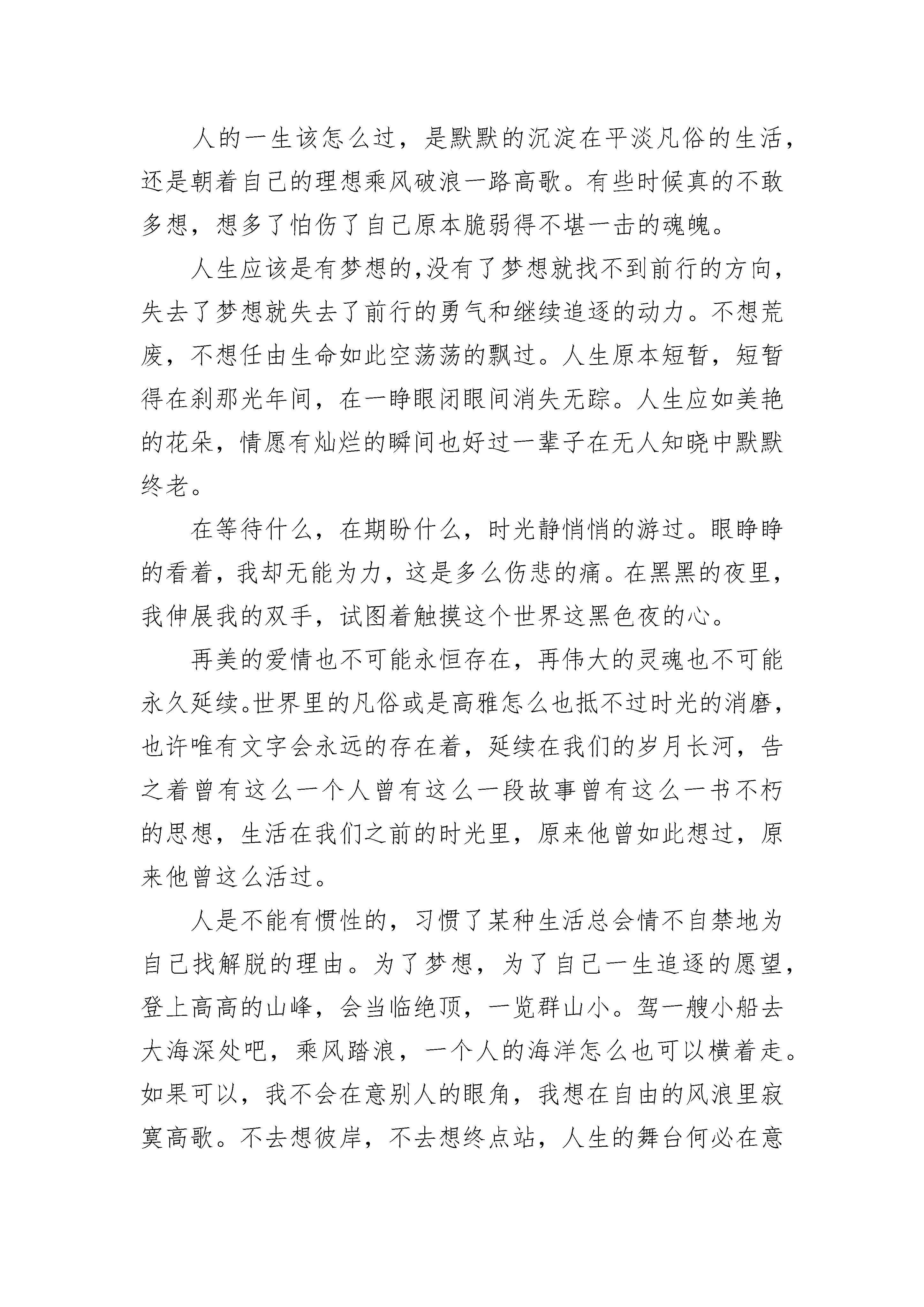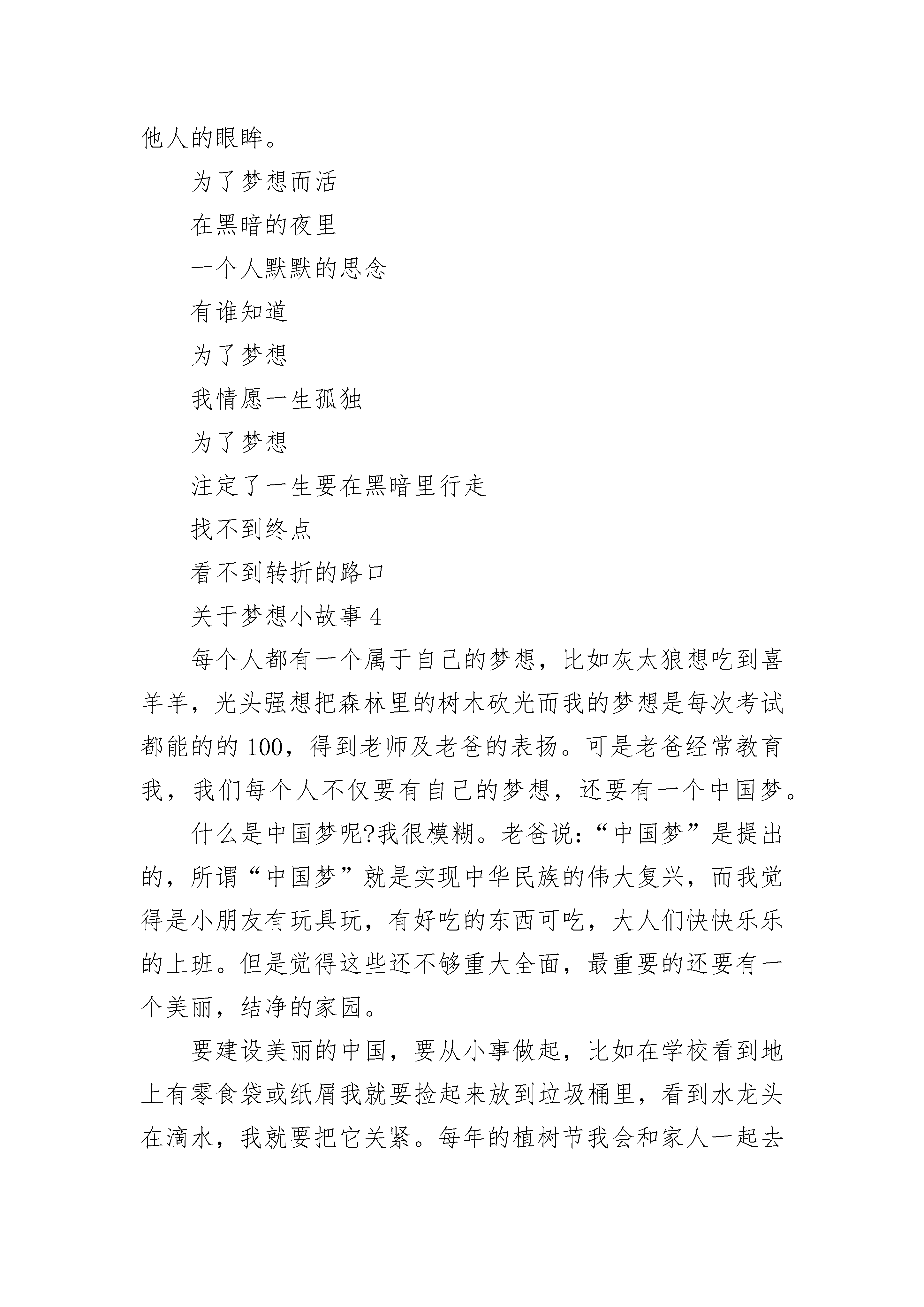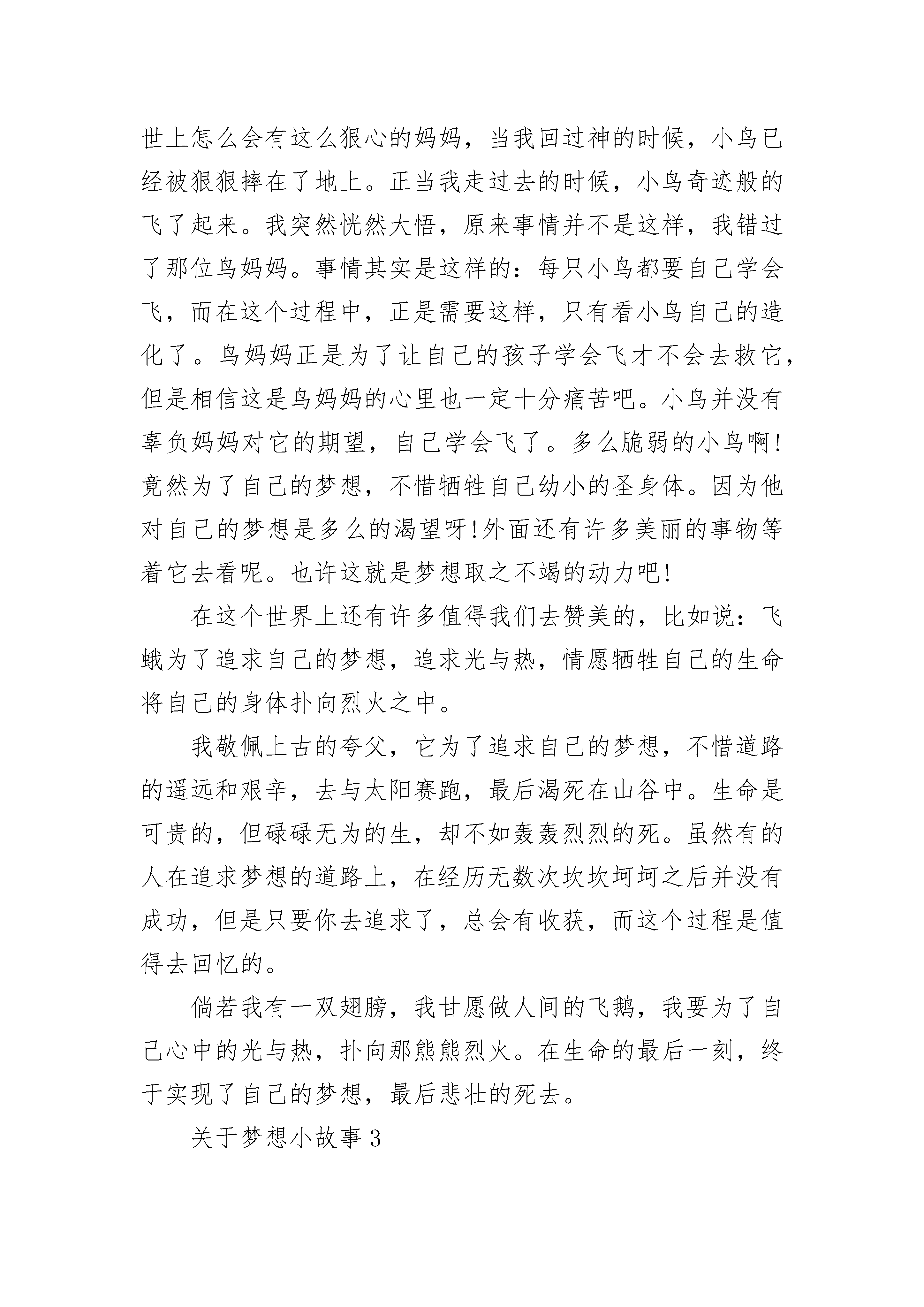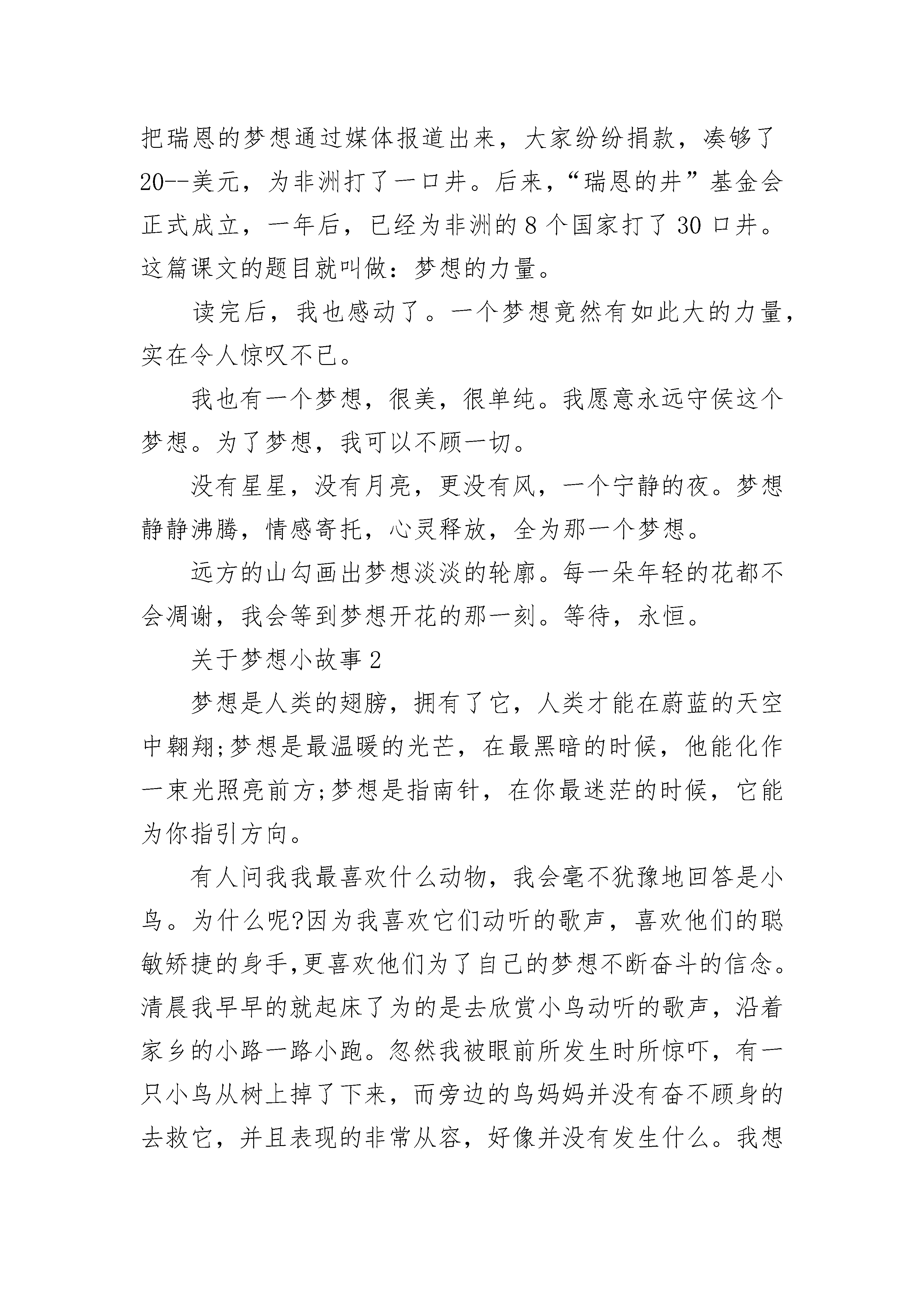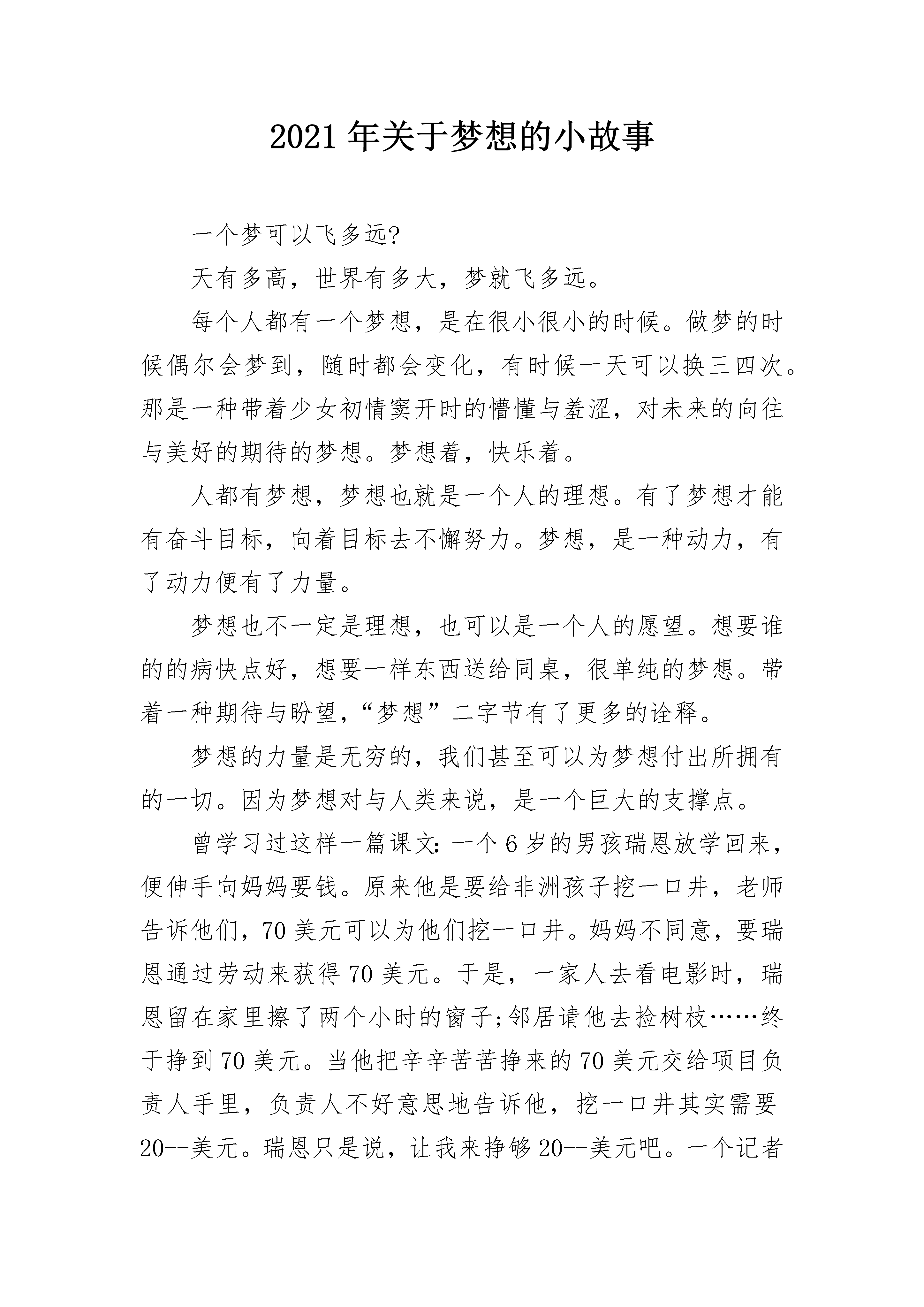 2021年关于梦想的小故事一个梦可以飞多远?天有多高,世界有多大,梦就飞多远。每个人都有一个梦想,是在很小很小的时候。做梦的时候偶尔会梦到,随时都会变化,有时候一天可以换三四次。那是一种带着少女初情窦开时的懵懂与羞涩,对未来的向往与美好的期待的梦想。梦想着,快乐着。人都有梦想,梦想也就是一个人的理想。有了梦想才能有奋斗目标,向着目标去不懈努力。梦想,是一种动力,有了动力便有了力量。梦想也不一定是理想,也可以是一个人的愿望。想要谁的的病快点好,想要一样东西送给同桌,很单纯的梦想。带着一种期待与盼望,“梦想”二字节有了更多的诠释。梦想的力量是无穷的,我们甚至可以为梦想付出所拥有的一切。因为梦想对与人类来说,是一个巨大的支撑点。曾学习过这样一篇课文:一个6岁的男孩瑞恩放学回来,便伸手向妈妈要钱。原来他是要给非洲孩子挖一口井,老师告诉他们,70美元可以为他们挖一口井。妈妈不同意,要瑞恩通过劳动来获得70美元。于是,一家人去看电影时,瑞恩留在家里擦了两个小时的窗子;邻居请他去捡树枝……终于挣到70美元。当他把辛辛苦苦挣来的70美元交给项目负责人手里,负责人不好意思地告诉他,挖一口井其实需要20--美元。瑞恩只是说,让我来挣够20--美元吧。一个记者把瑞恩的梦想通过媒体报道出来,大家纷纷捐款,凑够了20--美元,为非洲打了一口井。后来,“瑞恩的井”基金会正式成立,一年后,已经为非洲的8个国家打了30口井。这篇课文的题目就叫做:梦想的力量。读完后,我也感动了。一个梦想竟然有如此大的力量,实在令人惊叹不已。我也有一个梦想,很美,很单纯。我愿意永远守侯这个梦想。为了梦想,我可以不顾一切。没有星星,没有月亮,更没有风,一个宁静的夜。梦想静静沸腾,情感寄托,心灵释放,全为那一个梦想。远方的山勾画出梦想淡淡的轮廓。每一朵年轻的花都不会凋谢,我会等到梦想开花的那一刻。等待,永恒。关于梦想小故事2梦想是人类的翅膀,拥有了它,人类才能在蔚蓝的天空中翱翔;梦想是最温暖的光芒,在最黑暗的时候,他能化作一束光照亮前方;梦想是指南针,在你最迷茫的时候,它能为你指引方向。有人问我我最喜欢什么动物,我会毫不犹豫地回答是小鸟。为什么呢?因为我喜欢它们动听的歌声,喜欢他们的聪敏矫捷的身手,更喜欢他们为了自己的梦想不断奋斗的信念。清晨我早早的就起床了为的是去欣赏小鸟动听的歌声,沿着家乡的小路一路小跑。忽然我被眼前所发生时所惊吓,有一只小鸟从树上掉了下来,而旁边的鸟妈妈并没有奋不顾身的去救它,并且表现的非常从容,好像并没有发生什么。我想世上怎么会有这么狠心的妈妈,当我回过神的时候,小鸟已经被狠狠摔在了地上。正当我走过去的时候,小鸟奇迹般的飞了起来。我突然恍然大悟,原来事情并不是这样,我错过了那位鸟妈妈。事情其实是这样的:每只小鸟都要自己学会飞,而在这个过程中,正是需要这样,只有看小鸟自己的造化了。鸟妈妈正是为了让自己的孩子学会飞才不会去救它,但是相信这是鸟妈妈的心里也一定十分痛苦吧。小鸟并没有辜负妈妈对它的期望,自己学会飞了。多么脆弱的小鸟啊!竟然为了自己的梦想,不惜牺牲自己幼小的圣身体。因为他对自己的梦想是多么的渴望呀!外面还有许多美丽的事物等着它去看呢。也许这就是梦想取之不竭的动力吧!在这个世界上还有许多值得我们去赞美的,比如说:飞蛾为了追求自己的梦想,追求光与热,情愿牺牲自己的生命将自己的身体扑向烈火之中。我敬佩上古的夸父,它为了追求自己的梦想,不惜道路的遥远和艰辛,去与太阳赛跑,最后渴死在山谷中。生命是可贵的,但碌碌无为的生,却不如轰轰烈烈的死。虽然有的人在追求梦想的道路上,在经历无数次坎坎坷坷之后并没有成功,但是只要你去追求了,总会有收获,而这个过程是值得去回忆的。倘若我有一双翅膀,我甘愿做人间的飞鹅,我要为了自己心中的光与热,扑向那熊熊烈火。在生命的最后一刻,终于实现了自己的梦想,最后悲壮的死去。关于梦想小故事3人的一生该怎么过,是默默的沉淀在平淡凡俗的生活,还是朝着自己的理想乘风破浪一路高歌。有些时候真的不敢多想,想多了怕伤了自己原本脆弱得不堪一击的魂魄。人生应该是有梦想的,没有了梦想就找不到前行的方向,失去了梦想就失去了前行的勇气和继续追逐的动力。不想荒废,不想任由生命如此空荡荡的飘过。人生原本短暂,短暂得在刹那光年间,在一睁眼闭眼间消失无踪。人生应如美艳的花朵,情愿有灿烂的瞬间也好过一辈子在无人知晓中默默终老。在等待什么,在期盼什么,时光静悄悄的游过。眼睁睁的看着,我却无能为力,这是多么伤悲的痛。在黑黑的夜里,我伸展我的双手,试图着触摸这个世界这黑色夜的心。再美的爱情也不可能永恒存在,再伟大的灵魂也不可能永久延续。世界里的凡俗或是高雅怎么也抵不过时光的消磨,也许唯有文字会永远的存在着,延续在我们的岁月长河,告之着曾有这么一个人曾有这么一段故事曾有这么一书