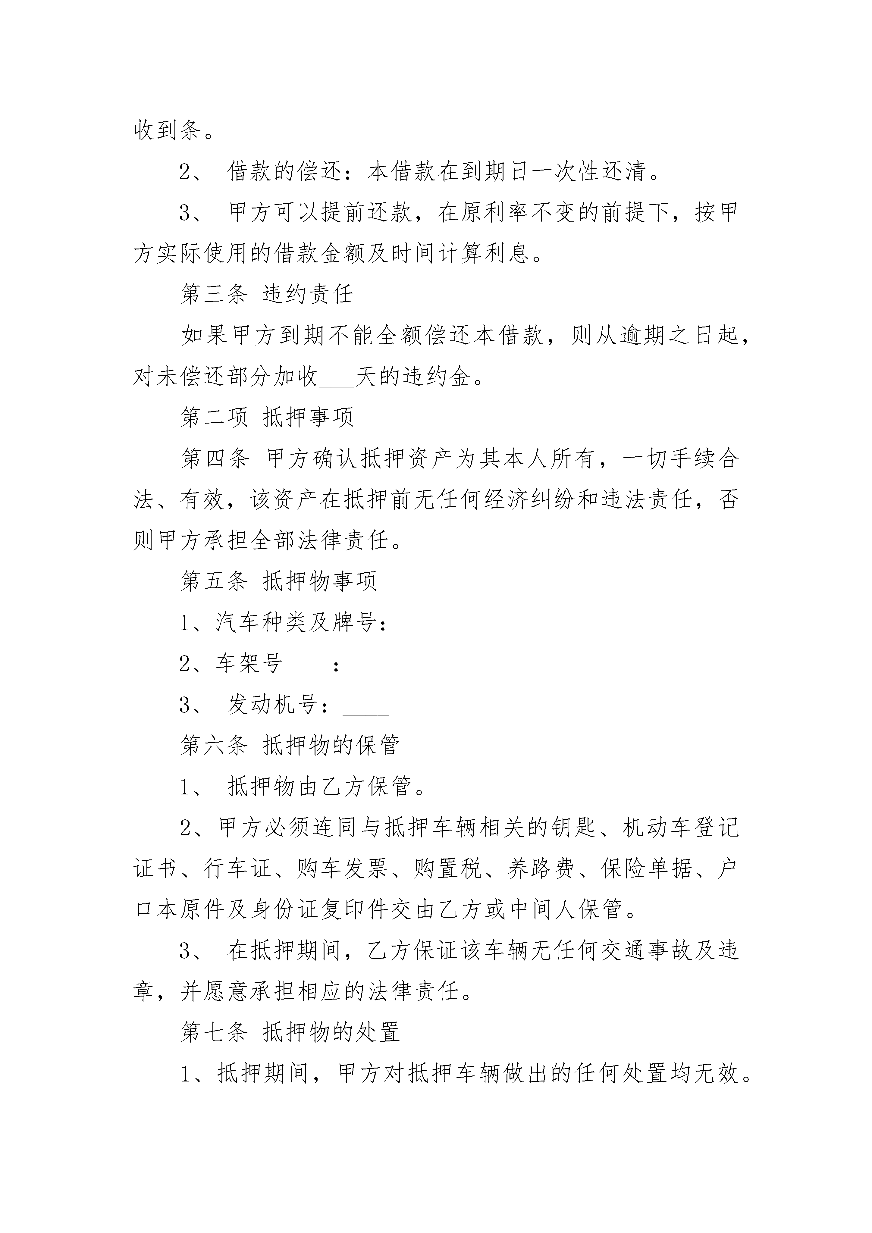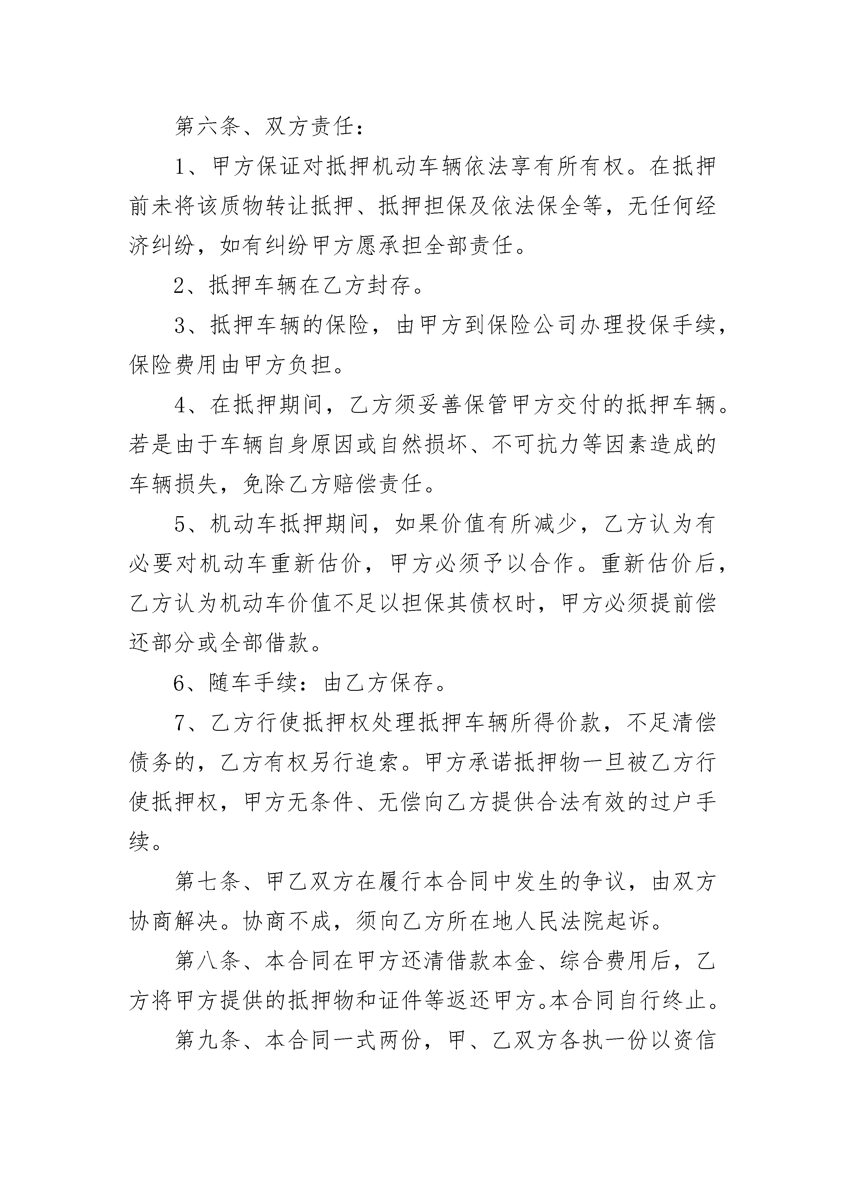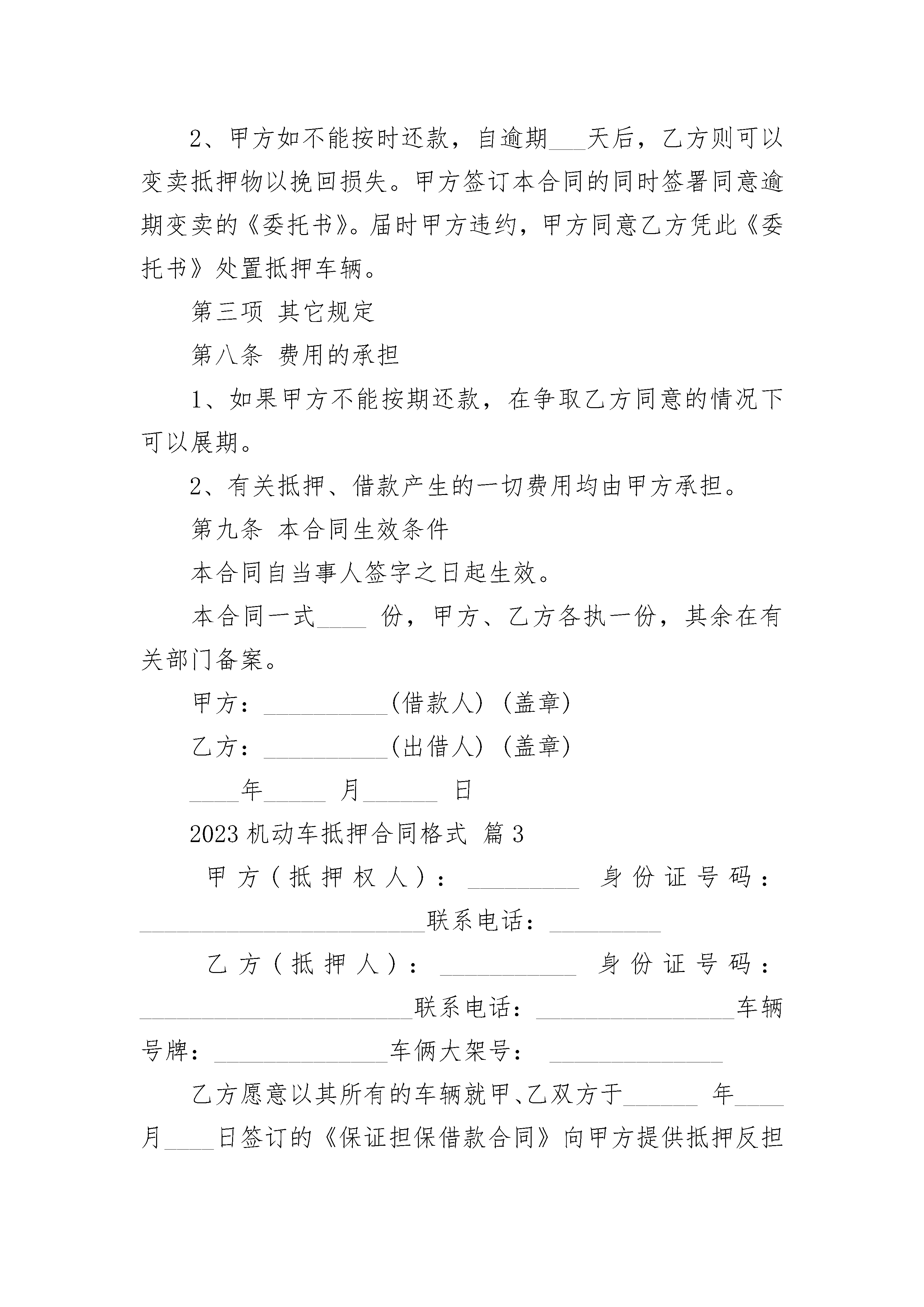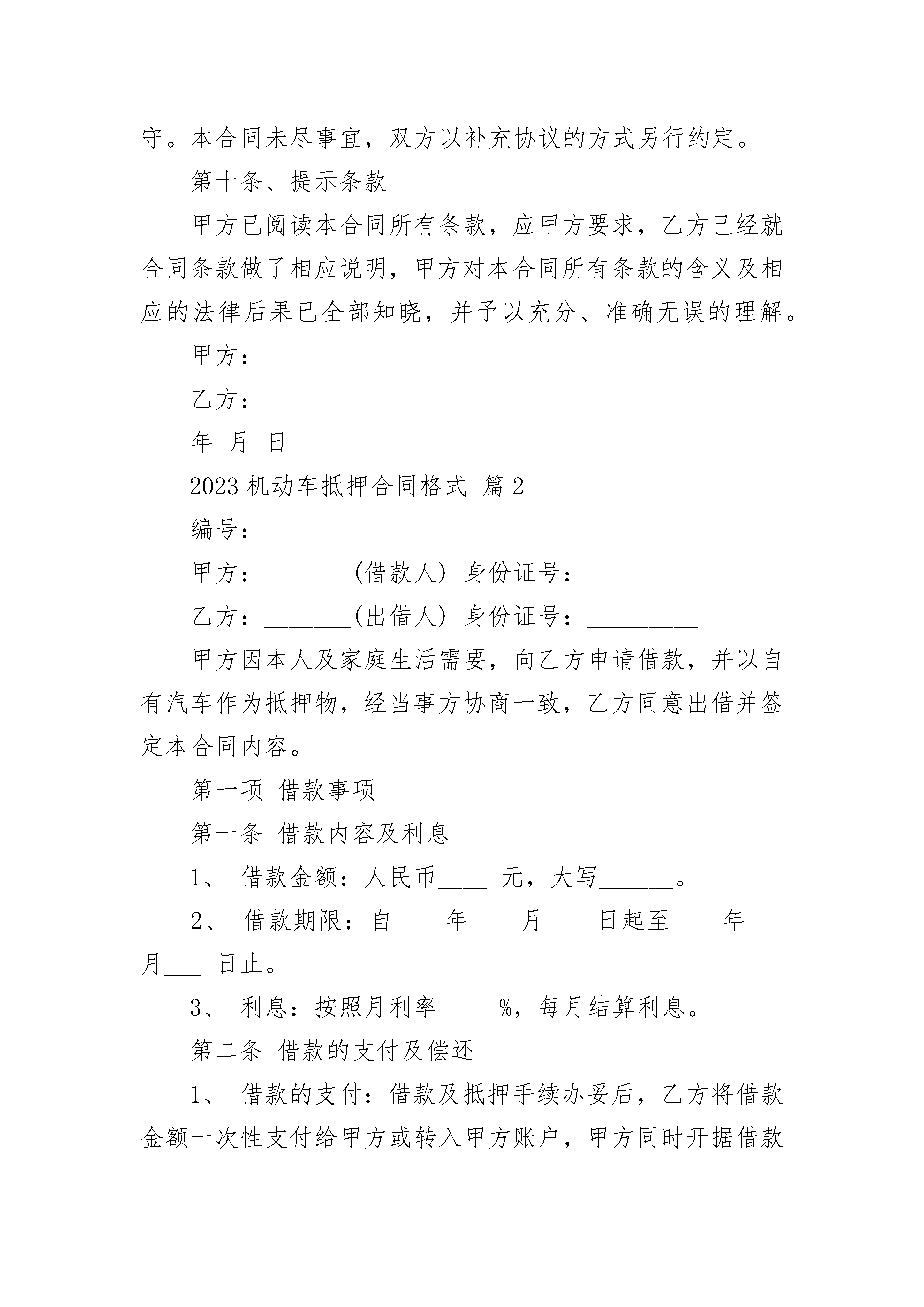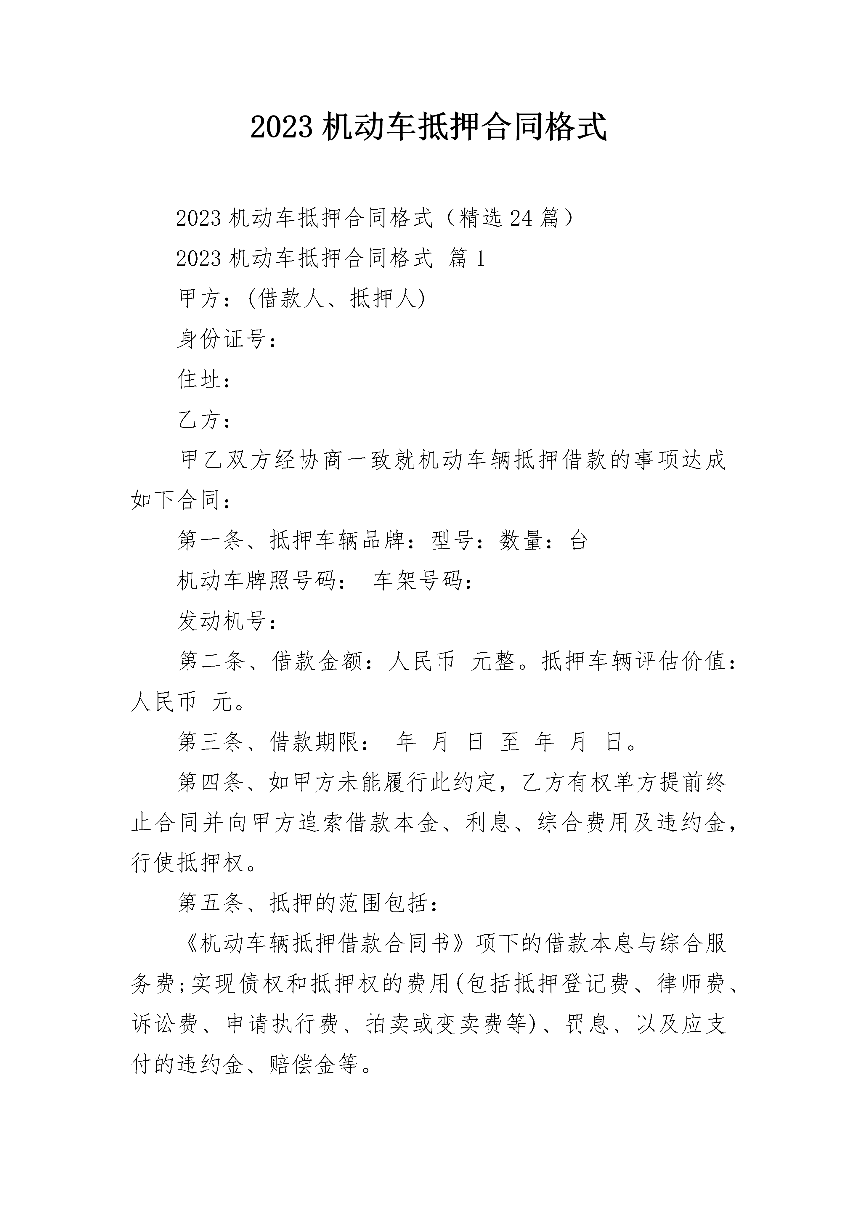 2023机动车抵押合同格式2023机动车抵押合同格式(精选24篇)2023机动车抵押合同格式篇1甲方:(借款人、抵押人)身份证号:住址:乙方:甲乙双方经协商一致就机动车辆抵押借款的事项达成如下合同:第一条、抵押车辆品牌:型号:数量:台机动车牌照号码:车架号码:发动机号:第二条、借款金额:人民币元整。抵押车辆评估价值:人民币元。第三条、借款期限:年月日至年月日。第四条、如甲方未能履行此约定,乙方有权单方提前终止合同并向甲方追索借款本金、利息、综合费用及违约金,行使抵押权。第五条、抵押的范围包括:《机动车辆抵押借款合同书》项下的借款本息与综合服务费;实现债权和抵押权的费用(包括抵押登记费、律师费、诉讼费、申请执行费、拍卖或变卖费等)、罚息、以及应支付的违约金、赔偿金等。第六条、双方责任:1、甲方保证对抵押机动车辆依法享有所有权。在抵押前未将该质物转让抵押、抵押担保及依法保全等,无任何经济纠纷,如有纠纷甲方愿承担全部责任。2、抵押车辆在乙方封存。3、抵押车辆的保险,由甲方到保险公司办理投保手续,保险费用由甲方负担。4、在抵押期间,乙方须妥善保管甲方交付的抵押车辆。若是由于车辆自身原因或自然损坏、不可抗力等因素造成的车辆损失,免除乙方赔偿责任。5、机动车抵押期间,如果价值有所减少,乙方认为有必要对机动车重新估价,甲方必须予以合作。重新估价后,乙方认为机动车价值不足以担保其债权时,甲方必须提前偿还部分或全部借款。6、随车手续:由乙方保存。7、乙方行使抵押权处理抵押车辆所得价款,不足清偿债务的,乙方有权另行追索。甲方承诺抵押物一旦被乙方行使抵押权,甲方无条件、无偿向乙方提供合法有效的过户手续。第七条、甲乙双方在履行本合同中发生的争议,由双方协商解决。协商不成,须向乙方所在地人民法院起诉。第八条、本合同在甲方还清借款本金、综合费用后,乙方将甲方提供的抵押物和证件等返还甲方。本合同自行终止。第九条、本合同一式两份,甲、乙双方各执一份以资信守。本合同未尽事宜,双方以补充协议的方式另行约定。第十条、提示条款甲方已阅读本合同所有条款,应甲方要求,乙方已经就合同条款做了相应说明,甲方对本合同所有条款的含义及相应的法律后果已全部知晓,并予以充分、准确无误的理解。甲方:乙方:年月日2023机动车抵押合同格式篇2编号:_________________甲方:_______(借款人)身份证号:_________乙方:_______(出借人)身份证号:_________甲方因本人及家庭生活需要,向乙方申请借款,并以自有汽车作为抵押物,经当事方协商一致,乙方同意出借并签定本合同内容。第一项借款事项第一条借款内容及利息1、借款金额:人民币____元,大写______。2、借款期限:自___年___月___日起至___年___月___日止。3、利息:按照月利率____%,每月结算利息。第二条借款的支付及偿还1、借款的支付:借款及抵押手续办妥后,乙方将借款金额一次性支付给甲方或转入甲方账户,甲方同时开据借款收到条。2、借款的偿还:本借款在到期日一次性还清。3、甲方可以提前还款,在原利率不变的前提下,按甲方实际使用的借款金额及时间计算利息。第三条违约责任如果甲方到期不能全额偿还本借款,则从逾期之日起,对未偿还部分加收___天的违约金。第二项抵押事项第四条甲方确认抵押资产为其本人所有,一切手续合法、有效,该资产在抵押前无任何经济纠纷和违法责任,否则甲方承担全部法律责任。第五条抵押物事项1、汽车种类及牌号:____2、车架号____:3、发动机号:____第六条抵押物的保管1、抵押物由乙方保管。2、甲方必须连同与抵押车辆相关的钥匙、机动车登记证书、行车证、购车发票、购置税、养路费、保险单据、户口本原件及身份证复印件交由乙方或中间人保管。3、在抵押期间,乙方保证该车辆无任何交通事故及违章,并愿意承担相应的法律责任。第七条抵押物的处置1、抵押期间,甲方对抵押车辆做出的任何处置均无效。2、甲方如不能按时还款,自逾期___天后,乙方则可以变卖抵押物以挽回损失。甲方签订本合同的同时签署同意逾期变卖的《委托书》。届时甲方违约,甲方同意乙方凭此《委托书》处置抵押车辆。第三项其它规定第八条费用的承担1、如果甲方不能按期还款,在争取乙方同意的情况下可以展期。2、有关抵押、借款产生的一切费用均由甲方承担。第九条本合同生效条件本合同自当事人签字之日起生效。本合同一式____份,甲方、乙方各执一份,其余在有关部门备案。甲方:__________(借款人)(盖章)乙方:__________(出借人)(盖章)____年_____月______日2023机动车抵押合同格式篇3甲方(抵押权人):_________身份证号码:_______________________联系电话:_________乙方