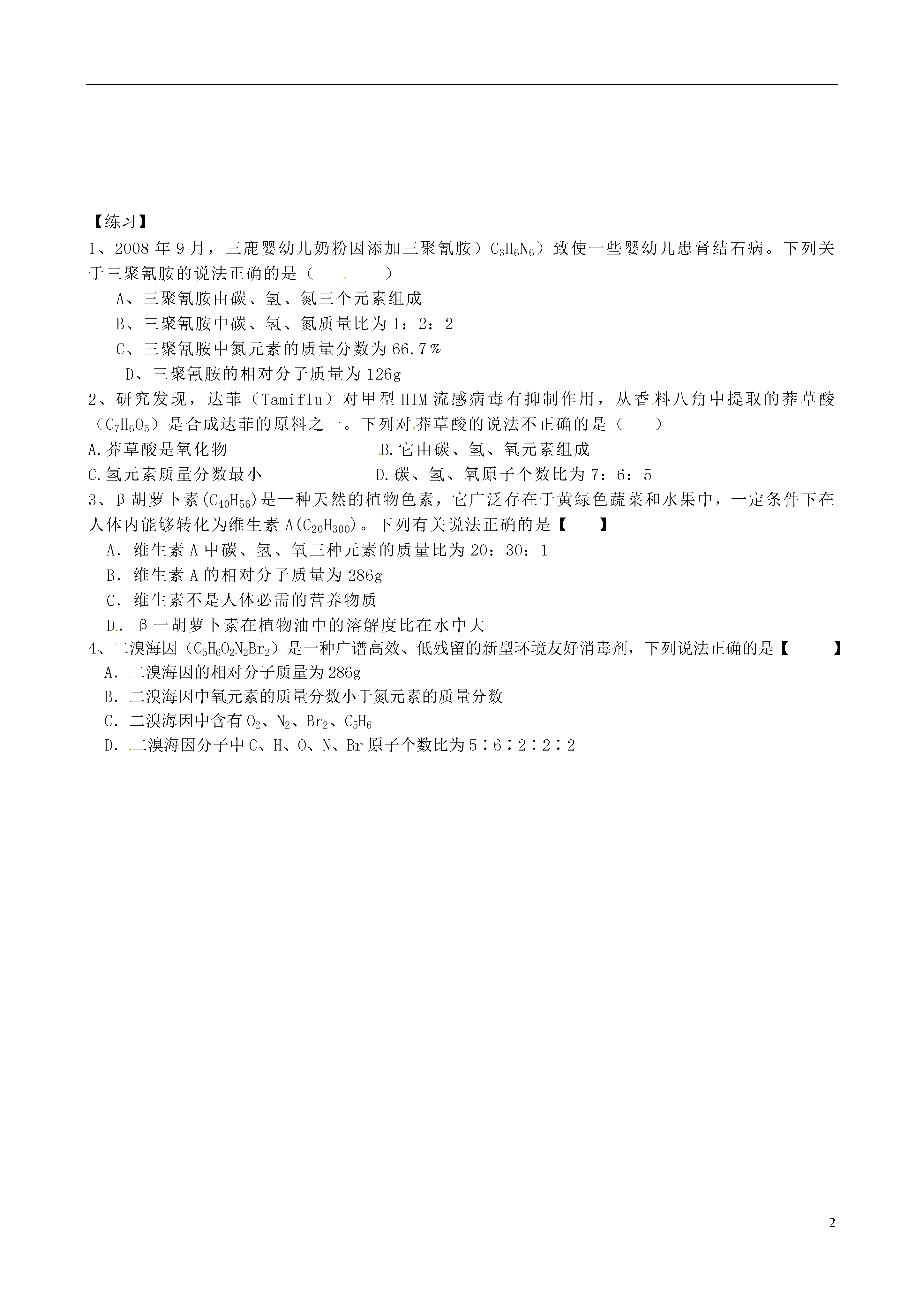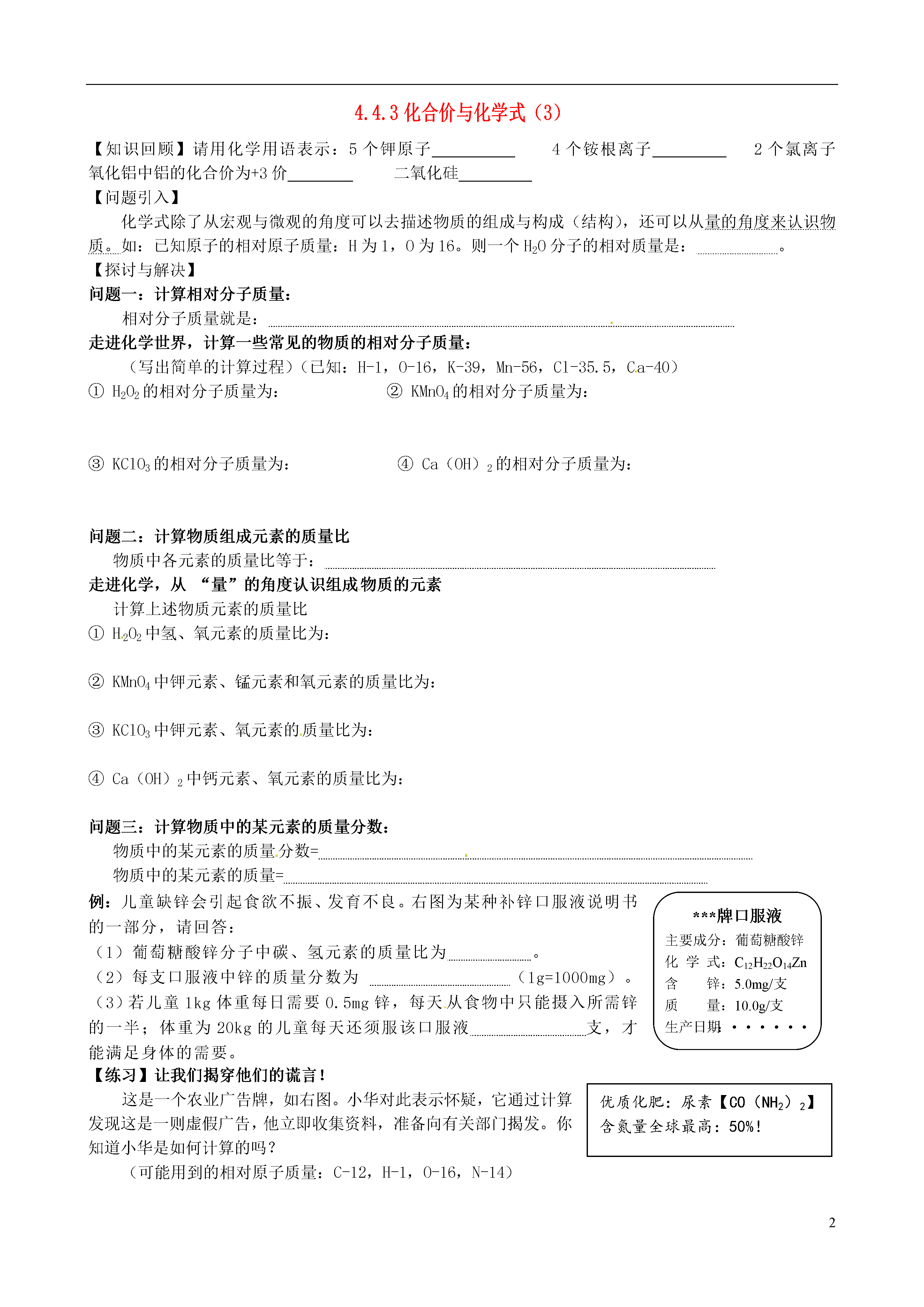 24.4.3化合价与化学式(3)【知识回顾】请用化学用语表示:5个钾原子4个铵根离子2个氯离子氧化铝中铝的化合价为+3价二氧化硅【问题引入】化学式除了从宏观与微观的角度可以去描述物质的组成与构成(结构),还可以从量的角度来认识物质。如:已知原子的相对原子质量:H为1,O为16。则一个H2O分子的相对质量是:。【探讨与解决】问题一:计算相对分子质量:相对分子质量就是:走进化学世界,计算一些常见的物质的相对分子质量:(写出简单的计算过程)(已知:H-1,O-16,K-39,Mn-56,Cl-35.5,Ca-40)①H2O2的相对分子质量为:②KMnO4的相对分子质量为:③KClO3的相对分子质量为:④Ca(OH)2的相对分子质量为:问题二:计算物质组成元素的质量比物质中各元素的质量比等于:走进化学,从“量”的角度认识组成物质的元素计算上述物质元素的质量比①H2O2中氢、氧元素的质量比为:②KMnO4中钾元素、锰元素和氧元素的质量比为:③KClO3中钾元素、氧元素的质量比为:④Ca(OH)2中钙元素、氧元素的质量比为:问题三:计算物质中的某元素的质量分数:物质中的某元素的质量分数=物质中的某元素的质量=***牌口服液主要成分:葡萄糖酸锌化学式:C12H22O14Zn含锌:5.0mg/支质量:10.0g/支生产日期:······例:儿童缺锌会引起食欲不振、发育不良。右图为某种补锌口服液说明书的一部分,请回答:(1)葡萄糖酸锌分子中碳、氢元素的质量比为。(2)每支口服液中锌的质量分数为(1g=1000mg)。(3)若儿童1kg体重每日需要0.5mg锌,每天从食物中只能摄入所需锌的一半;体重为20kg的儿童每天还须服该口服液支,才能满足身体的需要。优质化肥:尿素【CO(NH2)2】含氮量全球最高:50%!【练习】让我们揭穿他们的谎言!这是一个农业广告牌,如右图。小华对此表示怀疑,它通过计算发现这是一则虚假广告,他立即收集资料,准备向有关部门揭发。你知道小华是如何计算的吗?(可能用到的相对原子质量:C-12,H-1,O-16,N-14)【练习】1、2008年9月,三鹿婴幼儿奶粉因添加三聚氰胺)C3H6N6)致使一些婴幼儿患肾结石病。下列关于三聚氰胺的说法正确的是()A、三聚氰胺由碳、氢、氮三个元素组成B、三聚氰胺中碳、氢、氮质量比为1:2:2C、三聚氰胺中氮元素的质量分数为66.7﹪D、三聚氰胺的相对分子质量为126g2、研究发现,达菲(Tamiflu)对甲型HIM流感病毒有抑制作用,从香料八角中提取的莽草酸(C7H6O5)是合成达菲的原料之一。下列对莽草酸的说法不正确的是()A.莽草酸是氧化物B.它由碳、氢、氧元素组成C.氢元素质量分数最小D.碳、氢、氧原子个数比为7:6:53、β胡萝卜素(C40H56)是一种天然的植物色素,它广泛存在于黄绿色蔬菜和水果中,一定条件下在人体内能够转化为维生素A(C20H30O)。下列有关说法正确的是【】A.维生素A中碳、氢、氧三种元素的质量比为20:30:1B.维生素A的相对分子质量为286gC.维生素不是人体必需的营养物质D.β一胡萝卜素在植物油中的溶解度比在水中大4、二溴海因(C5H6O2N2Br2)是一种广谱高效、低残留的新型环境友好消毒剂,下列说法正确的是【】A.二溴海因的相对分子质量为286gB.二溴海因中氧元素的质量分数小于氮元素的质量分数C.二溴海因中含有O2、N2、Br2、C5H6D.二溴海因分子中C、H、O、N、Br原子个数比为5∶6∶2∶2∶2